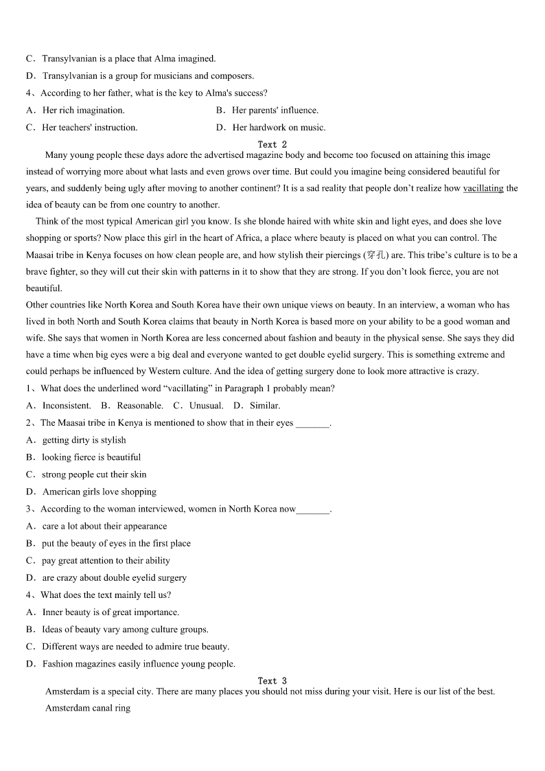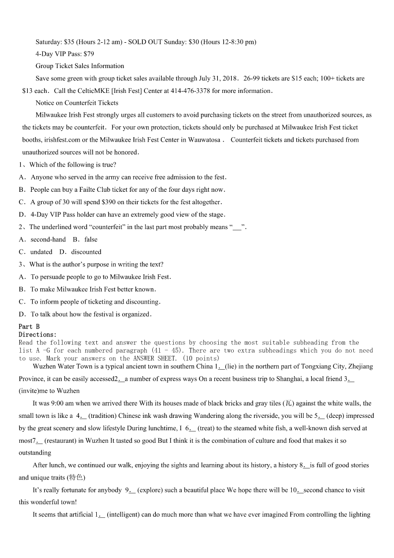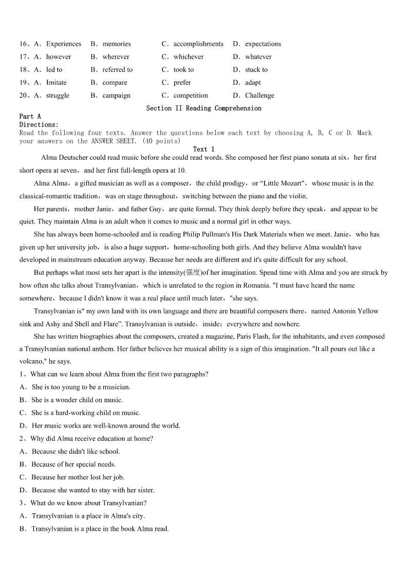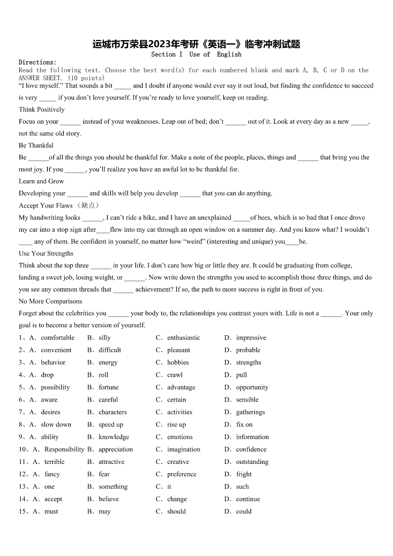 运城市万荣县2023年考研《英语一》临考冲刺试题 SectionIUseofEnglish Directions: Readthefollowingtext.Choosethebestword(s)foreachnumberedblankandmarkA,B,CorDonthe ANSWERSHEET.(10points) “Ilovemyself.”Thatsoundsabit_____andIdoubtifanyonewouldeversayitoutloud,butfindingtheconfidencetosucceed isvery_____ifyoudon’tloveyourself.Ifyou’rereadytoloveyourself,keeponreading. ThinkPositively Focusonyour______insteadofyourweaknesses.Leapoutofbed;don’t______outofit.Lookateverydayasanew_____, notthesameoldstory. BeThankful Be______ofallthethingsyoushouldbethankfulfor.Makeanoteofthepeople,places,thingsand______thatbringyouthe mostjoy.Ifyou______,you’llrealizeyouhaveanawfullottobethankfulfor. LearnandGrow Developingyour______andskillswillhelpyoudevelop______thatyoucandoanything. AcceptYourFlaws(缺点) Myhandwritinglooks______,Ican’trideabike,andIhaveanunexplained_____ofbees,whichissobadthatIoncedrove mycarintoastopsignafter____flewintomycarthroughanopenwindowonasummerday.Andyouknowwhat?Iwouldn’t ____anyofthem.Beconfidentinyourself,nomatterhow“weird”(interestingandunique)you____be. UseYourStrengths Thinkaboutthetopthree______inyourlife.Idon’tcarehowbigorlittletheyare.Itcouldbegraduatingfromcollege, landingasweetjob,losingweight,or______.Nowwritedownthestrengthsyouusedtoaccomplishthosethreethings,anddo youseeanycommonthreadsthat______achievement?Ifso,thepathtomoresuccessisrightinfrontofyou. NoMoreComparisons Forgetaboutthecelebritiesyou______yourbodyto,therelationshipsyoucontrastyourswith.Lifeisnota______.Youronly goalistobecomeabetterversionofyourself. 1、A.comfortableB.sillyC.enthusiasticD.impressive 2、A.convenientB.difficultC.pleasantD.probable 3、A.behaviorB.energyC.hobbiesD.strengths 4、A.dropB.rollC.crawlD.pull 5、A.possibilityB.fortuneC.advantageD.opportunity 6、A.awareB.carefulC.certainD.sensible 7、A.desiresB.charactersC.activitiesD.gatherings 8、A.slowdownB.speedupC.riseupD.fixon 9、A.abilityB.knowledgeC.emotionsD.information 10、A.ResponsibilityB.appreciationC.imaginationD.confidence 11、A.terribleB.attracti