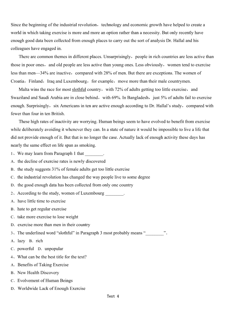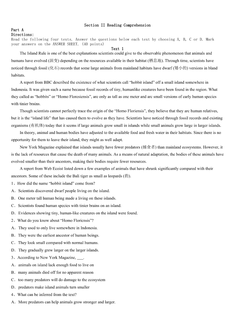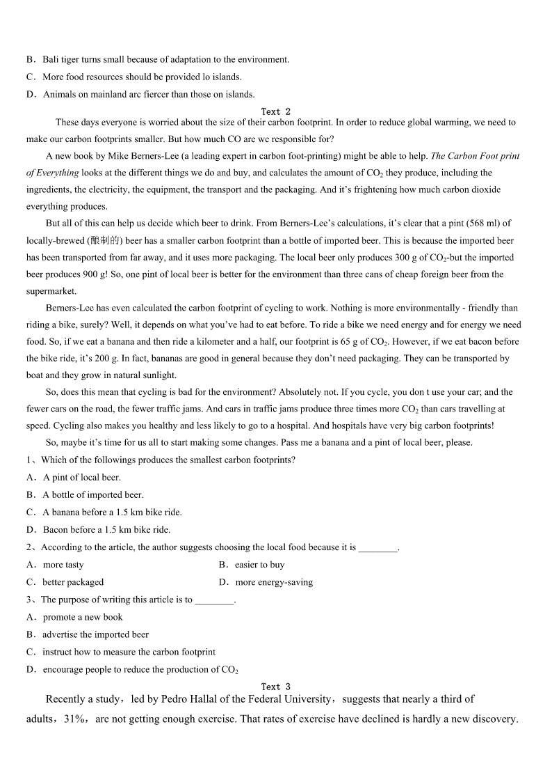 邯郸市鸡泽县2023年考研《英语一》深度预测试题 SectionIUseofEnglish Directions: Readthefollowingtext.Choosethebestword(s)foreachnumberedblankandmarkA,B,CorDonthe ANSWERSHEET.(10points) Mymotherhasalwaysbeeninvolvedinearly-childhoodeducation.Sheoftensetthesceneforchildrento1thejoyof physicalactivity,gettingthemexcitedand2tolearn. MumwassoproudofmeafterI3thetriathlonatthe2000Olympics,butbeforethedust4,shegrabbedme, saying:‘"Nowthisisyour5.Useit.”Shewasn’tspeakingfromaneconomicpointofviewbuttalkingaboutthe6ofmy beingarolemodel,encouragingkidsto7theirdreams. SincetheOlympics,Ihave8morethan100schools.Italktothekidsabout“livingalifeless9aconceptpassed ontomebymyparents—theideaof10beingaverage.Itellthemthatwhatyoubelieve,youwill11. AsIwasakid,mymothercametoevery12---nottopressuremebutto13me.Oneofmyfavoritesports-related memorieswaswhenIwas14intheCanadianTriathlonChampionships.AsIranbyabigtruck,Isawmymother15on topofoneofitshugewheels,cheeringforme.Ifinditsadwhenpeoplesaytheirparentshaveneverseenthem16. WhenIwasattheUniversity,Icompletedonlyonesemesterandthendecidedto17soIcouldraceprofessionallyfull- time.MumwasthefirstpersonIcalled.Itwasa18moment.Iwasn’tsurehowshewouldreact. “Mum,Ihavethisopportunity,andIthinkI’mgoingtotakeit.Whatdoyouthink?” Shewasas19asever.Itturnedouttobeagood20. Supportingyourchildren,trustingtheirdecisions,givingwell-thought-outadvice—thosearedefinitelyimportant qualities. 1、A.experienceB.evaluateC.expressD.expect 2、A.afraidB.readyC.relaxedD.reluctant 3、A.wonB.choseC.playedD.watched 4、A.roseB.settledC.flewD.appeared 5、A.luckB.timeC.crossroadD.opportunity 6、A.demandB.happinessC.courageD.importance 7、A.displayB.followC.appreciateD.abandon 8、A.servedB.attendedC.visitedD.started 9、A.energeticB.colorfulC.miserableD.ordinary 10、A.neverB.alwaysC.seldomD.usually 11、A.neglectB.achieveC.suspectD.assume 12、A.practiceB.schoolC.gameD.kindergarten 13、A.supportB.rewardC.instructD.comfort 14、A.surfingB.jumpingC.joggingD.running 15、A.sittingB.speakingC.standingD.performing 16、A.competeB.su