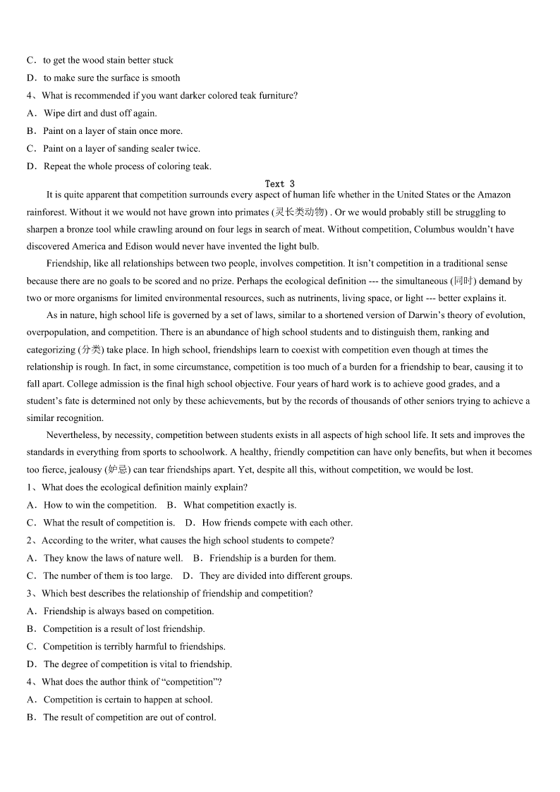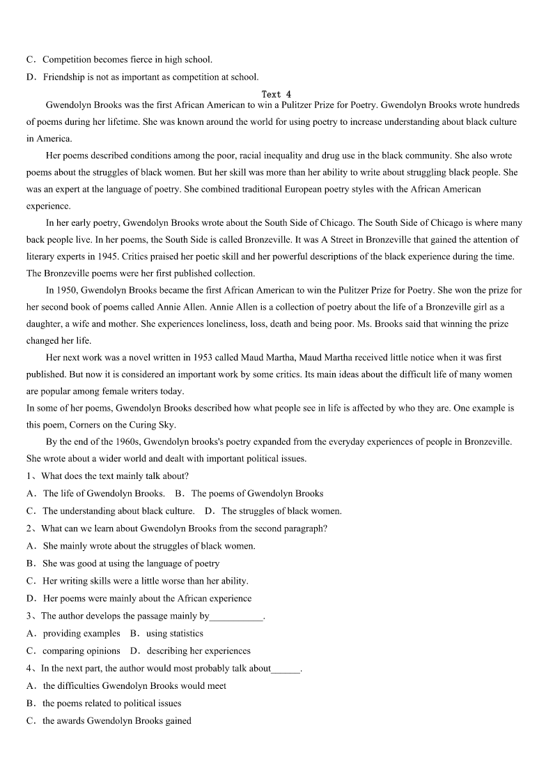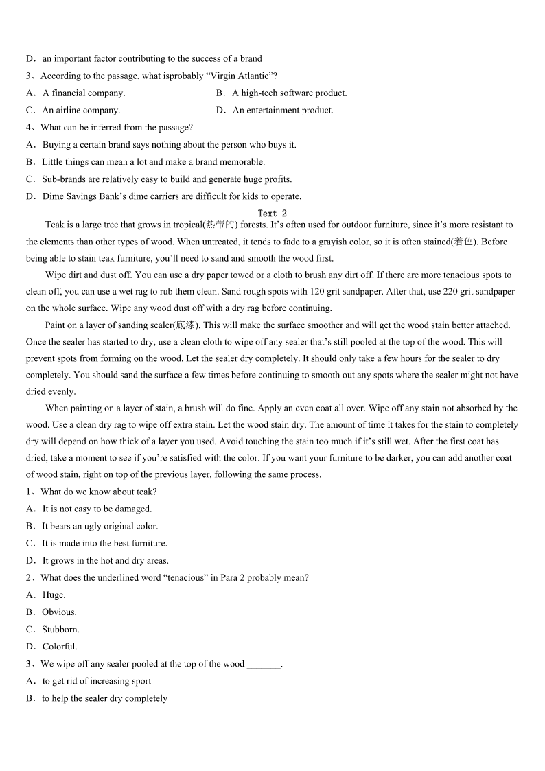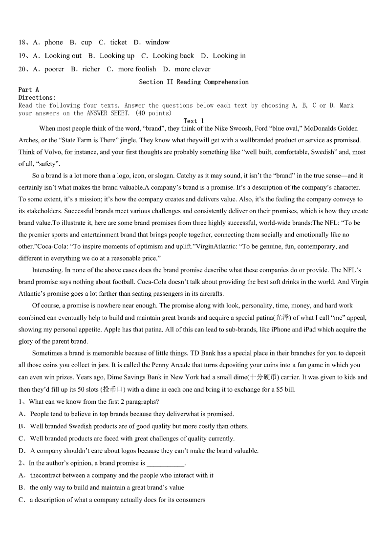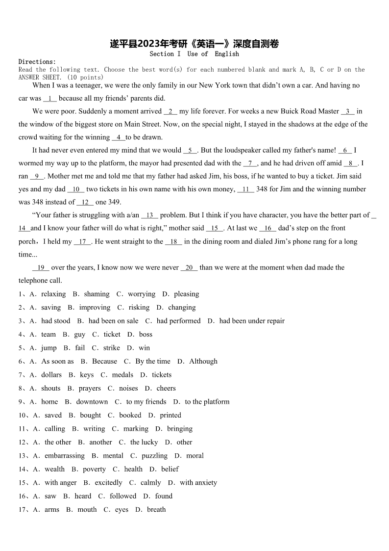 遂平县2023年考研《英语一》深度自测卷 SectionIUseofEnglish Directions: Readthefollowingtext.Choosethebestword(s)foreachnumberedblankandmarkA,B,CorDonthe ANSWERSHEET.(10points) WhenIwasateenager,weweretheonlyfamilyinourNewYorktownthatdidn’townacar.Andhavingno carwas1becauseallmyfriends’parentsdid. Wewerepoor.Suddenlyamomentarrived2mylifeforever.ForweeksanewBuickRoadMaster3in thewindowofthebiggeststoreonMainStreet.Now,onthespecialnight,Istayedintheshadowsattheedgeofthe crowdwaitingforthewinning4tobedrawn. Ithadneverevenenteredmymindthatwewould5.Buttheloudspeakercalledmyfather'sname!6I wormedmywayuptotheplatform,themayorhadpresenteddadwiththe7,andhehaddrivenoffamid8.I ran9.MothermetmeandtoldmethatmyfatherhadaskedJim,hisboss,ifhewantedtobuyaticket.Jimsaid yesandmydad10twoticketsinhisownnamewithhisownmoney,11348forJimandthewinningnumber was348insteadof12one349. “Yourfatherisstrugglingwitha/an13problem.ButIthinkifyouhavecharacter,youhavethebetterpartof 14andIknowyourfatherwilldowhatisright,”mothersaid15.Atlastwe16dad’ssteponthefront porch,Iheldmy17.Hewentstraighttothe18inthediningroomanddialedJim’sphonerangforalong time... 19overtheyears,Iknownowwewerenever20thanwewereatthemomentwhendadmadethe telephonecall. 1、A.relaxingB.shamingC.worryingD.pleasing 2、A.savingB.improvingC.riskingD.changing 3、A.hadstoodB.hadbeenonsaleC.hadperformedD.hadbeenunderrepair 4、A.teamB.guyC.ticketD.boss 5、A.jumpB.failC.strikeD.win 6、A.AssoonasB.BecauseC.BythetimeD.Although 7、A.dollarsB.keysC.medalsD.tickets 8、A.shoutsB.prayersC.noisesD.cheers 9、A.homeB.downtownC.tomyfriendsD.totheplatform 10、A.savedB.boughtC.bookedD.printed 11、A.callingB.writingC.markingD.bringing 12、A.theotherB.anotherC.theluckyD.other 13、A.embarrassingB.mentalC.puzzlingD.moral 14、A.wealthB.povertyC.healthD.belief 15、A.withangerB.excitedlyC.calmlyD.withanxiety 16、A.sawB.heardC.followedD.found 17、A.armsB.mouthC.eyesD.breath 18、A.phoneB.cupC.ticketD.window 19、A.LookingoutB.LookingupC.LookingbackD.Lookingin 20、A.poorerB.richerC.morefoolishD.morecle