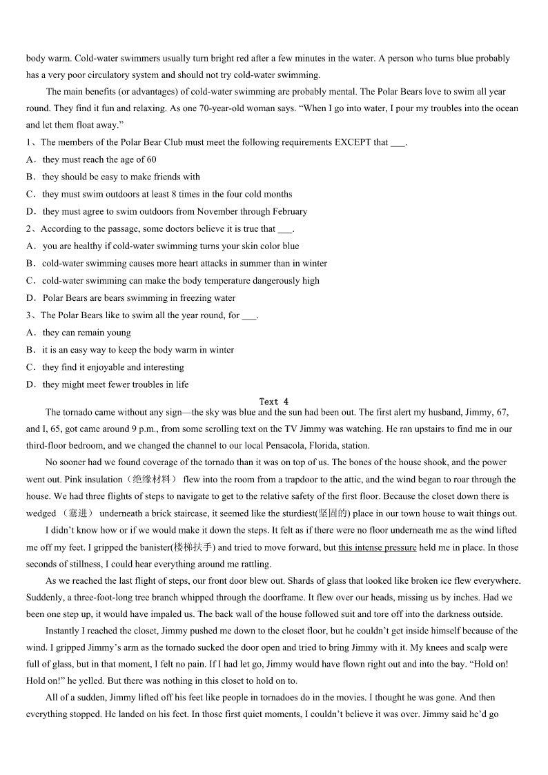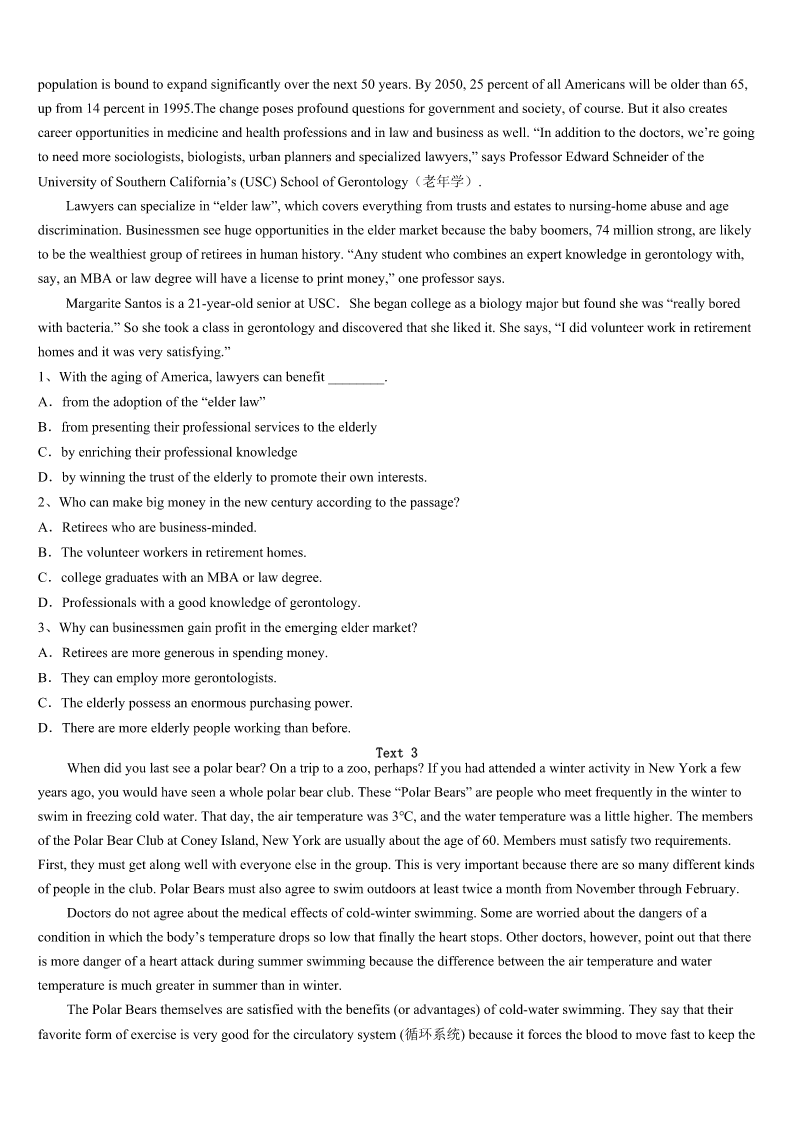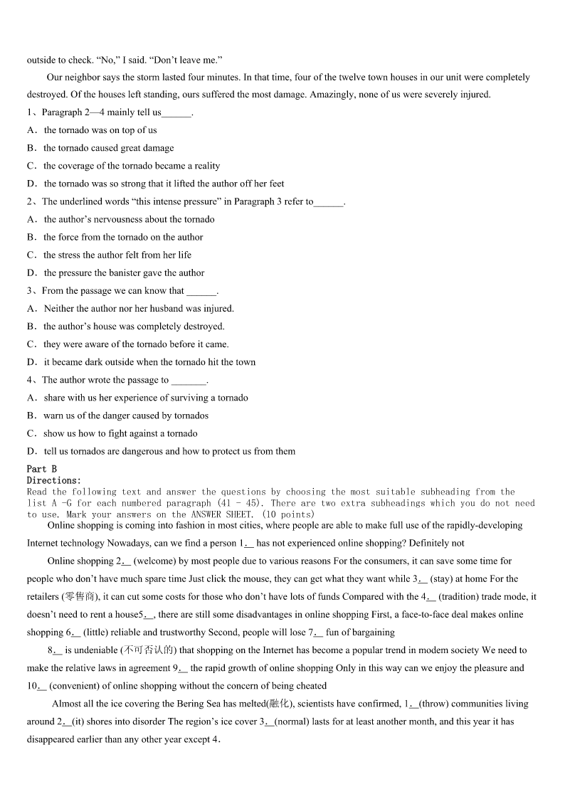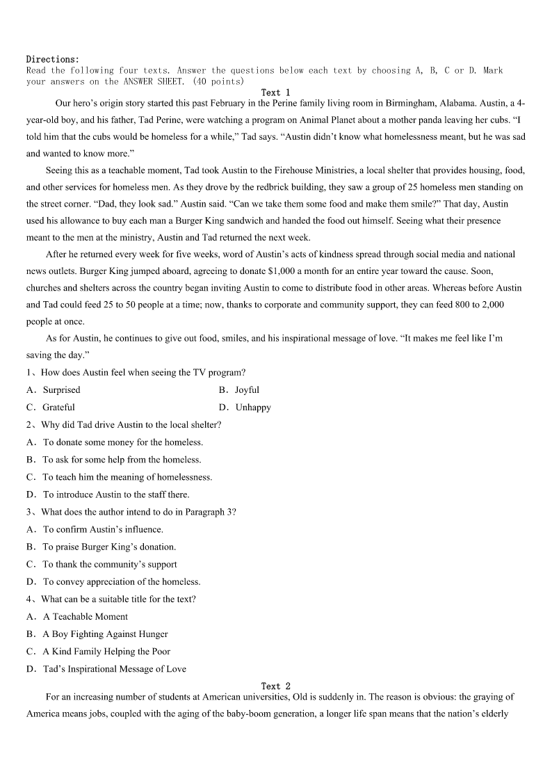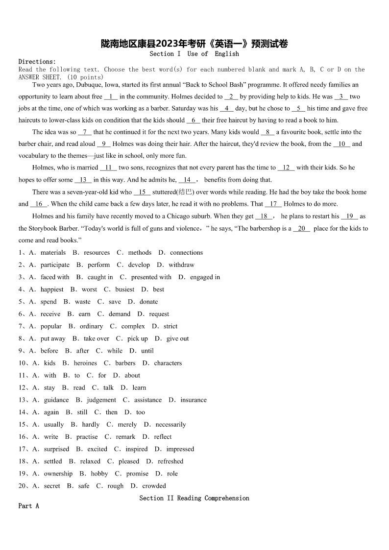 陇南地区康县2023年考研《英语一》预测试卷 SectionIUseofEnglish Directions: Readthefollowingtext.Choosethebestword(s)foreachnumberedblankandmarkA,B,CorDonthe ANSWERSHEET.(10points) Twoyearsago,Dubuque,Iowa,starteditsfirstannual“BacktoSchoolBash”programme.Itofferedneedyfamiliesan opportunitytolearnaboutfree1inthecommunity.Holmesdecidedto2byprovidinghelptokids.Hewas3two jobsatthetime,oneofwhichwasworkingasabarber.Saturdaywashis4day,buthechoseto5histimeandgavefree haircutstolowerclasskidsonconditionthatthekidsshould6theirfreehaircutbyhavingtoreadabooktohim. Theideawasso7thathecontinueditforthenexttwoyears.Manykidswould8afavouritebook,settleintothe barberchair,andreadaloud9Holmeswasdoingtheirhair.Afterthehaircut,they'dreviewthebook,fromthe10and vocabularytothethemes—justlikeinschool,onlymorefun. Holmes,whoismarried11twosons,recognizesthatnoteveryparenthasthetimeto12withtheirkids.Sohe hopestooffersome13inthisway.Andheadmitshe,14,benefitsfromdoingthat. Therewasasevenyearoldkidwho15stuttered(结巴)overwordswhilereading.Hehadtheboytakethebookhome and16.Whenthechildcamebackafewdayslater,hereaditwithnoproblems.That17Holmestodomore. HolmesandhisfamilyhaverecentlymovedtoaChicagosuburb.Whentheyget18,heplanstorestarthis19as theStorybookBarber.“Today'sworldisfullofgunsandviolence,”hesays,“Thebarbershopisa20placeforthekidsto comeandreadbooks.” 1、A.materialsB.resourcesC.methodsD.connections 2、A.participateB.performC.developD.withdraw 3、A.facedwithB.caughtinC.presentedwithD.engagedin 4、A.happiestB.worstC.busiestD.best 5、A.spendB.wasteC.saveD.donate 6、A.receiveB.earnC.demandD.request 7、A.popularB.ordinaryC.complexD.strict 8、A.putawayB.takeoverC.pickupD.giveout 9、A.beforeB.afterC.whileD.until 10、A.kidsB.heroinesC.barbersD.characters 11、A.withB.toC.forD.about 12、A.stayB.readC.talkD.learn 13、A.guidanceB.judgementC.assistanceD.insurance 14、A.againB.stillC.thenD.too 15、A.usuallyB.hardlyC.merelyD.necessarily 16、A.writeB.practiseC.remarkD.reflect 17、A.surprisedB.excitedC.inspiredD.impressed 18、A.settledB.relaxe