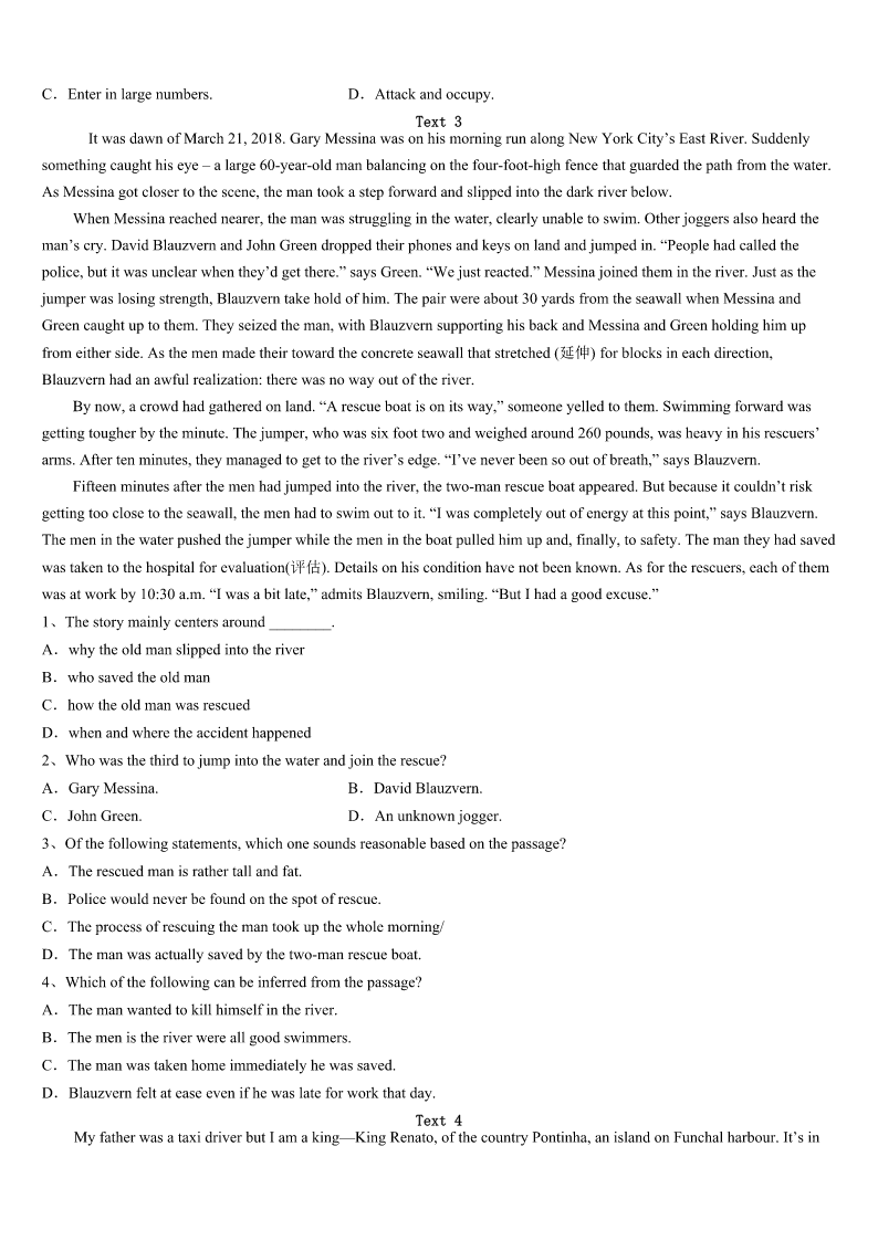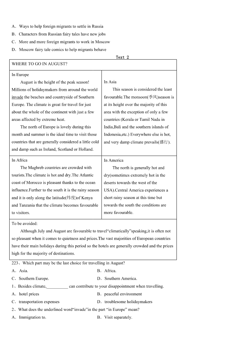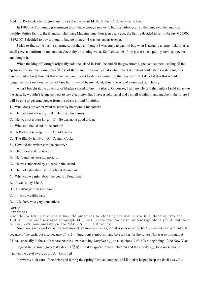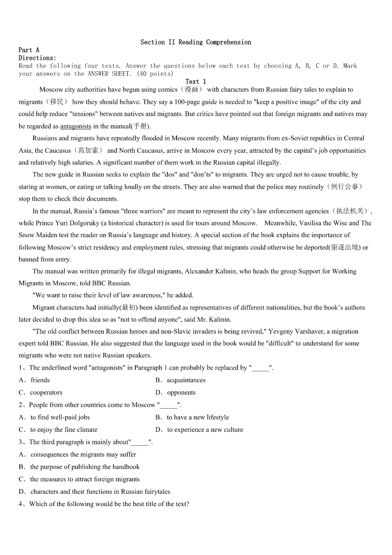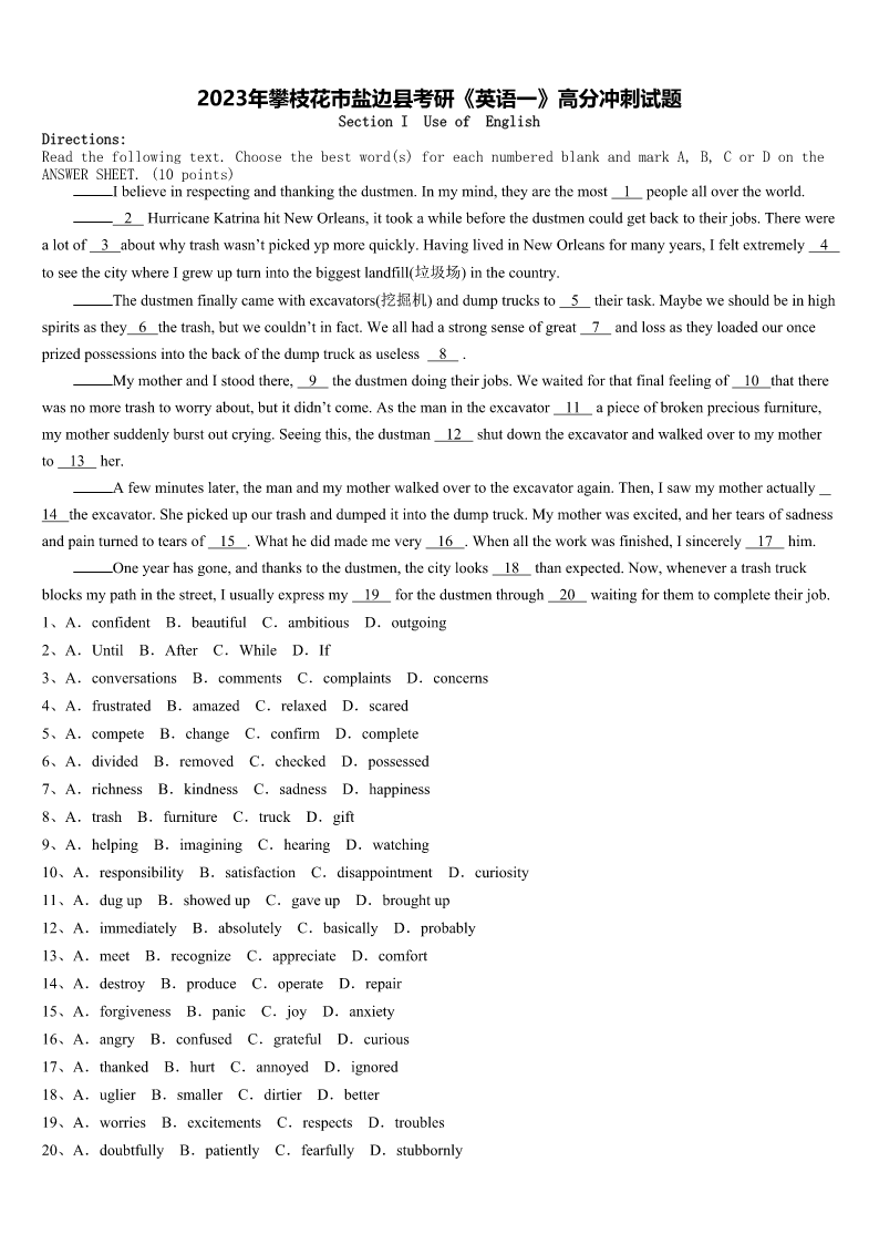 2023年攀枝花市盐边县考研《英语一》高分冲刺试题 SectionIUseofEnglish Directions: Readthefollowingtext.Choosethebestword(s)foreachnumberedblankandmarkA,B,CorDonthe ANSWERSHEET.(10points) Ibelieveinrespectingandthankingthedustmen.Inmymind,theyarethemost1peopleallovertheworld. 2HurricaneKatrinahitNewOrleans,ittookawhilebeforethedustmencouldgetbacktotheirjobs.Therewere alotof3aboutwhytrashwasn’tpickedypmorequickly.HavinglivedinNewOrleansformanyyears,Ifeltextremely4 toseethecitywhereIgrewupturnintothebiggestlandfill(垃圾场)inthecountry. Thedustmenfinallycamewithexcavators(挖掘机)anddumptrucksto5theirtask.Maybeweshouldbeinhigh spiritsasthey6thetrash,butwecouldn’tinfact.Weallhadastrongsenseofgreat7andlossastheyloadedouronce prizedpossessionsintothebackofthedumptruckasuseless8. MymotherandIstoodthere,9thedustmendoingtheirjobs.Wewaitedforthatfinalfeelingof10thatthere wasnomoretrashtoworryabout,butitdidn’tcome.Asthemanintheexcavator11apieceofbrokenpreciousfurniture, mymothersuddenlyburstoutcrying.Seeingthis,thedustman12shutdowntheexcavatorandwalkedovertomymother to13her. Afewminuteslater,themanandmymotherwalkedovertotheexcavatoragain.Then,Isawmymotheractually 14theexcavator.Shepickedupourtrashanddumpeditintothedumptruck.Mymotherwasexcited,andhertearsofsadness andpainturnedtotearsof15.Whathedidmademevery16.Whenalltheworkwasfinished,Isincerely17him. Oneyearhasgone,andthankstothedustmen,thecitylooks18thanexpected.Now,wheneveratrashtruck blocksmypathinthestreet,Iusuallyexpressmy19forthedustmenthrough20waitingforthemtocompletetheirjob. 1、A.confidentB.beautifulC.ambitiousD.outgoing 2、A.UntilB.AfterC.WhileD.If 3、A.conversationsB.commentsC.complaintsD.concerns 4、A.frustratedB.amazedC.relaxedD.scared 5、A.competeB.changeC.confirmD.complete 6、A.dividedB.removedC.checkedD.possessed 7、A.richnessB.kindnessC.sadnessD.happiness 8、A.trashB.furnitureC.truckD.gift 9、A.helpingB.imaginingC.hearingD.watching 10、A.responsibilityB.satisfactionC.disappointmentD.curiosity 11、A.dugupB.showedupC.gaveupD.broughtup 12、A.immediatelyB