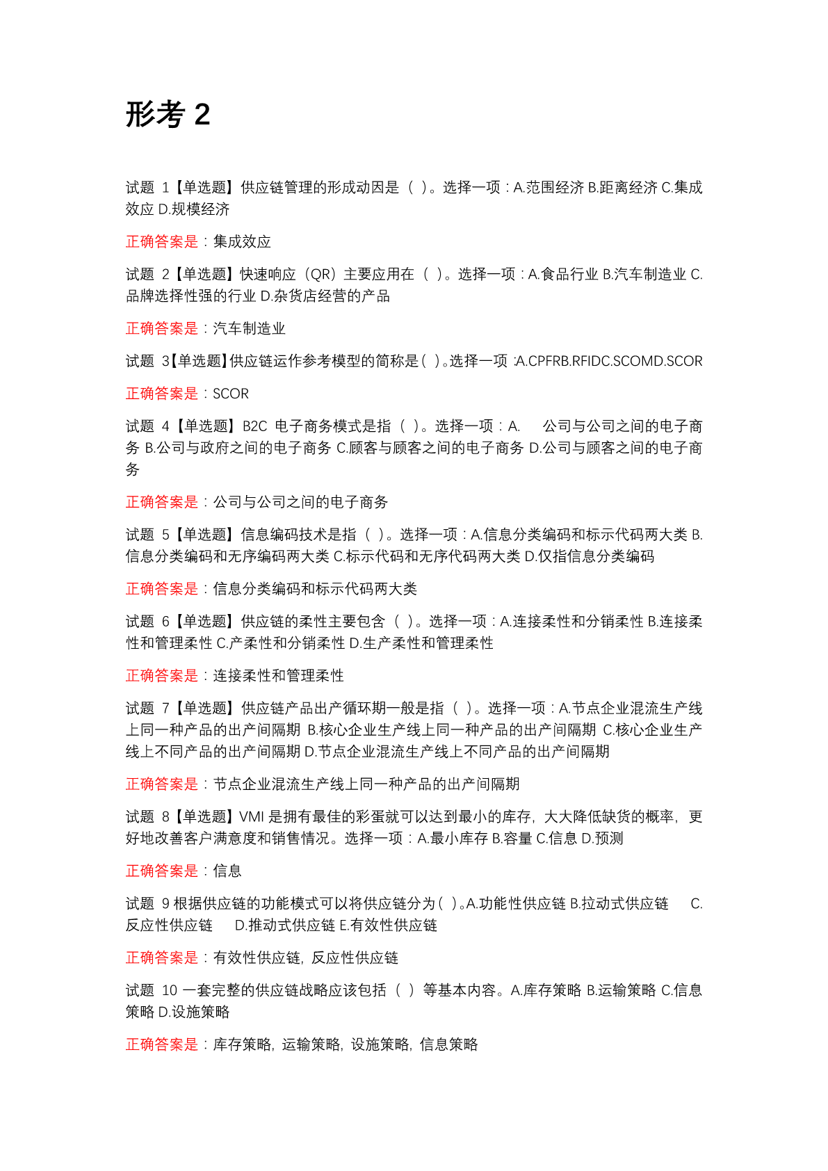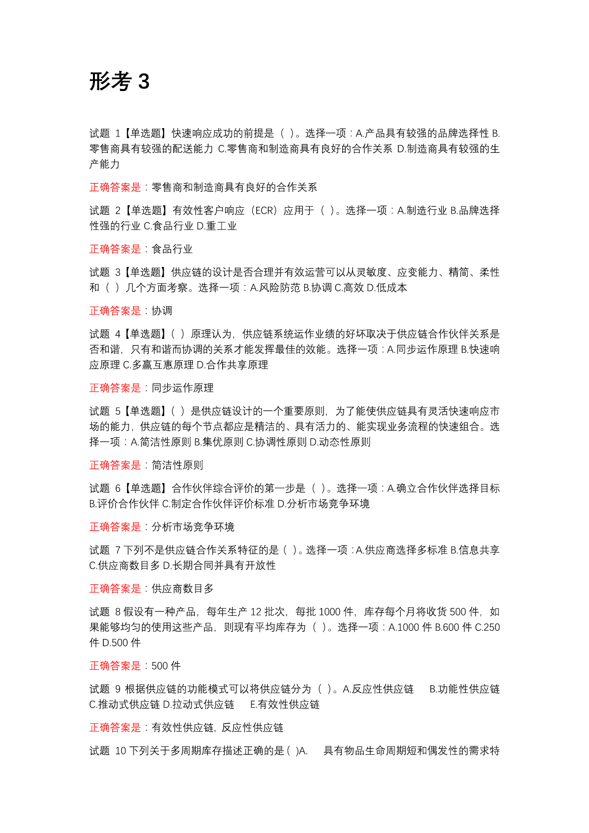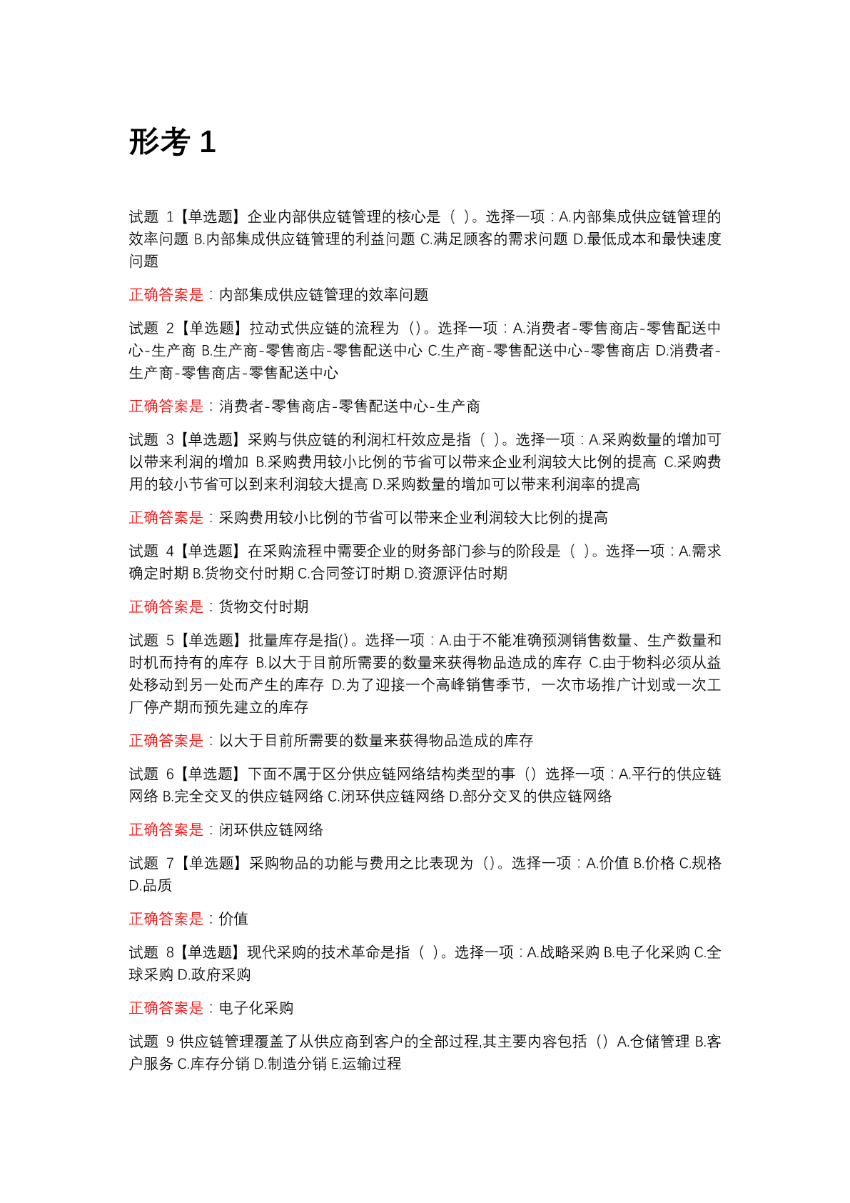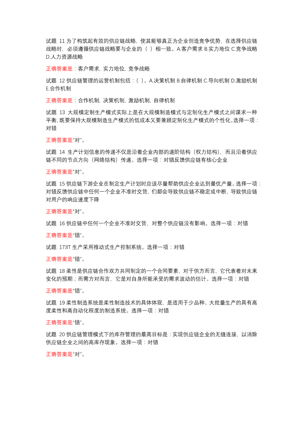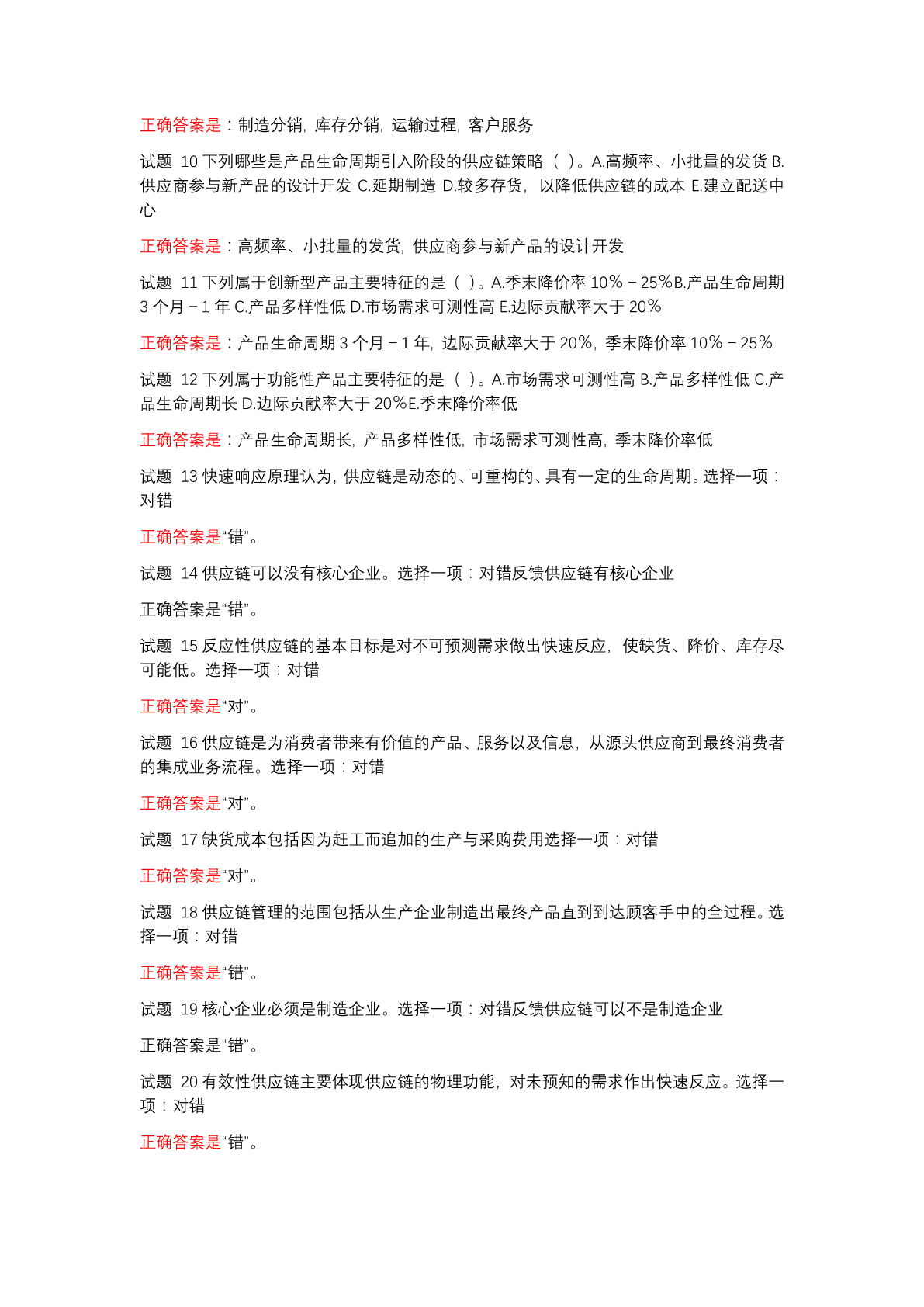 形考1 试题1【单选题】企业内部供应链管理的核心是()。选择一项:A.内部集成供应链管理的 效率问题B.内部集成供应链管理的利益问题C.满足顾客的需求问题D.最低成本和最快速度 问题 正确答案是:内部集成供应链管理的效率问题 试题2【单选题】拉动式供应链的流程为()。选择一项:A.消费者-零售商店-零售配送中 心-生产商B.生产商-零售商店-零售配送中心C.生产商-零售配送中心-零售商店D.消费者- 生产商-零售商店-零售配送中心 正确答案是:消费者-零售商店-零售配送中心-生产商 试题3【单选题】采购与供应链的利润杠杆效应是指()。选择一项:A.采购数量的增加可 以带来利润的增加B.采购费用较小比例的节省可以带来企业利润较大比例的提高C.采购费 用的较小节省可以到来利润较大提高D.采购数量的增加可以带来利润率的提高 正确答案是:采购费用较小比例的节省可以带来企业利润较大比例的提高 试题4【单选题】在采购流程中需要企业的财务部门参与的阶段是()。选择一项:A.需求 确定时期B.货物交付时期C.合同签订时期D.资源评估时期 正确答案是:货物交付时期 试题5【单选题】批量库存是指()。选择一项:A.由于不能准确预测销售数量、生产数量和 时机而持有的库存B.以大于目前所需要的数量来获得物品造成的库存C.由于物料必须从益 处移动到另一处而产生的库存D.为了迎接一个高峰销售季节,一次市场推广计划或一次工 厂停产期而预先建立的库存 正确答案是:以大于目前所需要的数量来获得物品造成的库存 试题6【单选题】下面不属于区分供应链网络结构类型的事()选择一项:A.平行的供应链 网络B.完全交叉的供应链网络C.闭环供应链网络D.部分交叉的供应链网络 正确答案是:闭环供应链网络 试题7【单选题】采购物品的功能与费用之比表现为()。选择一项:A.价值B.价格C.规格 D.品质 正确答案是:价值 试题8【单选题】现代采购的技术革命是指()。选择一项:A.战略采购B.电子化采购C.全 球采购D.政府采购 正确答案是:电子化采购 试题9供应链管理覆盖了从供应商到客户的全部过程,其主要内容包括()A.仓储管理B.客 户服务C.库存分销D.制造分销E.运输过程 正确答案是:制造分销,库存分销,运输过程,客户服务 试题10下列哪些是产品生命周期引入阶段的供应链策略()。A.高频率、小批量的发货B. 供应商参与新产品的设计开发C.延期制造D.较多存货,以降低供应链的成本E.建立配送中 心 正确答案是:高频率、小批量的发货,供应商参与新产品的设计开发 试题11下列属于创新型产品主要特征的是()。A.季末降价率10%-25%B.产品生命周期 3个月-1年C.产品多样性低D.市场需求可测性高E.边际贡献率大于20% 正确答案是:产品生命周期3个月-1年,边际贡献率大于20%,季末降价率10%-25% 试题12下列属于功能性产品主要特征的是()。A.市场需求可测性高B.产品多样性低C.产 品生命周期长D.边际贡献率大于20%E.季末降价率低 正确答案是:产品生命周期长,产品多样性低,市场需求可测性高,季末降价率低 试题13快速响应原理认为,供应链是动态的、可重构的、具有一定的生命周期。选择一项: 对错 正确答案是“错”。 试题14供应链可以没有核心企业。选择一项:对错反馈供应链有核心企业 正确答案是“错”。 试题15反应性供应链的基本目标是对不可预测需求做出快速反应,使缺货、降价、库存尽 可能低。选择一项:对错 正确答案是“对”。 试题16供应链是为消费者带来有价值的产品、服务以及信息,从源头供应商到最终消费者 的集成业务流程。选择一项:对错 正确答案是“对”。 试题17缺货成本包括因为赶工而追加的生产与采购费用选择一项:对错 正确答案是“对”。 试题18供应链管理的范围包括从生产企业制造出最终产品直到到达顾客手中的全过程。选 择一项:对错 正确答案是“错”。 试题19核心企业必须是制造企业。选择一项:对错反馈供应链可以不是制造企业 正确答案是“错”。 试题20有效性供应链主要体现供应链的物理功能,对未预知的需求作出快速反应。选择一 项:对错 正确答案是“错”。 形考2 试题1【单选题】供应链管理的形成动因是()。选择一项:A.范围经济B.距离经济C.集成 效应D.规模经济 正确答案是:集成效应 试题2【单选题】快速响应(QR)主要应用在()。选择一项:A.食品行业B.汽车制造业C. 品牌选择性强的行业D.杂货店经营的产品 正确答案是:汽车制造业 试题3【单选题】供应链运作参考模型的简称是()。选择一项:A.CPFRB.RFIDC.SCOMD.SCOR 正确答案是:SCOR
