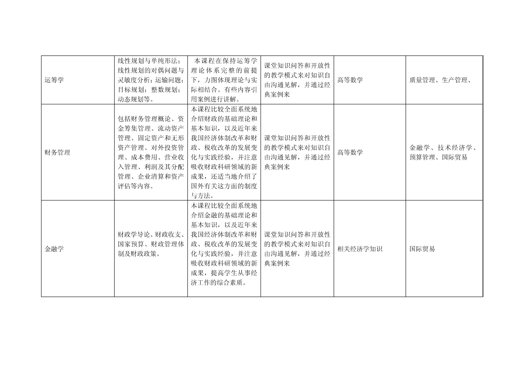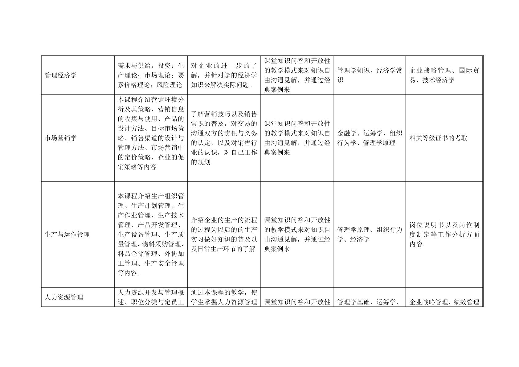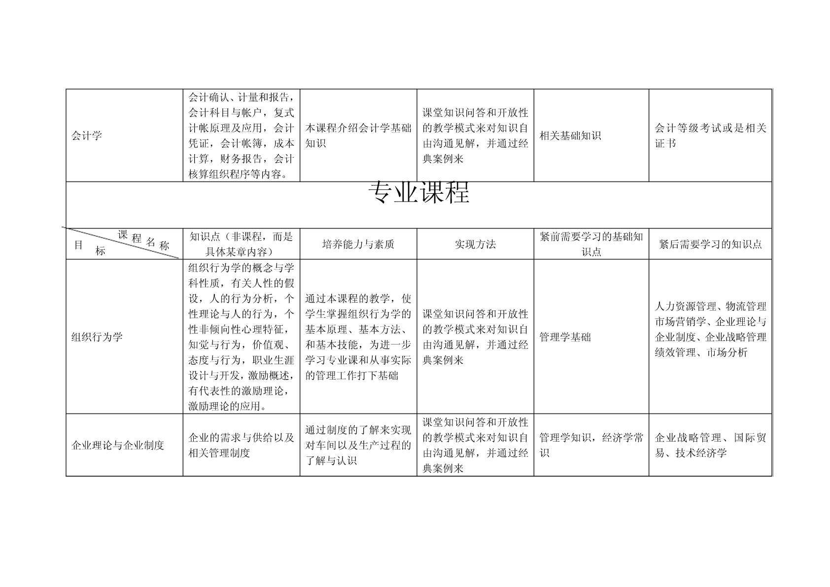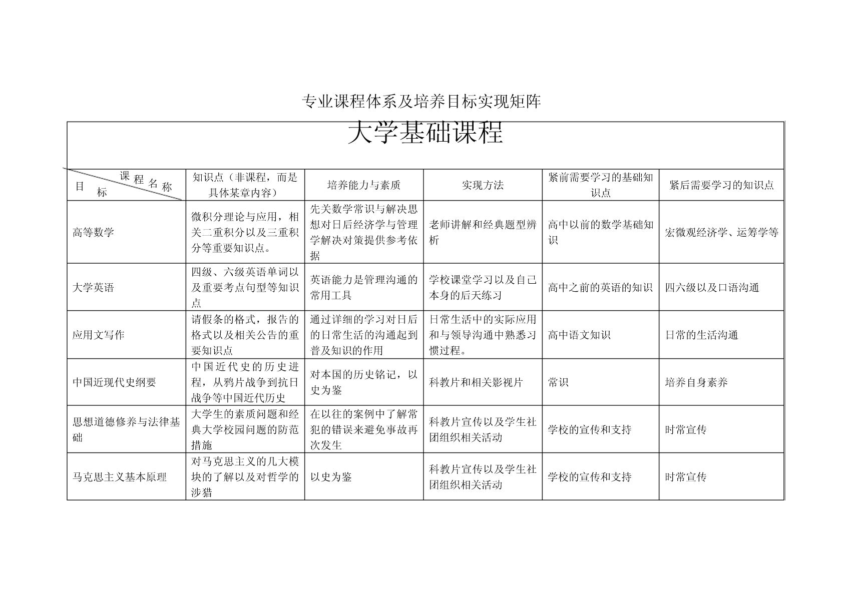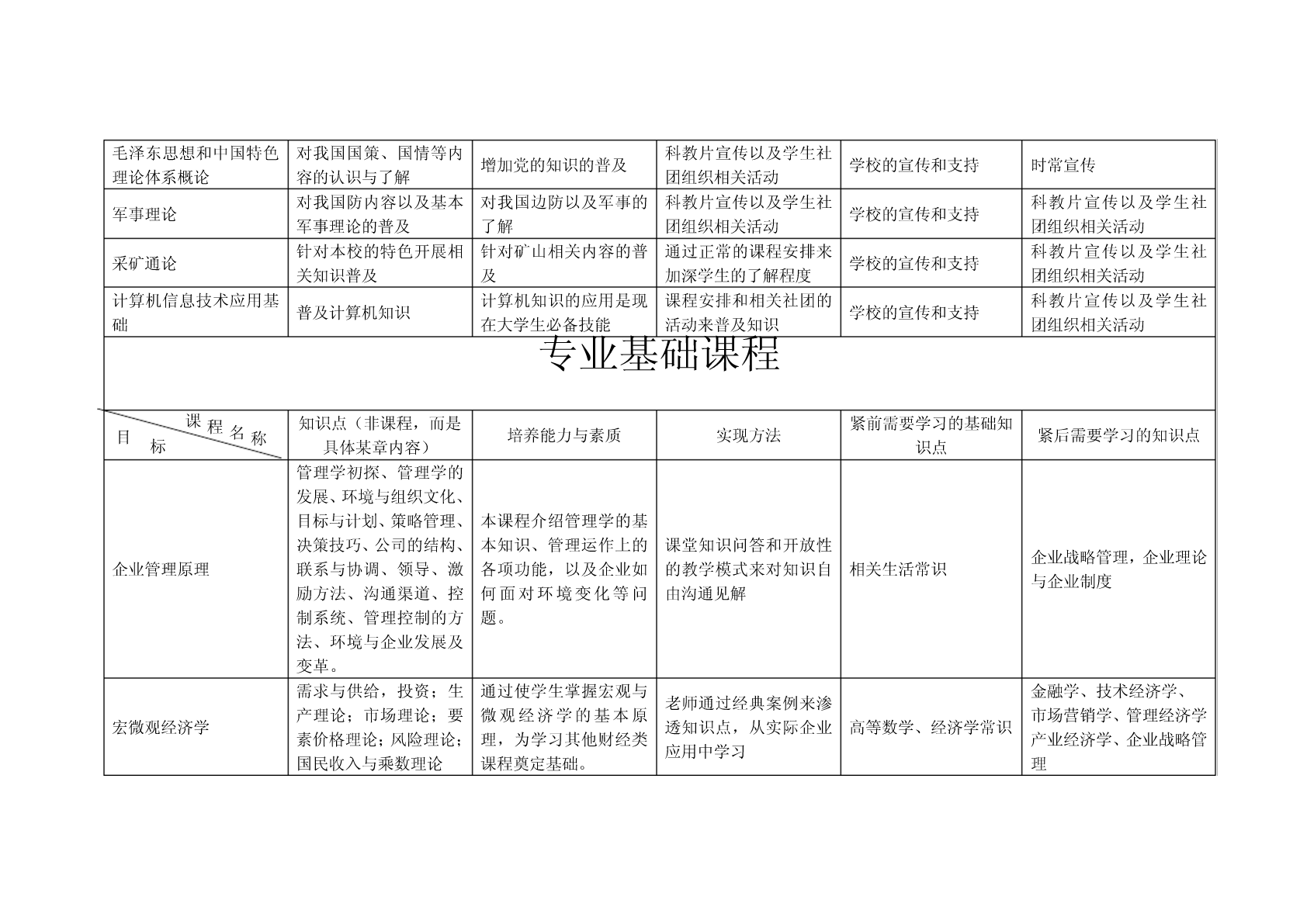 专业课程体系及培养目标实现矩阵 大学基础课程 课程知识点(非课程,而是紧前需要学习的基础知 目名称培养能力与素质实现方法紧后需要学习的知识点 标具体某章内容)识点 先关数学常识与解决思 微积分理论与应用,相 想对日后经济学与管理老师讲解和经典题型辨高中以前的数学基础知 高等数学关二重积分以及三重积宏微观经济学、运筹学等 学解决对策提供参考依析识 分等重要知识点。 据 四级、六级英语单词以 英语能力是管理沟通的学校课堂学习以及自己 大学英语及重要考点句型等知识高中之前的英语的知识四六级以及口语沟通 常用工具本身的后天练习 点 请假条的格式,报告的通过详细的学习对日后日常生活中的实际应用 应用文写作格式以及相关公告的重的日常生活的沟通起到和与领导沟通中熟悉习高中语文知识日常的生活沟通 要知识点普及知识的作用惯过程。 中国近代史的历史进 对本国的历史铭记,以 中国近现代史纲要程,从鸦片战争到抗日科教片和相关影视片常识培养自身素养 史为鉴 战争等中国近代历史 大学生的素质问题和经在以往的案例中了解常 思想道德修养与法律基科教片宣传以及学生社 典大学校园问题的防范犯的错误来避免事故再学校的宣传和支持时常宣传 础团组织相关活动 措施次发生 对马克思主义的几大模 科教片宣传以及学生社 马克思主义基本原理块的了解以及对哲学的以史为鉴学校的宣传和支持时常宣传 团组织相关活动 涉猎 毛泽东思想和中国特色对我国国策、国情等内科教片宣传以及学生社 增加党的知识的普及学校的宣传和支持时常宣传 理论体系概论容的认识与了解团组织相关活动 对我国防内容以及基本对我国边防以及军事的科教片宣传以及学生社科教片宣传以及学生社 军事理论学校的宣传和支持 军事理论的普及了解团组织相关活动团组织相关活动 针对本校的特色开展相针对矿山相关内容的普通过正常的课程安排来科教片宣传以及学生社 采矿通论学校的宣传和支持 关知识普及及加深学生的了解程度团组织相关活动 计算机信息技术应用基计算机知识的应用是现课程安排和相关社团的科教片宣传以及学生社 普及计算机知识学校的宣传和支持 础在大学生必备技能活动来普及知识团组织相关活动 专业基础课程 课程知识点(非课程,而是紧前需要学习的基础知 目名称培养能力与素质实现方法紧后需要学习的知识点 标具体某章内容)识点 管理学初探、管理学的 发展、环境与组织文化、 目标与计划、策略管理、本课程介绍管理学的基 决策技巧、公司的结构、本知识、管理运作上的课堂知识问答和开放性 企业战略管理,企业理论 企业管理原理联系与协调、领导、激各项功能,以及企业如的教学模式来对知识自相关生活常识 与企业制度 励方法、沟通渠道、控何面对环境变化等问由沟通见解 制系统、管理控制的方题。 法、环境与企业发展及 变革。 需求与供给,投资;生通过使学生掌握宏观与金融学、技术经济学、 老师通过经典案例来渗 产理论;市场理论;要微观经济学的基本原市场营销学、管理经济学 宏微观经济学透知识点,从实际企业高等数学、经济学常识 素价格理论;风险理论;理,为学习其他财经类产业经济学、企业战略管 应用中学习 国民收入与乘数理论课程奠定基础。理 线性规划与单纯形法;本课程在保持运筹学 课堂知识问答和开放性 线性规划的对偶问题与理论体系完整的前提 的教学模式来对知识自 运筹学灵敏度分析;运输问题;下,力图体现理论与实高等数学质量管理、生产管理、 由沟通见解,并通过经 目标规划;整数规划;际相结合。有些内容引 典案例来 动态规划等。用案例进行讲解。 本课程比较全面系统地 包括财务管理概论、资介绍财政的基础理论和 金筹集管理、流动资产基本知识,以及近年来 管理、固定资产和无形我国经济体制改革和财课堂知识问答和开放性 资产管理、对外投资管政、税收改革的发展变的教学模式来对知识自金融学、技术经济学、 财务管理高等数学 理、成本费用、营业收化与实践经验,并注意由沟通见解,并通过经预算管理、国际贸易 入管理、利润及其分配吸收财政科研领域的新典案例来 管理、企业清算和资产成果,还适当地介绍了 评估等内容。国外有关这方面的制度 与方法。 本课程比较全面系统地 介绍金融的基础理论和 基本知识,以及近年来 财政学导论、财政收支、我国经济体制改革和财课堂知识问答和开放性 国家预算、财政管理体政、税收改革的发展变的教学模式来对知识自 金融学相关经济学知识国际贸易 制及财政政策。化与实践经验,并注意由沟通见解,并通过经 吸收财政科研领域的新典案例来 成果,提高学生从事经 济工作的综合素质。 会计确认、计量和报告, 会计科目与帐户,复式课堂知识问答和开放性 计帐原理及应用,会计本课程介绍会计学基础的教学模式来对知识自会计等级考试或是相关 会计学相关基础知识 凭证,会计