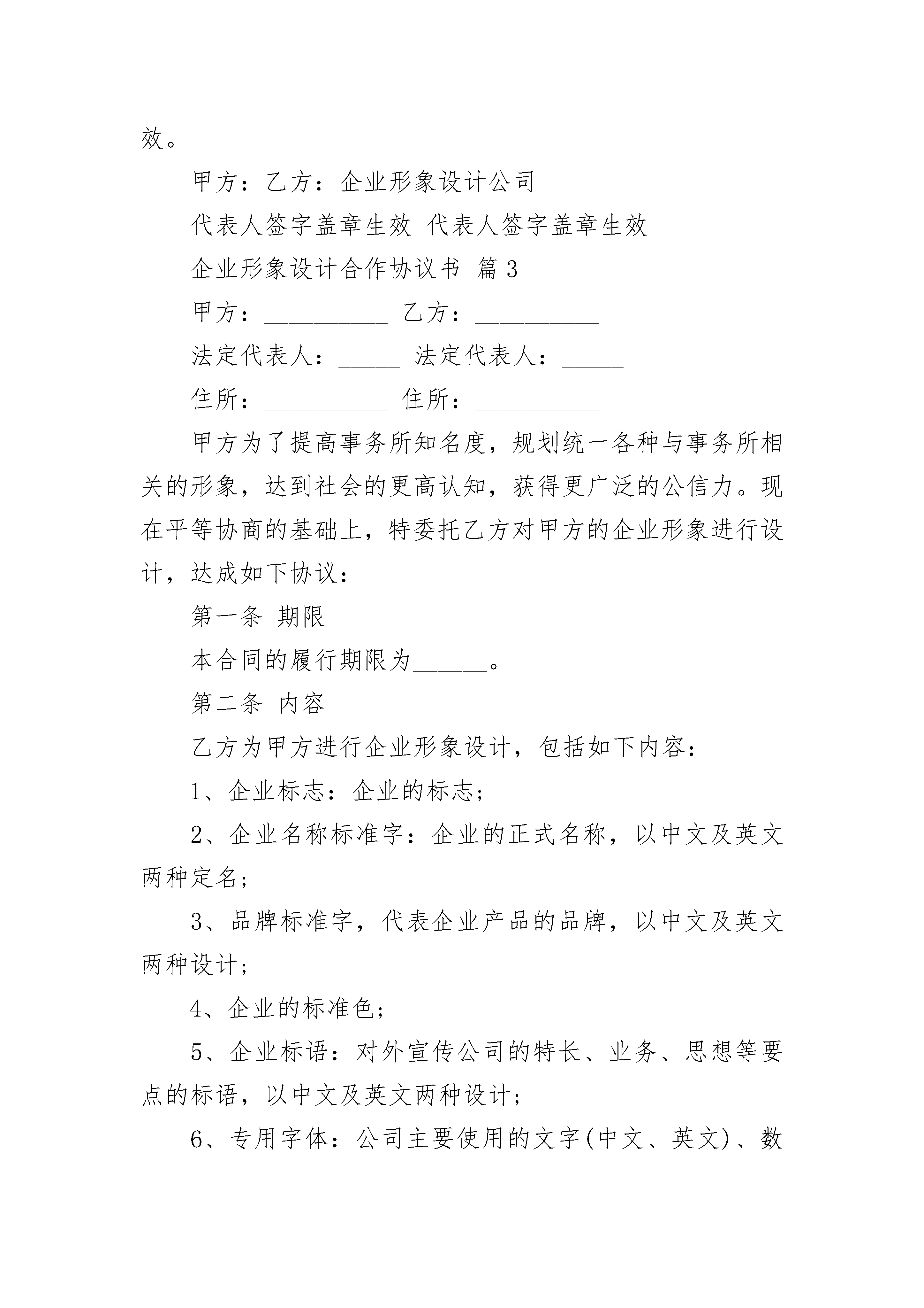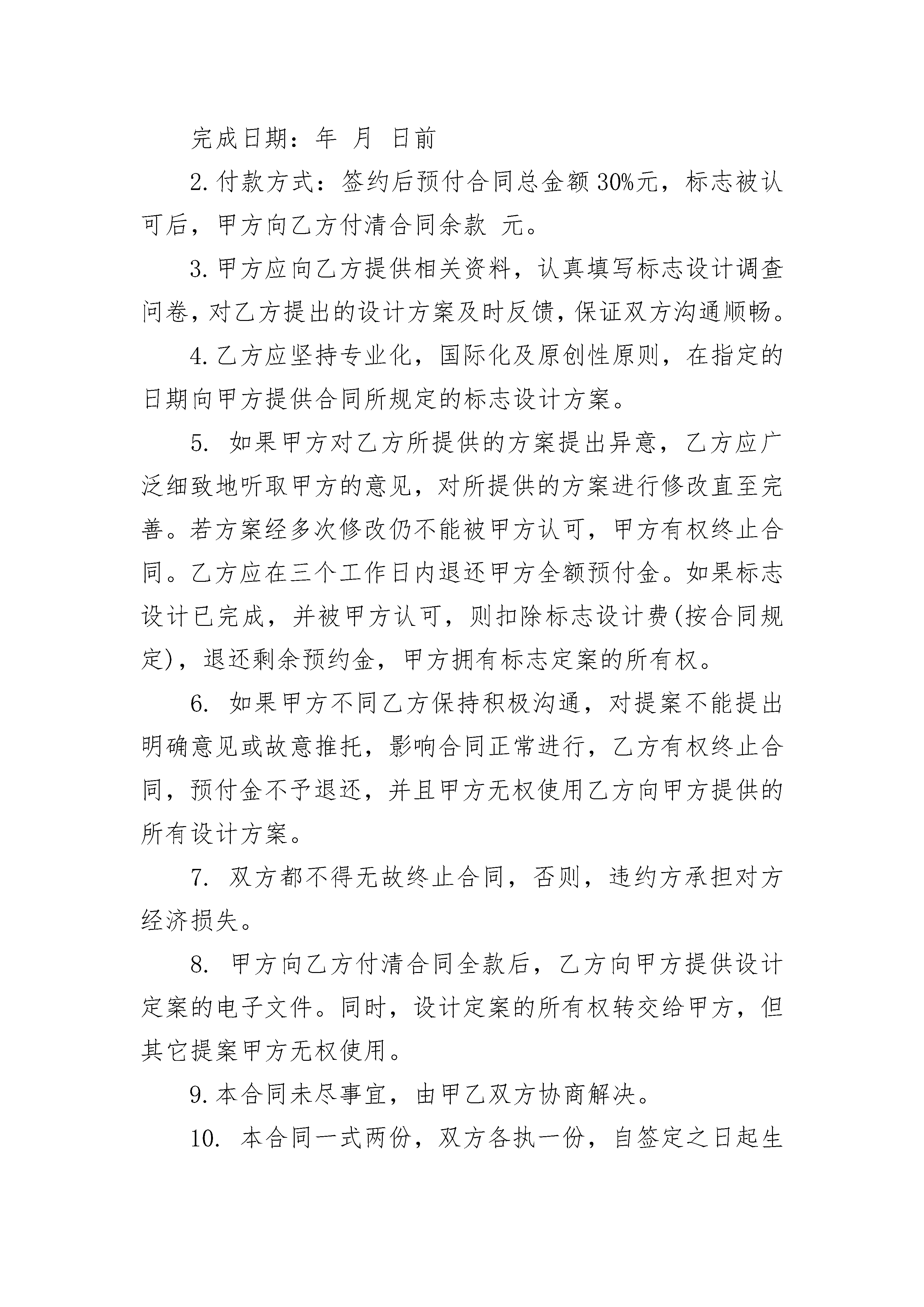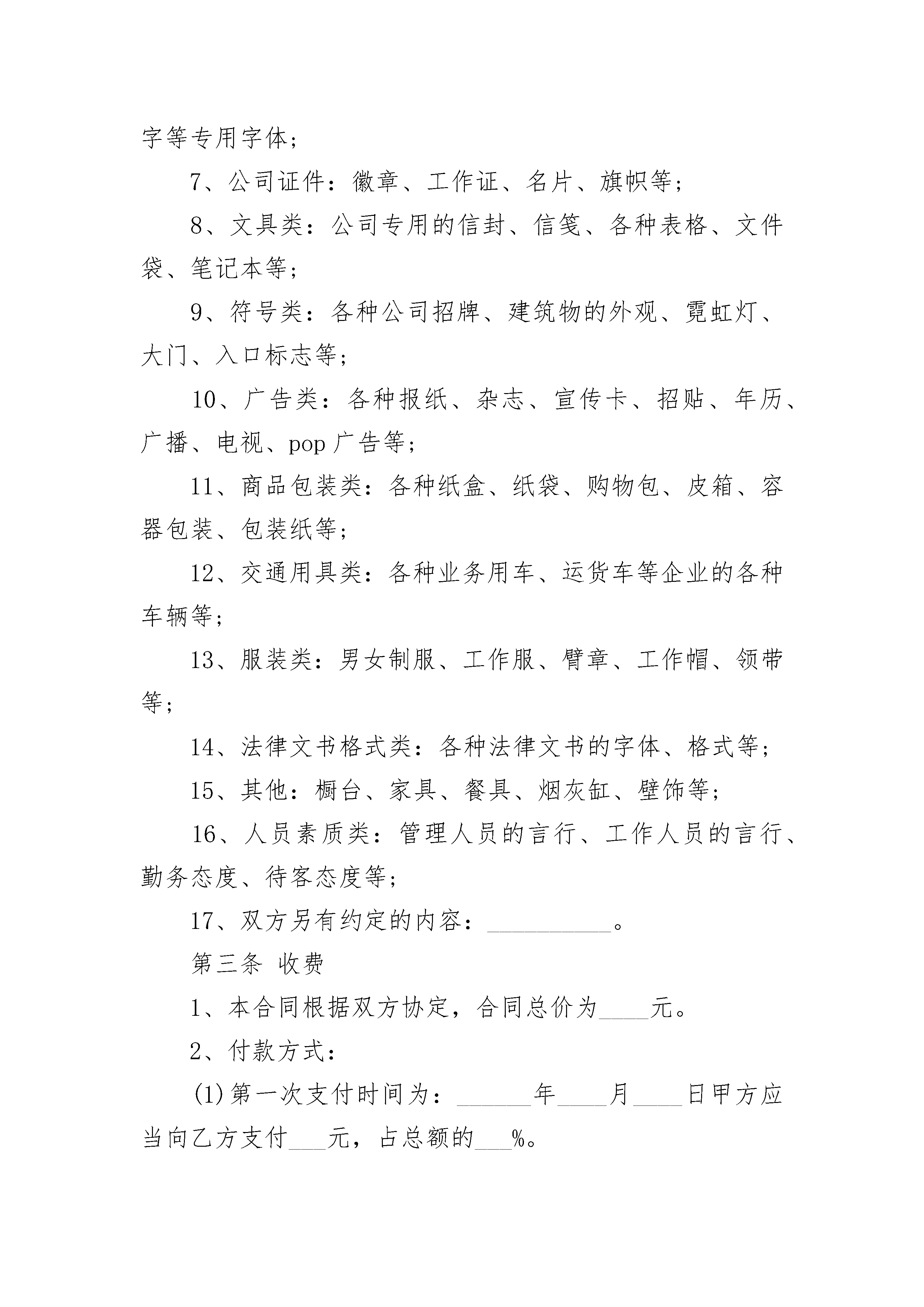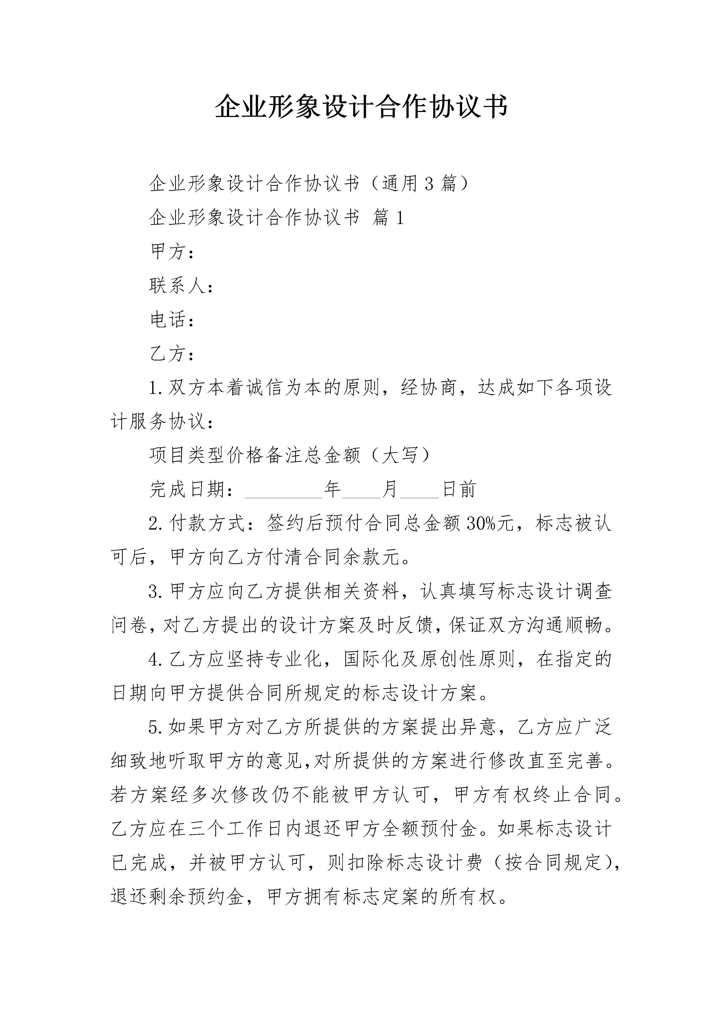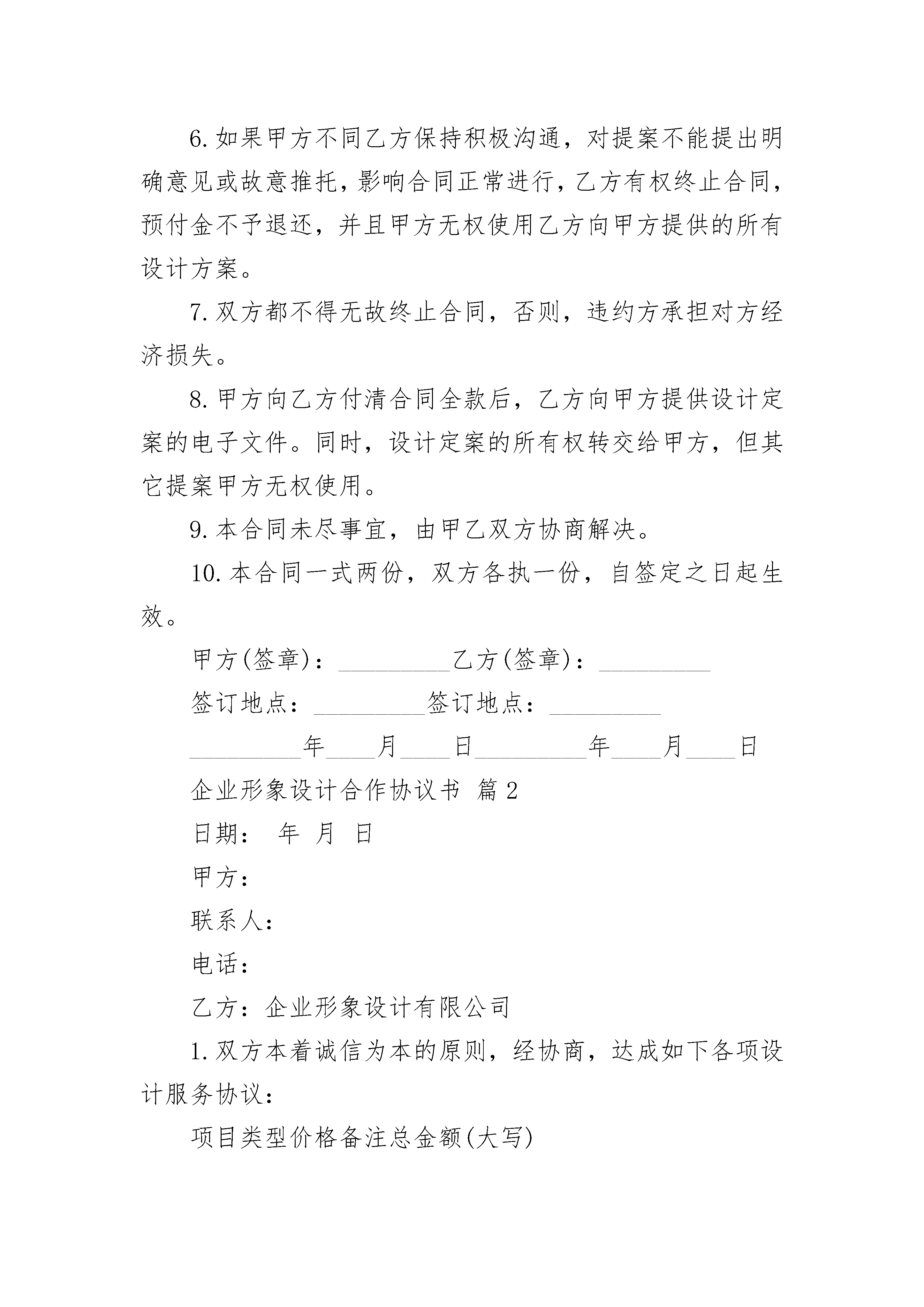 企业形象设计合作协议书企业形象设计合作协议书(通用3篇)企业形象设计合作协议书篇1甲方:联系人:电话:乙方:1.双方本着诚信为本的原则,经协商,达成如下各项设计服务协议:项目类型价格备注总金额(大写)完成日期:________年____月____日前2.付款方式:签约后预付合同总金额30%元,标志被认可后,甲方向乙方付清合同余款元。3.甲方应向乙方提供相关资料,认真填写标志设计调查问卷,对乙方提出的设计方案及时反馈,保证双方沟通顺畅。4.乙方应坚持专业化,国际化及原创性原则,在指定的日期向甲方提供合同所规定的标志设计方案。5.如果甲方对乙方所提供的方案提出异意,乙方应广泛细致地听取甲方的意见,对所提供的方案进行修改直至完善。若方案经多次修改仍不能被甲方认可,甲方有权终止合同。乙方应在三个工作日内退还甲方全额预付金。如果标志设计已完成,并被甲方认可,则扣除标志设计费(按合同规定),退还剩余预约金,甲方拥有标志定案的所有权。6.如果甲方不同乙方保持积极沟通,对提案不能提出明确意见或故意推托,影响合同正常进行,乙方有权终止合同,预付金不予退还,并且甲方无权使用乙方向甲方提供的所有设计方案。7.双方都不得无故终止合同,否则,违约方承担对方经济损失。8.甲方向乙方付清合同全款后,乙方向甲方提供设计定案的电子文件。同时,设计定案的所有权转交给甲方,但其它提案甲方无权使用。9.本合同未尽事宜,由甲乙双方协商解决。10.本合同一式两份,双方各执一份,自签定之日起生效。甲方(签章):_________乙方(签章):_________签订地点:_________签订地点:__________________年____月____日_________年____月____日企业形象设计合作协议书篇2日期:年月日甲方:联系人:电话:乙方:企业形象设计有限公司1.双方本着诚信为本的原则,经协商,达成如下各项设计服务协议:项目类型价格备注总金额(大写)完成日期:年月日前2.付款方式:签约后预付合同总金额30%元,标志被认可后,甲方向乙方付清合同余款元。3.甲方应向乙方提供相关资料,认真填写标志设计调查问卷,对乙方提出的设计方案及时反馈,保证双方沟通顺畅。4.乙方应坚持专业化,国际化及原创性原则,在指定的日期向甲方提供合同所规定的标志设计方案。5.如果甲方对乙方所提供的方案提出异意,乙方应广泛细致地听取甲方的意见,对所提供的方案进行修改直至完善。若方案经多次修改仍不能被甲方认可,甲方有权终止合同。乙方应在三个工作日内退还甲方全额预付金。如果标志设计已完成,并被甲方认可,则扣除标志设计费(按合同规定),退还剩余预约金,甲方拥有标志定案的所有权。6.如果甲方不同乙方保持积极沟通,对提案不能提出明确意见或故意推托,影响合同正常进行,乙方有权终止合同,预付金不予退还,并且甲方无权使用乙方向甲方提供的所有设计方案。7.双方都不得无故终止合同,否则,违约方承担对方经济损失。8.甲方向乙方付清合同全款后,乙方向甲方提供设计定案的电子文件。同时,设计定案的所有权转交给甲方,但其它提案甲方无权使用。9.本合同未尽事宜,由甲乙双方协商解决。10.本合同一式两份,双方各执一份,自签定之日起生效。甲方:乙方:企业形象设计公司代表人签字盖章生效代表人签字盖章生效企业形象设计合作协议书篇3甲方:__________乙方:__________法定代表人:_____法定代表人:_____住所:__________住所:__________甲方为了提高事务所知名度,规划统一各种与事务所相关的形象,达到社会的更高认知,获得更广泛的公信力。现在平等协商的基础上,特委托乙方对甲方的企业形象进行设计,达成如下协议:第一条期限本合同的履行期限为______。第二条内容乙方为甲方进行企业形象设计,包括如下内容:1、企业标志:企业的标志;2、企业名称标准字:企业的正式名称,以中文及英文两种定名;3、品牌标准字,代表企业产品的品牌,以中文及英文两种设计;4、企业的标准色;5、企业标语:对外宣传公司的特长、业务、思想等要点的标语,以中文及英文两种设计;6、专用字体:公司主要使用的文字(中文、英文)、数字等专用字体;7、公司证件:徽章、工作证、名片、旗帜等;8、文具类:公司专用的信封、信笺、各种表格、文件袋、笔记本等;9、符号类:各种公司招牌、建筑物的外观、霓虹灯、大门、入口标志等;10、广告类:各种报纸、杂志、宣传卡、招贴、年历、广播、电视、pop广告等;11、商品包装类:各种纸盒、纸袋、购物包、皮箱、容器包装、包装纸等;12、交通用具类:各种业务用车、运货车等企业的各种车辆等;13、服装类:男女制服、工作服、臂章、工作帽、领带等;14、法律文书格式类:各种法律文书的字体、格式等;15、其他:橱台、家具、餐
