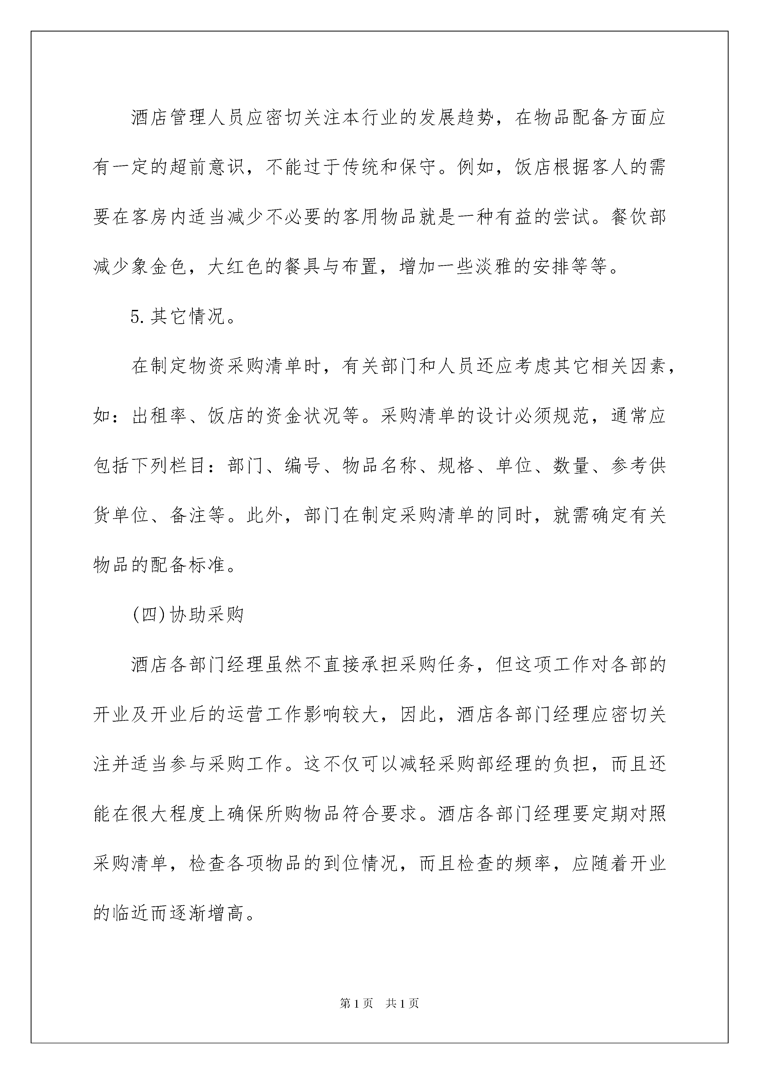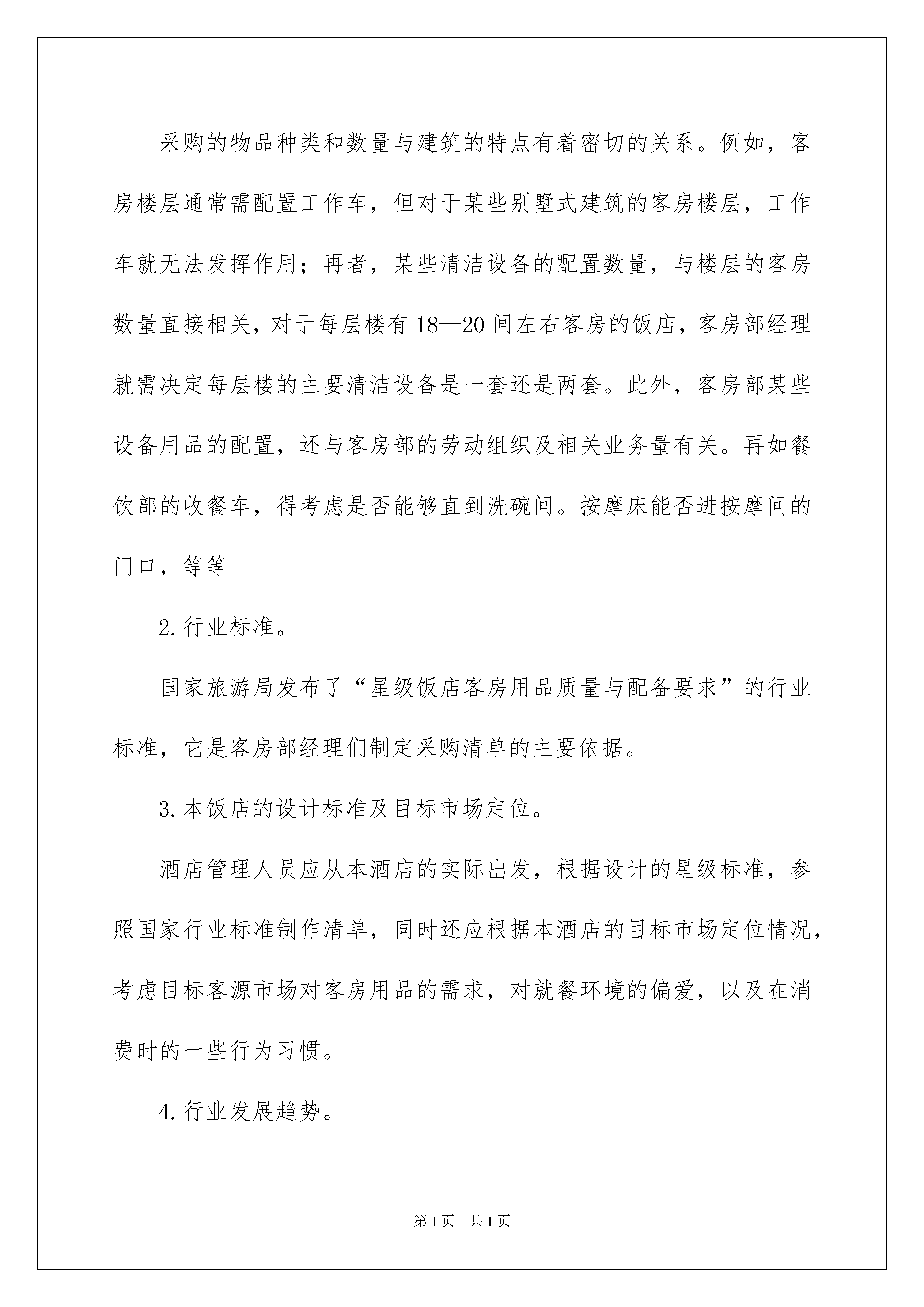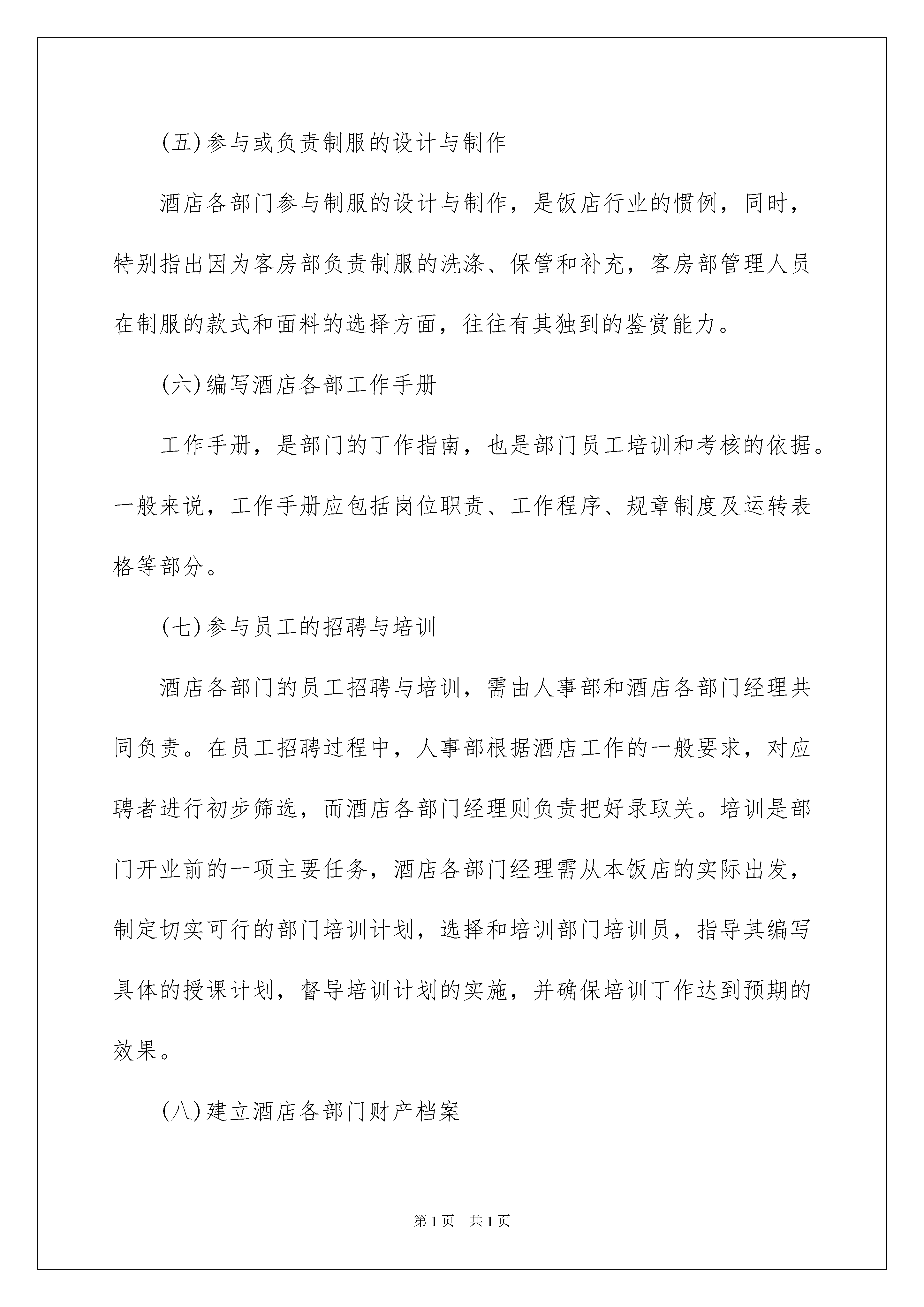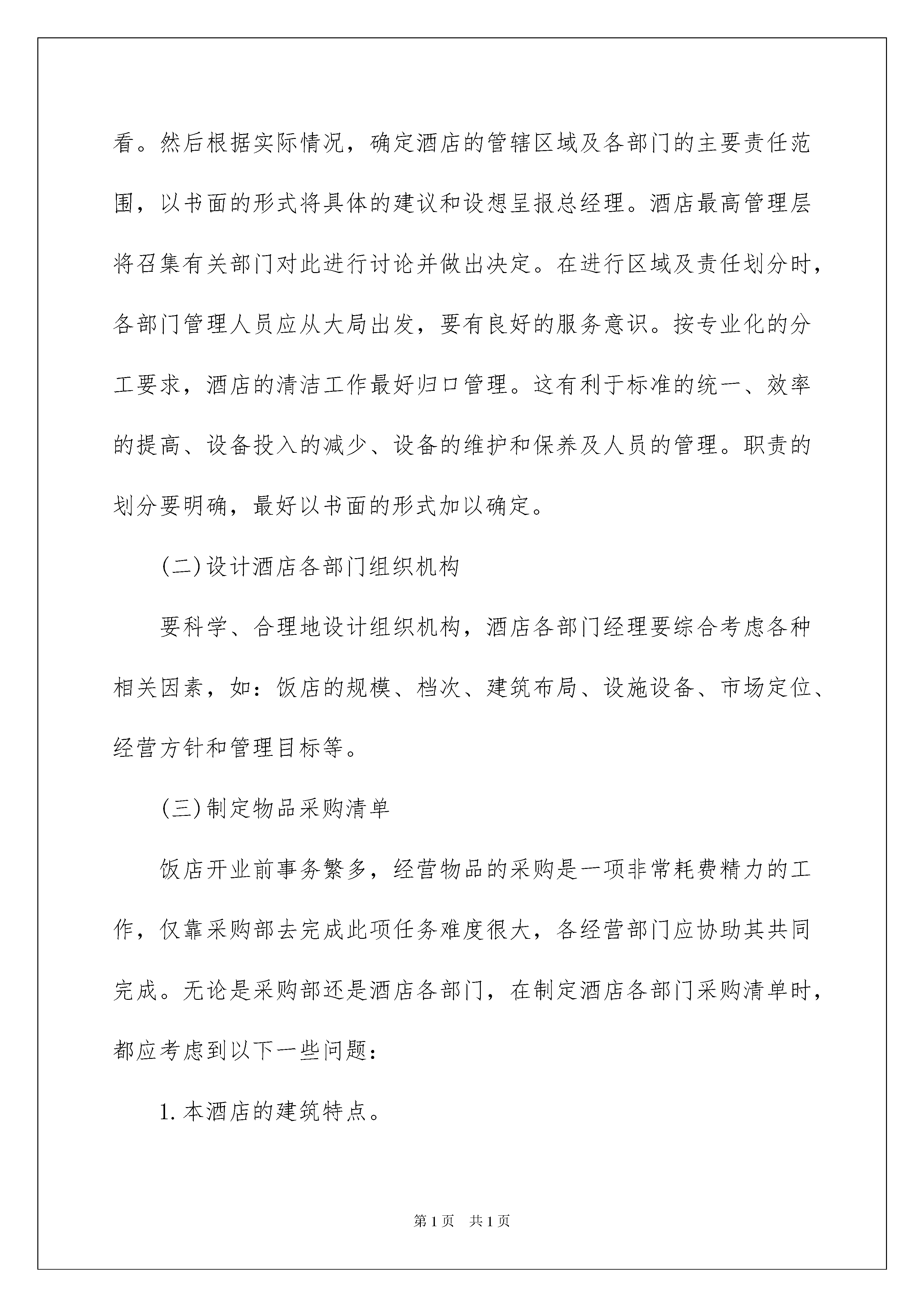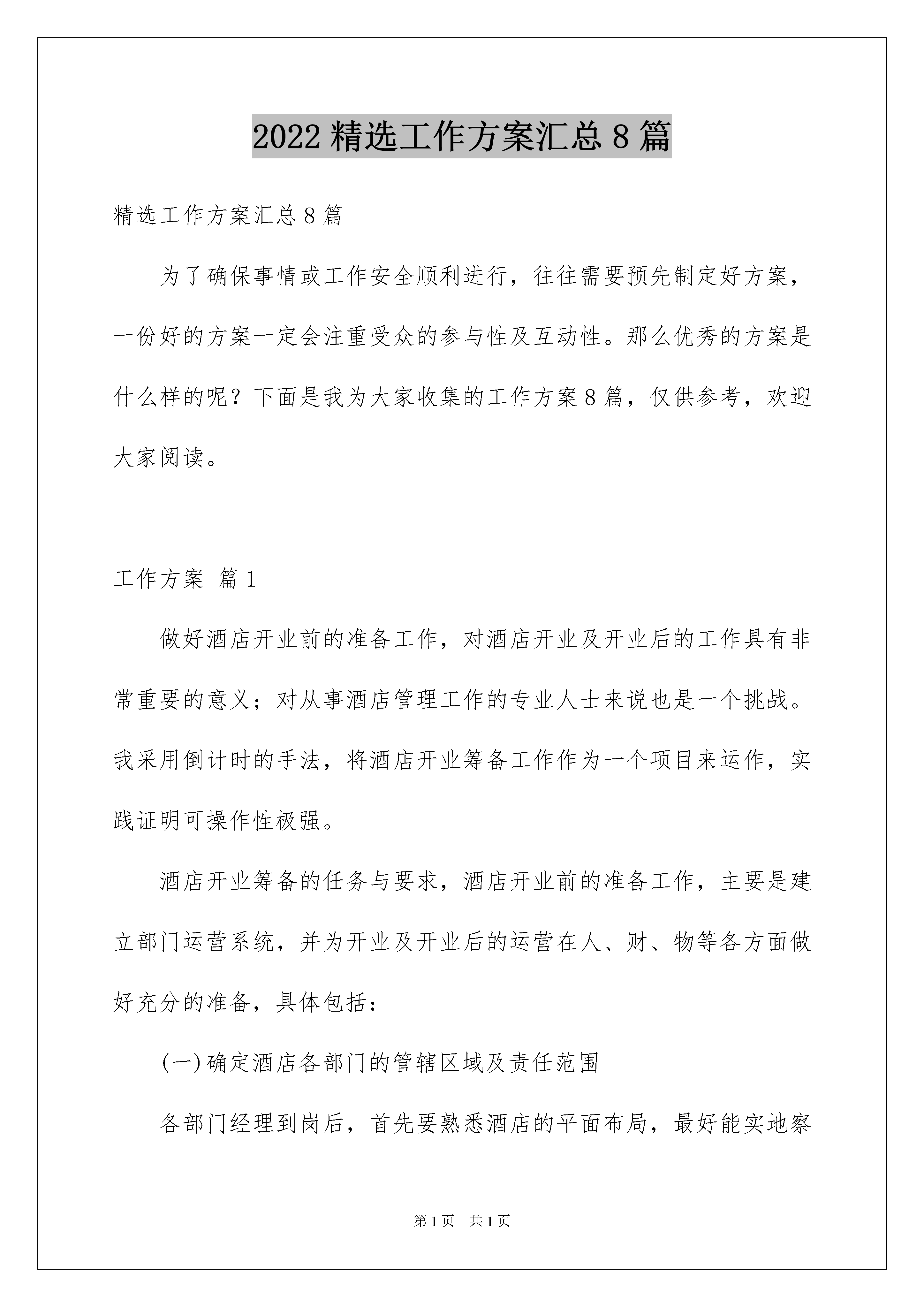 2022精选工作方案汇总8篇精选工作方案汇总8篇为了确保事情或工作安全顺利进行,往往需要预先制定好方案,一份好的方案一定会注重受众的参与性及互动性。那么优秀的方案是什么样的呢?下面是我为大家收集的工作方案8篇,仅供参考,欢迎大家阅读。工作方案篇1做好酒店开业前的准备工作,对酒店开业及开业后的工作具有非常重要的意义;对从事酒店管理工作的专业人士来说也是一个挑战。我采用倒计时的手法,将酒店开业筹备工作作为一个项目来运作,实践证明可操作性极强。酒店开业筹备的任务与要求,酒店开业前的准备工作,主要是建立部门运营系统,并为开业及开业后的运营在人、财、物等各方面做好充分的准备,具体包括:(一)确定酒店各部门的管辖区域及责任范围各部门经理到岗后,首先要熟悉酒店的平面布局,最好能实地察看。然后根据实际情况,确定酒店的管辖区域及各部门的主要责任范围,以书面的形式将具体的建议和设想呈报总经理。酒店最高管理层将召集有关部门对此进行讨论并做出决定。在进行区域及责任划分时,各部门管理人员应从大局出发,要有良好的服务意识。按专业化的分工要求,酒店的清洁工作最好归口管理。这有利于标准的统一、效率的提高、设备投入的减少、设备的维护和保养及人员的管理。职责的划分要明确,最好以书面的形式加以确定。(二)设计酒店各部门组织机构要科学、合理地设计组织机构,酒店各部门经理要综合考虑各种相关因素,如:饭店的规模、档次、建筑布局、设施设备、市场定位、经营方针和管理目标等。(三)制定物品采购清单饭店开业前事务繁多,经营物品的采购是一项非常耗费精力的工作,仅靠采购部去完成此项任务难度很大,各经营部门应协助其共同完成。无论是采购部还是酒店各部门,在制定酒店各部门采购清单时,都应考虑到以下一些问题:1.本酒店的建筑特点。采购的物品种类和数量与建筑的特点有着密切的关系。例如,客房楼层通常需配置工作车,但对于某些别墅式建筑的客房楼层,工作车就无法发挥作用;再者,某些清洁设备的配置数量,与楼层的客房数量直接相关,对于每层楼有18—20间左右客房的饭店,客房部经理就需决定每层楼的主要清洁设备是一套还是两套。此外,客房部某些设备用品的配置,还与客房部的劳动组织及相关业务量有关。再如餐饮部的收餐车,得考虑是否能够直到洗碗间。按摩床能否进按摩间的门口,等等2.行业标准。国家旅游局发布了“星级饭店客房用品质量与配备要求”的行业标准,它是客房部经理们制定采购清单的主要依据。3.本饭店的设计标准及目标市场定位。酒店管理人员应从本酒店的实际出发,根据设计的星级标准,参照国家行业标准制作清单,同时还应根据本酒店的目标市场定位情况,考虑目标客源市场对客房用品的需求,对就餐环境的偏爱,以及在消费时的一些行为习惯。4.行业发展趋势。酒店管理人员应密切关注本行业的发展趋势,在物品配备方面应有一定的超前意识,不能过于传统和保守。例如,饭店根据客人的需要在客房内适当减少不必要的客用物品就是一种有益的尝试。餐饮部减少象金色,大红色的餐具与布置,增加一些淡雅的安排等等。5.其它情况。在制定物资采购清单时,有关部门和人员还应考虑其它相关因素,如:出租率、饭店的资金状况等。采购清单的设计必须规范,通常应包括下列栏目:部门、编号、物品名称、规格、单位、数量、参考供货单位、备注等。此外,部门在制定采购清单的同时,就需确定有关物品的配备标准。(四)协助采购酒店各部门经理虽然不直接承担采购任务,但这项工作对各部的开业及开业后的运营工作影响较大,因此,酒店各部门经理应密切关注并适当参与采购工作。这不仅可以减轻采购部经理的负担,而且还能在很大程度上确保所购物品符合要求。酒店各部门经理要定期对照采购清单,检查各项物品的到位情况,而且检查的频率,应随着开业的临近而逐渐增高。(五)参与或负责制服的设计与制作酒店各部门参与制服的设计与制作,是饭店行业的惯例,同时,特别指出因为客房部负责制服的洗涤、保管和补充,客房部管理人员在制服的款式和面料的选择方面,往往有其独到的鉴赏能力。(六)编写酒店各部工作手册工作手册,是部门的丁作指南,也是部门员工培训和考核的依据。一般来说,工作手册应包括岗位职责、工作程序、规章制度及运转表格等部分。(七)参与员工的招聘与培训酒店各部门的员工招聘与培训,需由人事部和酒店各部门经理共同负责。在员工招聘过程中,人事部根据酒店工作的一般要求,对应聘者进行初步筛选,而酒店各部门经理则负责把好录取关。培训是部门开业前的一项主要任务,酒店各部门经理需从本饭店的实际出发,制定切实可行的部门培训计划,选择和培训部门培训员,指导其编写具体的授课计划,督导培训计划的实施,并确保培训