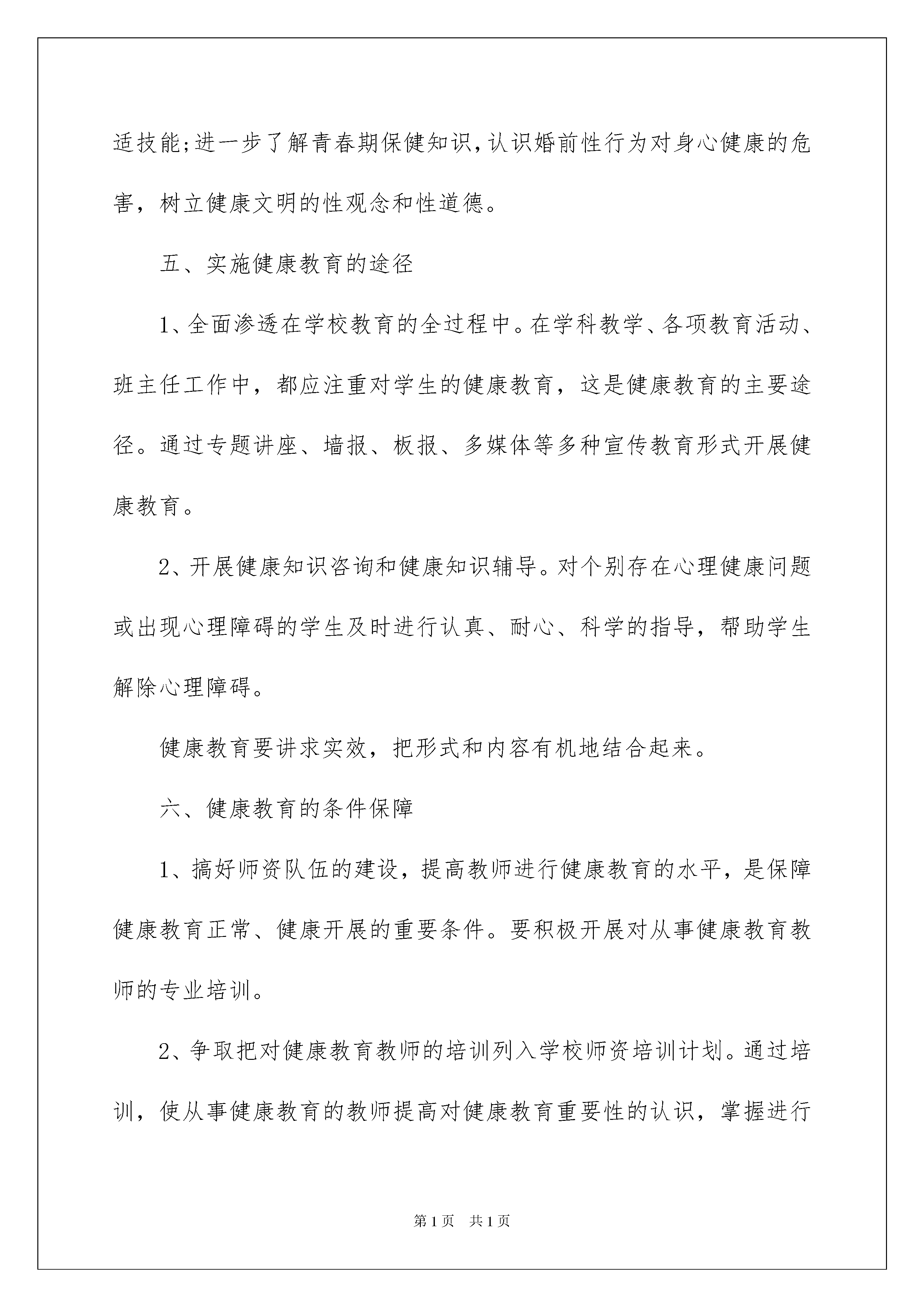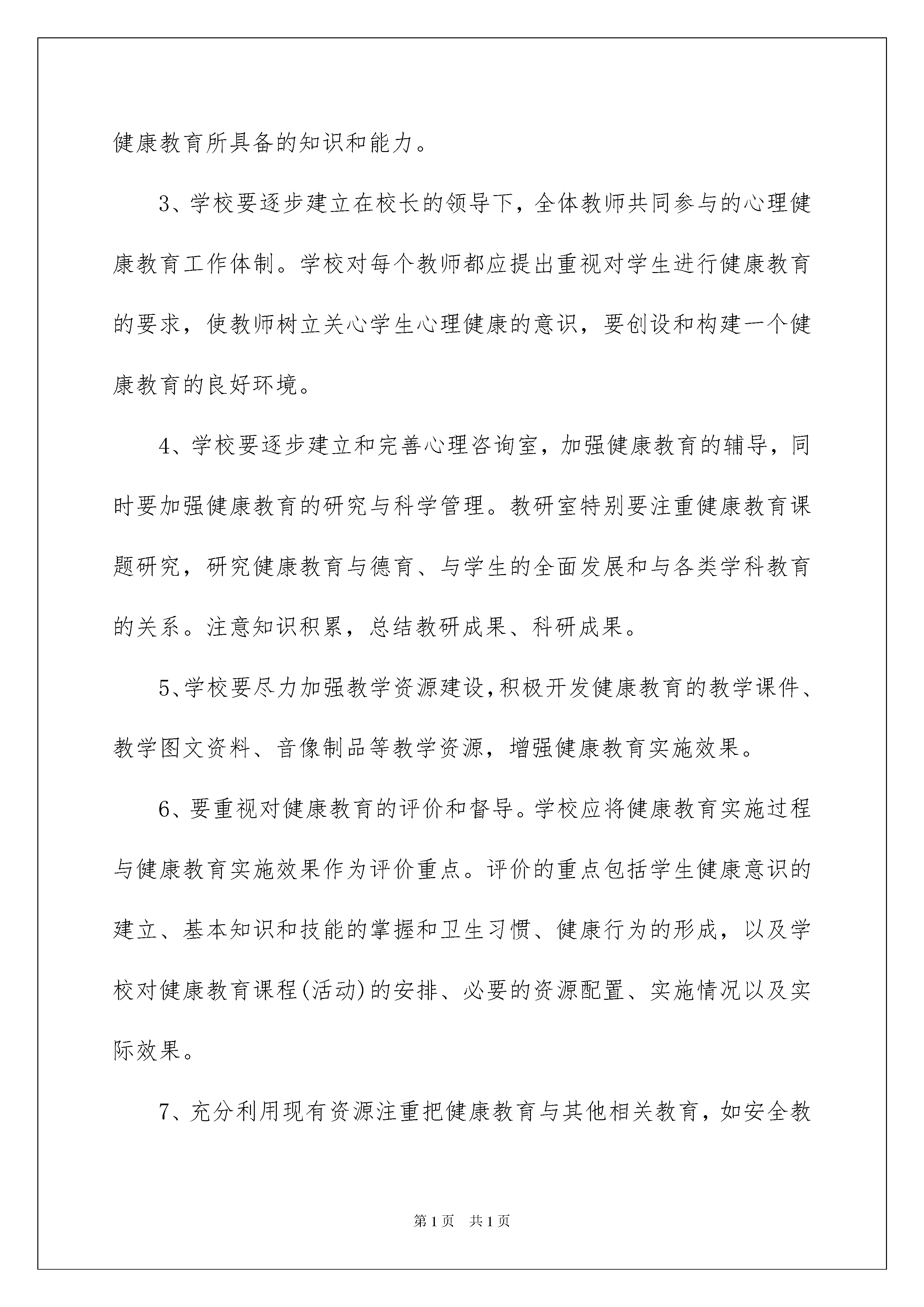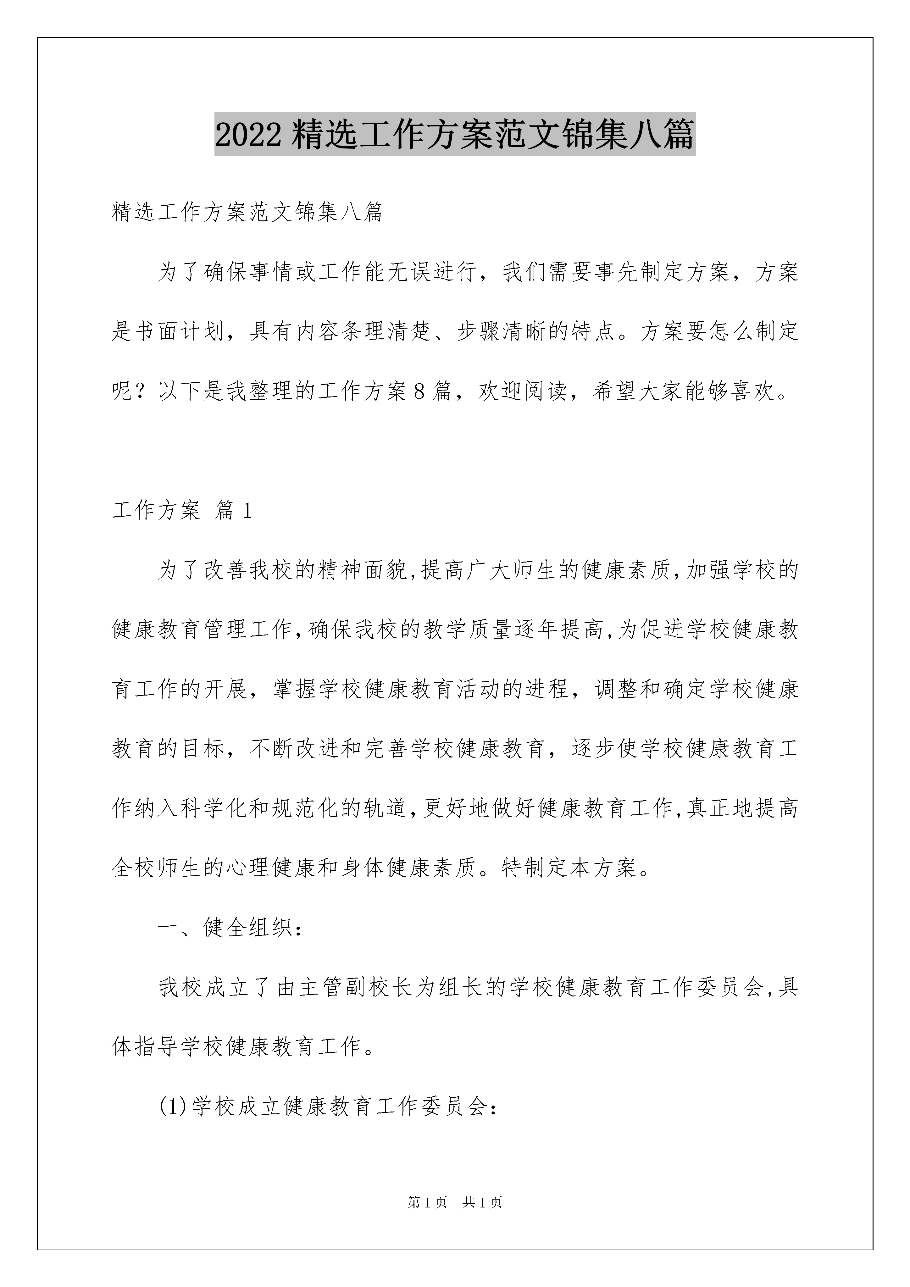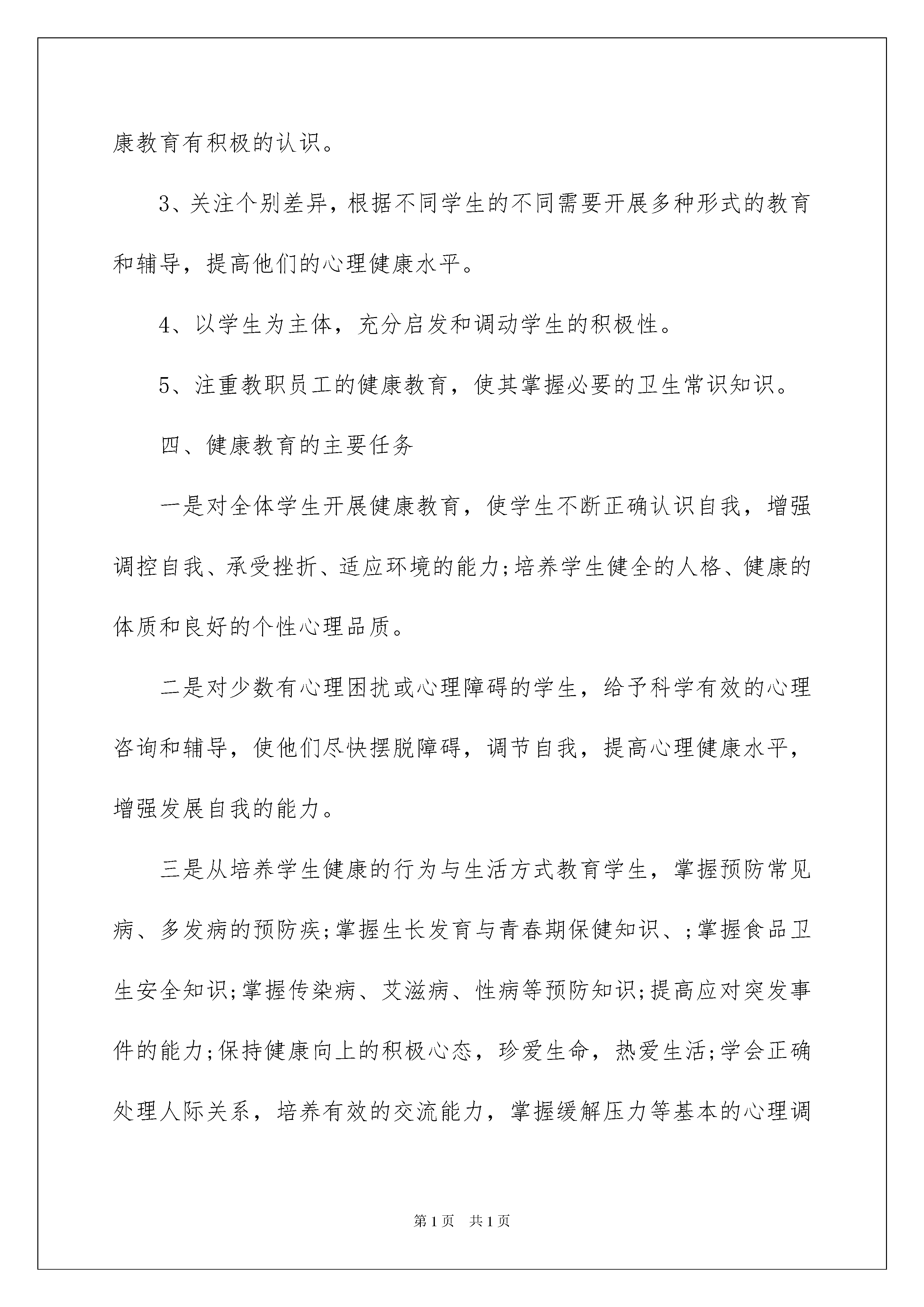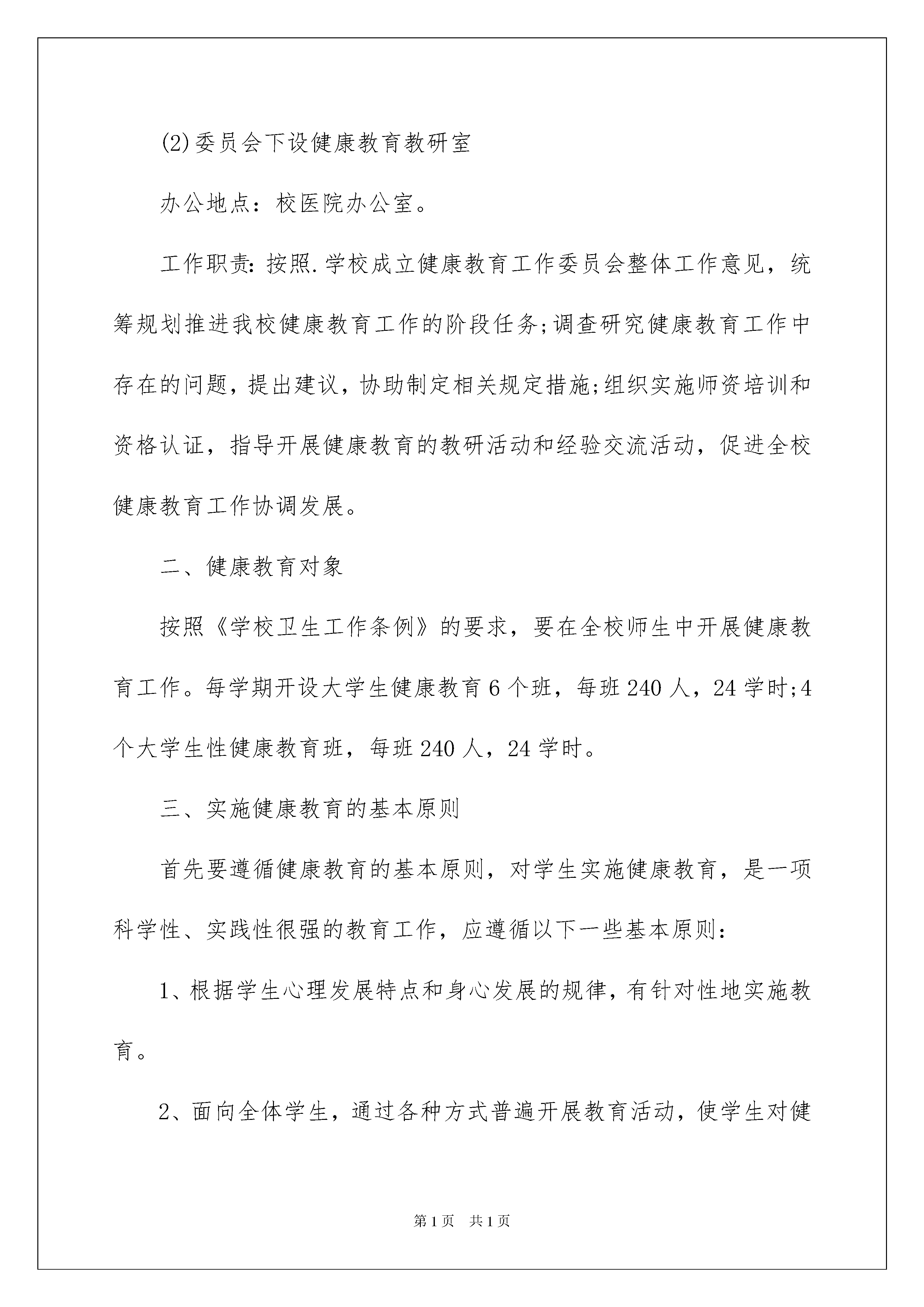 2022精选工作方案范文锦集八篇精选工作方案范文锦集八篇为了确保事情或工作能无误进行,我们需要事先制定方案,方案是书面计划,具有内容条理清楚、步骤清晰的特点。方案要怎么制定呢?以下是我整理的工作方案8篇,欢迎阅读,希望大家能够喜欢。工作方案篇1为了改善我校的精神面貌,提高广大师生的健康素质,加强学校的健康教育管理工作,确保我校的教学质量逐年提高,为促进学校健康教育工作的开展,掌握学校健康教育活动的进程,调整和确定学校健康教育的目标,不断改进和完善学校健康教育,逐步使学校健康教育工作纳入科学化和规范化的轨道,更好地做好健康教育工作,真正地提高全校师生的心理健康和身体健康素质。特制定本方案。一、健全组织:我校成立了由主管副校长为组长的学校健康教育工作委员会,具体指导学校健康教育工作。(1)学校成立健康教育工作委员会:(2)委员会下设健康教育教研室办公地点:校医院办公室。工作职责:按照.学校成立健康教育工作委员会整体工作意见,统筹规划推进我校健康教育工作的阶段任务;调查研究健康教育工作中存在的问题,提出建议,协助制定相关规定措施;组织实施师资培训和资格认证,指导开展健康教育的教研活动和经验交流活动,促进全校健康教育工作协调发展。二、健康教育对象按照《学校卫生工作条例》的要求,要在全校师生中开展健康教育工作。每学期开设大学生健康教育6个班,每班240人,24学时;4个大学生性健康教育班,每班240人,24学时。三、实施健康教育的基本原则首先要遵循健康教育的基本原则,对学生实施健康教育,是一项科学性、实践性很强的教育工作,应遵循以下一些基本原则:1、根据学生心理发展特点和身心发展的规律,有针对性地实施教育。2、面向全体学生,通过各种方式普遍开展教育活动,使学生对健康教育有积极的认识。3、关注个别差异,根据不同学生的不同需要开展多种形式的教育和辅导,提高他们的心理健康水平。4、以学生为主体,充分启发和调动学生的积极性。5、注重教职员工的健康教育,使其掌握必要的卫生常识知识。四、健康教育的主要任务一是对全体学生开展健康教育,使学生不断正确认识自我,增强调控自我、承受挫折、适应环境的能力;培养学生健全的人格、健康的体质和良好的个性心理品质。二是对少数有心理困扰或心理障碍的学生,给予科学有效的心理咨询和辅导,使他们尽快摆脱障碍,调节自我,提高心理健康水平,增强发展自我的能力。三是从培养学生健康的行为与生活方式教育学生,掌握预防常见病、多发病的预防疾;掌握生长发育与青春期保健知识、;掌握食品卫生安全知识;掌握传染病、艾滋病、性病等预防知识;提高应对突发事件的能力;保持健康向上的积极心态,珍爱生命,热爱生活;学会正确处理人际关系,培养有效的交流能力,掌握缓解压力等基本的心理调适技能;进一步了解青春期保健知识,认识婚前性行为对身心健康的危害,树立健康文明的性观念和性道德。五、实施健康教育的途径1、全面渗透在学校教育的全过程中。在学科教学、各项教育活动、班主任工作中,都应注重对学生的健康教育,这是健康教育的主要途径。通过专题讲座、墙报、板报、多媒体等多种宣传教育形式开展健康教育。2、开展健康知识咨询和健康知识辅导。对个别存在心理健康问题或出现心理障碍的学生及时进行认真、耐心、科学的指导,帮助学生解除心理障碍。健康教育要讲求实效,把形式和内容有机地结合起来。六、健康教育的条件保障1、搞好师资队伍的建设,提高教师进行健康教育的水平,是保障健康教育正常、健康开展的重要条件。要积极开展对从事健康教育教师的专业培训。2、争取把对健康教育教师的培训列入学校师资培训计划。通过培训,使从事健康教育的教师提高对健康教育重要性的认识,掌握进行健康教育所具备的知识和能力。3、学校要逐步建立在校长的领导下,全体教师共同参与的心理健康教育工作体制。学校对每个教师都应提出重视对学生进行健康教育的要求,使教师树立关心学生心理健康的意识,要创设和构建一个健康教育的良好环境。4、学校要逐步建立和完善心理咨询室,加强健康教育的辅导,同时要加强健康教育的研究与科学管理。教研室特别要注重健康教育课题研究,研究健康教育与德育、与学生的全面发展和与各类学科教育的关系。注意知识积累,总结教研成果、科研成果。5、学校要尽力加强教学资源建设,积极开发健康教育的教学课件、教学图文资料、音像制品等教学资源,增强健康教育实施效果。6、要重视对健康教育的评价和督导。学校应将健康教育实施过程与健康教育实施效果作为评价重点。评价的重点包括学生健康意识的建立、基本知识和技能的掌握和卫生习惯、健康行为的形成,以及学校对健康教育课程(活动)的安排、必要的资源配置、