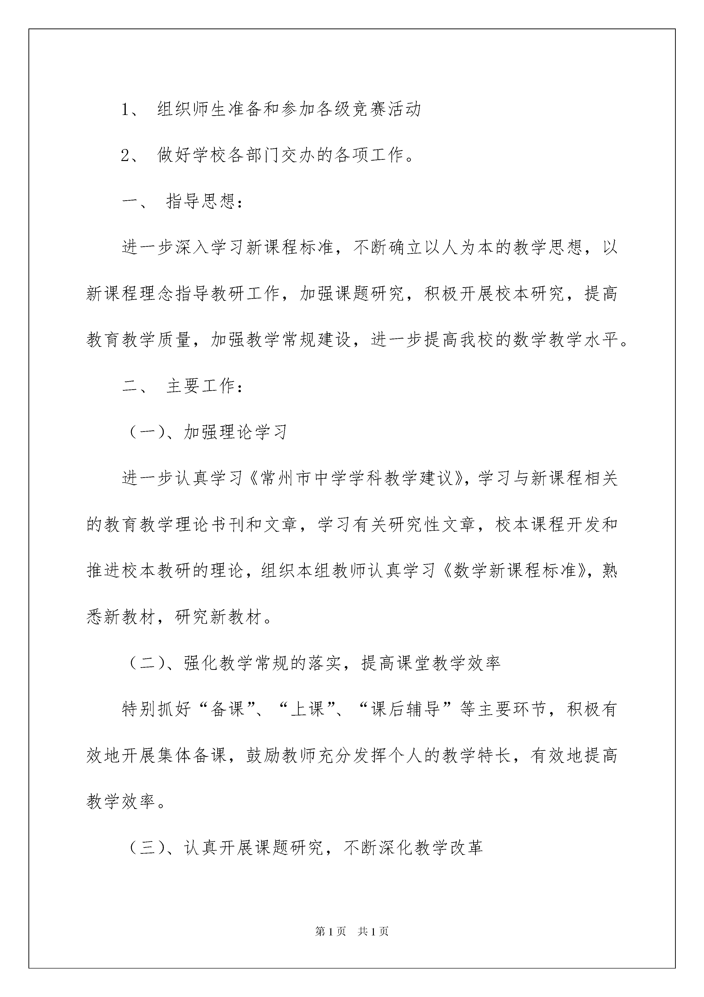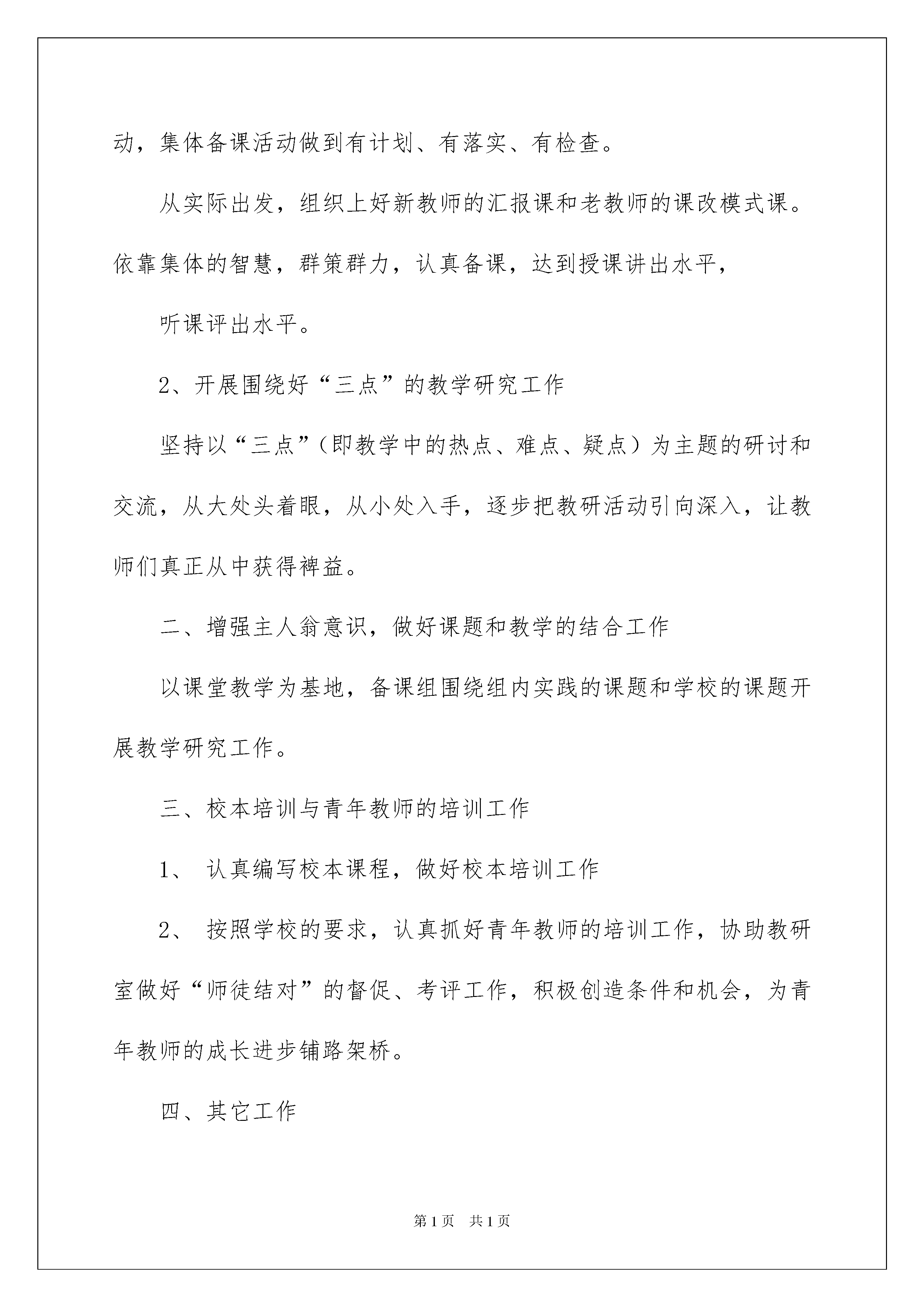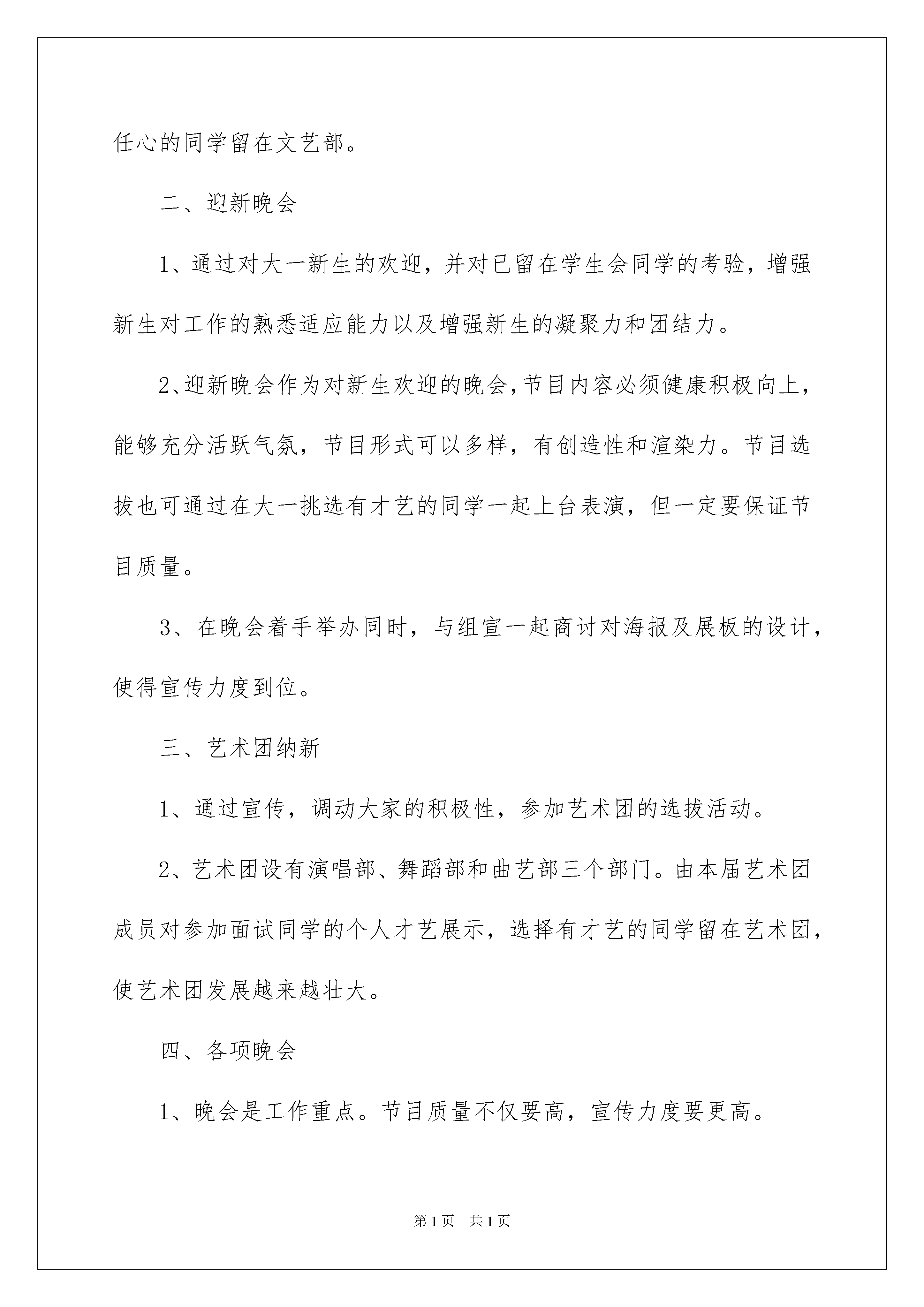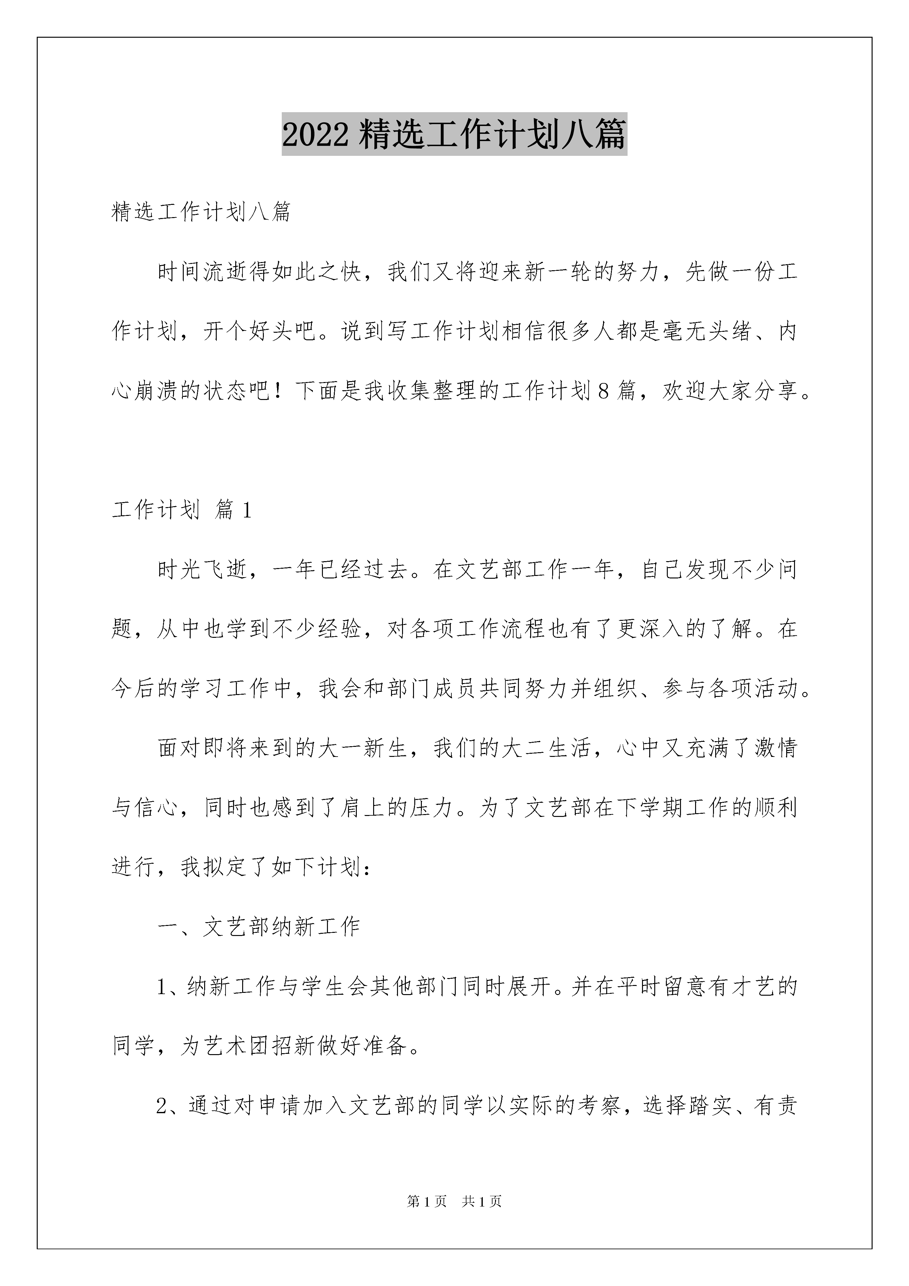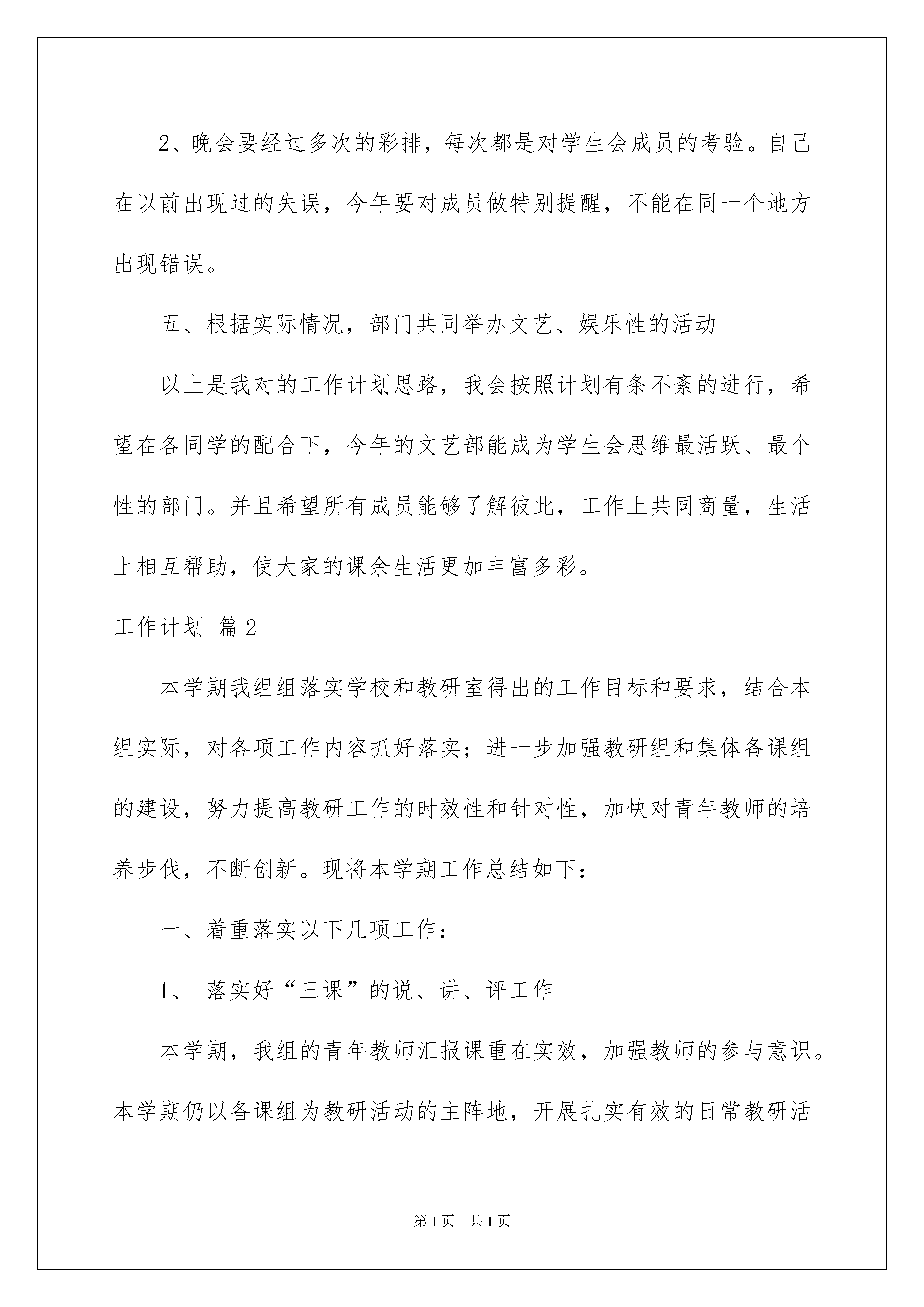 2022精选工作计划八篇精选工作计划八篇时间流逝得如此之快,我们又将迎来新一轮的努力,先做一份工作计划,开个好头吧。说到写工作计划相信很多人都是毫无头绪、内心崩溃的状态吧!下面是我收集整理的工作计划8篇,欢迎大家分享。工作计划篇1时光飞逝,一年已经过去。在文艺部工作一年,自己发现不少问题,从中也学到不少经验,对各项工作流程也有了更深入的了解。在今后的学习工作中,我会和部门成员共同努力并组织、参与各项活动。面对即将来到的大一新生,我们的大二生活,心中又充满了激情与信心,同时也感到了肩上的压力。为了文艺部在下学期工作的顺利进行,我拟定了如下计划:一、文艺部纳新工作1、纳新工作与学生会其他部门同时展开。并在平时留意有才艺的同学,为艺术团招新做好准备。2、通过对申请加入文艺部的同学以实际的考察,选择踏实、有责任心的同学留在文艺部。二、迎新晚会1、通过对大一新生的欢迎,并对已留在学生会同学的考验,增强新生对工作的熟悉适应能力以及增强新生的凝聚力和团结力。2、迎新晚会作为对新生欢迎的晚会,节目内容必须健康积极向上,能够充分活跃气氛,节目形式可以多样,有创造性和渲染力。节目选拔也可通过在大一挑选有才艺的同学一起上台表演,但一定要保证节目质量。3、在晚会着手举办同时,与组宣一起商讨对海报及展板的设计,使得宣传力度到位。三、艺术团纳新1、通过宣传,调动大家的积极性,参加艺术团的选拔活动。2、艺术团设有演唱部、舞蹈部和曲艺部三个部门。由本届艺术团成员对参加面试同学的个人才艺展示,选择有才艺的同学留在艺术团,使艺术团发展越来越壮大。四、各项晚会1、晚会是工作重点。节目质量不仅要高,宣传力度要更高。2、晚会要经过多次的彩排,每次都是对学生会成员的考验。自己在以前出现过的失误,今年要对成员做特别提醒,不能在同一个地方出现错误。五、根据实际情况,部门共同举办文艺、娱乐性的活动以上是我对的工作计划思路,我会按照计划有条不紊的进行,希望在各同学的配合下,今年的文艺部能成为学生会思维最活跃、最个性的部门。并且希望所有成员能够了解彼此,工作上共同商量,生活上相互帮助,使大家的课余生活更加丰富多彩。工作计划篇2本学期我组组落实学校和教研室得出的工作目标和要求,结合本组实际,对各项工作内容抓好落实;进一步加强教研组和集体备课组的建设,努力提高教研工作的时效性和针对性,加快对青年教师的培养步伐,不断创新。现将本学期工作总结如下:一、着重落实以下几项工作:1、落实好“三课”的说、讲、评工作本学期,我组的青年教师汇报课重在实效,加强教师的参与意识。本学期仍以备课组为教研活动的主阵地,开展扎实有效的日常教研活动,集体备课活动做到有计划、有落实、有检查。从实际出发,组织上好新教师的汇报课和老教师的课改模式课。依靠集体的智慧,群策群力,认真备课,达到授课讲出水平,听课评出水平。2、开展围绕好“三点”的教学研究工作坚持以“三点”(即教学中的热点、难点、疑点)为主题的研讨和交流,从大处头着眼,从小处入手,逐步把教研活动引向深入,让教师们真正从中获得裨益。二、增强主人翁意识,做好课题和教学的结合工作以课堂教学为基地,备课组围绕组内实践的课题和学校的课题开展教学研究工作。三、校本培训与青年教师的培训工作1、认真编写校本课程,做好校本培训工作2、按照学校的要求,认真抓好青年教师的培训工作,协助教研室做好“师徒结对”的督促、考评工作,积极创造条件和机会,为青年教师的成长进步铺路架桥。四、其它工作1、组织师生准备和参加各级竞赛活动2、做好学校各部门交办的各项工作。一、指导思想:进一步深入学习新课程标准,不断确立以人为本的教学思想,以新课程理念指导教研工作,加强课题研究,积极开展校本研究,提高教育教学质量,加强教学常规建设,进一步提高我校的数学教学水平。二、主要工作:(一)、加强理论学习进一步认真学习《常州市中学学科教学建议》,学习与新课程相关的教育教学理论书刊和文章,学习有关研究性文章,校本课程开发和推进校本教研的理论,组织本组教师认真学习《数学新课程标准》,熟悉新教材,研究新教材。(二)、强化教学常规的落实,提高课堂教学效率特别抓好“备课”、“上课”、“课后辅导”等主要环节,积极有效地开展集体备课,鼓励教师充分发挥个人的教学特长,有效地提高教学效率。(三)、认真开展课题研究,不断深化教学改革重点抓好数学教学的研究,协助学校搞好课题研究活动。(四)、认真抓好毕业班和非毕业班工作认真做好中考试卷分析工作,回顾总结上届初三毕业班复习教学中的得失,根据新一届毕业班学生的现状,制订切实可行的教学复习计划,认真做好新教材的分析、研究和教学研讨活动