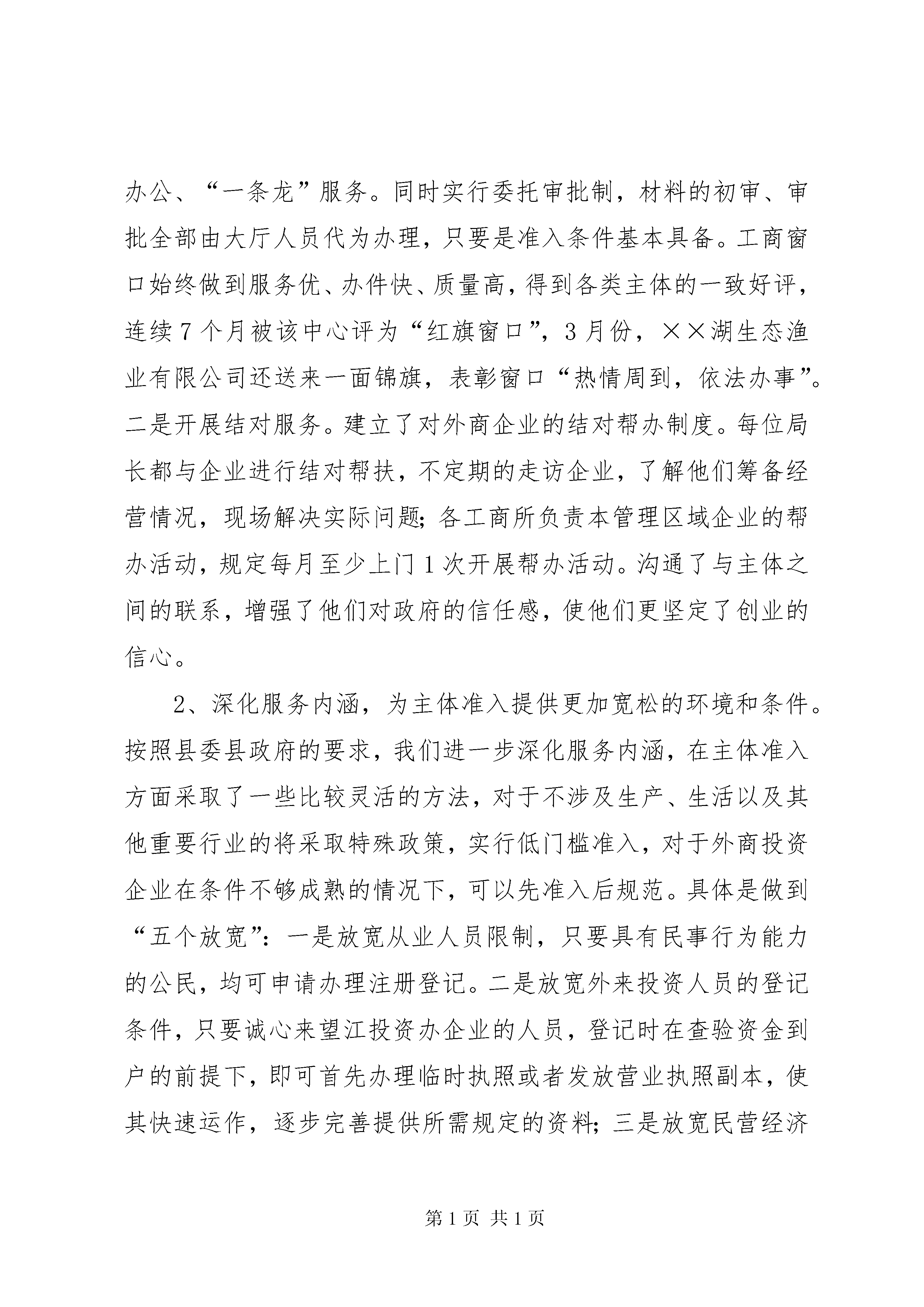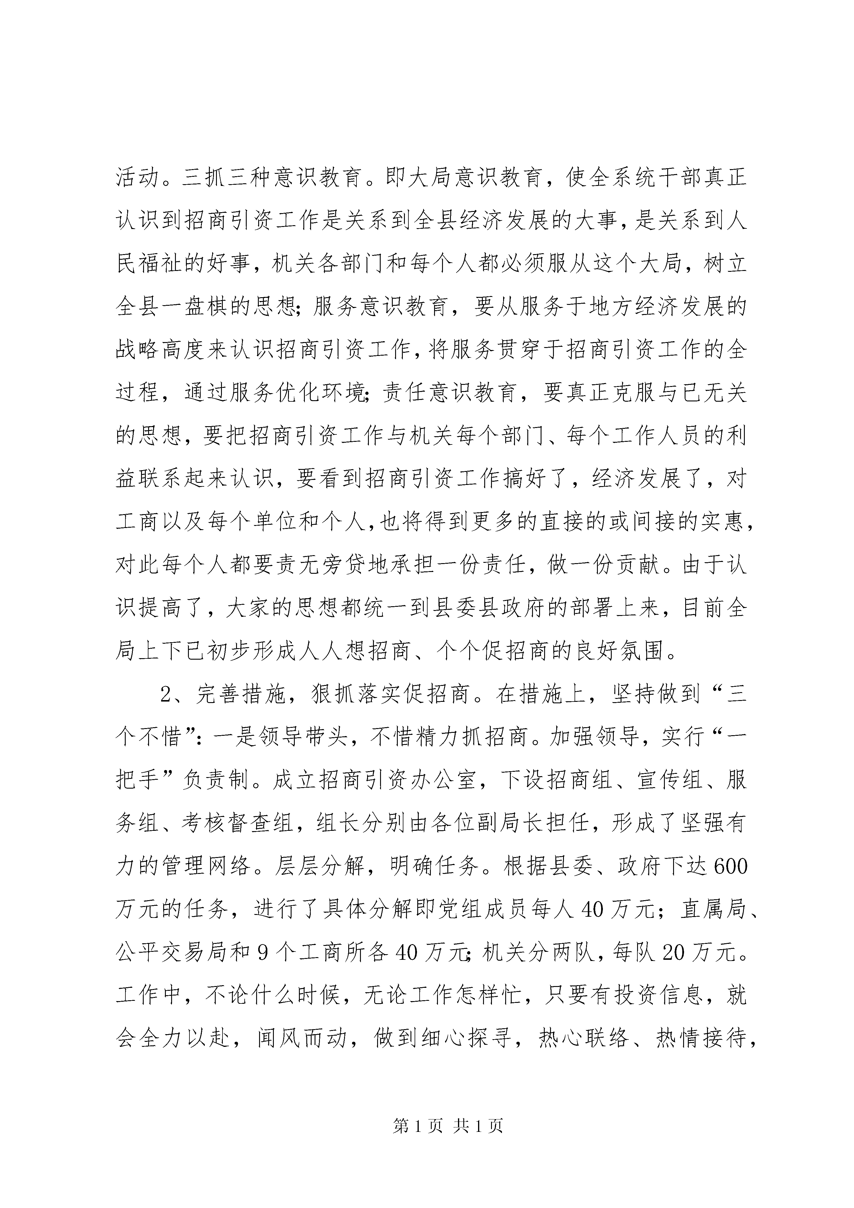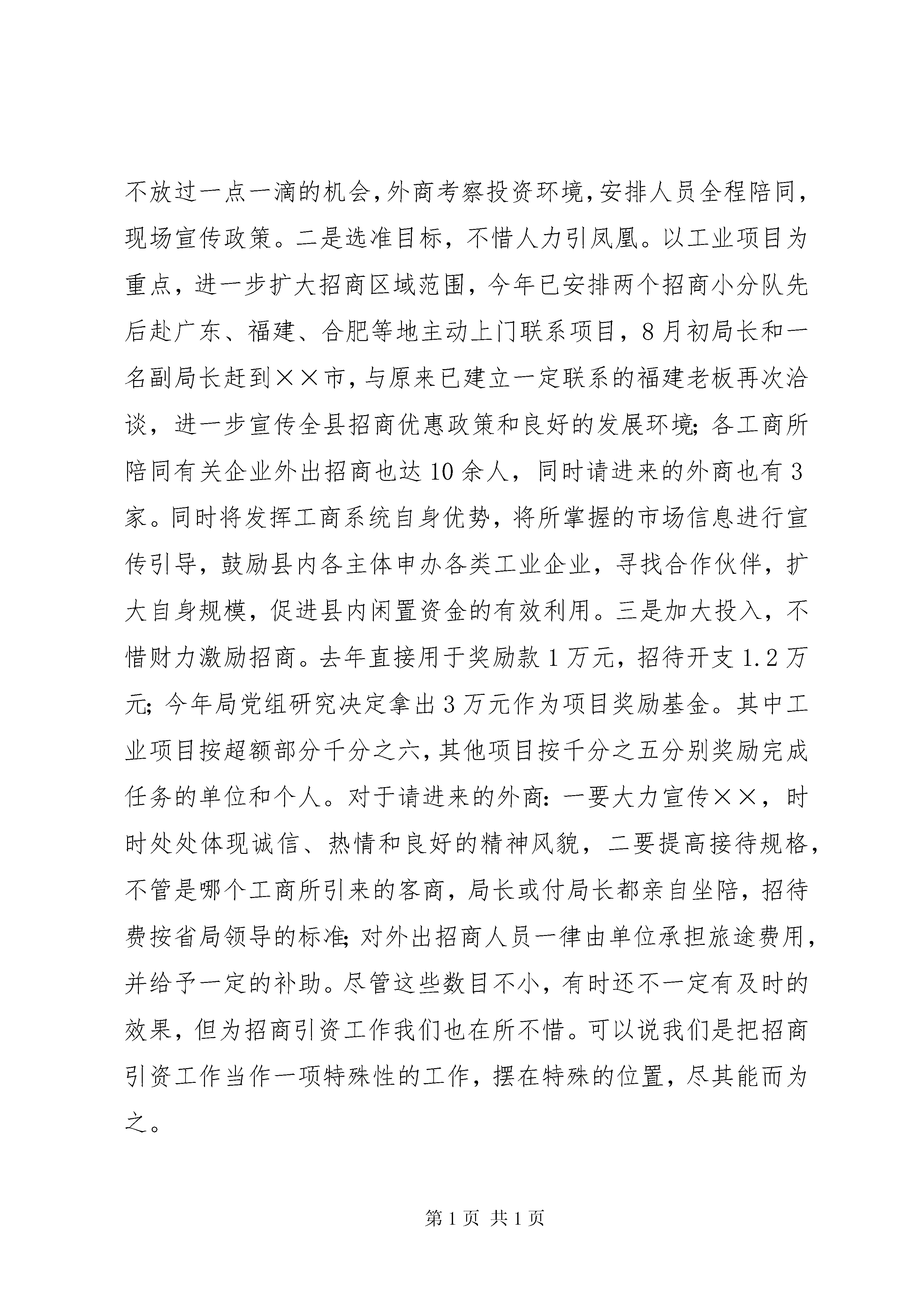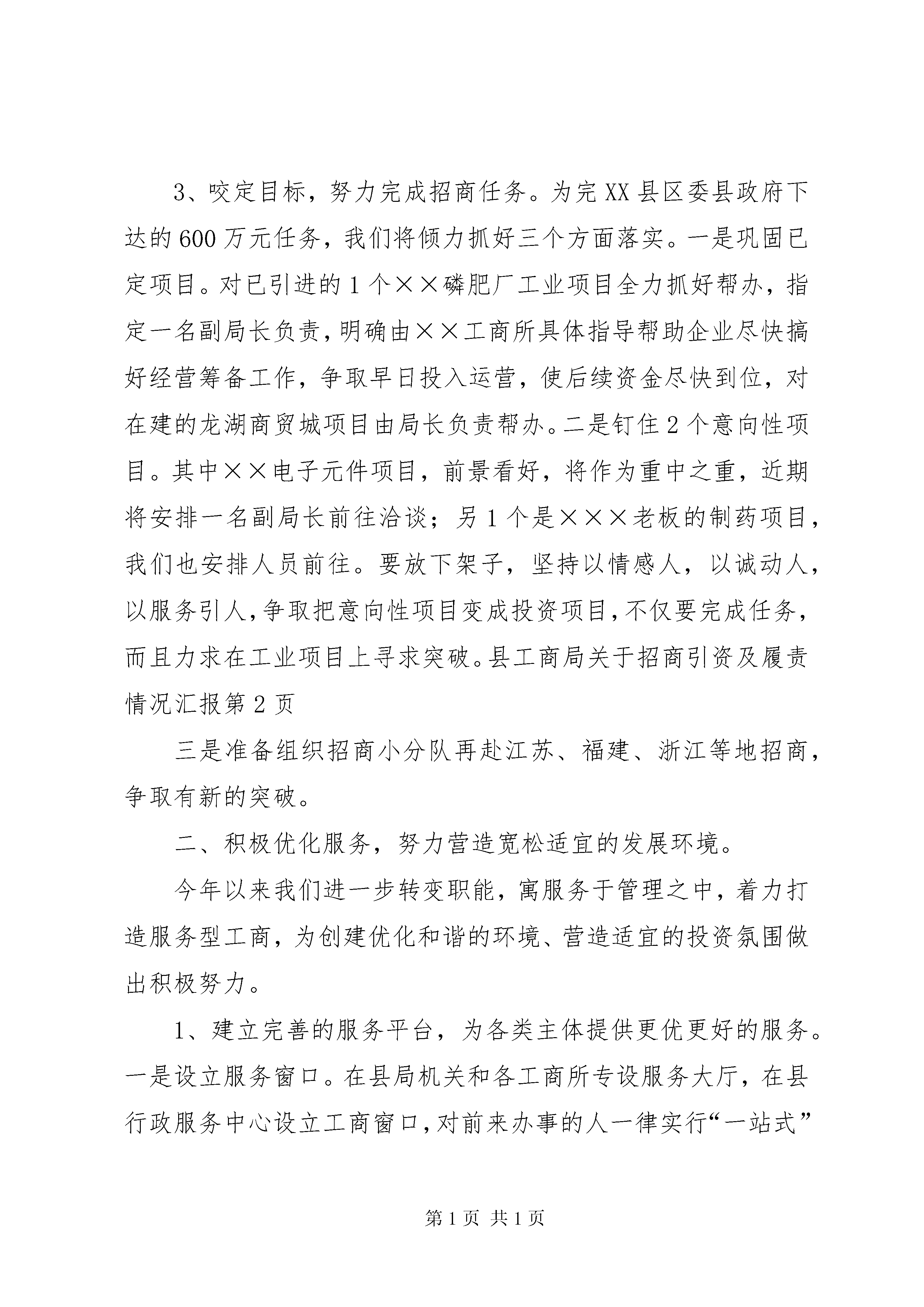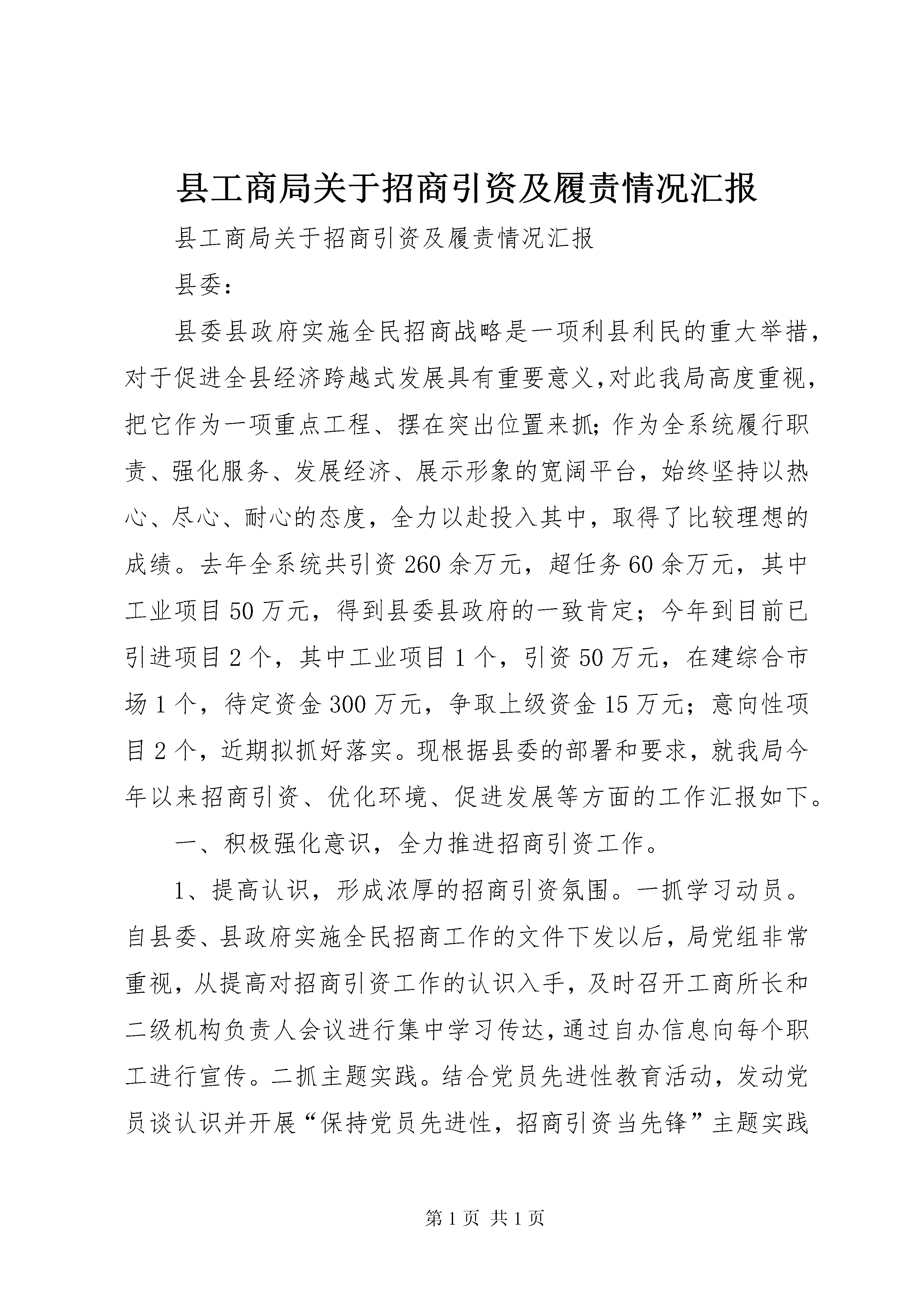 县工商局关于招商引资及履责情况汇报县工商局关于招商引资及履责情况汇报县委:县委县政府实施全民招商战略是一项利县利民的重大举措,对于促进全县经济跨越式发展具有重要意义,对此我局高度重视,把它作为一项重点工程、摆在突出位置来抓;作为全系统履行职责、强化服务、发展经济、展示形象的宽阔平台,始终坚持以热心、尽心、耐心的态度,全力以赴投入其中,取得了比较理想的成绩。去年全系统共引资260余万元,超任务60余万元,其中工业项目50万元,得到县委县政府的一致肯定;今年到目前已引进项目2个,其中工业项目1个,引资50万元,在建综合市场1个,待定资金300万元,争取上级资金15万元;意向性项目2个,近期拟抓好落实。现根据县委的部署和要求,就我局今年以来招商引资、优化环境、促进发展等方面的工作汇报如下。一、积极强化意识,全力推进招商引资工作。1、提高认识,形成浓厚的招商引资氛围。一抓学习动员。自县委、县政府实施全民招商工作的文件下发以后,局党组非常重视,从提高对招商引资工作的认识入手,及时召开工商所长和二级机构负责人会议进行集中学习传达,通过自办信息向每个职工进行宣传。二抓主题实践。结合党员先进性教育活动,发动党员谈认识并开展“保持党员先进性,招商引资当先锋”主题实践活动。三抓三种意识教育。即大局意识教育,使全系统干部真正认识到招商引资工作是关系到全县经济发展的大事,是关系到人民福祉的好事,机关各部门和每个人都必须服从这个大局,树立全县一盘棋的思想;服务意识教育,要从服务于地方经济发展的战略高度来认识招商引资工作,将服务贯穿于招商引资工作的全过程,通过服务优化环境;责任意识教育,要真正克服与已无关的思想,要把招商引资工作与机关每个部门、每个工作人员的利益联系起来认识,要看到招商引资工作搞好了,经济发展了,对工商以及每个单位和个人,也将得到更多的直接的或间接的实惠,对此每个人都要责无旁贷地承担一份责任,做一份贡献。由于认识提高了,大家的思想都统一到县委县政府的部署上来,目前全局上下已初步形成人人想招商、个个促招商的良好氛围。2、完善措施,狠抓落实促招商。在措施上,坚持做到“三个不惜”:一是领导带头,不惜精力抓招商。加强领导,实行“一把手”负责制。成立招商引资办公室,下设招商组、宣传组、服务组、考核督查组,组长分别由各位副局长担任,形成了坚强有力的管理网络。层层分解,明确任务。根据县委、政府下达600万元的任务,进行了具体分解即党组成员每人40万元;直属局、公平交易局和9个工商所各40万元;机关分两队,每队20万元。工作中,不论什么时候,无论工作怎样忙,只要有投资信息,就会全力以赴,闻风而动,做到细心探寻,热心联络、热情接待,不放过一点一滴的机会,外商考察投资环境,安排人员全程陪同,现场宣传政策。二是选准目标,不惜人力引凤凰。以工业项目为重点,进一步扩大招商区域范围,今年已安排两个招商小分队先后赴广东、福建、合肥等地主动上门联系项目,8月初局长和一名副局长赶到××市,与原来已建立一定联系的福建老板再次洽谈,进一步宣传全县招商优惠政策和良好的发展环境;各工商所陪同有关企业外出招商也达10余人,同时请进来的外商也有3家。同时将发挥工商系统自身优势,将所掌握的市场信息进行宣传引导,鼓励县内各主体申办各类工业企业,寻找合作伙伴,扩大自身规模,促进县内闲置资金的有效利用。三是加大投入,不惜财力激励招商。去年直接用于奖励款1万元,招待开支1.2万元;今年局党组研究决定拿出3万元作为项目奖励基金。其中工业项目按超额部分千分之六,其他项目按千分之五分别奖励完成任务的单位和个人。对于请进来的外商:一要大力宣传××,时时处处体现诚信、热情和良好的精神风貌,二要提高接待规格,不管是哪个工商所引来的客商,局长或付局长都亲自坐陪,招待费按省局领导的标准;对外出招商人员一律由单位承担旅途费用,并给予一定的补助。尽管这些数目不小,有时还不一定有及时的效果,但为招商引资工作我们也在所不惜。可以说我们是把招商引资工作当作一项特殊性的工作,摆在特殊的位置,尽其能而为之。3、咬定目标,努力完成招商任务。为完XX县区委县政府下达的600万元任务,我们将倾力抓好三个方面落实。一是巩固已定项目。对已引进的1个××磷肥厂工业项目全力抓好帮办,指定一名副局长负责,明确由××工商所具体指导帮助企业尽快搞好经营筹备工作,争取早日投入运营,使后续资金尽快到位,对在建的龙湖商贸城项目由局长负责帮办。二是钉住2个意向性项目。其中××电子元件项目,前景看好,将作为重中之重,近期将安排一名副局长前往洽谈;另1个是×××老板的制药项目,我们也安排人员前往。要放下架子,坚持以情感人,以诚动人,以服务引人,争取把意向性项目变成投资项目,不仅要完成任务,而且力求在工业项目上寻求突破。县工商局关
