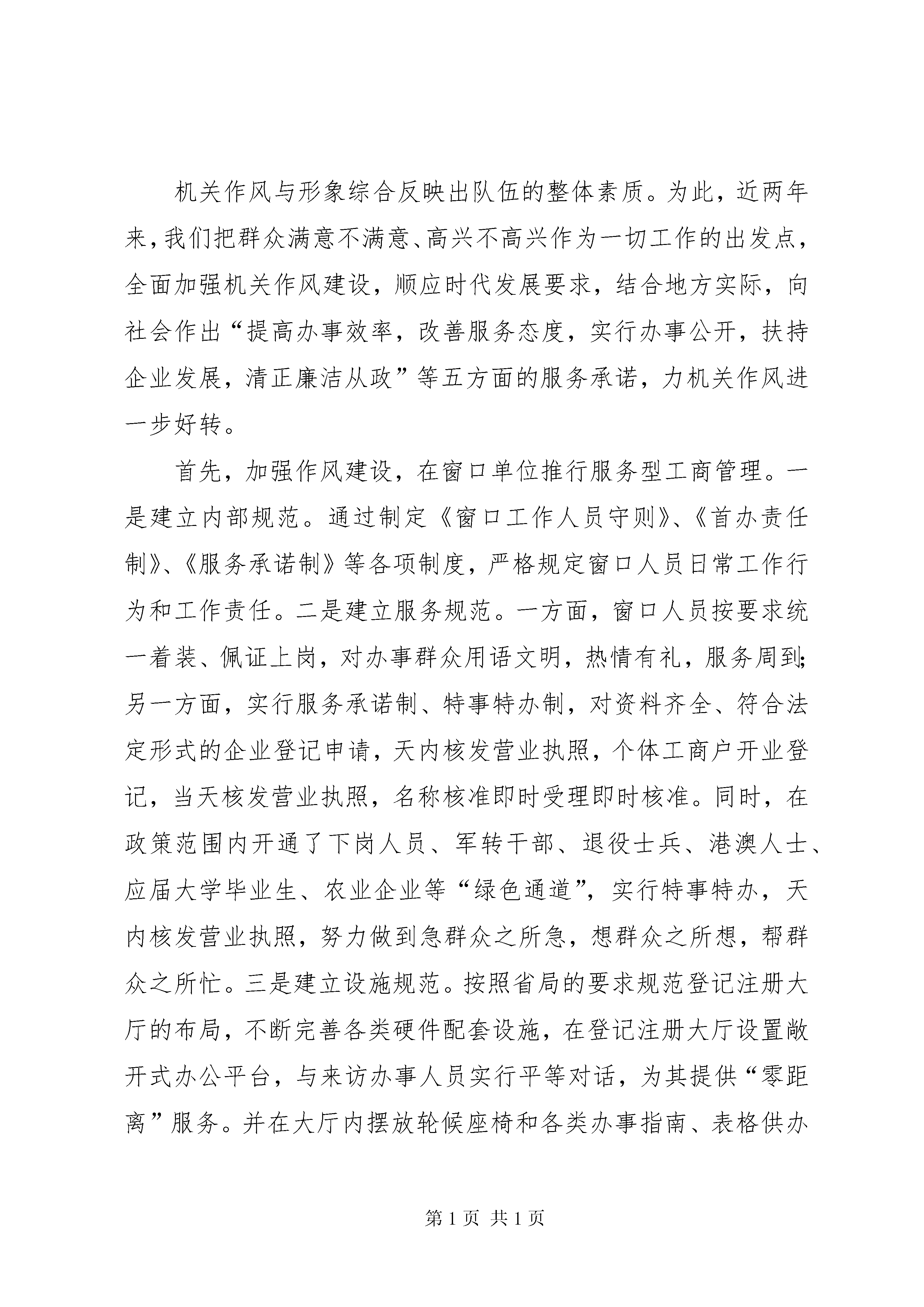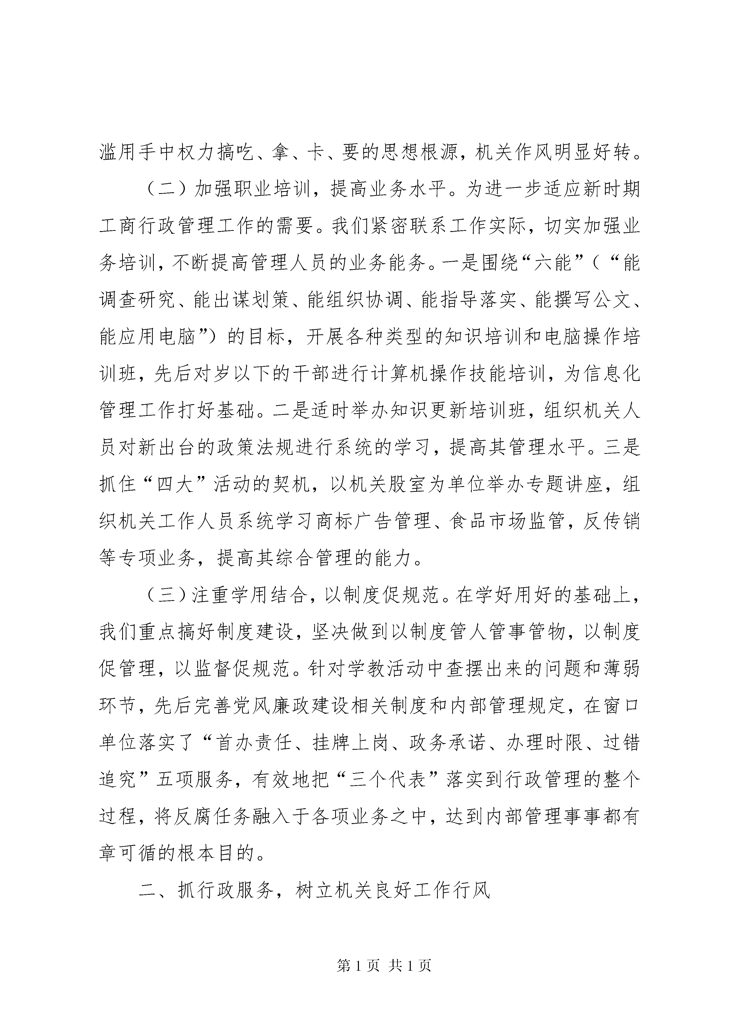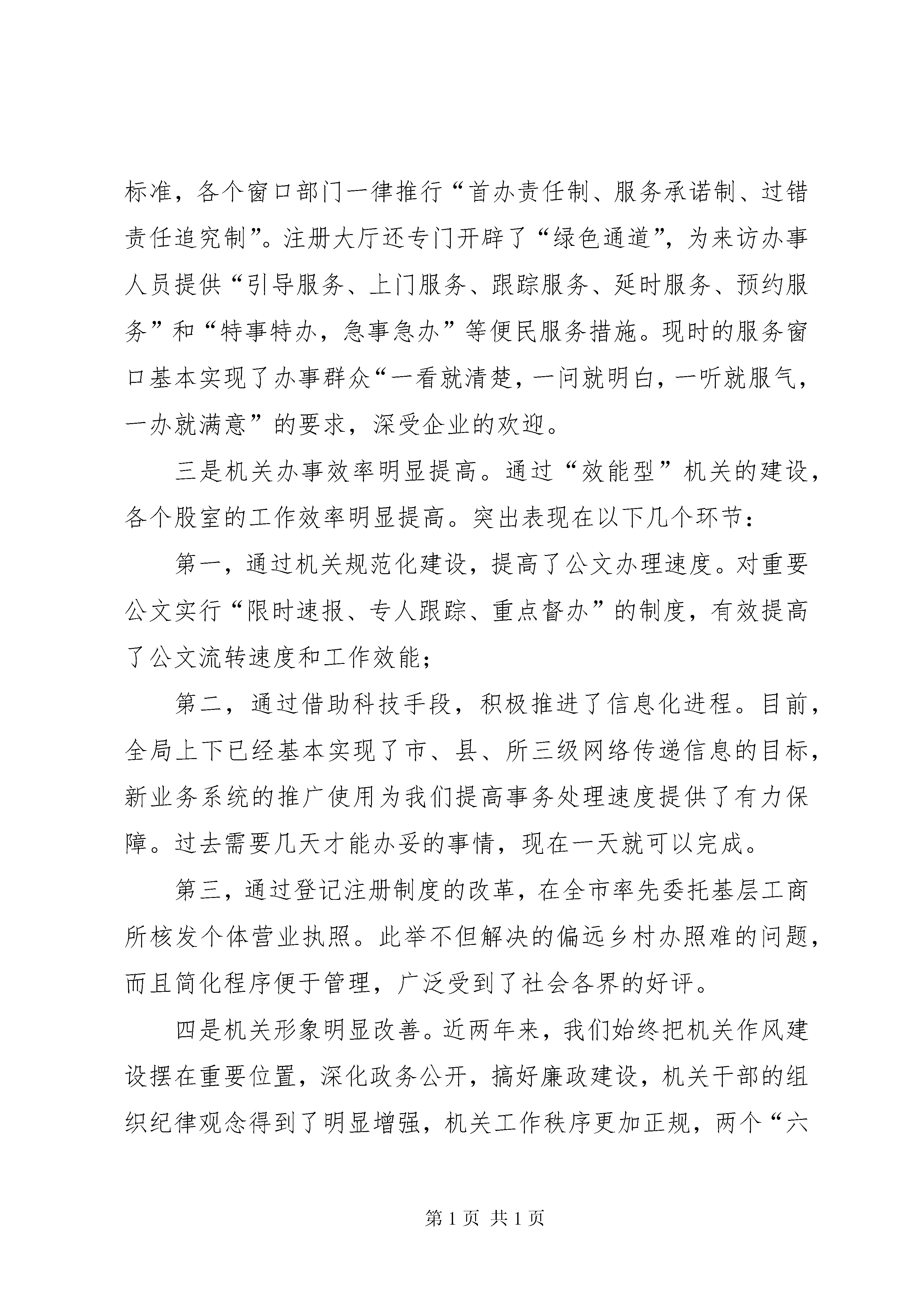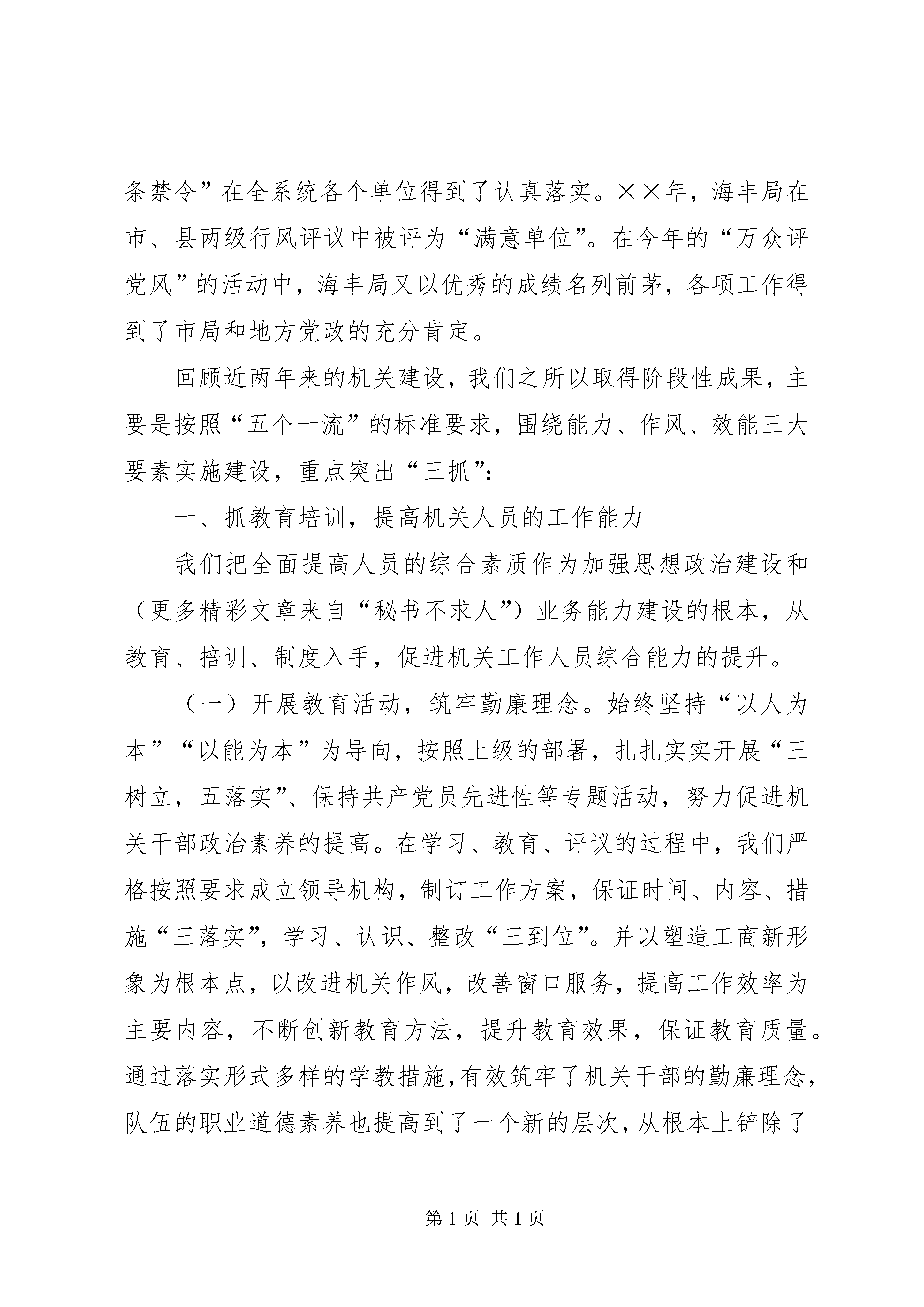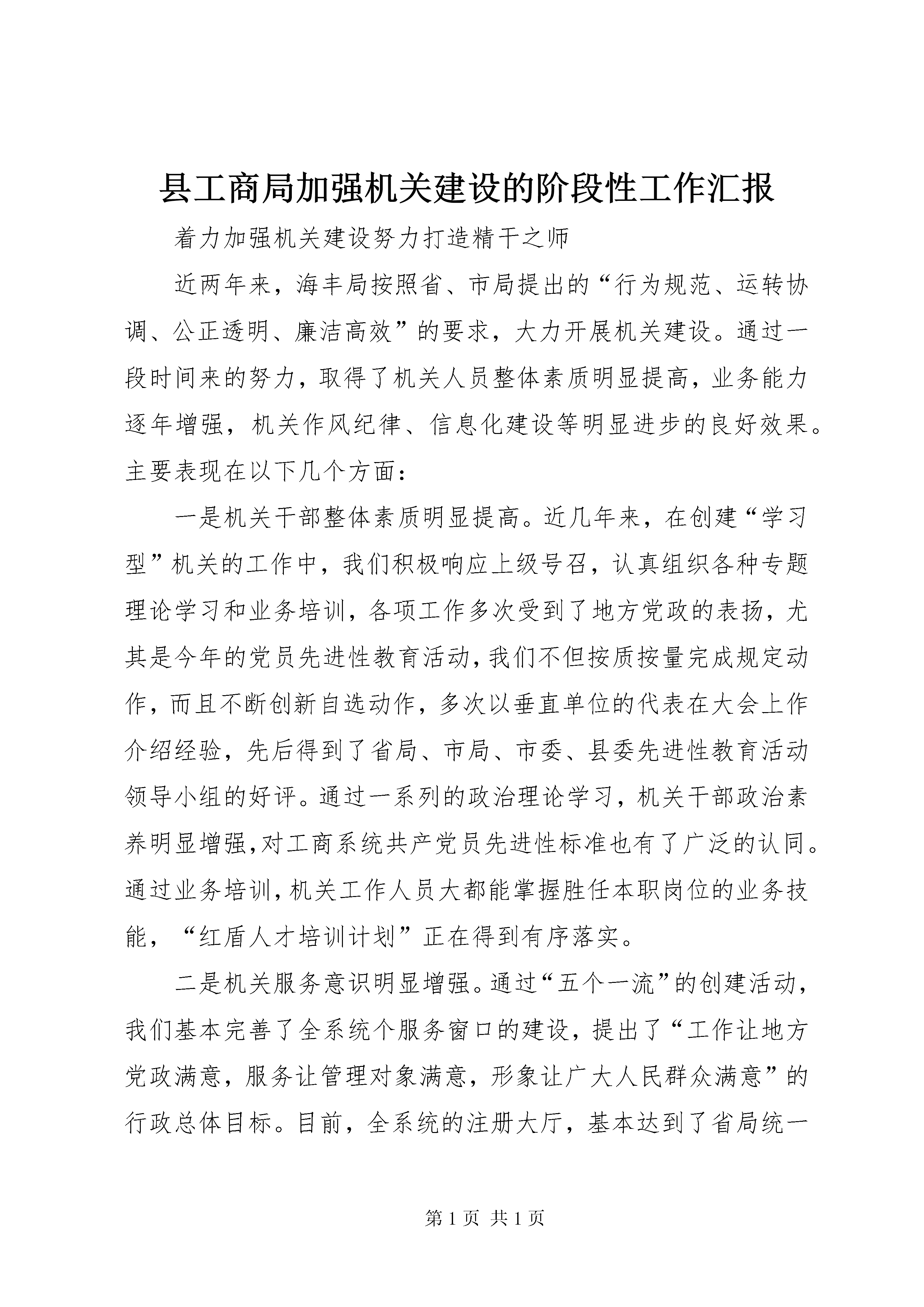 县工商局加强机关建设的阶段性工作汇报着力加强机关建设努力打造精干之师近两年来,海丰局按照省、市局提出的“行为规范、运转协调、公正透明、廉洁高效”的要求,大力开展机关建设。通过一段时间来的努力,取得了机关人员整体素质明显提高,业务能力逐年增强,机关作风纪律、信息化建设等明显进步的良好效果。主要表现在以下几个方面:一是机关干部整体素质明显提高。近几年来,在创建“学习型”机关的工作中,我们积极响应上级号召,认真组织各种专题理论学习和业务培训,各项工作多次受到了地方党政的表扬,尤其是今年的党员先进性教育活动,我们不但按质按量完成规定动作,而且不断创新自选动作,多次以垂直单位的代表在大会上作介绍经验,先后得到了省局、市局、市委、县委先进性教育活动领导小组的好评。通过一系列的政治理论学习,机关干部政治素养明显增强,对工商系统共产党员先进性标准也有了广泛的认同。通过业务培训,机关工作人员大都能掌握胜任本职岗位的业务技能,“红盾人才培训计划”正在得到有序落实。二是机关服务意识明显增强。通过“五个一流”的创建活动,我们基本完善了全系统个服务窗口的建设,提出了“工作让地方党政满意,服务让管理对象满意,形象让广大人民群众满意”的行政总体目标。目前,全系统的注册大厅,基本达到了省局统一标准,各个窗口部门一律推行“首办责任制、服务承诺制、过错责任追究制”。注册大厅还专门开辟了“绿色通道”,为来访办事人员提供“引导服务、上门服务、跟踪服务、延时服务、预约服务”和“特事特办,急事急办”等便民服务措施。现时的服务窗口基本实现了办事群众“一看就清楚,一问就明白,一听就服气,一办就满意”的要求,深受企业的欢迎。三是机关办事效率明显提高。通过“效能型”机关的建设,各个股室的工作效率明显提高。突出表现在以下几个环节:第一,通过机关规范化建设,提高了公文办理速度。对重要公文实行“限时速报、专人跟踪、重点督办”的制度,有效提高了公文流转速度和工作效能;第二,通过借助科技手段,积极推进了信息化进程。目前,全局上下已经基本实现了市、县、所三级网络传递信息的目标,新业务系统的推广使用为我们提高事务处理速度提供了有力保障。过去需要几天才能办妥的事情,现在一天就可以完成。第三,通过登记注册制度的改革,在全市率先委托基层工商所核发个体营业执照。此举不但解决的偏远乡村办照难的问题,而且简化程序便于管理,广泛受到了社会各界的好评。四是机关形象明显改善。近两年来,我们始终把机关作风建设摆在重要位置,深化政务公开,搞好廉政建设,机关干部的组织纪律观念得到了明显增强,机关工作秩序更加正规,两个“六条禁令”在全系统各个单位得到了认真落实。××年,海丰局在市、县两级行风评议中被评为“满意单位”。在今年的“万众评党风”的活动中,海丰局又以优秀的成绩名列前茅,各项工作得到了市局和地方党政的充分肯定。回顾近两年来的机关建设,我们之所以取得阶段性成果,主要是按照“五个一流”的标准要求,围绕能力、作风、效能三大要素实施建设,重点突出“三抓”:一、抓教育培训,提高机关人员的工作能力我们把全面提高人员的综合素质作为加强思想政治建设和(更多精彩文章来自“秘书不求人”)业务能力建设的根本,从教育、掊训、制度入手,促进机关工作人员综合能力的提升。(一)开展教育活动,筑牢勤廉理念。始终坚持“以人为本”“以能为本”为导向,按照上级的部署,扎扎实实开展“三树立,五落实”、保持共产党员先进性等专题活动,努力促进机关干部政治素养的提高。在学习、教育、评议的过程中,我们严格按照要求成立领导机构,制订工作方案,保证时间、内容、措施“三落实”,学习、认识、整改“三到位”。并以塑造工商新形象为根本点,以改进机关作风,改善窗口服务,提高工作效率为主要内容,不断创新教育方法,提升教育效果,保证教育质量。通过落实形式多样的学教措施,有效筑牢了机关干部的勤廉理念,队伍的职业道德素养也提高到了一个新的层次,从根本上铲除了滥用手中权力搞吃、拿、卡、要的思想根源,机关作风明显好转。(二)加强职业培训,提高业务水平。为进一步适应新时期工商行政管理工作的需要。我们紧密联系工作实际,切实加强业务培训,不断提高管理人员的业务能务。一是围绕“六能”(“能调查研究、能出谋划策、能组织协调、能指导落实、能撰写公文、能应用电脑”)的目标,开展各种类型的知识培训和电脑操作培训班,先后对岁以下的干部进行计算机操作技能培训,为信息化管理工作打好基础。二是适时举办知识更新培训班,组织机关人员对新出台的政策法规进行系统的学习,提高其管理水平。三是抓住“四大”活动的契机,以机关股室为单位举办专题讲座,组织机关工作人员系统学习商标广告管理、食品市场监管,反传销等专项业务,提高其综合管理的能力。(三)注重学用结合,以制度促规范。在学好用好的基础上,我们