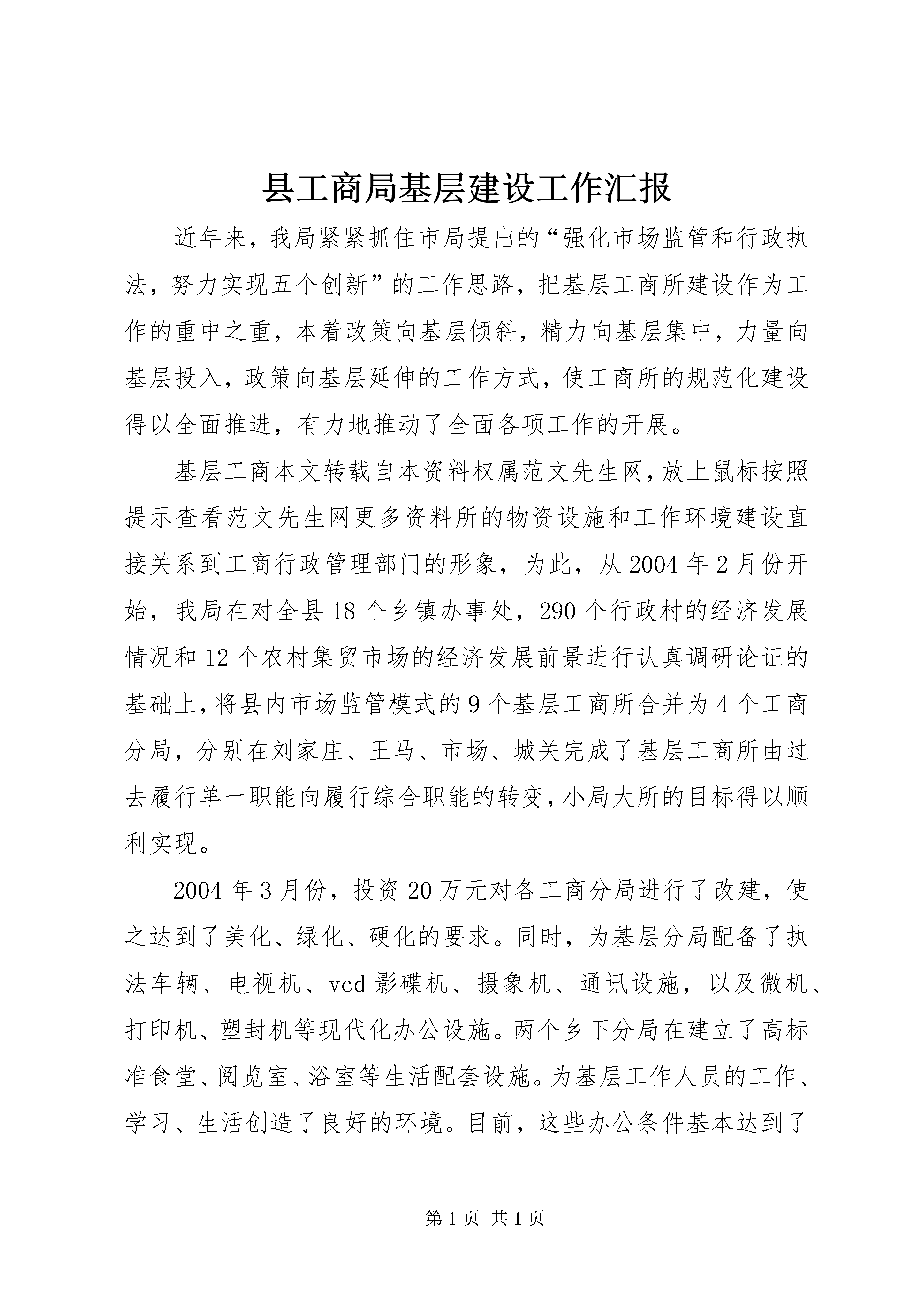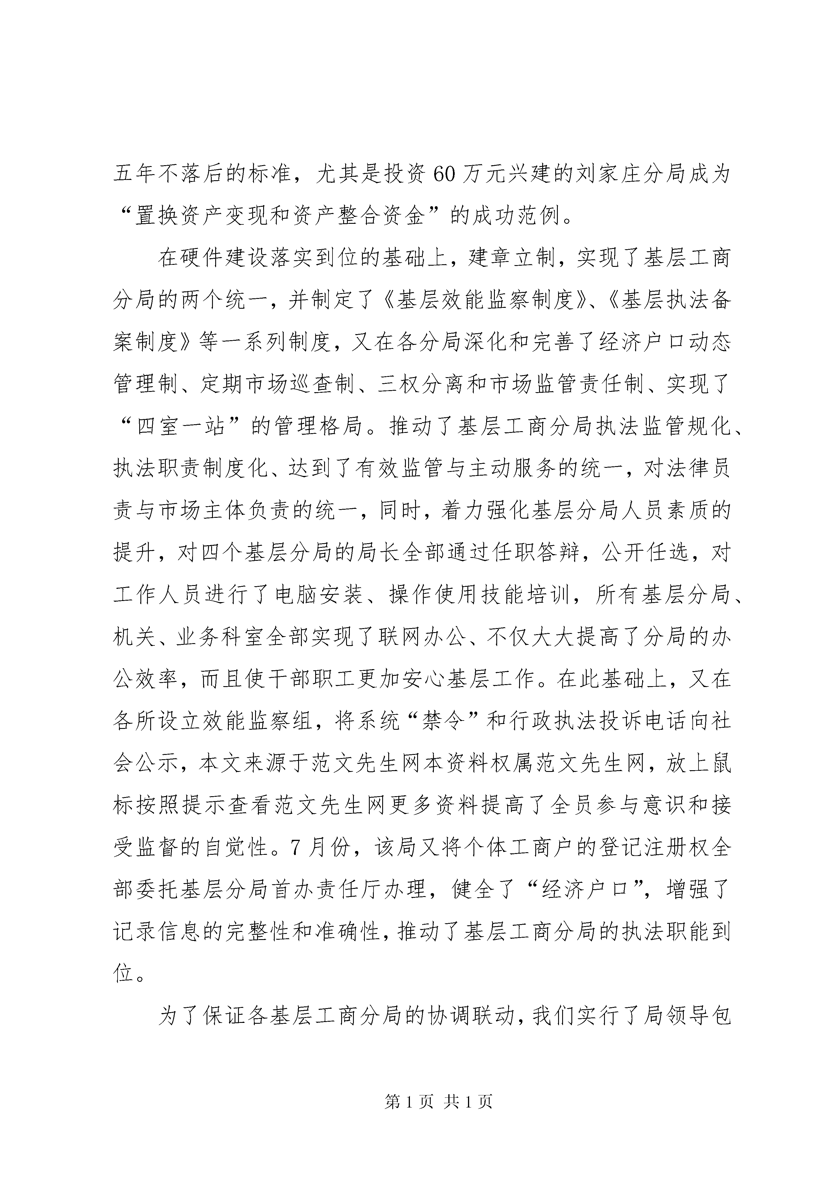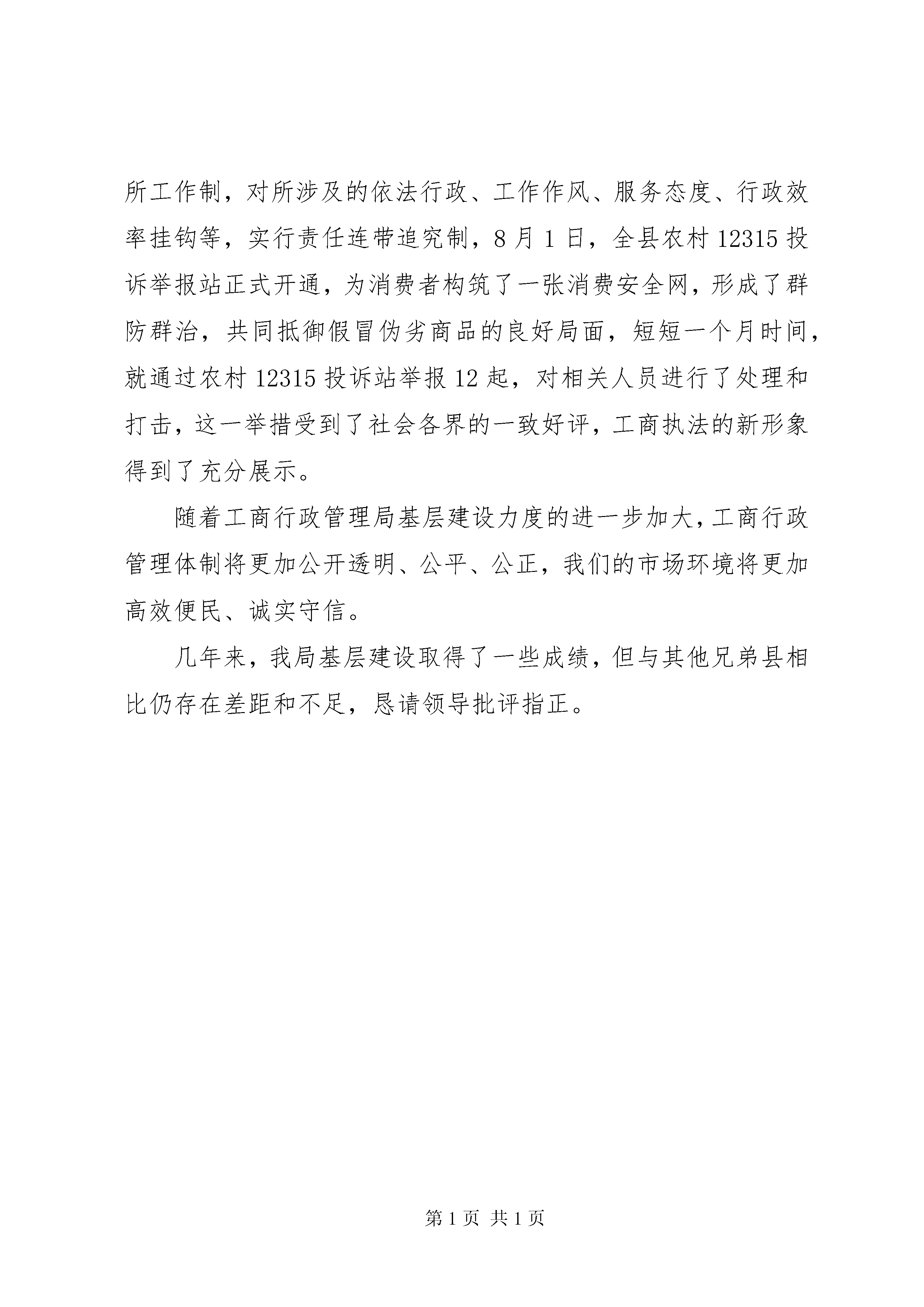 县工商局基层建设工作汇报近年来,我局紧紧抓住市局提出的“强化市场监管和行政执法,努力实现五个创新”的工作思路,把基层工商所建设作为工作的重中之重,本着政策向基层倾斜,精力向基层集中,力量向基层投入,政策向基层延伸的工作方式,使工商所的规范化建设得以全面推进,有力地推动了全面各项工作的开展。基层工商本文转载自本资料权属范文先生网,放上鼠标按照提示查看范文先生网更多资料所的物资设施和工作环境建设直接关系到工商行政管理部门的形象,为此,从2004年2月份开始,我局在对全县18个乡镇办事处,290个行政村的经济发展情况和12个农村集贸市场的经济发展前景进行认真调研论证的基础上,将县内市场监管模式的9个基层工商所合并为4个工商分局,分别在刘家庄、王马、市场、城关完成了基层工商所由过去履行单一职能向履行综合职能的转变,小局大所的目标得以顺利实现。2004年3月份,投资20万元对各工商分局进行了改建,使之达到了美化、绿化、硬化的要求。同时,为基层分局配备了执法车辆、电视机、vcd影碟机、摄象机、通讯设施,以及微机、打印机、塑封机等现代化办公设施。两个乡下分局在建立了高标准食堂、阅览室、浴室等生活配套设施。为基层工作人员的工作、学习、生活创造了良好的环境。目前,这些办公条件基本达到了五年不落后的标准,尤其是投资60万元兴建的刘家庄分局成为“置换资产变现和资产整合资金”的成功范例。在硬件建设落实到位的基础上,建章立制,实现了基层工商分局的两个统一,并制定了《基层效能监察制度》、《基层执法备案制度》等一系列制度,又在各分局深化和完善了经济户口动态管理制、定期市场巡查制、三权分离和市场监管责任制、实现了“四室一站”的管理格局。推动了基层工商分局执法监管规化、执法职责制度化、达到了有效监管与主动服务的统一,对法律员责与市场主体负责的统一,同时,着力强化基层分局人员素质的提升,对四个基层分局的局长全部通过任职答辩,公开任选,对工作人员进行了电脑安装、操作使用技能培训,所有基层分局、机关、业务科室全部实现了联网办公、不仅大大提高了分局的办公效率,而且使干部职工更加安心基层工作。在此基础上,又在各所设立效能监察组,将系统“禁令”和行政执法投诉电话向社会公示,本文来源于范文先生网本资料权属范文先生网,放上鼠标按照提示查看范文先生网更多资料提高了全员参与意识和接受监督的自觉性。7月份,该局又将个体工商户的登记注册权全部委托基层分局首办责任厅办理,健全了“经济户口”,增强了记录信息的完整性和准确性,推动了基层工商分局的执法职能到位。为了保证各基层工商分局的协调联动,我们实行了局领导包所工作制,对所涉及的依法行政、工作作风、服务态度、行政效率挂钩等,实行责任连带追究制,8月1日,全县农村12315投诉举报站正式开通,为消费者构筑了一张消费安全网,形成了群防群治,共同抵御假冒伪劣商品的良好局面,短短一个月时间,就通过农村12315投诉站举报12起,对相关人员进行了处理和打击,这一举措受到了社会各界的一致好评,工商执法的新形象得到了充分展示。随着工商行政管理局基层建设力度的进一步加大,工商行政管理体制将更加公开透明、公平、公正,我们的市场环境将更加高效便民、诚实守信。几年来,我局基层建设取得了一些成绩,但与其他兄弟县相比仍存在差距和不足,恳请领导批评指正。