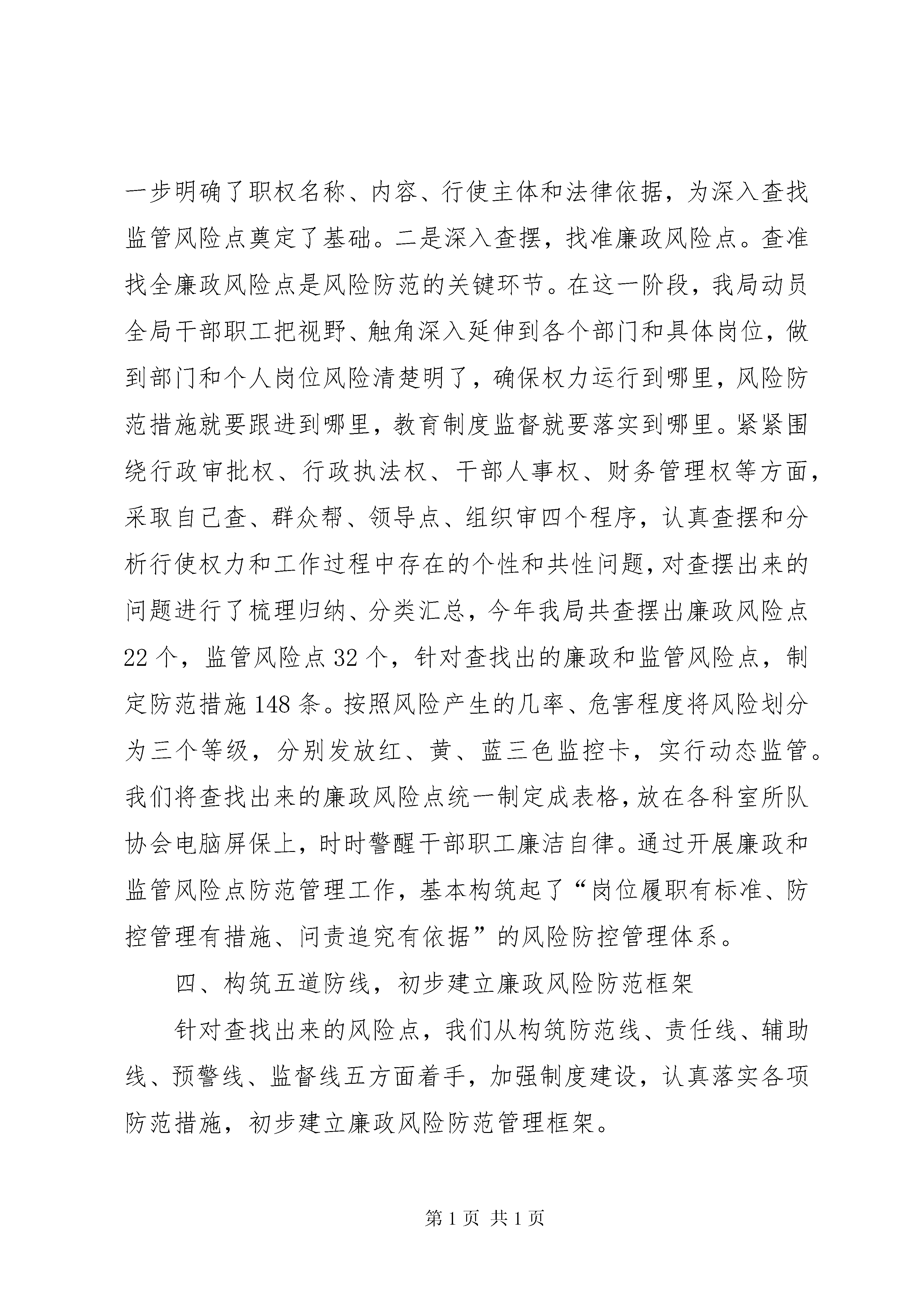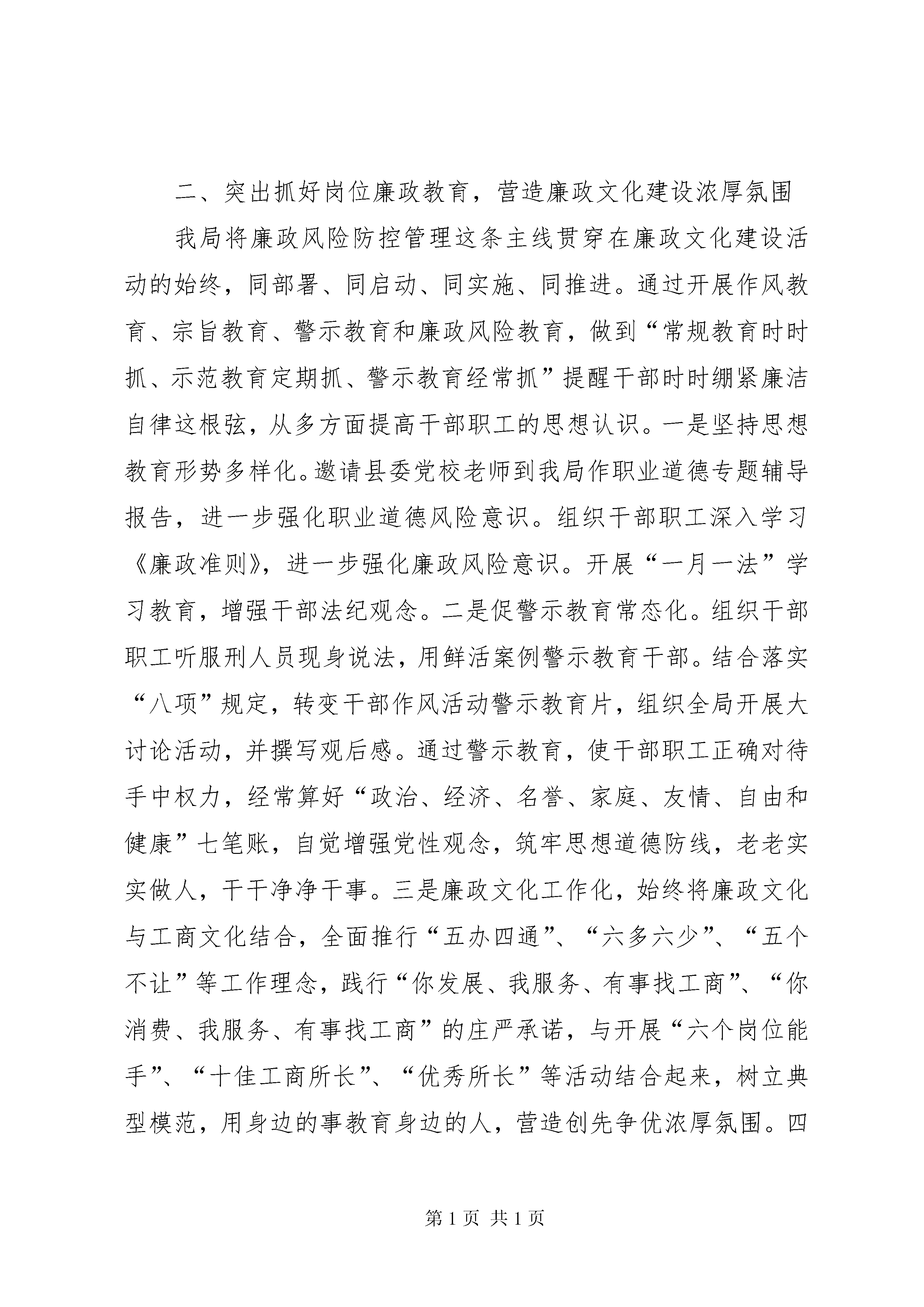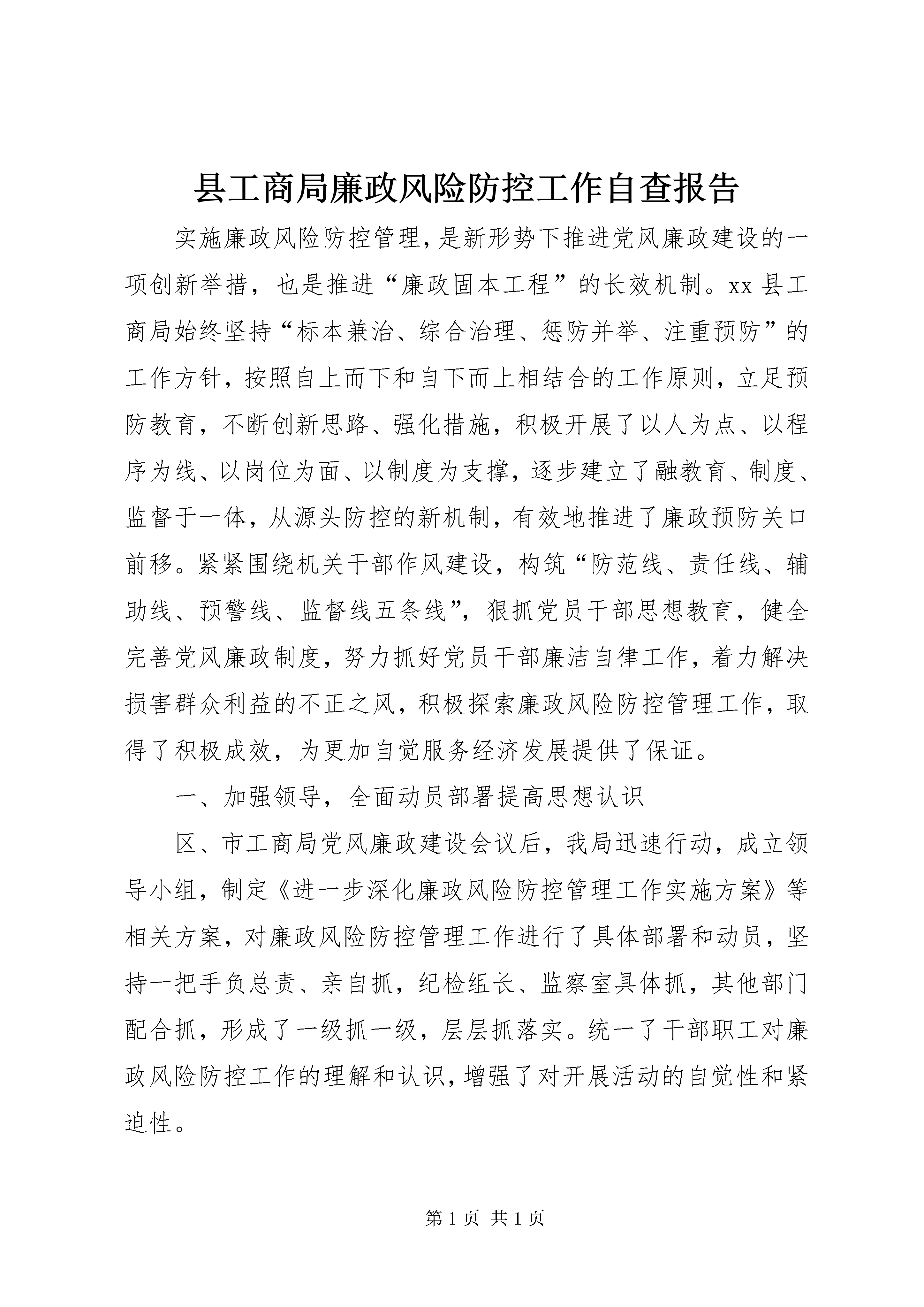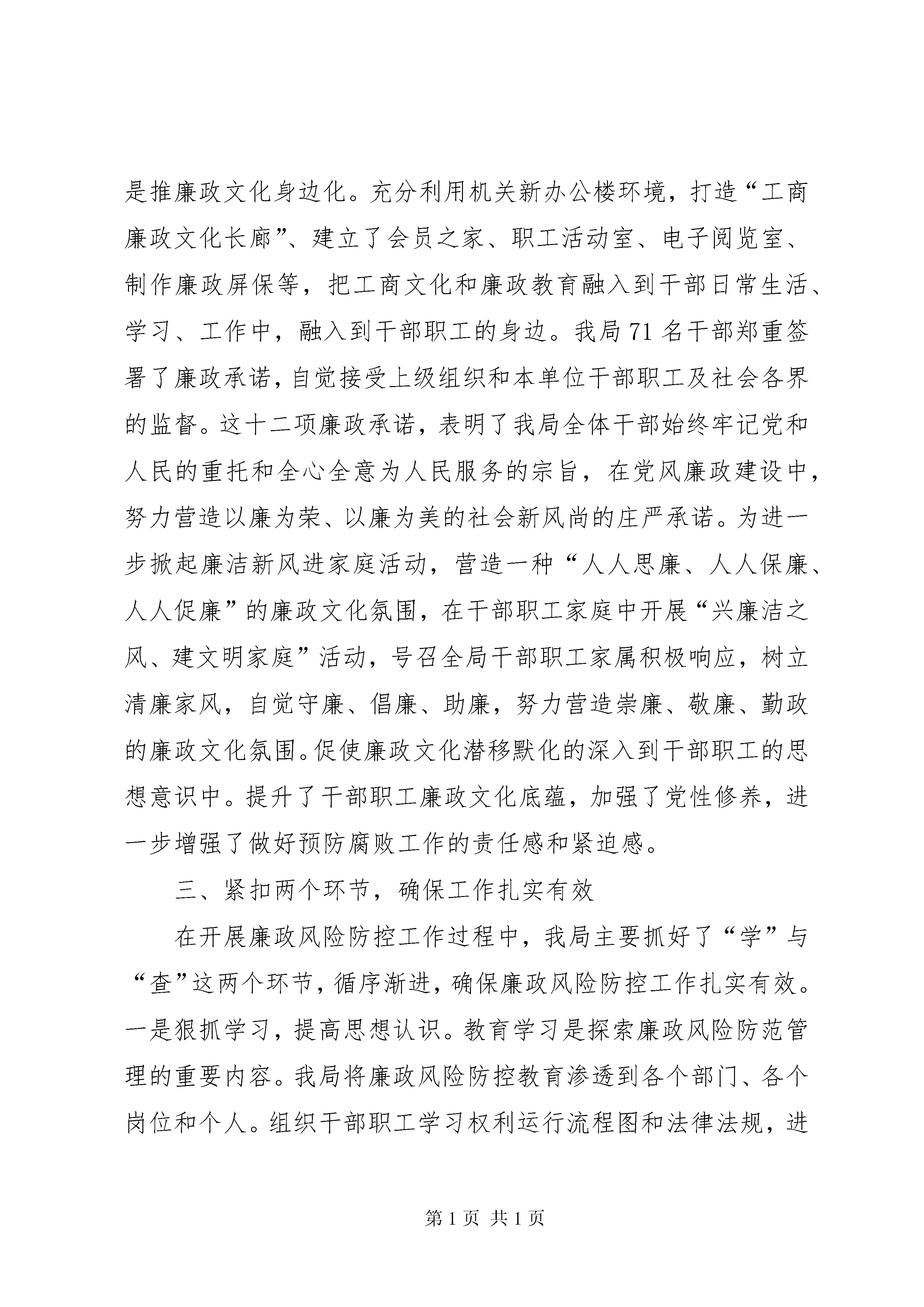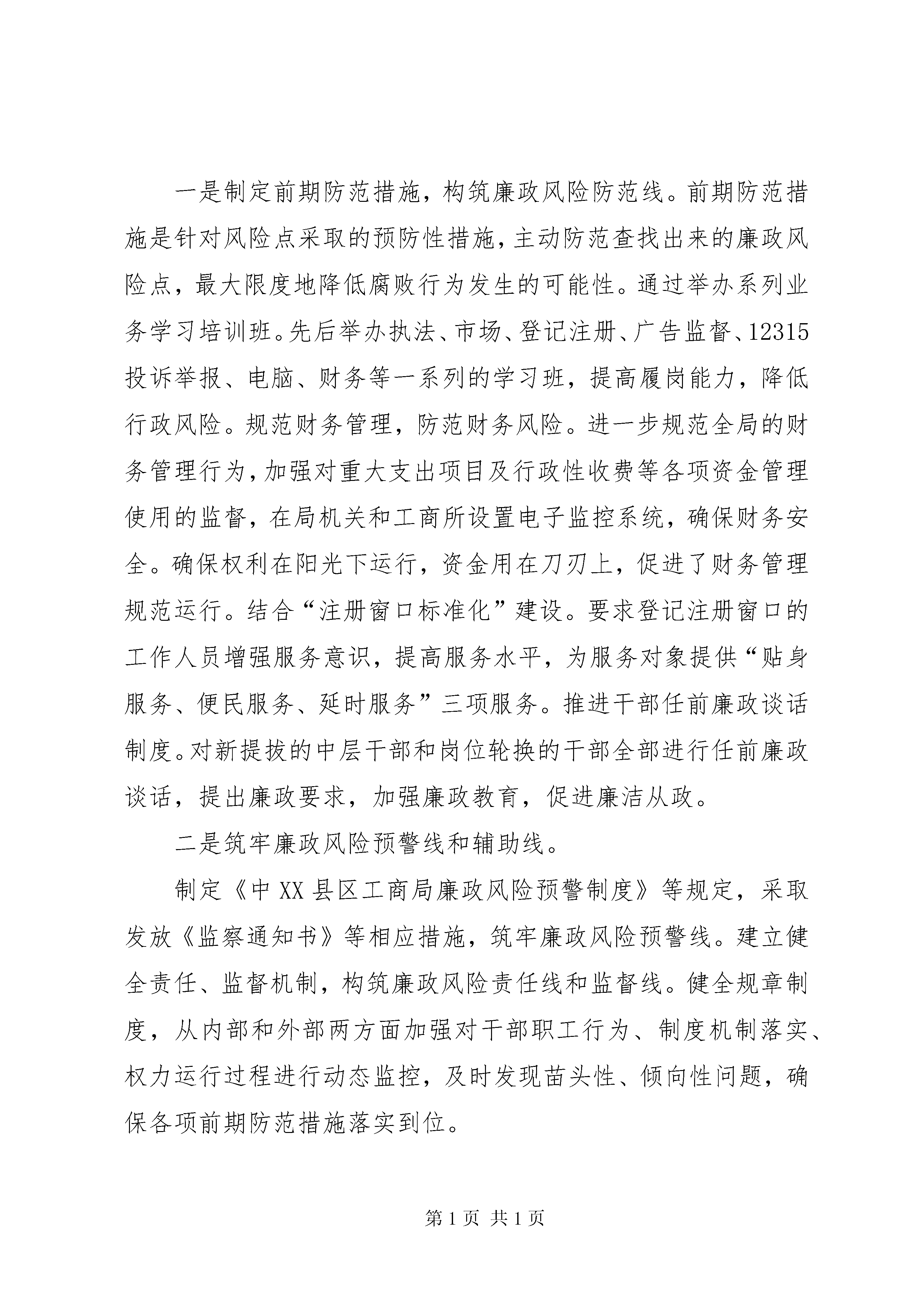 县工商局廉政风险防控工作自查报告实施廉政风险防控管理,是新形势下推进党风廉政建设的一项创新举措,也是推进“廉政固本工程”的长效机制。xx县工商局始终坚持“标本兼治、综合治理、惩防并举、注重预防”的工作方针,按照自上而下和自下而上相结合的工作原则,立足预防教育,不断创新思路、强化措施,积极开展了以人为点、以程序为线、以岗位为面、以制度为支撑,逐步建立了融教育、制度、监督于一体,从源头防控的新机制,有效地推进了廉政预防关口前移。紧紧围绕机关干部作风建设,构筑“防范线、责任线、辅助线、预警线、监督线五条线”,狠抓党员干部思想教育,健全完善党风廉政制度,努力抓好党员干部廉洁自律工作,着力解决损害群众利益的不正之风,积极探索廉政风险防控管理工作,取得了积极成效,为更加自觉服务经济发展提供了保证。一、加强领导,全面动员部署提高思想认识区、市工商局党风廉政建设会议后,我局迅速行动,成立领导小组,制定《进一步深化廉政风险防控管理工作实施方案》等相关方案,对廉政风险防控管理工作进行了具体部署和动员,坚持一把手负总责、亲自抓,纪检组长、监察室具体抓,其他部门配合抓,形成了一级抓一级,层层抓落实。统一了干部职工对廉政风险防控工作的理解和认识,增强了对开展活动的自觉性和紧迫性。二、突出抓好岗位廉政教育,营造廉政文化建设浓厚氛围我局将廉政风险防控管理这条主线贯穿在廉政文化建设活动的始终,同部署、同启动、同实施、同推进。通过开展作风教育、宗旨教育、警示教育和廉政风险教育,做到“常规教育时时抓、示范教育定期抓、警示教育经常抓”提醒干部时时绷紧廉洁自律这根弦,从多方面提高干部职工的思想认识。一是坚持思想教育形势多样化。邀请县委党校老师到我局作职业道德专题辅导报告,进一步强化职业道德风险意识。组织干部职工深入学习《廉政准则》,进一步强化廉政风险意识。开展“一月一法”学习教育,增强干部法纪观念。二是促警示教育常态化。组织干部职工听服刑人员现身说法,用鲜活案例警示教育干部。结合落实“八项”规定,转变干部作风活动警示教育片,组织全局开展大讨论活动,并撰写观后感。通过警示教育,使干部职工正确对待手中权力,经常算好“政治、经济、名誉、家庭、友情、自由和健康”七笔账,自觉增强党性观念,筑牢思想道德防线,老老实实做人,干干净净干事。三是廉政文化工作化,始终将廉政文化与工商文化结合,全面推行“五办四通”、“六多六少”、“五个不让”等工作理念,践行“你发展、我服务、有事找工商”、“你消费、我服务、有事找工商”的庄严承诺,与开展“六个岗位能手”、“十佳工商所长”、“优秀所长”等活动结合起来,树立典型模范,用身边的事教育身边的人,营造创先争优浓厚氛围。四是推廉政文化身边化。充分利用机关新办公楼环境,打造“工商廉政文化长廊”、建立了会员之家、职工活动室、电子阅览室、制作廉政屏保等,把工商文化和廉政教育融入到干部日常生活、学习、工作中,融入到干部职工的身边。我局71名干部郑重签署了廉政承诺,自觉接受上级组织和本单位干部职工及社会各界的监督。这十二项廉政承诺,表明了我局全体干部始终牢记党和人民的重托和全心全意为人民服务的宗旨,在党风廉政建设中,努力营造以廉为荣、以廉为美的社会新风尚的庄严承诺。为进一步掀起廉洁新风进家庭活动,营造一种“人人思廉、人人保廉、人人促廉”的廉政文化氛围,在干部职工家庭中开展“兴廉洁之风、建文明家庭”活动,号召全局干部职工家属积极响应,树立清廉家风,自觉守廉、倡廉、助廉,努力营造崇廉、敬廉、勤政的廉政文化氛围。促使廉政文化潜移默化的深入到干部职工的思想意识中。提升了干部职工廉政文化底蕴,加强了党性修养,进一步增强了做好预防腐败工作的责任感和紧迫感。三、紧扣两个环节,确保工作扎实有效在开展廉政风险防控工作过程中,我局主要抓好了“学”与“查”这两个环节,循序渐进,确保廉政风险防控工作扎实有效。一是狠抓学习,提高思想认识。教育学习是探索廉政风险防范管理的重要内容。我局将廉政风险防控教育渗透到各个部门、各个岗位和个人。组织干部职工学习权利运行流程图和法律法规,进一步明确了职权名称、内容、行使主体和法律依据,为深入查找监管风险点奠定了基础。二是深入查摆,找准廉政风险点。查准找全廉政风险点是风险防范的关键环节。在这一阶段,我局动员全局干部职工把视野、触角深入延伸到各个部门和具体岗位,做到部门和个人岗位风险清楚明了,确保权力运行到哪里,风险防范措施就要跟进到哪里,教育制度监督就要落实到哪里。紧紧围绕行政审批权、行政执法权、干部人事权、财务管理权等方面,采取自己查、群众帮、领导点、组织审四个程序,认真查摆和分析行使权力和工作过程中存在的个性和共性问题,对查摆出来的问题进行了梳理归纳、分类汇总,今年我局共查摆出廉政风险点22个,监管风险点32个,针对查找出