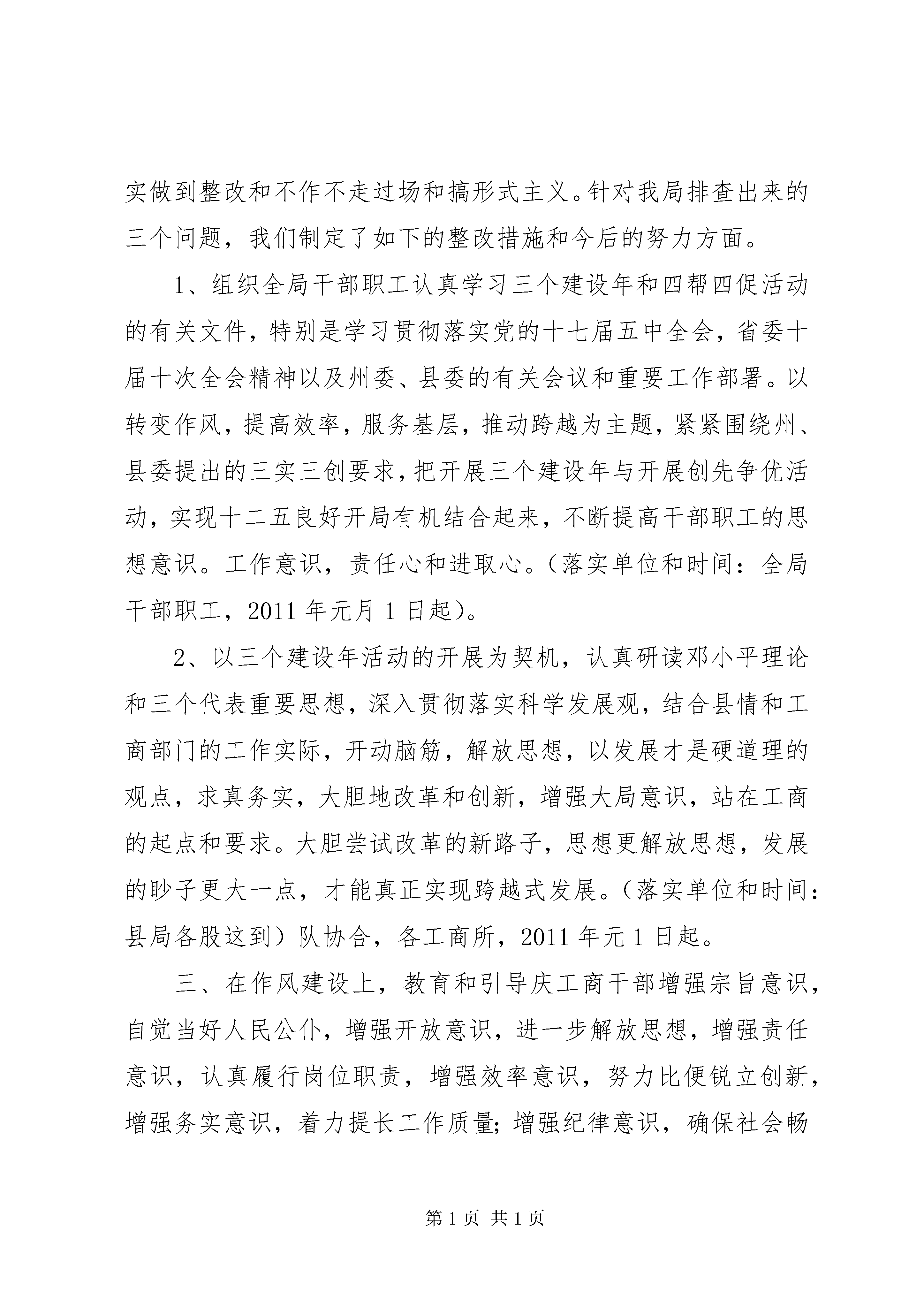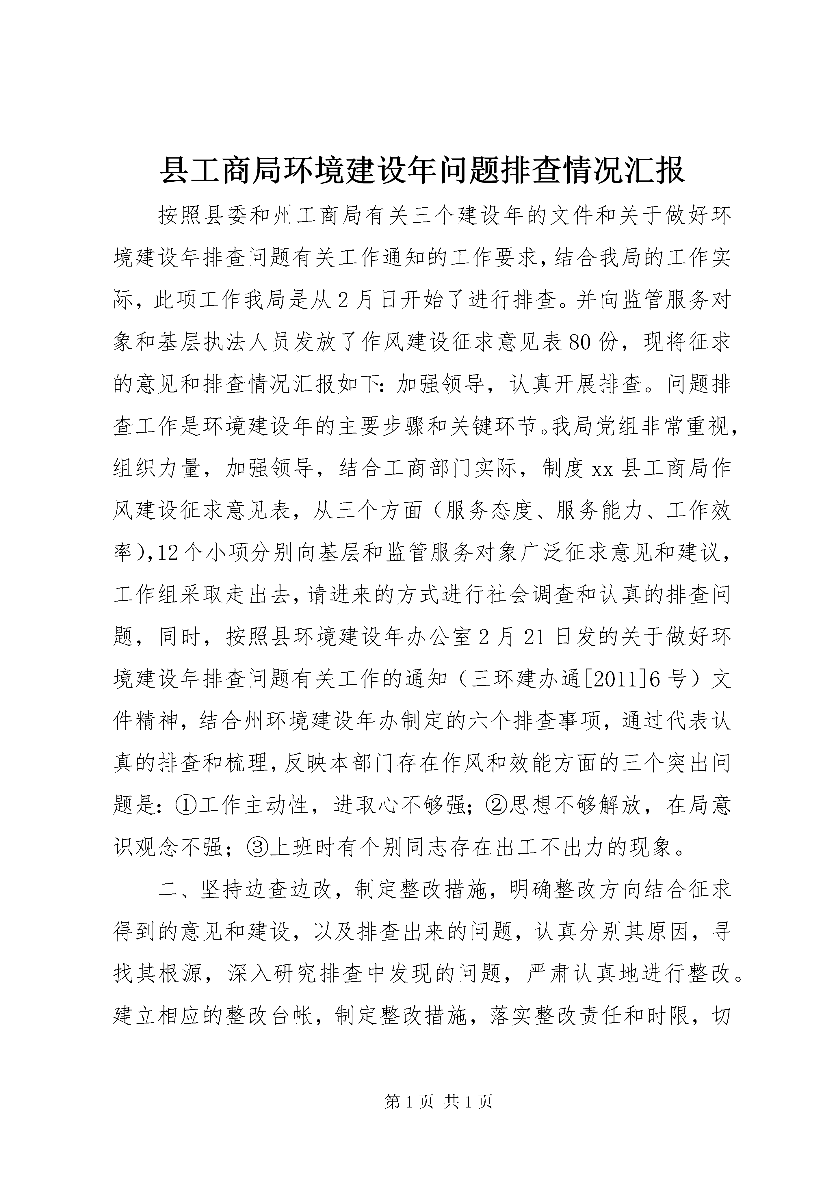 县工商局环境建设年问题排查情况汇报按照县委和州工商局有关三个建设年的文件和关于做好环境建设年排查问题有关工作通知的工作要求,结合我局的工作实际,此项工作我局是从2月日开始了进行排查。并向监管服务对象和基层执法人员发放了作风建设征求意见表80份,现将征求的意见和排查情况汇报如下:加强领导,认真开展排查。问题排查工作是环境建设年的主要步骤和关键环节。我局党组非常重视,组织力量,加强领导,结合工商部门实际,制度xx县工商局作风建设征求意见表,从三个方面(服务态度、服务能力、工作效率),12个小项分别向基层和监管服务对象广泛征求意见和建议,工作组采取走出去,请进来的方式进行社会调查和认真的排查问题,同时,按照县环境建设年办公室2月21日发的关于做好环境建设年排查问题有关工作的通知(三环建办通[2011]6号)文件精神,结合州环境建设年办制定的六个排查事项,通过代表认真的排查和梳理,反映本部门存在作风和效能方面的三个突出问题是:①工作主动性,进取心不够强;②思想不够解放,在局意识观念不强;③上班时有个别同志存在出工不出力的现象。二、坚持边查边改,制定整改措施,明确整改方向结合征求得到的意见和建设,以及排查出来的问题,认真分别其原因,寻找其根源,深入研究排查中发现的问题,严肃认真地进行整改。建立相应的整改台帐,制定整改措施,落实整改责任和时限,切实做到整改和不作不走过场和搞形式主义。针对我局排查出来的三个问题,我们制定了如下的整改措施和今后的努力方面。1、组织全局干部职工认真学习三个建设年和四帮四促活动的有关文件,特别是学习贯彻落实党的十七届五中全会,省委十届十次全会精神以及州委、县委的有关会议和重要工作部署。以转变作风,提高效率,服务基层,推动跨越为主题,紧紧围绕州、县委提出的三实三创要求,把开展三个建设年与开展创先争优活动,实现十二五良好开局有机结合起来,不断提高干部职工的思想意识。工作意识,责任心和进取心。(落实单位和时间:全局干部职工,2011年元月1日起)。2、以三个建设年活动的开展为契机,认真研读邓小平理论和三个代表重要思想,深入贯彻落实科学发展观,结合县情和工商部门的工作实际,开动脑筋,解放思想,以发展才是硬道理的观点,求真务实,大胆地改革和创新,增强大局意识,站在工商的起点和要求。大胆尝试改革的新路子,思想更解放思想,发展的眇子更大一点,才能真正实现跨越式发展。(落实单位和时间:县局各股这到)队协合,各工商所,2011年元1日起。三、在作风建设上,教育和引导庆工商干部增强宗旨意识,自觉当好人民公仆,增强开放意识,进一步解放思想,增强责任意识,认真履行岗位职责,增强效率意识,努力比便锐立创新,增强务实意识,着力提长工作质量;增强纪律意识,确保社会畅通,增强大局意识,正确处理好各种关系,增强团结意识,促进和谐共事,影响发展的作风问题得以解决,努力形成工作创一流、目标争第一的良氛围和干事创业,增比进位,创先争化成的良好局面。努力做到四个不手段,一是以完善和执行为基础,对有全不行,有禁不止的行为从严追究,有关人员和部门负责的责任不手软;二是以落实队优惠政策这理一把手第一责任为保障,对疏于管理,包庇纵容,弄虚作假者从严追究不手软;三是严肃工作纠律为突破口,对不服从工作安排,不按下时上下班,不着装上岗和不按时完成任务的人员从严追究不手软;四是继续探索完善月考通报年总评的目标积分管理体系建设为抓手,对读职失职,工作不在状态,目标任务完成差的和个人从严追究不手软,(落实单位和时间:全局干部职工,2011年元月1日起)。二○一一年二月二十三日