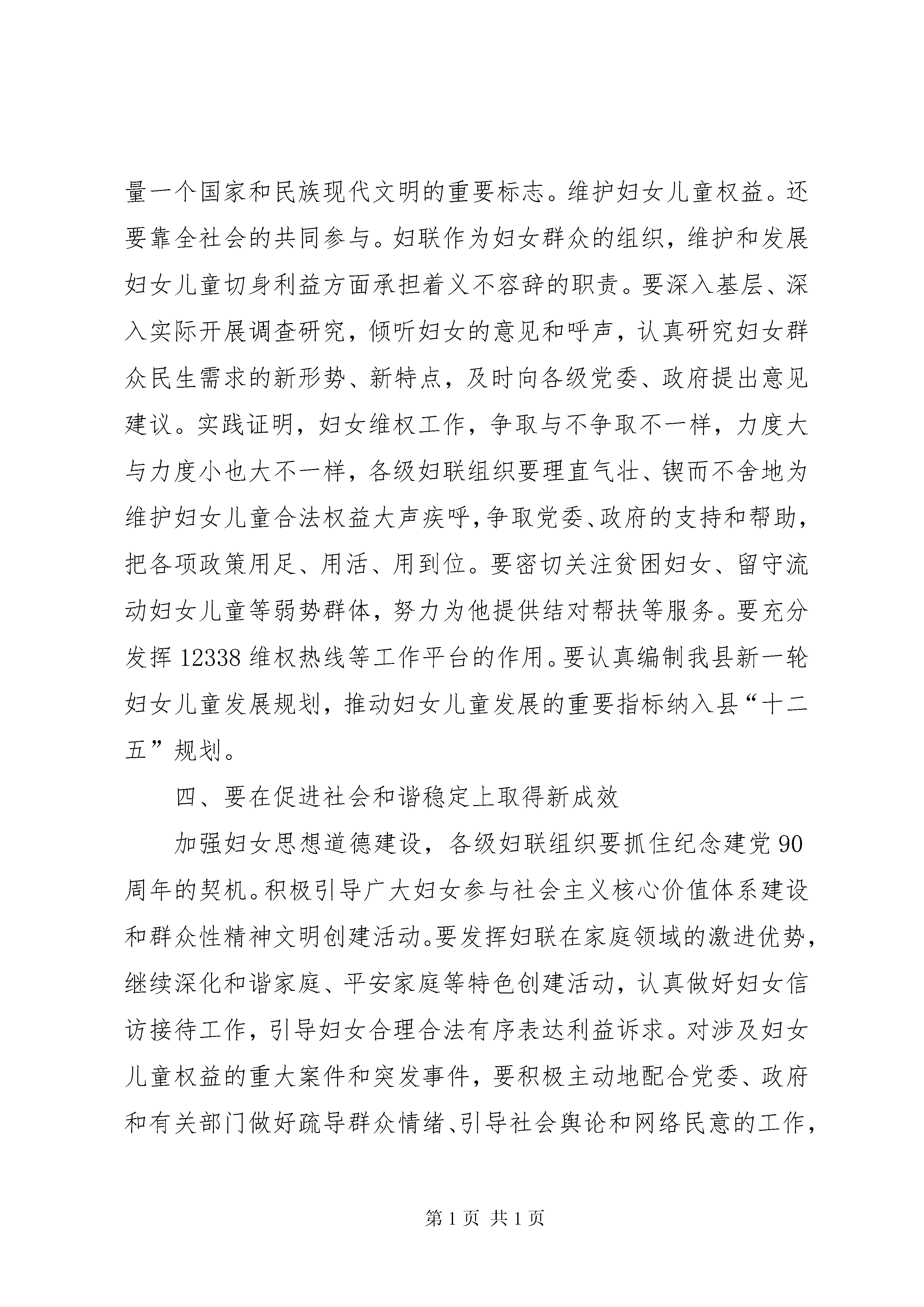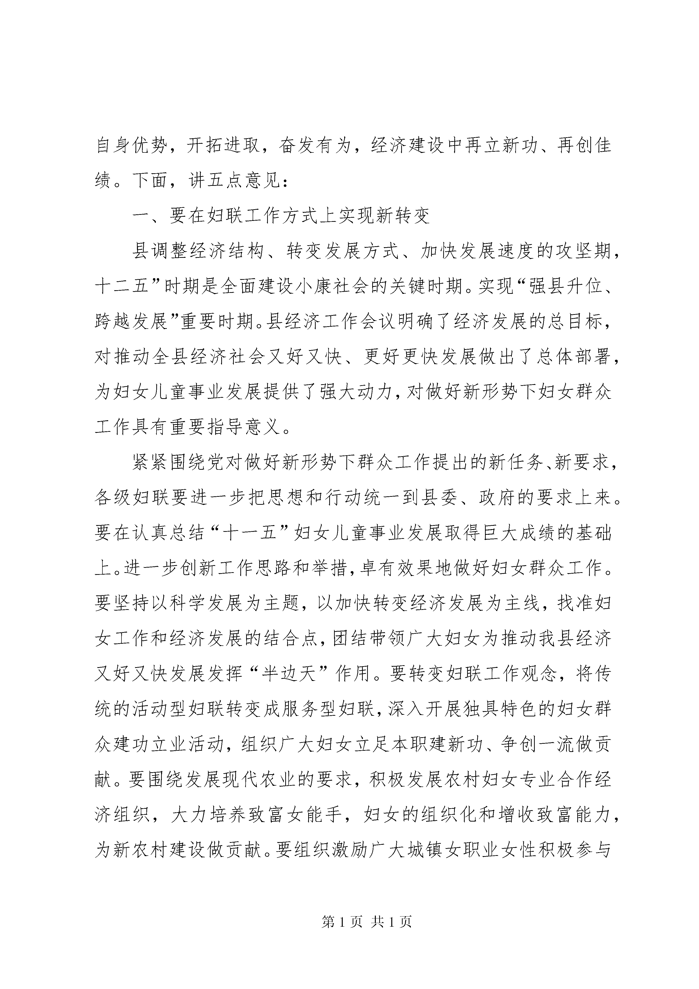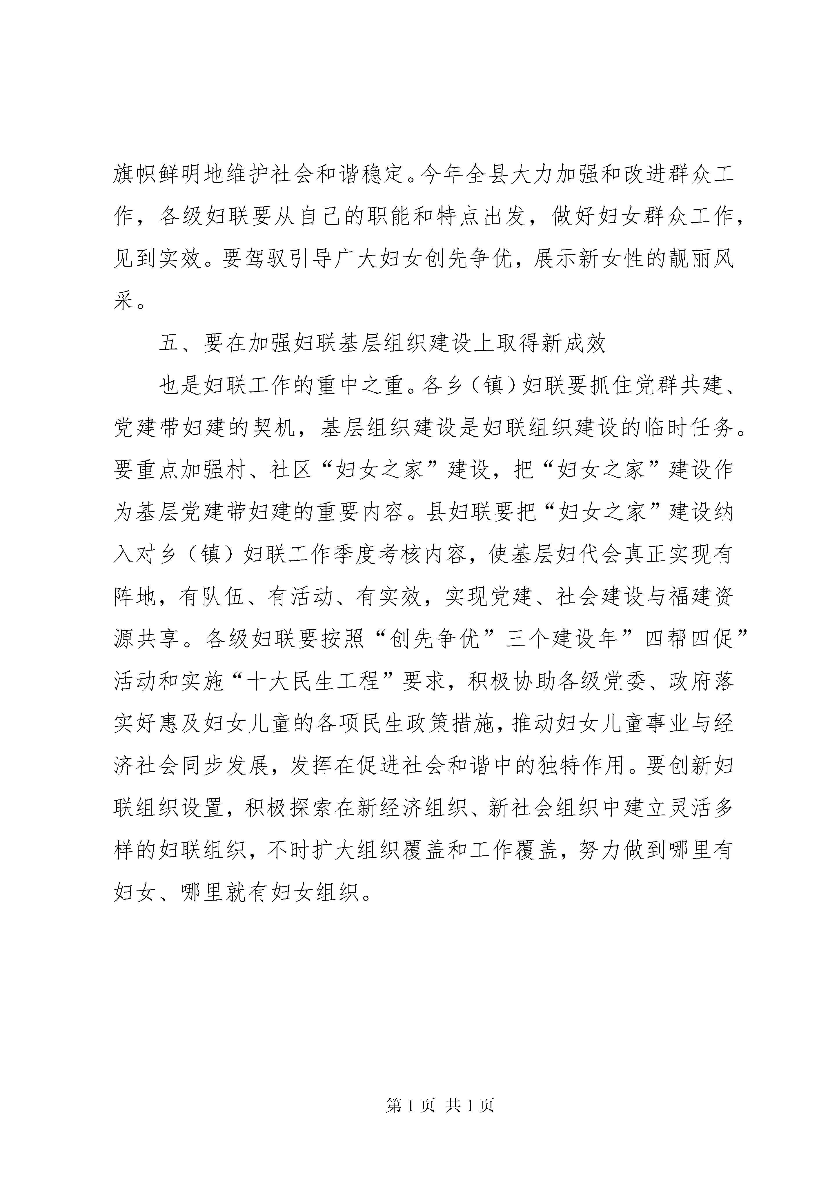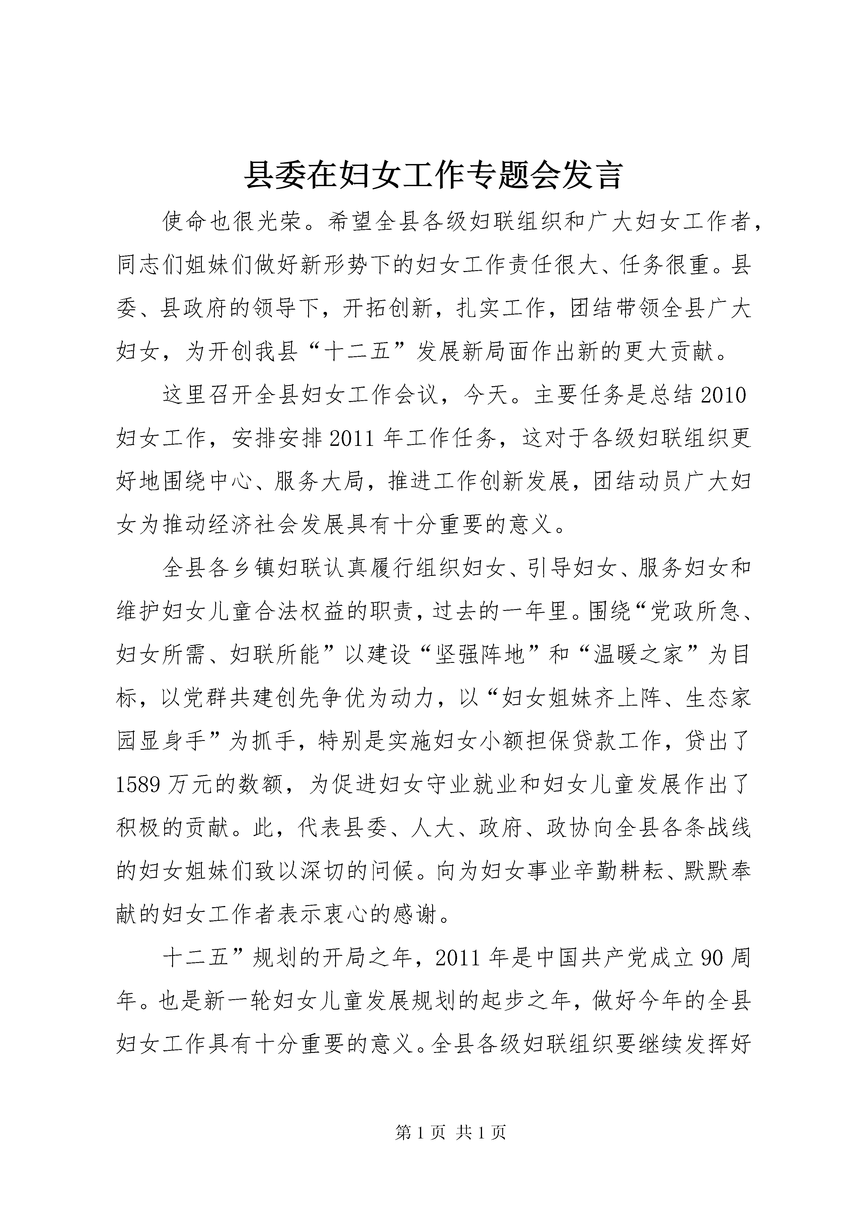 县委在妇女工作专题会发言使命也很光荣。希望全县各级妇联组织和广大妇女工作者,同志们姐妹们做好新形势下的妇女工作责任很大、任务很重。县委、县政府的领导下,开拓创新,扎实工作,团结带领全县广大妇女,为开创我县“十二五”发展新局面作出新的更大贡献。这里召开全县妇女工作会议,今天。主要任务是总结2010妇女工作,安排安排2011年工作任务,这对于各级妇联组织更好地围绕中心、服务大局,推进工作创新发展,团结动员广大妇女为推动经济社会发展具有十分重要的意义。全县各乡镇妇联认真履行组织妇女、引导妇女、服务妇女和维护妇女儿童合法权益的职责,过去的一年里。围绕“党政所急、妇女所需、妇联所能”以建设“坚强阵地”和“温暖之家”为目标,以党群共建创先争优为动力,以“妇女姐妹齐上阵、生态家园显身手”为抓手,特别是实施妇女小额担保贷款工作,贷出了1589万元的数额,为促进妇女守业就业和妇女儿童发展作出了积极的贡献。此,代表县委、人大、政府、政协向全县各条战线的妇女姐妹们致以深切的问候。向为妇女事业辛勤耕耘、默默奉献的妇女工作者表示衷心的感谢。十二五”规划的开局之年,2011年是中国共产党成立90周年。也是新一轮妇女儿童发展规划的起步之年,做好今年的全县妇女工作具有十分重要的意义。全县各级妇联组织要继续发挥好自身优势,开拓进取,奋发有为,经济建设中再立新功、再创佳绩。下面,讲五点意见:一、要在妇联工作方式上实现新转变县调整经济结构、转变发展方式、加快发展速度的攻坚期,十二五”时期是全面建设小康社会的关键时期。实现“强县升位、跨越发展”重要时期。县经济工作会议明确了经济发展的总目标,对推动全县经济社会又好又快、更好更快发展做出了总体部署,为妇女儿童事业发展提供了强大动力,对做好新形势下妇女群众工作具有重要指导意义。紧紧围绕党对做好新形势下群众工作提出的新任务、新要求,各级妇联要进一步把思想和行动统一到县委、政府的要求上来。要在认真总结“十一五”妇女儿童事业发展取得巨大成绩的基础上。进一步创新工作思路和举措,卓有效果地做好妇女群众工作。要坚持以科学发展为主题,以加快转变经济发展为主线,找准妇女工作和经济发展的结合点,团结带领广大妇女为推动我县经济又好又快发展发挥“半边天”作用。要转变妇联工作观念,将传统的活动型妇联转变成服务型妇联,深入开展独具特色的妇女群众建功立业活动,组织广大妇女立足本职建新功、争创一流做贡献。要围绕发展现代农业的要求,积极发展农村妇女专业合作经济组织,大力培养致富女能手,妇女的组织化和增收致富能力,为新农村建设做贡献。要组织激励广大城镇女职业女性积极参与岗位练兵、技能比武等活动,平凡的岗位上施展才华,为推动经济社会发展作出贡献。二、要在推进妇女就业守业上取得新成效也是妇女贡献智慧力量、实现自强自立的重要基础。各级妇联要把推进妇女就业守业放在突出位置,就业守业是广大妇女面临的一大难题。切实抓好妇女小额担保贷款工作,进一步加大宣传力度、健全机制、简化顺序、加强配合、深入调研,切实抓紧抓好、抓出水平、抓出成效。重点突破担保瓶颈,做大贷款规模,用足用好政策,最大限度地扩大经济效益和社会效益。要深化女性守业促进行动。不时完善妇女就业守业服务体系,拓宽妇女就业守业渠道,为妇女送政策、送岗位、送技能、送服务,千方百计提高城乡妇女和女大学毕业生就业率、守业胜利率,实现他就业守业愿望。要重视发展家政服务和养老服务,利用有效途径和措施,充分挖掘潜力,为妇女就业守业提供广阔平台。要充分运用各种社会教育资源,协助广大妇女学习新知识、新技能。要积极协调各方面力量,加大对妇女技能培训的支持力度,针对不同妇女群体的实际需要,坚持因地制宜、因材施教,搞好分层次、分类别培训,不时提高广大妇女技能素质和综合素质。三、要在解决妇女儿童基本需求上取得新成效不只要靠各级政府,妇女儿童在教育、医疗、就业、社会保证、收入分配等方面具有特殊性。尊重和维护妇女儿童权益是衡量一个国家和民族现代文明的重要标志。维护妇女儿童权益。还要靠全社会的共同参与。妇联作为妇女群众的组织,维护和发展妇女儿童切身利益方面承担着义不容辞的职责。要深入基层、深入实际开展调查研究,倾听妇女的意见和呼声,认真研究妇女群众民生需求的新形势、新特点,及时向各级党委、政府提出意见建议。实践证明,妇女维权工作,争取与不争取不一样,力度大与力度小也大不一样,各级妇联组织要理直气壮、锲而不舍地为维护妇女儿童合法权益大声疾呼,争取党委、政府的支持和帮助,把各项政策用足、用活、用到位。要密切关注贫困妇女、留守流动妇女儿童等弱势群体,努力为他提供结对帮扶等服务。要充分发挥12338维权热线等工作平台的作用。要认真编制我县新一轮妇女儿童发展规划,推动妇女儿童发展的重要指标纳入县“十二五”规划。四、要在促进社会