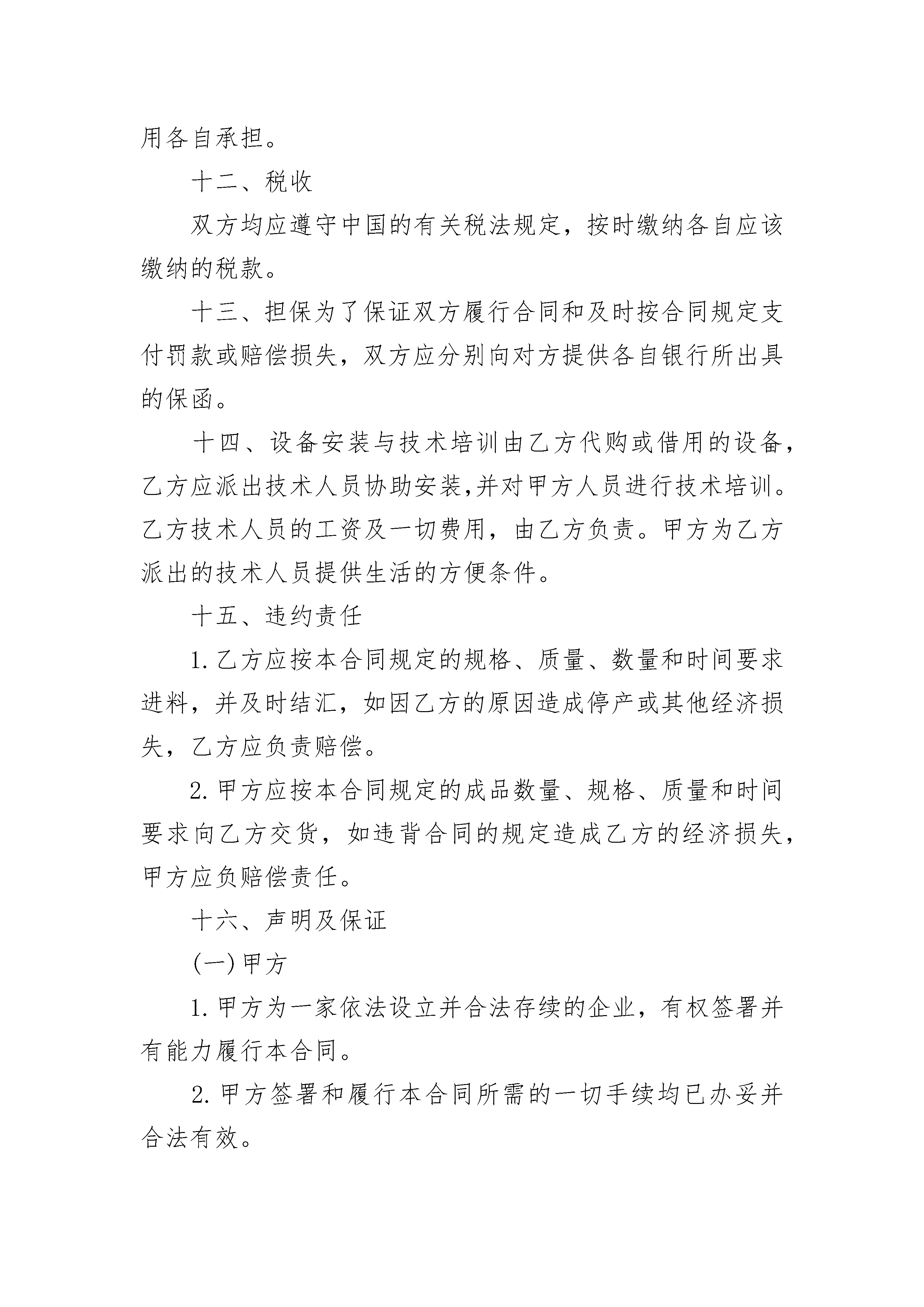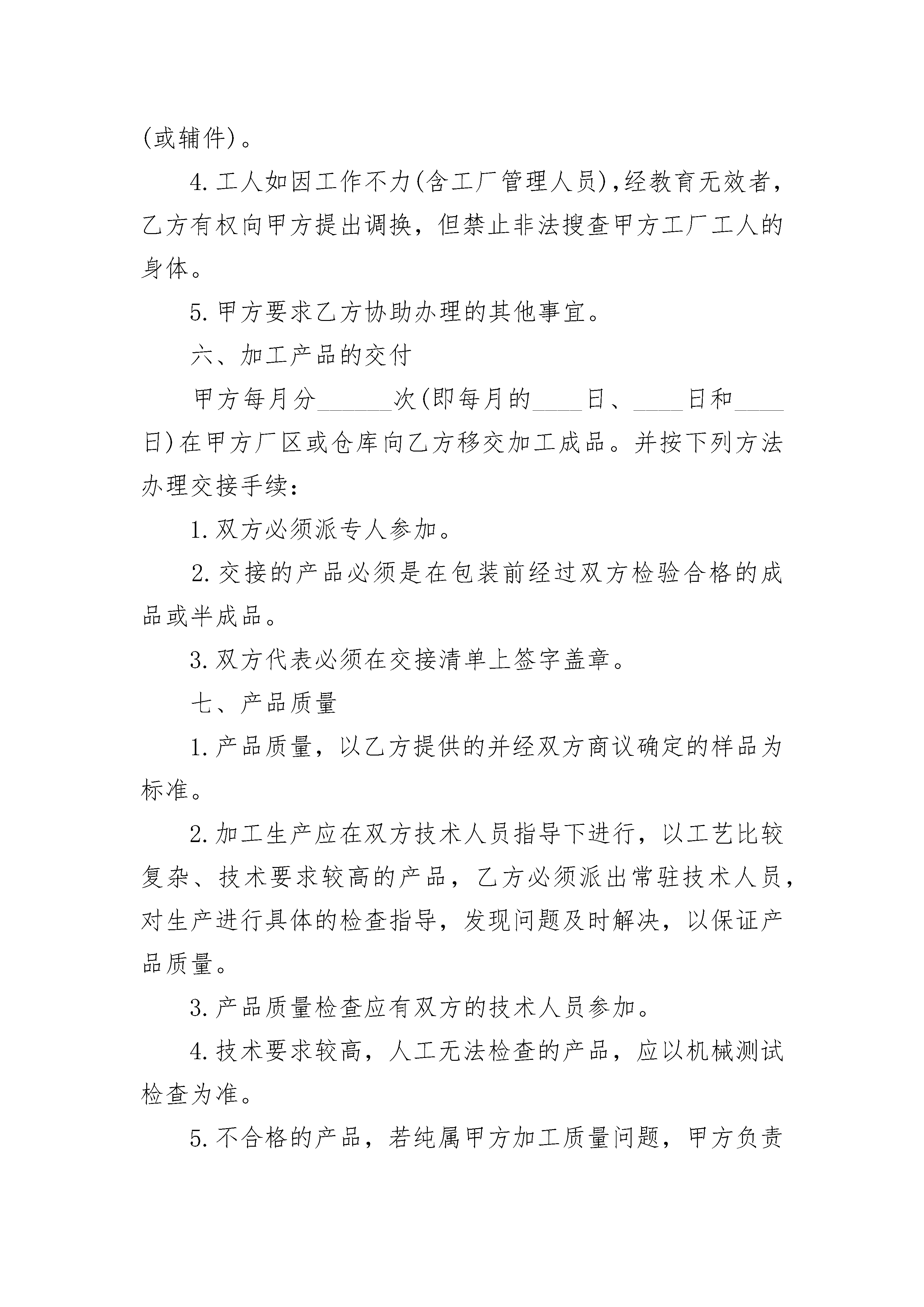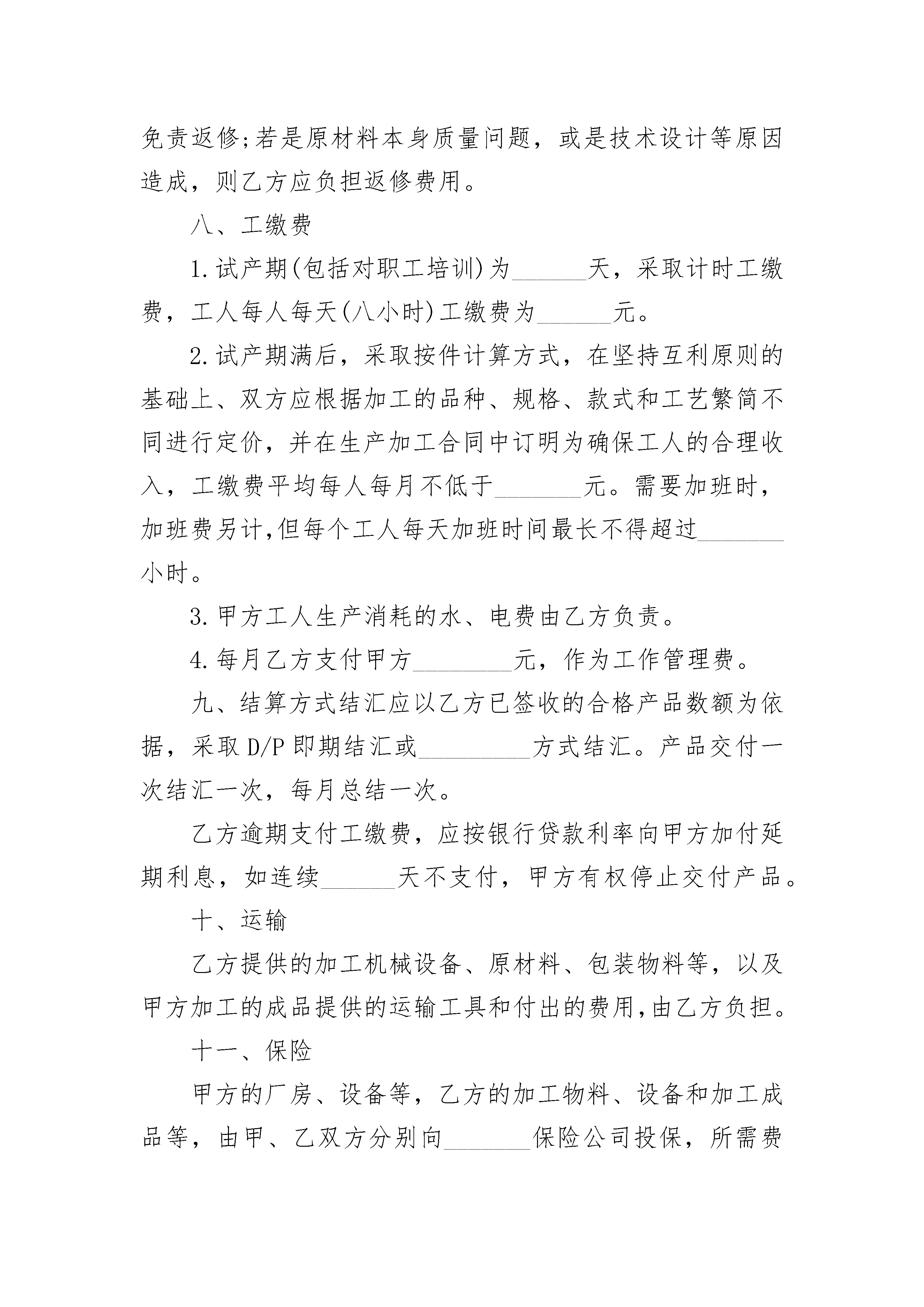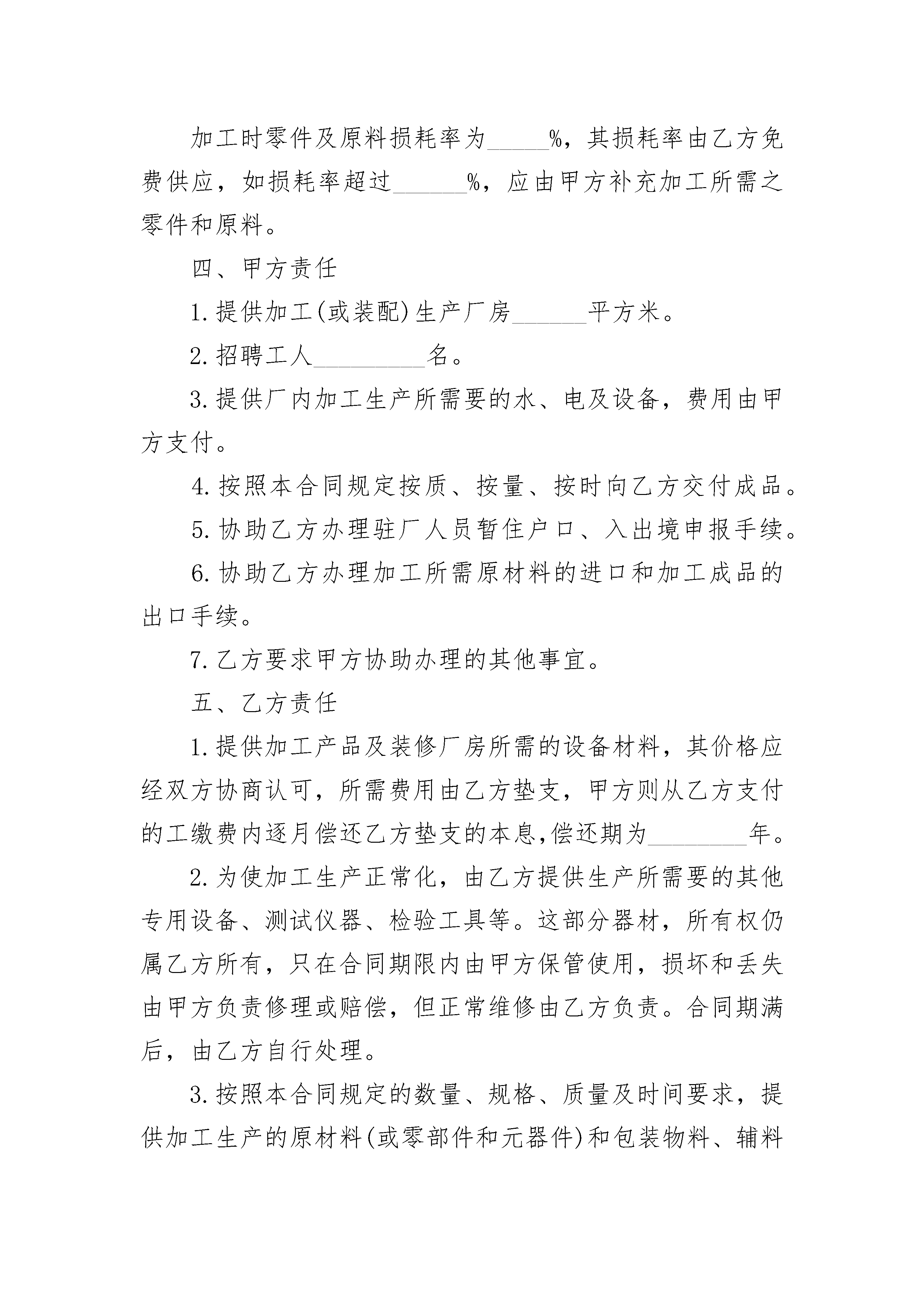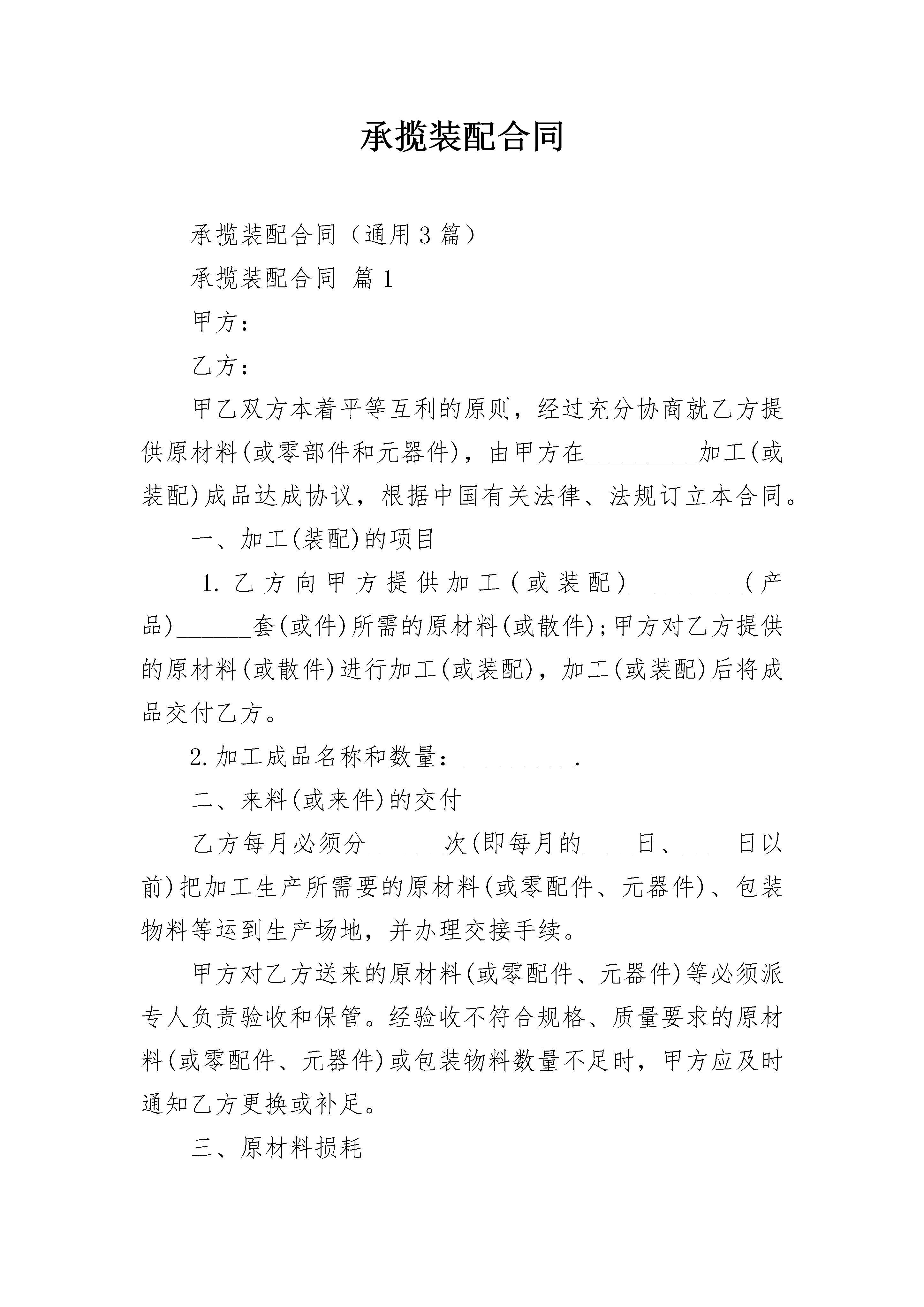 承揽装配合同承揽装配合同(通用3篇)承揽装配合同篇1甲方:乙方:甲乙双方本着平等互利的原则,经过充分协商就乙方提供原材料(或零部件和元器件),由甲方在_________加工(或装配)成品达成协议,根据中国有关法律、法规订立本合同。一、加工(装配)的项目1.乙方向甲方提供加工(或装配)_________(产品)______套(或件)所需的原材料(或散件);甲方对乙方提供的原材料(或散件)进行加工(或装配),加工(或装配)后将成品交付乙方。2.加工成品名称和数量:_________.二、来料(或来件)的交付乙方每月必须分______次(即每月的____日、____日以前)把加工生产所需要的原材料(或零配件、元器件)、包装物料等运到生产场地,并办理交接手续。甲方对乙方送来的原材料(或零配件、元器件)等必须派专人负责验收和保管。经验收不符合规格、质量要求的原材料(或零配件、元器件)或包装物料数量不足时,甲方应及时通知乙方更换或补足。三、原材料损耗加工时零件及原料损耗率为_____%,其损耗率由乙方免费供应,如损耗率超过______%,应由甲方补充加工所需之零件和原料。四、甲方责任1.提供加工(或装配)生产厂房______平方米。2.招聘工人_________名。3.提供厂内加工生产所需要的水、电及设备,费用由甲方支付。4.按照本合同规定按质、按量、按时向乙方交付成品。5.协助乙方办理驻厂人员暂住户口、入出境申报手续。6.协助乙方办理加工所需原材料的进口和加工成品的出口手续。7.乙方要求甲方协助办理的其他事宜。五、乙方责任1.提供加工产品及装修厂房所需的设备材料,其价格应经双方协商认可,所需费用由乙方垫支,甲方则从乙方支付的工缴费内逐月偿还乙方垫支的本息,偿还期为________年。2.为使加工生产正常化,由乙方提供生产所需要的其他专用设备、测试仪器、检验工具等。这部分器材,所有权仍属乙方所有,只在合同期限内由甲方保管使用,损坏和丢失由甲方负责修理或赔偿,但正常维修由乙方负责。合同期满后,由乙方自行处理。3.按照本合同规定的数量、规格、质量及时间要求,提供加工生产的原材料(或零部件和元器件)和包装物料、辅料(或辅件)。4.工人如因工作不力(含工厂管理人员),经教育无效者,乙方有权向甲方提出调换,但禁止非法搜查甲方工厂工人的身体。5.甲方要求乙方协助办理的其他事宜。六、加工产品的交付甲方每月分______次(即每月的____日、____日和____日)在甲方厂区或仓库向乙方移交加工成品。并按下列方法办理交接手续:1.双方必须派专人参加。2.交接的产品必须是在包装前经过双方检验合格的成品或半成品。3.双方代表必须在交接清单上签字盖章。七、产品质量1.产品质量,以乙方提供的并经双方商议确定的样品为标准。2.加工生产应在双方技术人员指导下进行,以工艺比较复杂、技术要求较高的产品,乙方必须派出常驻技术人员,对生产进行具体的检查指导,发现问题及时解决,以保证产品质量。3.产品质量检查应有双方的技术人员参加。4.技术要求较高,人工无法检查的产品,应以机械测试检查为准。5.不合格的产品,若纯属甲方加工质量问题,甲方负责免责返修;若是原材料本身质量问题,或是技术设计等原因造成,则乙方应负担返修费用。八、工缴费1.试产期(包括对职工培训)为______天,采取计时工缴费,工人每人每天(八小时)工缴费为______元。2.试产期满后,采取按件计算方式,在坚持互利原则的基础上、双方应根据加工的品种、规格、款式和工艺繁简不同进行定价,并在生产加工合同中订明为确保工人的合理收入,工缴费平均每人每月不低于_______元。需要加班时,加班费另计,但每个工人每天加班时间最长不得超过_______小时。3.甲方工人生产消耗的水、电费由乙方负责。4.每月乙方支付甲方________元,作为工作管理费。九、结算方式结汇应以乙方已签收的合格产品数额为依据,采取D/P即期结汇或_________方式结汇。产品交付一次结汇一次,每月总结一次。乙方逾期支付工缴费,应按银行贷款利率向甲方加付延期利息,如连续______天不支付,甲方有权停止交付产品。十、运输乙方提供的加工机械设备、原材料、包装物料等,以及甲方加工的成品提供的运输工具和付出的费用,由乙方负担。十一、保险甲方的厂房、设备等,乙方的加工物料、设备和加工成品等,由甲、乙双方分别向_______保险公司投保,所需费用各自承担。十二、税收双方均应遵守中国的有关税法规定,按时缴纳各自应该缴纳的税款。十三、担保为了保证双方履行合同和及时按合同规定支付罚款或赔偿损失,双方应分别向对方提供各自银行所出具的保函。十四、设备安装与技术培训由乙方代购或借用的设备,乙方应派出技术人员协助安装,并对甲方人员进行技术培训。乙方技术人员的工资及一