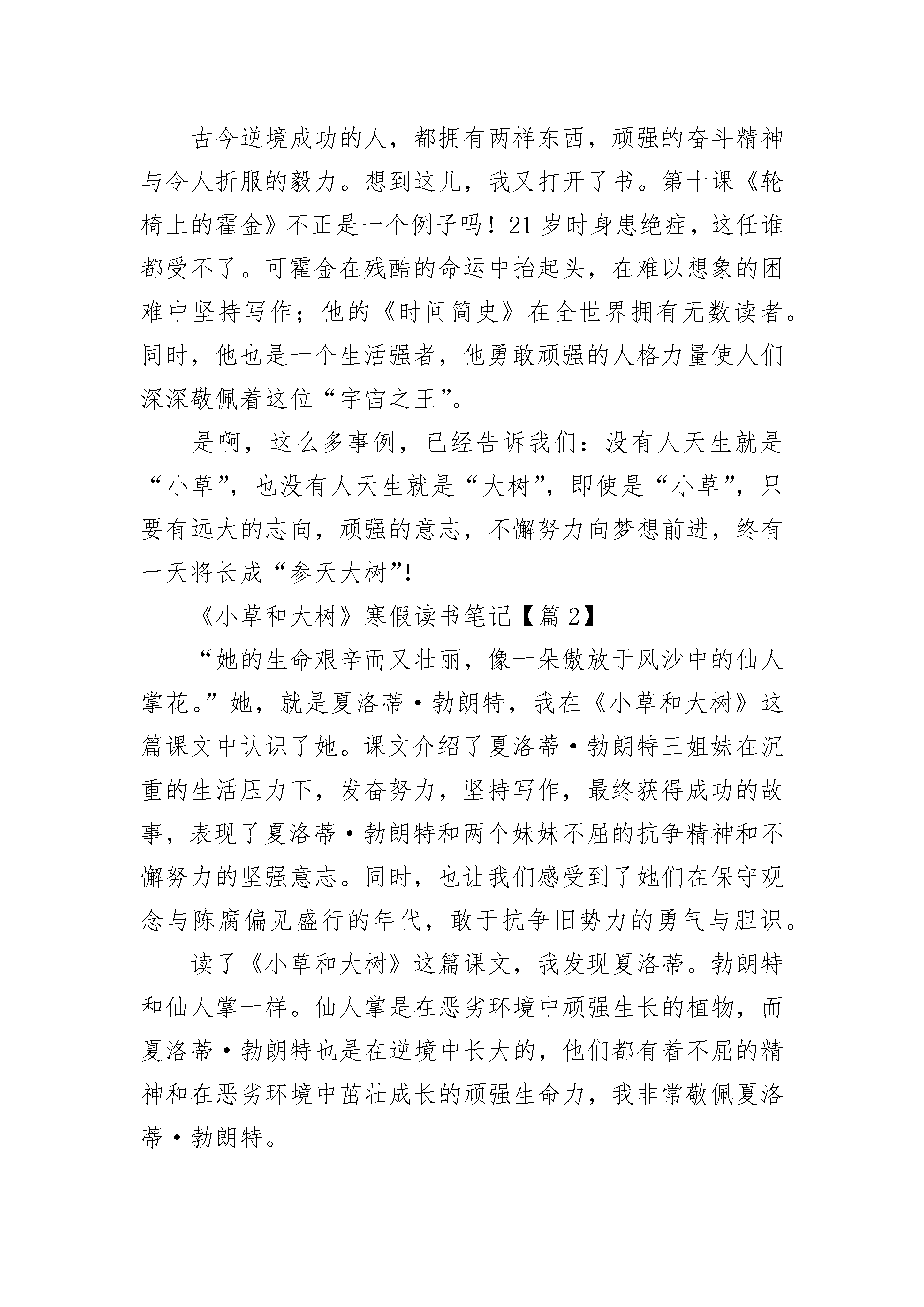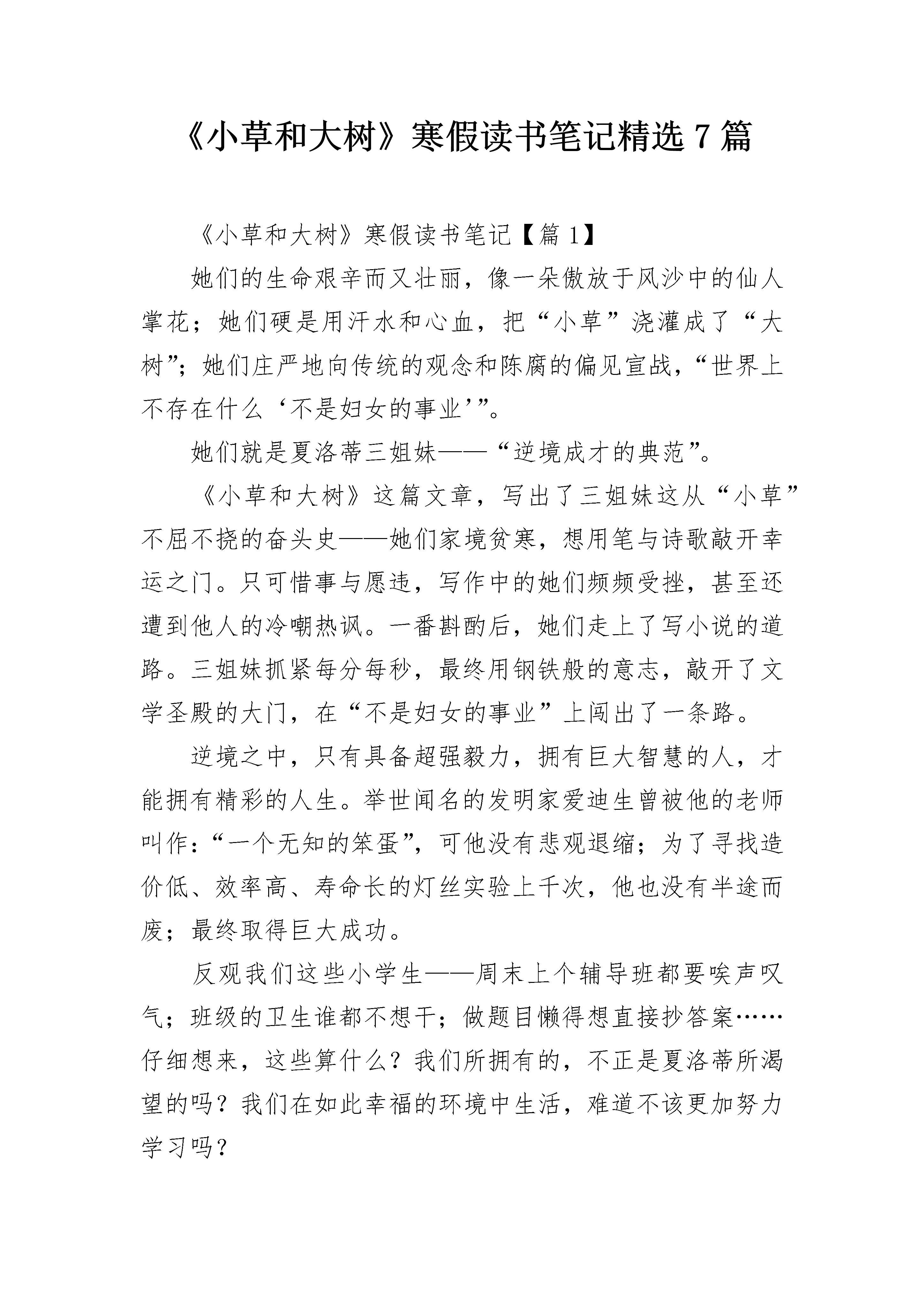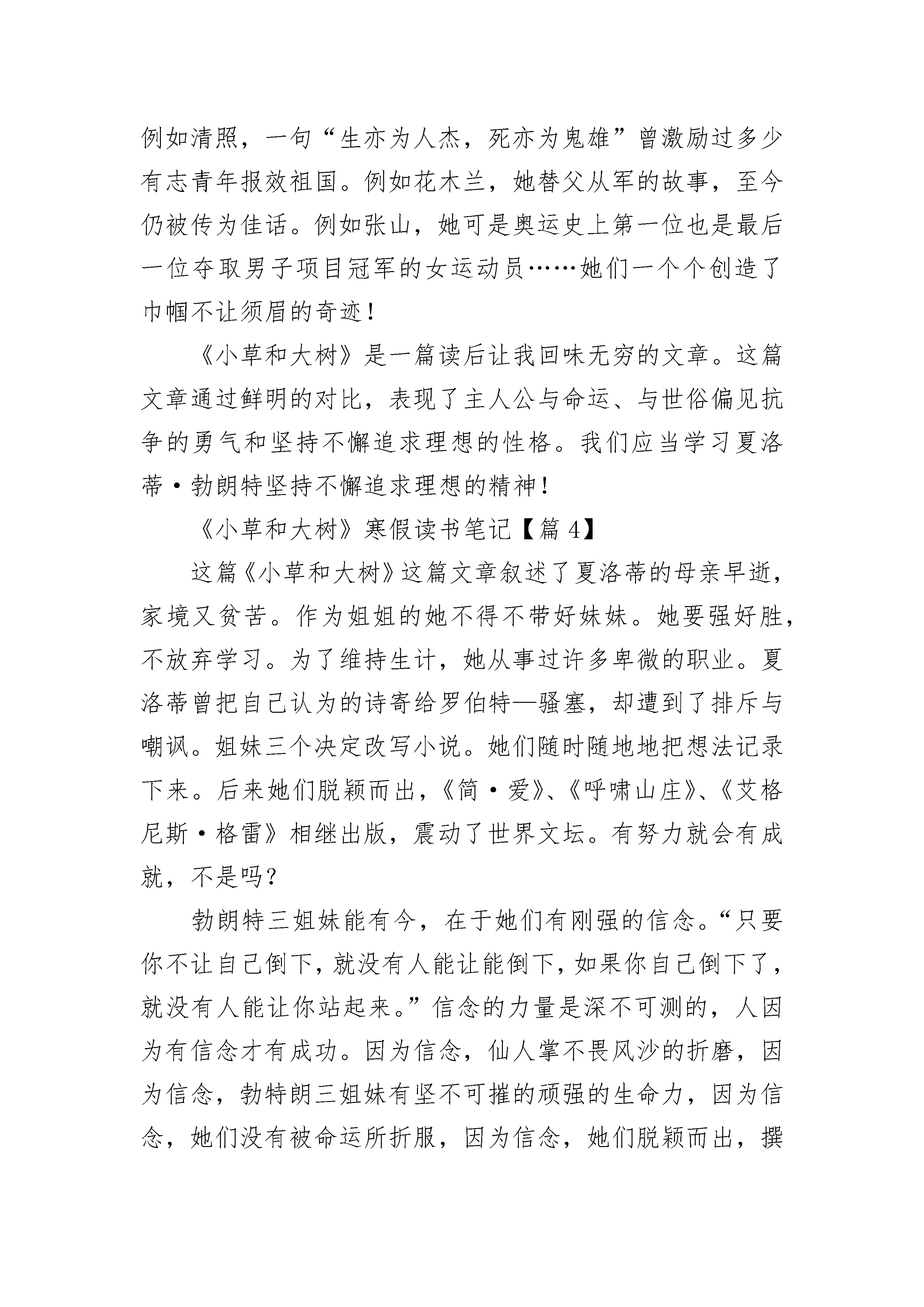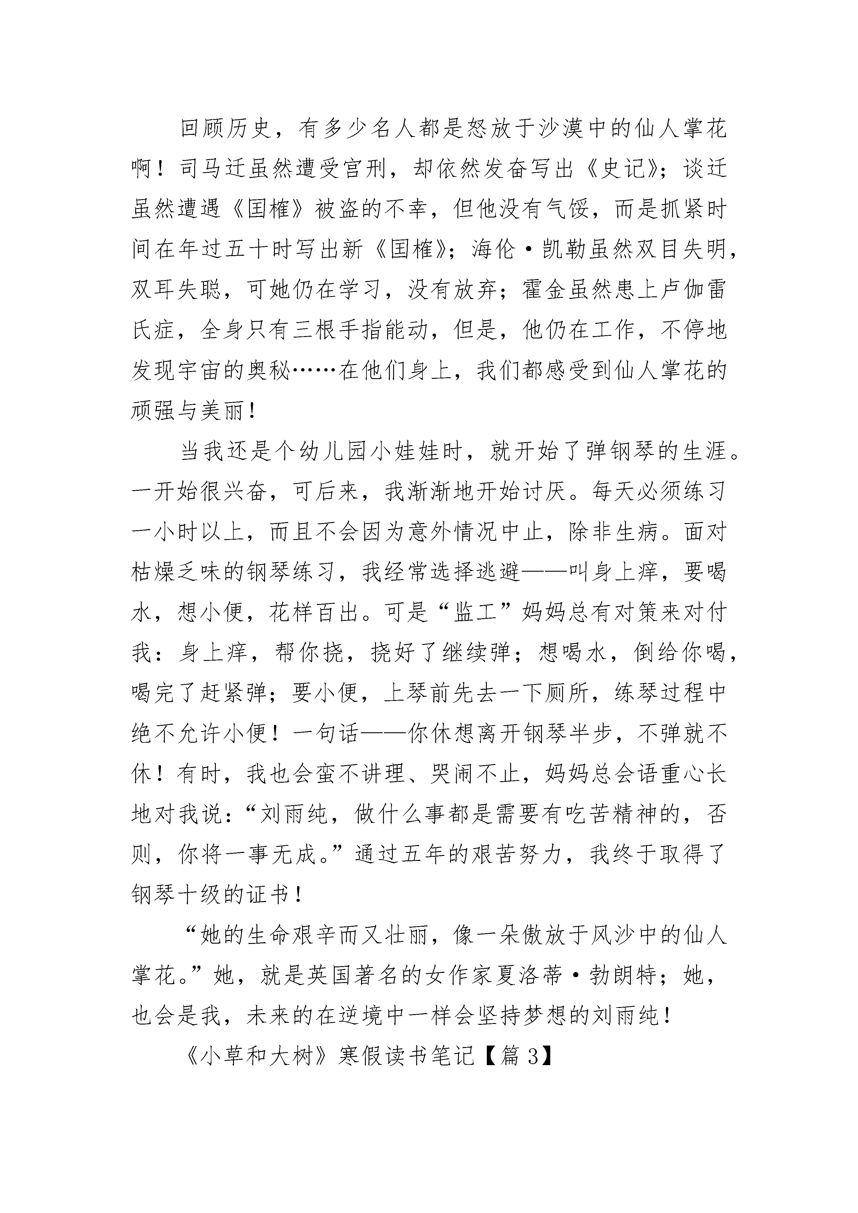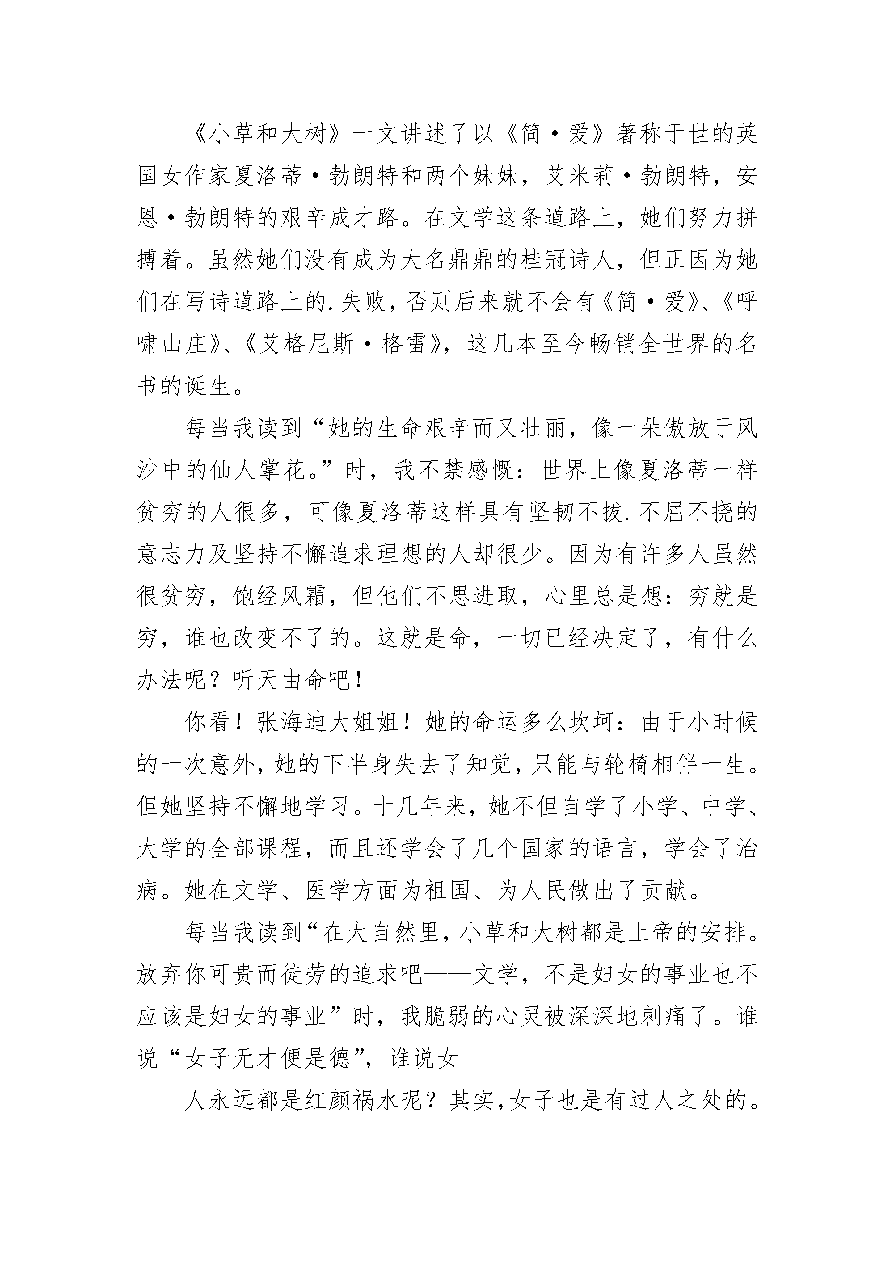 《小草和大树》寒假读书笔记精选7篇《小草和大树》寒假读书笔记【篇1】她们的生命艰辛而又壮丽,像一朵傲放于风沙中的仙人掌花;她们硬是用汗水和心血,把“小草”浇灌成了“大树”;她们庄严地向传统的观念和陈腐的偏见宣战,“世界上不存在什么‘不是妇女的事业’”。她们就是夏洛蒂三姐妹——“逆境成才的典范”。《小草和大树》这篇文章,写出了三姐妹这从“小草”不屈不挠的奋头史——她们家境贫寒,想用笔与诗歌敲开幸运之门。只可惜事与愿违,写作中的她们频频受挫,甚至还遭到他人的冷嘲热讽。一番斟酌后,她们走上了写小说的道路。三姐妹抓紧每分每秒,最终用钢铁般的意志,敲开了文学圣殿的大门,在“不是妇女的事业”上闯出了一条路。逆境之中,只有具备超强毅力,拥有巨大智慧的人,才能拥有精彩的人生。举世闻名的发明家爱迪生曾被他的老师叫作:“一个无知的笨蛋”,可他没有悲观退缩;为了寻找造价低、效率高、寿命长的灯丝实验上千次,他也没有半途而废;最终取得巨大成功。反观我们这些小学生——周末上个辅导班都要唉声叹气;班级的卫生谁都不想干;做题目懒得想直接抄答案……仔细想来,这些算什么?我们所拥有的,不正是夏洛蒂所渴望的吗?我们在如此幸福的环境中生活,难道不该更加努力学习吗?古今逆境成功的人,都拥有两样东西,顽强的奋斗精神与令人折服的毅力。想到这儿,我又打开了书。第十课《轮椅上的霍金》不正是一个例子吗!21岁时身患绝症,这任谁都受不了。可霍金在残酷的命运中抬起头,在难以想象的困难中坚持写作;他的《时间简史》在全世界拥有无数读者。同时,他也是一个生活强者,他勇敢顽强的人格力量使人们深深敬佩着这位“宇宙之王”。是啊,这么多事例,已经告诉我们:没有人天生就是“小草”,也没有人天生就是“大树”,即使是“小草”,只要有远大的志向,顽强的意志,不懈努力向梦想前进,终有一天将长成“参天大树”!《小草和大树》寒假读书笔记【篇2】“她的生命艰辛而又壮丽,像一朵傲放于风沙中的仙人掌花。”她,就是夏洛蒂·勃朗特,我在《小草和大树》这篇课文中认识了她。课文介绍了夏洛蒂·勃朗特三姐妹在沉重的生活压力下,发奋努力,坚持写作,最终获得成功的故事,表现了夏洛蒂·勃朗特和两个妹妹不屈的抗争精神和不懈努力的坚强意志。同时,也让我们感受到了她们在保守观念与陈腐偏见盛行的年代,敢于抗争旧势力的勇气与胆识。读了《小草和大树》这篇课文,我发现夏洛蒂。勃朗特和仙人掌一样。仙人掌是在恶劣环境中顽强生长的植物,而夏洛蒂·勃朗特也是在逆境中长大的,他们都有着不屈的精神和在恶劣环境中茁壮成长的顽强生命力,我非常敬佩夏洛蒂·勃朗特。回顾历史,有多少名人都是怒放于沙漠中的仙人掌花啊!司马迁虽然遭受宫刑,却依然发奋写出《史记》;谈迁虽然遭遇《囯榷》被盗的不幸,但他没有气馁,而是抓紧时间在年过五十时写出新《囯榷》;海伦·凯勒虽然双目失明,双耳失聪,可她仍在学习,没有放弃;霍金虽然患上卢伽雷氏症,全身只有三根手指能动,但是,他仍在工作,不停地发现宇宙的奥秘……在他们身上,我们都感受到仙人掌花的顽强与美丽!当我还是个幼儿园小娃娃时,就开始了弹钢琴的生涯。一开始很兴奋,可后来,我渐渐地开始讨厌。每天必须练习一小时以上,而且不会因为意外情况中止,除非生病。面对枯燥乏味的钢琴练习,我经常选择逃避——叫身上痒,要喝水,想小便,花样百出。可是“监工”妈妈总有对策来对付我:身上痒,帮你挠,挠好了继续弹;想喝水,倒给你喝,喝完了赶紧弹;要小便,上琴前先去一下厕所,练琴过程中绝不允许小便!一句话——你休想离开钢琴半步,不弹就不休!有时,我也会蛮不讲理、哭闹不止,妈妈总会语重心长地对我说:“刘雨纯,做什么事都是需要有吃苦精神的,否则,你将一事无成。”通过五年的艰苦努力,我终于取得了钢琴十级的证书!“她的生命艰辛而又壮丽,像一朵傲放于风沙中的仙人掌花。”她,就是英国著名的女作家夏洛蒂·勃朗特;她,也会是我,未来的在逆境中一样会坚持梦想的刘雨纯!《小草和大树》寒假读书笔记【篇3】《小草和大树》一文讲述了以《简·爱》著称于世的英国女作家夏洛蒂·勃朗特和两个妹妹,艾米莉·勃朗特,安恩·勃朗特的艰辛成才路。在文学这条道路上,她们努力拼搏着。虽然她们没有成为大名鼎鼎的桂冠诗人,但正因为她们在写诗道路上的.失败,否则后来就不会有《简·爱》、《呼啸山庄》、《艾格尼斯·格雷》,这几本至今畅销全世界的名书的诞生。每当我读到“她的生命艰辛而又壮丽,像一朵傲放于风沙中的仙人掌花。”时,我不禁感慨:世界上像夏洛蒂一样贫穷的人很多,可像夏洛蒂这样具有坚韧不拔.不屈不挠的意志力及坚持不懈追求理想的人却很少。因为有许多人虽然很贫穷,饱经风霜,但他们不思进取,心里总是想:穷就是穷,谁也改变不了的。这就是命,一切已经决定了,有什么办法呢?听天由命吧!你看!张海迪大姐姐!她的命运多么坎坷:由于