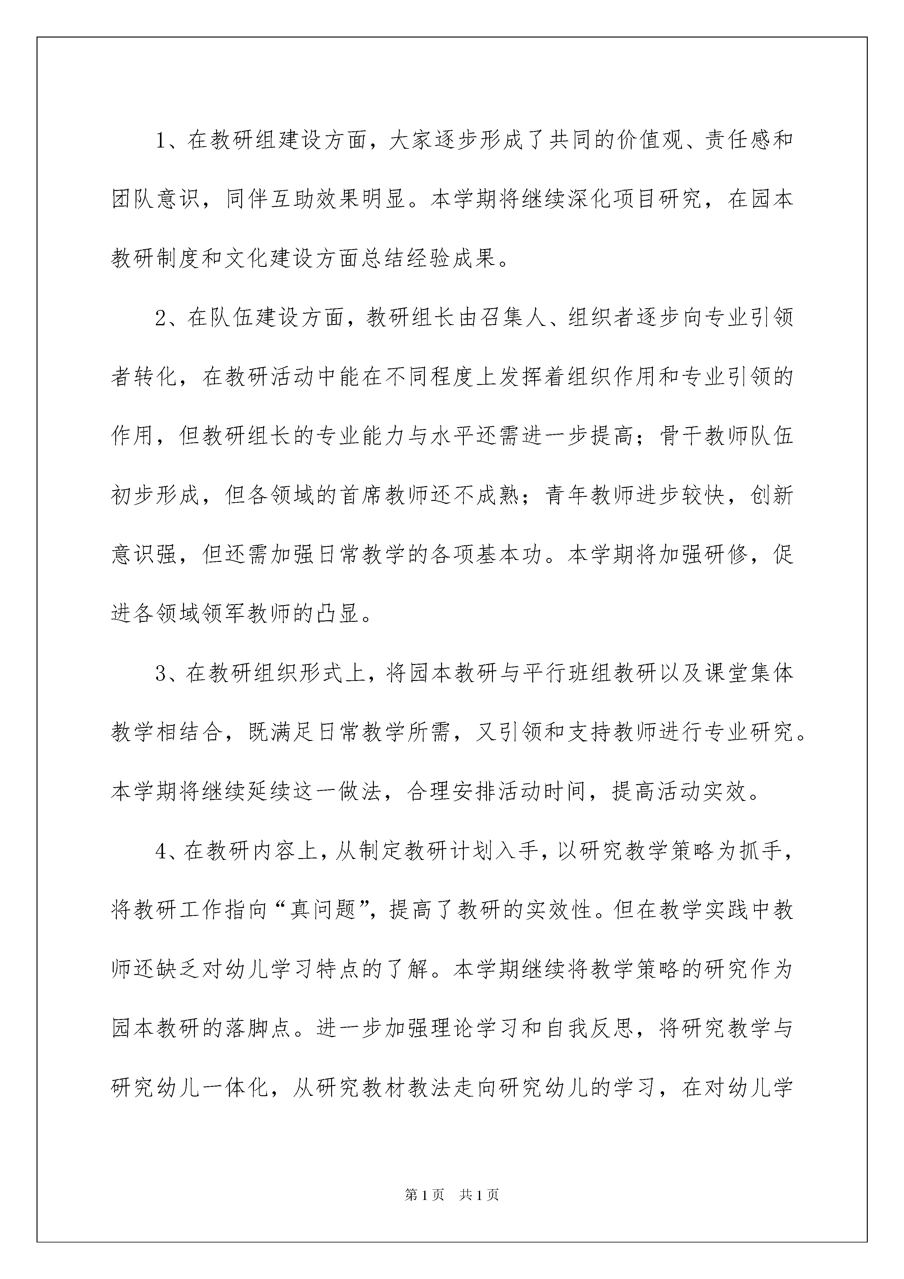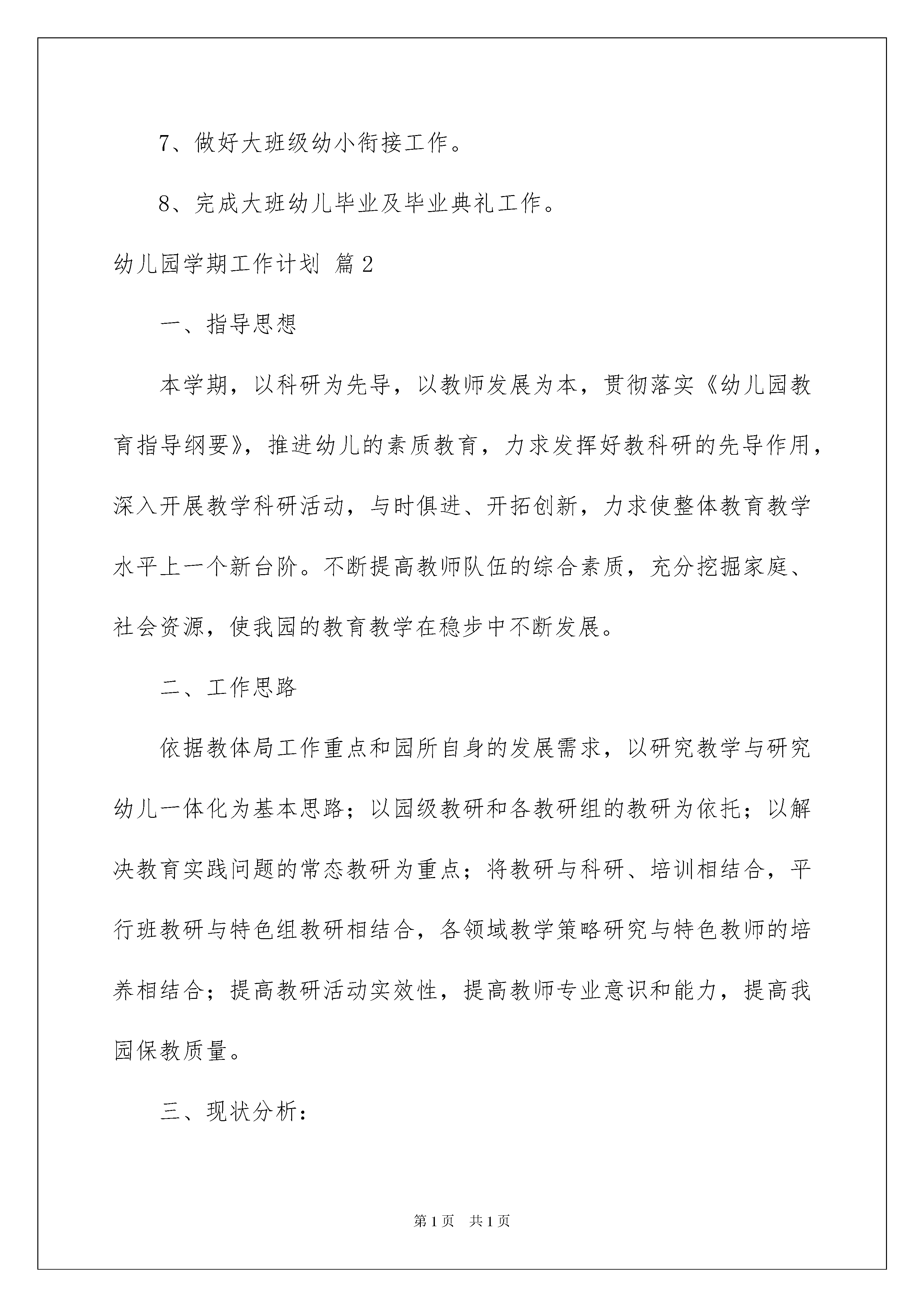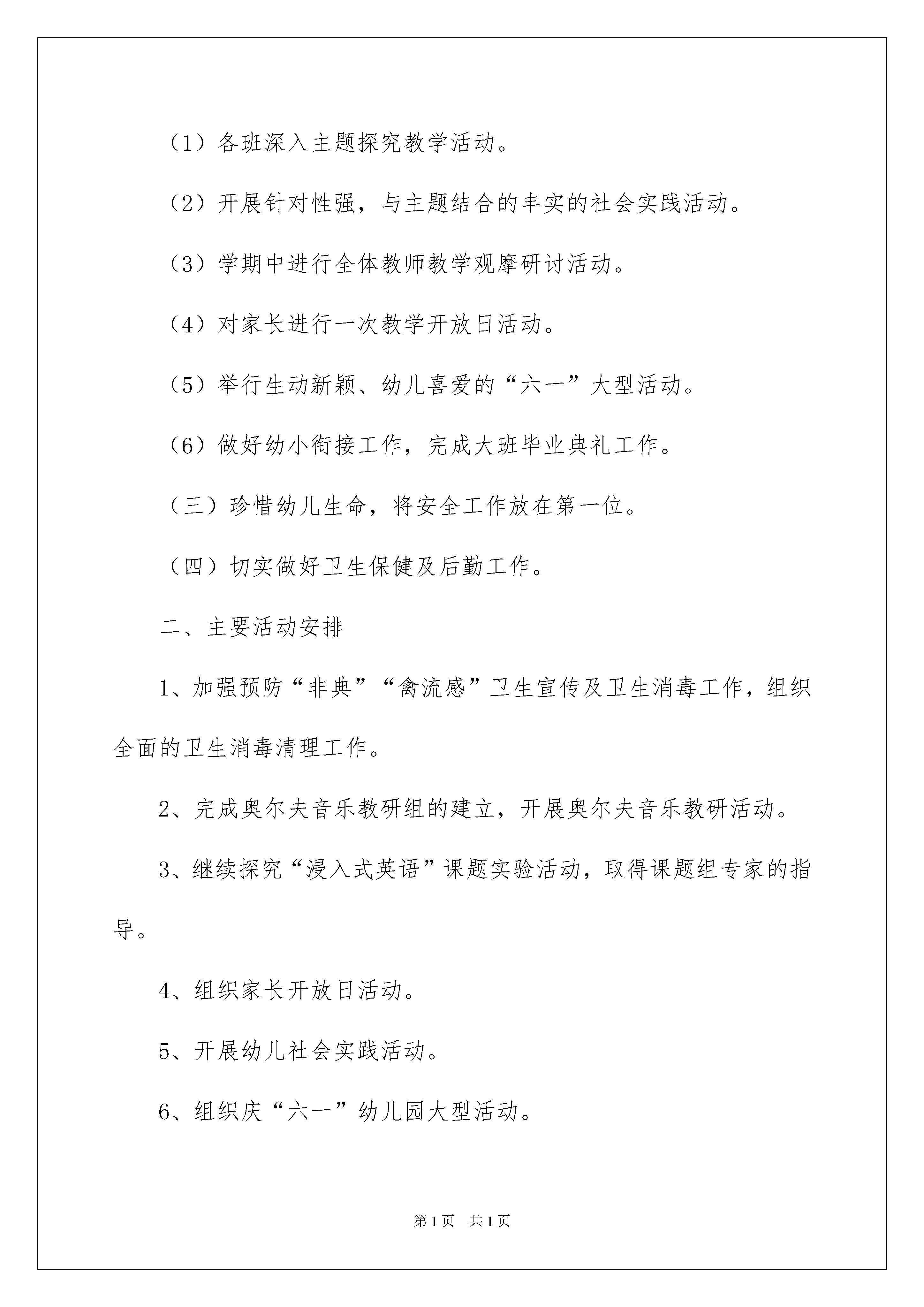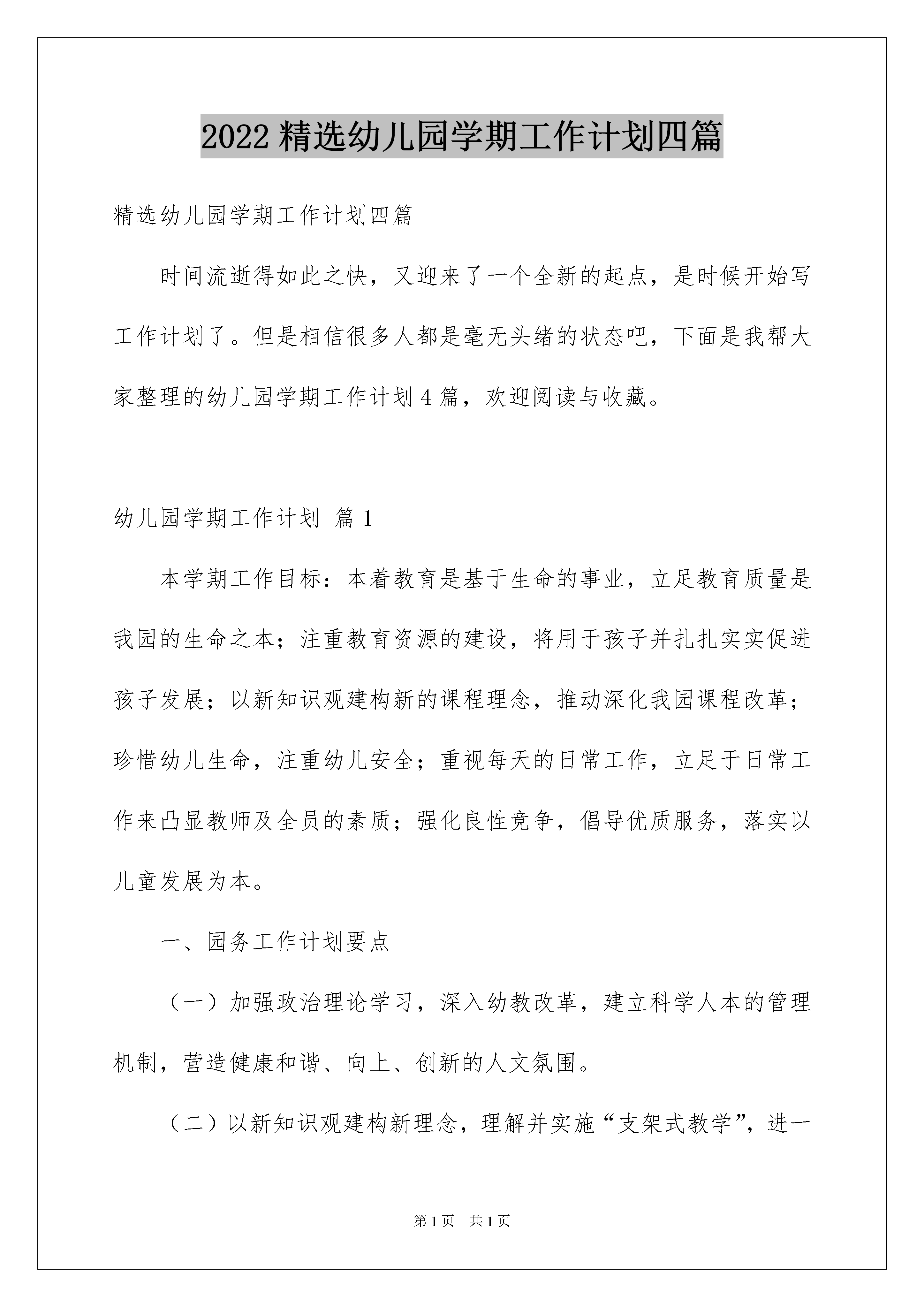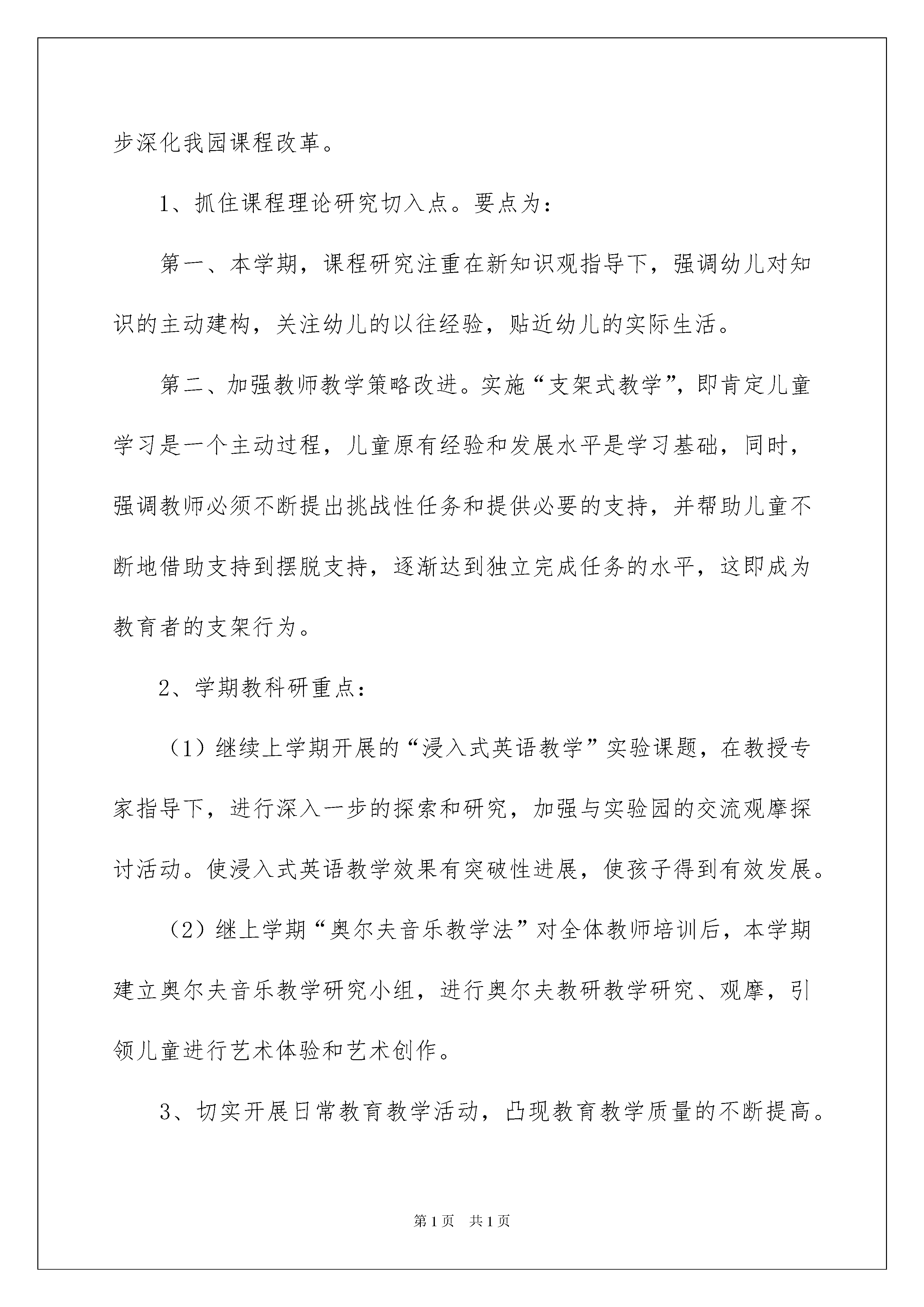 2022精选幼儿园学期工作计划四篇精选幼儿园学期工作计划四篇时间流逝得如此之快,又迎来了一个全新的起点,是时候开始写工作计划了。但是相信很多人都是毫无头绪的状态吧,下面是我帮大家整理的幼儿园学期工作计划4篇,欢迎阅读与收藏。幼儿园学期工作计划篇1本学期工作目标:本着教育是基于生命的事业,立足教育质量是我园的生命之本;注重教育资源的建设,将用于孩子并扎扎实实促进孩子发展;以新知识观建构新的课程理念,推动深化我园课程改革;珍惜幼儿生命,注重幼儿安全;重视每天的日常工作,立足于日常工作来凸显教师及全员的素质;强化良性竞争,倡导优质服务,落实以儿童发展为本。一、园务工作计划要点(一)加强政治理论学习,深入幼教改革,建立科学人本的管理机制,营造健康和谐、向上、创新的人文氛围。(二)以新知识观建构新理念,理解并实施“支架式教学”,进一步深化我园课程改革。1、抓住课程理论研究切入点。要点为:第一、本学期,课程研究注重在新知识观指导下,强调幼儿对知识的主动建构,关注幼儿的以往经验,贴近幼儿的实际生活。第二、加强教师教学策略改进。实施“支架式教学”,即肯定儿童学习是一个主动过程,儿童原有经验和发展水平是学习基础,同时,强调教师必须不断提出挑战性任务和提供必要的支持,并帮助儿童不断地借助支持到摆脱支持,逐渐达到独立完成任务的水平,这即成为教育者的支架行为。2、学期教科研重点:(1)继续上学期开展的“浸入式英语教学”实验课题,在教授专家指导下,进行深入一步的探索和研究,加强与实验园的交流观摩探讨活动。使浸入式英语教学效果有突破性进展,使孩子得到有效发展。(2)继上学期“奥尔夫音乐教学法”对全体教师培训后,本学期建立奥尔夫音乐教学研究小组,进行奥尔夫教研教学研究、观摩,引领儿童进行艺术体验和艺术创作。3、切实开展日常教育教学活动,凸现教育教学质量的不断提高。(1)各班深入主题探究教学活动。(2)开展针对性强,与主题结合的丰实的社会实践活动。(3)学期中进行全体教师教学观摩研讨活动。(4)对家长进行一次教学开放日活动。(5)举行生动新颖、幼儿喜爱的“六一”大型活动。(6)做好幼小衔接工作,完成大班毕业典礼工作。(三)珍惜幼儿生命,将安全工作放在第一位。(四)切实做好卫生保健及后勤工作。二、主要活动安排1、加强预防“非典”“禽流感”卫生宣传及卫生消毒工作,组织全面的卫生消毒清理工作。2、完成奥尔夫音乐教研组的建立,开展奥尔夫音乐教研活动。3、继续探究“浸入式英语”课题实验活动,取得课题组专家的指导。4、组织家长开放日活动。5、开展幼儿社会实践活动。6、组织庆“六一”幼儿园大型活动。7、做好大班级幼小衔接工作。8、完成大班幼儿毕业及毕业典礼工作。幼儿园学期工作计划篇2一、指导思想本学期,以科研为先导,以教师发展为本,贯彻落实《幼儿园教育指导纲要》,推进幼儿的素质教育,力求发挥好教科研的先导作用,深入开展教学科研活动,与时俱进、开拓创新,力求使整体教育教学水平上一个新台阶。不断提高教师队伍的综合素质,充分挖掘家庭、社会资源,使我园的教育教学在稳步中不断发展。二、工作思路依据教体局工作重点和园所自身的发展需求,以研究教学与研究幼儿一体化为基本思路;以园级教研和各教研组的教研为依托;以解决教育实践问题的常态教研为重点;将教研与科研、培训相结合,平行班教研与特色组教研相结合,各领域教学策略研究与特色教师的培养相结合;提高教研活动实效性,提高教师专业意识和能力,提高我园保教质量。三、现状分析:1、在教研组建设方面,大家逐步形成了共同的价值观、责任感和团队意识,同伴互助效果明显。本学期将继续深化项目研究,在园本教研制度和文化建设方面总结经验成果。2、在队伍建设方面,教研组长由召集人、组织者逐步向专业引领者转化,在教研活动中能在不同程度上发挥着组织作用和专业引领的作用,但教研组长的专业能力与水平还需进一步提高;骨干教师队伍初步形成,但各领域的首席教师还不成熟;青年教师进步较快,创新意识强,但还需加强日常教学的各项基本功。本学期将加强研修,促进各领域领军教师的凸显。3、在教研组织形式上,将园本教研与平行班组教研以及课堂集体教学相结合,既满足日常教学所需,又引领和支持教师进行专业研究。本学期将继续延续这一做法,合理安排活动时间,提高活动实效。4、在教研内容上,从制定教研计划入手,以研究教学策略为抓手,将教研工作指向“真问题”,提高了教研的实效性。但在教学实践中教师还缺乏对幼儿学习特点的了解。本学期继续将教学策略的研究作为园本教研的落脚点。进一步加强理论学习和自我反思,将研究教学与研究幼儿一体化,从研究教材教法走向研究幼