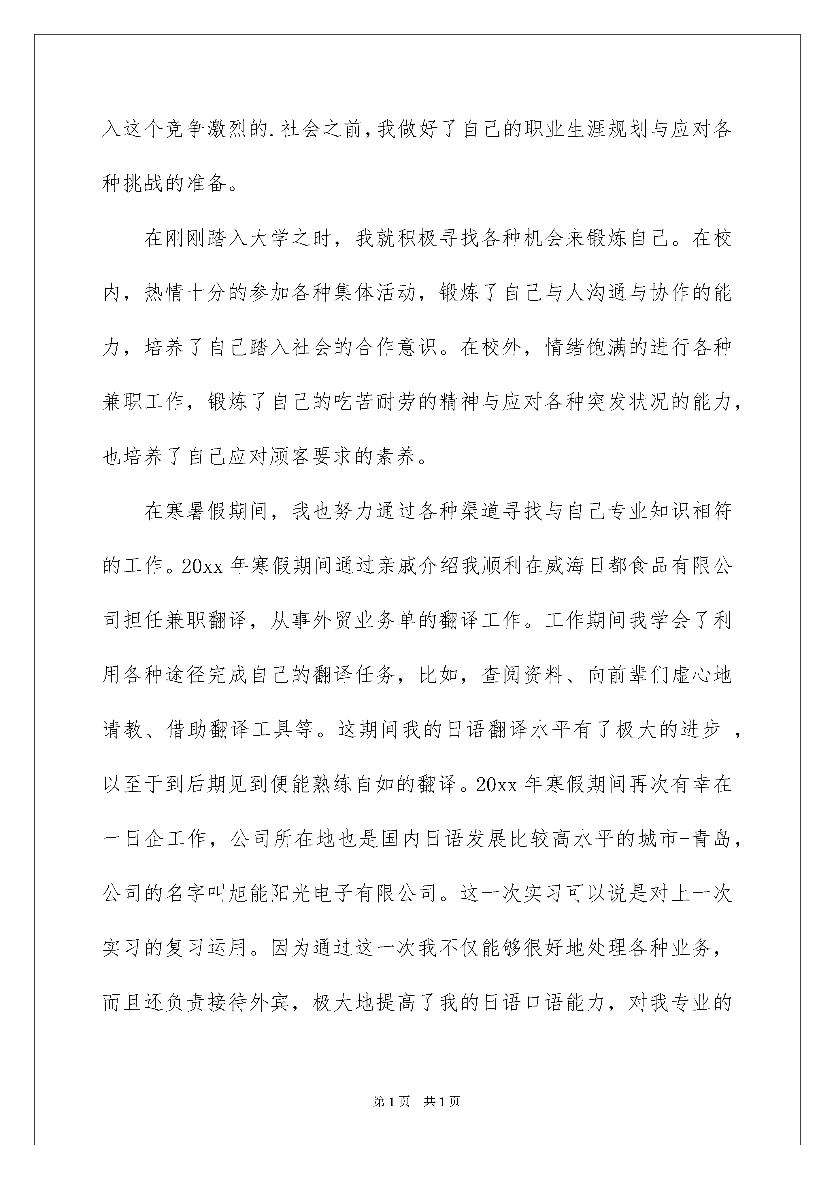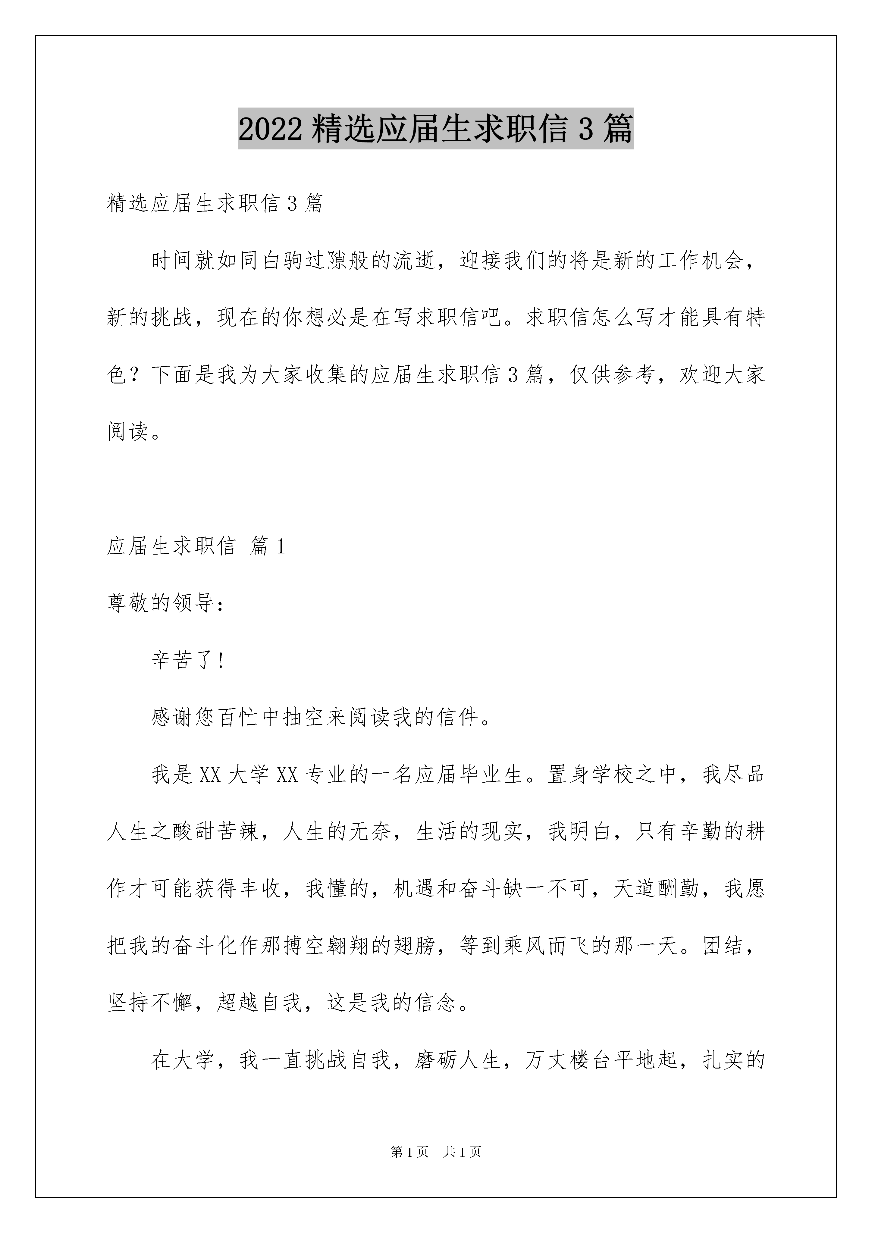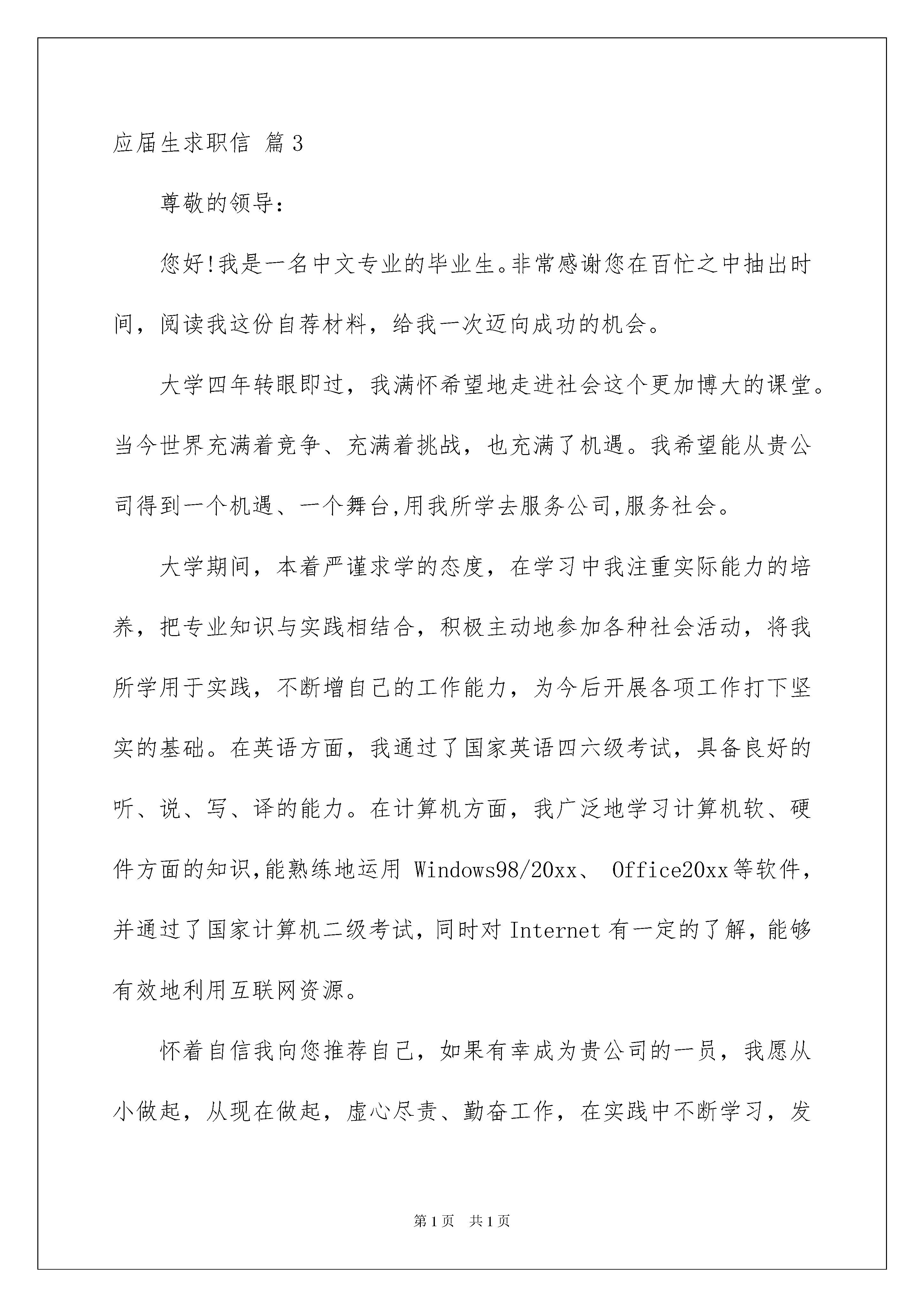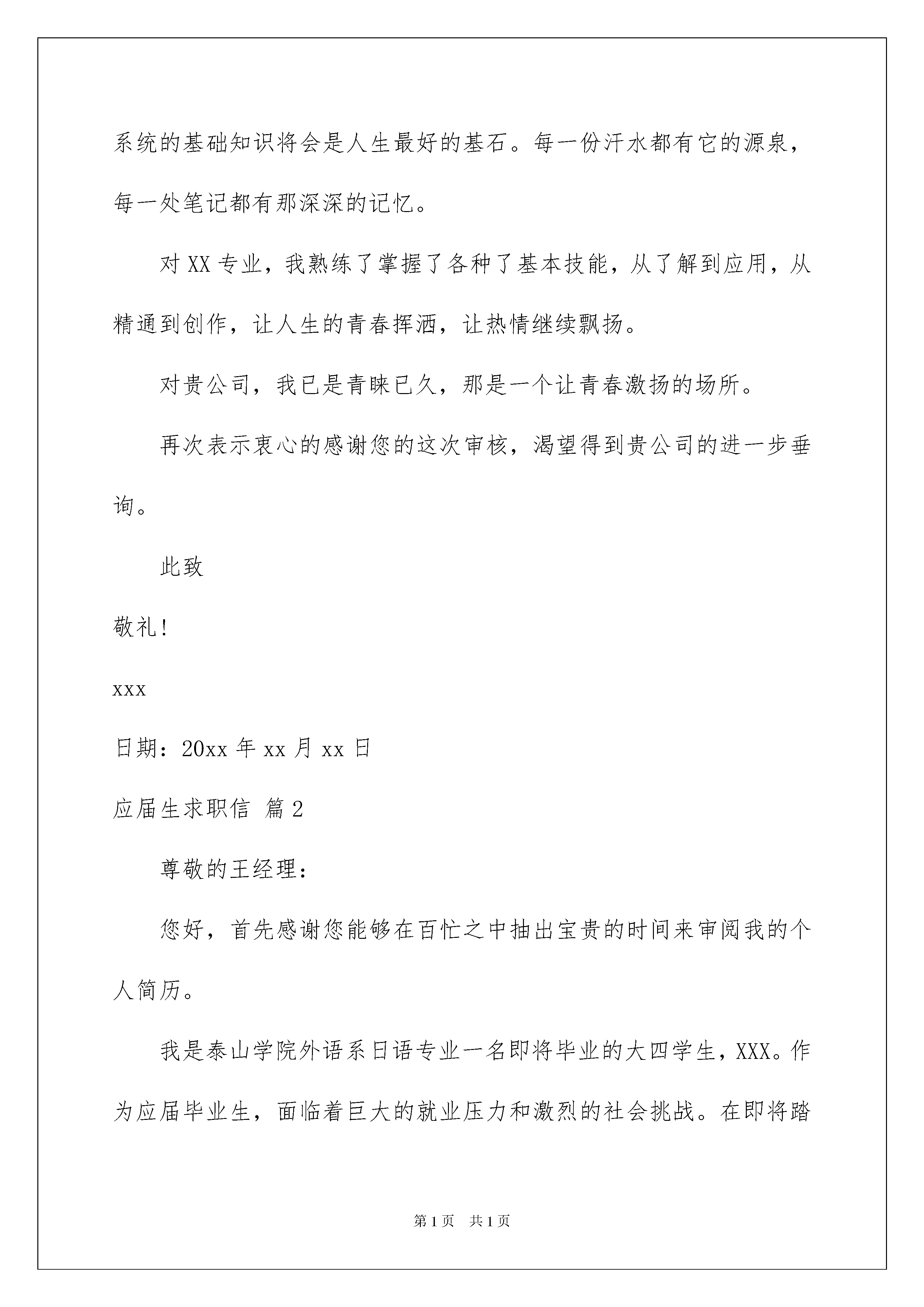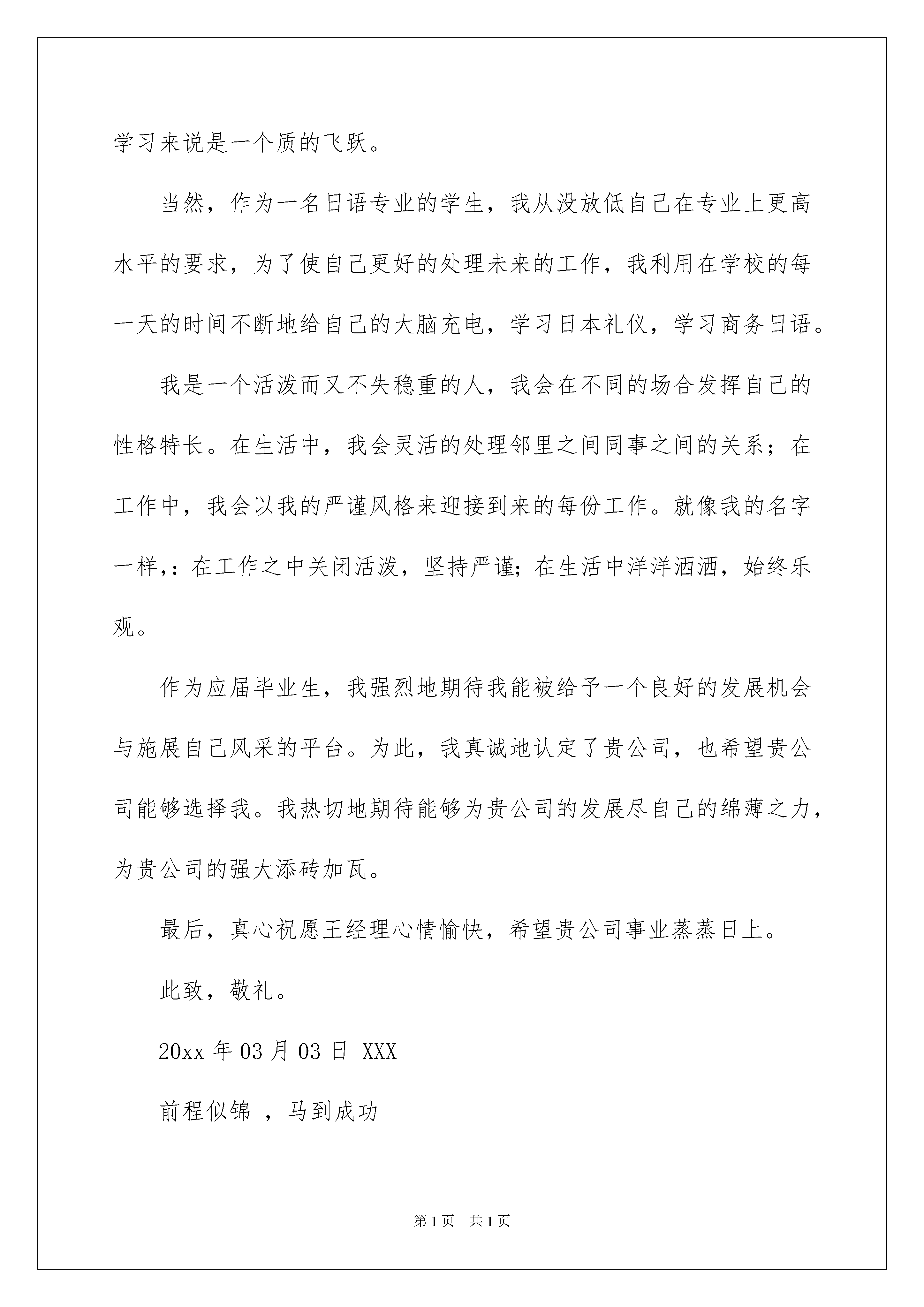 2022精选应届生求职信3篇精选应届生求职信3篇时间就如同白驹过隙般的流逝,迎接我们的将是新的工作机会,新的挑战,现在的你想必是在写求职信吧。求职信怎么写才能具有特色?下面是我为大家收集的应届生求职信3篇,仅供参考,欢迎大家阅读。应届生求职信篇1尊敬的领导:辛苦了!感谢您百忙中抽空来阅读我的信件。我是XX大学XX专业的一名应届毕业生。置身学校之中,我尽品人生之酸甜苦辣,人生的无奈,生活的现实,我明白,只有辛勤的耕作才可能获得丰收,我懂的,机遇和奋斗缺一不可,天道酬勤,我愿把我的奋斗化作那搏空翱翔的翅膀,等到乘风而飞的那一天。团结,坚持不懈,超越自我,这是我的信念。在大学,我一直挑战自我,磨砺人生,万丈楼台平地起,扎实的系统的基础知识将会是人生最好的基石。每一份汗水都有它的源泉,每一处笔记都有那深深的记忆。对XX专业,我熟练了掌握了各种了基本技能,从了解到应用,从精通到创作,让人生的青春挥洒,让热情继续飘扬。对贵公司,我已是青睐已久,那是一个让青春激扬的场所。再次表示衷心的感谢您的这次审核,渴望得到贵公司的进一步垂询。此致敬礼!xxx日期:20xx年xx月xx日应届生求职信篇2尊敬的王经理:您好,首先感谢您能够在百忙之中抽出宝贵的时间来审阅我的个人简历。我是泰山学院外语系日语专业一名即将毕业的大四学生,XXX。作为应届毕业生,面临着巨大的就业压力和激烈的社会挑战。在即将踏入这个竞争激烈的.社会之前,我做好了自己的职业生涯规划与应对各种挑战的准备。在刚刚踏入大学之时,我就积极寻找各种机会来锻炼自己。在校内,热情十分的参加各种集体活动,锻炼了自己与人沟通与协作的能力,培养了自己踏入社会的合作意识。在校外,情绪饱满的进行各种兼职工作,锻炼了自己的吃苦耐劳的精神与应对各种突发状况的能力,也培养了自己应对顾客要求的素养。在寒暑假期间,我也努力通过各种渠道寻找与自己专业知识相符的工作。20xx年寒假期间通过亲戚介绍我顺利在威海日都食品有限公司担任兼职翻译,从事外贸业务单的翻译工作。工作期间我学会了利用各种途径完成自己的翻译任务,比如,查阅资料、向前辈们虚心地请教、借助翻译工具等。这期间我的日语翻译水平有了极大的进步,以至于到后期见到便能熟练自如的翻译。20xx年寒假期间再次有幸在一日企工作,公司所在地也是国内日语发展比较高水平的城市-青岛,公司的名字叫旭能阳光电子有限公司。这一次实习可以说是对上一次实习的复习运用。因为通过这一次我不仅能够很好地处理各种业务,而且还负责接待外宾,极大地提高了我的日语口语能力,对我专业的学习来说是一个质的飞跃。当然,作为一名日语专业的学生,我从没放低自己在专业上更高水平的要求,为了使自己更好的处理未来的工作,我利用在学校的每一天的时间不断地给自己的大脑充电,学习日本礼仪,学习商务日语。我是一个活泼而又不失稳重的人,我会在不同的场合发挥自己的性格特长。在生活中,我会灵活的处理邻里之间同事之间的关系;在工作中,我会以我的严谨风格来迎接到来的每份工作。就像我的名字一样,:在工作之中关闭活泼,坚持严谨;在生活中洋洋洒洒,始终乐观。作为应届毕业生,我强烈地期待我能被给予一个良好的发展机会与施展自己风采的平台。为此,我真诚地认定了贵公司,也希望贵公司能够选择我。我热切地期待能够为贵公司的发展尽自己的绵薄之力,为贵公司的强大添砖加瓦。最后,真心祝愿王经理心情愉快,希望贵公司事业蒸蒸日上。此致,敬礼。20xx年03月03日XXX前程似锦,马到成功应届生求职信篇3尊敬的领导:您好!我是一名中文专业的毕业生。非常感谢您在百忙之中抽出时间,阅读我这份自荐材料,给我一次迈向成功的机会。大学四年转眼即过,我满怀希望地走进社会这个更加博大的课堂。当今世界充满着竞争、充满着挑战,也充满了机遇。我希望能从贵公司得到一个机遇、一个舞台,用我所学去服务公司,服务社会。大学期间,本着严谨求学的态度,在学习中我注重实际能力的培养,把专业知识与实践相结合,积极主动地参加各种社会活动,将我所学用于实践,不断增自己的工作能力,为今后开展各项工作打下坚实的基础。在英语方面,我通过了国家英语四六级考试,具备良好的听、说、写、译的能力。在计算机方面,我广泛地学习计算机软、硬件方面的知识,能熟练地运用Windows98/20xx、Office20xx等软件,并通过了国家计算机二级考试,同时对Internet有一定的了解,能够有效地利用互联网资源。怀着自信我向您推荐自己,如果有幸成为贵公司的一员,我愿从小做起,从现在做起,虚心尽责、勤奋工作,在实践中不断学习,发挥自己的主动性、创造性,竭力为公司的发展添一份光彩