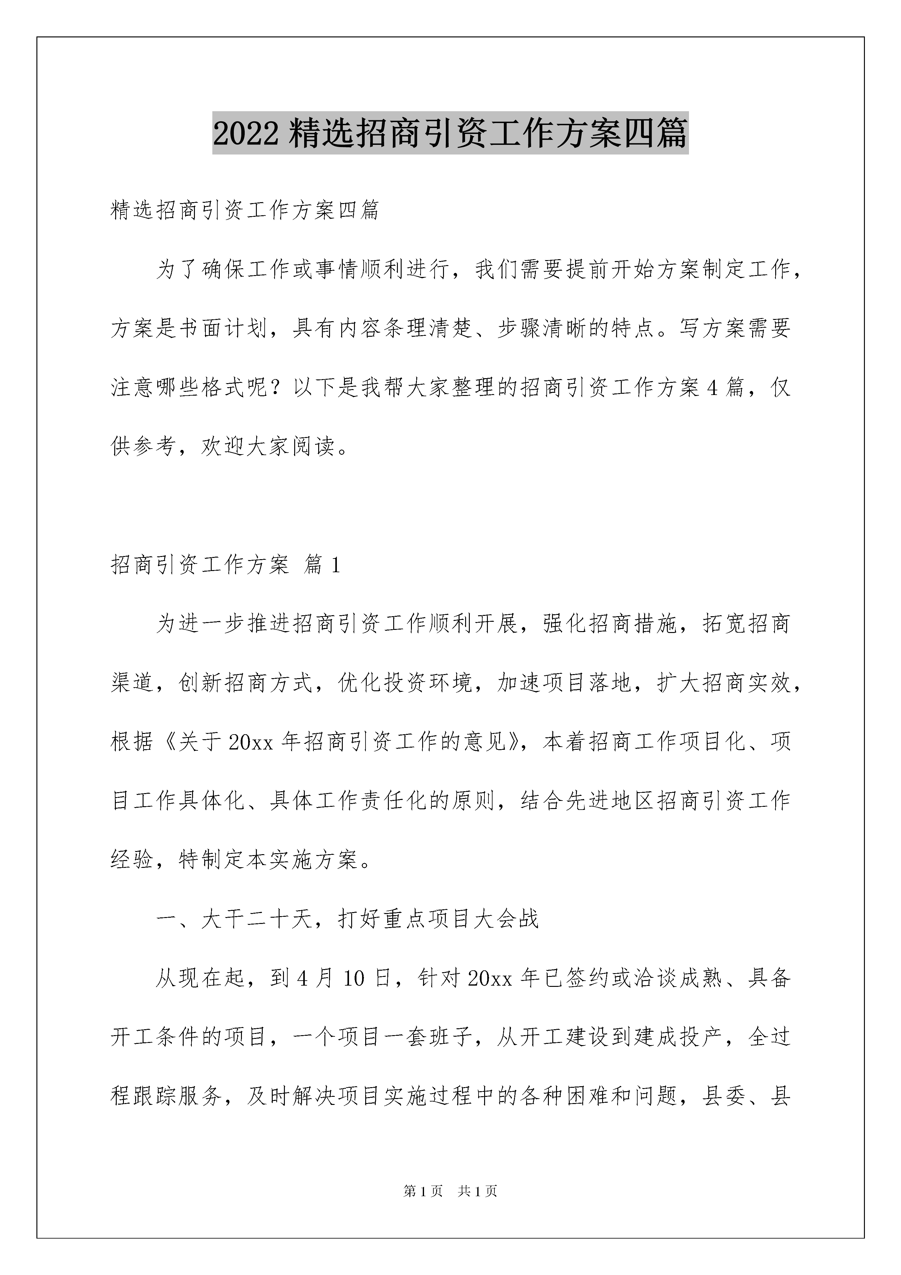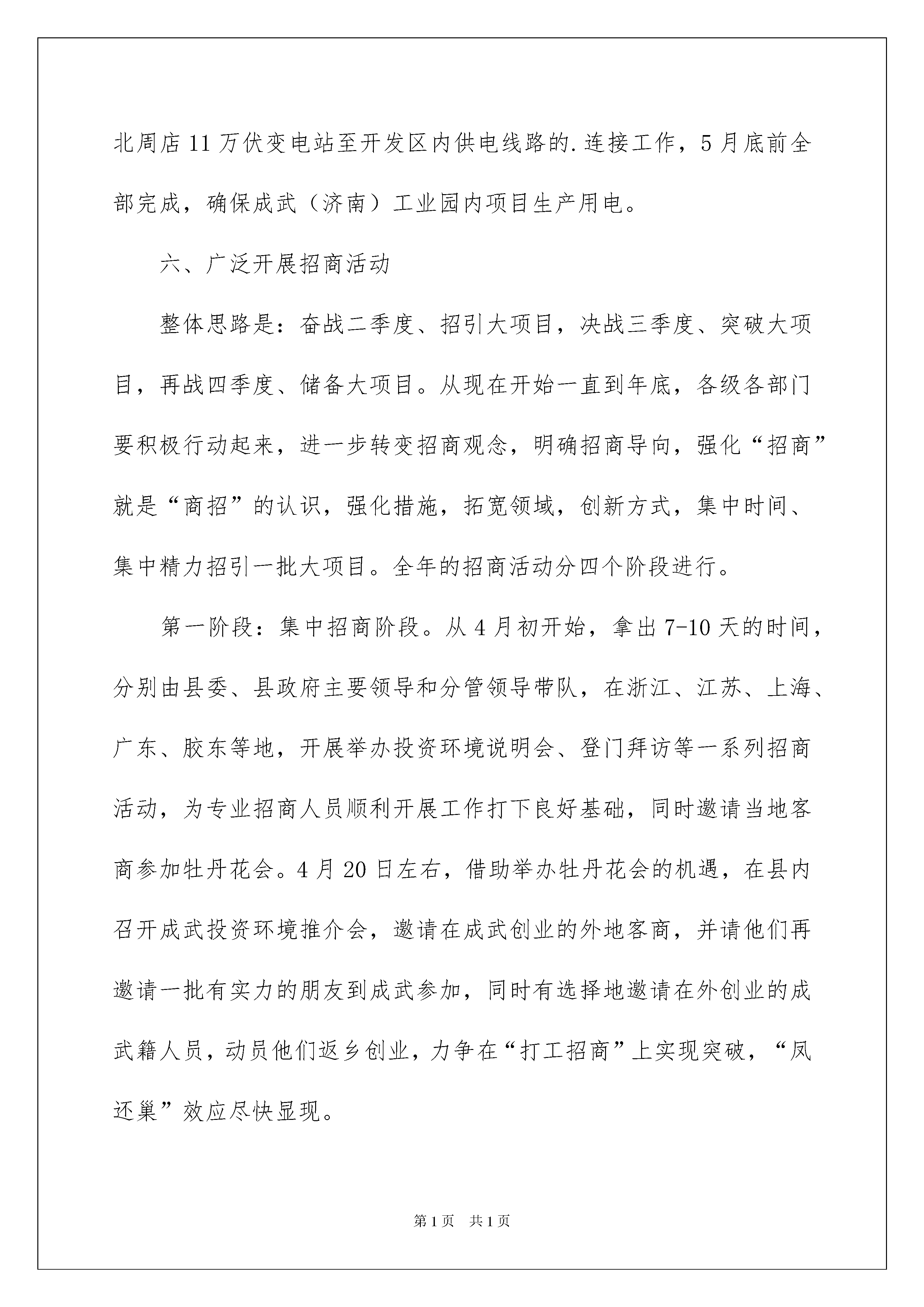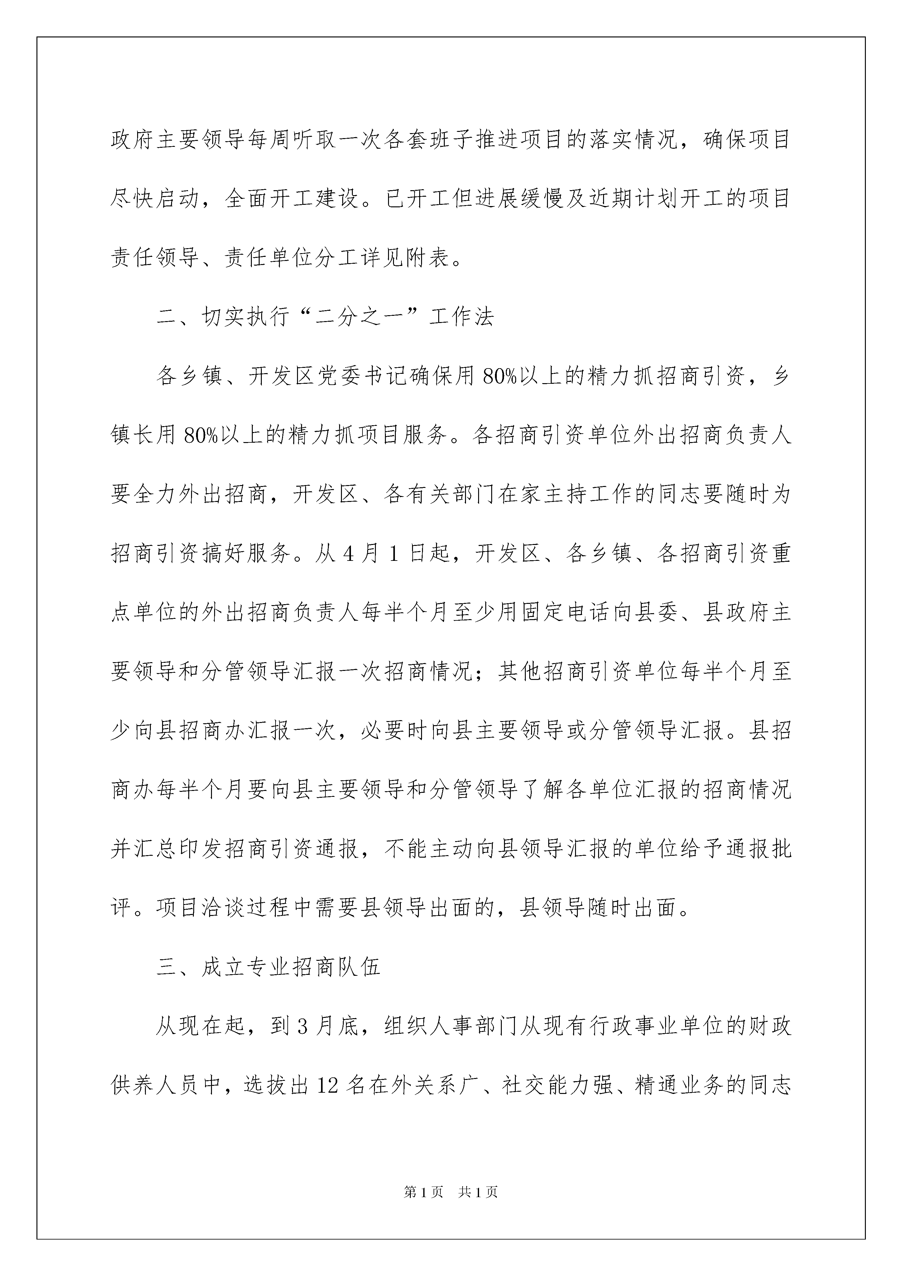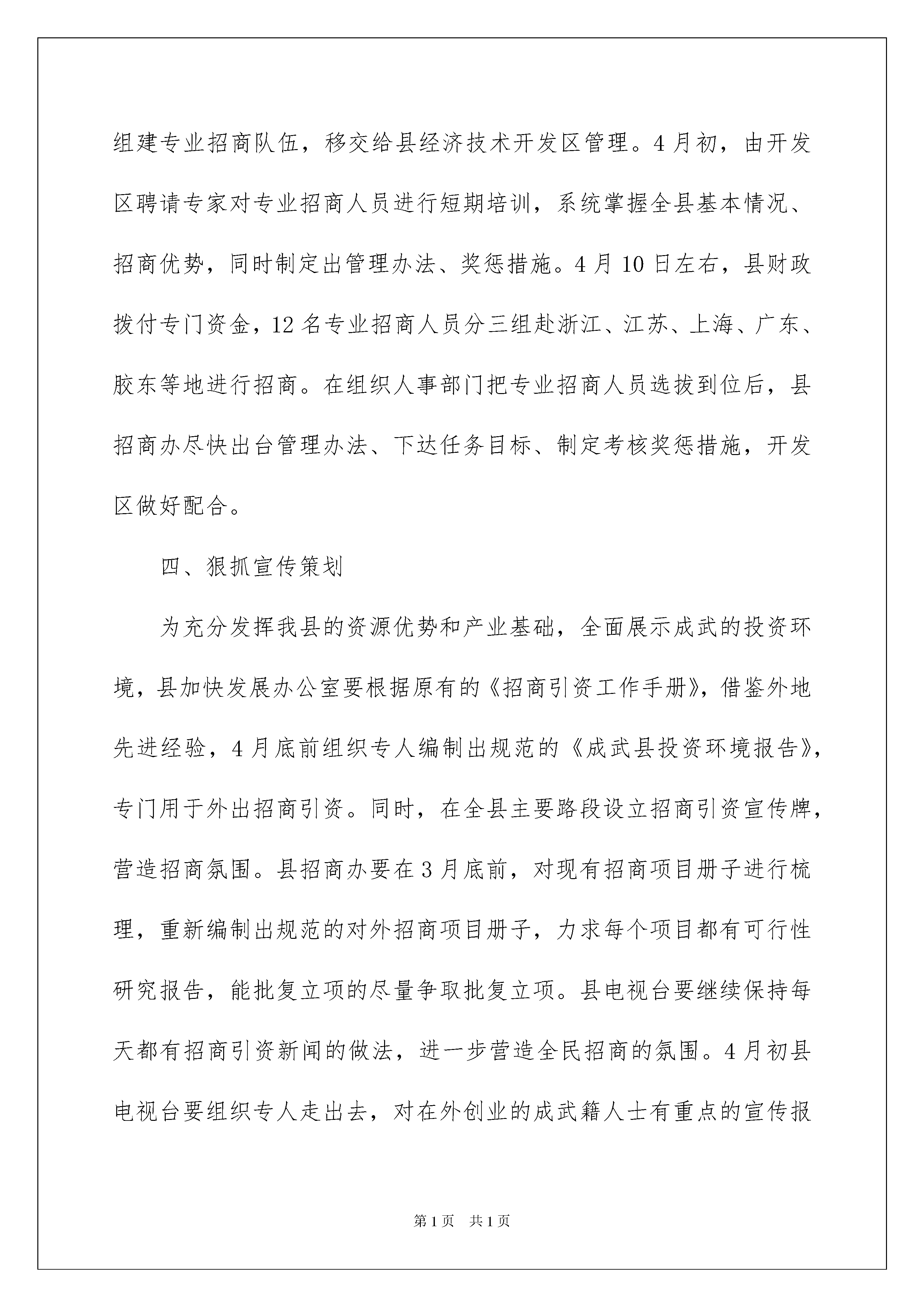 2022精选招商引资工作方案四篇精选招商引资工作方案四篇为了确保工作或事情顺利进行,我们需要提前开始方案制定工作,方案是书面计划,具有内容条理清楚、步骤清晰的特点。写方案需要注意哪些格式呢?以下是我帮大家整理的招商引资工作方案4篇,仅供参考,欢迎大家阅读。招商引资工作方案篇1为进一步推进招商引资工作顺利开展,强化招商措施,拓宽招商渠道,创新招商方式,优化投资环境,加速项目落地,扩大招商实效,根据《关于20xx年招商引资工作的意见》,本着招商工作项目化、项目工作具体化、具体工作责任化的原则,结合先进地区招商引资工作经验,特制定本实施方案。一、大干二十天,打好重点项目大会战从现在起,到4月10日,针对20xx年已签约或洽谈成熟、具备开工条件的项目,一个项目一套班子,从开工建设到建成投产,全过程跟踪服务,及时解决项目实施过程中的各种困难和问题,县委、县政府主要领导每周听取一次各套班子推进项目的落实情况,确保项目尽快启动,全面开工建设。已开工但进展缓慢及近期计划开工的项目责任领导、责任单位分工详见附表。二、切实执行“二分之一”工作法各乡镇、开发区党委书记确保用80%以上的精力抓招商引资,乡镇长用80%以上的精力抓项目服务。各招商引资单位外出招商负责人要全力外出招商,开发区、各有关部门在家主持工作的同志要随时为招商引资搞好服务。从4月1日起,开发区、各乡镇、各招商引资重点单位的外出招商负责人每半个月至少用固定电话向县委、县政府主要领导和分管领导汇报一次招商情况;其他招商引资单位每半个月至少向县招商办汇报一次,必要时向县主要领导或分管领导汇报。县招商办每半个月要向县主要领导和分管领导了解各单位汇报的招商情况并汇总印发招商引资通报,不能主动向县领导汇报的单位给予通报批评。项目洽谈过程中需要县领导出面的,县领导随时出面。三、成立专业招商队伍从现在起,到3月底,组织人事部门从现有行政事业单位的财政供养人员中,选拔出12名在外关系广、社交能力强、精通业务的同志组建专业招商队伍,移交给县经济技术开发区管理。4月初,由开发区聘请专家对专业招商人员进行短期培训,系统掌握全县基本情况、招商优势,同时制定出管理办法、奖惩措施。4月10日左右,县财政拨付专门资金,12名专业招商人员分三组赴浙江、江苏、上海、广东、胶东等地进行招商。在组织人事部门把专业招商人员选拔到位后,县招商办尽快出台管理办法、下达任务目标、制定考核奖惩措施,开发区做好配合。四、狠抓宣传策划为充分发挥我县的资源优势和产业基础,全面展示成武的投资环境,县加快发展办公室要根据原有的《招商引资工作手册》,借鉴外地先进经验,4月底前组织专人编制出规范的《成武县投资环境报告》,专门用于外出招商引资。同时,在全县主要路段设立招商引资宣传牌,营造招商氛围。县招商办要在3月底前,对现有招商项目册子进行梳理,重新编制出规范的对外招商项目册子,力求每个项目都有可行性研究报告,能批复立项的尽量争取批复立项。县电视台要继续保持每天都有招商引资新闻的做法,进一步营造全民招商的氛围。4月初县电视台要组织专人走出去,对在外创业的成武籍人士有重点的宣传报道,5月份开播《他乡成武人》专题栏目,从各方面引导他们回乡创业,为家乡经济发展作贡献。五、着力加快开发区建设3月底前,开发区要对区内现有可利用土地摸清底子,把所处位置、地上附属物、面积大小、权属等情况汇总后制作成图,交县主要领导及分管领导,便于项目审查领导小组对入区项目进行审查论证、选址落地。同时,开发区要根据现有30个入区项目逐一排出配套服务责任人,全力推进项目建设进度。对入驻开发区的项目用地要求,自签订正式协议后,开发区要在投资商确定的开工日期前10日内确保把项目用地清理完毕,具备开工条件;项目必须在三个月内全面开工建设,否则收回土地;对固定资产投资5000万元以下项目建设周期不超过一年,投资5000万元以上项目不超过两年且当年投入不低于总投入的一半。基础设施建设方面,县交通局、公路局要加快先农坛街东延伸段、文亭街东延伸段的施工进度,确保6月底前建成通车;济南市帮扶建设的“一纵四横”五条道路的绿化工作,3月20日前确定绿化方案,3月底前骨架树木栽植完毕,同时,向济南市领导做好汇报,争取更多的帮扶资金用于开发区基础设施建设;县供电公司负责的城北周店11万伏变电站至开发区内供电线路的.连接工作,5月底前全部完成,确保成武(济南)工业园内项目生产用电。六、广泛开展招商活动整体思路是:奋战二季度、招引大项目,决战三季度、突破大项目,再战四季度、储备大项目。从现在开始一直到年底,各级各部门要积极行动起来,进一步转变招商观念,