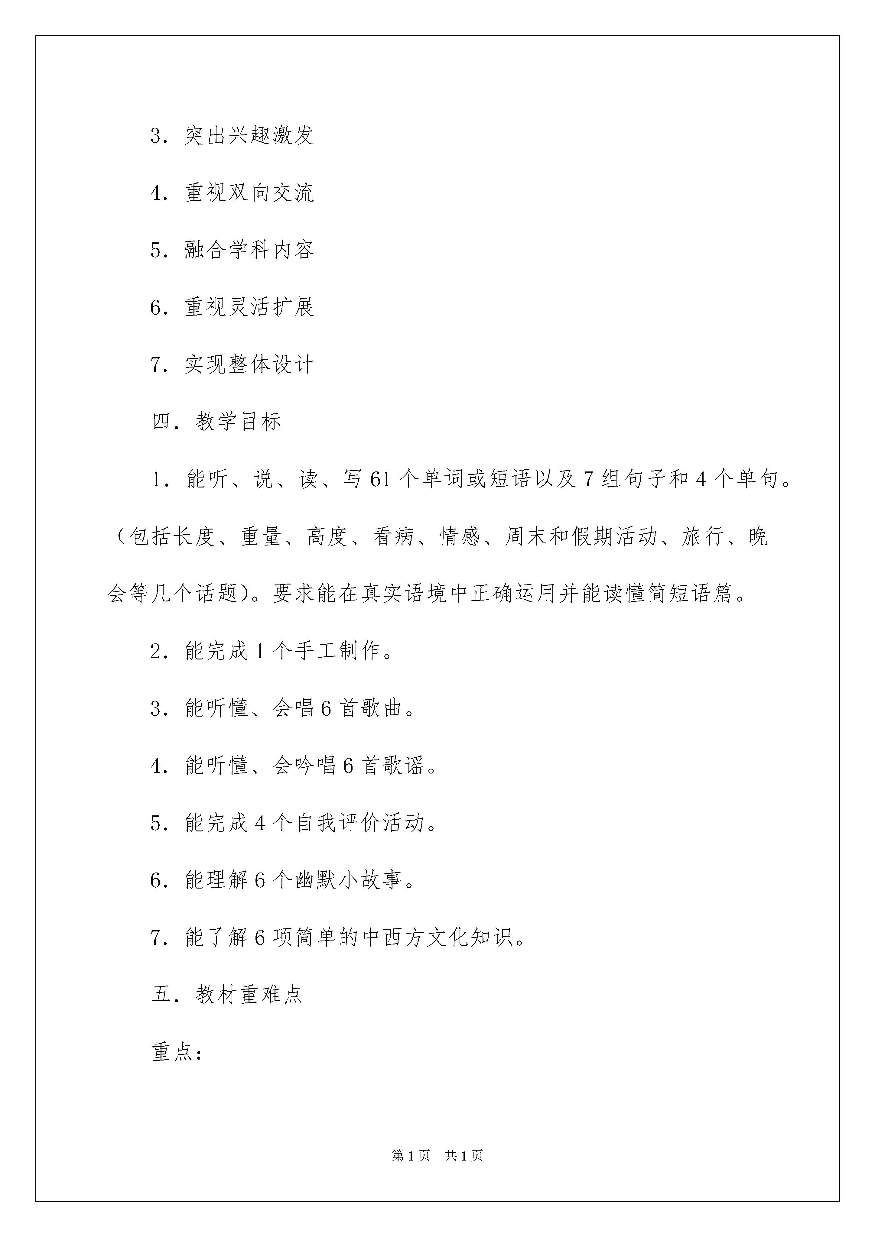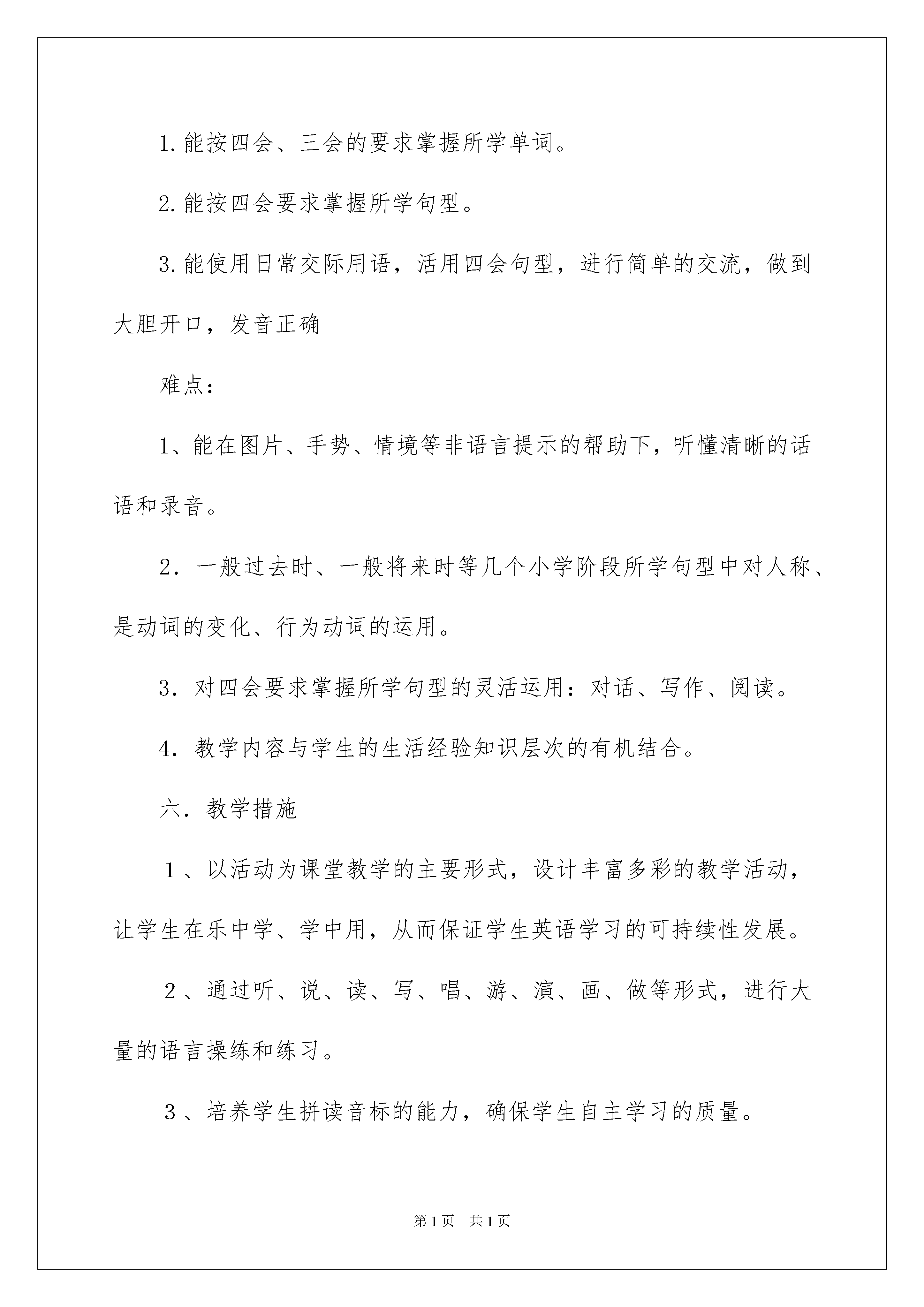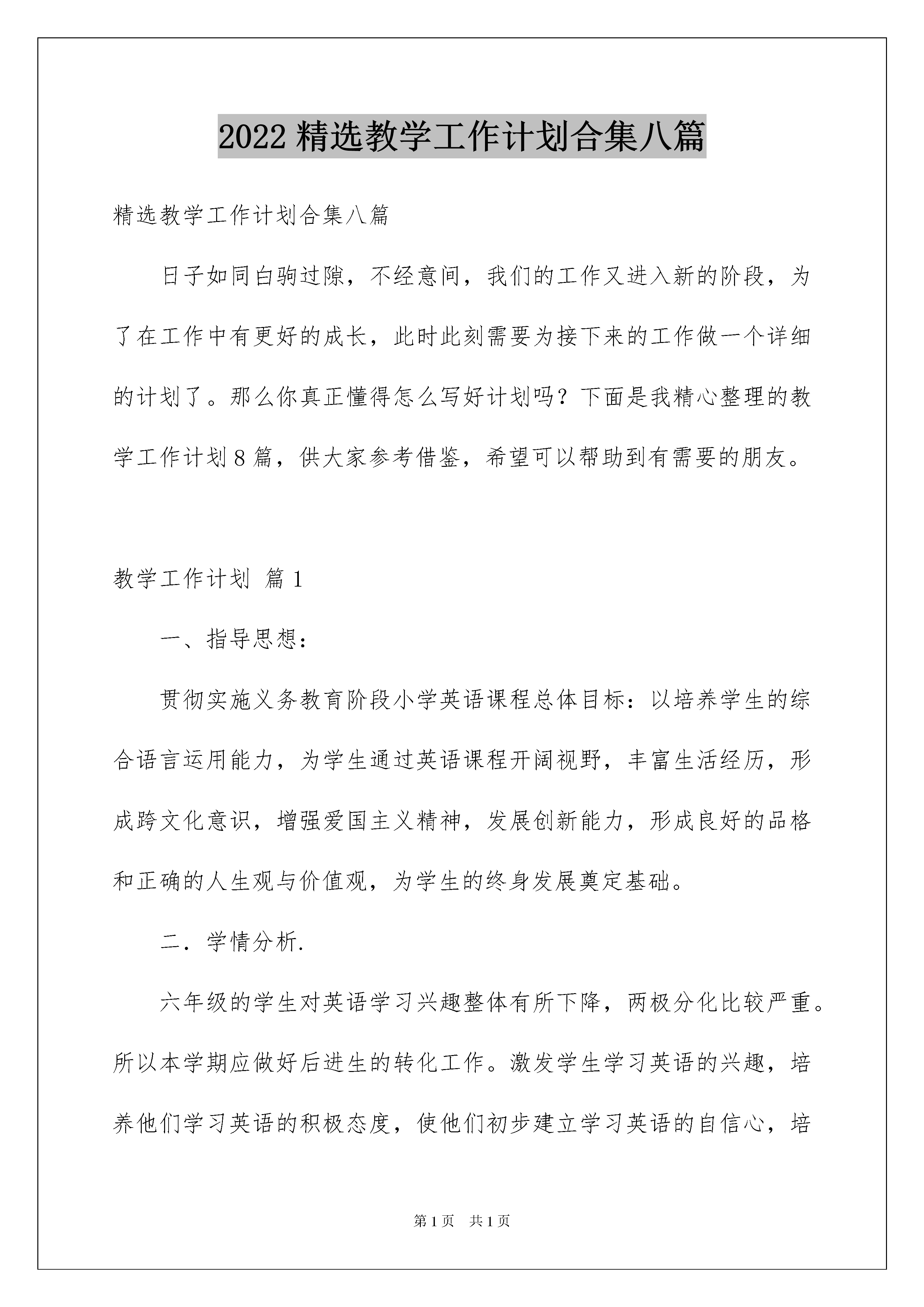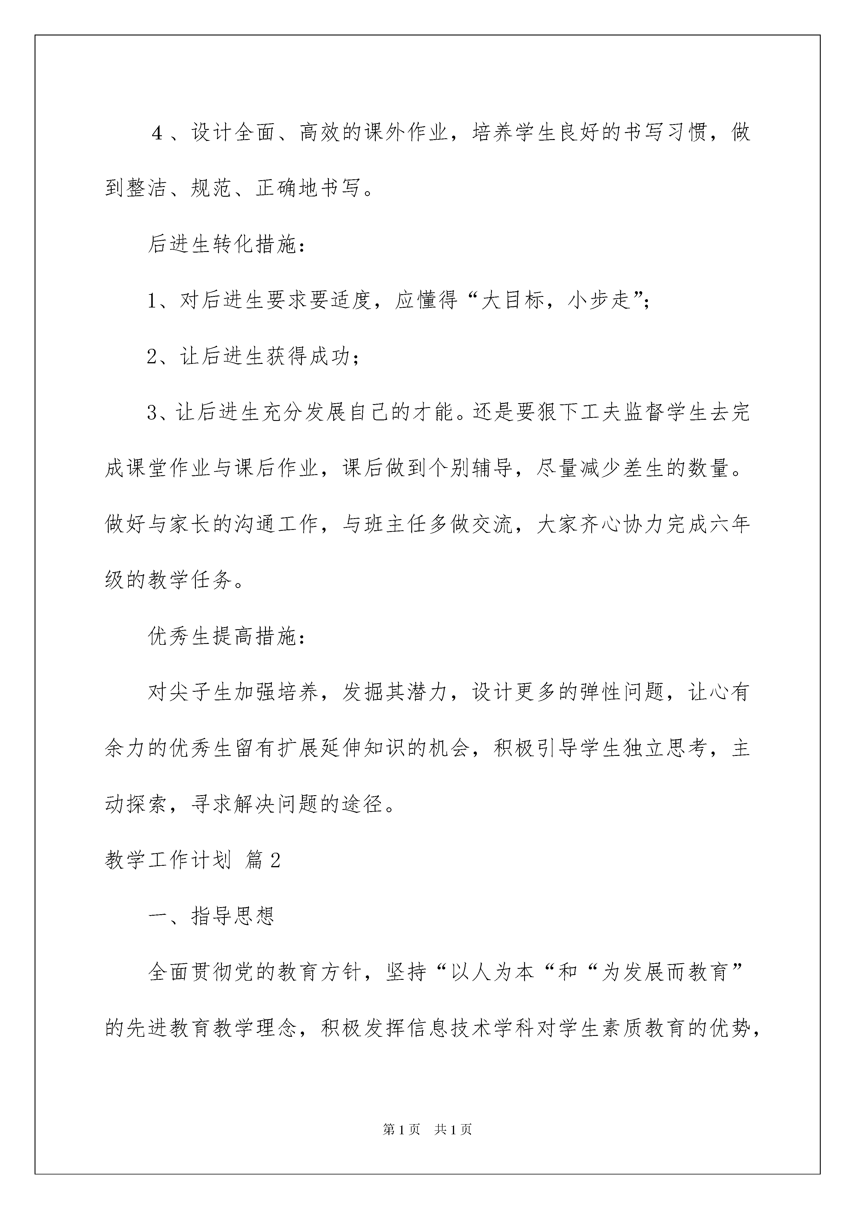 2022精选教学工作计划合集八篇精选教学工作计划合集八篇日子如同白驹过隙,不经意间,我们的工作又进入新的阶段,为了在工作中有更好的成长,此时此刻需要为接下来的工作做一个详细的计划了。那么你真正懂得怎么写好计划吗?下面是我精心整理的教学工作计划8篇,供大家参考借鉴,希望可以帮助到有需要的朋友。教学工作计划篇1一、指导思想:贯彻实施义务教育阶段小学英语课程总体目标:以培养学生的综合语言运用能力,为学生通过英语课程开阔视野,丰富生活经历,形成跨文化意识,增强爱国主义精神,发展创新能力,形成良好的品格和正确的人生观与价值观,为学生的终身发展奠定基础。二.学情分析.六年级的学生对英语学习兴趣整体有所下降,两极分化比较严重。所以本学期应做好后进生的转化工作。激发学生学习英语的兴趣,培养他们学习英语的积极态度,使他们初步建立学习英语的自信心,培养学生具有一定的语感和良好的语音、语调、书写基础,以及良好的学习习惯,使他们初步具备用英语进行简单日常交流的能力。同时培养学生的观察、记忆、思维、想象和创造能力。教师在教学过程中应强调语言的综合运用,注意学生能力的培养,突出对学生学习兴趣的激发,重视知识的灵活扩展,真正将英语教学的目标落实到实处。在五年级的对话的基础上,增加了阅读的内容和难度。本册中所涉及的一般现在时、一般将来时、过去时等句型中对人称、是动词的变化、行为动词的运用对小学生都是一个难点,要打好此部分的基础,为六年级的毕业考试打好基础。三.教材分析本册教材是《义务教育课程标准实验教科书英语(PEP)》是课程教材研究所英语课程教材研究开发中心,与加拿大LingoMedia国际集团合作编写的一套全新的小学英语教材。这套教材是根据教育部制定的《国家英语课程标准》编写而成的。供小学6年级的学生使用。本册教材的特点是:1.强调语言运用。2.注重能力培养3.突出兴趣激发4.重视双向交流5.融合学科内容6.重视灵活扩展7.实现整体设计四.教学目标1.能听、说、读、写61个单词或短语以及7组句子和4个单句。(包括长度、重量、高度、看病、情感、周末和假期活动、旅行、晚会等几个话题)。要求能在真实语境中正确运用并能读懂简短语篇。2.能完成1个手工制作。3.能听懂、会唱6首歌曲。4.能听懂、会吟唱6首歌谣。5.能完成4个自我评价活动。6.能理解6个幽默小故事。7.能了解6项简单的中西方文化知识。五.教材重难点重点:1.能按四会、三会的要求掌握所学单词。2.能按四会要求掌握所学句型。3.能使用日常交际用语,活用四会句型,进行简单的交流,做到大胆开口,发音正确难点:1、能在图片、手势、情境等非语言提示的帮助下,听懂清晰的话语和录音。2.一般过去时、一般将来时等几个小学阶段所学句型中对人称、是动词的变化、行为动词的运用。3.对四会要求掌握所学句型的灵活运用:对话、写作、阅读。4.教学内容与学生的生活经验知识层次的有机结合。六.教学措施1、以活动为课堂教学的主要形式,设计丰富多彩的教学活动,让学生在乐中学、学中用,从而保证学生英语学习的可持续性发展。2、通过听、说、读、写、唱、游、演、画、做等形式,进行大量的语言操练和练习。3、培养学生拼读音标的能力,确保学生自主学习的质量。4、设计全面、高效的课外作业,培养学生良好的书写习惯,做到整洁、规范、正确地书写。后进生转化措施:1、对后进生要求要适度,应懂得“大目标,小步走”;2、让后进生获得成功;3、让后进生充分发展自己的才能。还是要狠下工夫监督学生去完成课堂作业与课后作业,课后做到个别辅导,尽量减少差生的数量。做好与家长的沟通工作,与班主任多做交流,大家齐心协力完成六年级的教学任务。优秀生提高措施:对尖子生加强培养,发掘其潜力,设计更多的弹性问题,让心有余力的优秀生留有扩展延伸知识的机会,积极引导学生独立思考,主动探索,寻求解决问题的途径。教学工作计划篇2一、指导思想全面贯彻党的教育方针,坚持“以人为本“和“为发展而教育”的先进教育教学理念,积极发挥信息技术学科对学生素质教育的优势,深化课程改革。发扬XX精神和本组“勤奋求实合作探究,敬业奉献与时具进”的传统,全面提高教育教学质量,为学校、教师、学生三方面的发展而努力。二、工作内容(一)教研组建设1、认真开展每周教研组活动和备课组活动,间周参加市教研活动,集思广益,提高本组业务水平。积极组织集体备课,统一进度与教案,及时进行课后总结,积累教学经验,丰富教学资源库。2、教研组计划在本学年内完成学科校本课程编写。分模块,全员参与,同时提供合作交流的机会,增加组员之间的凝聚力。3、教研组内在日常教学中随时进行新课程标准探讨