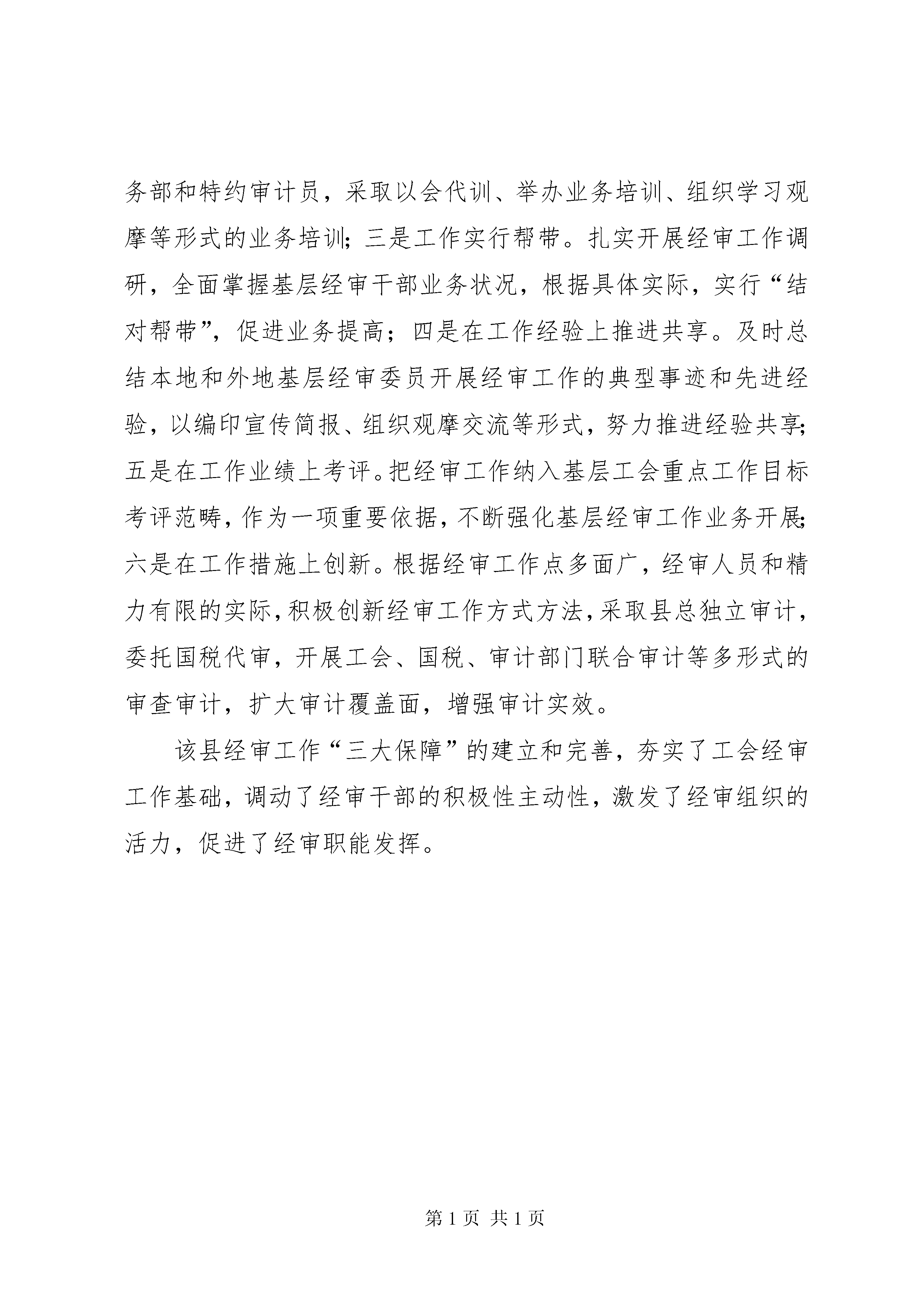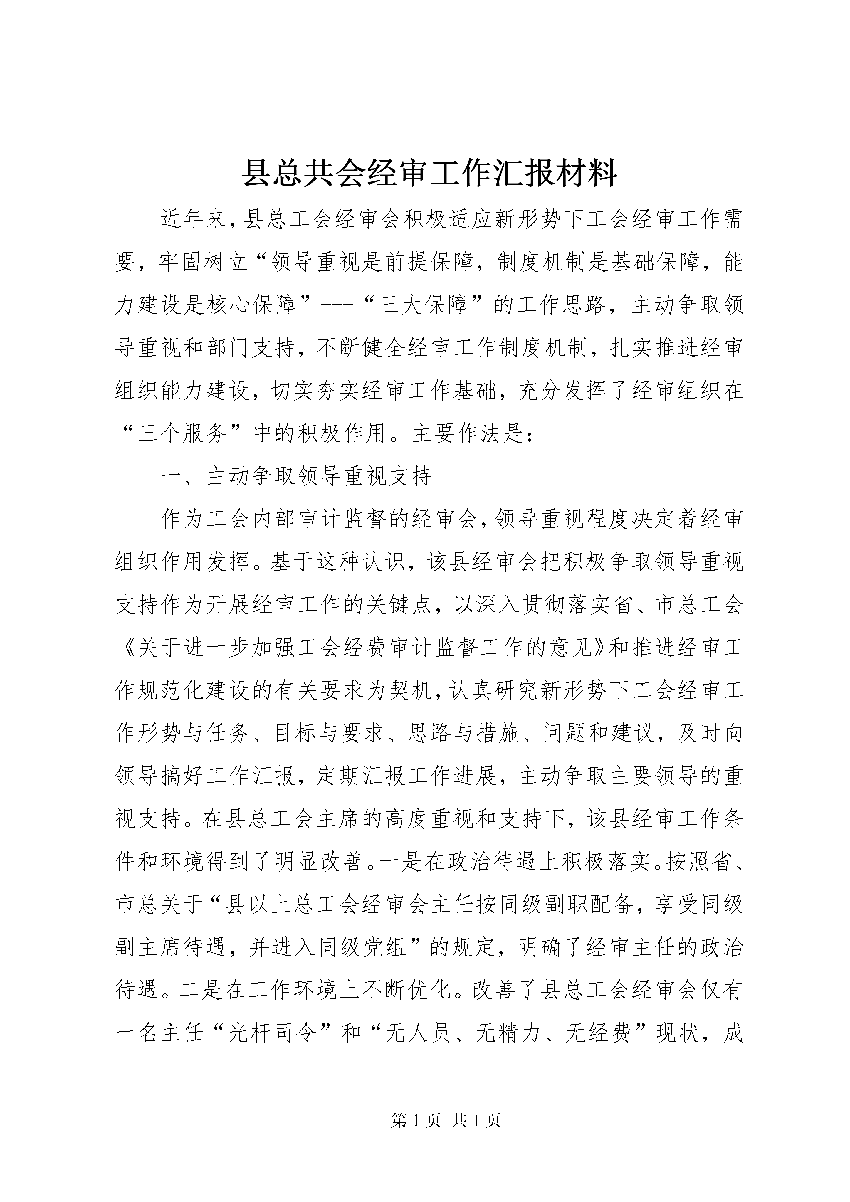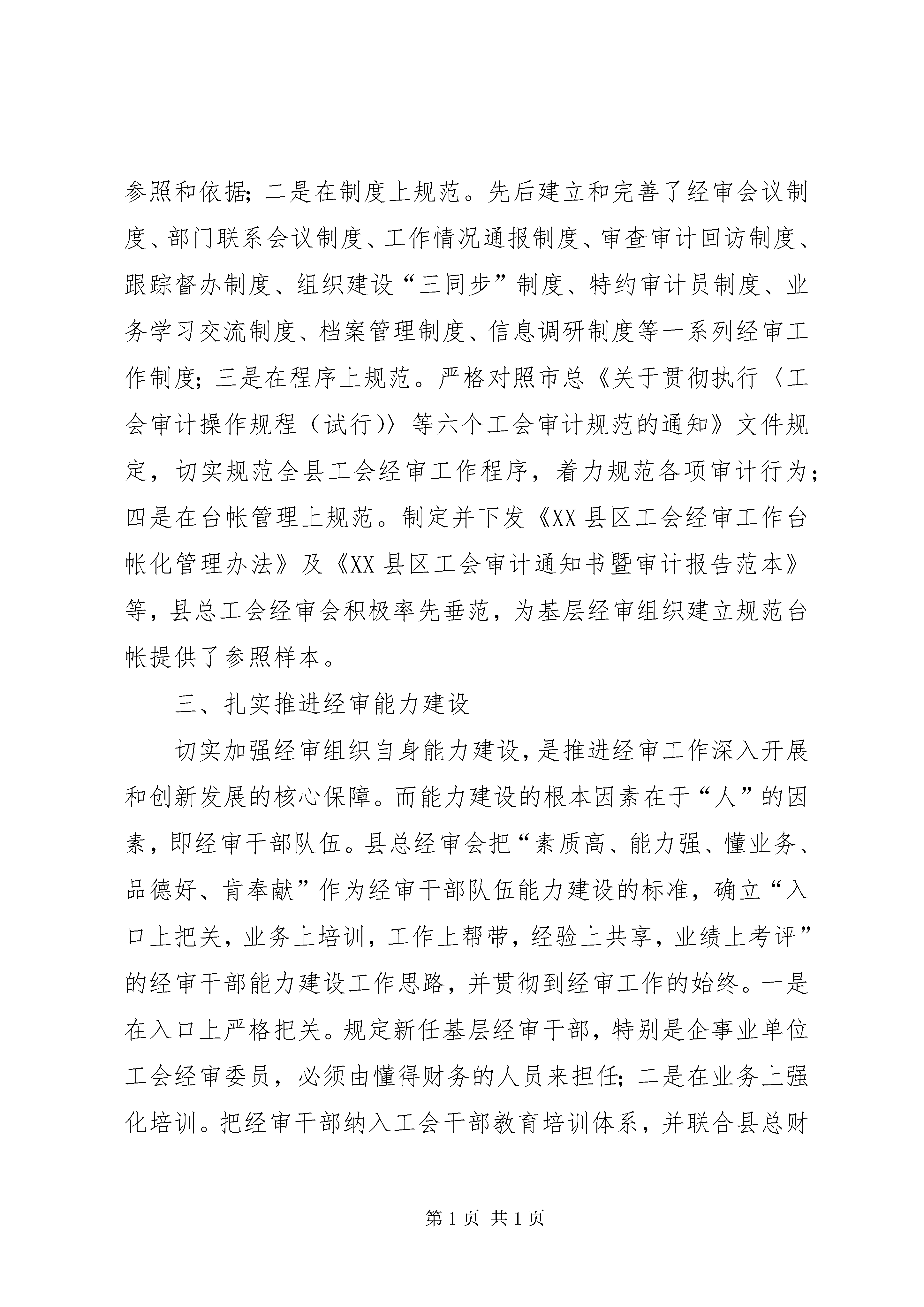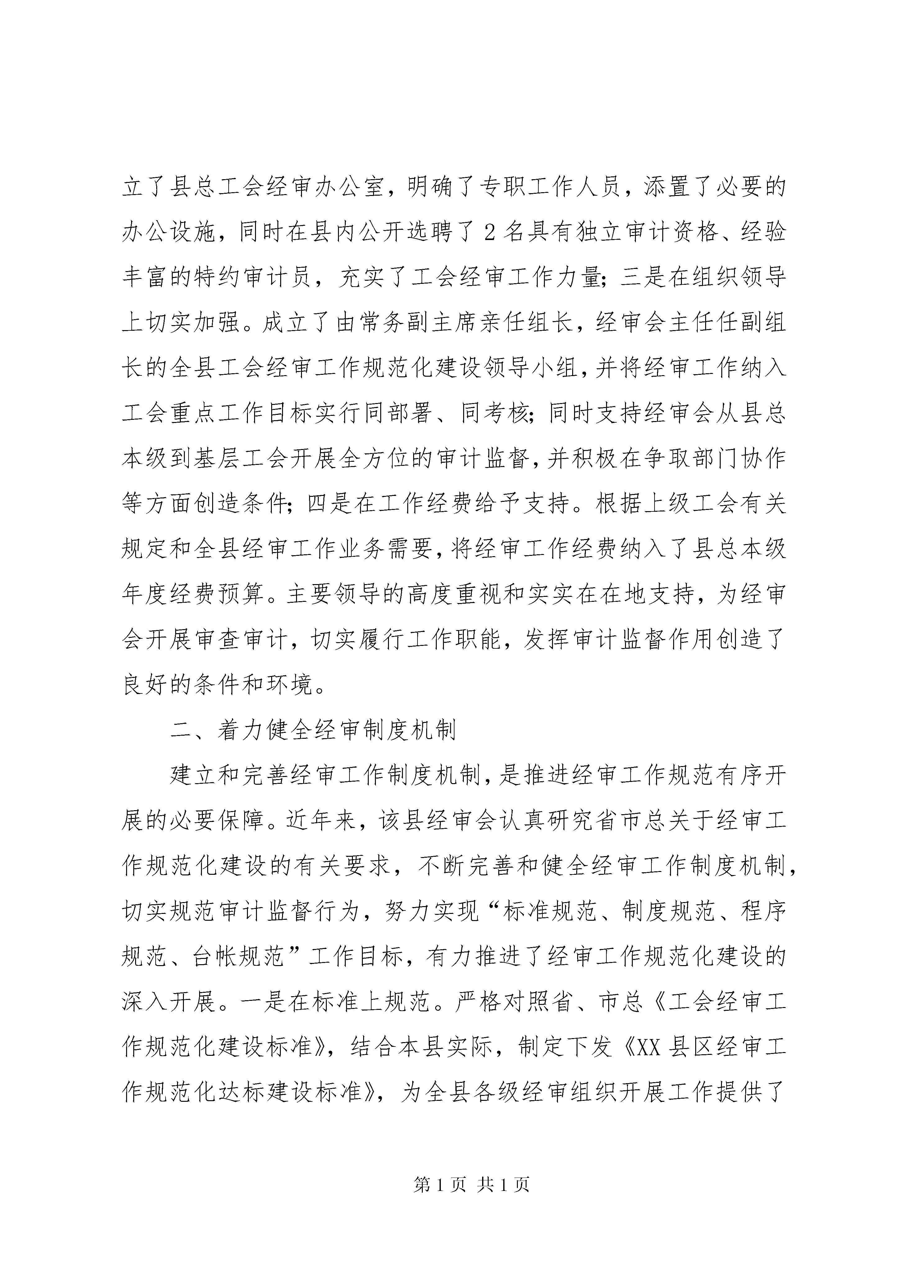 县总共会经审工作汇报材料近年来,县总工会经审会积极适应新形势下工会经审工作需要,牢固树立“领导重视是前提保障,制度机制是基础保障,能力建设是核心保障”---“三大保障”的工作思路,主动争取领导重视和部门支持,不断健全经审工作制度机制,扎实推进经审组织能力建设,切实夯实经审工作基础,充分发挥了经审组织在“三个服务”中的积极作用。主要作法是:一、主动争取领导重视支持作为工会内部审计监督的经审会,领导重视程度决定着经审组织作用发挥。基于这种认识,该县经审会把积极争取领导重视支持作为开展经审工作的关键点,以深入贯彻落实省、市总工会《关于进一步加强工会经费审计监督工作的意见》和推进经审工作规范化建设的有关要求为契机,认真研究新形势下工会经审工作形势与任务、目标与要求、思路与措施、问题和建议,及时向领导搞好工作汇报,定期汇报工作进展,主动争取主要领导的重视支持。在县总工会主席的高度重视和支持下,该县经审工作条件和环境得到了明显改善。一是在政治待遇上积极落实。按照省、市总关于“县以上总工会经审会主任按同级副职配备,享受同级副主席待遇,并进入同级党组”的规定,明确了经审主任的政治待遇。二是在工作环境上不断优化。改善了县总工会经审会仅有一名主任“光杆司令”和“无人员、无精力、无经费”现状,成立了县总工会经审办公室,明确了专职工作人员,添置了必要的办公设施,同时在县内公开选聘了2名具有独立审计资格、经验丰富的特约审计员,充实了工会经审工作力量;三是在组织领导上切实加强。成立了由常务副主席亲任组长,经审会主任任副组长的全县工会经审工作规范化建设领导小组,并将经审工作纳入工会重点工作目标实行同部署、同考核;同时支持经审会从县总本级到基层工会开展全方位的审计监督,并积极在争取部门协作等方面创造条件;四是在工作经费给予支持。根据上级工会有关规定和全县经审工作业务需要,将经审工作经费纳入了县总本级年度经费预算。主要领导的高度重视和实实在在地支持,为经审会开展审查审计,切实履行工作职能,发挥审计监督作用创造了良好的条件和环境。二、着力健全经审制度机制建立和完善经审工作制度机制,是推进经审工作规范有序开展的必要保障。近年来,该县经审会认真研究省市总关于经审工作规范化建设的有关要求,不断完善和健全经审工作制度机制,切实规范审计监督行为,努力实现“标准规范、制度规范、程序规范、台帐规范”工作目标,有力推进了经审工作规范化建设的深入开展。一是在标准上规范。严格对照省、市总《工会经审工作规范化建设标准》,结合本县实际,制定下发《XX县区经审工作规范化达标建设标准》,为全县各级经审组织开展工作提供了参照和依据;二是在制度上规范。先后建立和完善了经审会议制度、部门联系会议制度、工作情况通报制度、审查审计回访制度、跟踪督办制度、组织建设“三同步”制度、特约审计员制度、业务学习交流制度、档案管理制度、信息调研制度等一系列经审工作制度;三是在程序上规范。严格对照市总《关于贯彻执行〈工会审计操作规程(试行)〉等六个工会审计规范的通知》文件规定,切实规范全县工会经审工作程序,着力规范各项审计行为;四是在台帐管理上规范。制定并下发《XX县区工会经审工作台帐化管理办法》及《XX县区工会审计通知书暨审计报告范本》等,县总工会经审会积极率先垂范,为基层经审组织建立规范台帐提供了参照样本。三、扎实推进经审能力建设切实加强经审组织自身能力建设,是推进经审工作深入开展和创新发展的核心保障。而能力建设的根本因素在于“人”的因素,即经审干部队伍。县总经审会把“素质高、能力强、懂业务、品德好、肯奉献”作为经审干部队伍能力建设的标准,确立“入口上把关,业务上培训,工作上帮带,经验上共享,业绩上考评”的经审干部能力建设工作思路,并贯彻到经审工作的始终。一是在入口上严格把关。规定新任基层经审干部,特别是企事业单位工会经审委员,必须由懂得财务的人员来担任;二是在业务上强化培训。把经审干部纳入工会干部教育培训体系,并联合县总财务部和特约审计员,采取以会代训、举办业务培训、组织学习观摩等形式的业务培训;三是工作实行帮带。扎实开展经审工作调研,全面掌握基层经审干部业务状况,根据具体实际,实行“结对帮带”,促进业务提高;四是在工作经验上推进共享。及时总结本地和外地基层经审委员开展经审工作的典型事迹和先进经验,以编印宣传简报、组织观摩交流等形式,努力推进经验共享;五是在工作业绩上考评。把经审工作纳入基层工会重点工作目标考评范畴,作为一项重要依据,不断强化基层经审工作业务开展;六是在工作措施上创新。根据经审工作点多面广,经审人员和精力有限的实际,积极创新经审工作方式方法,采取县总独立审计,委托国税代审,开展工会、国税、审计部门联合审计等多形式的审查审计,扩大审计覆盖面,增强审计实效。该县经审工作