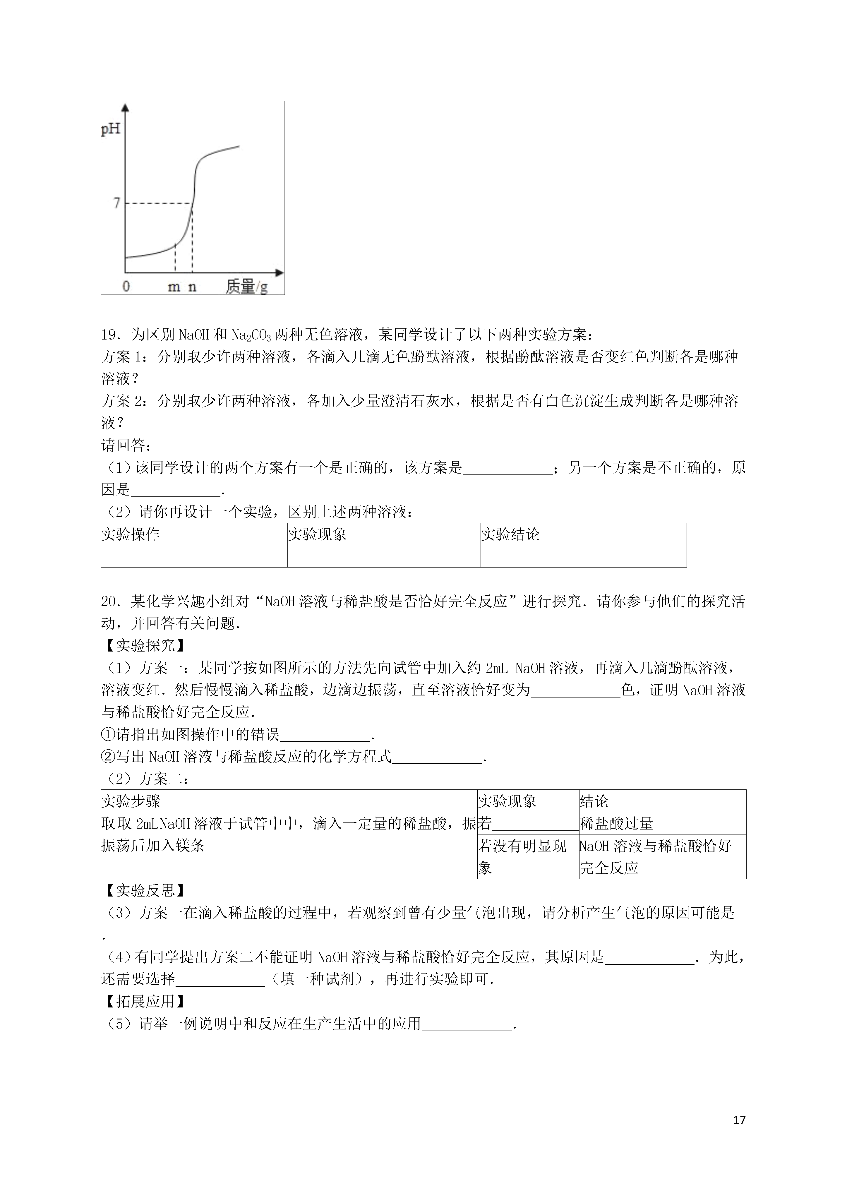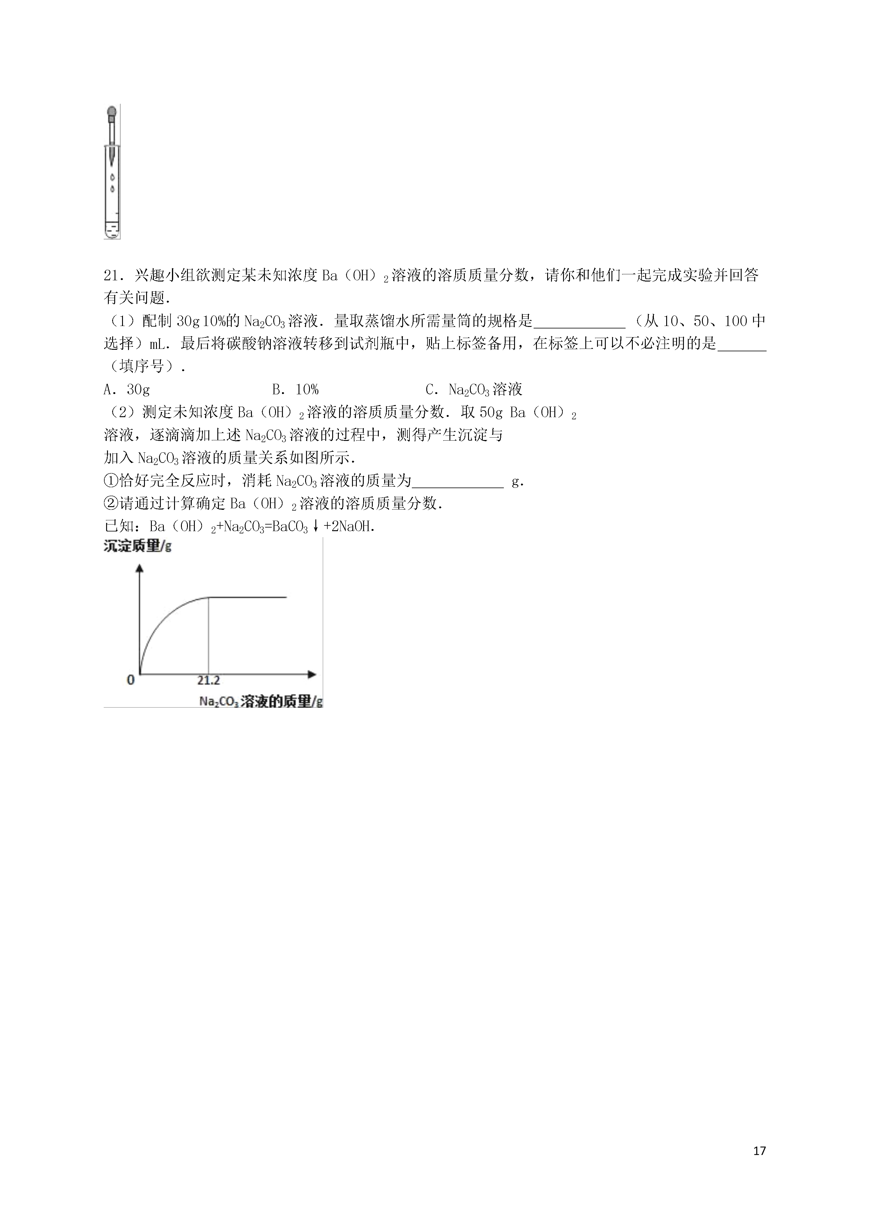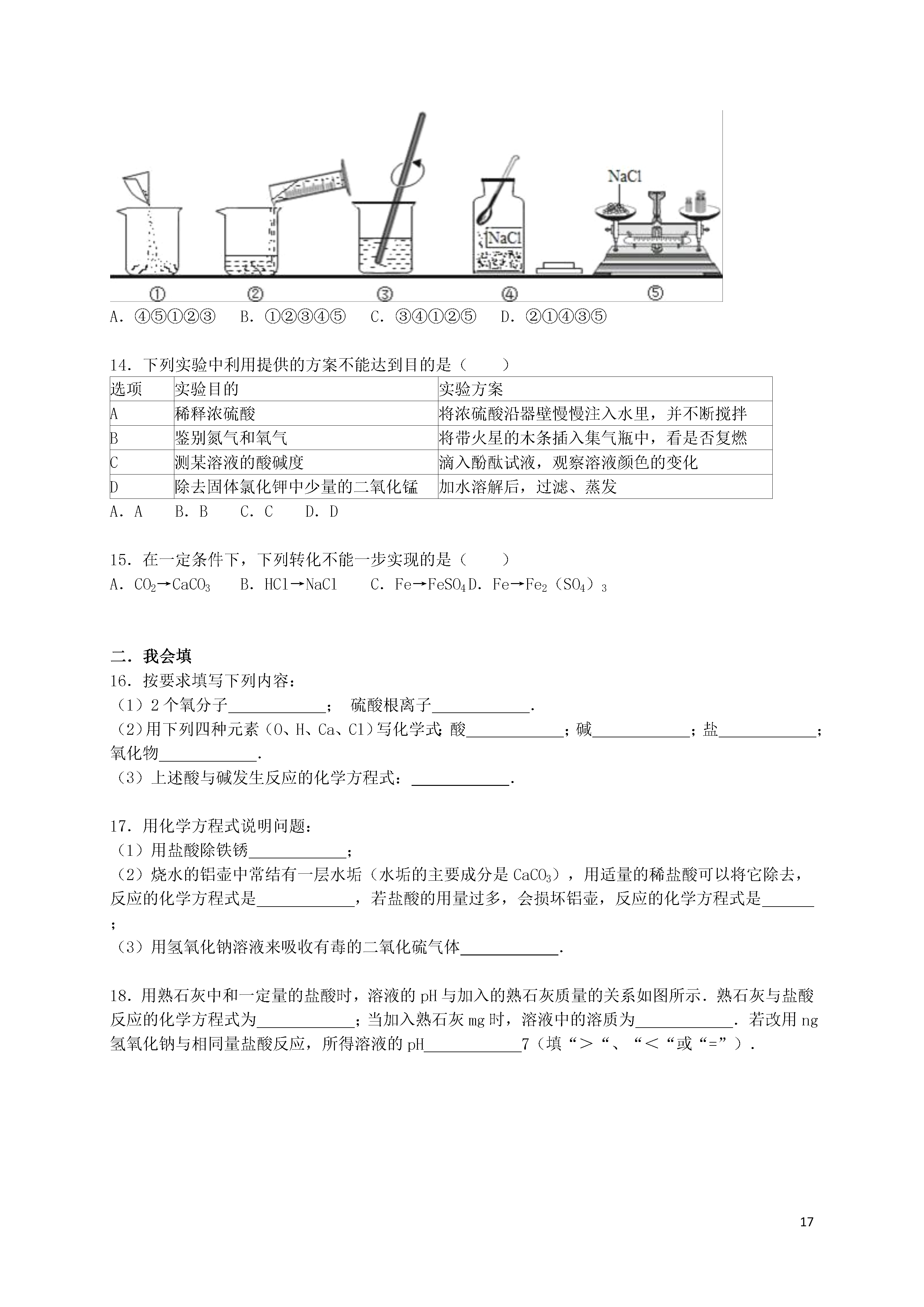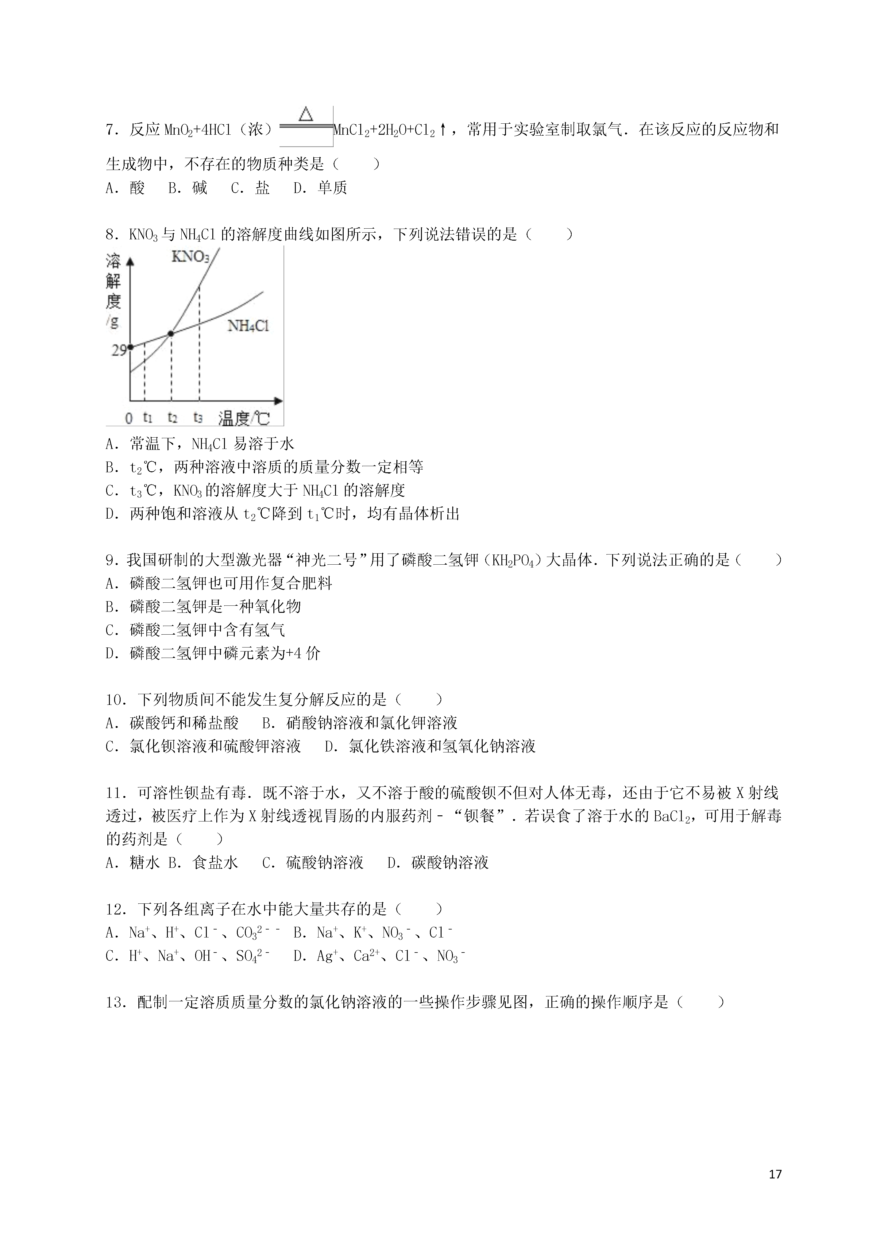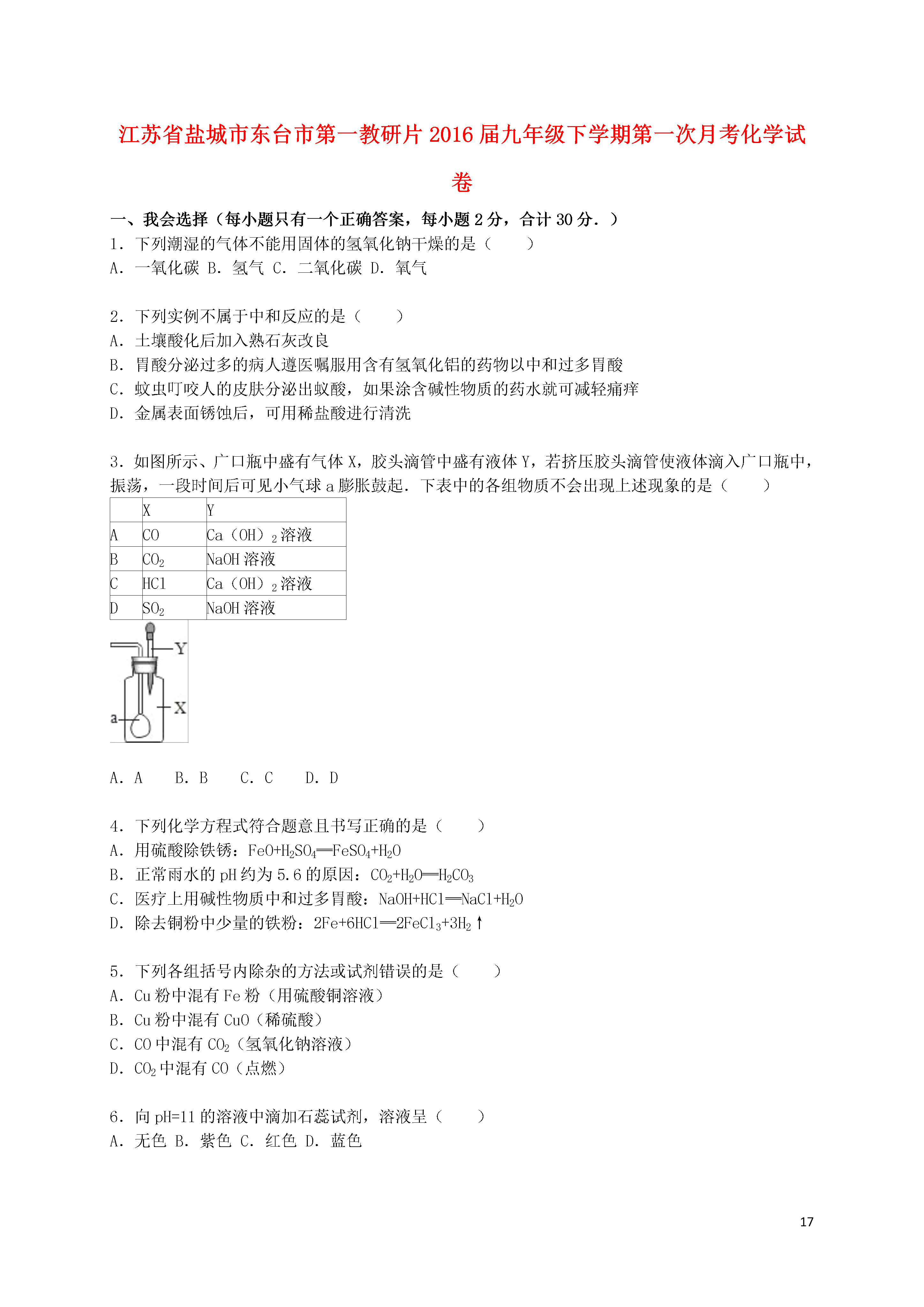 17江苏省盐城市东台市第一教研片2016届九年级下学期第一次月考化学试卷一、我会选择(每小题只有一个正确答案,每小题2分,合计30分.)1.下列潮湿的气体不能用固体的氢氧化钠干燥的是()A.一氧化碳B.氢气C.二氧化碳D.氧气2.下列实例不属于中和反应的是()A.土壤酸化后加入熟石灰改良B.胃酸分泌过多的病人遵医嘱服用含有氢氧化铝的药物以中和过多胃酸C.蚊虫叮咬人的皮肤分泌出蚁酸,如果涂含碱性物质的药水就可减轻痛痒D.金属表面锈蚀后,可用稀盐酸进行清洗3.如图所示、广口瓶中盛有气体X,胶头滴管中盛有液体Y,若挤压胶头滴管使液体滴入广口瓶中,振荡,一段时间后可见小气球a膨胀鼓起.下表中的各组物质不会出现上述现象的是()XYACOCa(OH)2溶液BCO2NaOH溶液CHClCa(OH)2溶液DSO2NaOH溶液A.AB.BC.CD.D4.下列化学方程式符合题意且书写正确的是()A.用硫酸除铁锈:FeO+H2SO4═FeSO4+H2OB.正常雨水的pH约为5.6的原因:CO2+H2O═H2CO3C.医疗上用碱性物质中和过多胃酸:NaOH+HCl═NaCl+H2OD.除去铜粉中少量的铁粉:2Fe+6HCl═2FeCl3+3H2↑5.下列各组括号内除杂的方法或试剂错误的是()A.Cu粉中混有Fe粉(用硫酸铜溶液)B.Cu粉中混有CuO(稀硫酸)C.CO中混有CO2(氢氧化钠溶液)D.CO2中混有CO(点燃)6.向pH=11的溶液中滴加石蕊试剂,溶液呈()A.无色B.紫色C.红色D.蓝色7.反应MnO2+4HCl(浓)MnCl2+2H2O+Cl2↑,常用于实验室制取氯气.在该反应的反应物和生成物中,不存在的物质种类是()A.酸B.碱C.盐D.单质8.KNO3与NH4Cl的溶解度曲线如图所示,下列说法错误的是()A.常温下,NH4Cl易溶于水B.t2℃,两种溶液中溶质的质量分数一定相等C.t3℃,KNO3的溶解度大于NH4Cl的溶解度D.两种饱和溶液从t2℃降到t1℃时,均有晶体析出9.我国研制的大型激光器“神光二号”用了磷酸二氢钾(KH2PO4)大晶体.下列说法正确的是()A.磷酸二氢钾也可用作复合肥料B.磷酸二氢钾是一种氧化物C.磷酸二氢钾中含有氢气D.磷酸二氢钾中磷元素为+4价10.下列物质间不能发生复分解反应的是()A.碳酸钙和稀盐酸B.硝酸钠溶液和氯化钾溶液C.氯化钡溶液和硫酸钾溶液D.氯化铁溶液和氢氧化钠溶液11.可溶性钡盐有毒.既不溶于水,又不溶于酸的硫酸钡不但对人体无毒,还由于它不易被X射线透过,被医疗上作为X射线透视胃肠的内服药剂﹣“钡餐”.若误食了溶于水的BaCl2,可用于解毒的药剂是()A.糖水B.食盐水C.硫酸钠溶液D.碳酸钠溶液12.下列各组离子在水中能大量共存的是()A.Na+、H+、Cl﹣、CO32﹣﹣B.Na+、K+、NO3﹣、Cl﹣C.H+、Na+、OH﹣、SO42﹣D.Ag+、Ca2+、Cl﹣、NO3﹣13.配制一定溶质质量分数的氯化钠溶液的一些操作步骤见图,正确的操作顺序是()A.④⑤①②③B.①②③④⑤C.③④①②⑤D.②①④③⑤14.下列实验中利用提供的方案不能达到目的是()选项实验目的实验方案A稀释浓硫酸将浓硫酸沿器壁慢慢注入水里,并不断搅拌B鉴别氮气和氧气将带火星的木条插入集气瓶中,看是否复燃C测某溶液的酸碱度滴入酚酞试液,观察溶液颜色的变化D除去固体氯化钾中少量的二氧化锰加水溶解后,过滤、蒸发A.AB.BC.CD.D15.在一定条件下,下列转化不能一步实现的是()A.CO2→CaCO3B.HCl→NaClC.Fe→FeSO4D.Fe→Fe2(SO4)3二.我会填16.按要求填写下列内容:(1)2个氧分子;硫酸根离子.(2)用下列四种元素(O、H、Ca、Cl)写化学式:酸;碱;盐;氧化物.(3)上述酸与碱发生反应的化学方程式:.17.用化学方程式说明问题:(1)用盐酸除铁锈;(2)烧水的铝壶中常结有一层水垢(水垢的主要成分是CaCO3),用适量的稀盐酸可以将它除去,反应的化学方程式是,若盐酸的用量过多,会损坏铝壶,反应的化学方程式是;(3)用氢氧化钠溶液来吸收有毒的二氧化硫气体.18.用熟石灰中和一定量的盐酸时,溶液的pH与加入的熟石灰质量的关系如图所示.熟石灰与盐酸反应的化学方程式为;当加入熟石灰mg时,溶液中的溶质为.若改用ng氢氧化钠与相同量盐酸反应,所得溶液的pH7(填“>“、“<“或“=”).19.为区别NaOH和Na2CO3两种无色溶液,某同学设计了以下两种实验方案:方案1:分别取少许两种溶液,各滴入几