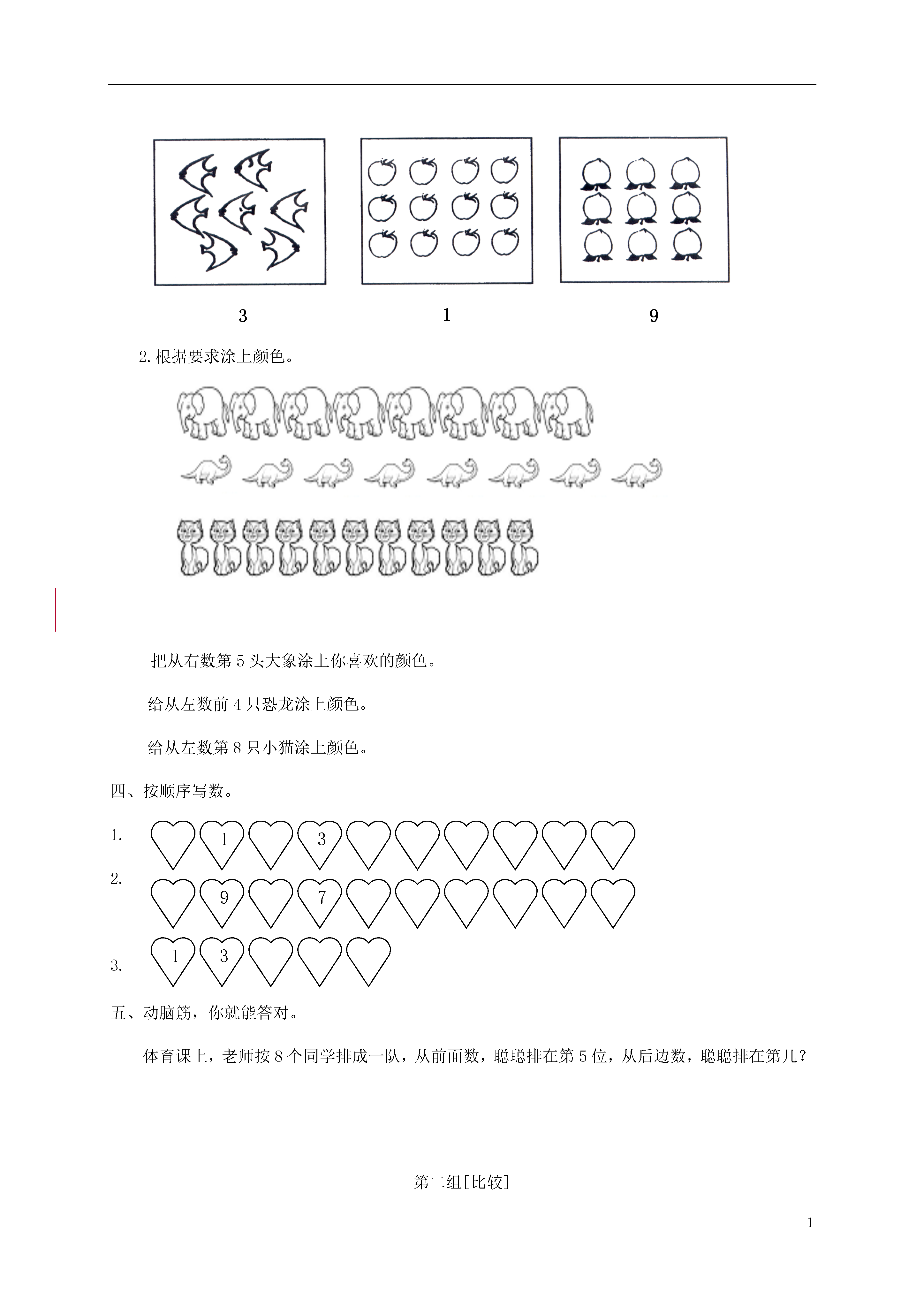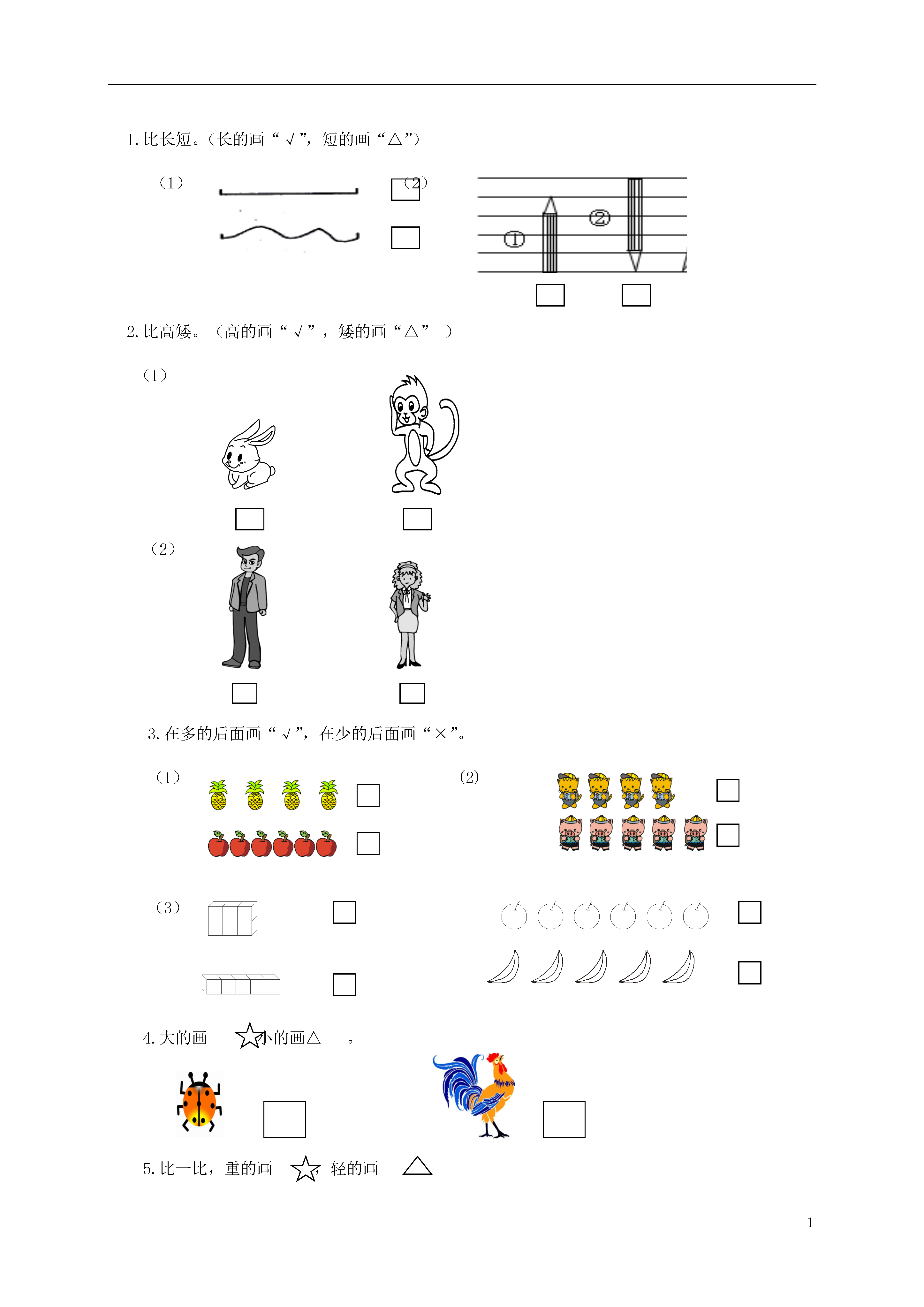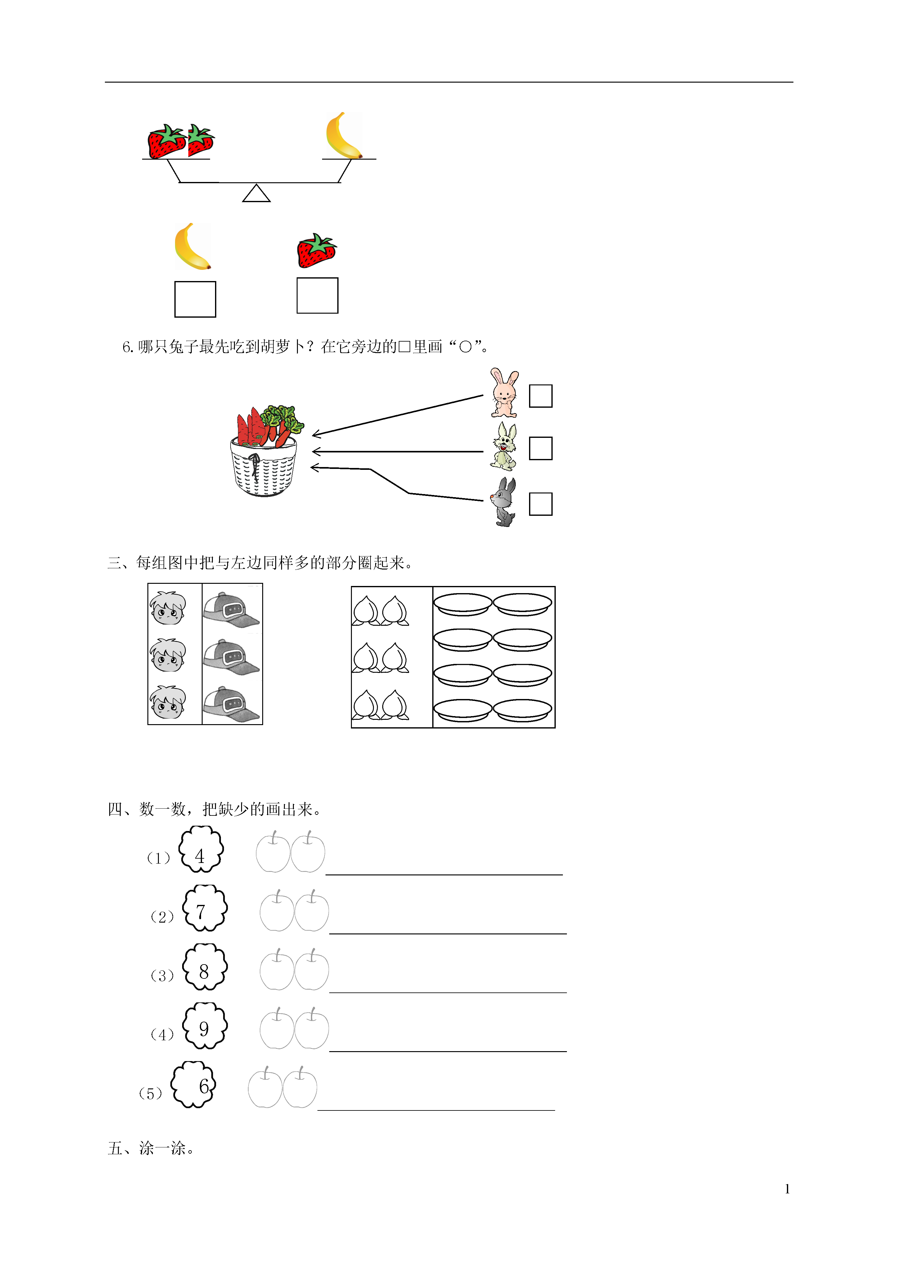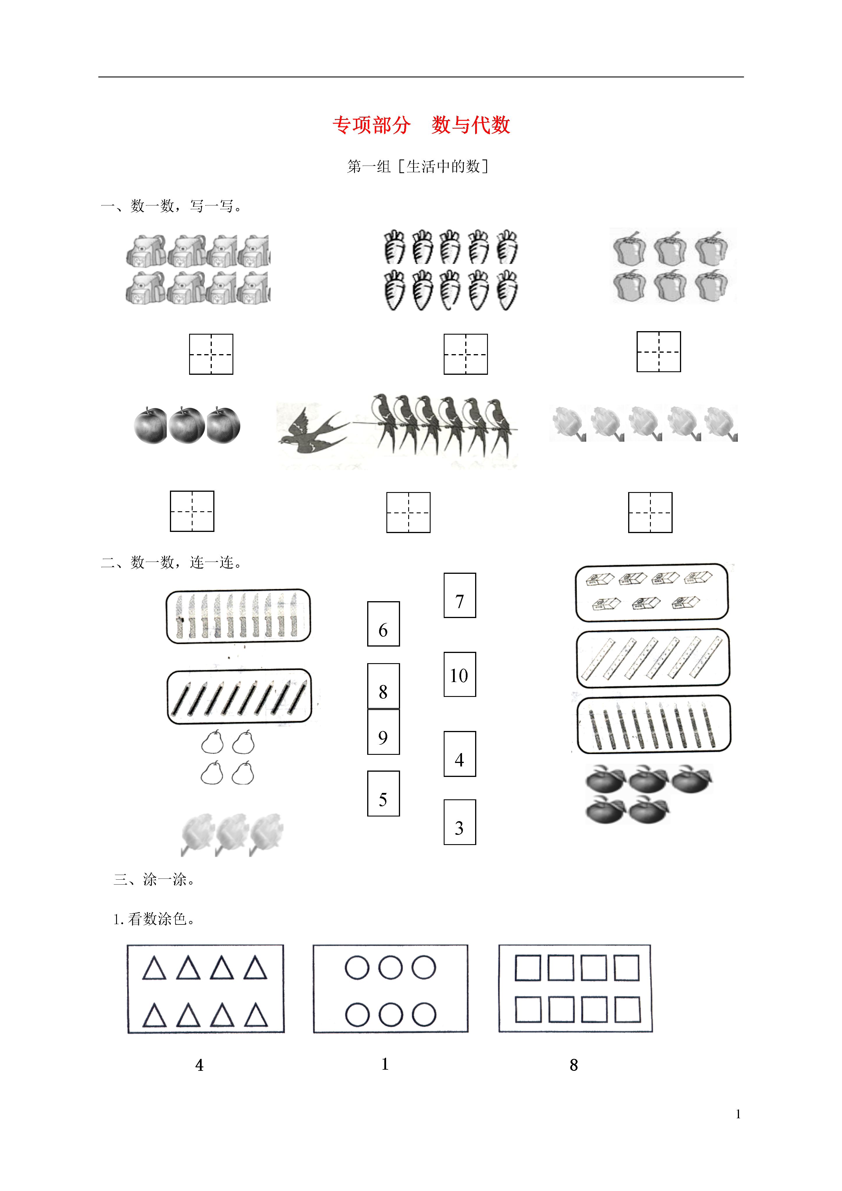 1专项部分数与代数第一组[生活中的数]一、数一数,写一写。7二、数一数,连一连。61089453三、涂一涂。1.看数涂色。41831000000000000000-0-090009099--992.根据要求涂上颜色。把从右数第5头大象涂上你喜欢的颜色。给从左数前4只恐龙涂上颜色。给从左数第8只小猫涂上颜色。四、按顺序写数。3179311.2.3.五、动脑筋,你就能答对。体育课上,老师按8个同学排成一队,从前面数,聪聪排在第5位,从后边数,聪聪排在第几?第二组[比较]一、你会选吗?在合适的答案后面画“√”1、小猴吃蟠桃。多多2、数珠子。(1)(2)多多多多和同样多和同样多3、动物搬家。每个动物住一间,够吗?动物之家够不够4、商店里一共有这些手套,我们每人一副,够吗?够不够二、选一选。1.比长短。(长的画“√”,短的画“△”)(1)(2)2.比高矮。(高的画“√”,矮的画“△”)(1)(2)3.在多的后面画“√”,在少的后面画“×”。(1)(2)(3)4.大的画,小的画△。5.比一比,重的画,轻的画。。6.哪只兔子最先吃到胡萝卜?在它旁边的□里画“○”。三、每组图中把与左边同样多的部分圈起来。四、数一数,把缺少的画出来。4(1)7(2)8(3)9(4)6(5)五、涂一涂。(1)给最长的铅笔涂上红色。(2)给最高的小朋友的衣服涂上你喜欢的颜色。(3)哪杯果汁最多,把最多的果汁涂上黄色。六、智力闯关。第三组[加与减(一)]一、填空1.看算式,先画○,再填数。2+4=□5+1=□4+3=□○○○○○○7-3=□7-5=□6-1=□○○○○○○○2.在□里填上合适的数。□+6=103+□=7□-2=410+□=105-□=24+□=8□+8=9□+□=93.夺红旗。+3+3+-2-51-+2+3-4+5-+――1-4-3+5984.从6、2、3、8中选三个数写出四道不同的算式。□○□=□□○□=□□○□=□□○□=□二、仔细算一算。5+4=4+2=3+6=6+2=5+1=8-3=8+0=9-9=8-6=4+4=7+2=2+6=1.4+3+2=3+6+1=7-3+2=5+3-2=10-0-3=9-2-3=2.三、分桃子。(连线)4+43+64+56+20+82+75+39-098()+()()+()()+()()+()()+()8四、开火车()+()()+()()+()()+()()+()10五、选一选。1.选﹥、﹤或=,填在里。9○84+6○76+2○85○76+2○82+7○108-2○810-3○84+4○710-9○23+7○88-2○8+22.下面是“+”还是“-”?72=955=081=774=323=506=637=1092=744=8六、打靶比赛。七、看图写出算式。☆☆☆☆☆☆☆☆☆☆☆1.=+=-○○○○○○○○○☆2.=+=-共9个八、看图列式?个1.2.共9支3.4.?支=+4=+45.6.==九、先摆一摆,再填数.1.比少()个。比多()个。-=2.比少()个。比多()个。-=十、解决问题。1.小兔原来有5只气球,小猪又拿来3只气球,现在一共有多少只气球?+=2.屋子里原来有5只鸽子,飞走了3只,还剩几只鸽子?-=3.小猫已经钓了3条鱼,河里还有7条鱼,河里一共有多少条鱼?+=4.我做彩旗用了2张绿纸我做彩旗用了8张红纸(1)他们做彩旗一共用了多少张彩纸?=(2)红纸比绿纸多用了多少张?=5.=第四组[加与减(二)]一、填一填。9+6=8+7=6+8=1.算法我来填。10101014-9=17-9=15-8=2.在○里填上“>”“<”或“=”。10+7○8