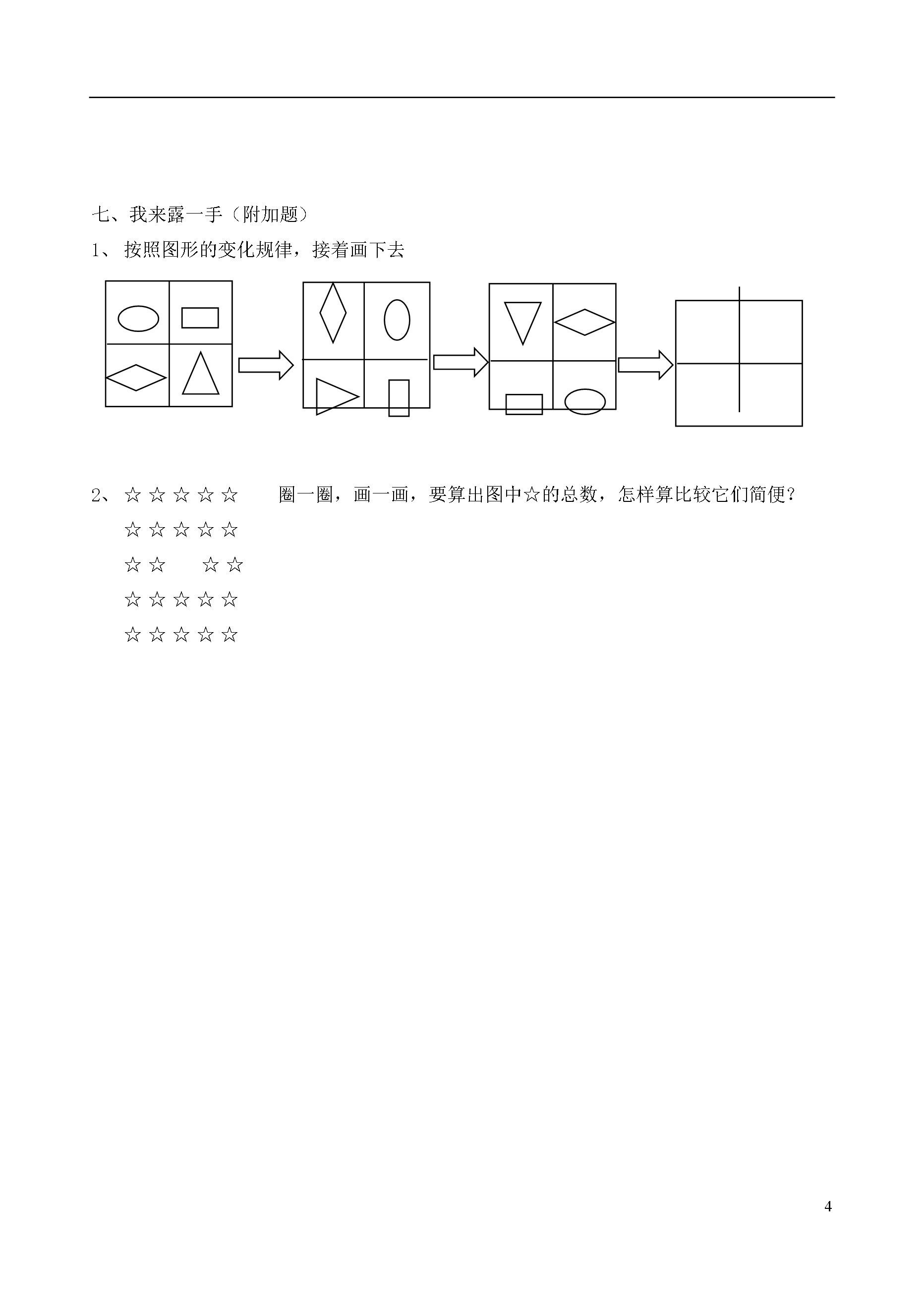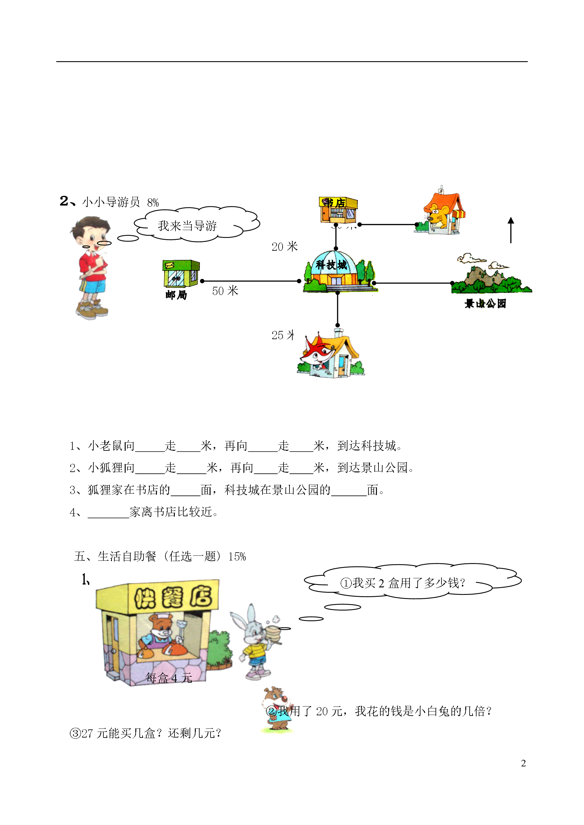 4(北师大版)一年级数学上册期末测试3班级:姓名:得分:知识根据地□×□=□×□=24□×□=□×□=36□÷□=□÷□=5□×□=□÷□=81时=分100分=时分75秒=分秒二、是非审判庭1、把21个苹果平均分给3个同学,每人分到6个,还剩3个。………()2、淘气早上上学时面向太阳走,下午回家时应该背向太阳走。…………()3、面向南方,后面是北,左面是东,右面是西。…………………………()4、箱子里装着5个黄球和5个红球,随便摸一个球,一定是红球。……()三、数学高速路1、口算3×3=2×5=2×8=1×9=4×4=5×9=6×7=49÷7=4×8=36-6=7×9=6×8=4×7=56÷7=3×7=17+42=59-18=32÷4=64÷8=36÷9=2、在○里填上“>”“<”或“=”7×8○655×7○6×68×3+8○8×47○2×58+8○643×3○72÷9100秒○1分钟4×4○4+4:::四、生活万花筒1、做时间的主人经过()分经过()分我来当导游小小导游员8%北30米20米50米45米25米1、小老鼠向走米,再向走米,到达科技城。2、小狐狸向走米,再向走米,到达景山公园。3、狐狸家在书店的面,科技城在景山公园的面。4、家离书店比较近。①我买2盒用了多少钱?五、生活自助餐(任选一题)15%每盒4元②我用了20元,我花的钱是小白兔的几倍?③27元能买几盒?还剩几元?2、①买4个布娃娃需要多少钱?②24元可以买几只风筝?③如果你有30元想买些什么?还剩多少钱?·········密·····封·····线·····内·····不·····要·····作·····答·········参加体育小组有16人参加唱歌小组人数的有4人学区小学年班姓名六、素质加油站科技小组的人数是唱歌小组人数的2倍体育活动:□□□□□□□□□□□□□□□□□□□□唱歌小组:□□□□□□□□□□□□□□□□□□□□科技小组:□□□□□□□□□□□□□□□□□□□□①参加科技小组有多少人?②参加体育小组的人数是科技小组的几倍?③你还能提出哪些数学问题?七、我来露一手(附加题)按照图形的变化规律,接着画下去☆☆☆☆☆圈一圈,画一画,要算出图中☆的总数,怎样算比较它们简便?☆☆☆☆☆☆☆☆☆☆☆☆☆☆☆☆☆☆☆