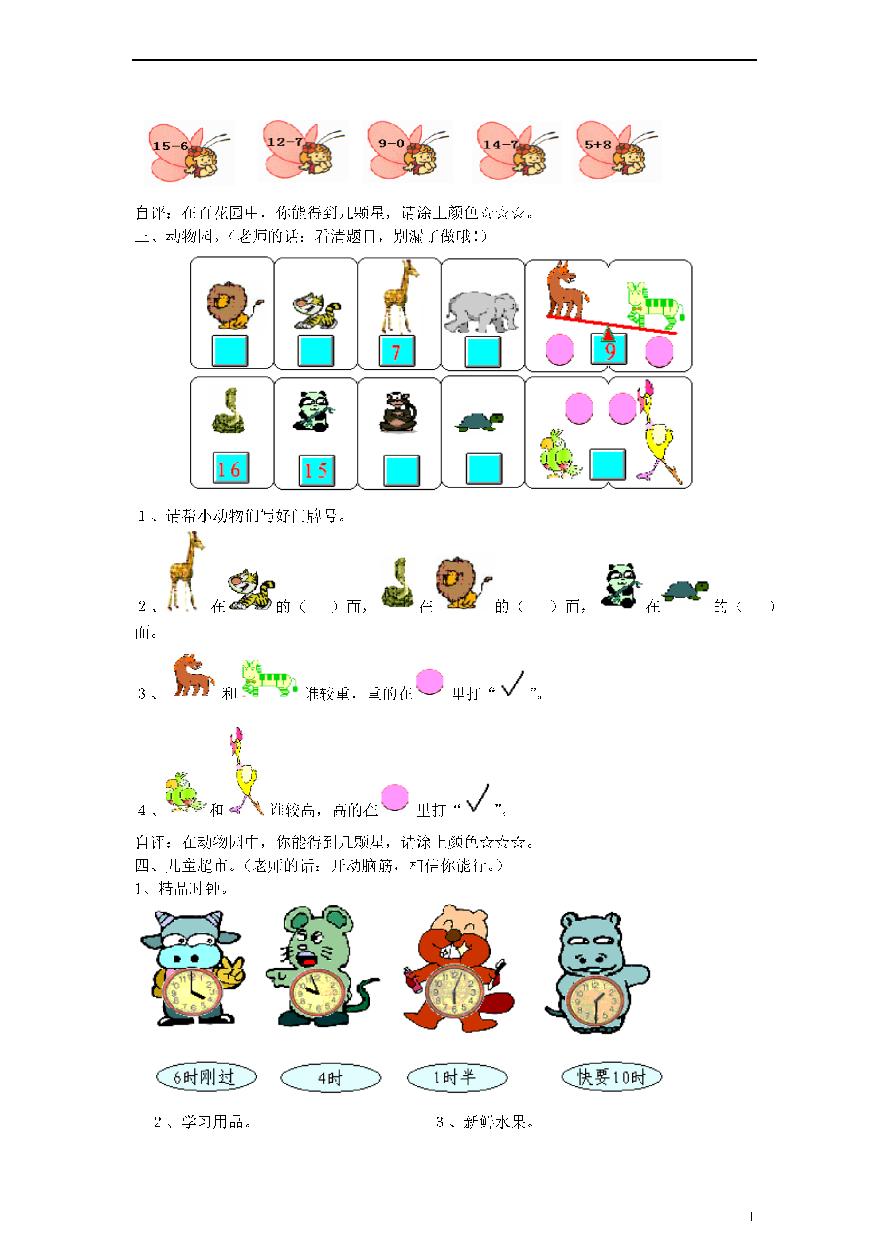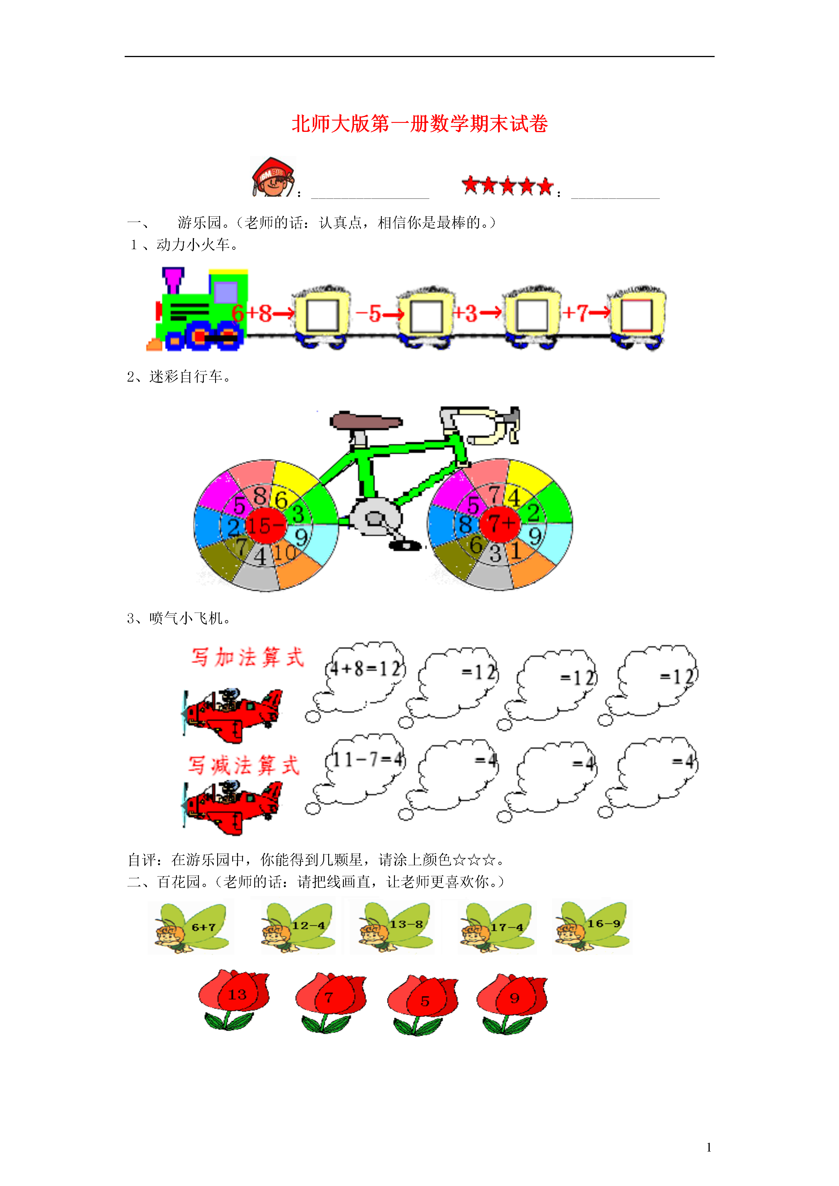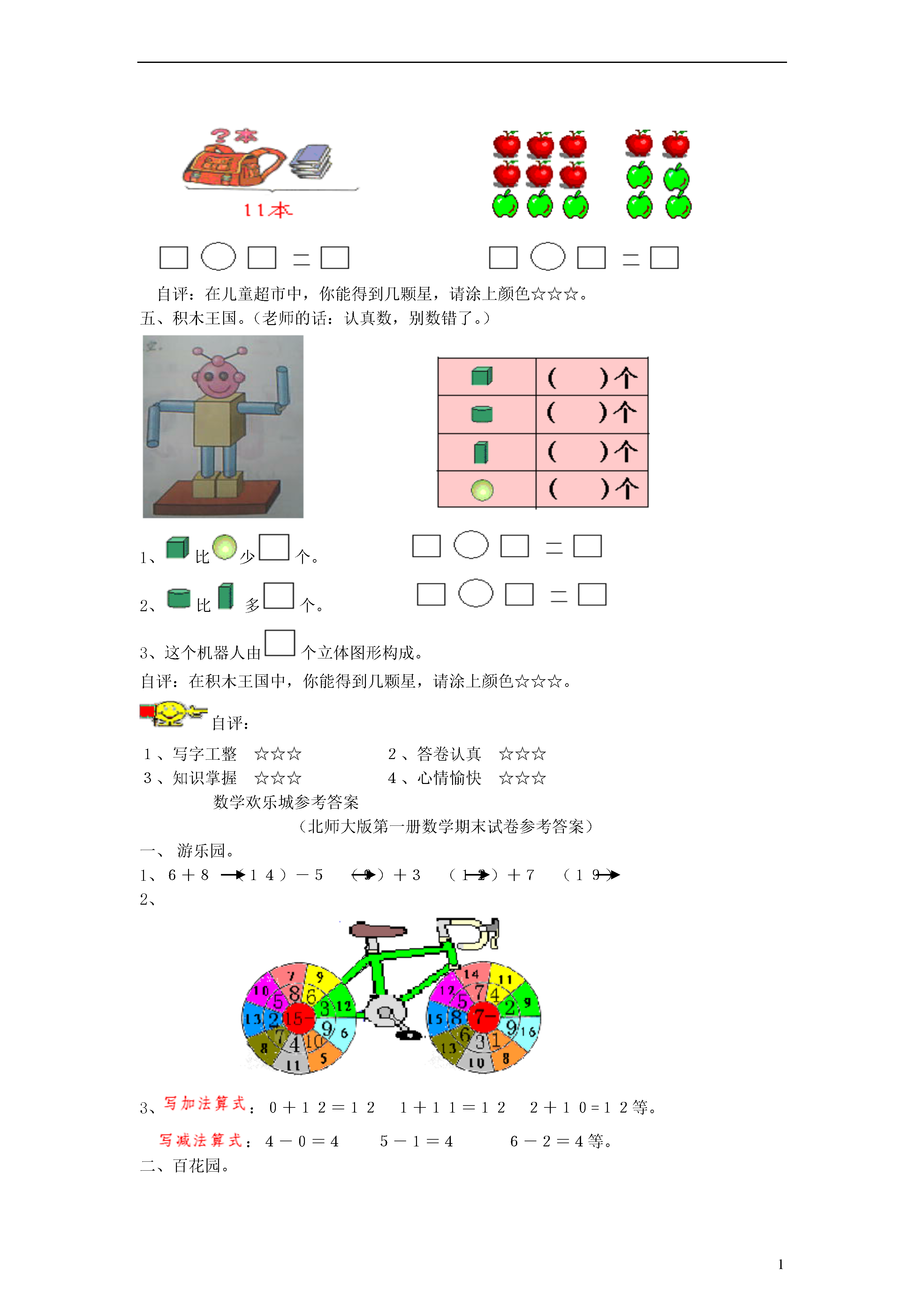 1北师大版第一册数学期末试卷:________________:____________游乐园。(老师的话:认真点,相信你是最棒的。)1、动力小火车。2、迷彩自行车。3、喷气小飞机。自评:在游乐园中,你能得到几颗星,请涂上颜色☆☆☆。二、百花园。(老师的话:请把线画直,让老师更喜欢你。)自评:在百花园中,你能得到几颗星,请涂上颜色☆☆☆。三、动物园。(老师的话:看清题目,别漏了做哦!)1、请帮小动物们写好门牌号。2、在的()面,在的()面,在的()面。3、和谁较重,重的在里打“”。4、和谁较高,高的在里打“”。自评:在动物园中,你能得到几颗星,请涂上颜色☆☆☆。四、儿童超市。(老师的话:开动脑筋,相信你能行。)1、精品时钟。2、学习用品。3、新鲜水果。自评:在儿童超市中,你能得到几颗星,请涂上颜色☆☆☆。五、积木王国。(老师的话:认真数,别数错了。)1、比少个。2、比多个。3、这个机器人由个立体图形构成。自评:在积木王国中,你能得到几颗星,请涂上颜色☆☆☆。自评:1、写字工整☆☆☆2、答卷认真☆☆☆3、知识掌握☆☆☆4、心情愉快☆☆☆数学欢乐城参考答案(北师大版第一册数学期末试卷参考答案)游乐园。1、6+8(14)-5(9)+3(12)+7(19)2、3、:0+12=121+11=122+10=12等。:4-0=45-1=46-2=4等。二、百花园。三、动物园。1、(5)、(6)、7、(8)、916、15、(14)、(13)、(12)2、右或后下左3、4、四、儿童超市。1、2、11-4=73、9+6=15或8+7=15(两个加数交换位置亦可)。五、积木王国。