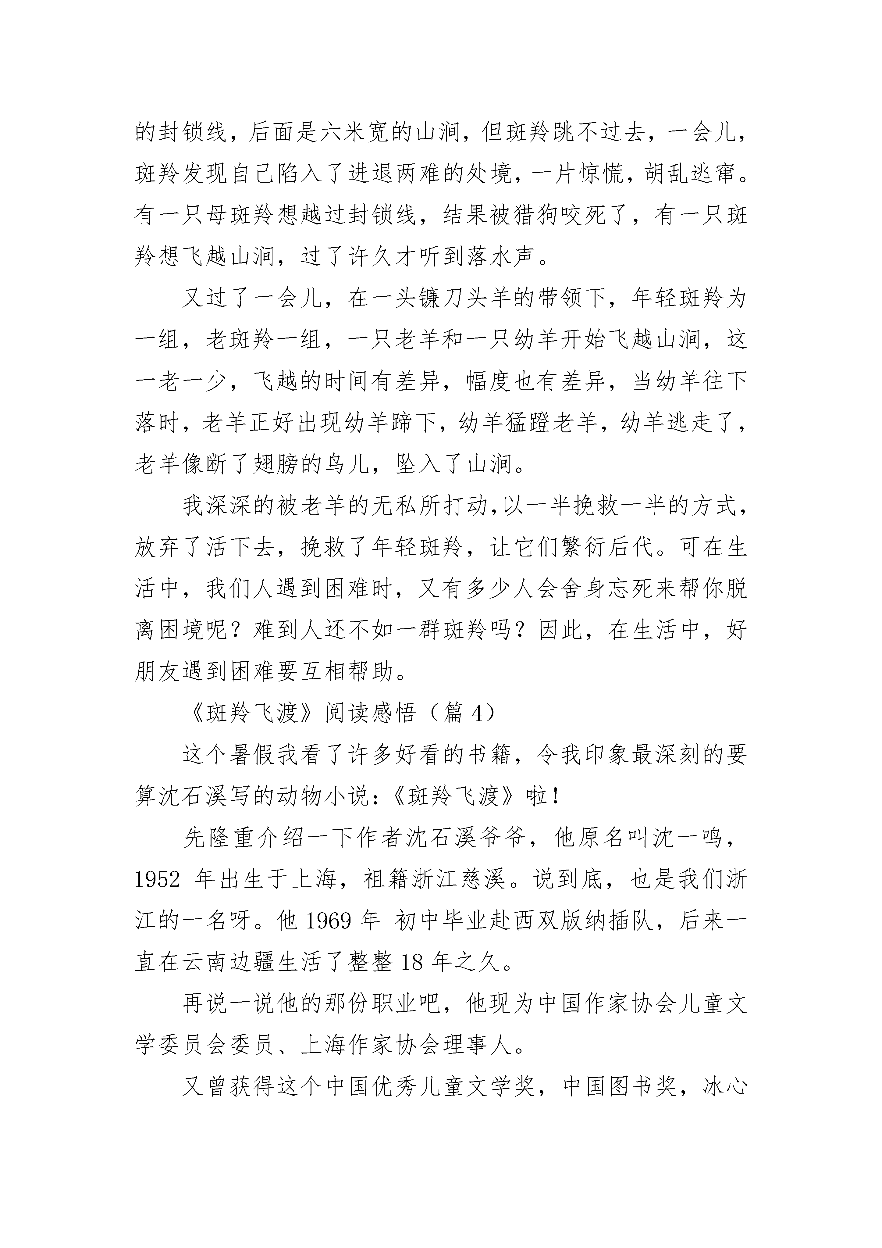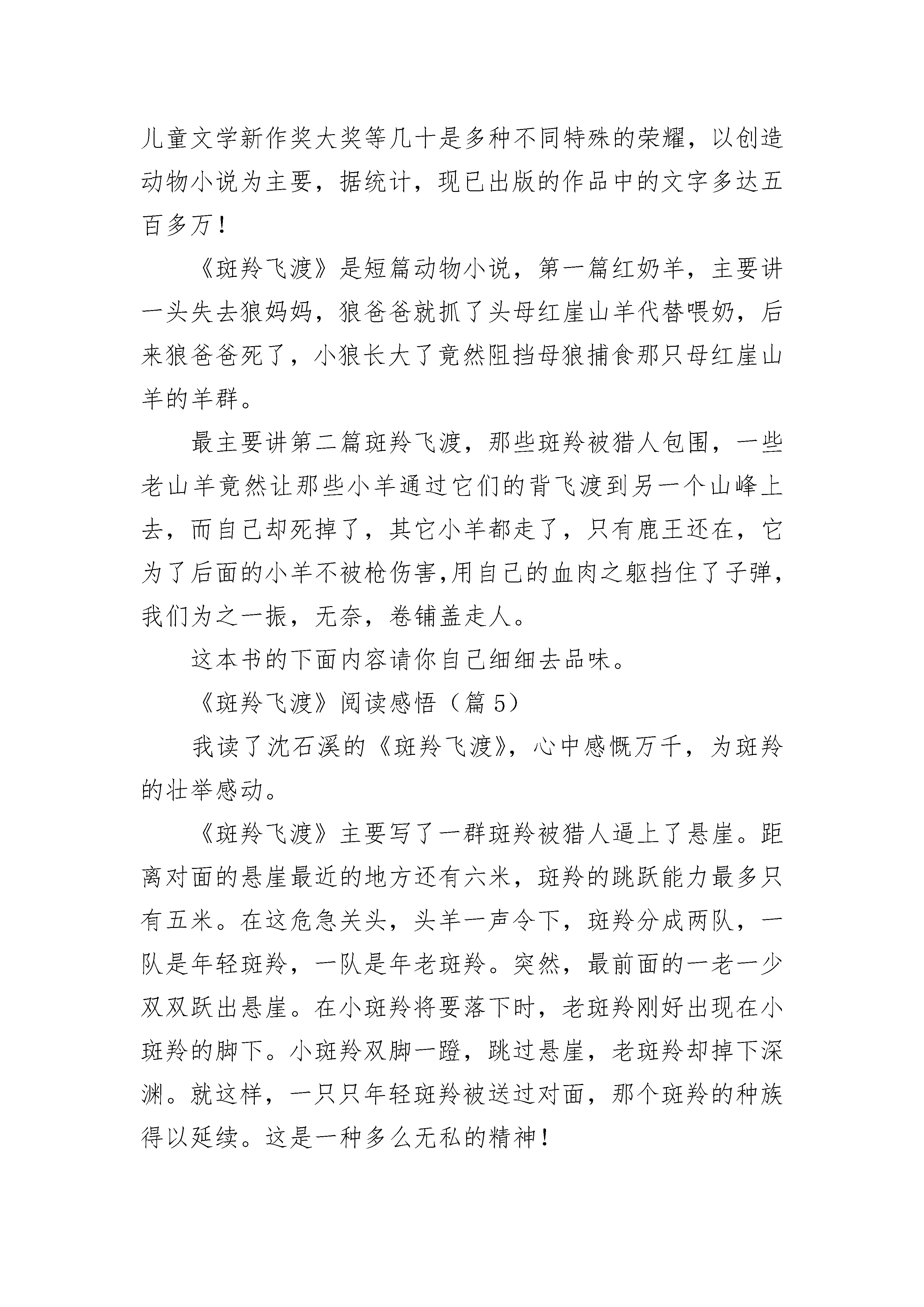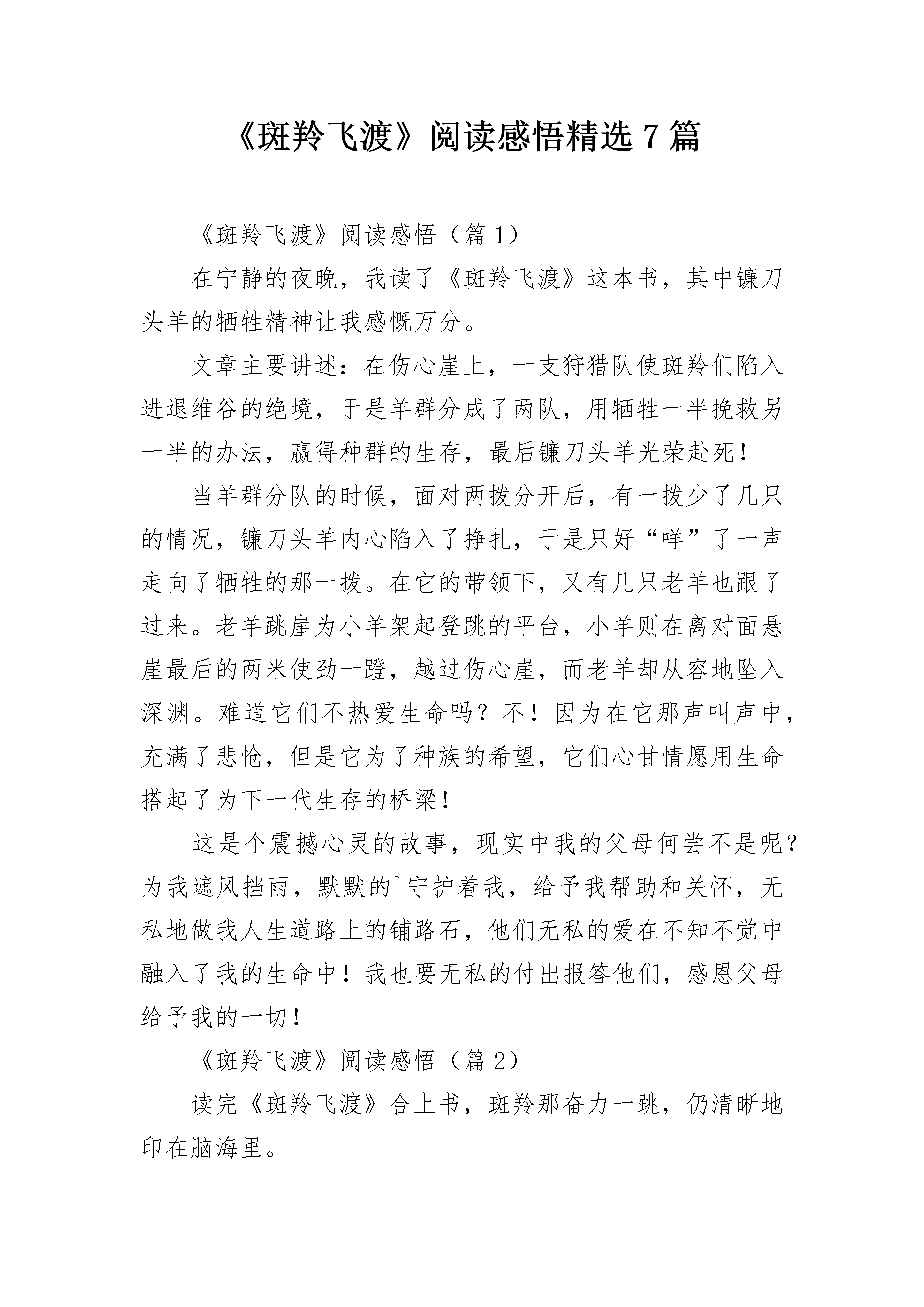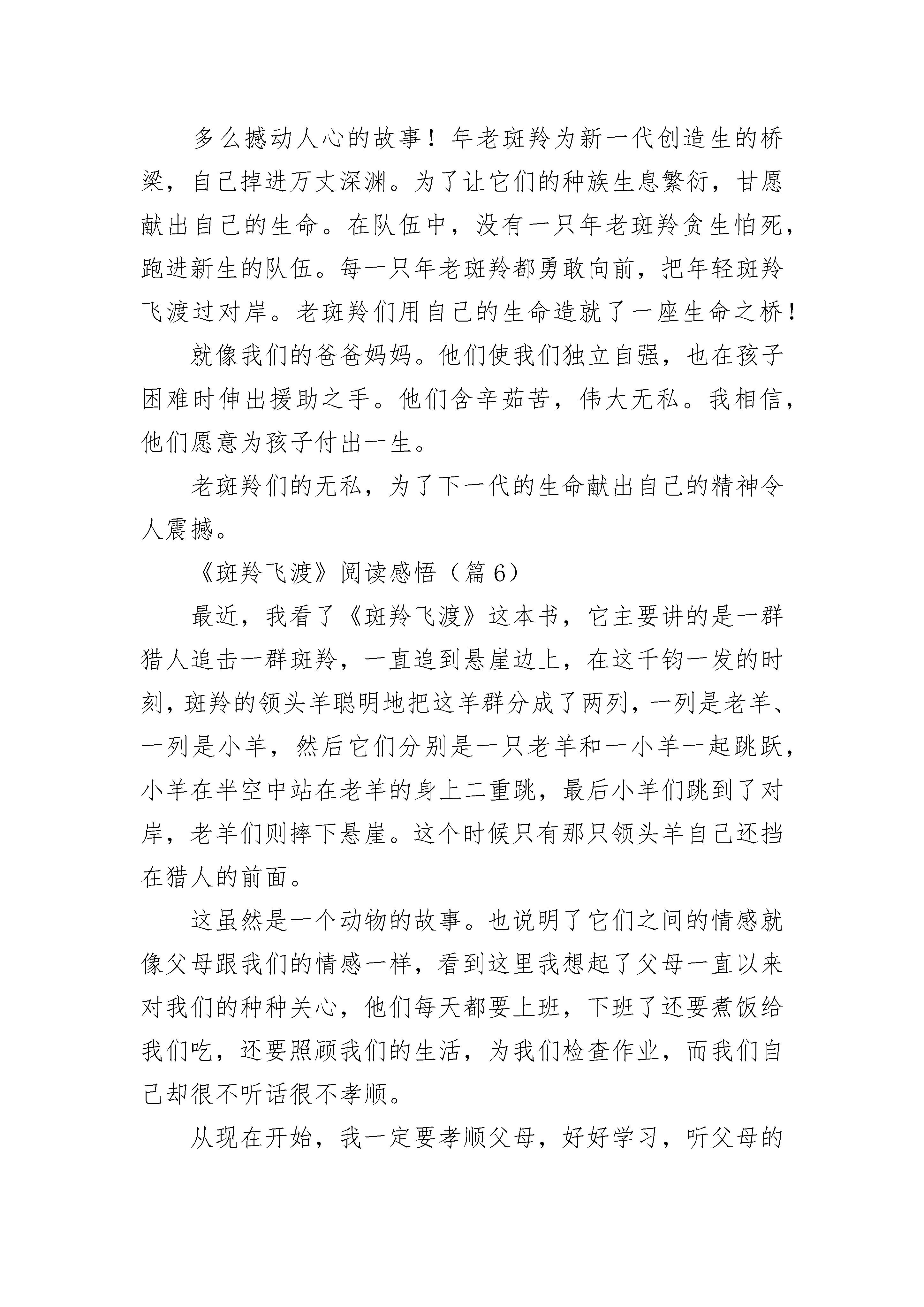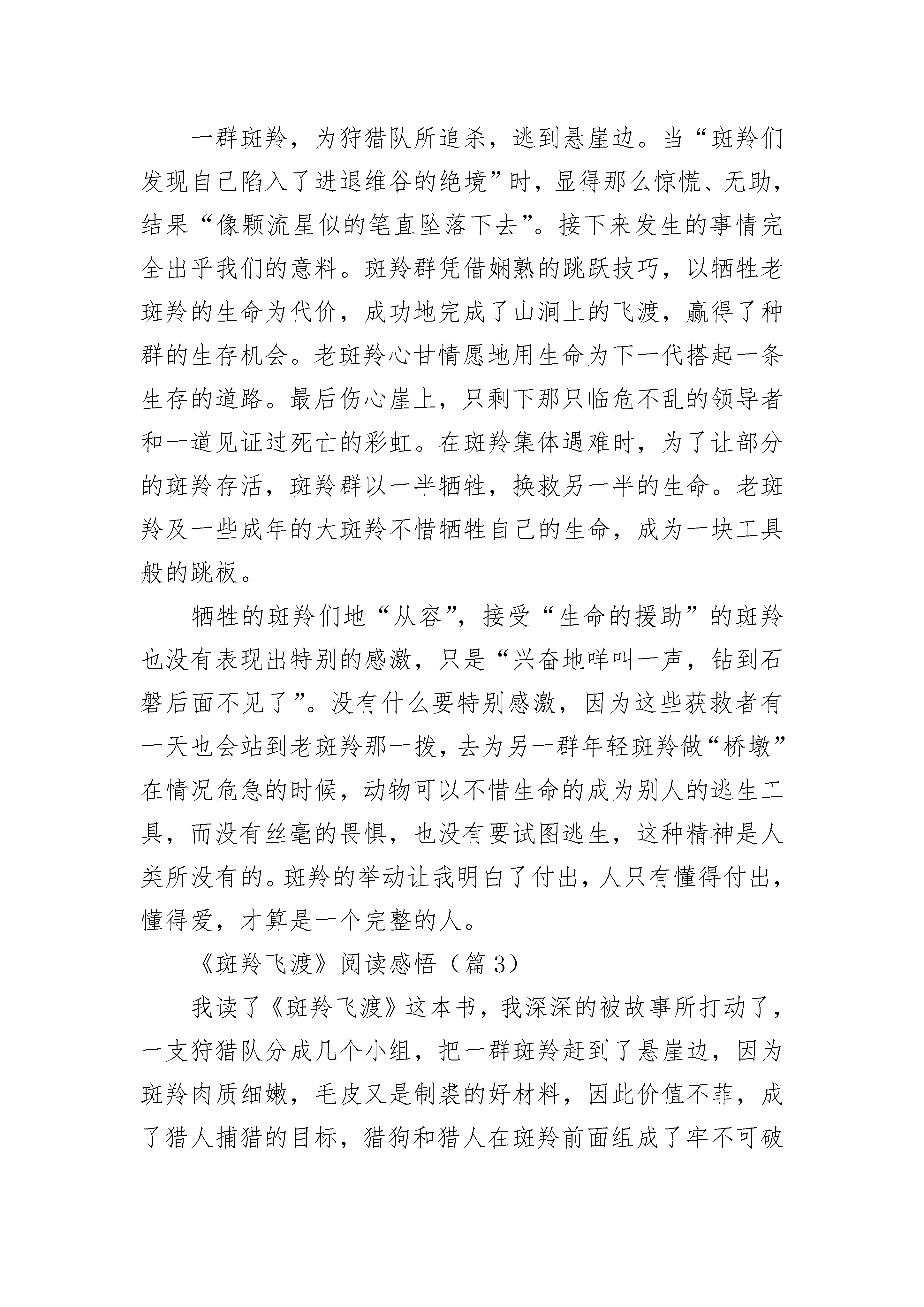 《斑羚飞渡》阅读感悟精选7篇《斑羚飞渡》阅读感悟(篇1)在宁静的夜晚,我读了《斑羚飞渡》这本书,其中镰刀头羊的牺牲精神让我感慨万分。文章主要讲述:在伤心崖上,一支狩猎队使斑羚们陷入进退维谷的绝境,于是羊群分成了两队,用牺牲一半挽救另一半的办法,赢得种群的生存,最后镰刀头羊光荣赴死!当羊群分队的时候,面对两拨分开后,有一拨少了几只的情况,镰刀头羊内心陷入了挣扎,于是只好“咩”了一声走向了牺牲的那一拨。在它的带领下,又有几只老羊也跟了过来。老羊跳崖为小羊架起登跳的平台,小羊则在离对面悬崖最后的两米使劲一蹬,越过伤心崖,而老羊却从容地坠入深渊。难道它们不热爱生命吗?不!因为在它那声叫声中,充满了悲怆,但是它为了种族的希望,它们心甘情愿用生命搭起了为下一代生存的桥梁!这是个震撼心灵的故事,现实中我的父母何尝不是呢?为我遮风挡雨,默默的`守护着我,给予我帮助和关怀,无私地做我人生道路上的铺路石,他们无私的爱在不知不觉中融入了我的生命中!我也要无私的付出报答他们,感恩父母给予我的一切!《斑羚飞渡》阅读感悟(篇2)读完《斑羚飞渡》合上书,斑羚那奋力一跳,仍清晰地印在脑海里。一群斑羚,为狩猎队所追杀,逃到悬崖边。当“斑羚们发现自己陷入了进退维谷的绝境”时,显得那么惊慌、无助,结果“像颗流星似的笔直坠落下去”。接下来发生的事情完全出乎我们的意料。斑羚群凭借娴熟的跳跃技巧,以牺牲老斑羚的生命为代价,成功地完成了山涧上的飞渡,赢得了种群的生存机会。老斑羚心甘情愿地用生命为下一代搭起一条生存的道路。最后伤心崖上,只剩下那只临危不乱的领导者和一道见证过死亡的彩虹。在斑羚集体遇难时,为了让部分的斑羚存活,斑羚群以一半牺牲,换救另一半的生命。老斑羚及一些成年的大斑羚不惜牺牲自己的生命,成为一块工具般的跳板。牺牲的斑羚们地“从容”,接受“生命的援助”的斑羚也没有表现出特别的感激,只是“兴奋地咩叫一声,钻到石磐后面不见了”。没有什么要特别感激,因为这些获救者有一天也会站到老斑羚那一拨,去为另一群年轻斑羚做“桥墩”在情况危急的时候,动物可以不惜生命的成为别人的逃生工具,而没有丝毫的畏惧,也没有要试图逃生,这种精神是人类所没有的。斑羚的举动让我明白了付出,人只有懂得付出,懂得爱,才算是一个完整的人。《斑羚飞渡》阅读感悟(篇3)我读了《斑羚飞渡》这本书,我深深的被故事所打动了,一支狩猎队分成几个小组,把一群斑羚赶到了悬崖边,因为斑羚肉质细嫩,毛皮又是制裘的好材料,因此价值不菲,成了猎人捕猎的目标,猎狗和猎人在斑羚前面组成了牢不可破的封锁线,后面是六米宽的山涧,但斑羚跳不过去,一会儿,斑羚发现自己陷入了进退两难的处境,一片惊慌,胡乱逃窜。有一只母斑羚想越过封锁线,结果被猎狗咬死了,有一只斑羚想飞越山涧,过了许久才听到落水声。又过了一会儿,在一头镰刀头羊的带领下,年轻斑羚为一组,老斑羚一组,一只老羊和一只幼羊开始飞越山涧,这一老一少,飞越的时间有差异,幅度也有差异,当幼羊往下落时,老羊正好出现幼羊蹄下,幼羊猛蹬老羊,幼羊逃走了,老羊像断了翅膀的鸟儿,坠入了山涧。我深深的被老羊的无私所打动,以一半挽救一半的方式,放弃了活下去,挽救了年轻斑羚,让它们繁衍后代。可在生活中,我们人遇到困难时,又有多少人会舍身忘死来帮你脱离困境呢?难到人还不如一群斑羚吗?因此,在生活中,好朋友遇到困难要互相帮助。《斑羚飞渡》阅读感悟(篇4)这个暑假我看了许多好看的书籍,令我印象最深刻的要算沈石溪写的动物小说:《斑羚飞渡》啦!先隆重介绍一下作者沈石溪爷爷,他原名叫沈一鸣,1952年出生于上海,祖籍浙江慈溪。说到底,也是我们浙江的一名呀。他1969年初中毕业赴西双版纳插队,后来一直在云南边疆生活了整整18年之久。再说一说他的那份职业吧,他现为中国作家协会儿童文学委员会委员、上海作家协会理事人。又曾获得这个中国优秀儿童文学奖,中国图书奖,冰心儿童文学新作奖大奖等几十是多种不同特殊的荣耀,以创造动物小说为主要,据统计,现已出版的作品中的文字多达五百多万!《斑羚飞渡》是短篇动物小说,第一篇红奶羊,主要讲一头失去狼妈妈,狼爸爸就抓了头母红崖山羊代替喂奶,后来狼爸爸死了,小狼长大了竟然阻挡母狼捕食那只母红崖山羊的羊群。最主要讲第二篇斑羚飞渡,那些斑羚被猎人包围,一些老山羊竟然让那些小羊通过它们的背飞渡到另一个山峰上去,而自己却死掉了,其它小羊都走了,只有鹿王还在,它为了后面的小羊不被枪伤害,用自己的血肉之躯挡住了子弹,我们为之一振,无奈,卷铺盖走人。这本书的下面内容请你自己细细去品味。《斑羚飞渡》阅读感悟(篇5)我读了沈石溪的《斑羚飞渡》,心中感慨万千,为斑羚的壮举感动。《斑羚飞渡》主要写了一群斑羚被猎人逼上了悬崖。距离对面的悬崖最近的地方还有六米,斑羚的跳跃能力最多只有五米。在这危急关头,头羊一声令下,