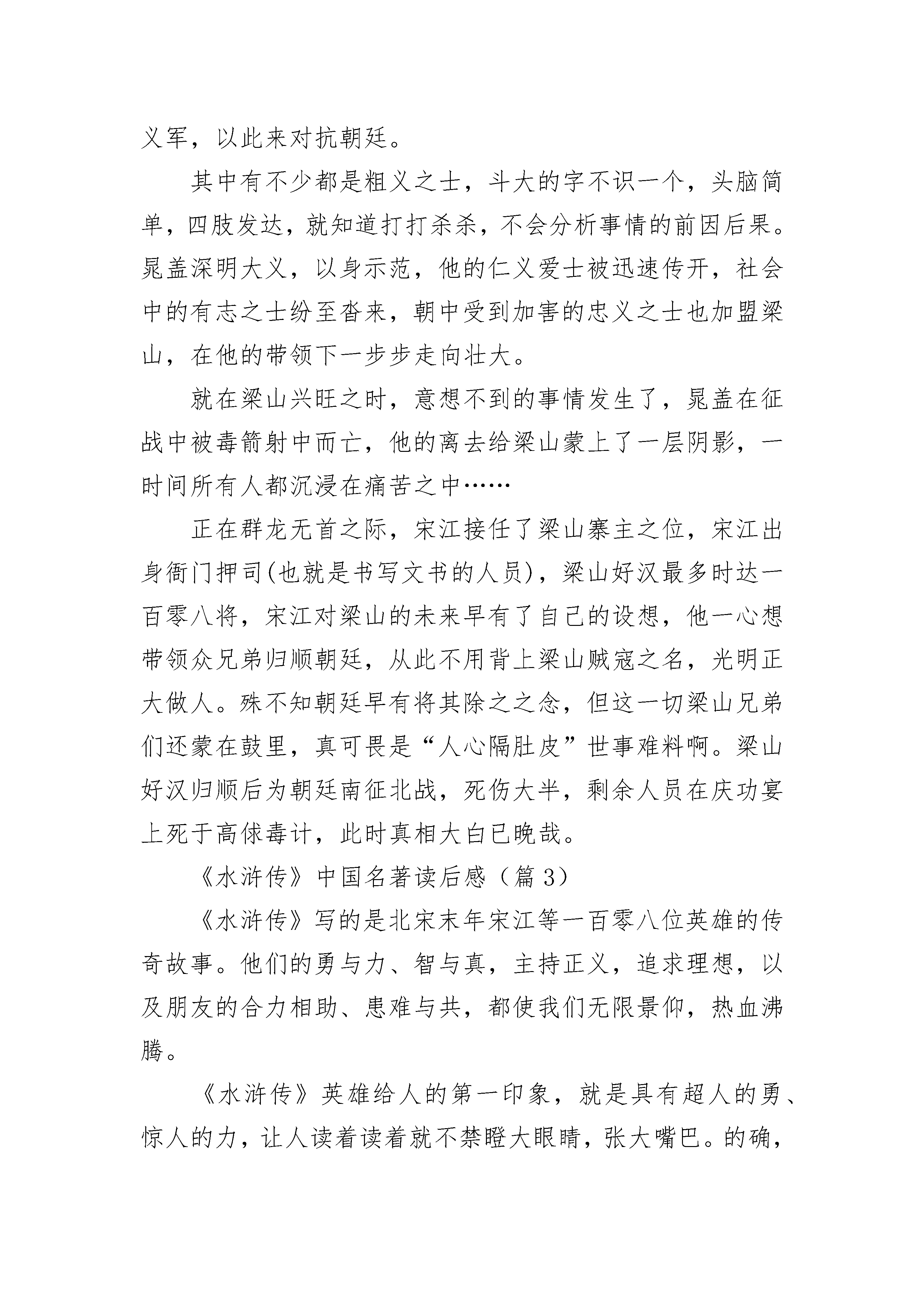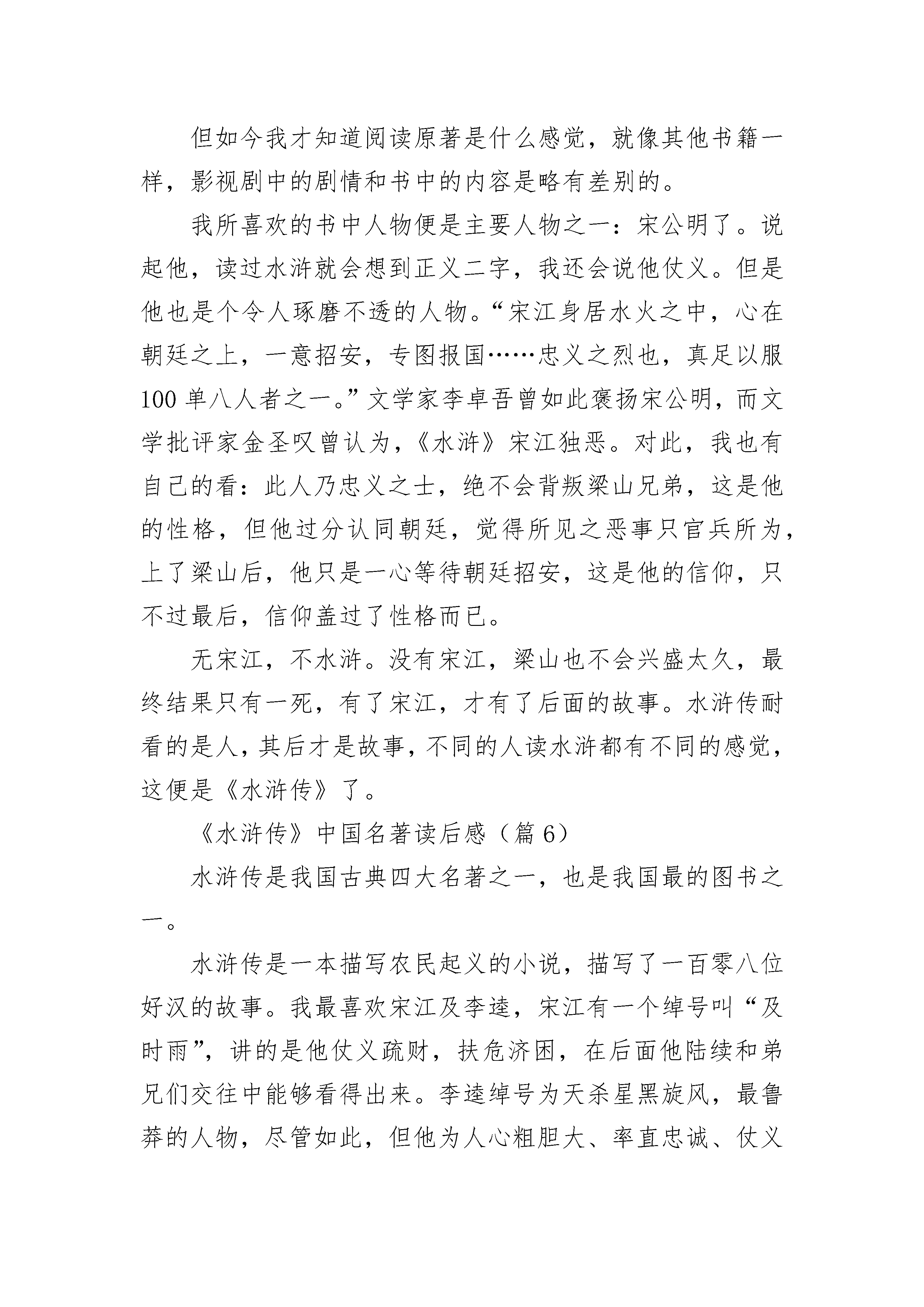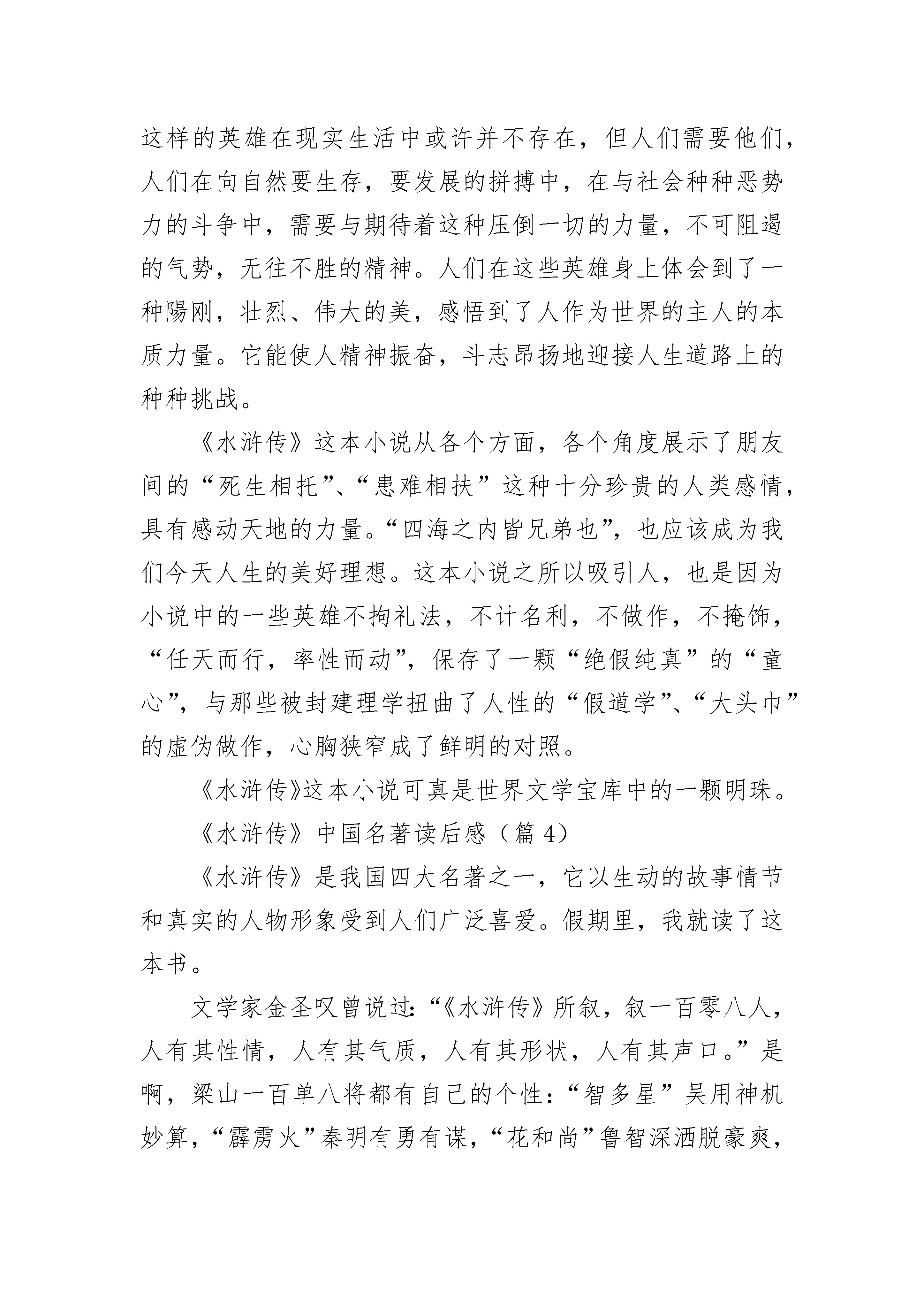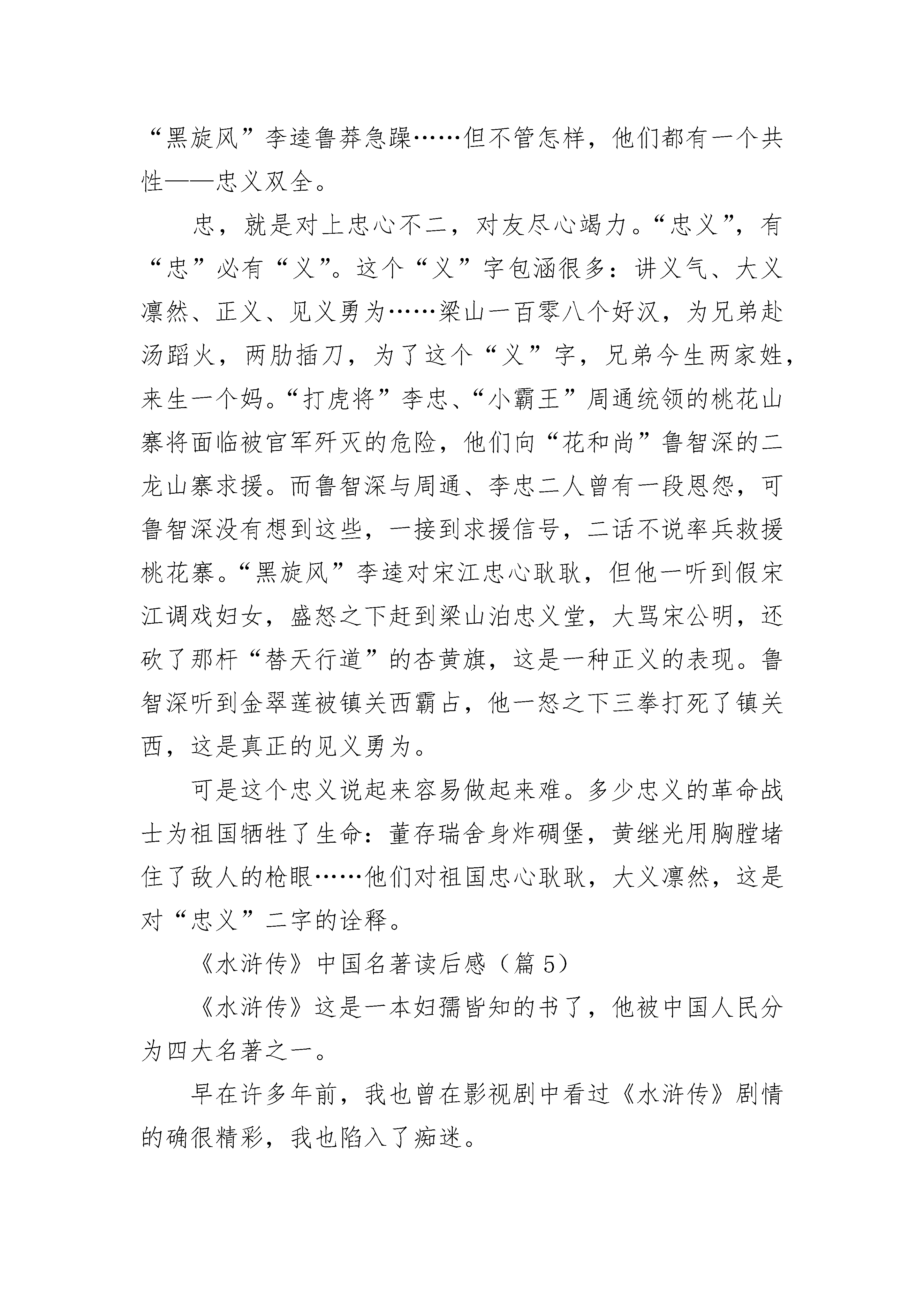 《水浒传》中国名著读后感(精选7篇)《水浒传》中国名著读后感(篇1)《水浒传》是我国古代,也是世界文学上的一部描写农民革命斗争的长篇小说,和《三国演义》、《西游记》、《红楼梦》并称为中国四大古典小说,几百年来,一直受到广大群众和小朋友们的喜爱。《水浒传》里讲了很多故事:太尉高俅原本是个无赖,因为会踢球,得到了皇帝的赏识,从此青云直上,无恶不作。他的干独生子高衙内横行霸道,为了霸占八十万禁军总教头林冲的漂亮妻子,他诬蔑林冲带刀进八军机重地白虎堂图谋不轨,把林冲发配充军,还想在野猪林半路把他杀死,幸亏花和尚鲁智深仗义相救。又有打虎英雄武松、宋江等众多好汉,共108人,最终都因为种种不同原因而被逼在梁山落草为寇,揭杆起义。他们举起义旗,打着替天行道,劫富济贪的口号,杀遍大江南北,沉重地打击了反动统治者的嚣张气焰,张扬了人民群众的神勇斗志,干出了一番轰轰烈烈的大事业。《水浒传》以其酷爱自由、富于反抗斗争的民主思想和性格鲜明,栩栩如生的人物形象,让人十分的喜爱。《水浒传》中国名著读后感(篇2)《水浒传》描写的是宋朝农民起义的小说,故事发生在梁山泊(今山东济宁)。因民众不满当时封建社会阶级矛盾,平民英勇义士们团结起来,聚集在梁山泊以晁盖为首领的起义军,以此来对抗朝廷。其中有不少都是粗义之士,斗大的字不识一个,头脑简单,四肢发达,就知道打打杀杀,不会分析事情的前因后果。晁盖深明大义,以身示范,他的仁义爱士被迅速传开,社会中的有志之士纷至沓来,朝中受到加害的忠义之士也加盟梁山,在他的带领下一步步走向壮大。就在梁山兴旺之时,意想不到的事情发生了,晁盖在征战中被毒箭射中而亡,他的离去给梁山蒙上了一层阴影,一时间所有人都沉浸在痛苦之中……正在群龙无首之际,宋江接任了梁山寨主之位,宋江出身衙门押司(也就是书写文书的人员),梁山好汉最多时达一百零八将,宋江对梁山的未来早有了自己的设想,他一心想带领众兄弟归顺朝廷,从此不用背上梁山贼寇之名,光明正大做人。殊不知朝廷早有将其除之之念,但这一切梁山兄弟们还蒙在鼓里,真可畏是“人心隔肚皮”世事难料啊。梁山好汉归顺后为朝廷南征北战,死伤大半,剩余人员在庆功宴上死于高俅毒计,此时真相大白已晚哉。《水浒传》中国名著读后感(篇3)《水浒传》写的是北宋末年宋江等一百零八位英雄的传奇故事。他们的勇与力、智与真,主持正义,追求理想,以及朋友的合力相助、患难与共,都使我们无限景仰,热血沸腾。《水浒传》英雄给人的第一印象,就是具有超人的勇、惊人的力,让人读着读着就不禁瞪大眼睛,张大嘴巴。的确,这样的英雄在现实生活中或许并不存在,但人们需要他们,人们在向自然要生存,要发展的拼搏中,在与社会种种恶势力的斗争中,需要与期待着这种压倒一切的力量,不可阻遏的气势,无往不胜的精神。人们在这些英雄身上体会到了一种陽刚,壮烈、伟大的美,感悟到了人作为世界的主人的本质力量。它能使人精神振奋,斗志昂扬地迎接人生道路上的种种挑战。《水浒传》这本小说从各个方面,各个角度展示了朋友间的“死生相托”、“患难相扶”这种十分珍贵的人类感情,具有感动天地的力量。“四海之内皆兄弟也”,也应该成为我们今天人生的美好理想。这本小说之所以吸引人,也是因为小说中的一些英雄不拘礼法,不计名利,不做作,不掩饰,“任天而行,率性而动”,保存了一颗“绝假纯真”的“童心”,与那些被封建理学扭曲了人性的“假道学”、“大头巾”的虚伪做作,心胸狭窄成了鲜明的对照。《水浒传》这本小说可真是世界文学宝库中的一颗明珠。《水浒传》中国名著读后感(篇4)《水浒传》是我国四大名著之一,它以生动的故事情节和真实的人物形象受到人们广泛喜爱。假期里,我就读了这本书。文学家金圣叹曾说过:“《水浒传》所叙,叙一百零八人,人有其性情,人有其气质,人有其形状,人有其声口。”是啊,梁山一百单八将都有自己的个性:“智多星”吴用神机妙算,“霹雳火”秦明有勇有谋,“花和尚”鲁智深洒脱豪爽,“黑旋风”李逵鲁莽急躁……但不管怎样,他们都有一个共性——忠义双全。忠,就是对上忠心不二,对友尽心竭力。“忠义”,有“忠”必有“义”。这个“义”字包涵很多:讲义气、大义凛然、正义、见义勇为……梁山一百零八个好汉,为兄弟赴汤蹈火,两肋插刀,为了这个“义”字,兄弟今生两家姓,来生一个妈。“打虎将”李忠、“小霸王”周通统领的桃花山寨将面临被官军歼灭的危险,他们向“花和尚”鲁智深的二龙山寨求援。而鲁智深与周通、李忠二人曾有一段恩怨,可鲁智深没有想到这些,一接到求援信号,二话不说率兵救援桃花寨。“黑旋风”李逵对宋江忠心耿耿,但他一听到假宋江调戏妇女,盛怒之下赶到梁山泊忠义堂,大骂宋公明,还砍了那杆“替天行道”的杏黄旗,这是一种正义的表现。鲁智深听到金翠莲被镇关西霸占,他一怒之下三拳打死了镇关西,这是真正的见义勇为。可是这个忠义说起来容易做起来