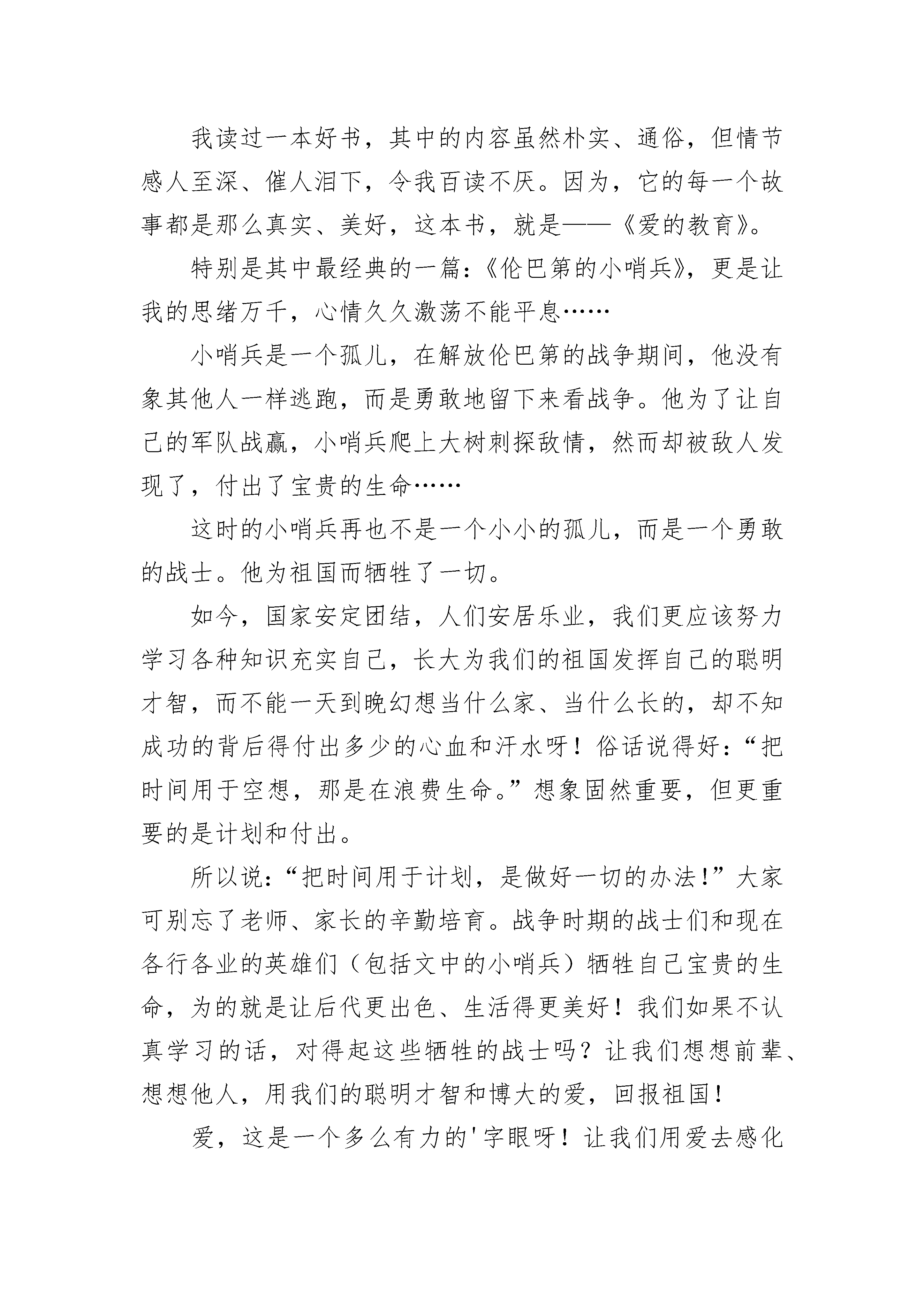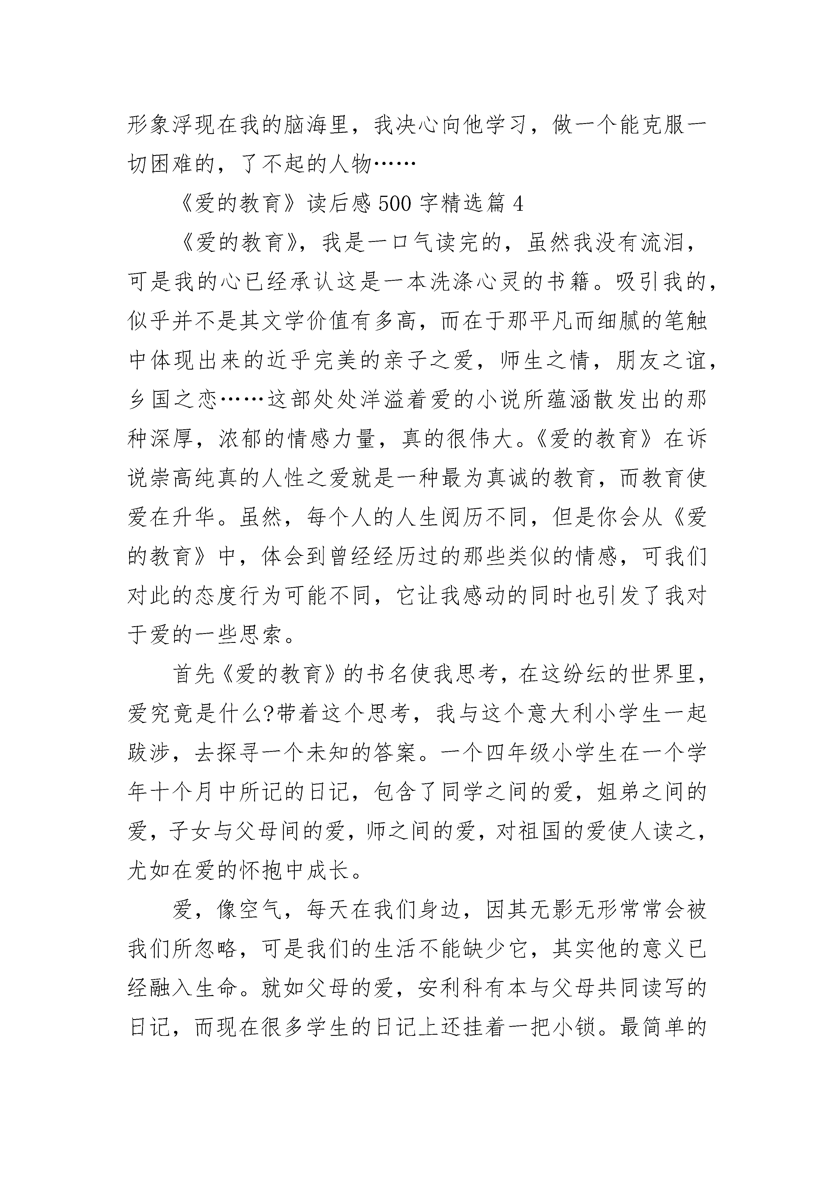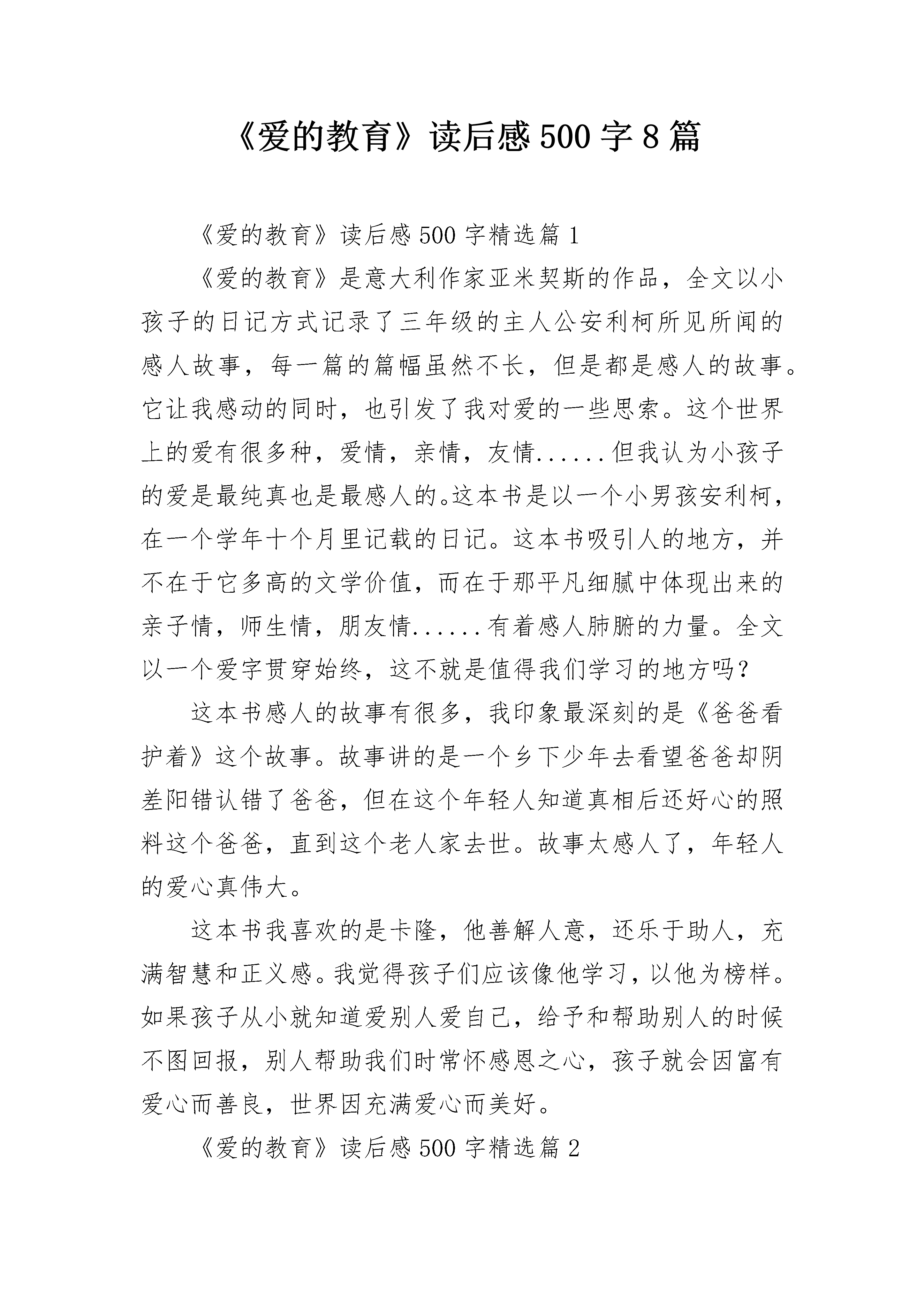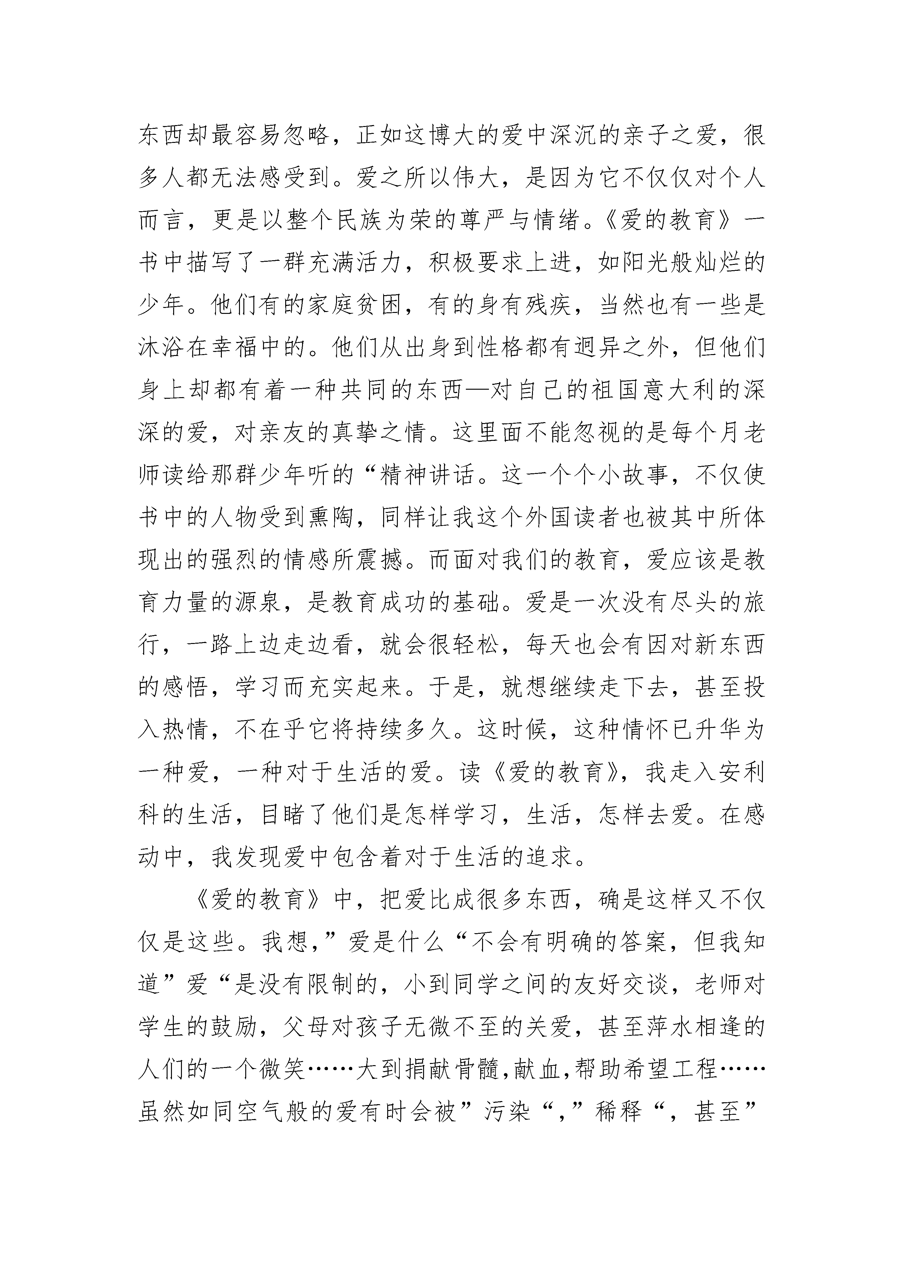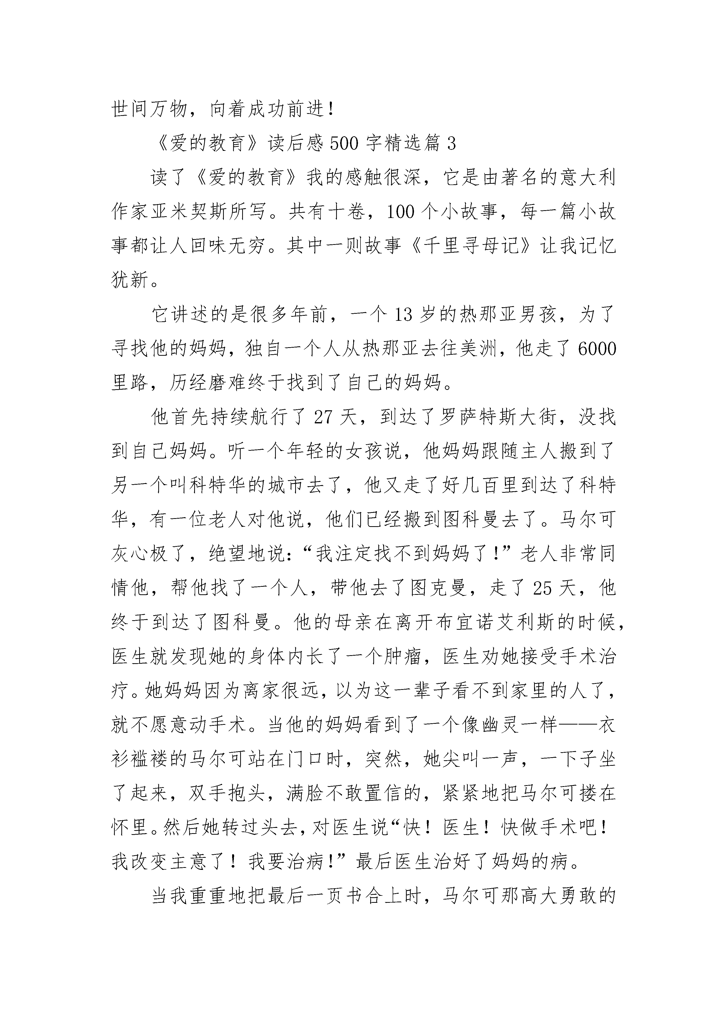 《爱的教育》读后感500字8篇《爱的教育》读后感500字精选篇1《爱的教育》是意大利作家亚米契斯的作品,全文以小孩子的日记方式记录了三年级的主人公安利柯所见所闻的感人故事,每一篇的篇幅虽然不长,但是都是感人的故事。它让我感动的同时,也引发了我对爱的一些思索。这个世界上的爱有很多种,爱情,亲情,友情......但我认为小孩子的爱是最纯真也是最感人的。这本书是以一个小男孩安利柯,在一个学年十个月里记载的日记。这本书吸引人的地方,并不在于它多高的文学价值,而在于那平凡细腻中体现出来的亲子情,师生情,朋友情......有着感人肺腑的力量。全文以一个爱字贯穿始终,这不就是值得我们学习的地方吗?这本书感人的故事有很多,我印象最深刻的是《爸爸看护着》这个故事。故事讲的是一个乡下少年去看望爸爸却阴差阳错认错了爸爸,但在这个年轻人知道真相后还好心的照料这个爸爸,直到这个老人家去世。故事太感人了,年轻人的爱心真伟大。这本书我喜欢的是卡隆,他善解人意,还乐于助人,充满智慧和正义感。我觉得孩子们应该像他学习,以他为榜样。如果孩子从小就知道爱别人爱自己,给予和帮助别人的时候不图回报,别人帮助我们时常怀感恩之心,孩子就会因富有爱心而善良,世界因充满爱心而美好。《爱的教育》读后感500字精选篇2我读过一本好书,其中的内容虽然朴实、通俗,但情节感人至深、催人泪下,令我百读不厌。因为,它的每一个故事都是那么真实、美好,这本书,就是——《爱的教育》。特别是其中最经典的一篇:《伦巴第的小哨兵》,更是让我的思绪万千,心情久久激荡不能平息……小哨兵是一个孤儿,在解放伦巴第的战争期间,他没有象其他人一样逃跑,而是勇敢地留下来看战争。他为了让自己的军队战赢,小哨兵爬上大树刺探敌情,然而却被敌人发现了,付出了宝贵的生命……这时的小哨兵再也不是一个小小的孤儿,而是一个勇敢的战士。他为祖国而牺牲了一切。如今,国家安定团结,人们安居乐业,我们更应该努力学习各种知识充实自己,长大为我们的祖国发挥自己的聪明才智,而不能一天到晚幻想当什么家、当什么长的,却不知成功的背后得付出多少的心血和汗水呀!俗话说得好:“把时间用于空想,那是在浪费生命。”想象固然重要,但更重要的是计划和付出。所以说:“把时间用于计划,是做好一切的办法!”大家可别忘了老师、家长的辛勤培育。战争时期的战士们和现在各行各业的英雄们(包括文中的小哨兵)牺牲自己宝贵的生命,为的就是让后代更出色、生活得更美好!我们如果不认真学习的话,对得起这些牺牲的战士吗?让我们想想前辈、想想他人,用我们的聪明才智和博大的爱,回报祖国!爱,这是一个多么有力的'字眼呀!让我们用爱去感化世间万物,向着成功前进!《爱的教育》读后感500字精选篇3读了《爱的教育》我的感触很深,它是由著名的意大利作家亚米契斯所写。共有十卷,100个小故事,每一篇小故事都让人回味无穷。其中一则故事《千里寻母记》让我记忆犹新。它讲述的是很多年前,一个13岁的热那亚男孩,为了寻找他的妈妈,独自一个人从热那亚去往美洲,他走了6000里路,历经磨难终于找到了自己的妈妈。他首先持续航行了27天,到达了罗萨特斯大街,没找到自己妈妈。听一个年轻的女孩说,他妈妈跟随主人搬到了另一个叫科特华的城市去了,他又走了好几百里到达了科特华,有一位老人对他说,他们已经搬到图科曼去了。马尔可灰心极了,绝望地说:“我注定找不到妈妈了!”老人非常同情他,帮他找了一个人,带他去了图克曼,走了25天,他终于到达了图科曼。他的母亲在离开布宜诺艾利斯的时候,医生就发现她的身体内长了一个肿瘤,医生劝她接受手术治疗。她妈妈因为离家很远,以为这一辈子看不到家里的人了,就不愿意动手术。当他的妈妈看到了一个像幽灵一样——衣衫褴褛的马尔可站在门口时,突然,她尖叫一声,一下子坐了起来,双手抱头,满脸不敢置信的,紧紧地把马尔可搂在怀里。然后她转过头去,对医生说“快!医生!快做手术吧!我改变主意了!我要治病!”最后医生治好了妈妈的病。当我重重地把最后一页书合上时,马尔可那高大勇敢的形象浮现在我的脑海里,我决心向他学习,做一个能克服一切困难的,了不起的人物……《爱的教育》读后感500字精选篇4《爱的教育》,我是一口气读完的,虽然我没有流泪,可是我的心已经承认这是一本洗涤心灵的书籍。吸引我的,似乎并不是其文学价值有多高,而在于那平凡而细腻的笔触中体现出来的近乎完美的亲子之爱,师生之情,朋友之谊,乡国之恋……这部处处洋溢着爱的小说所蕴涵散发出的那种深厚,浓郁的情感力量,真的很伟大。《爱的教育》在诉说崇高纯真的人性之爱就是一种最为真诚的教育,而教育使爱在升华。虽然,每个人的人生阅历不同,但是你会从《爱的教育》中,体会到曾经经历过的那些类似的情感,可我们对此的态度行为可能不同,它让我感动的同时也引发了我对于爱的一些思索。首先《爱的教育