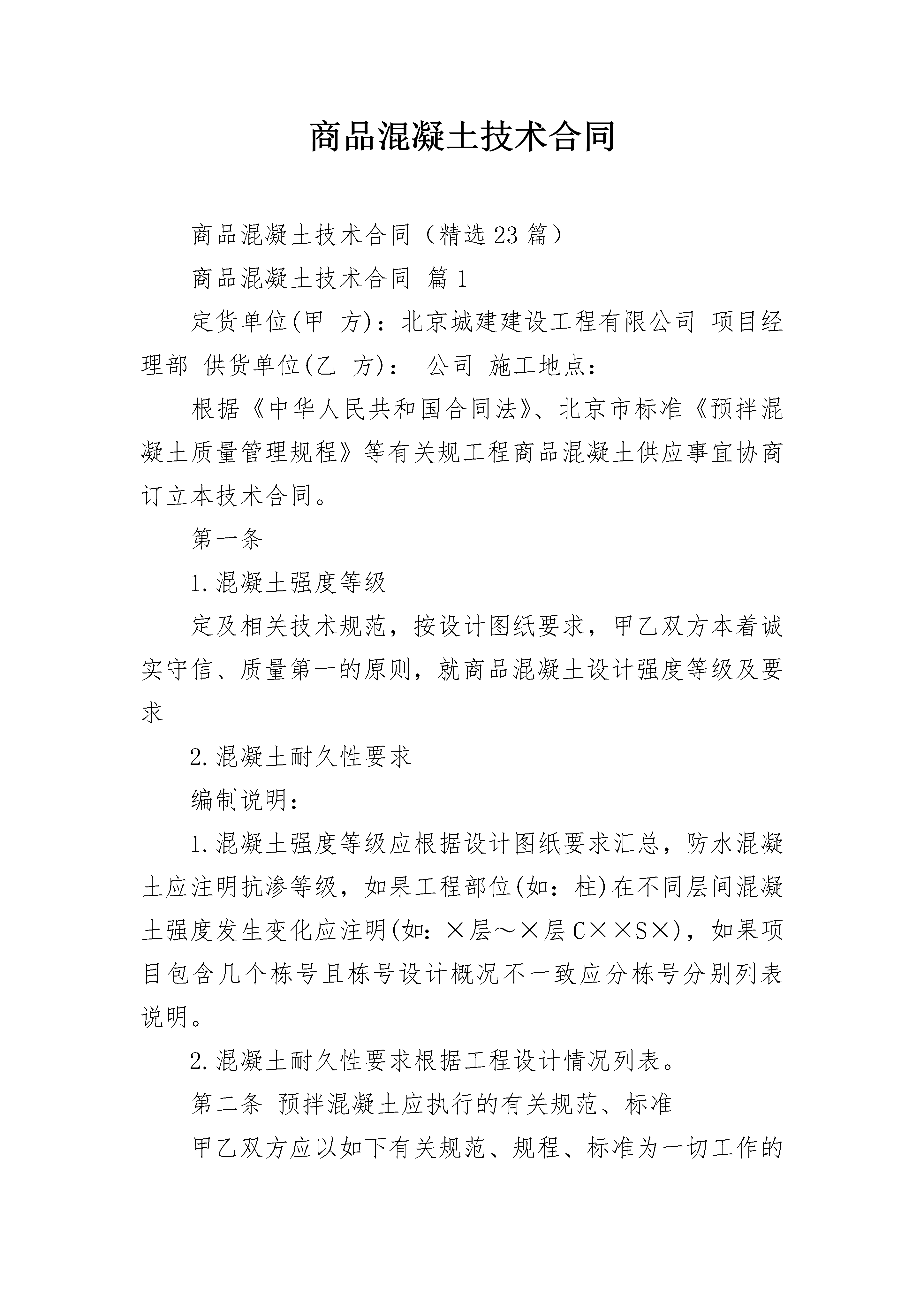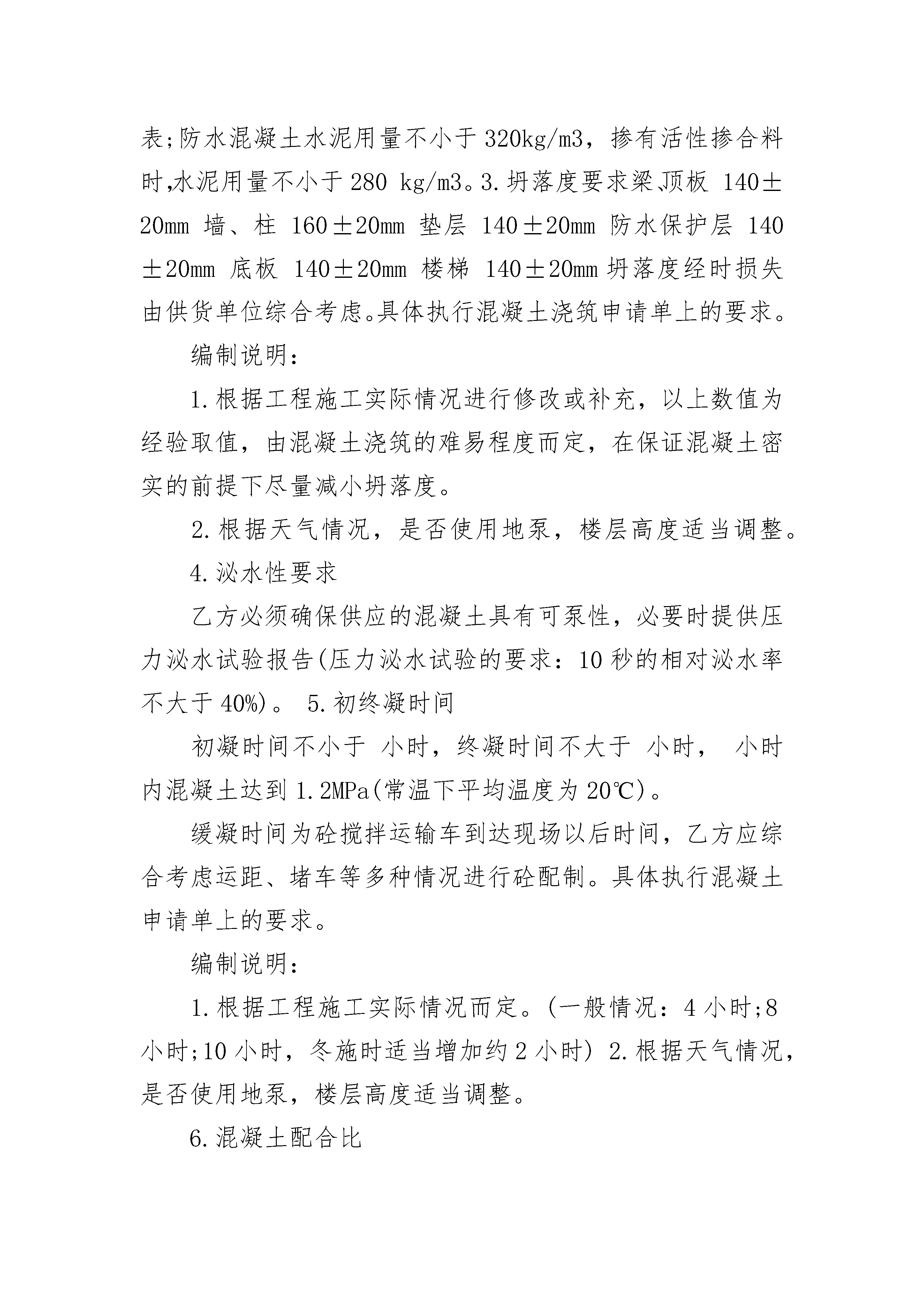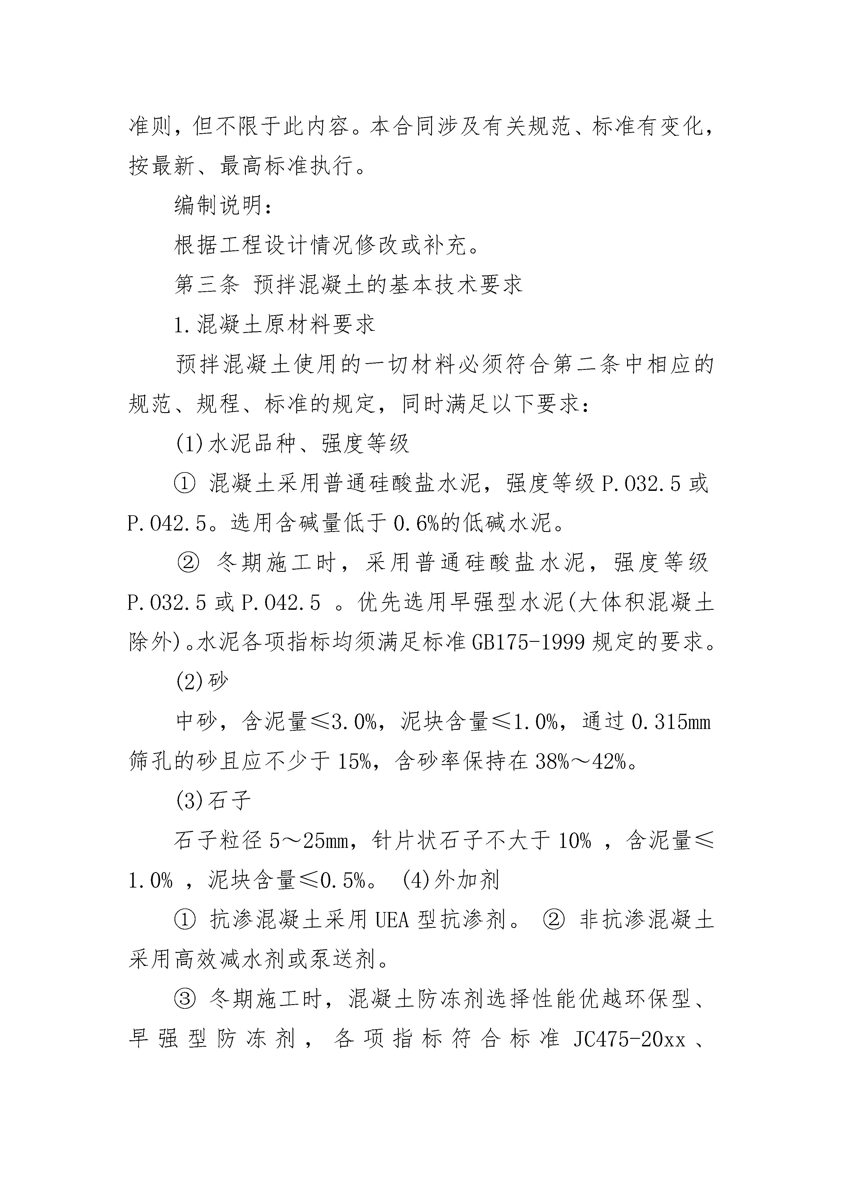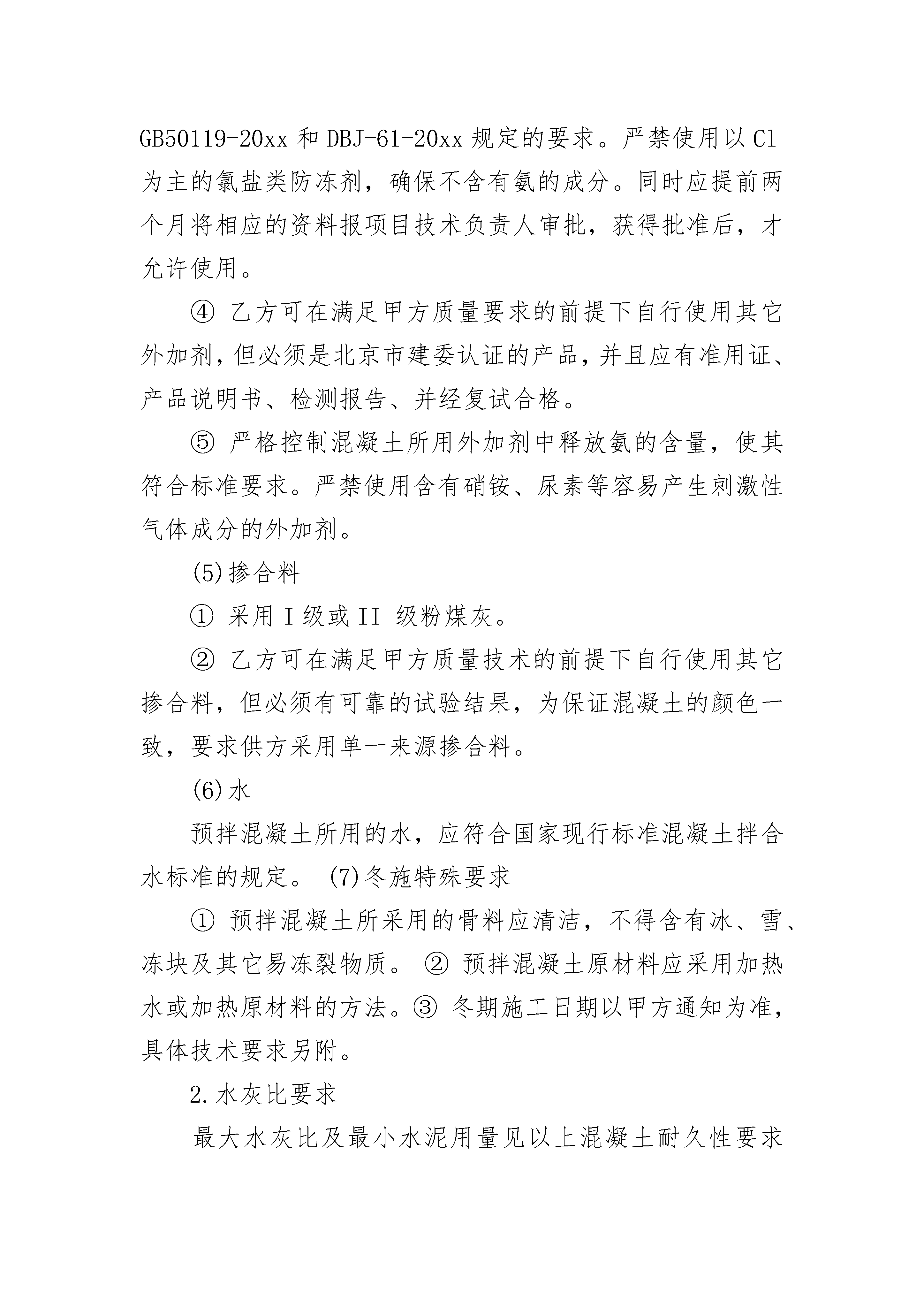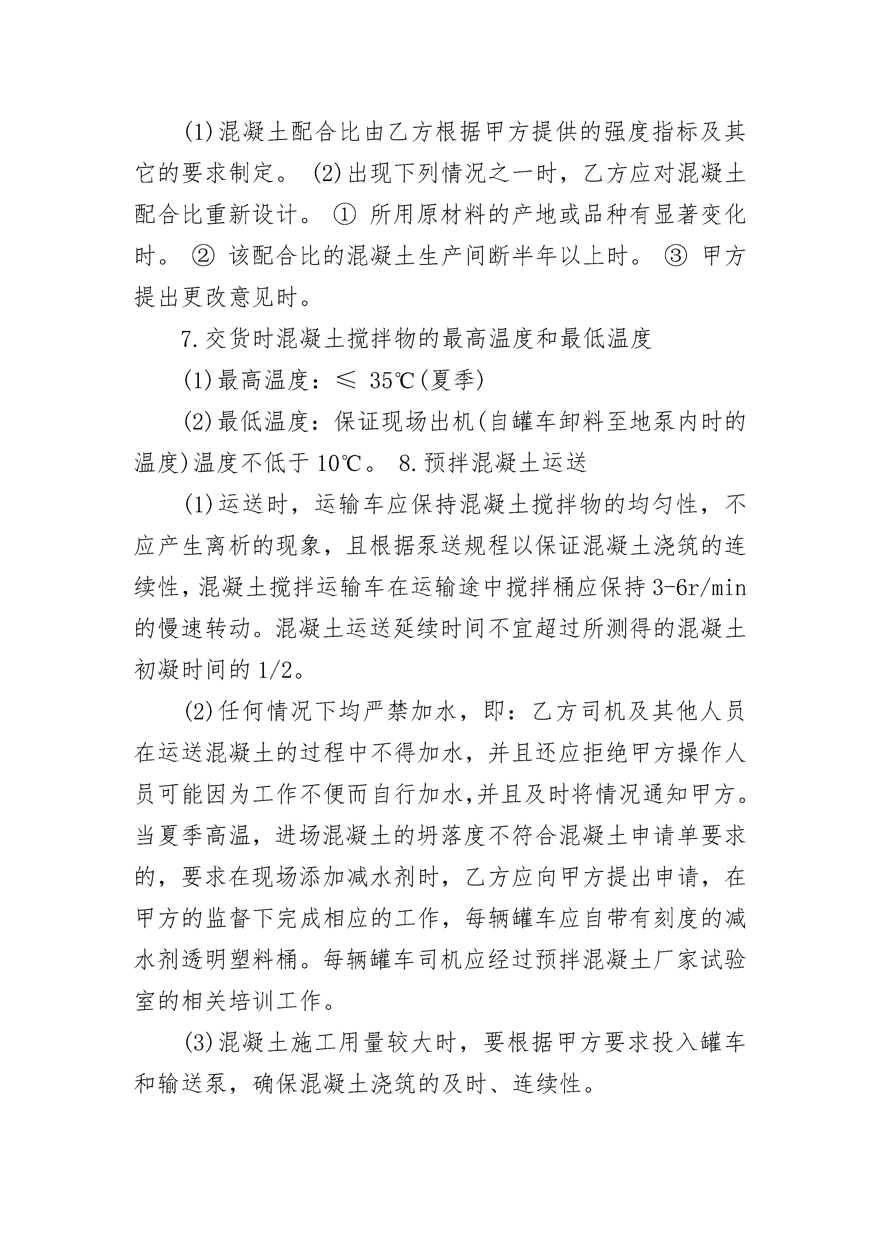 商品混凝土技术合同商品混凝土技术合同(精选23篇)商品混凝土技术合同篇1定货单位(甲方):北京城建建设工程有限公司项目经理部供货单位(乙方):公司施工地点:根据《中华人民共和国合同法》、北京市标准《预拌混凝土质量管理规程》等有关规工程商品混凝土供应事宜协商订立本技术合同。第一条1.混凝土强度等级定及相关技术规范,按设计图纸要求,甲乙双方本着诚实守信、质量第一的原则,就商品混凝土设计强度等级及要求2.混凝土耐久性要求编制说明:1.混凝土强度等级应根据设计图纸要求汇总,防水混凝土应注明抗渗等级,如果工程部位(如:柱)在不同层间混凝土强度发生变化应注明(如:×层~×层C××S×),如果项目包含几个栋号且栋号设计概况不一致应分栋号分别列表说明。2.混凝土耐久性要求根据工程设计情况列表。第二条预拌混凝土应执行的有关规范、标准甲乙双方应以如下有关规范、规程、标准为一切工作的准则,但不限于此内容。本合同涉及有关规范、标准有变化,按最新、最高标准执行。编制说明:根据工程设计情况修改或补充。第三条预拌混凝土的基本技术要求1.混凝土原材料要求预拌混凝土使用的一切材料必须符合第二条中相应的规范、规程、标准的规定,同时满足以下要求:(1)水泥品种、强度等级①混凝土采用普通硅酸盐水泥,强度等级P.O32.5或P.O42.5。选用含碱量低于0.6%的低碱水泥。②冬期施工时,采用普通硅酸盐水泥,强度等级P.O32.5或P.O42.5。优先选用早强型水泥(大体积混凝土除外)。水泥各项指标均须满足标准GB175-1999规定的要求。(2)砂中砂,含泥量≤3.0%,泥块含量≤1.0%,通过0.315mm筛孔的砂且应不少于15%,含砂率保持在38%~42%。(3)石子石子粒径5~25mm,针片状石子不大于10%,含泥量≤1.0%,泥块含量≤0.5%。(4)外加剂①抗渗混凝土采用UEA型抗渗剂。②非抗渗混凝土采用高效减水剂或泵送剂。③冬期施工时,混凝土防冻剂选择性能优越环保型、早强型防冻剂,各项指标符合标准JC475-20xx、GB50119-20xx和DBJ-61-20xx规定的要求。严禁使用以Cl为主的氯盐类防冻剂,确保不含有氨的成分。同时应提前两个月将相应的资料报项目技术负责人审批,获得批准后,才允许使用。④乙方可在满足甲方质量要求的前提下自行使用其它外加剂,但必须是北京市建委认证的产品,并且应有准用证、产品说明书、检测报告、并经复试合格。⑤严格控制混凝土所用外加剂中释放氨的含量,使其符合标准要求。严禁使用含有硝铵、尿素等容易产生刺激性气体成分的外加剂。(5)掺合料①采用I级或II级粉煤灰。②乙方可在满足甲方质量技术的前提下自行使用其它掺合料,但必须有可靠的试验结果,为保证混凝土的颜色一致,要求供方采用单一来源掺合料。(6)水预拌混凝土所用的水,应符合国家现行标准混凝土拌合水标准的规定。(7)冬施特殊要求①预拌混凝土所采用的骨料应清洁,不得含有冰、雪、冻块及其它易冻裂物质。②预拌混凝土原材料应采用加热水或加热原材料的方法。③冬期施工日期以甲方通知为准,具体技术要求另附。2.水灰比要求最大水灰比及最小水泥用量见以上混凝土耐久性要求表;防水混凝土水泥用量不小于320kg/m3,掺有活性掺合料时,水泥用量不小于280kg/m3。3.坍落度要求梁、顶板140±20mm墙、柱160±20mm垫层140±20mm防水保护层140±20mm底板140±20mm楼梯140±20mm坍落度经时损失由供货单位综合考虑。具体执行混凝土浇筑申请单上的要求。编制说明:1.根据工程施工实际情况进行修改或补充,以上数值为经验取值,由混凝土浇筑的难易程度而定,在保证混凝土密实的前提下尽量减小坍落度。2.根据天气情况,是否使用地泵,楼层高度适当调整。4.泌水性要求乙方必须确保供应的混凝土具有可泵性,必要时提供压力泌水试验报告(压力泌水试验的要求:10秒的相对泌水率不大于40%)。5.初终凝时间初凝时间不小于小时,终凝时间不大于小时,小时内混凝土达到1.2MPa(常温下平均温度为20℃)。缓凝时间为砼搅拌运输车到达现场以后时间,乙方应综合考虑运距、堵车等多种情况进行砼配制。具体执行混凝土申请单上的要求。编制说明:1.根据工程施工实际情况而定。(一般情况:4小时;8小时;10小时,冬施时适当增加约2小时)2.根据天气情况,是否使用地泵,楼层高度适当调整。6.混凝土配合比(1)混凝土配合比由乙方根据甲方提供的强度指标及其它的要求制定。(2)出现下列情况之一时,乙方应对混凝土配合比重新设计。①所用原材料的产地或品种有显著变化时。②该配合比的混凝土生产间断半年以上时。③甲方提出更改意见时。7.交货时混凝土搅拌物的最高温度和最低温度(1)最高温度:≤35℃(夏季)(2)最低温度:保证现场出机(自罐车卸