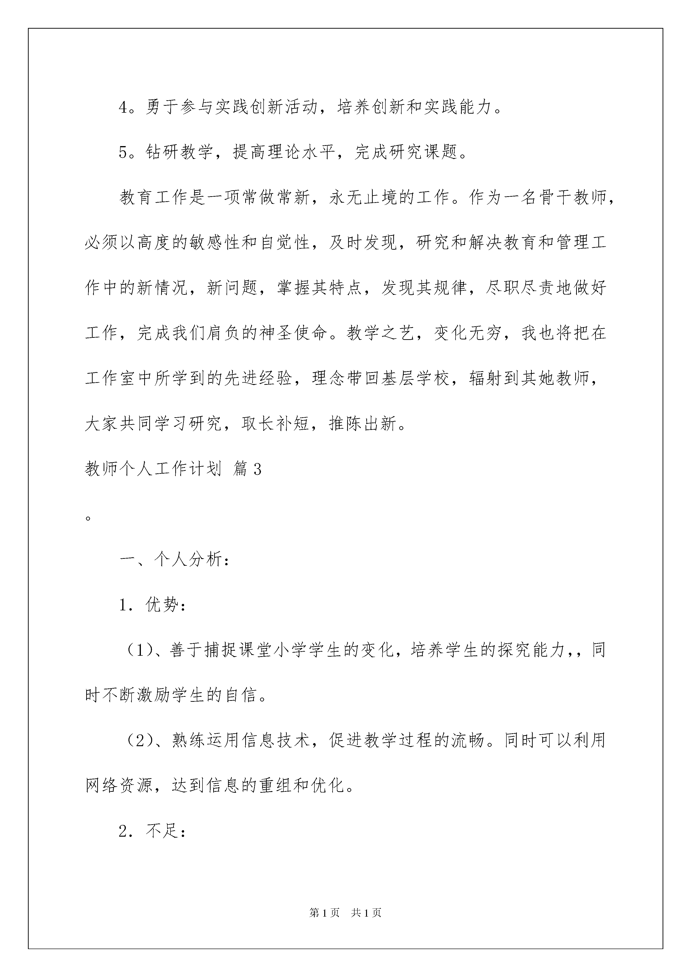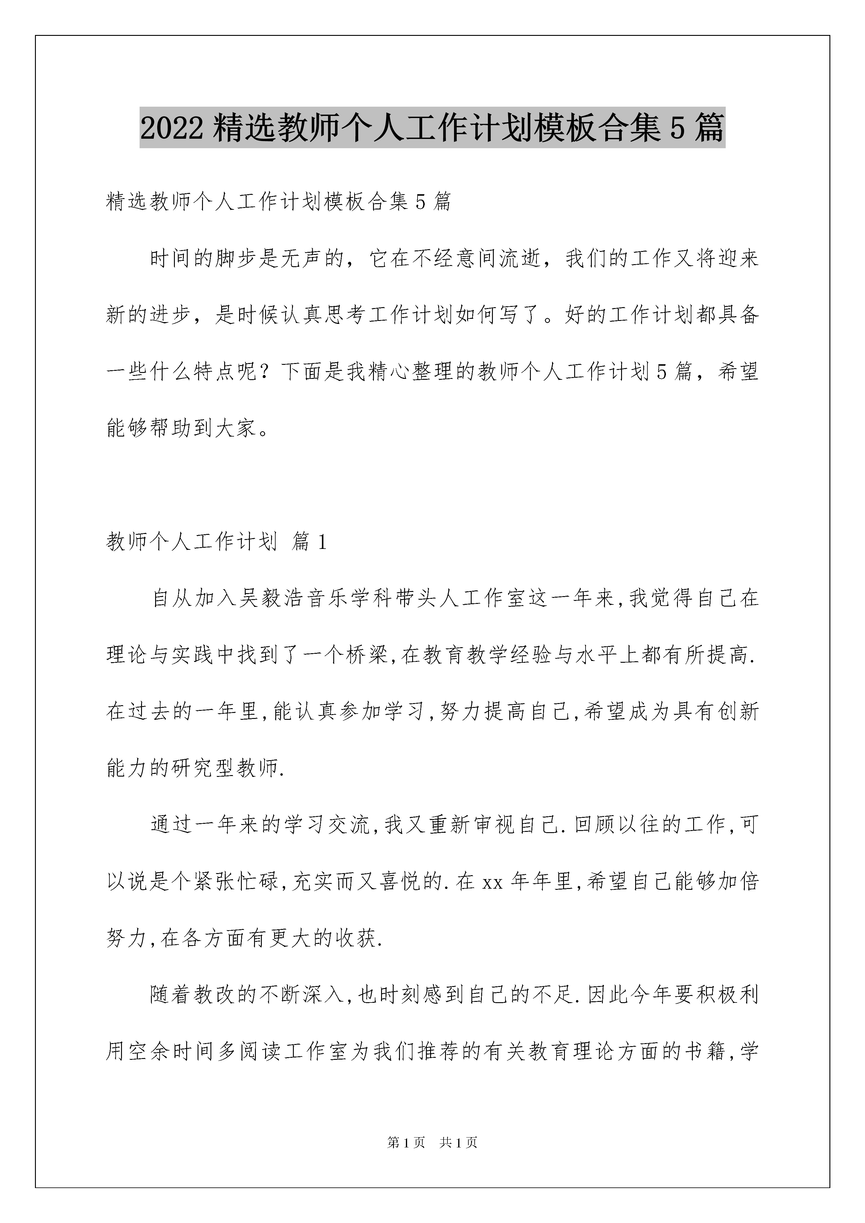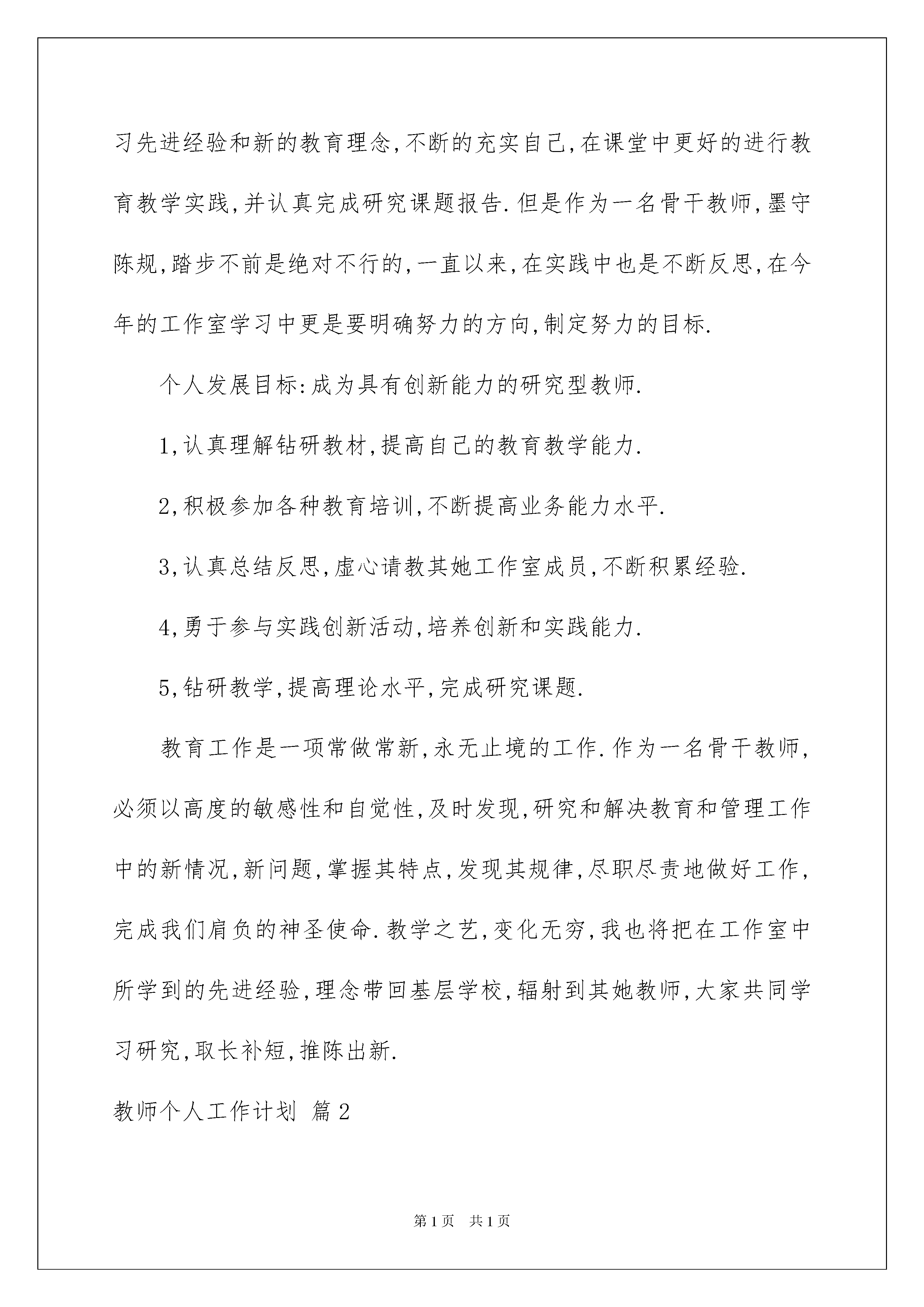2022精选教师个人工作计划模板合集5篇精选教师个人工作计划模板合集5篇时间的脚步是无声的,它在不经意间流逝,我们的工作又将迎来新的进步,是时候认真思考工作计划如何写了。好的工作计划都具备一些什么特点呢?下面是我精心整理的教师个人工作计划5篇,希望能够帮助到大家。教师个人工作计划篇1自从加入吴毅浩音乐学科带头人工作室这一年来,我觉得自己在理论与实践中找到了一个桥梁,在教育教学经验与水平上都有所提高.在过去的一年里,能认真参加学习,努力提高自己,希望成为具有创新能力的研究型教师.通过一年来的学习交流,我又重新审视自己.回顾以往的工作,可以说是个紧张忙碌,充实而又喜悦的.在xx年年里,希望自己能够加倍努力,在各方面有更大的收获.随着教改的不断深入,也时刻感到自己的不足.因此今年要积极利用空余时间多阅读工作室为我们推荐的有关教育理论方面的书籍,学习先进经验和新的教育理念,不断的充实自己,在课堂中更好的进行教育教学实践,并认真完成研究课题报告.但是作为一名骨干教师,墨守陈规,踏步不前是绝对不行的,一直以来,在实践中也是不断反思,在今年的工作室学习中更是要明确努力的方向,制定努力的目标.个人发展目标:成为具有创新能力的研究型教师.1,认真理解钻研教材,提高自己的教育教学能力.2,积极参加各种教育培训,不断提高业务能力水平.3,认真总结反思,虚心请教其她工作室成员,不断积累经验.4,勇于参与实践创新活动,培养创新和实践能力.5,钻研教学,提高理论水平,完成研究课题.教育工作是一项常做常新,永无止境的工作.作为一名骨干教师,必须以高度的敏感性和自觉性,及时发现,研究和解决教育和管理工作中的新情况,新问题,掌握其特点,发现其规律,尽职尽责地做好工作,完成我们肩负的神圣使命.教学之艺,变化无穷,我也将把在工作室中所学到的先进经验,理念带回基层学校,辐射到其她教师,大家共同学习研究,取长补短,推陈出新.教师个人工作计划篇2自从加入吴毅浩音乐学科带头人工作室这一年来,我觉得自己在理论与实践中找到了一个桥梁,在教育教学经验与水平上都有所提高。在过去的一年里,能认真参加学习,努力提高自己,希望成为具有创新能力的研究型教师。通过一年来的学习交流,我又重新审视自己。回顾以往的工作,可以说是个紧张忙碌,充实而又喜悦的。在XX年年里,希望自己能够加倍努力,在各方面有更大的收获。随着教改的不断深入,也时刻感到自己的不足。因此今年要积极利用空余时间多阅读工作室为我们推荐的有关教育理论方面的书籍,学习先进经验和新的教育理念,不断的充实自己,在课堂中更好的进行教育教学实践,并认真完成研究课题报告。但是作为一名骨干教师,墨守陈规,踏步不前是绝对不行的,一直以来,在实践中也是不断反思,在今年的工作室学习中更是要明确努力的方向,制定努力的目标。个人发展目标:成为具有创新能力的研究型教师。1。认真理解钻研教材,提高自己的教育教学能力。2。积极参加各种教育培训,不断提高业务能力水平。3。认真总结反思,虚心请教其她工作室成员,不断积累经验。4。勇于参与实践创新活动,培养创新和实践能力。5。钻研教学,提高理论水平,完成研究课题。教育工作是一项常做常新,永无止境的工作。作为一名骨干教师,必须以高度的敏感性和自觉性,及时发现,研究和解决教育和管理工作中的新情况,新问题,掌握其特点,发现其规律,尽职尽责地做好工作,完成我们肩负的神圣使命。教学之艺,变化无穷,我也将把在工作室中所学到的先进经验,理念带回基层学校,辐射到其她教师,大家共同学习研究,取长补短,推陈出新。教师个人工作计划篇3。一、个人分析:1.优势:(1)、善于捕捉课堂小学学生的变化,培养学生的探究能力,,同时不断激励学生的自信。(2)、熟练运用信息技术,促进教学过程的流畅。同时可以利用网络资源,达到信息的重组和优化。2.不足:(1)语文教师专业素养不够。(2)、在面向每一个学生方面做得不够,在教学中没有兼顾到所有学生的积极性。二、目标及措施:发展目标:树立终身学习的思想,多读书、不断学习先进的教育教学理论、紧跟教育发展的新形势,用先进的思想和理念武装自己,做思想型教师,积极学习关于自己专业的教学理论知识,并能运用在自己的教学中,及时进行反思及重构。多读多思,坚持写教学随笔,提高自己的理论层次1、多读书,提升自己的生命质量,做一个高雅的人。读书是一种至关重要的途径,所以我在本学期要坚持读有关教育的书籍。同时,教师的师德魅力也是以其深厚的文化为底蕴的。唯有如此,教师才能完成其教书育人的神圣使命,把"学习与思考"真正成为自己的一个习惯。2、虚心请教,取人之长,补己之短。要积极向