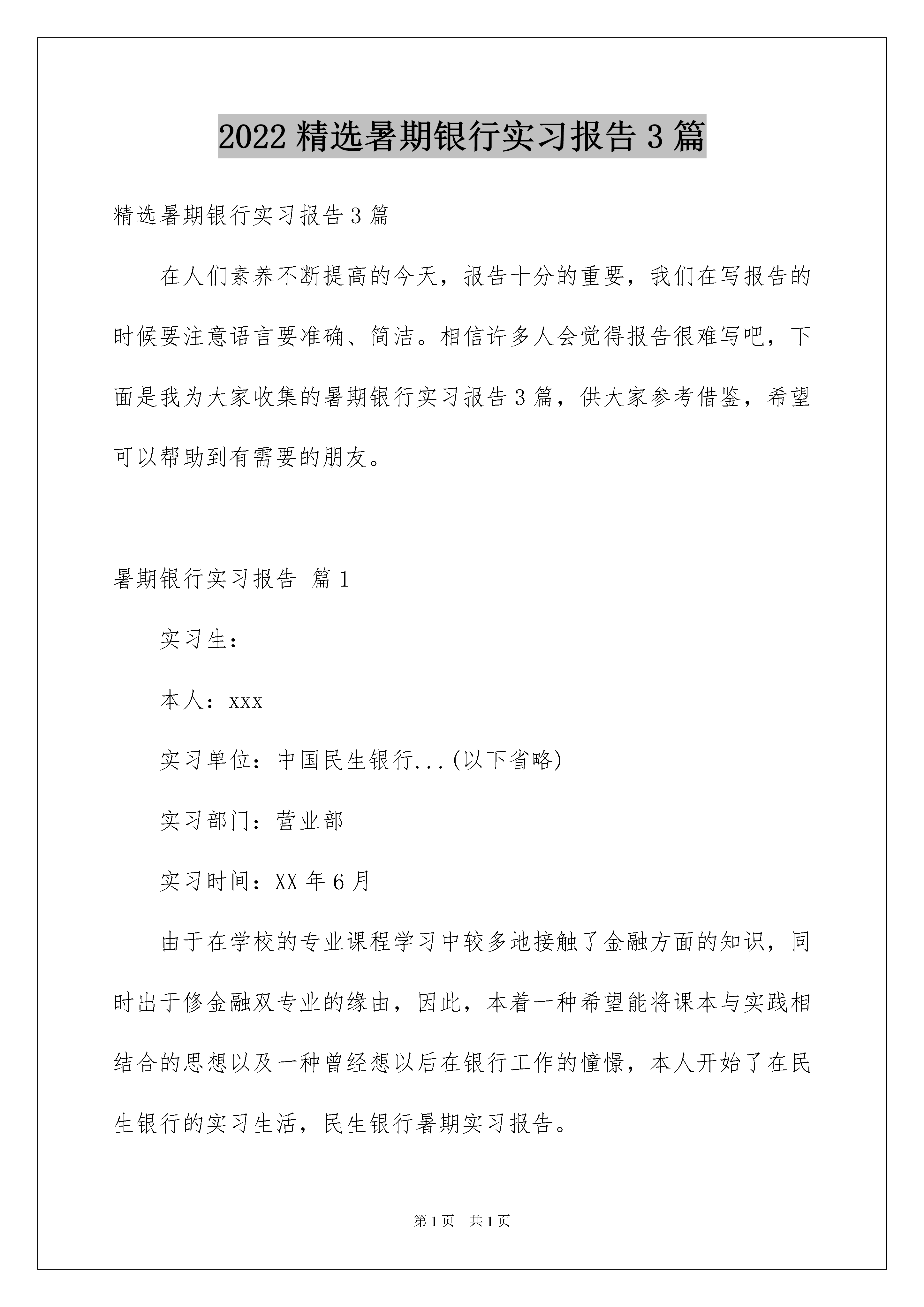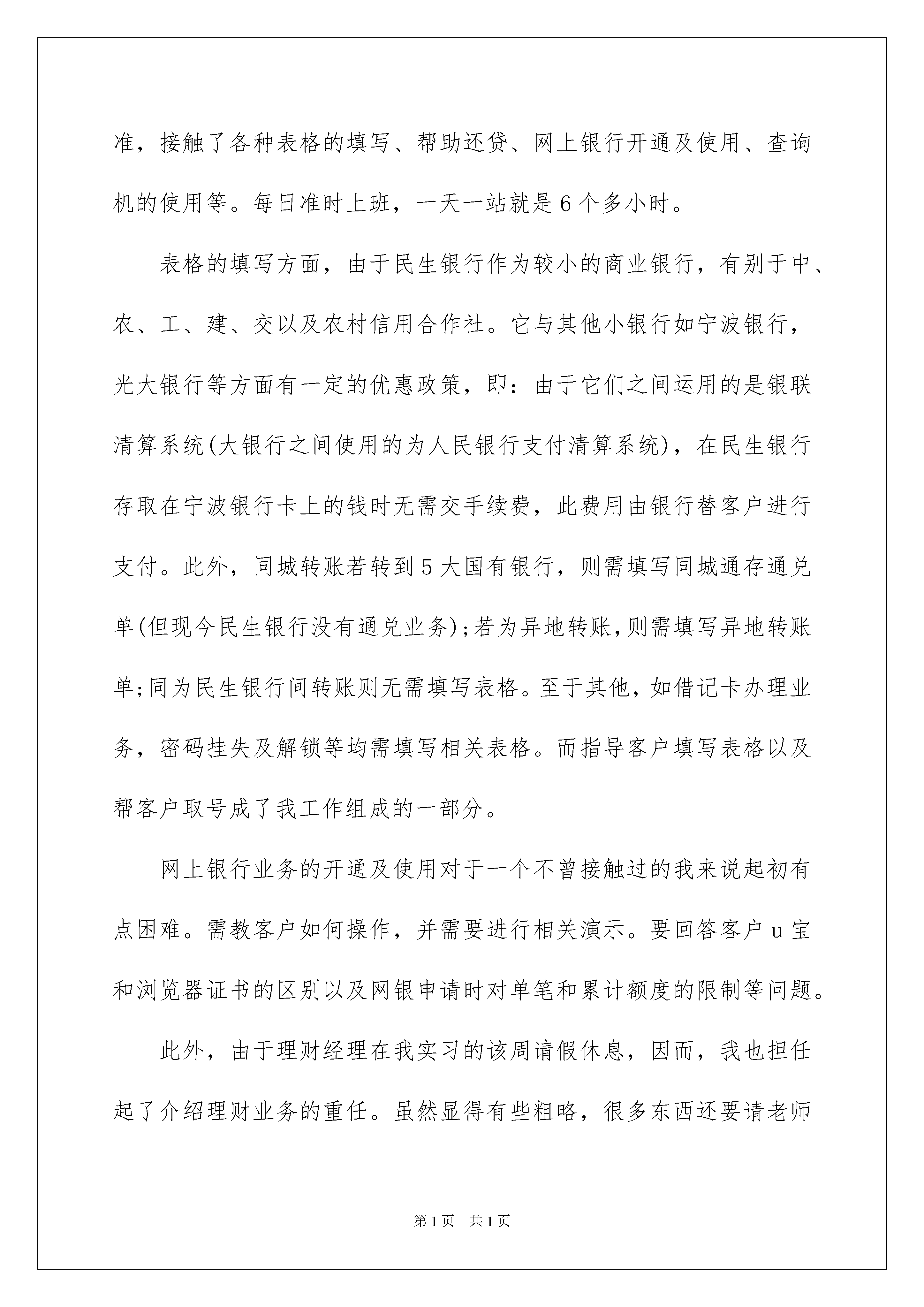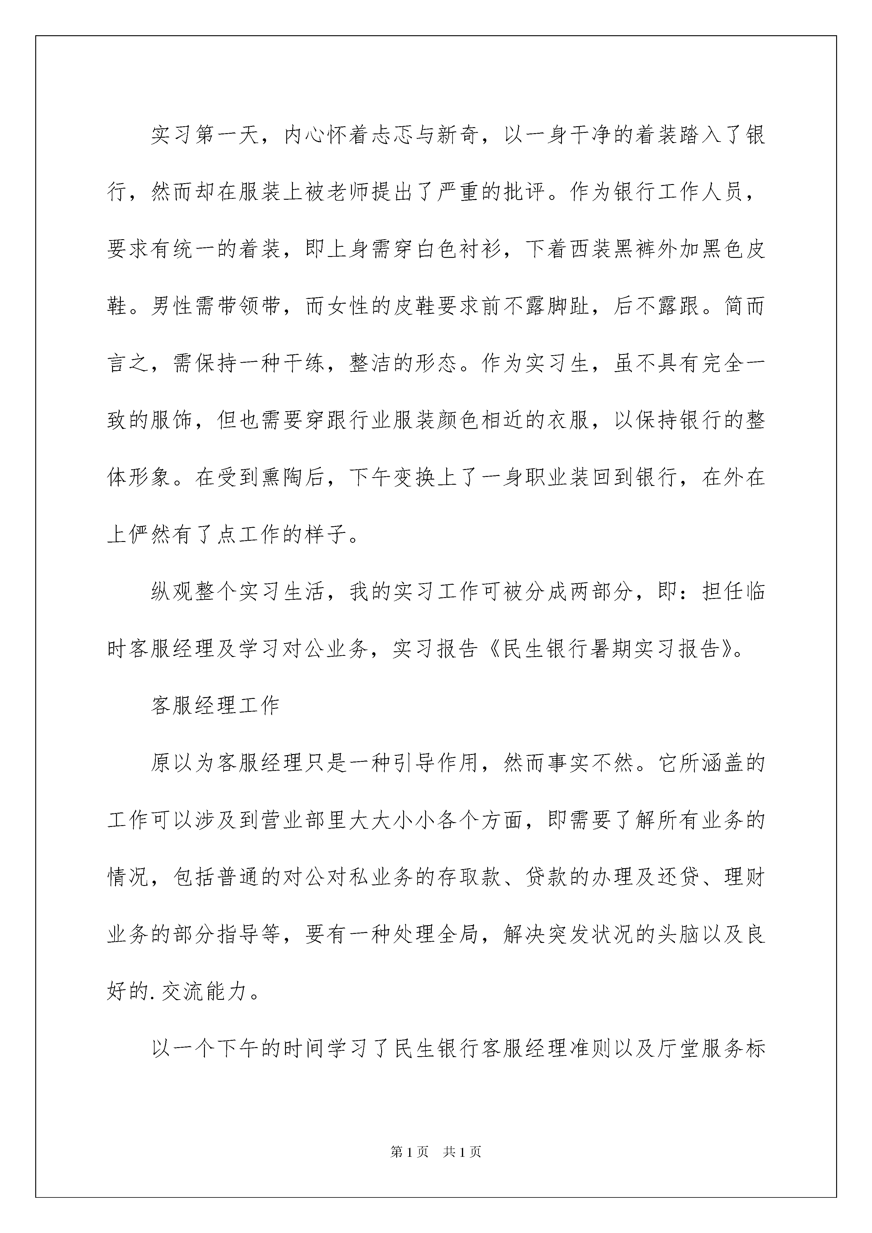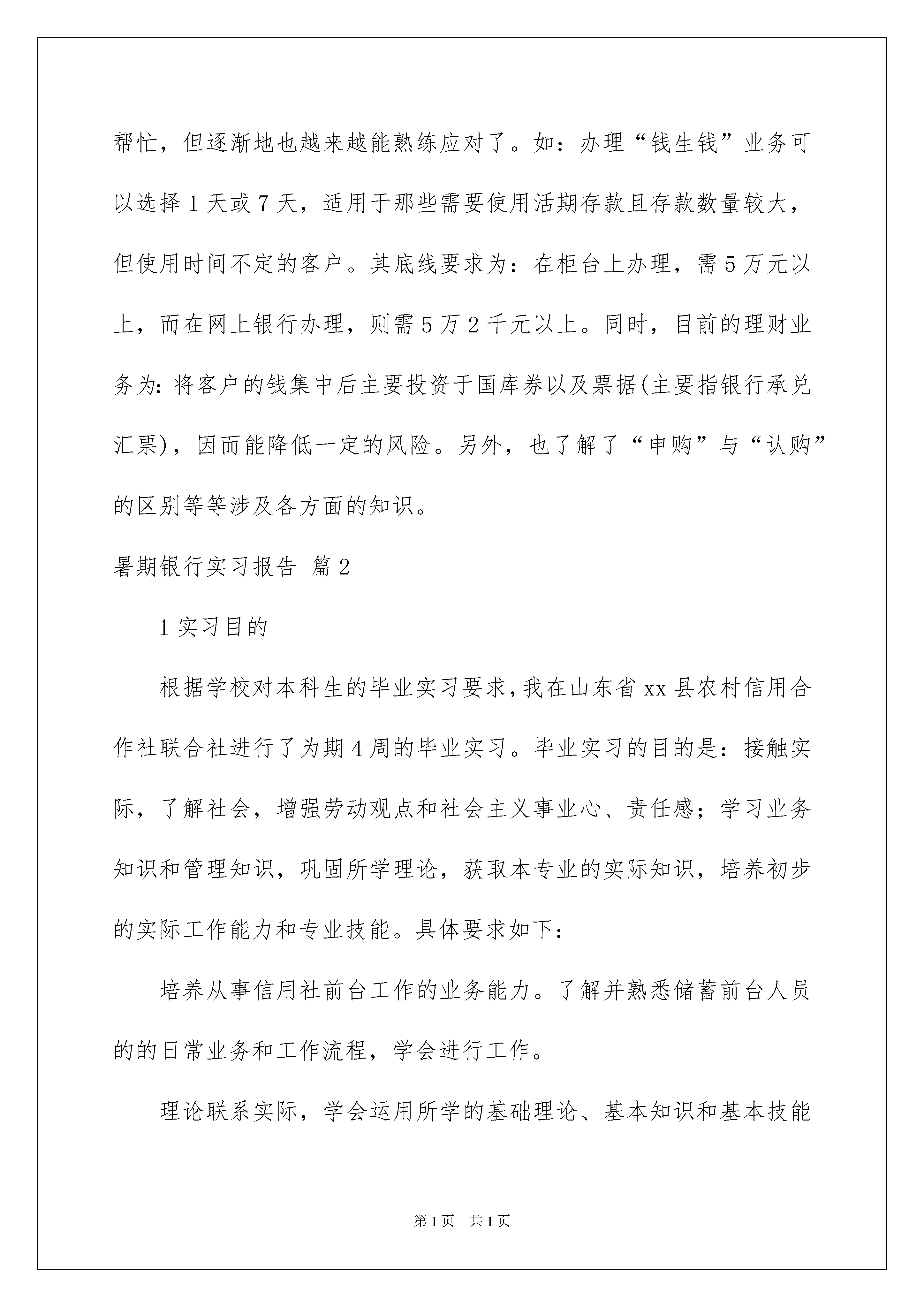 2022精选暑期银行实习报告3篇精选暑期银行实习报告3篇在人们素养不断提高的今天,报告十分的重要,我们在写报告的时候要注意语言要准确、简洁。相信许多人会觉得报告很难写吧,下面是我为大家收集的暑期银行实习报告3篇,供大家参考借鉴,希望可以帮助到有需要的朋友。暑期银行实习报告篇1实习生:本人:xxx实习单位:中国民生银行...(以下省略)实习部门:营业部实习时间:XX年6月由于在学校的专业课程学习中较多地接触了金融方面的知识,同时出于修金融双专业的缘由,因此,本着一种希望能将课本与实践相结合的思想以及一种曾经想以后在银行工作的憧憬,本人开始了在民生银行的实习生活,民生银行暑期实习报告。实习第一天,内心怀着忐忑与新奇,以一身干净的着装踏入了银行,然而却在服装上被老师提出了严重的批评。作为银行工作人员,要求有统一的着装,即上身需穿白色衬衫,下着西装黑裤外加黑色皮鞋。男性需带领带,而女性的皮鞋要求前不露脚趾,后不露跟。简而言之,需保持一种干练,整洁的形态。作为实习生,虽不具有完全一致的服饰,但也需要穿跟行业服装颜色相近的衣服,以保持银行的整体形象。在受到熏陶后,下午变换上了一身职业装回到银行,在外在上俨然有了点工作的样子。纵观整个实习生活,我的实习工作可被分成两部分,即:担任临时客服经理及学习对公业务,实习报告《民生银行暑期实习报告》。客服经理工作原以为客服经理只是一种引导作用,然而事实不然。它所涵盖的工作可以涉及到营业部里大大小小各个方面,即需要了解所有业务的情况,包括普通的对公对私业务的存取款、贷款的办理及还贷、理财业务的部分指导等,要有一种处理全局,解决突发状况的头脑以及良好的.交流能力。以一个下午的时间学习了民生银行客服经理准则以及厅堂服务标准,接触了各种表格的填写、帮助还贷、网上银行开通及使用、查询机的使用等。每日准时上班,一天一站就是6个多小时。表格的填写方面,由于民生银行作为较小的商业银行,有别于中、农、工、建、交以及农村信用合作社。它与其他小银行如宁波银行,光大银行等方面有一定的优惠政策,即:由于它们之间运用的是银联清算系统(大银行之间使用的为人民银行支付清算系统),在民生银行存取在宁波银行卡上的钱时无需交手续费,此费用由银行替客户进行支付。此外,同城转账若转到5大国有银行,则需填写同城通存通兑单(但现今民生银行没有通兑业务);若为异地转账,则需填写异地转账单;同为民生银行间转账则无需填写表格。至于其他,如借记卡办理业务,密码挂失及解锁等均需填写相关表格。而指导客户填写表格以及帮客户取号成了我工作组成的一部分。网上银行业务的开通及使用对于一个不曾接触过的我来说起初有点困难。需教客户如何操作,并需要进行相关演示。要回答客户u宝和浏览器证书的区别以及网银申请时对单笔和累计额度的限制等问题。此外,由于理财经理在我实习的该周请假休息,因而,我也担任起了介绍理财业务的重任。虽然显得有些粗略,很多东西还要请老师帮忙,但逐渐地也越来越能熟练应对了。如:办理“钱生钱”业务可以选择1天或7天,适用于那些需要使用活期存款且存款数量较大,但使用时间不定的客户。其底线要求为:在柜台上办理,需5万元以上,而在网上银行办理,则需5万2千元以上。同时,目前的理财业务为:将客户的钱集中后主要投资于国库券以及票据(主要指银行承兑汇票),因而能降低一定的风险。另外,也了解了“申购”与“认购”的区别等等涉及各方面的知识。暑期银行实习报告篇21实习目的根据学校对本科生的毕业实习要求,我在山东省xx县农村信用合作社联合社进行了为期4周的毕业实习。毕业实习的目的是:接触实际,了解社会,增强劳动观点和社会主义事业心、责任感;学习业务知识和管理知识,巩固所学理论,获取本专业的实际知识,培养初步的实际工作能力和专业技能。具体要求如下:培养从事信用社前台工作的业务能力。了解并熟悉储蓄前台人员的的日常业务和工作流程,学会进行工作。理论联系实际,学会运用所学的基础理论、基本知识和基本技能去参与到具体的前台工作中。培养艰苦创业精神和社会责任感,形成热爱专业、热爱劳动的良好品德。预演和准备就业。找出自身状况与社会实际需要的差距,并在以后的学习期间及时补充相关知识,为求职与正式工作做好充分的知识、能力准备。x实习时间我于x0xx年x月1号到3月1号在山东省xx农村信用合作社联合社进行了为期4周实习。3实习单位3.1单位地址与规模山东省xx农村信用合作社联合社位于沂水镇南环路,法人高传发,电话xxx-xxxxxx。xx农村信用社拥有x58名信合员工,辖1x个信用社、1个营业部、73名客户经理,345个协贷站。x.实习单位主要业务