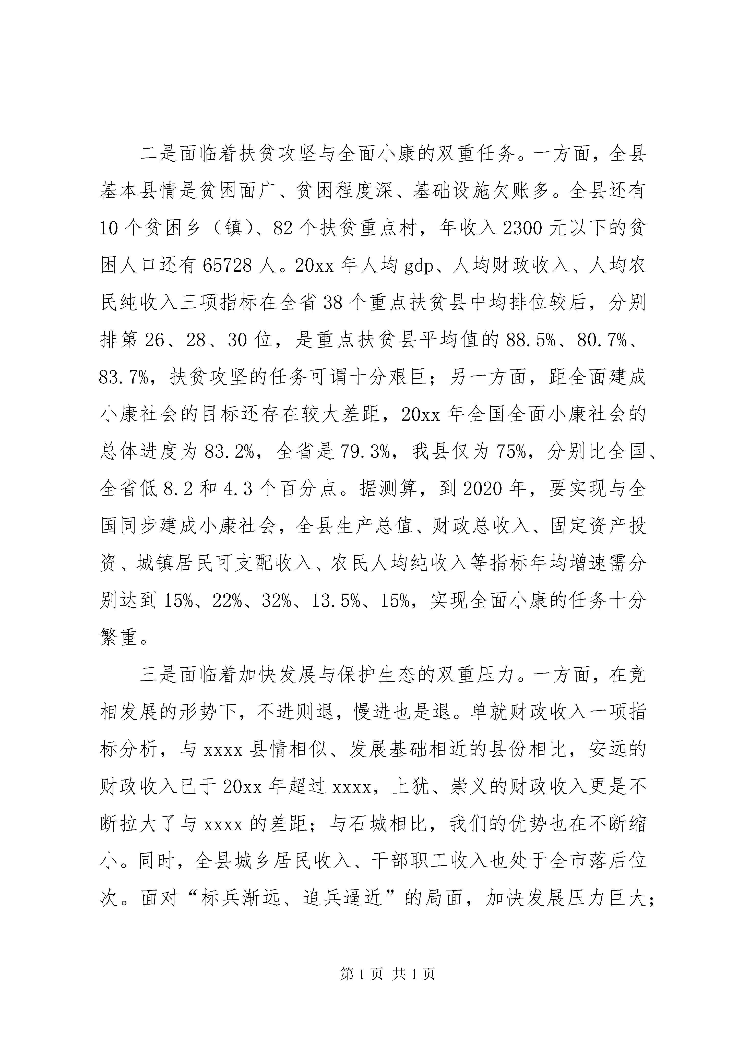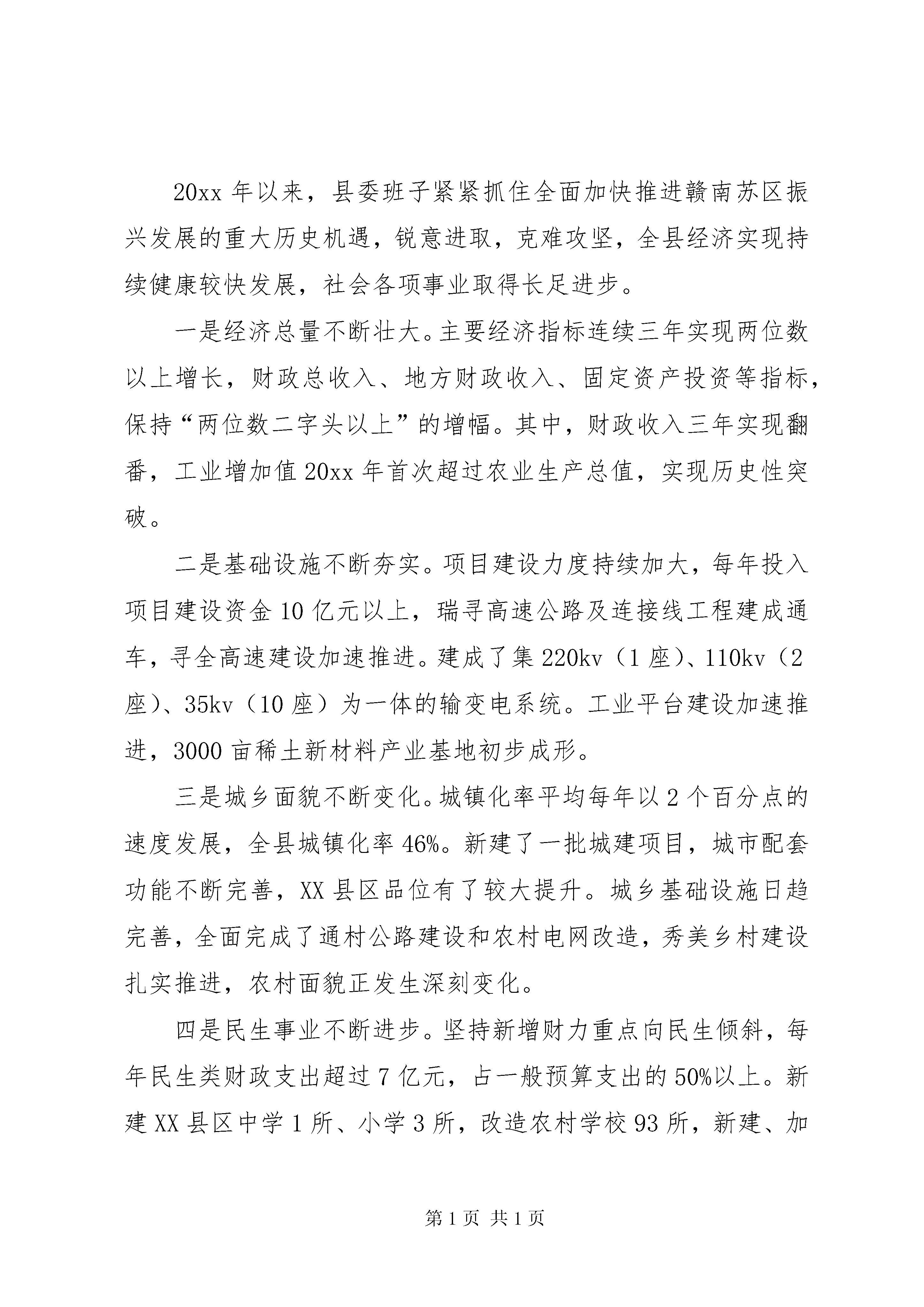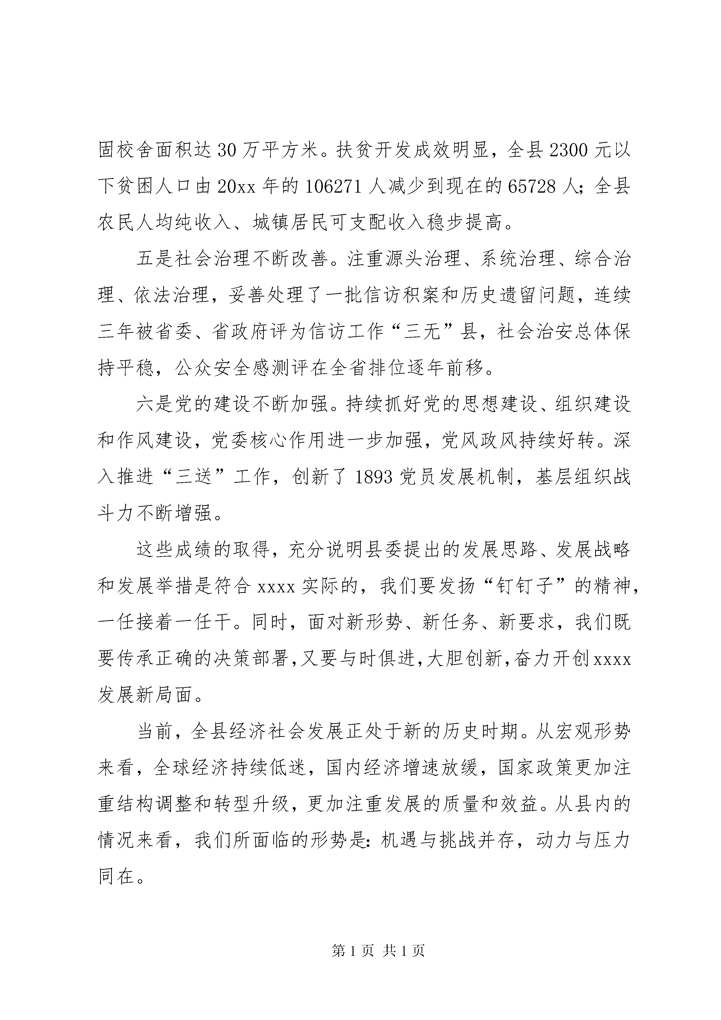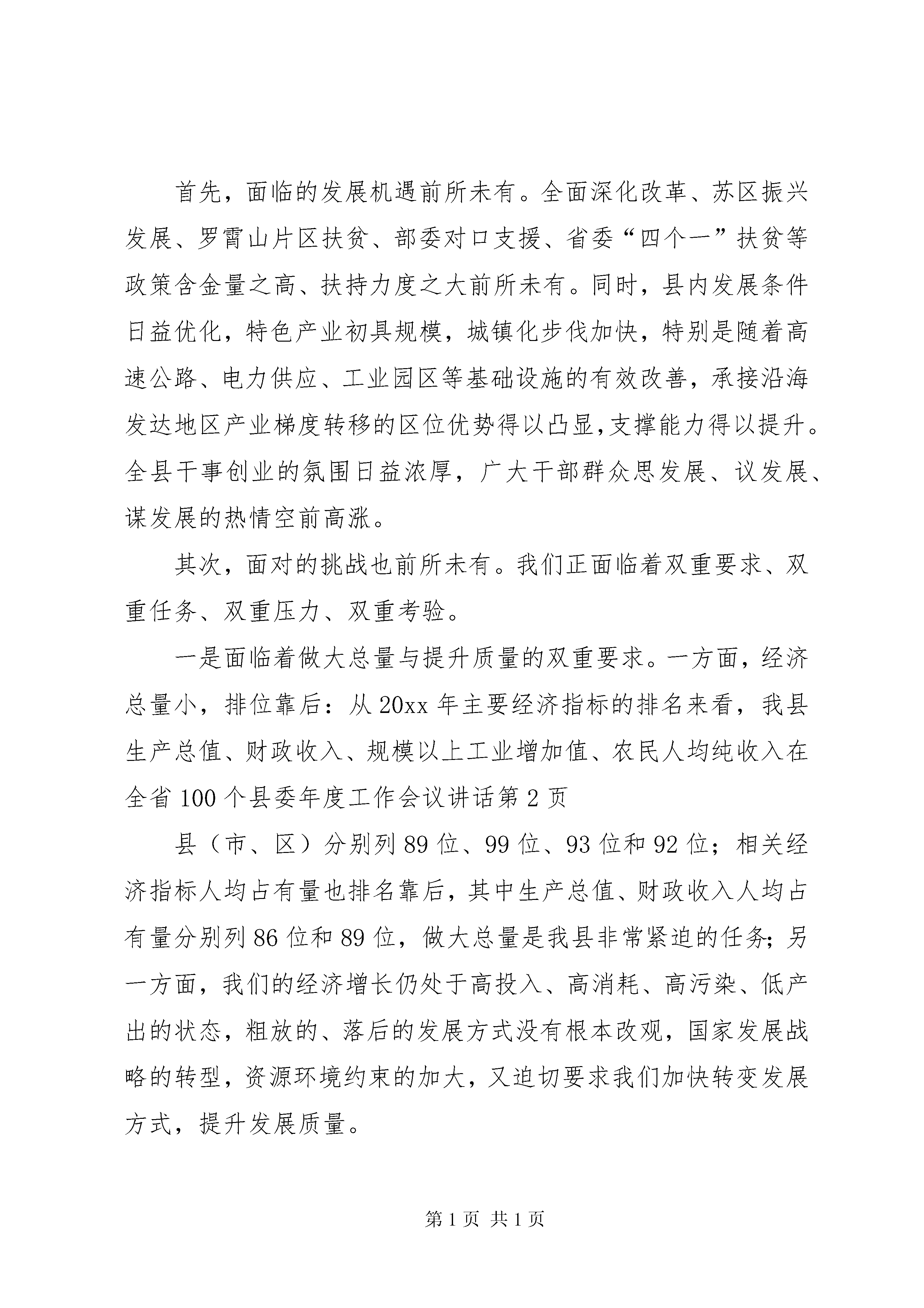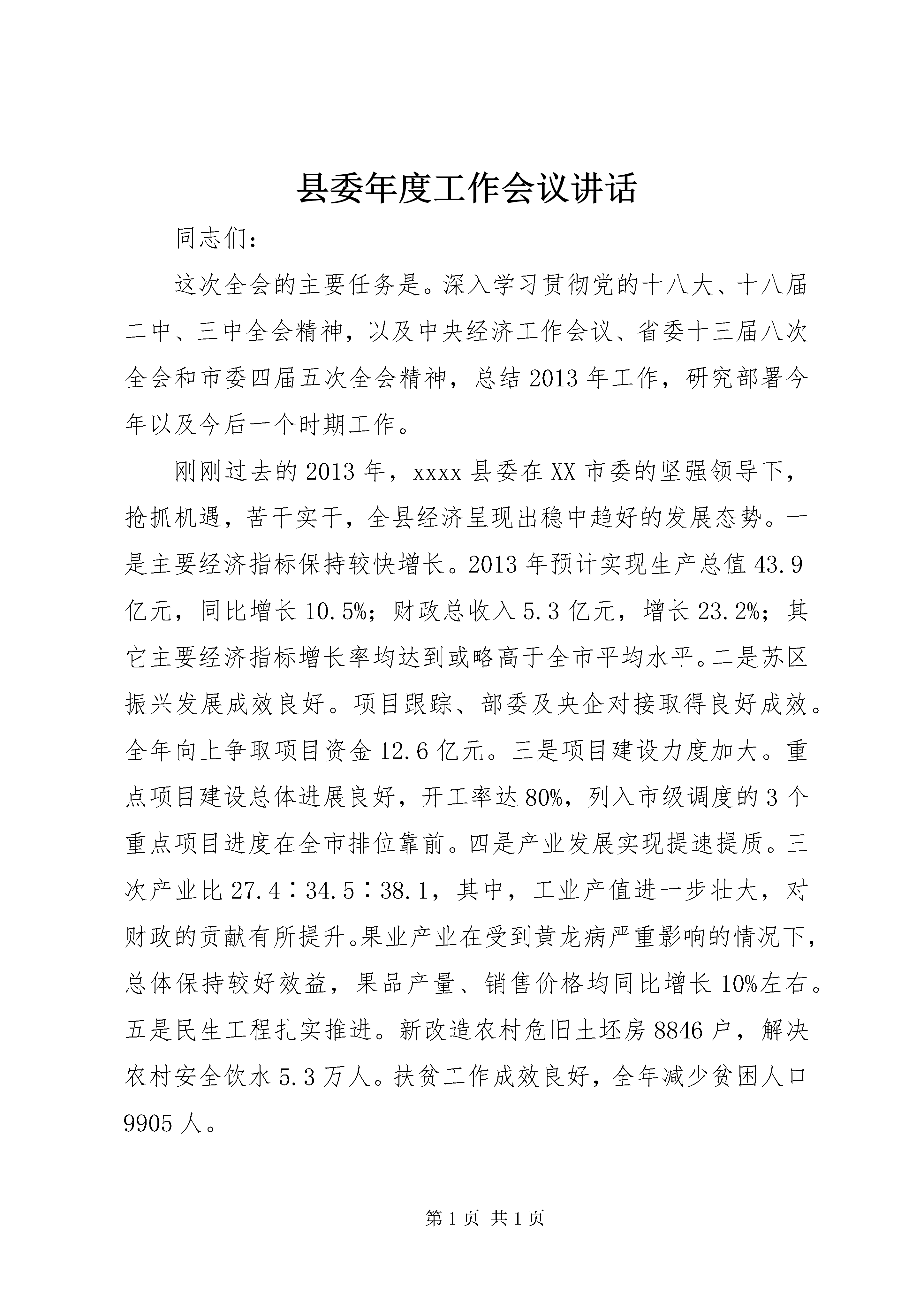 县委年度工作会议讲话同志们:这次全会的主要任务是。深入学习贯彻党的十八大、十八届二中、三中全会精神,以及中央经济工作会议、省委十三届八次全会和市委四届五次全会精神,总结2013年工作,研究部署今年以及今后一个时期工作。刚刚过去的2013年,xxxx县委在XX市委的坚强领导下,抢抓机遇,苦干实干,全县经济呈现出稳中趋好的发展态势。一是主要经济指标保持较快增长。2013年预计实现生产总值43.9亿元,同比增长10.5%;财政总收入5.3亿元,增长23.2%;其它主要经济指标增长率均达到或略高于全市平均水平。二是苏区振兴发展成效良好。项目跟踪、部委及央企对接取得良好成效。全年向上争取项目资金12.6亿元。三是项目建设力度加大。重点项目建设总体进展良好,开工率达80%,列入市级调度的3个重点项目进度在全市排位靠前。四是产业发展实现提速提质。三次产业比27.4∶34.5∶38.1,其中,工业产值进一步壮大,对财政的贡献有所提升。果业产业在受到黄龙病严重影响的情况下,总体保持较好效益,果品产量、销售价格均同比增长10%左右。五是民生工程扎实推进。新改造农村危旧土坯房8846户,解决农村安全饮水5.3万人。扶贫工作成效良好,全年减少贫困人口9905人。20xx年以来,县委班子紧紧抓住全面加快推进赣南苏区振兴发展的重大历史机遇,锐意进取,克难攻坚,全县经济实现持续健康较快发展,社会各项事业取得长足进步。一是经济总量不断壮大。主要经济指标连续三年实现两位数以上增长,财政总收入、地方财政收入、固定资产投资等指标,保持“两位数二字头以上”的增幅。其中,财政收入三年实现翻番,工业增加值20xx年首次超过农业生产总值,实现历史性突破。二是基础设施不断夯实。项目建设力度持续加大,每年投入项目建设资金10亿元以上,瑞寻高速公路及连接线工程建成通车,寻全高速建设加速推进。建成了集220kv(1座)、110kv(2座)、35kv(10座)为一体的输变电系统。工业平台建设加速推进,3000亩稀土新材料产业基地初步成形。三是城乡面貌不断变化。城镇化率平均每年以2个百分点的速度发展,全县城镇化率46%。新建了一批城建项目,城市配套功能不断完善,XX县区品位有了较大提升。城乡基础设施日趋完善,全面完成了通村公路建设和农村电网改造,秀美乡村建设扎实推进,农村面貌正发生深刻变化。四是民生事业不断进步。坚持新增财力重点向民生倾斜,每年民生类财政支出超过7亿元,占一般预算支出的50%以上。新建XX县区中学1所、小学3所,改造农村学校93所,新建、加固校舍面积达30万平方米。扶贫开发成效明显,全县2300元以下贫困人口由20xx年的106271人减少到现在的65728人;全县农民人均纯收入、城镇居民可支配收入稳步提高。五是社会治理不断改善。注重源头治理、系统治理、综合治理、依法治理,妥善处理了一批信访积案和历史遗留问题,连续三年被省委、省政府评为信访工作“三无”县,社会治安总体保持平稳,公众安全感测评在全省排位逐年前移。六是党的建设不断加强。持续抓好党的思想建设、组织建设和作风建设,党委核心作用进一步加强,党风政风持续好转。深入推进“三送”工作,创新了1893党员发展机制,基层组织战斗力不断增强。这些成绩的取得,充分说明县委提出的发展思路、发展战略和发展举措是符合xxxx实际的,我们要发扬“钉钉子”的精神,一任接着一任干。同时,面对新形势、新任务、新要求,我们既要传承正确的决策部署,又要与时俱进,大胆创新,奋力开创xxxx发展新局面。当前,全县经济社会发展正处于新的历史时期。从宏观形势来看,全球经济持续低迷,国内经济增速放缓,国家政策更加注重结构调整和转型升级,更加注重发展的质量和效益。从县内的情况来看,我们所面临的形势是:机遇与挑战并存,动力与压力同在。首先,面临的发展机遇前所未有。全面深化改革、苏区振兴发展、罗霄山片区扶贫、部委对口支援、省委“四个一”扶贫等政策含金量之高、扶持力度之大前所未有。同时,县内发展条件日益优化,特色产业初具规模,城镇化步伐加快,特别是随着高速公路、电力供应、工业园区等基础设施的有效改善,承接沿海发达地区产业梯度转移的区位优势得以凸显,支撑能力得以提升。全县干事创业的氛围日益浓厚,广大干部群众思发展、议发展、谋发展的热情空前高涨。其次,面对的挑战也前所未有。我们正面临着双重要求、双重任务、双重压力、双重考验。一是面临着做大总量与提升质量的双重要求。一方面,经济总量小,排位靠后:从20xx年主要经济指标的排名来看,我县生产总值、财政收入、规模以上工业增加值、农民人均纯收入在全省100个县委年度工作会议讲话县(市、区)分别列89位、99位、93位和92位;相关经济指标人均占有量也排名靠后,其中生产总值、财政收入人均占有量
