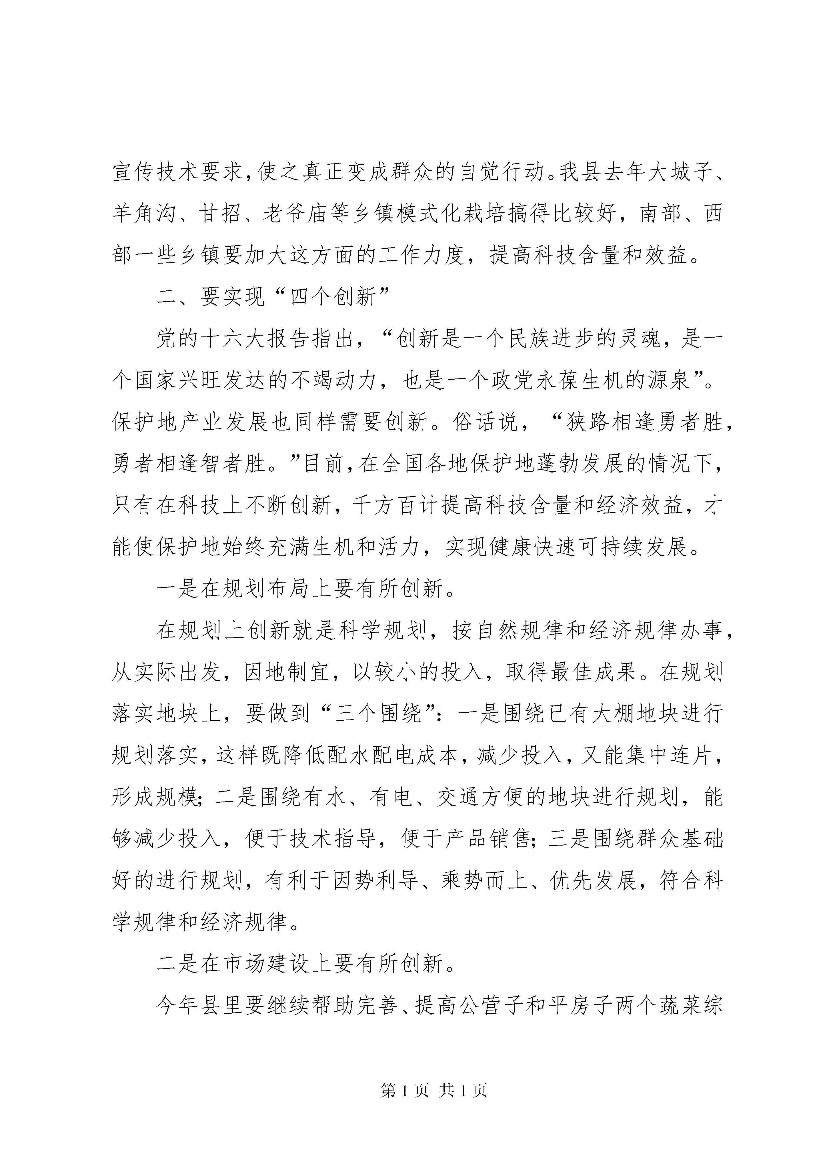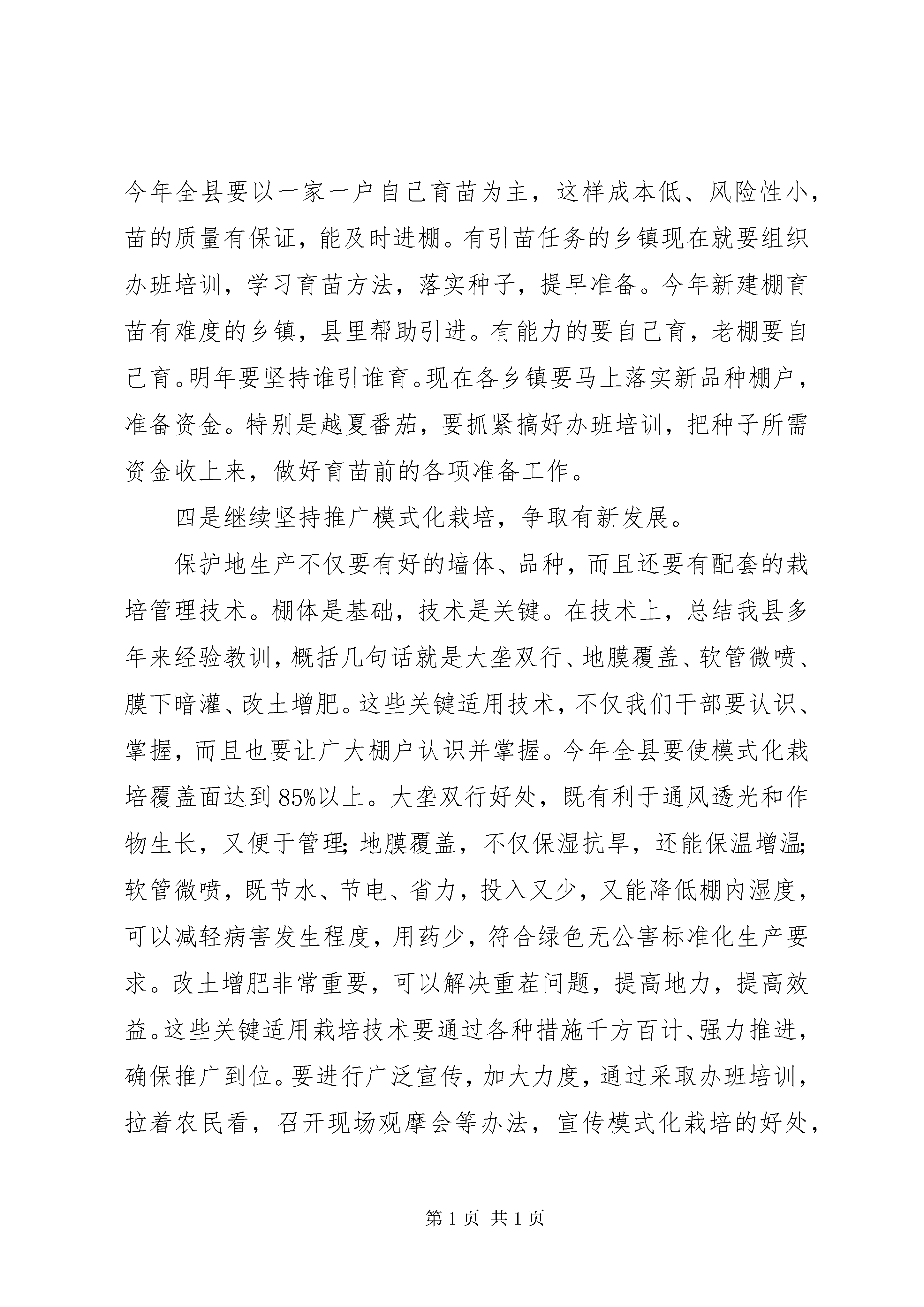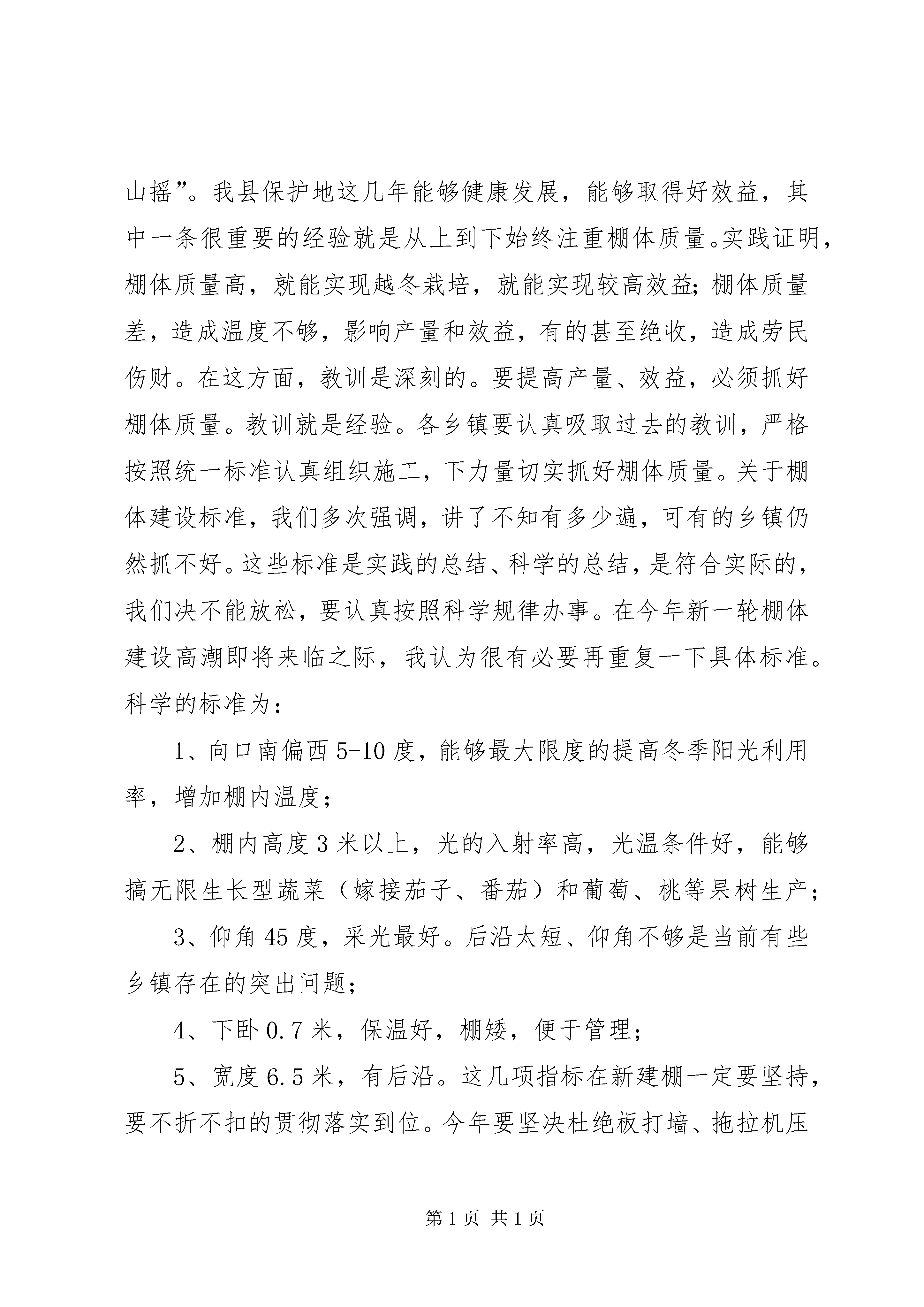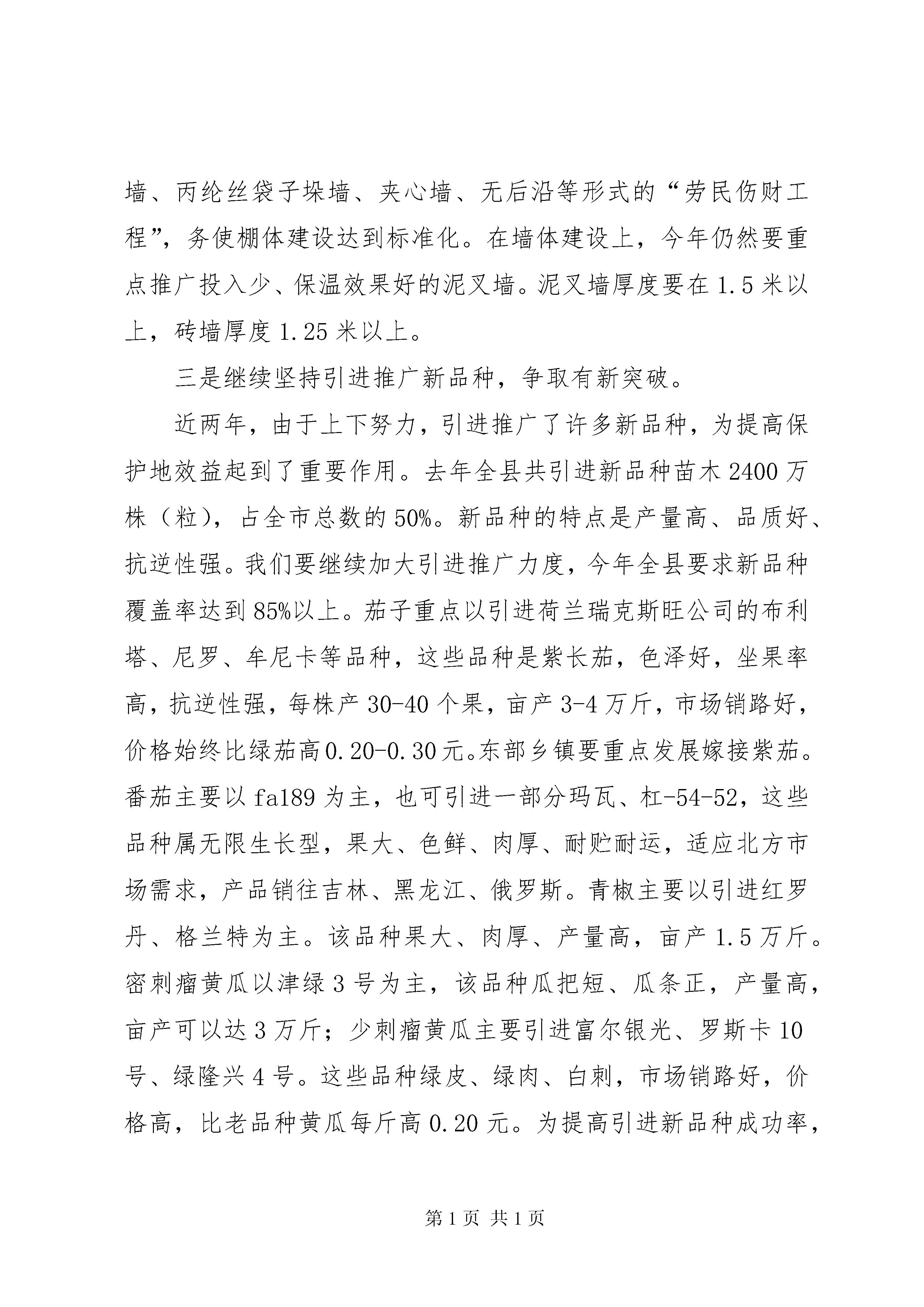 县委生产现场会上的讲话一、要做到“四个继续坚持”一是继续坚持抓早,争取工作上主动。抓早是发展保护地的关键环节。抓早就是抓产量、抓市场、抓效益。比如刚才通过看现场,大家对抓早有了进一步的认识。我县抓早的棚户,现在青椒已卖了4000—6000元,西红柿卖了8000元、多的17000元,黄瓜6000—8000元;抓晚的有些乡镇棚户只卖1000—2000元,有的甚至不到1000元。同样投入差别很大。现在有的乡镇落棚难,群众积极性不高,效益差,主要原因就是抓的晚。由于抓的晚,所以影响效益、落户难。那么,如何抓早呢。“凡事预则立,不预则废。”要强化抓早措施,做到早建棚、早育苗、早扣棚、早定植、早上市。全县保护地品种布局为东部以嫁接茄子为主,西南部以黄瓜为主,北部以西红柿为主,中部以花卉和青椒为主。为了便于管理、技术指导和销售,各乡镇要根据区域化统一品种布局,从本地实际出发,选定一个主栽品种,确定培训、建棚、育苗、扣棚、定植时间,排出时间表。全县总体要求3月末开始打墙体,6月末前打完墙体。在育苗时间上,今年要全面抓早,比去年提前。总之,要进一步增强紧迫感、责任感,切实把握关键时间环节,确保抓出效益。二是继续坚持棚体建设质量,争取有新提高。棚体建设质量是保护地高产高效的基础。“基础不牢,地动山摇”。我县保护地这几年能够健康发展,能够取得好效益,其中一条很重要的经验就是从上到下始终注重棚体质量。实践证明,棚体质量高,就能实现越冬栽培,就能实现较高效益;棚体质量差,造成温度不够,影响产量和效益,有的甚至绝收,造成劳民伤财。在这方面,教训是深刻的。要提高产量、效益,必须抓好棚体质量。教训就是经验。各乡镇要认真吸取过去的教训,严格按照统一标准认真组织施工,下力量切实抓好棚体质量。关于棚体建设标准,我们多次强调,讲了不知有多少遍,可有的乡镇仍然抓不好。这些标准是实践的总结、科学的总结,是符合实际的,我们决不能放松,要认真按照科学规律办事。在今年新一轮棚体建设高潮即将来临之际,我认为很有必要再重复一下具体标准。科学的标准为:1、向口南偏西5-10度,能够最大限度的提高冬季阳光利用率,增加棚内温度;2、棚内高度3米以上,光的入射率高,光温条件好,能够搞无限生长型蔬菜(嫁接茄子、番茄)和葡萄、桃等果树生产;3、仰角45度,采光最好。后沿太短、仰角不够是当前有些乡镇存在的突出问题;4、下卧0.7米,保温好,棚矮,便于管理;5、宽度6.5米,有后沿。这几项指标在新建棚一定要坚持,要不折不扣的贯彻落实到位。今年要坚决杜绝板打墙、拖拉机压墙、丙纶丝袋子垛墙、夹心墙、无后沿等形式的“劳民伤财工程”,务使棚体建设达到标准化。在墙体建设上,今年仍然要重点推广投入少、保温效果好的泥叉墙。泥叉墙厚度要在1.5米以上,砖墙厚度1.25米以上。三是继续坚持引进推广新品种,争取有新突破。近两年,由于上下努力,引进推广了许多新品种,为提高保护地效益起到了重要作用。去年全县共引进新品种苗木2400万株(粒),占全市总数的50%。新品种的特点是产量高、品质好、抗逆性强。我们要继续加大引进推广力度,今年全县要求新品种覆盖率达到85%以上。茄子重点以引进荷兰瑞克斯旺公司的布利塔、尼罗、牟尼卡等品种,这些品种是紫长茄,色泽好,坐果率高,抗逆性强,每株产30-40个果,亩产3-4万斤,市场销路好,价格始终比绿茄高0.20-0.30元。东部乡镇要重点发展嫁接紫茄。番茄主要以fa189为主,也可引进一部分玛瓦、杠-54-52,这些品种属无限生长型,果大、色鲜、肉厚、耐贮耐运,适应北方市场需求,产品销往吉林、黑龙江、俄罗斯。青椒主要以引进红罗丹、格兰特为主。该品种果大、肉厚、产量高,亩产1.5万斤。密刺瘤黄瓜以津绿3号为主,该品种瓜把短、瓜条正,产量高,亩产可以达3万斤;少刺瘤黄瓜主要引进富尔银光、罗斯卡10号、绿隆兴4号。这些品种绿皮、绿肉、白刺,市场销路好,价格高,比老品种黄瓜每斤高0.20元。为提高引进新品种成功率,今年全县要以一家一户自己育苗为主,这样成本低、风险性小,苗的质量有保证,能及时进棚。有引苗任务的乡镇现在就要组织办班培训,学习育苗方法,落实种子,提早准备。今年新建棚育苗有难度的乡镇,县里帮助引进。有能力的要自己育,老棚要自己育。明年要坚持谁引谁育。现在各乡镇要马上落实新品种棚户,准备资金。特别是越夏番茄,要抓紧搞好办班培训,把种子所需资金收上来,做好育苗前的各项准备工作。四是继续坚持推广模式化栽培,争取有新发展。保护地生产不仅要有好的墙体、品种,而且还要有配套的栽培管理技术。棚体是基础,技术是关键。在技术上,总结我县多年来经验教训,概括几句话就是大垄双行、地膜覆盖、软管微喷、膜下暗灌、改土增肥。这些关键适用技术,不仅我们干部要认识、掌握,而且也要让广大棚户