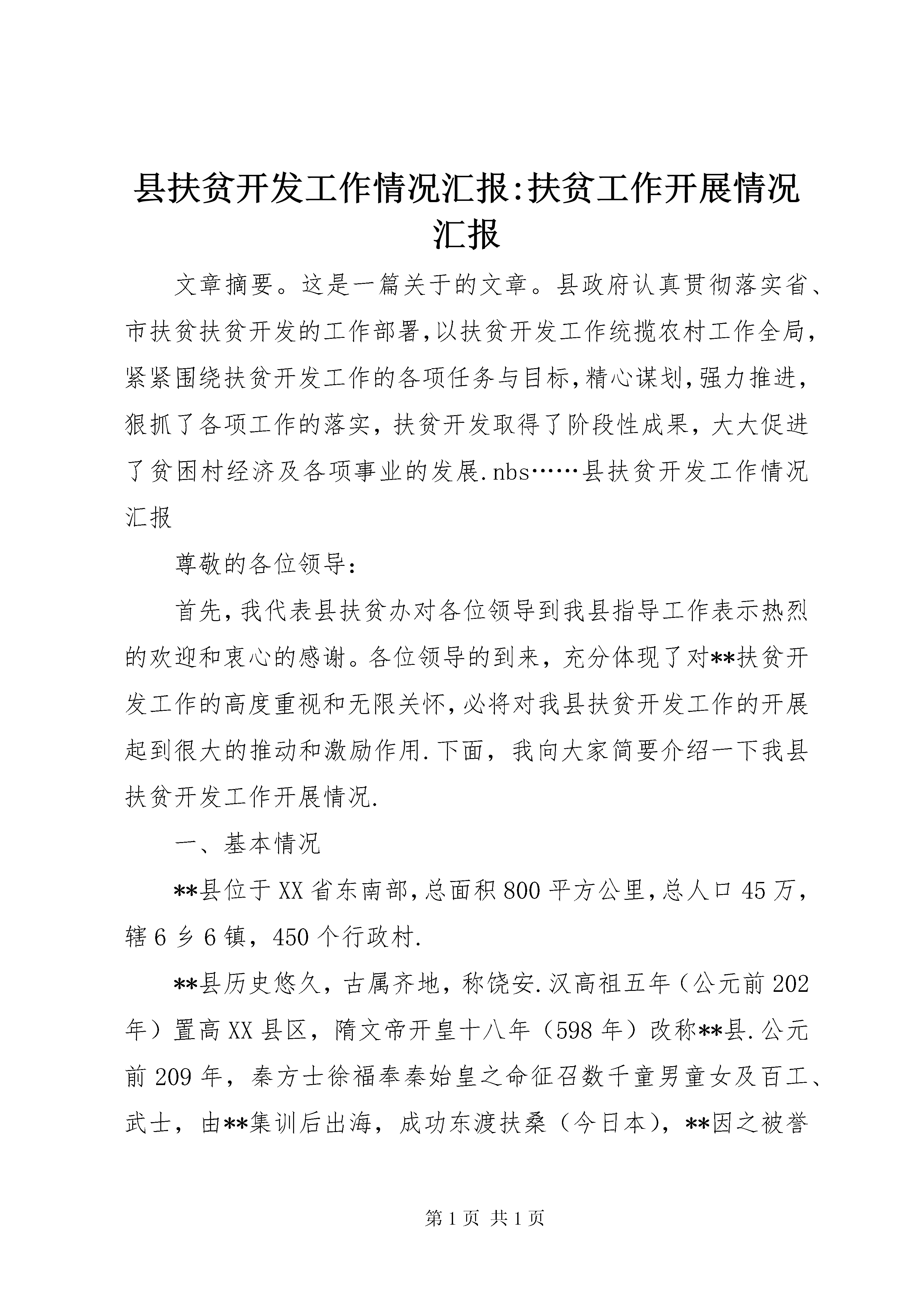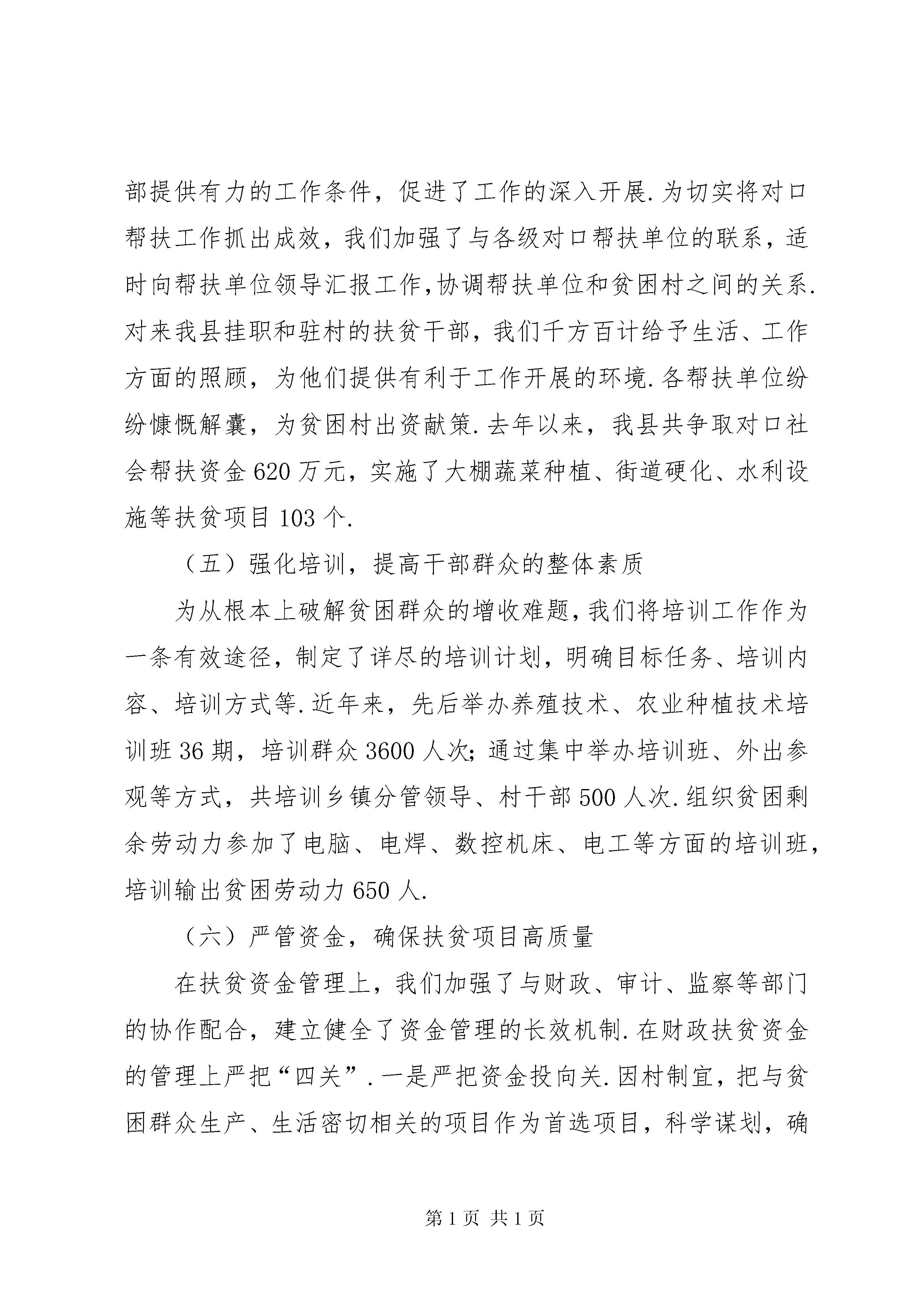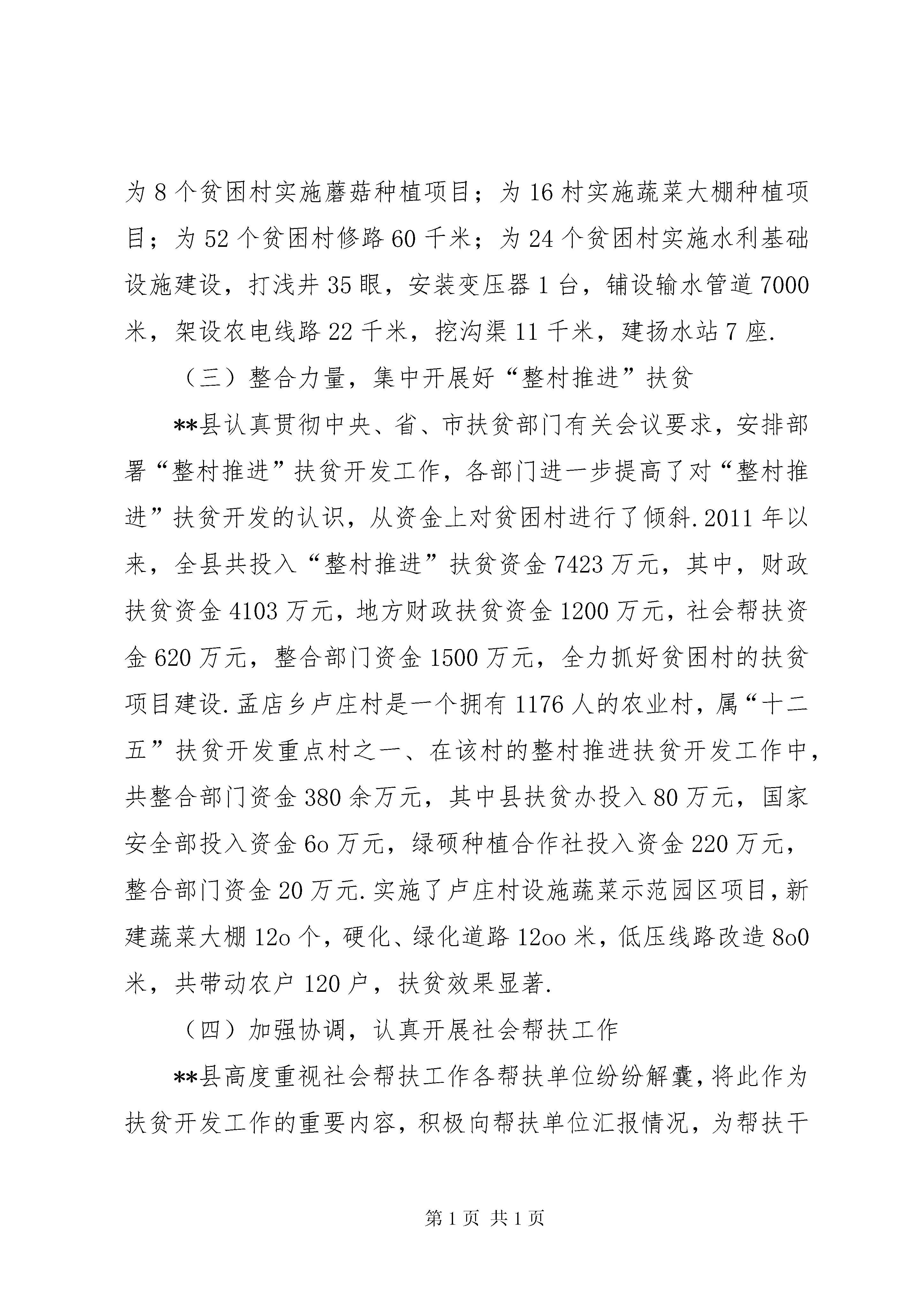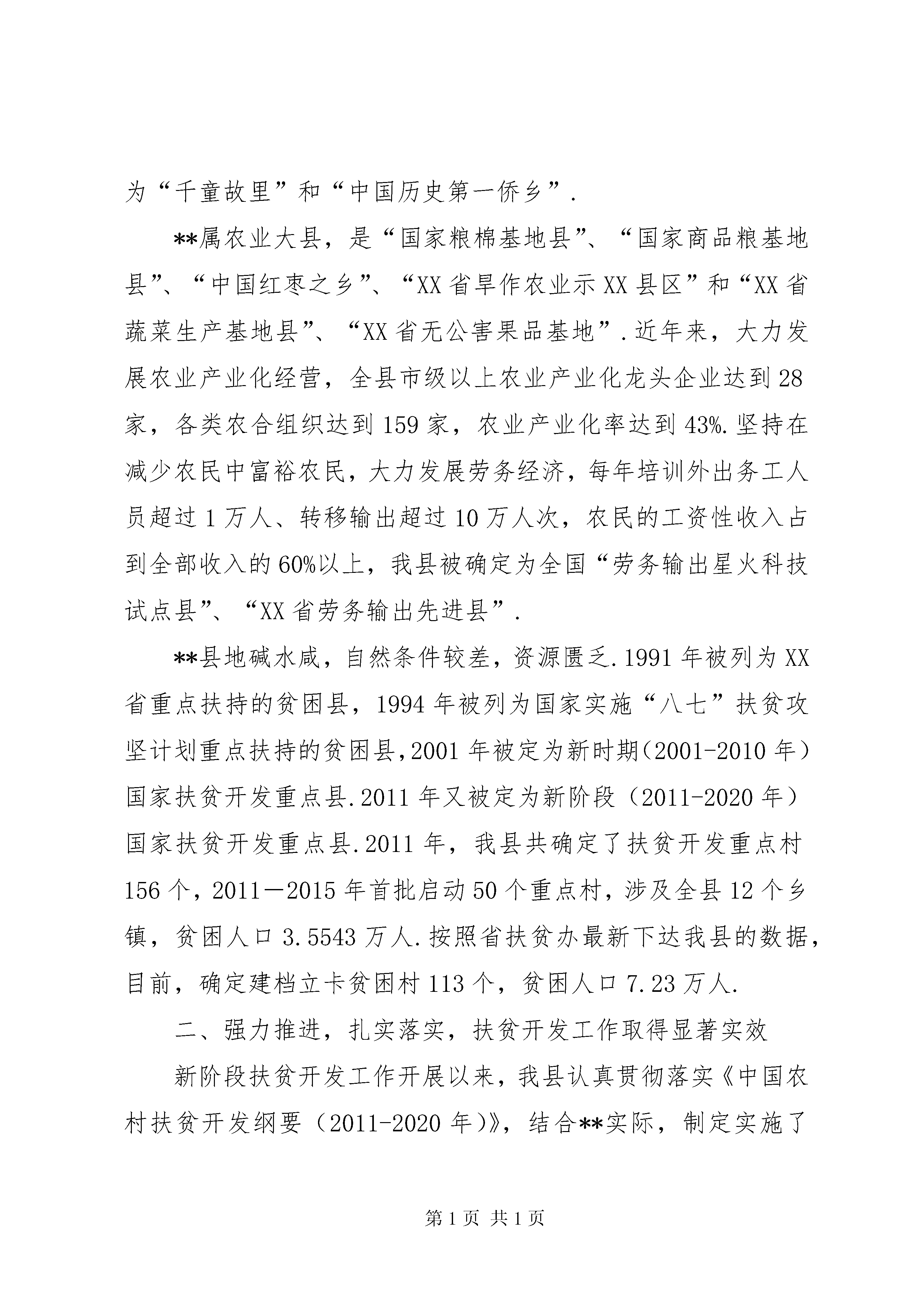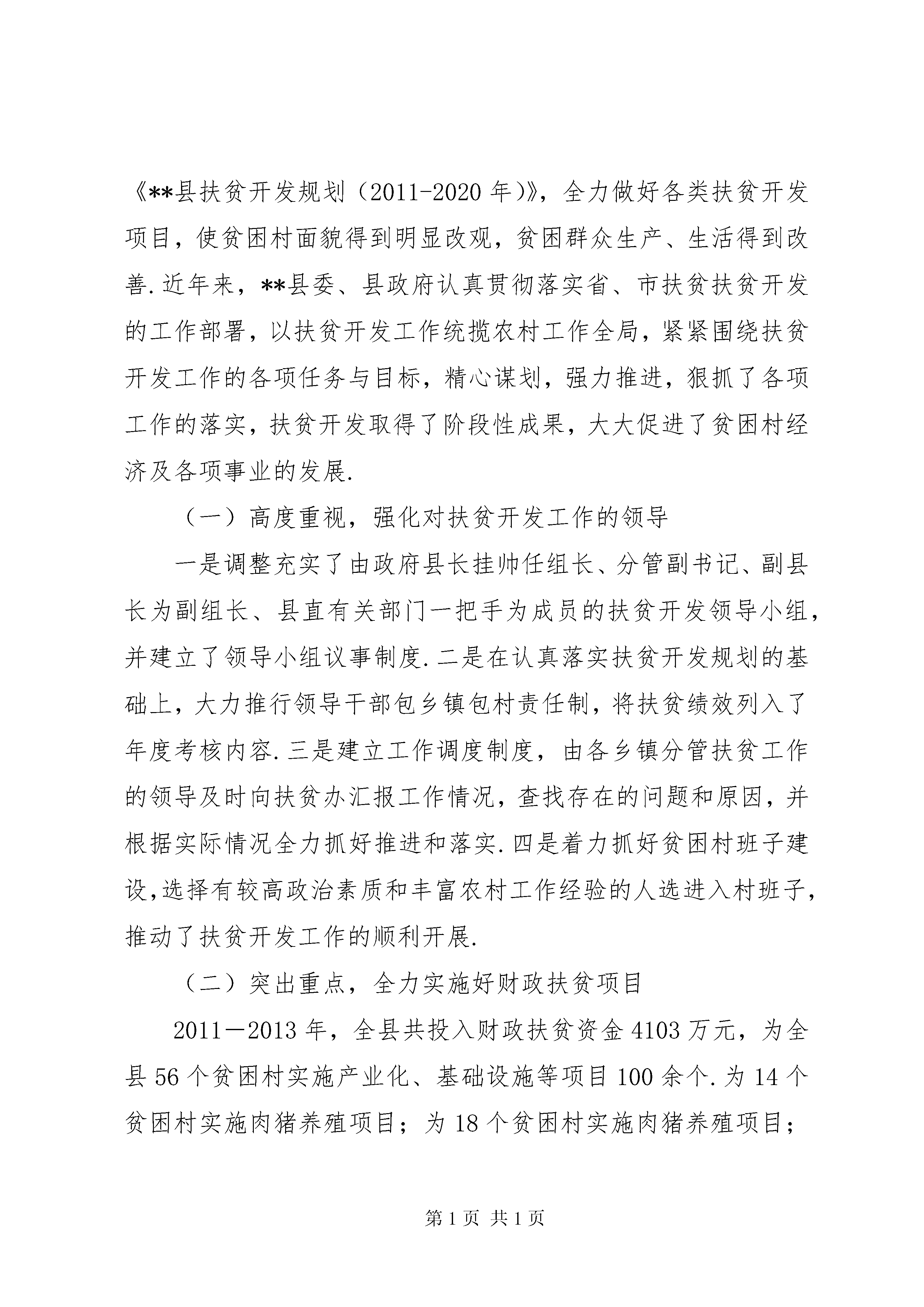 县扶贫开发工作情况汇报:扶贫工作开展情况汇报文章摘要。这是一篇关于的文章。县政府认真贯彻落实省、市扶贫扶贫开发的工作部署,以扶贫开发工作统揽农村工作全局,紧紧围绕扶贫开发工作的各项任务与目标,精心谋划,强力推进,狠抓了各项工作的落实,扶贫开发取得了阶段性成果,大大促进了贫困村经济及各项事业的发展.nbs……县扶贫开发工作情况汇报尊敬的各位领导:首先,我代表县扶贫办对各位领导到我县指导工作表示热烈的欢迎和衷心的感谢。各位领导的到来,充分体现了对**扶贫开发工作的高度重视和无限关怀,必将对我县扶贫开发工作的开展起到很大的推动和激励作用.下面,我向大家简要介绍一下我县扶贫开发工作开展情况.一、基本情况**县位于XX省东南部,总面积800平方公里,总人口45万,辖6乡6镇,450个行政村.**县历史悠久,古属齐地,称饶安.汉高祖五年(公元前202年)置高XX县区,隋文帝开皇十八年(598年)改称**县.公元前209年,秦方士徐福奉秦始皇之命征召数千童男童女及百工、武士,由**集训后出海,成功东渡扶桑(今日本),**因之被誉为“千童故里”和“中国历史第一侨乡”.**属农业大县,是“国家粮棉基地县”、“国家商品粮基地县”、“中国红枣之乡”、“XX省旱作农业示XX县区”和“XX省蔬菜生产基地县”、“XX省无公害果品基地”.近年来,大力发展农业产业化经营,全县市级以上农业产业化龙头企业达到28家,各类农合组织达到159家,农业产业化率达到43%.坚持在减少农民中富裕农民,大力发展劳务经济,每年培训外出务工人员超过1万人、转移输出超过10万人次,农民的工资性收入占到全部收入的60%以上,我县被确定为全国“劳务输出星火科技试点县”、“XX省劳务输出先进县”.**县地碱水咸,自然条件较差,资源匮乏.1991年被列为XX省重点扶持的贫困县,1994年被列为国家实施“八七”扶贫攻坚计划重点扶持的贫困县,2001年被定为新时期(2001-2010年)国家扶贫开发重点县.2011年又被定为新阶段(2011-2020年)国家扶贫开发重点县.2011年,我县共确定了扶贫开发重点村156个,2011―2015年首批启动50个重点村,涉及全县12个乡镇,贫困人口3.5543万人.按照省扶贫办最新下达我县的数据,目前,确定建档立卡贫困村113个,贫困人口7.23万人.二、强力推进,扎实落实,扶贫开发工作取得显著实效新阶段扶贫开发工作开展以来,我县认真贯彻落实《中国农村扶贫开发纲要(2011-2020年)》,结合**实际,制定实施了《**县扶贫开发规划(2011-2020年)》,全力做好各类扶贫开发项目,使贫困村面貌得到明显改观,贫困群众生产、生活得到改善.近年来,**县委、县政府认真贯彻落实省、市扶贫扶贫开发的工作部署,以扶贫开发工作统揽农村工作全局,紧紧围绕扶贫开发工作的各项任务与目标,精心谋划,强力推进,狠抓了各项工作的落实,扶贫开发取得了阶段性成果,大大促进了贫困村经济及各项事业的发展.(一)高度重视,强化对扶贫开发工作的领导一是调整充实了由政府县长挂帅任组长、分管副书记、副县长为副组长、县直有关部门一把手为成员的扶贫开发领导小组,并建立了领导小组议事制度.二是在认真落实扶贫开发规划的基础上,大力推行领导干部包乡镇包村责任制,将扶贫绩效列入了年度考核内容.三是建立工作调度制度,由各乡镇分管扶贫工作的领导及时向扶贫办汇报工作情况,查找存在的问题和原因,并根据实际情况全力抓好推进和落实.四是着力抓好贫困村班子建设,选择有较高政治素质和丰富农村工作经验的人选进入村班子,推动了扶贫开发工作的顺利开展.(二)突出重点,全力实施好财政扶贫项目2011―2013年,全县共投入财政扶贫资金4103万元,为全县56个贫困村实施产业化、基础设施等项目100余个.为14个贫困村实施肉猪养殖项目;为18个贫困村实施肉猪养殖项目;为8个贫困村实施蘑菇种植项目;为16村实施蔬菜大棚种植项目;为52个贫困村修路60千米;为24个贫困村实施水利基础设施建设,打浅井35眼,安装变压器1台,铺设输水管道7000米,架设农电线路22千米,挖沟渠11千米,建扬水站7座.(三)整合力量,集中开展好“整村推进”扶贫**县认真贯彻中央、省、市扶贫部门有关会议要求,安排部署“整村推进”扶贫开发工作,各部门进一步提高了对“整村推进”扶贫开发的认识,从资金上对贫困村进行了倾斜.2011年以来,全县共投入“整村推进”扶贫资金7423万元,其中,财政扶贫资金4103万元,地方财政扶贫资金1200万元,社会帮扶资金620万元,整合部门资金1500万元,全力抓好贫困村的扶贫项目建设.孟店乡卢庄村是一个拥有1176人的农业村,属“十二五”扶贫开发重点村之一、在该村的整村推进扶贫开发工作中,共整合
