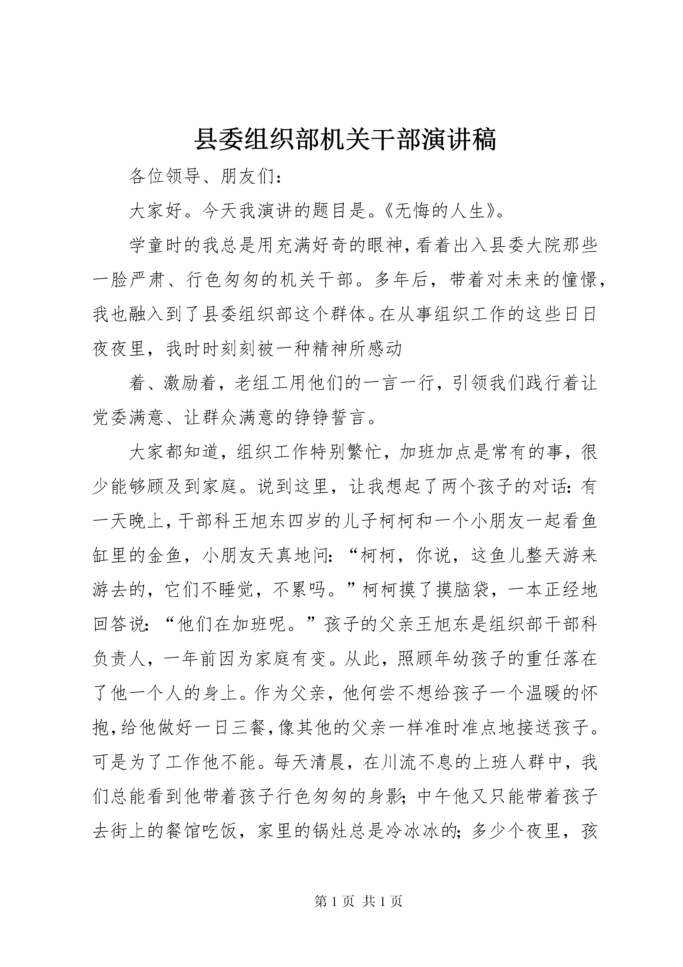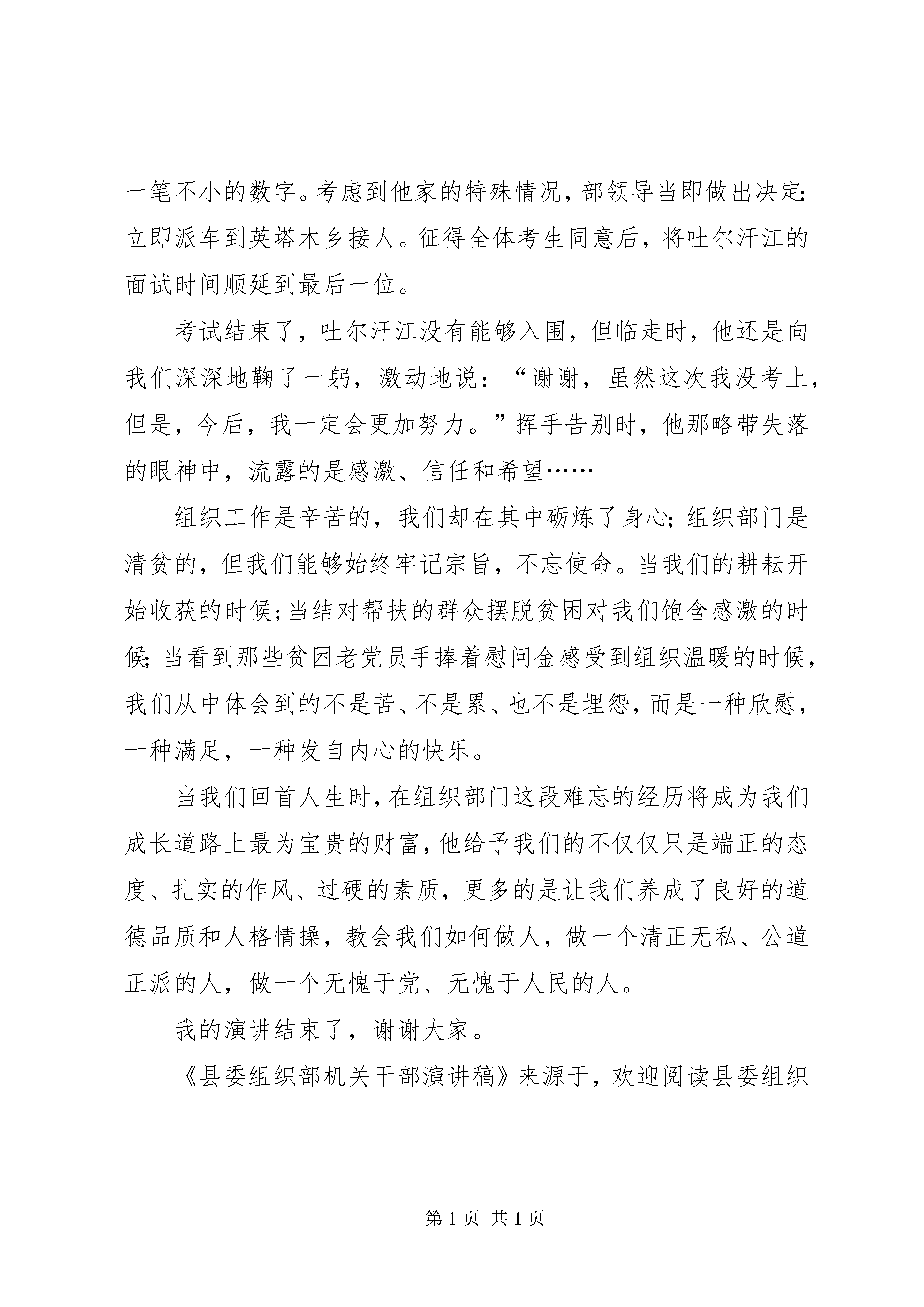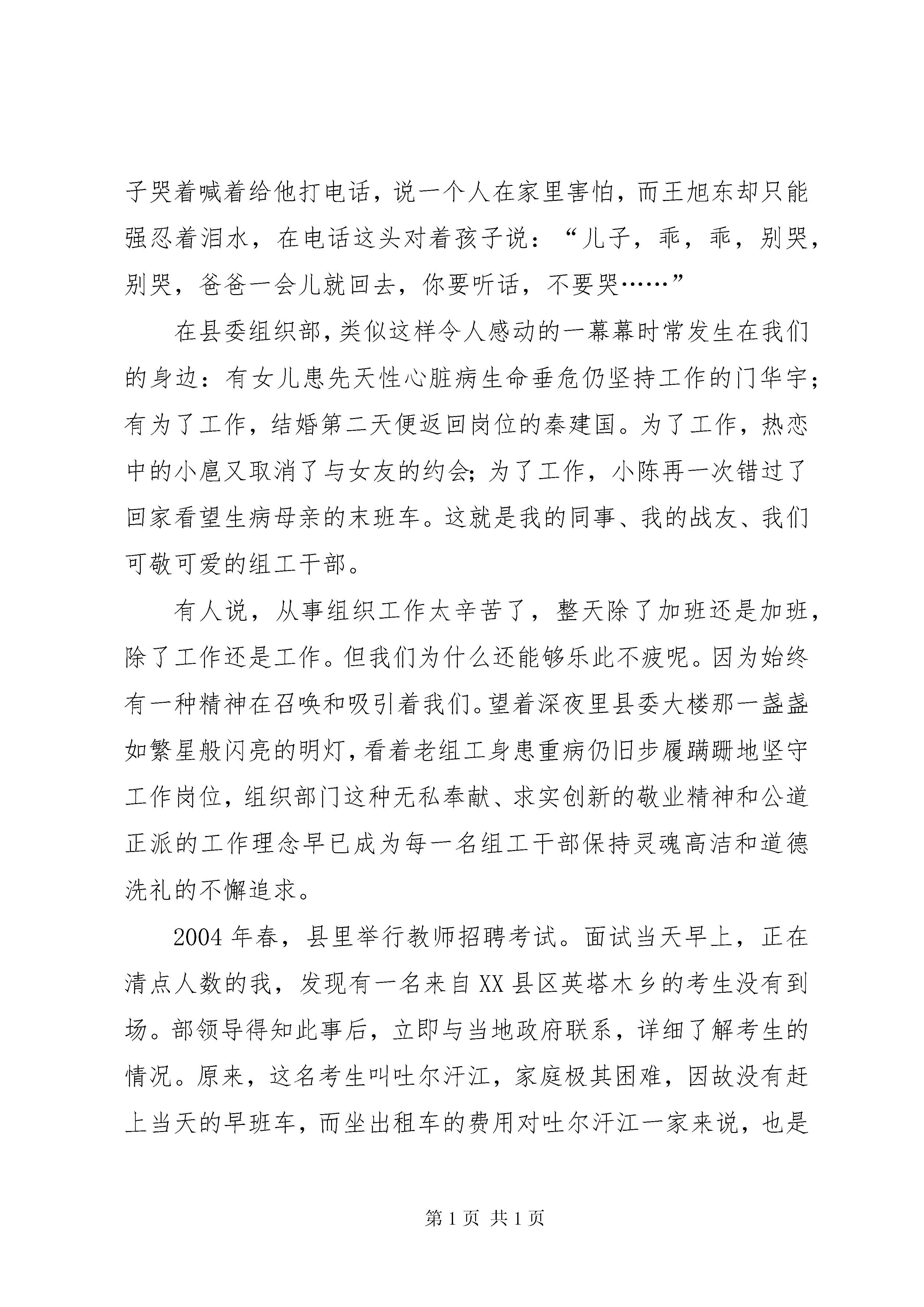 县委组织部机关干部演讲稿各位领导、朋友们:大家好。今天我演讲的题目是。《无悔的人生》。学童时的我总是用充满好奇的眼神,看着出入县委大院那些一脸严肃、行色匆匆的机关干部。多年后,带着对未来的憧憬,我也融入到了县委组织部这个群体。在从事组织工作的这些日日夜夜里,我时时刻刻被一种精神所感动着、激励着,老组工用他们的一言一行,引领我们践行着让党委满意、让群众满意的铮铮誓言。大家都知道,组织工作特别繁忙,加班加点是常有的事,很少能够顾及到家庭。说到这里,让我想起了两个孩子的对话:有一天晚上,干部科王旭东四岁的儿子柯柯和一个小朋友一起看鱼缸里的金鱼,小朋友天真地问:“柯柯,你说,这鱼儿整天游来游去的,它们不睡觉,不累吗。”柯柯摸了摸脑袋,一本正经地回答说:“他们在加班呢。”孩子的父亲王旭东是组织部干部科负责人,一年前因为家庭有变。从此,照顾年幼孩子的重任落在了他一个人的身上。作为父亲,他何尝不想给孩子一个温暖的怀抱,给他做好一日三餐,像其他的父亲一样准时准点地接送孩子。可是为了工作他不能。每天清晨,在川流不息的上班人群中,我们总能看到他带着孩子行色匆匆的身影;中午他又只能带着孩子去街上的餐馆吃饭,家里的锅灶总是冷冰冰的;多少个夜里,孩子哭着喊着给他打电话,说一个人在家里害怕,而王旭东却只能强忍着泪水,在电话这头对着孩子说:“儿子,乖,乖,别哭,别哭,爸爸一会儿就回去,你要听话,不要哭……”在县委组织部,类似这样令人感动的一幕幕时常发生在我们的身边:有女儿患先天性心脏病生命垂危仍坚持工作的门华宇;有为了工作,结婚第二天便返回岗位的秦建国。为了工作,热恋中的小扈又取消了与女友的约会;为了工作,小陈再一次错过了回家看望生病母亲的末班车。这就是我的同事、我的战友、我们可敬可爱的组工干部。有人说,从事组织工作太辛苦了,整天除了加班还是加班,除了工作还是工作。但我们为什么还能够乐此不疲呢。因为始终有一种精神在召唤和吸引着我们。望着深夜里县委大楼那一盏盏如繁星般闪亮的明灯,看着老组工身患重病仍旧步履蹒跚地坚守工作岗位,组织部门这种无私奉献、求实创新的敬业精神和公道正派的工作理念早已成为每一名组工干部保持灵魂高洁和道德洗礼的不懈追求。2004年春,县里举行教师招聘考试。面试当天早上,正在清点人数的我,发现有一名来自XX县区英塔木乡的考生没有到场。部领导得知此事后,立即与当地政府联系,详细了解考生的情况。原来,这名考生叫吐尔汗江,家庭极其困难,因故没有赶上当天的早班车,而坐出租车的费用对吐尔汗江一家来说,也是一笔不小的数字。考虑到他家的特殊情况,部领导当即做出决定:立即派车到英塔木乡接人。征得全体考生同意后,将吐尔汗江的面试时间顺延到最后一位。考试结束了,吐尔汗江没有能够入围,但临走时,他还是向我们深深地鞠了一躬,激动地说:“谢谢,虽然这次我没考上,但是,今后,我一定会更加努力。”挥手告别时,他那略带失落的眼神中,流露的是感激、信任和希望……组织工作是辛苦的,我们却在其中砺炼了身心;组织部门是清贫的,但我们能够始终牢记宗旨,不忘使命。当我们的耕耘开始收获的时候;当结对帮扶的群众摆脱贫困对我们饱含感激的时候;当看到那些贫困老党员手捧着慰问金感受到组织温暖的时候,我们从中体会到的不是苦、不是累、也不是埋怨,而是一种欣慰,一种满足,一种发自内心的快乐。当我们回首人生时,在组织部门这段难忘的经历将成为我们成长道路上最为宝贵的财富,他给予我们的不仅仅只是端正的态度、扎实的作风、过硬的素质,更多的是让我们养成了良好的道德品质和人格情操,教会我们如何做人,做一个清正无私、公道正派的人,做一个无愧于党、无愧于人民的人。我的演讲结束了,谢谢大家。《县委组织部机关干部演讲稿》来源于,欢迎阅读县委组织部机关干部演讲稿。