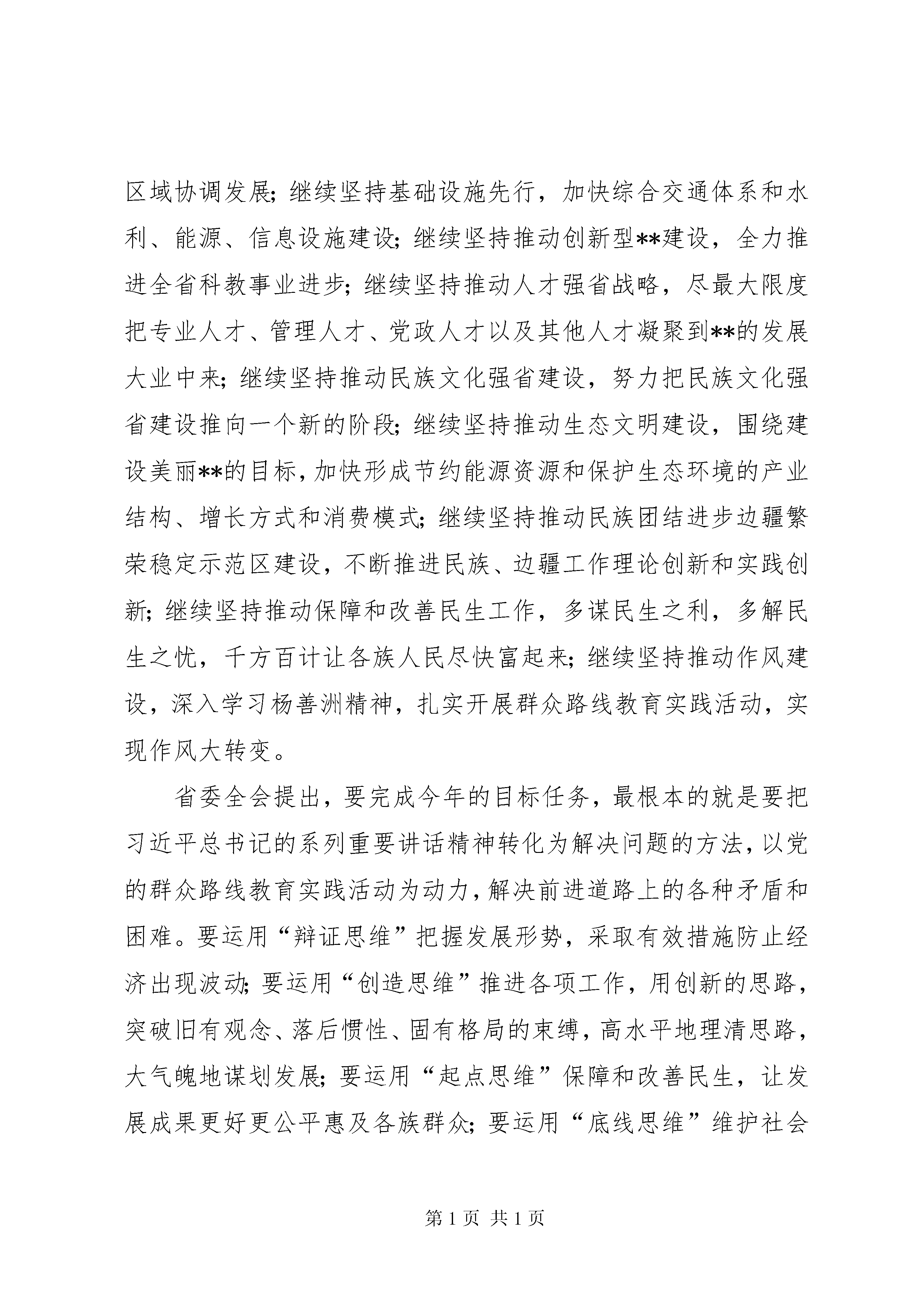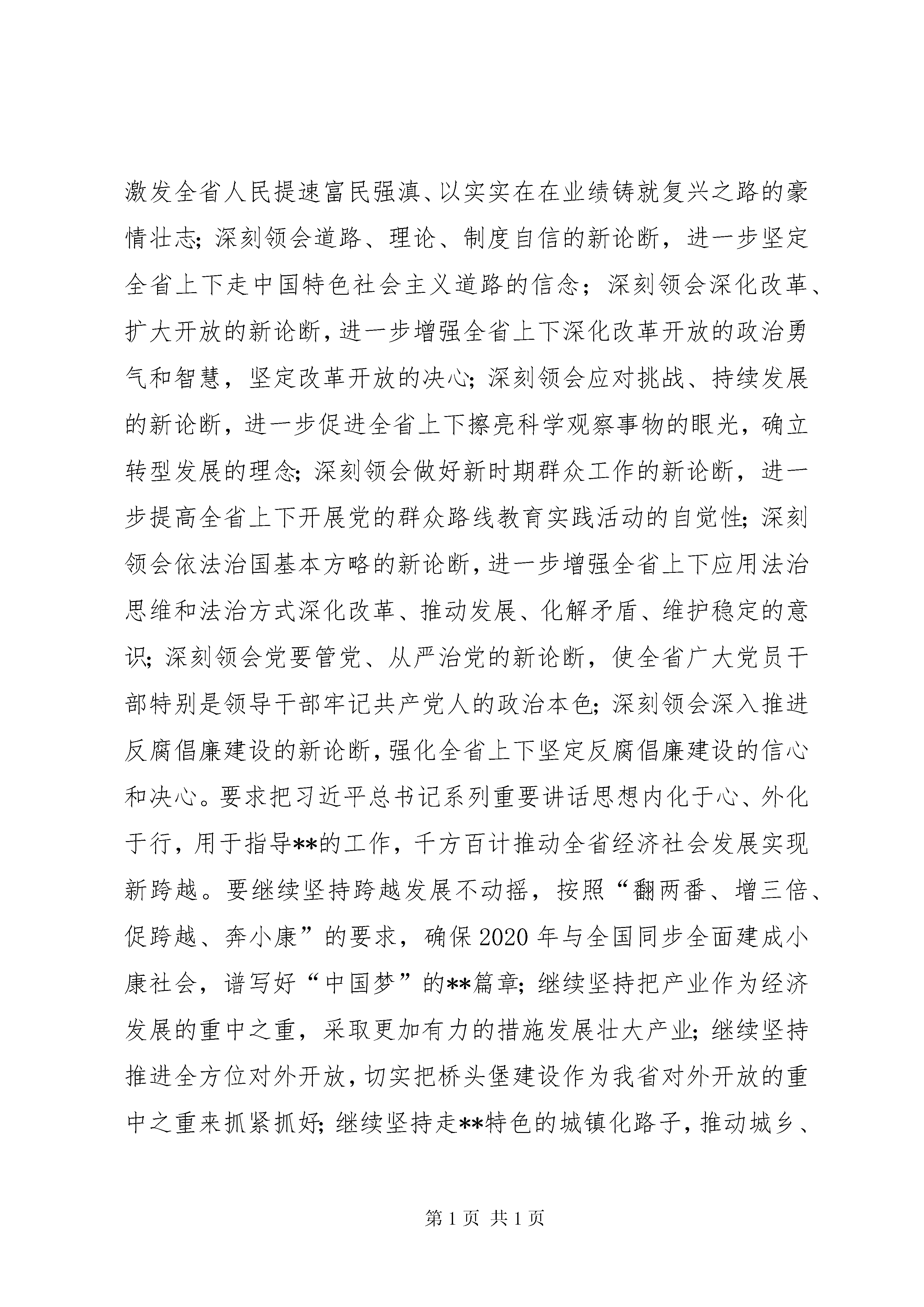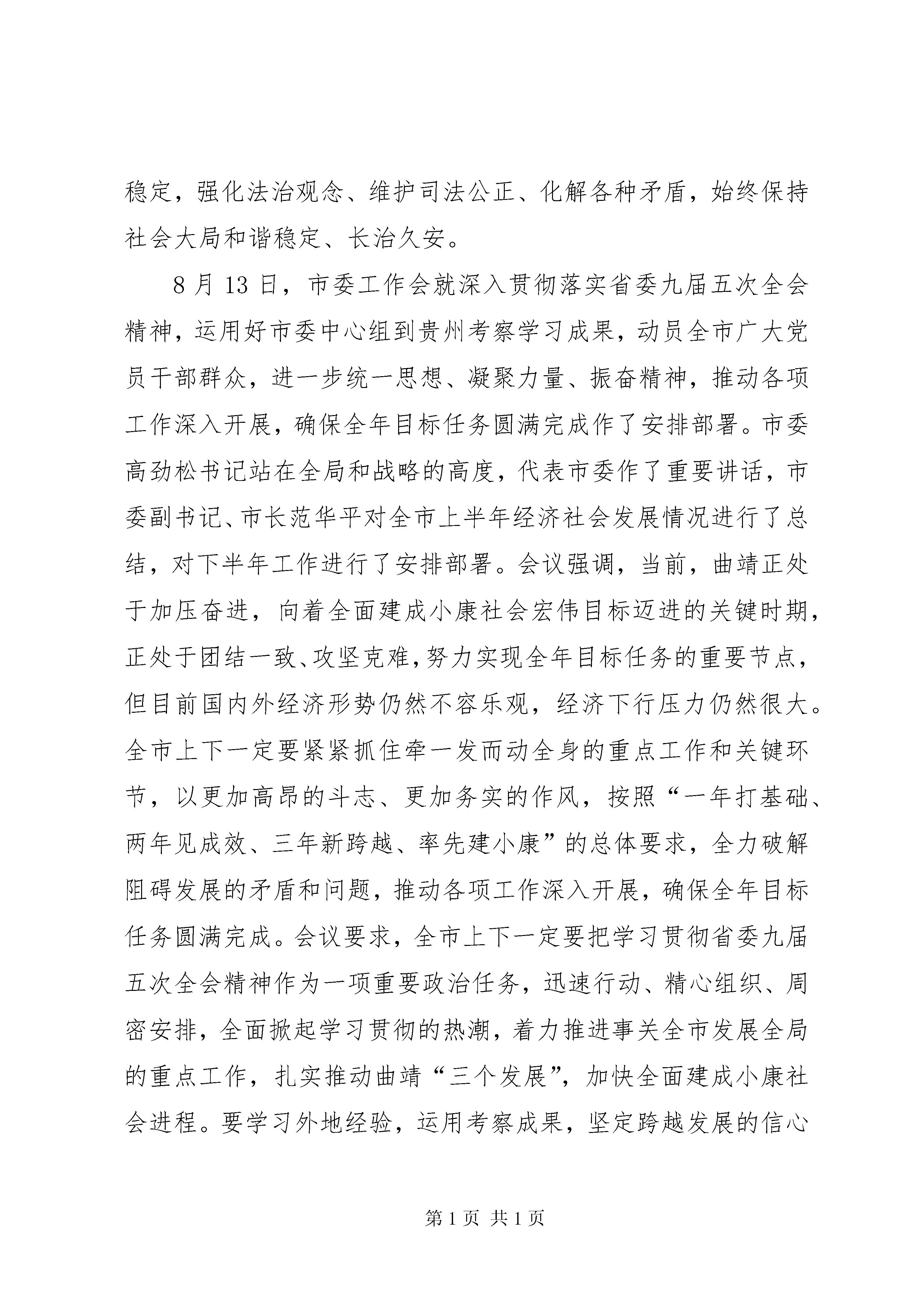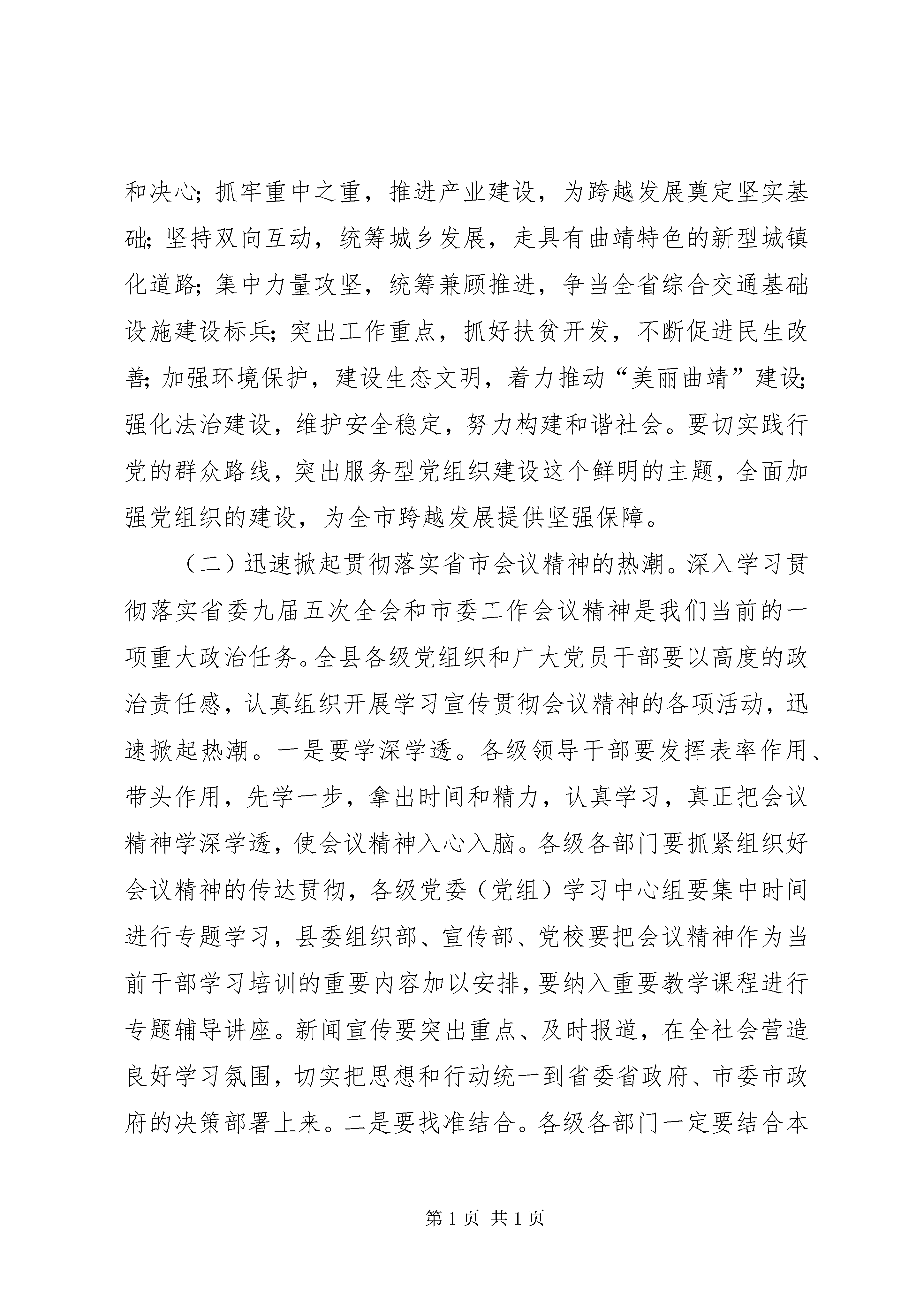 县委经济工作会议讲话开拓创新奋发有为为推动全县经济社会跨越发展而努力奋斗同志们:这次会议的主要任务是。认真学习领会习近平总书记系列重要讲话精神,深入贯彻落实省委九届五次全会和市委工作会议精神,安排部署下半年工作,动员全县广大干部群众进一步解放思想、开拓创新,转变作风、苦干实干,确保全年目标任务圆满完成。过一会儿,品红县长还要对经济等相关工作作安排,请大家一并落实。下面,我讲四点意见:一、内化于心,认真学习领会省委九届五次全会和市委工作会议精神,凝聚发展共识(一)全面理解和把握省市会议精神实质。7月28至29日,省委九届五次全体(扩大)会议在昆明召开。8月13日,XX市委召开了市委工作会。省委全会强调,必须围绕实现省第九次党代会提出的目标任务,坚定不移地坚持好字当头、快字当先,能快则快、好中求快,进一步立赶超之志、鼓奋进之气,千方百计推动全省经济社会发展实现新跨越。省委全会全面总结、深入阐述了习近平总书记系列重要讲话精神,要求全省上下深刻领会实现中华民族伟大复兴中国梦的新论断,进一步统一全省上下思想,激发全省人民提速富民强滇、以实实在在业绩铸就复兴之路的豪情壮志;深刻领会道路、理论、制度自信的新论断,进一步坚定全省上下走中国特色社会主义道路的信念;深刻领会深化改革、扩大开放的新论断,进一步增强全省上下深化改革开放的政治勇气和智慧,坚定改革开放的决心;深刻领会应对挑战、持续发展的新论断,进一步促进全省上下擦亮科学观察事物的眼光,确立转型发展的理念;深刻领会做好新时期群众工作的新论断,进一步提高全省上下开展党的群众路线教育实践活动的自觉性;深刻领会依法治国基本方略的新论断,进一步增强全省上下应用法治思维和法治方式深化改革、推动发展、化解矛盾、维护稳定的意识;深刻领会党要管党、从严治党的新论断,使全省广大党员干部特别是领导干部牢记共产党人的政治本色;深刻领会深入推进反腐倡廉建设的新论断,强化全省上下坚定反腐倡廉建设的信心和决心。要求把习近平总书记系列重要讲话思想内化于心、外化于行,用于指导**的工作,千方百计推动全省经济社会发展实现新跨越。要继续坚持跨越发展不动摇,按照“翻两番、增三倍、促跨越、奔小康”的要求,确保2020年与全国同步全面建成小康社会,谱写好“中国梦”的**篇章;继续坚持把产业作为经济发展的重中之重,采取更加有力的措施发展壮大产业;继续坚持推进全方位对外开放,切实把桥头堡建设作为我省对外开放的重中之重来抓紧抓好;继续坚持走**特色的城镇化路子,推动城乡、区域协调发展;继续坚持基础设施先行,加快综合交通体系和水利、能源、信息设施建设;继续坚持推动创新型**建设,全力推进全省科教事业进步;继续坚持推动人才强省战略,尽最大限度把专业人才、管理人才、党政人才以及其他人才凝聚到**的发展大业中来;继续坚持推动民族文化强省建设,努力把民族文化强省建设推向一个新的阶段;继续坚持推动生态文明建设,围绕建设美丽**的目标,加快形成节约能源资源和保护生态环境的产业结构、增长方式和消费模式;继续坚持推动民族团结进步边疆繁荣稳定示范区建设,不断推进民族、边疆工作理论创新和实践创新;继续坚持推动保障和改善民生工作,多谋民生之利,多解民生之忧,千方百计让各族人民尽快富起来;继续坚持推动作风建设,深入学习杨善洲精神,扎实开展群众路线教育实践活动,实现作风大转变。省委全会提出,要完成今年的目标任务,最根本的就是要把习近平总书记的系列重要讲话精神转化为解决问题的方法,以党的群众路线教育实践活动为动力,解决前进道路上的各种矛盾和困难。要运用“辩证思维”把握发展形势,采取有效措施防止经济出现波动;要运用“创造思维”推进各项工作,用创新的思路,突破旧有观念、落后惯性、固有格局的束缚,高水平地理清思路,大气魄地谋划发展;要运用“起点思维”保障和改善民生,让发展成果更好更公平惠及各族群众;要运用“底线思维”维护社会稳定,强化法治观念、维护司法公正、化解各种矛盾,始终保持社会大局和谐稳定、长治久安。8月13日,市委工作会就深入贯彻落实省委九届五次全会精神,运用好市委中心组到贵州考察学习成果,动员全市广大党员干部群众,进一步统一思想、凝聚力量、振奋精神,推动各项工作深入开展,确保全年目标任务圆满完成作了安排部署。市委高劲松书记站在全局和战略的高度,代表市委作了重要讲话,市委副书记、市长范华平对全市上半年经济社会发展情况进行了总结,对下半年工作进行了安排部署。会议强调,当前,曲靖正处于加压奋进,向着全面建成小康社会宏伟目标迈进的关键时期,正处于团结一致、攻坚克难,努力实现全年目标任务的重要节点,但目前国内外经济形势仍然不容乐观,经济下行压力仍然很大。全市上下一定要紧紧抓住牵一发而动全身的重点工作和关键环节,以更加高昂的斗志、更加务实的作风,按