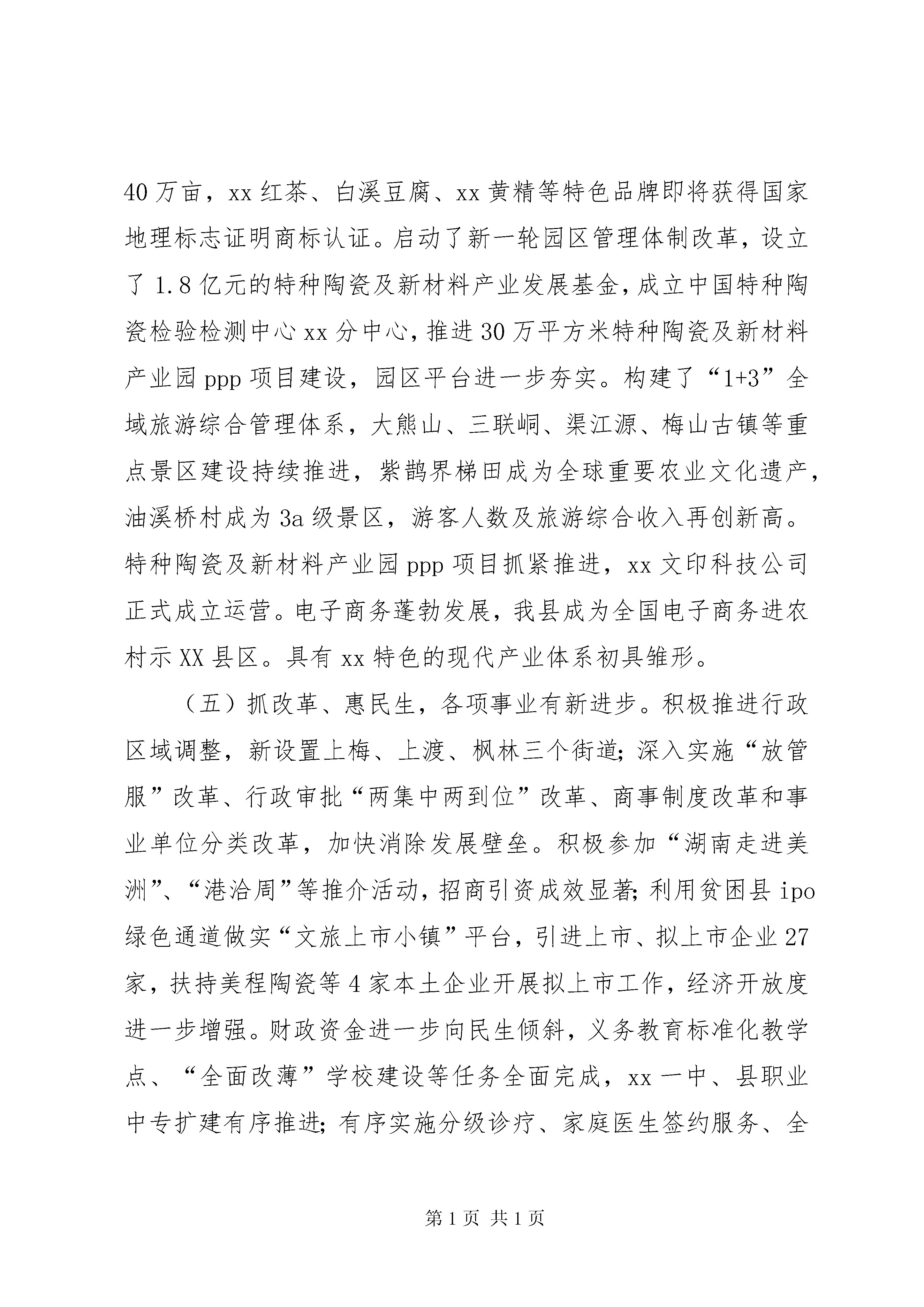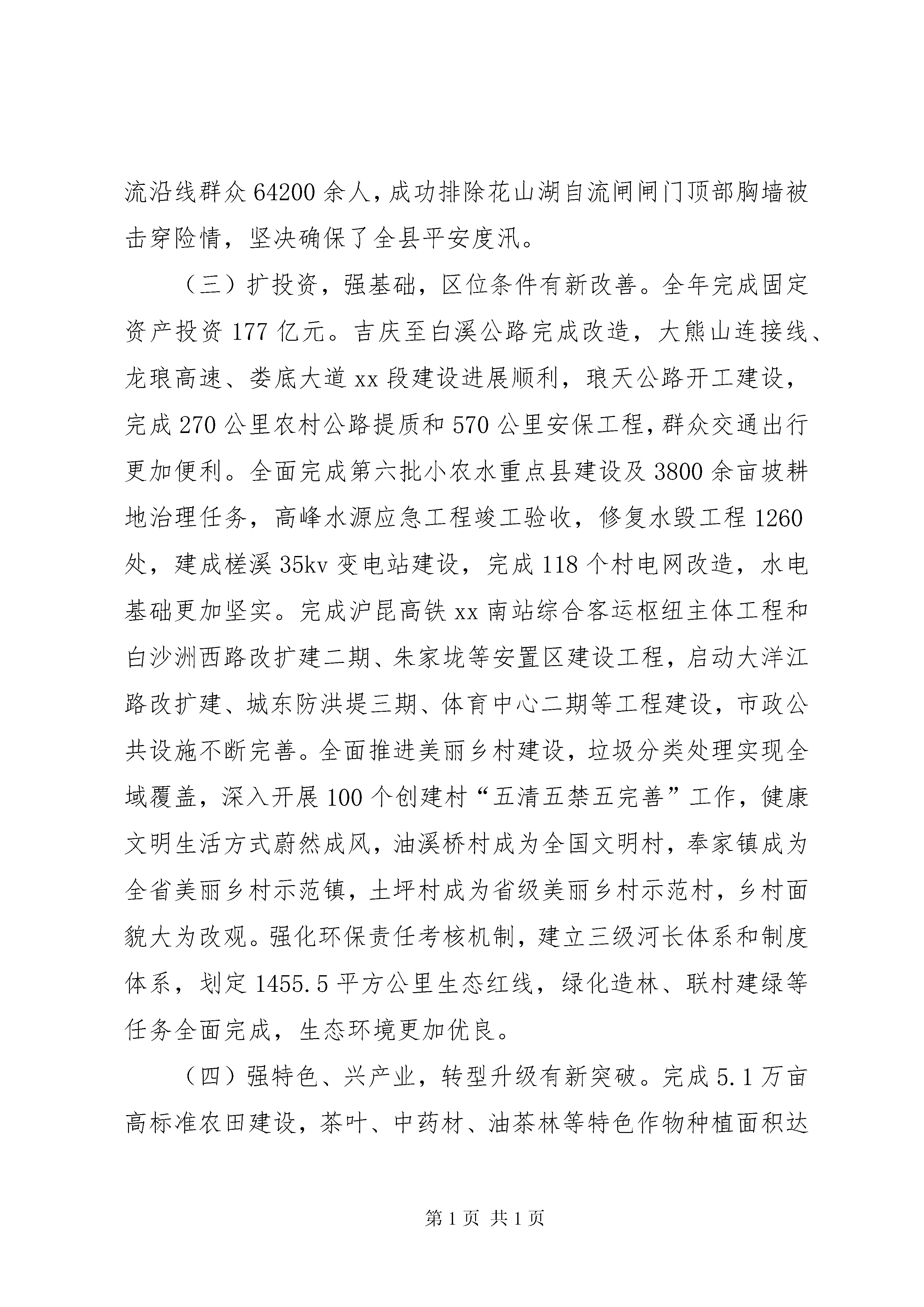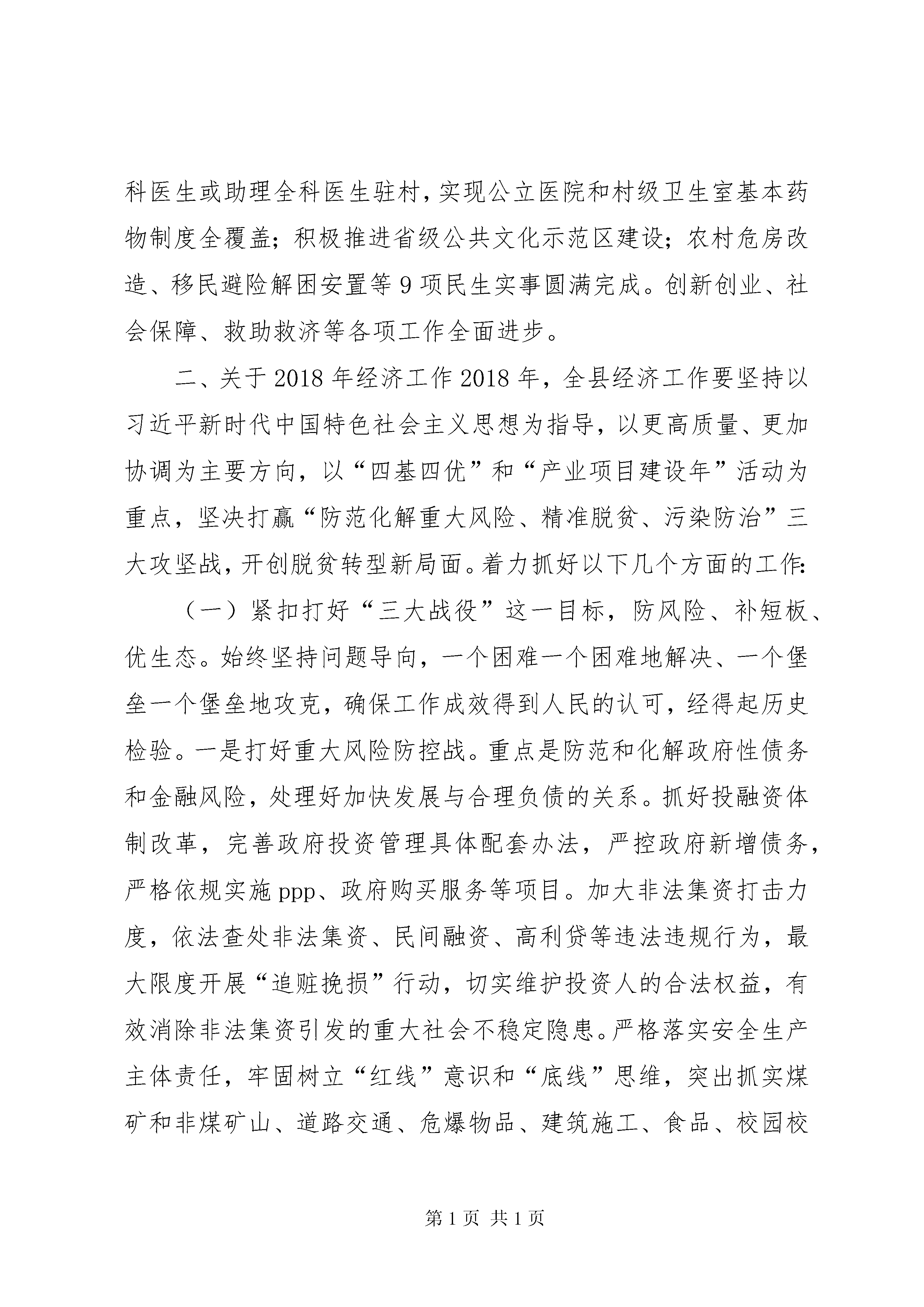 县委经济工作会议讲话稿同志们:刚才,前明书记的重要讲话,全面总结了2017年经济工作,科学研判了当前的经济形势,结合中央和省、市经济工作会议精神,对2018年经济工作作了精心部署,各级各部门要认真领会,抓好贯彻落实。下面,我讲三点意见。一、关于2017年经济工作过去一年,在县委的坚强领导下,全县上下紧扣“绿色崛起·科学跨越”主题和“脱贫转型·富民强县”目标,以提高发展质量与效益为中心,突出九个“三年行动计划”和美丽乡村建设重点,开拓创新、克难奋进,较好地完成了年度目标任务,努力开创了经济社会发展新局面。(一)调结构、稳增长,经济发展有新起色。全年完成地区生产总值245亿元、增长8.2%,其中一产业、二产业、三产业增加值分别为62亿元、76亿元、107亿元,分别增长4.1%、6.8%、11.6%,三次产业结构比为25.3∶31.0∶43.7。实现规模工业增加值55亿元、增长7.4%,完成固定资产投资173.7亿元、增长16.0%,金融机构各项存、贷款余额达到350.9亿元、148.2亿元,分别增长15.0%、19.2%,财政总收入12.8亿元、地方财政预算收入7.9亿元,分别增长9.3%、4.3%,两项收入中税收占比分别为75%、59.2%,比上年提高了4.6和3.8个百分点。社会消费品零售总额105.1亿元、增长10.8%,城镇居民、农村居民人均可支配收入达到19266元、7920元,分别增长8.0%、10.4%。(二)解难题、控风险,瓶颈破解有新作为。坚持“在抓发展中解难题,在解难题中促发展”。深入推进“解难题、促发展、保稳定”活动,对信访积案一一进行交办化解,对非法融资、网络融资进行了认真的清理整顿,组织完成或强力推进了学府路以西、资江、盛教北路、体育中心二期、新田、曾家垅等安置区建设,顺利拆除了城东防洪堤用地范围内4栋房屋,推进了永兴街、玉虚宫、三义阁、原茶厂等棚改项目建设,清缴入库土地出让金5540.8万元等。全县上下层层动员、人人参与,全力发扬“5+2”“白加黑”拼搏精神,进村入户、进项目现场,确保了年度脱贫攻坚任务圆满完成。出台史上最严《拆违控违责任追究办法》,拆除违法建筑479处74130平方米,推进了力度空前、效果显著的XX县区禁燃、环境卫生、交通秩序整治。加速推进了西河等6个乡镇污水处理厂和工业园区污水处理及涉重废水治理ppp项目建设,禁养区495家畜禽规模养殖场退出关闭到位,63家新型墙体材料砖厂、67家粘土砖厂全部按要求改造、处置、取缔到位,污染治理成效明显。向县纪委移送了6起损害经济发展环境案件,查处党员干部11人;及时处置环境投诉114起,刑事打击6人、治安拘留64人。面对6月22日至7月3日的特大洪水灾害,出动各级干部12.8万人次,紧急转移安置资江干流沿线群众64200余人,成功排除花山湖自流闸闸门顶部胸墙被击穿险情,坚决确保了全县平安度汛。(三)扩投资,强基础,区位条件有新改善。全年完成固定资产投资177亿元。吉庆至白溪公路完成改造,大熊山连接线、龙琅高速、娄底大道xx段建设进展顺利,琅天公路开工建设,完成270公里农村公路提质和570公里安保工程,群众交通出行更加便利。全面完成第六批小农水重点县建设及3800余亩坡耕地治理任务,高峰水源应急工程竣工验收,修复水毁工程1260处,建成槎溪35kv变电站建设,完成118个村电网改造,水电基础更加坚实。完成沪昆高铁xx南站综合客运枢纽主体工程和白沙洲西路改扩建二期、朱家垅等安置区建设工程,启动大洋江路改扩建、城东防洪堤三期、体育中心二期等工程建设,市政公共设施不断完善。全面推进美丽乡村建设,垃圾分类处理实现全域覆盖,深入开展100个创建村“五清五禁五完善”工作,健康文明生活方式蔚然成风,油溪桥村成为全国文明村,奉家镇成为全省美丽乡村示范镇,土坪村成为省级美丽乡村示范村,乡村面貌大为改观。强化环保责任考核机制,建立三级河长体系和制度体系,划定1455.5平方公里生态红线,绿化造林、联村建绿等任务全面完成,生态环境更加优良。(四)强特色、兴产业,转型升级有新突破。完成5.1万亩高标准农田建设,茶叶、中药材、油茶林等特色作物种植面积达40万亩,xx红茶、白溪豆腐、xx黄精等特色品牌即将获得国家地理标志证明商标认证。启动了新一轮园区管理体制改革,设立了1.8亿元的特种陶瓷及新材料产业发展基金,成立中国特种陶瓷检验检测中心xx分中心,推进30万平方米特种陶瓷及新材料产业园ppp项目建设,园区平台进一步夯实。构建了“1+3”全域旅游综合管理体系,大熊山、三联峒、渠江源、梅山古镇等重点景区建设持续推进,紫鹊界梯田成为全球重要农业文化遗产,油溪桥村成为3a级景区,游客人数及旅游综合收入再创新高。特种陶瓷及新材料产业园ppp项目抓紧推进,xx