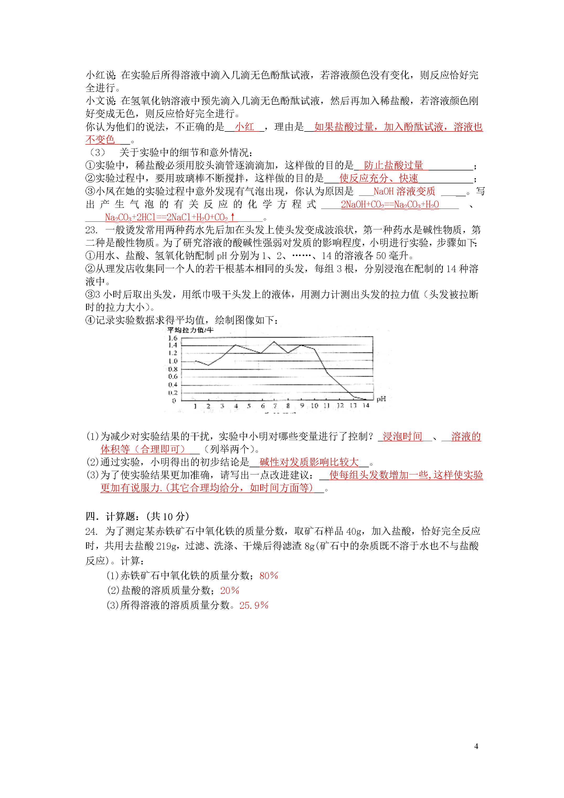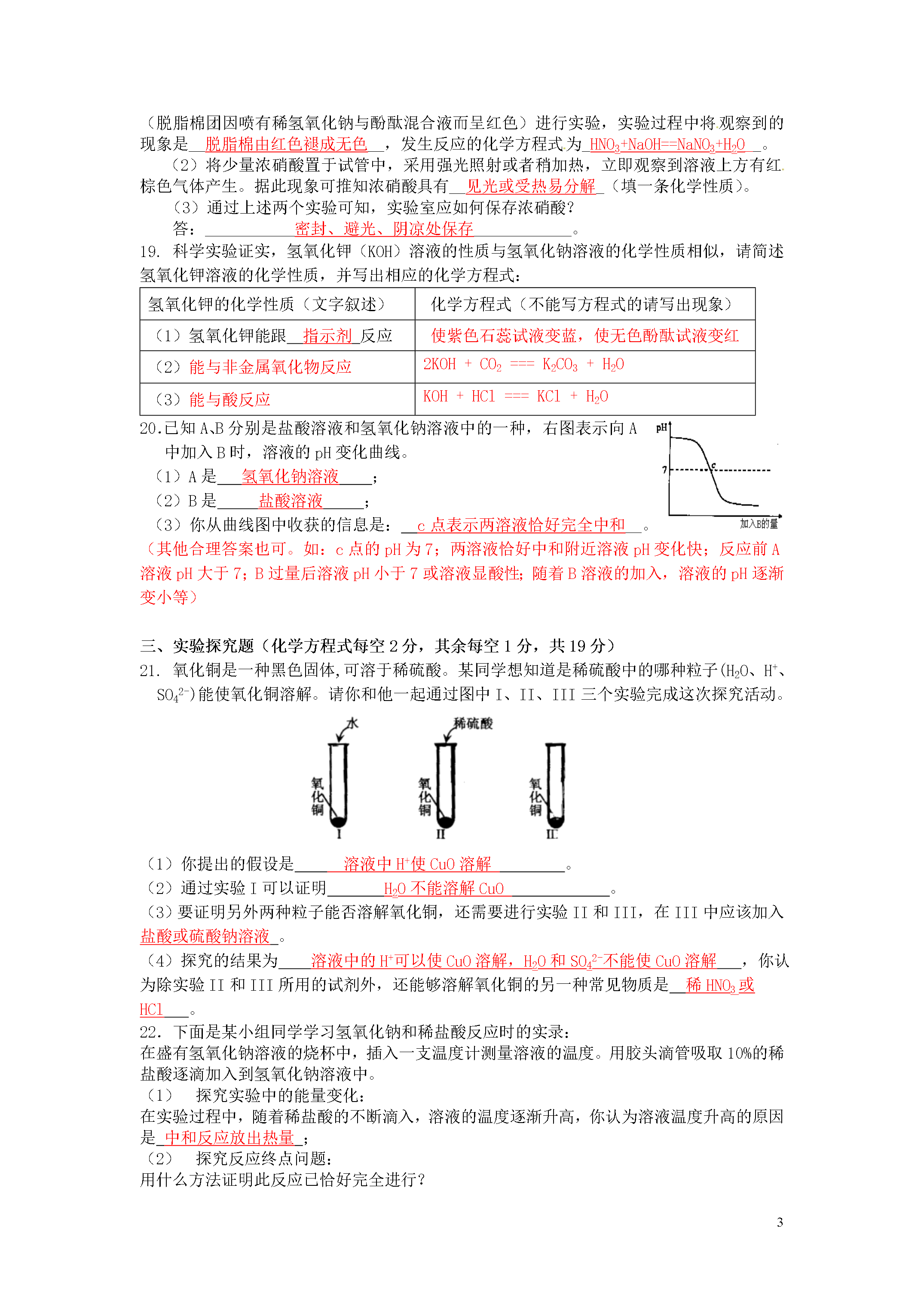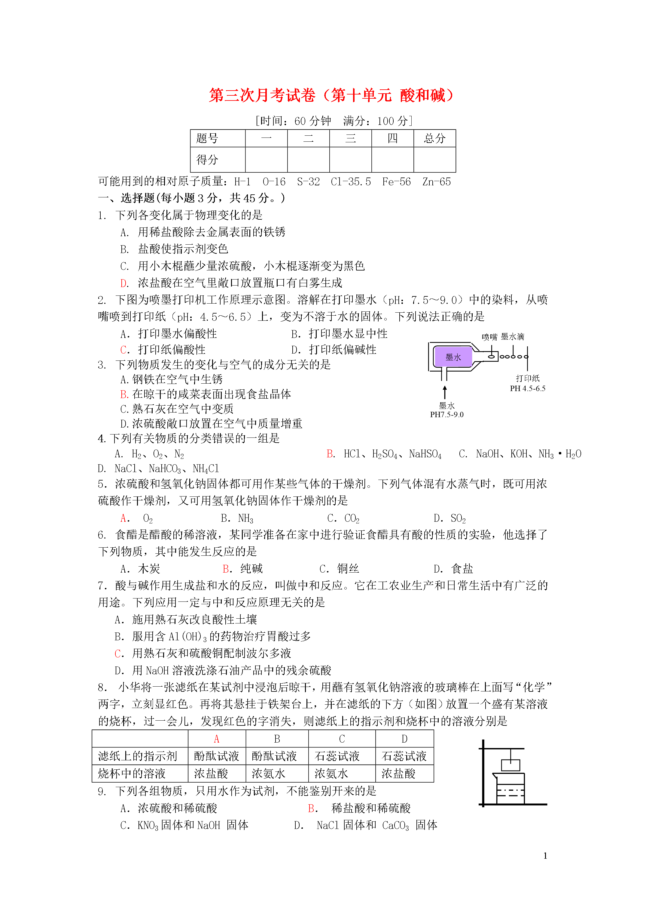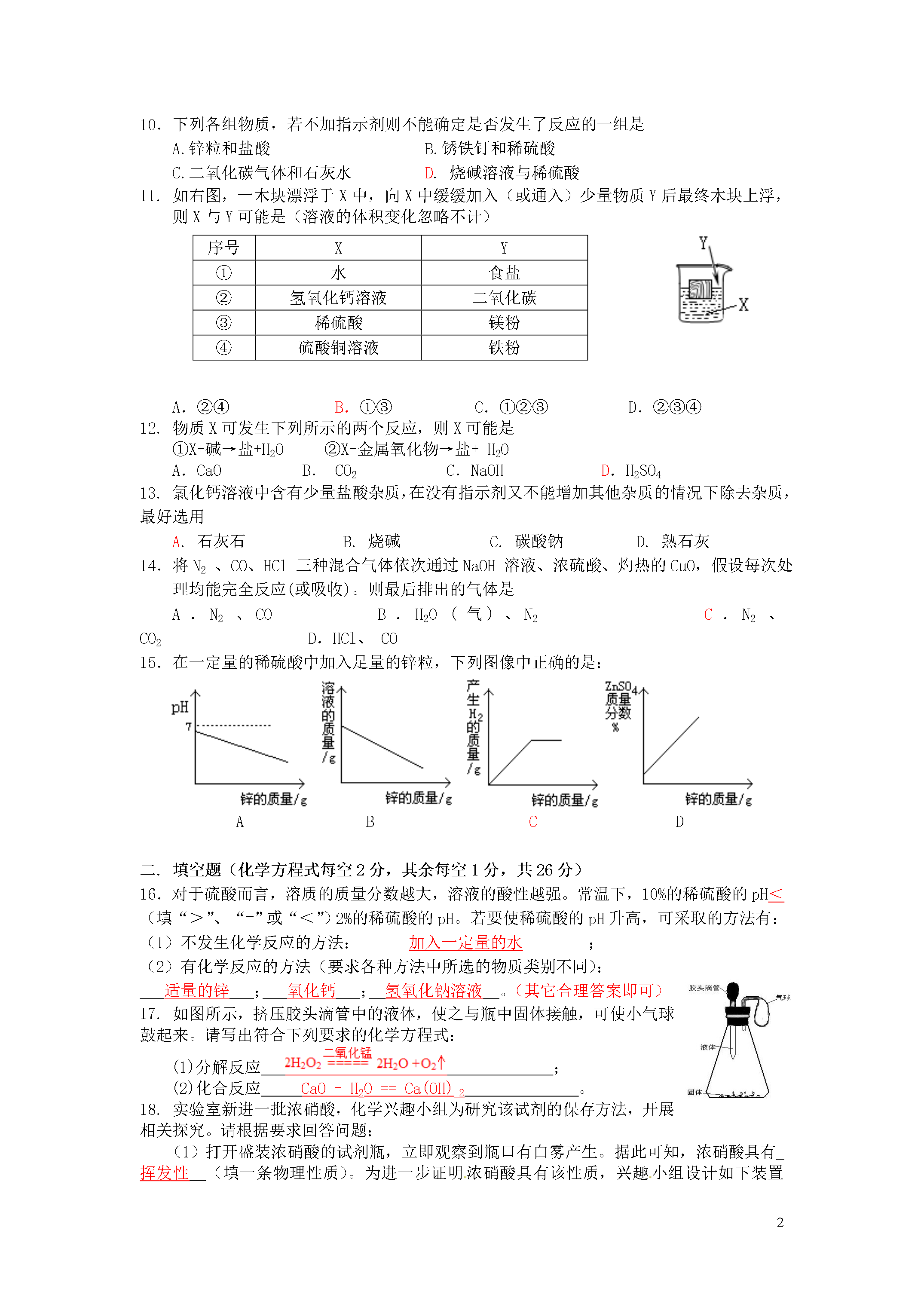 4第三次月考试卷(第十单元酸和碱)[时间:60分钟满分:100分]题号一二三四总分得分可能用到的相对原子质量:H-1O-16S-32Cl-35.5Fe-56Zn-65一、选择题(每小题3分,共45分。)1.下列各变化属于物理变化的是A.用稀盐酸除去金属表面的铁锈B.盐酸使指示剂变色C.用小木棍蘸少量浓硫酸,小木棍逐渐变为黑色D.浓盐酸在空气里敞口放置瓶口有白雾生成墨水墨水PH7.5-9.0喷嘴墨水滴打印纸PH4.5-6.52.下图为喷墨打印机工作原理示意图。溶解在打印墨水(pH:7.5~9.0)中的染料,从喷嘴喷到打印纸(pH:4.5~6.5)上,变为不溶于水的固体。下列说法正确的是A.打印墨水偏酸性B.打印墨水显中性C.打印纸偏酸性D.打印纸偏碱性3.下列物质发生的变化与空气的成分无关的是A.钢铁在空气中生锈B.在晾干的咸菜表面出现食盐晶体C.熟石灰在空气中变质D.浓硫酸敞口放置在空气中质量增重4.下列有关物质的分类错误的一组是A.H2、O2、N2B.HCl、H2SO4、NaHSO4C.NaOH、KOH、NH3·H2OD.NaCl、NaHCO3、NH4Cl5.浓硫酸和氢氧化钠固体都可用作某些气体的干燥剂。下列气体混有水蒸气时,既可用浓硫酸作干燥剂,又可用氢氧化钠固体作干燥剂的是A.O2B.NH3C.CO2D.SO26.食醋是醋酸的稀溶液,某同学准备在家中进行验证食醋具有酸的性质的实验,他选择了下列物质,其中能发生反应的是A.木炭B.纯碱C.铜丝D.食盐7.酸与碱作用生成盐和水的反应,叫做中和反应。它在工农业生产和日常生活中有广泛的用途。下列应用一定与中和反应原理无关的是A.施用熟石灰改良酸性土壤B.服用含Al(OH)3的药物治疗胃酸过多C.用熟石灰和硫酸铜配制波尔多液D.用NaOH溶液洗涤石油产品中的残余硫酸8.小华将一张滤纸在某试剂中浸泡后晾干,用蘸有氢氧化钠溶液的玻璃棒在上面写“化学”两字,立刻显红色。再将其悬挂于铁架台上,并在滤纸的下方(如图)放置一个盛有某溶液的烧杯,过一会儿,发现红色的字消失,则滤纸上的指示剂和烧杯中的溶液分别是ABCD滤纸上的指示剂酚酞试液酚酞试液石蕊试液石蕊试液烧杯中的溶液浓盐酸浓氨水浓氨水浓盐酸9.下列各组物质,只用水作为试剂,不能鉴别开来的是A.浓硫酸和稀硫酸B.稀盐酸和稀硫酸C.KNO3固体和NaOH固体D.NaCl固体和CaCO3固体10.下列各组物质,若不加指示剂则不能确定是否发生了反应的一组是A.锌粒和盐酸B.锈铁钉和稀硫酸C.二氧化碳气体和石灰水D.烧碱溶液与稀硫酸11.如右图,一木块漂浮于X中,向X中缓缓加入(或通入)少量物质Y后最终木块上浮,则X与Y可能是(溶液的体积变化忽略不计)序号XY①水食盐②氢氧化钙溶液二氧化碳③稀硫酸镁粉④硫酸铜溶液铁粉A.②④B.①③C.①②③D.②③④12.物质X可发生下列所示的两个反应,则X可能是①X+碱→盐+H2O②X+金属氧化物→盐+H2OA.CaOB.CO2C.NaOHD.H2SO413.氯化钙溶液中含有少量盐酸杂质,在没有指示剂又不能增加其他杂质的情况下除去杂质,最好选用A.石灰石B.烧碱C.碳酸钠D.熟石灰14.将N2、CO、HCl三种混合气体依次通过NaOH溶液、浓硫酸、灼热的CuO,假设每次处理均能完全反应(或吸收)。则最后排出的气体是A.N2、COB.H2O(气)、N2C.N2、CO2D.HCl、CO15.在一定量的稀硫酸中加入足量的锌粒,下列图像中正确的是:ABCD二.填空题(化学方程式每空2分,其余每空1分,共26分)16.对于硫酸而言,溶质的质量分数越大,溶液的酸性越强。常温下,10%的稀硫酸的pH<(填“>”、“=”或“<”)2%的稀硫酸的pH。若要使稀硫酸的pH升高,可采取的方法有:(1)不发生化学反应的方法:______加入一定量的水________;(2)有化学反应的方法(要求各种方法中所选的物质类别不同):___适量的锌___;___氧化钙___;__氢氧化钠溶液__。(其它合理答案即可)17.如图所示,挤压胶头滴管中的液体,使之与瓶中固体接触,可使小气球鼓起来。请写出符合下列要求的化学方程式:(1)分解反应;(2)化合反应CaO+H2O==Ca(OH)2。18.实验室新进一批浓硝酸,化学兴趣小组为研究该试剂的保存方法,开展相关探究。请根据要求回答问题:(1)打开盛装浓硝酸的试剂瓶,立即观察到瓶口有白雾产生。据此可知,浓硝酸具有_挥发性__(填一条物理性质)。为进一步证明浓硝酸具有该性质,兴趣小组设计如下装置(脱脂棉团因喷有稀氢氧化钠与酚酞混合液而呈红色)进行实验,实验过程中将观察到的现象是__脱脂棉由红色褪成无色__,发生反应的化学方程式为_HNO3+NaOH==NaNO3+H2O__。(2)将少量浓硝酸置于试管