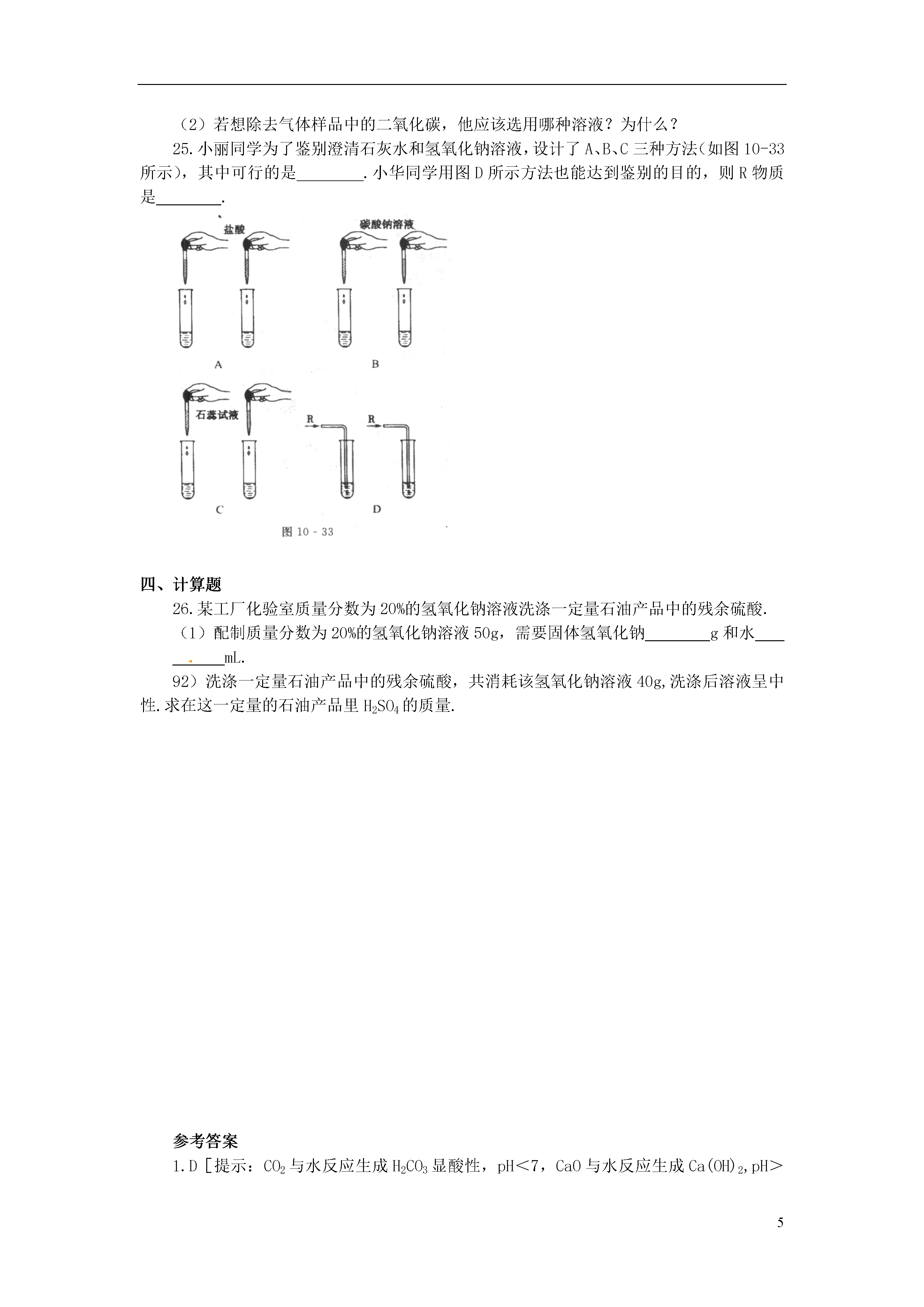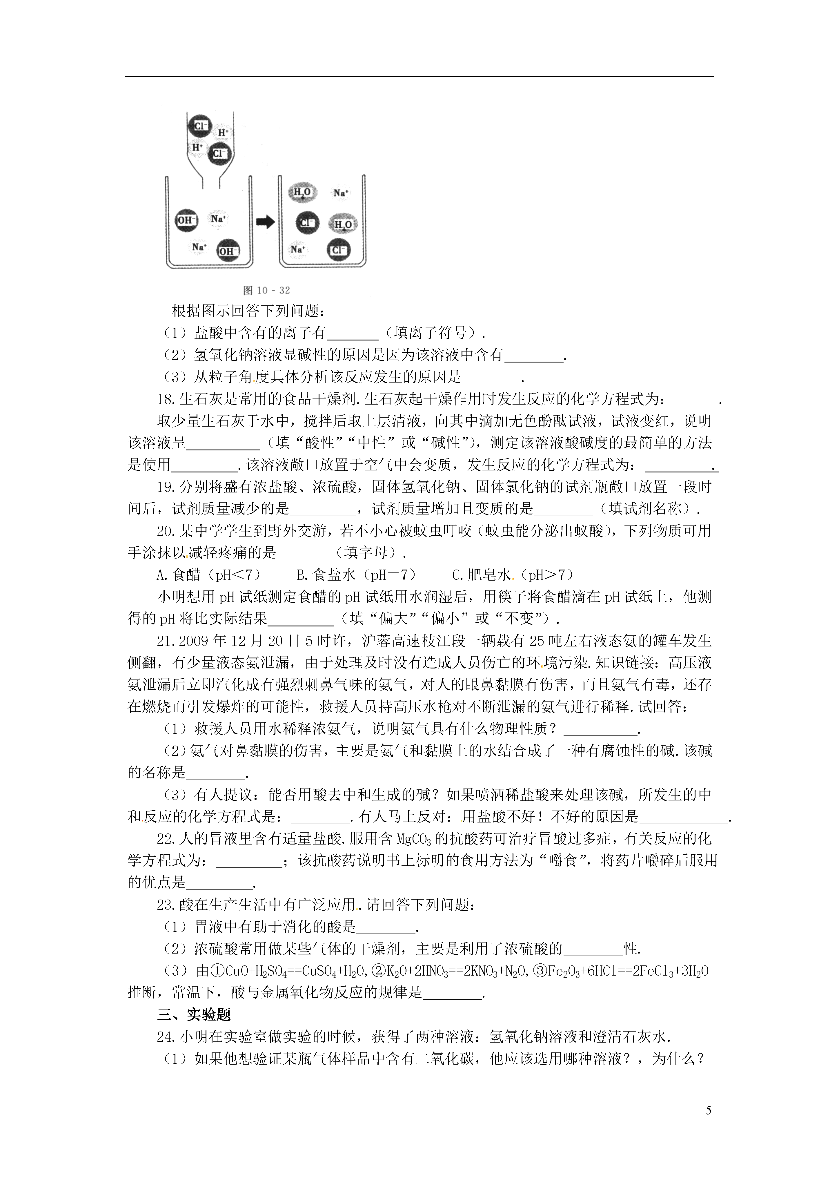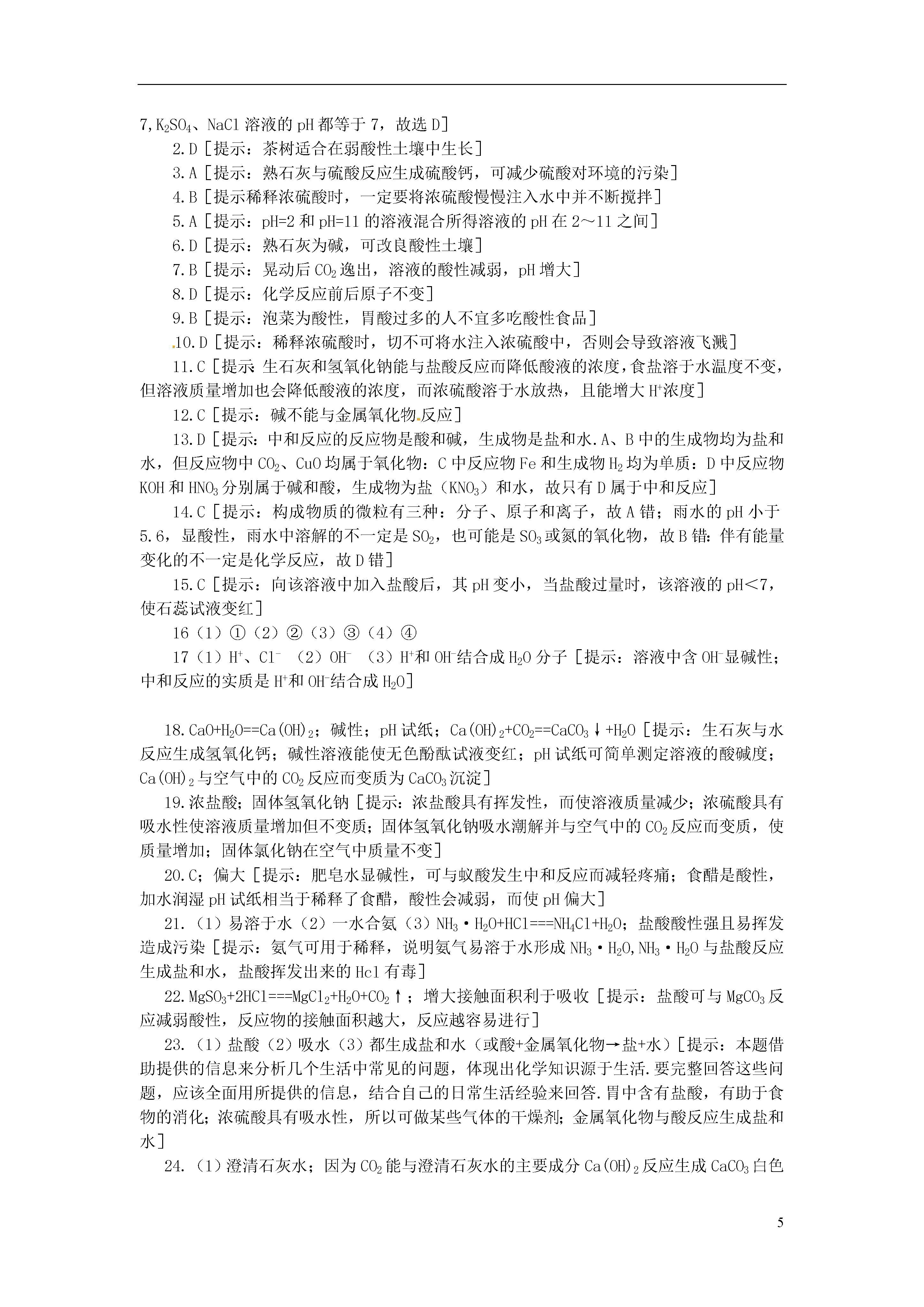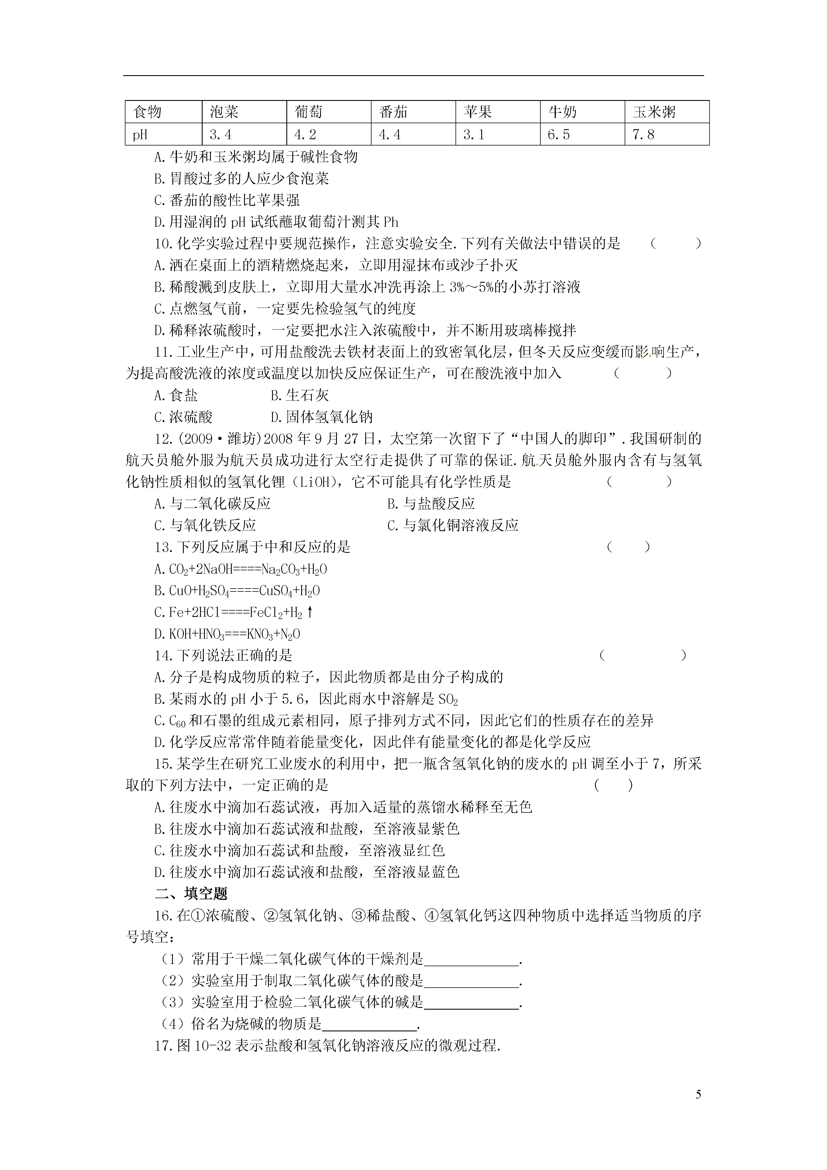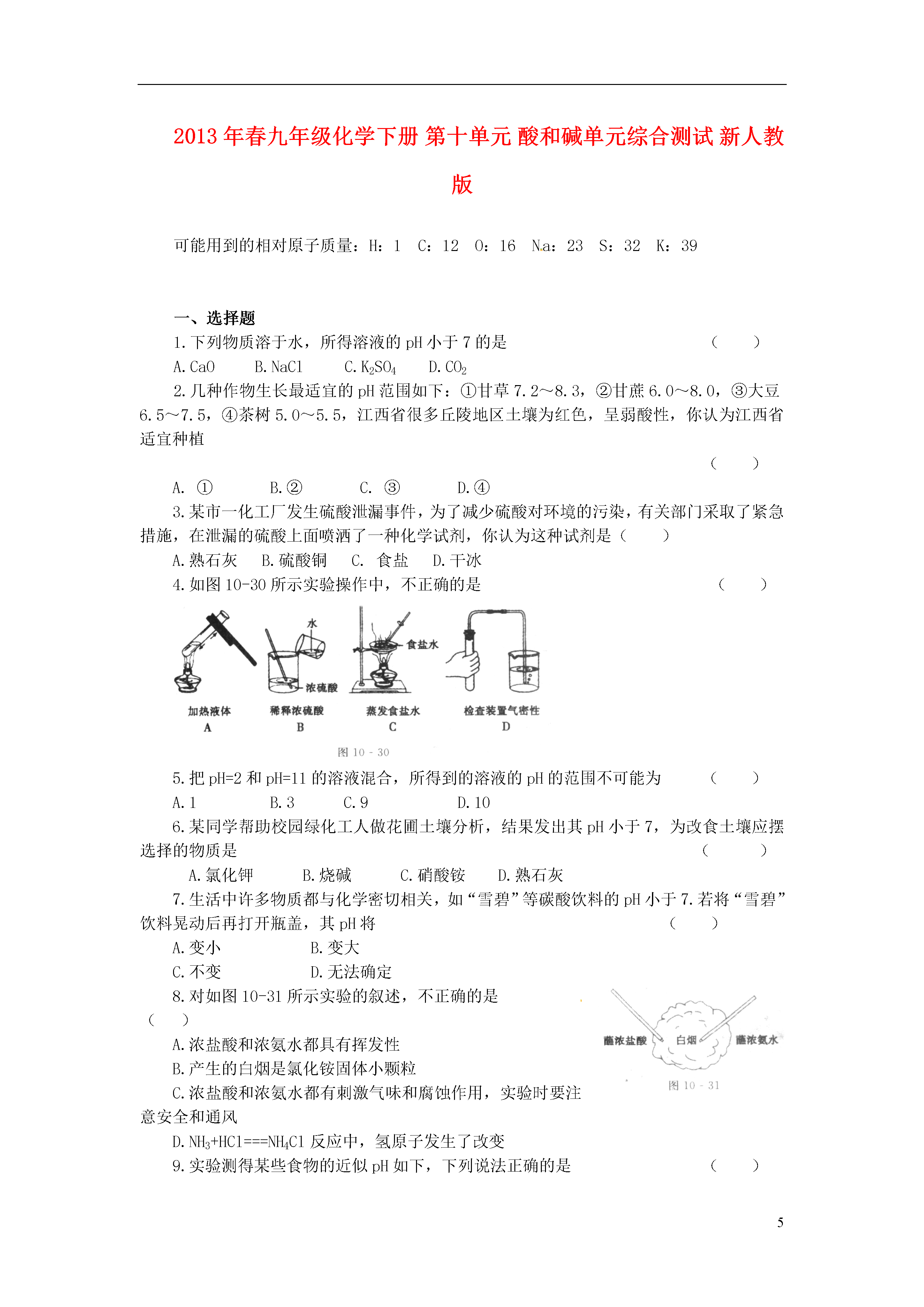 52013年春九年级化学下册第十单元酸和碱单元综合测试新人教版可能用到的相对原子质量:H:1C:12O:16Na:23S:32K:39一、选择题1.下列物质溶于水,所得溶液的pH小于7的是()A.CaOB.NaClC.K2SO4D.CO22.几种作物生长最适宜的pH范围如下:①甘草7.2~8.3,②甘蔗6.0~8.0,③大豆6.5~7.5,④茶树5.0~5.5,江西省很多丘陵地区土壤为红色,呈弱酸性,你认为江西省适宜种植()A.①B.②C.③D.④3.某市一化工厂发生硫酸泄漏事件,为了减少硫酸对环境的污染,有关部门采取了紧急措施,在泄漏的硫酸上面喷洒了一种化学试剂,你认为这种试剂是()A.熟石灰B.硫酸铜C.食盐D.干冰4.如图10-30所示实验操作中,不正确的是()5.把pH=2和pH=11的溶液混合,所得到的溶液的pH的范围不可能为()A.1B.3C.9D.106.某同学帮助校园绿化工人做花圃土壤分析,结果发出其pH小于7,为改食土壤应摆选择的物质是()A.氯化钾B.烧碱C.硝酸铵D.熟石灰7.生活中许多物质都与化学密切相关,如“雪碧”等碳酸饮料的pH小于7.若将“雪碧”饮料晃动后再打开瓶盖,其pH将()A.变小B.变大C.不变D.无法确定8.对如图10-31所示实验的叙述,不正确的是()A.浓盐酸和浓氨水都具有挥发性B.产生的白烟是氯化铵固体小颗粒C.浓盐酸和浓氨水都有刺激气味和腐蚀作用,实验时要注意安全和通风D.NH3+HCl===NH4Cl反应中,氢原子发生了改变9.实验测得某些食物的近似pH如下,下列说法正确的是()食物泡菜葡萄番茄苹果牛奶玉米粥pH3.44.24.43.16.57.8A.牛奶和玉米粥均属于碱性食物B.胃酸过多的人应少食泡菜C.番茄的酸性比苹果强D.用湿润的pH试纸蘸取葡萄汁测其Ph10.化学实验过程中要规范操作,注意实验安全.下列有关做法中错误的是()A.洒在桌面上的酒精燃烧起来,立即用湿抹布或沙子扑灭B.稀酸溅到皮肤上,立即用大量水冲洗再涂上3%~5%的小苏打溶液C.点燃氢气前,一定要先检验氢气的纯度D.稀释浓硫酸时,一定要把水注入浓硫酸中,并不断用玻璃棒搅拌11.工业生产中,可用盐酸洗去铁材表面上的致密氧化层,但冬天反应变缓而影响生产,为提高酸洗液的浓度或温度以加快反应保证生产,可在酸洗液中加入()A.食盐B.生石灰C.浓硫酸D.固体氢氧化钠12.(2009·潍坊)2008年9月27日,太空第一次留下了“中国人的脚印”.我国研制的航天员舱外服为航天员成功进行太空行走提供了可靠的保证.航天员舱外服内含有与氢氧化钠性质相似的氢氧化锂(LiOH),它不可能具有化学性质是()A.与二氧化碳反应B.与盐酸反应C.与氧化铁反应C.与氯化铜溶液反应13.下列反应属于中和反应的是()A.CO2+2NaOH====Na2CO3+H2OB.CuO+H2SO4====CuSO4+H2OC.Fe+2HCl====FeCl2+H2↑D.KOH+HNO3===KNO3+N2O14.下列说法正确的是()A.分子是构成物质的粒子,因此物质都是由分子构成的B.某雨水的pH小于5.6,因此雨水中溶解是SO2C.C60和石墨的组成元素相同,原子排列方式不同,因此它们的性质存在的差异D.化学反应常常伴随着能量变化,因此伴有能量变化的都是化学反应15.某学生在研究工业废水的利用中,把一瓶含氢氧化钠的废水的pH调至小于7,所采取的下列方法中,一定正确的是()A.往废水中滴加石蕊试液,再加入适量的蒸馏水稀释至无色B.往废水中滴加石蕊试液和盐酸,至溶液显紫色C.往废水中滴加石蕊试和盐酸,至溶液显红色D.往废水中滴加石蕊试液和盐酸,至溶液显蓝色二、填空题16.在①浓硫酸、②氢氧化钠、③稀盐酸、④氢氧化钙这四种物质中选择适当物质的序号填空:(1)常用于干燥二氧化碳气体的干燥剂是.(2)实验室用于制取二氧化碳气体的酸是.(3)实验室用于检验二氧化碳气体的碱是.(4)俗名为烧碱的物质是.17.图10-32表示盐酸和氢氧化钠溶液反应的微观过程.根据图示回答下列问题:(1)盐酸中含有的离子有(填离子符号).(2)氢氧化钠溶液显碱性的原因是因为该溶液中含有.(3)从粒子角度具体分析该反应发生的原因是.18.生石灰是常用的食品干燥剂.生石灰起干燥作用时发生反应的化学方程式为:.取少量生石灰于水中,搅拌后取上层清液,向其中滴加无色酚酞试液,试液变红,说明该溶液呈(填“酸性”“中性”或“碱性”),测定该溶液酸碱度的最简单的方法是使用.该溶液敞口放置于空气中会变质,发生反应的化学方程式为:.19.分别将盛
