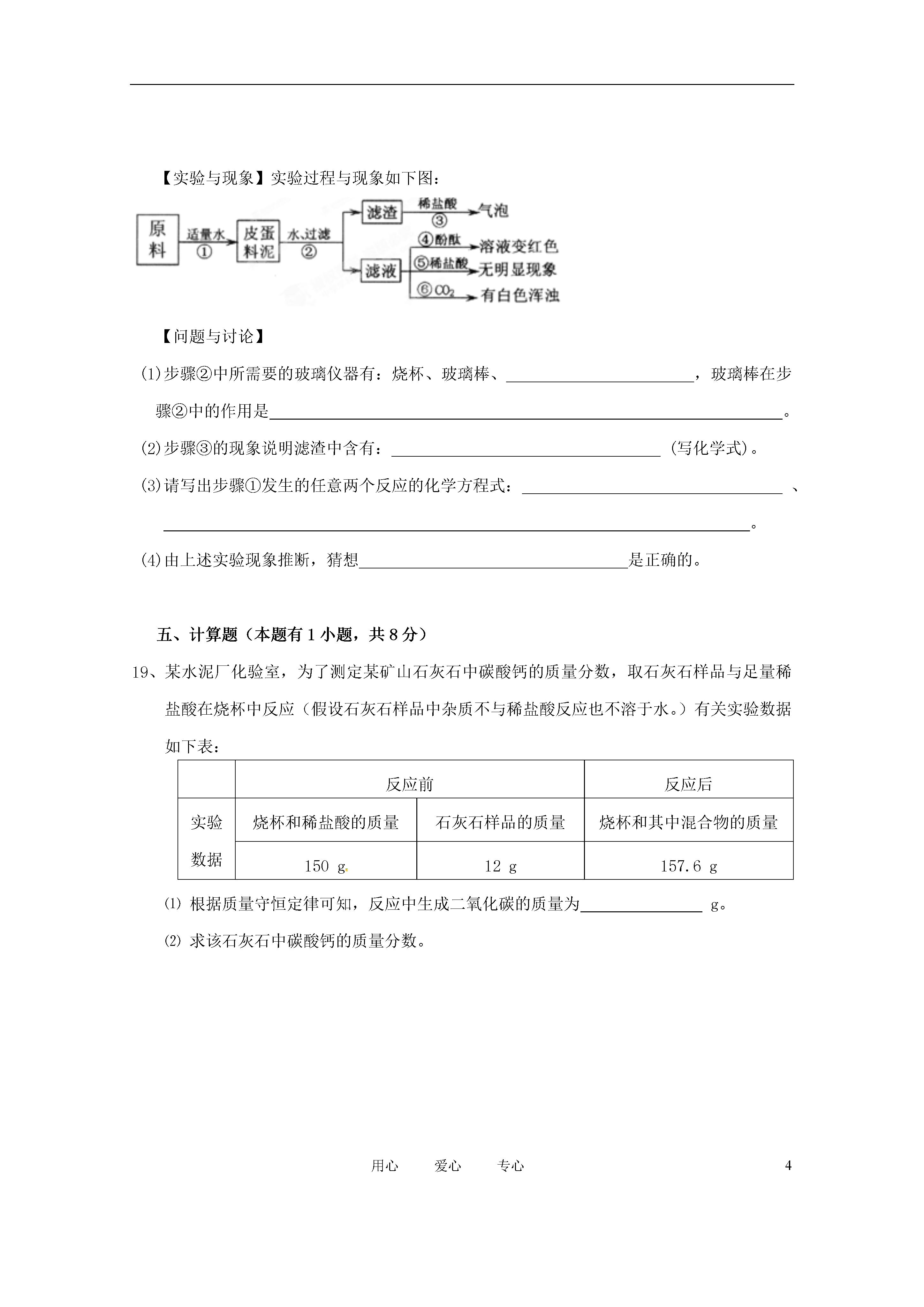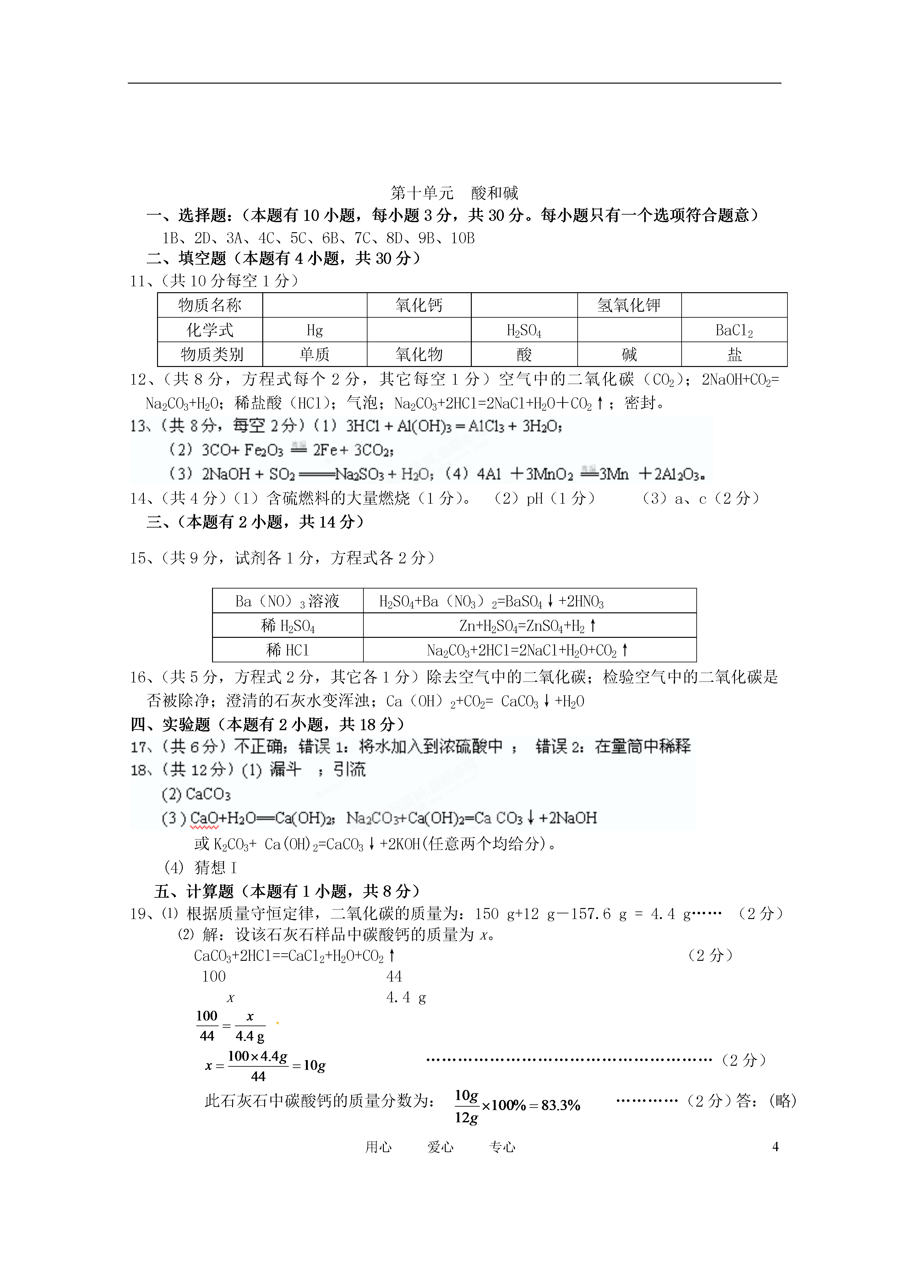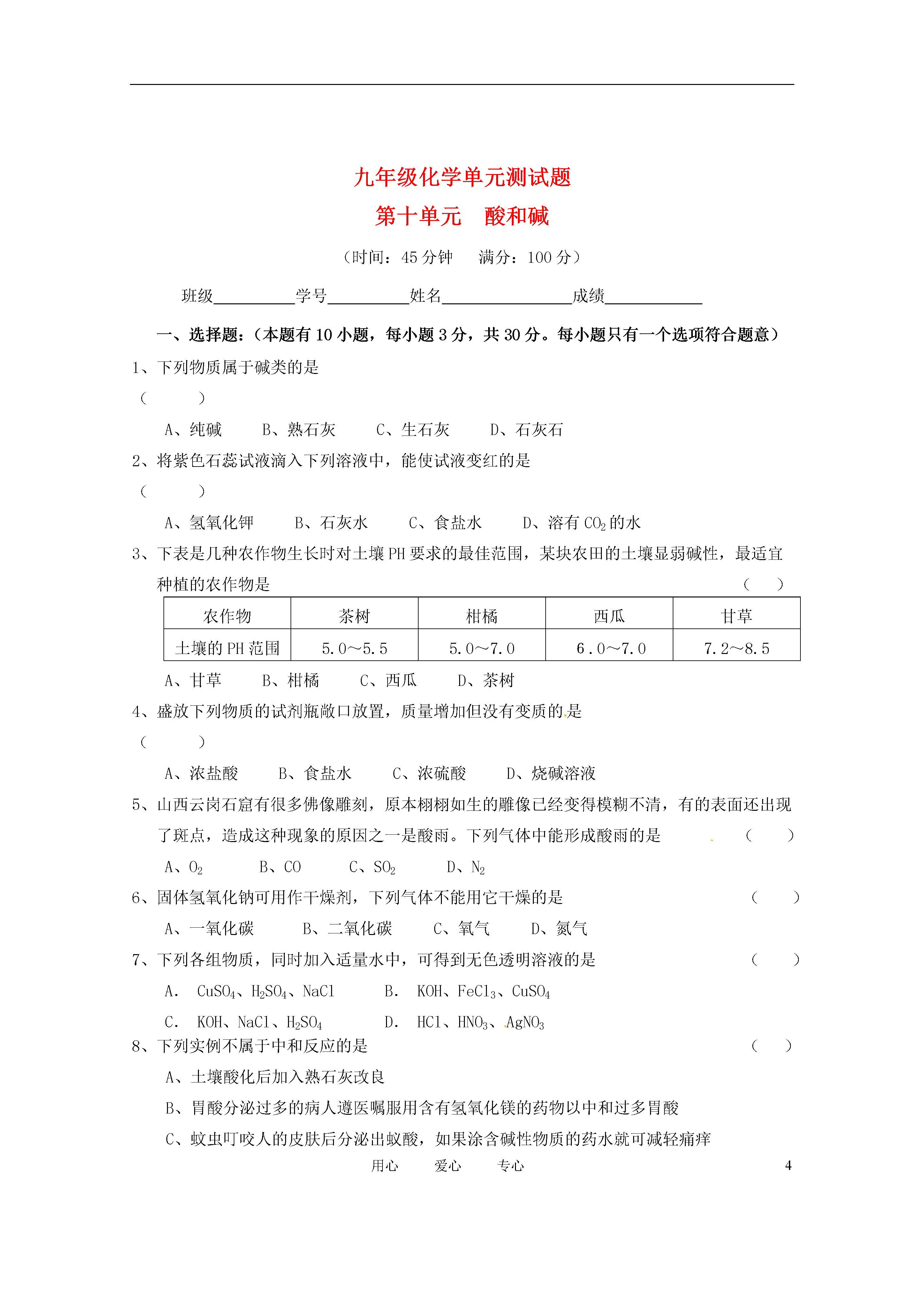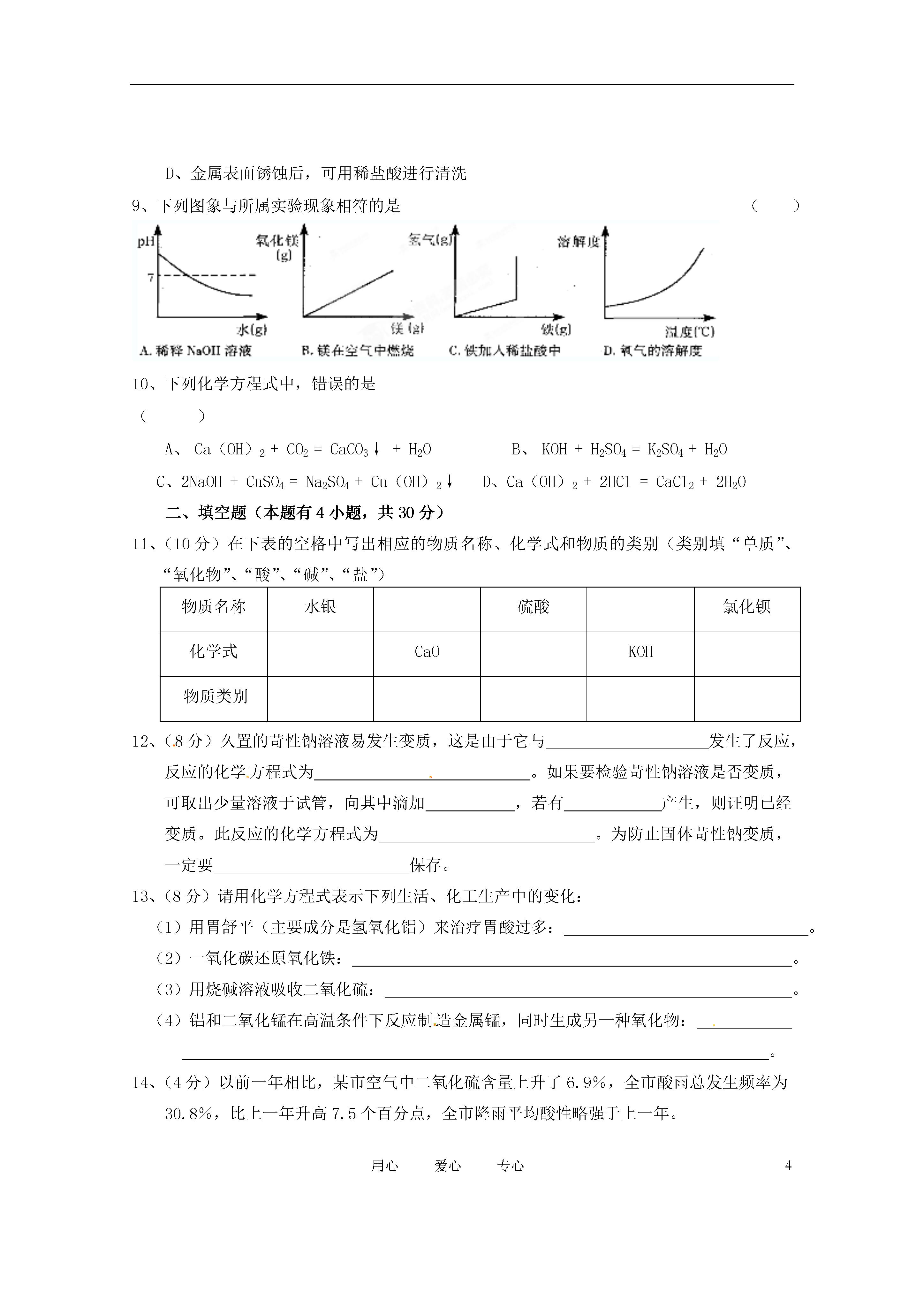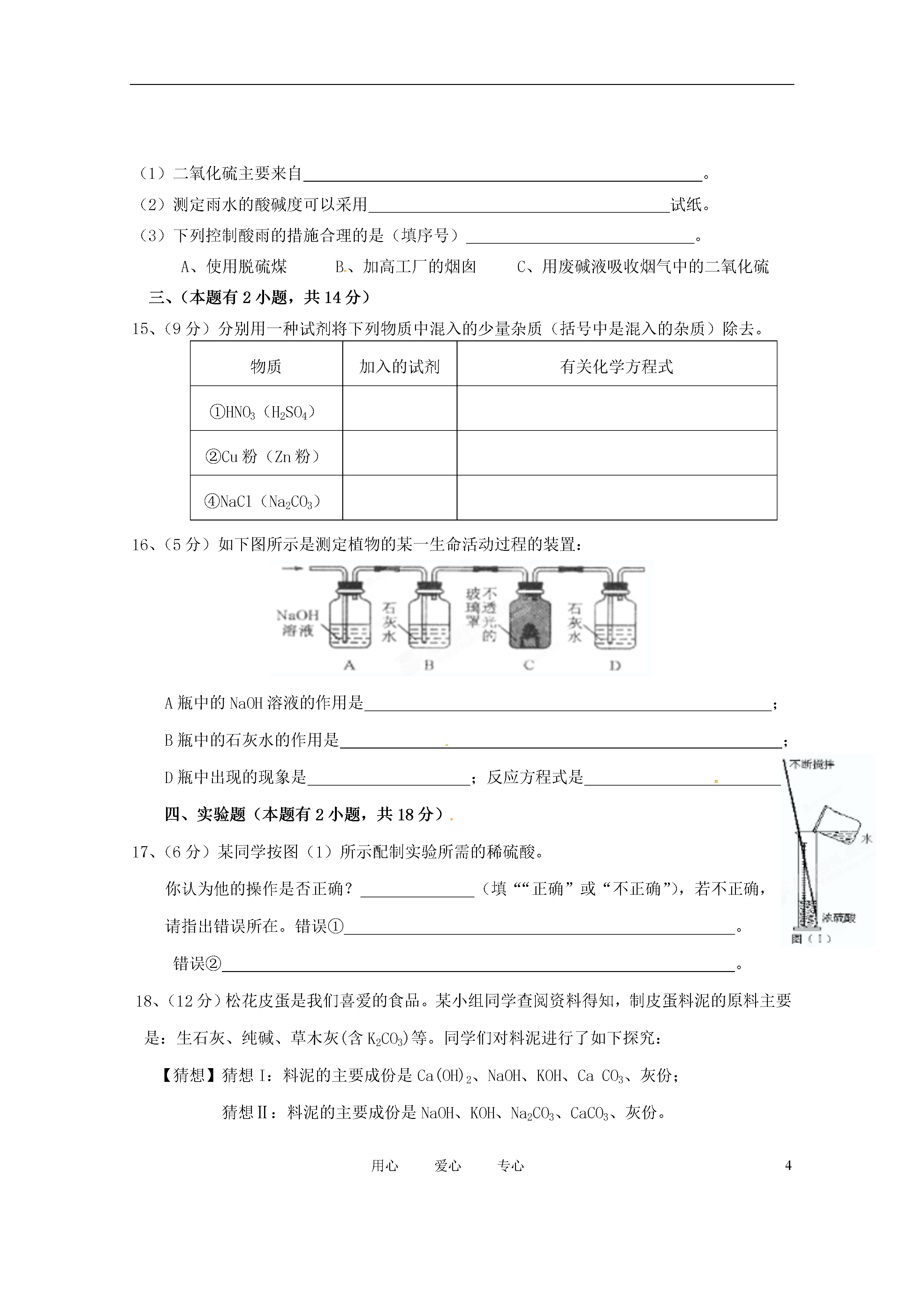 4用心爱心专心九年级化学单元测试题第十单元酸和碱(时间:45分钟满分:100分)班级学号姓名成绩一、选择题:(本题有10小题,每小题3分,共30分。每小题只有一个选项符合题意)1、下列物质属于碱类的是()A、纯碱B、熟石灰C、生石灰D、石灰石2、将紫色石蕊试液滴入下列溶液中,能使试液变红的是()A、氢氧化钾B、石灰水C、食盐水D、溶有CO2的水3、下表是几种农作物生长时对土壤PH要求的最佳范围,某块农田的土壤显弱碱性,最适宜种植的农作物是()农作物茶树柑橘西瓜甘草土壤的PH范围5.0~5.55.0~7.06.0~7.07.2~8.5A、甘草B、柑橘C、西瓜D、茶树4、盛放下列物质的试剂瓶敞口放置,质量增加但没有变质的是()A、浓盐酸B、食盐水C、浓硫酸D、烧碱溶液5、山西云岗石窟有很多佛像雕刻,原本栩栩如生的雕像已经变得模糊不清,有的表面还出现了斑点,造成这种现象的原因之一是酸雨。下列气体中能形成酸雨的是()A、O2B、COC、SO2D、N26、固体氢氧化钠可用作干燥剂,下列气体不能用它干燥的是()A、一氧化碳B、二氧化碳C、氧气D、氮气7、下列各组物质,同时加入适量水中,可得到无色透明溶液的是()A.CuSO4、H2SO4、NaClB.KOH、FeCl3、CuSO4C.KOH、NaCl、H2SO4D.HCl、HNO3、AgNO38、下列实例不属于中和反应的是()A、土壤酸化后加入熟石灰改良B、胃酸分泌过多的病人遵医嘱服用含有氢氧化镁的药物以中和过多胃酸C、蚊虫叮咬人的皮肤后分泌出蚁酸,如果涂含碱性物质的药水就可减轻痛痒D、金属表面锈蚀后,可用稀盐酸进行清洗9、下列图象与所属实验现象相符的是()10、下列化学方程式中,错误的是()A、Ca(OH)2+CO2=CaCO3↓+H2OB、KOH+H2SO4=K2SO4+H2OC、2NaOH+CuSO4=Na2SO4+Cu(OH)2↓D、Ca(OH)2+2HCl=CaCl2+2H2O二、填空题(本题有4小题,共30分)11、(10分)在下表的空格中写出相应的物质名称、化学式和物质的类别(类别填“单质”、“氧化物”、“酸”、“碱”、“盐”)物质名称水银硫酸氯化钡化学式CaOKOH物质类别12、(8分)久置的苛性钠溶液易发生变质,这是由于它与发生了反应,反应的化学方程式为。如果要检验苛性钠溶液是否变质,可取出少量溶液于试管,向其中滴加,若有产生,则证明已经变质。此反应的化学方程式为。为防止固体苛性钠变质,一定要保存。13、(8分)请用化学方程式表示下列生活、化工生产中的变化:(1)用胃舒平(主要成分是氢氧化铝)来治疗胃酸过多:。(2)一氧化碳还原氧化铁:。(3)用烧碱溶液吸收二氧化硫:。(4)铝和二氧化锰在高温条件下反应制造金属锰,同时生成另一种氧化物:。14、(4分)以前一年相比,某市空气中二氧化硫含量上升了6.9%,全市酸雨总发生频率为30.8%,比上一年升高7.5个百分点,全市降雨平均酸性略强于上一年。(1)二氧化硫主要来自。(2)测定雨水的酸碱度可以采用试纸。(3)下列控制酸雨的措施合理的是(填序号)。A、使用脱硫煤B、加高工厂的烟囱C、用废碱液吸收烟气中的二氧化硫三、(本题有2小题,共14分)15、(9分)分别用一种试剂将下列物质中混入的少量杂质(括号中是混入的杂质)除去。物质加入的试剂有关化学方程式①HNO3(H2SO4)②Cu粉(Zn粉)④NaCl(Na2CO3)16、(5分)如下图所示是测定植物的某一生命活动过程的装置:A瓶中的NaOH溶液的作用是;B瓶中的石灰水的作用是;D瓶中出现的现象是;反应方程式是。四、实验题(本题有2小题,共18分)17、(6分)某同学按图(1)所示配制实验所需的稀硫酸。你认为他的操作是否正确?(填““正确”或“不正确”),若不正确,请指出错误所在。错误①。错误②。18、(12分)松花皮蛋是我们喜爱的食品。某小组同学查阅资料得知,制皮蛋料泥的原料主要是:生石灰、纯碱、草木灰(含K2CO3)等。同学们对料泥进行了如下探究:【猜想】猜想I:料泥的主要成份是Ca(OH)2、NaOH、KOH、CaCO3、灰份;猜想Ⅱ:料泥的主要成份是NaOH、KOH、Na2CO3、CaCO3、灰份。【实验与现象】实验过程与现象如下图:【问题与讨论】(1)步骤②中所需要的玻璃仪器有:烧杯、玻璃棒、,玻璃棒在步骤②中的作用是。(2)步骤③的现象说明滤渣中含有:(写化学式)。(3)请写出步骤①发生的任意两个反应的化学方程式:、。(4)由上述实验现象推断,猜想是正确的。五、计算题(本题有1小题,共8分)19、某水