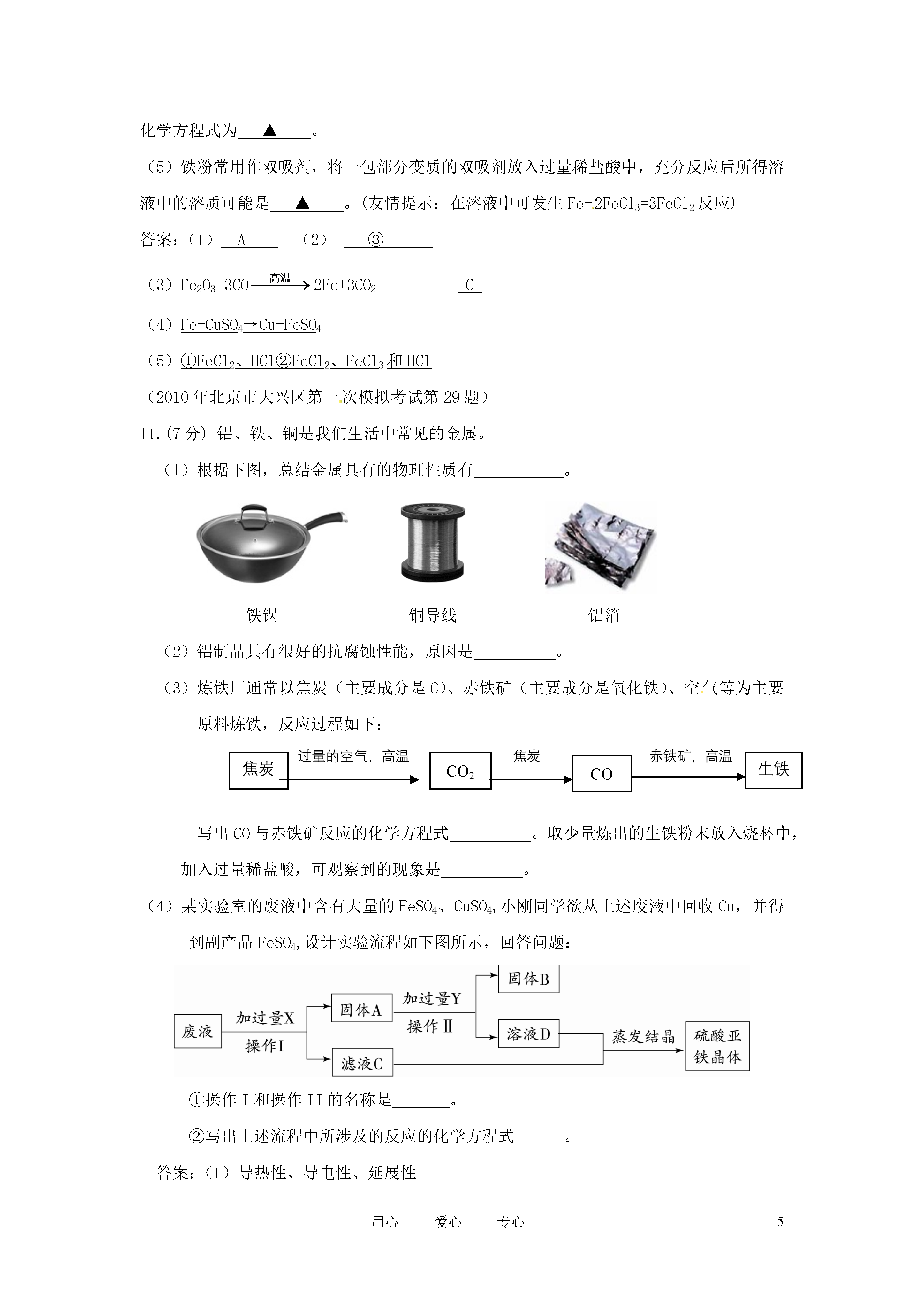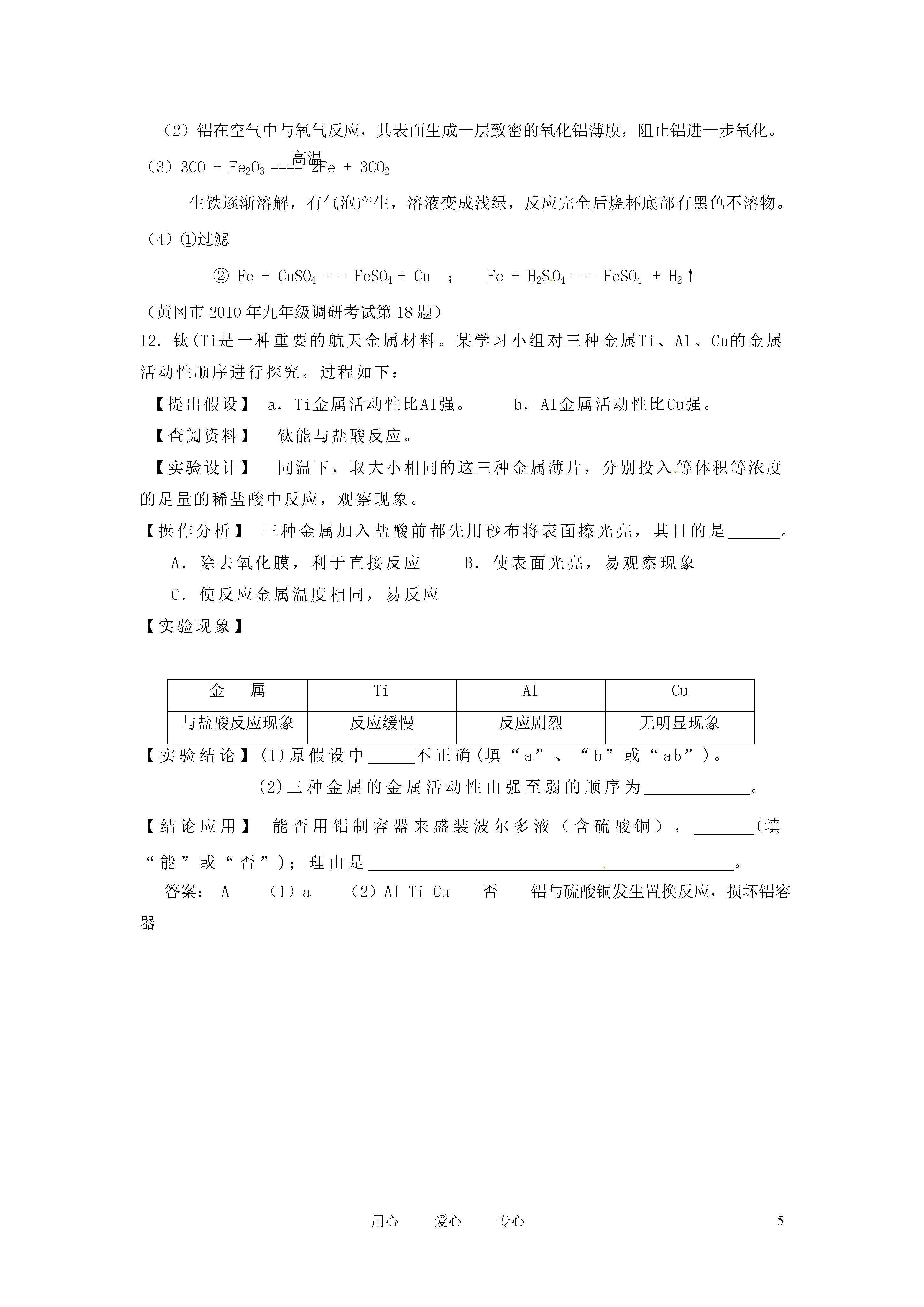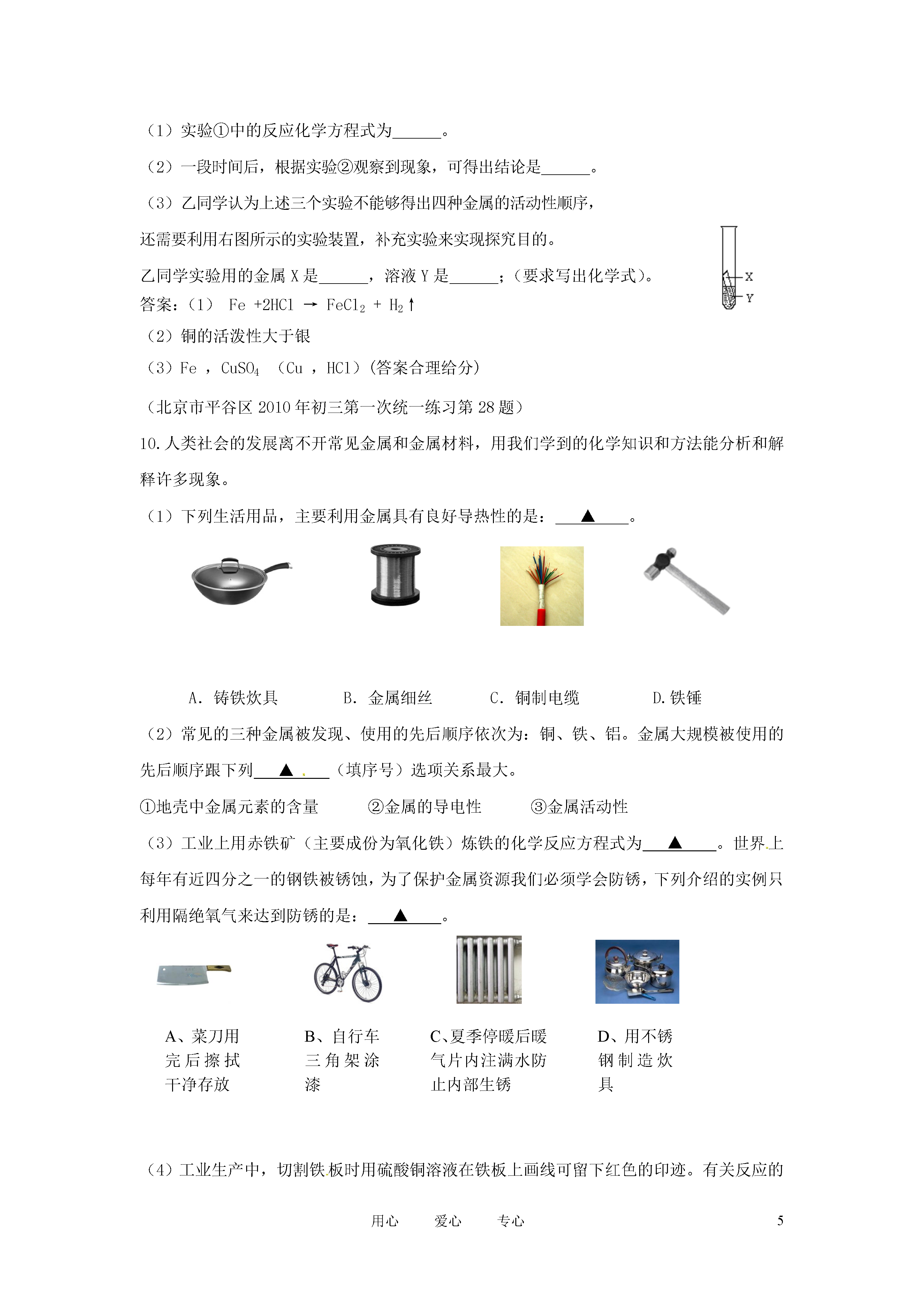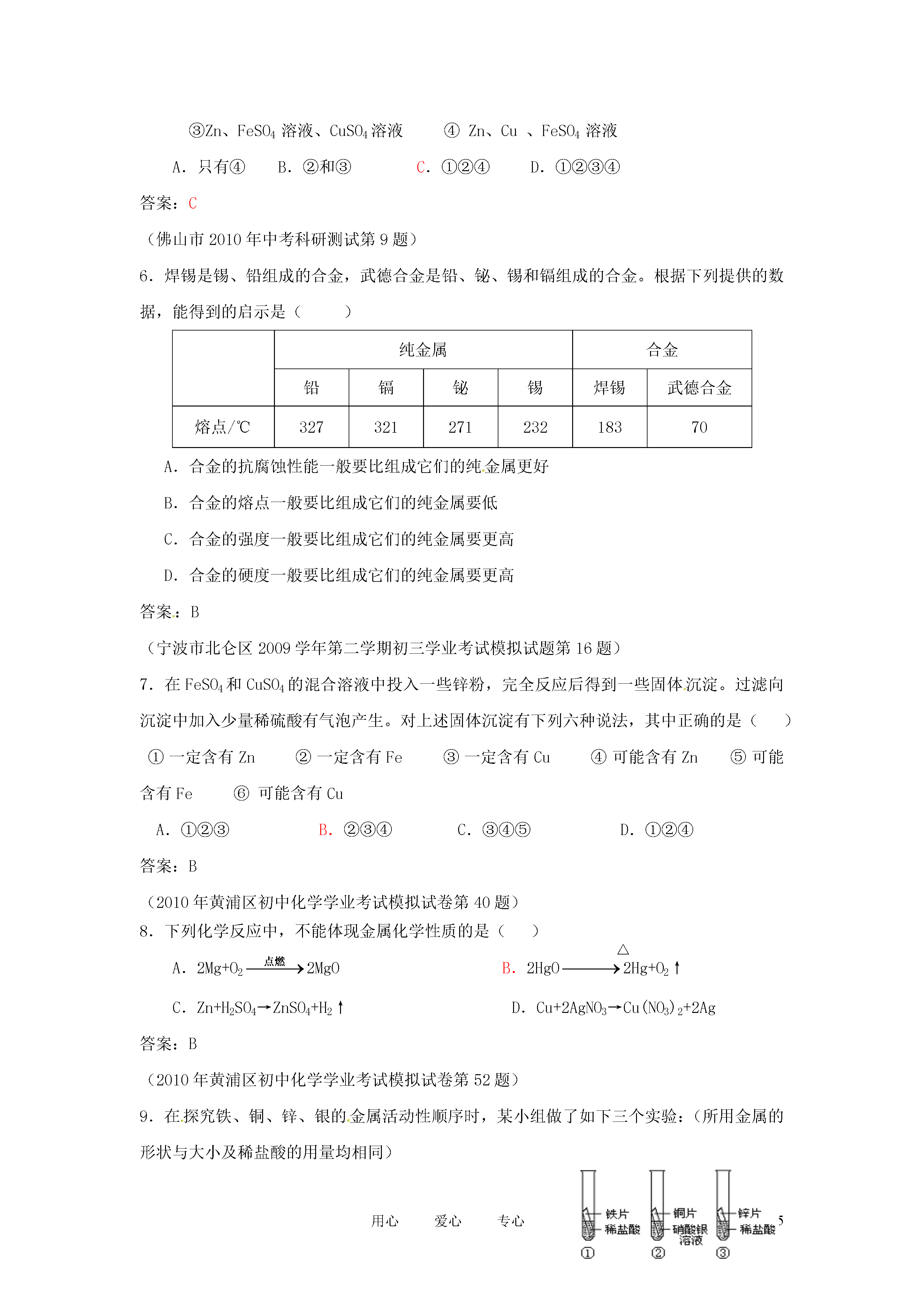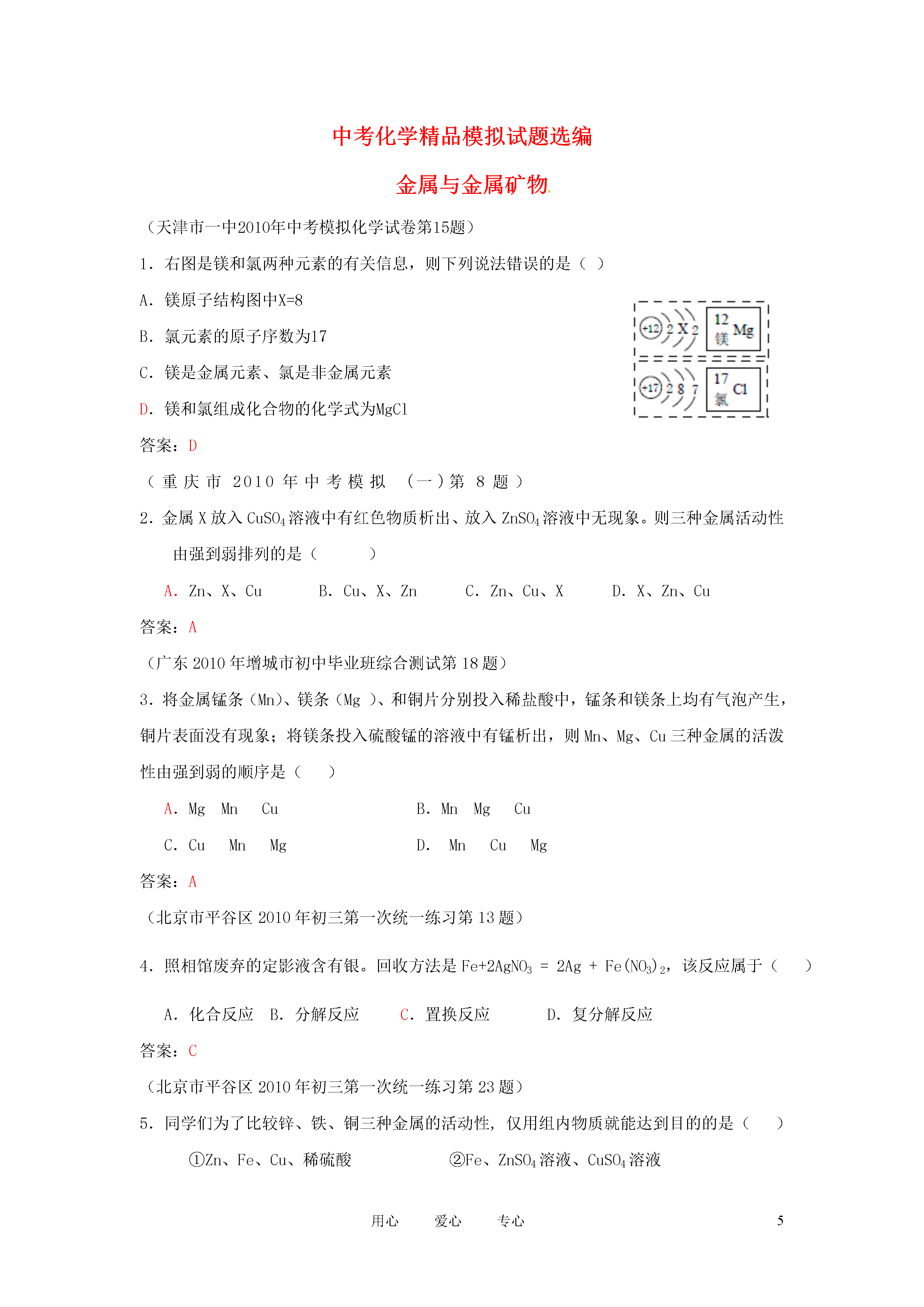 5用心爱心专心中考化学精品模拟试题选编金属与金属矿物(天津市一中2010年中考模拟化学试卷第15题)1.右图是镁和氯两种元素的有关信息,则下列说法错误的是()A.镁原子结构图中X=8B.氯元素的原子序数为17C.镁是金属元素、氯是非金属元素D.镁和氯组成化合物的化学式为MgCl答案:D(重庆市2010年中考模拟(一)第8题)2.金属X放入CuSO4溶液中有红色物质析出、放入ZnSO4溶液中无现象。则三种金属活动性由强到弱排列的是()A.Zn、X、CuB.Cu、X、ZnC.Zn、Cu、XD.X、Zn、Cu答案:A(广东2010年增城市初中毕业班综合测试第18题)3.将金属锰条(Mn)、镁条(Mg)、和铜片分别投入稀盐酸中,锰条和镁条上均有气泡产生,铜片表面没有现象;将镁条投入硫酸锰的溶液中有锰析出,则Mn、Mg、Cu三种金属的活泼性由强到弱的顺序是()A.MgMnCuB.MnMgCuC.CuMnMgD.MnCuMg答案:A(北京市平谷区2010年初三第一次统一练习第13题)4.照相馆废弃的定影液含有银。回收方法是Fe+2AgNO3=2Ag+Fe(NO3)2,该反应属于()A.化合反应B.分解反应C.置换反应D.复分解反应答案:C(北京市平谷区2010年初三第一次统一练习第23题)5.同学们为了比较锌、铁、铜三种金属的活动性,仅用组内物质就能达到目的的是()①Zn、Fe、Cu、稀硫酸②Fe、ZnSO4溶液、CuSO4溶液③Zn、FeSO4溶液、CuSO4溶液④Zn、Cu、FeSO4溶液A.只有④B.②和③C.①②④D.①②③④答案:C(佛山市2010年中考科研测试第9题)6.焊锡是锡、铅组成的合金,武德合金是铅、铋、锡和镉组成的合金。根据下列提供的数据,能得到的启示是()纯金属合金铅镉铋锡焊锡武德合金熔点/℃32732127123218370A.合金的抗腐蚀性能一般要比组成它们的纯金属更好B.合金的熔点一般要比组成它们的纯金属要低C.合金的强度一般要比组成它们的纯金属要更高D.合金的硬度一般要比组成它们的纯金属要更高答案:B(宁波市北仑区2009学年第二学期初三学业考试模拟试题第16题)7.在FeSO4和CuSO4的混合溶液中投入一些锌粉,完全反应后得到一些固体沉淀。过滤向沉淀中加入少量稀硫酸有气泡产生。对上述固体沉淀有下列六种说法,其中正确的是()①一定含有Zn②一定含有Fe③一定含有Cu④可能含有Zn⑤可能含有Fe⑥可能含有CuA.①②③B.②③④C.③④⑤D.①②④答案:B(2010年黄浦区初中化学学业考试模拟试卷第40题)△8.下列化学反应中,不能体现金属化学性质的是()A.2Mg+O22MgOB.2HgO2Hg+O2↑C.Zn+H2SO4→ZnSO4+H2↑D.Cu+2AgNO3→Cu(NO3)2+2Ag答案:B(2010年黄浦区初中化学学业考试模拟试卷第52题)9.在探究铁、铜、锌、银的金属活动性顺序时,某小组做了如下三个实验:(所用金属的形状与大小及稀盐酸的用量均相同)(1)实验①中的反应化学方程式为。(2)一段时间后,根据实验②观察到现象,可得出结论是。(3)乙同学认为上述三个实验不能够得出四种金属的活动性顺序,还需要利用右图所示的实验装置,补充实验来实现探究目的。乙同学实验用的金属X是,溶液Y是;(要求写出化学式)。答案:(1)Fe+2HCl→FeCl2+H2↑(2)铜的活泼性大于银(3)Fe,CuSO4(Cu,HCl)(答案合理给分)(北京市平谷区2010年初三第一次统一练习第28题)10.人类社会的发展离不开常见金属和金属材料,用我们学到的化学知识和方法能分析和解释许多现象。(1)下列生活用品,主要利用金属具有良好导热性的是:___▲____。A.铸铁炊具B.金属细丝C.铜制电缆D.铁锤(2)常见的三种金属被发现、使用的先后顺序依次为:铜、铁、铝。金属大规模被使用的先后顺序跟下列___▲____(填序号)选项关系最大。①地壳中金属元素的含量②金属的导电性③金属活动性(3)工业上用赤铁矿(主要成份为氧化铁)炼铁的化学反应方程式为___▲____。世界上每年有近四分之一的钢铁被锈蚀,为了保护金属资源我们必须学会防锈,下列介绍的实例只利用隔绝氧气来达到防锈的是:___▲____。C、夏季停暖后暖气片内注满水防止内部生锈D、用不锈钢制造炊具B、自行车三角架涂漆A、菜刀用完后擦拭干净存放(4)工业生产中,切割铁板时用硫酸铜溶液在铁板上画线可留下红色的印迹。有关反应的化学方程式为___▲____。(5)铁粉常用作双吸剂,将一包部分变质的双吸剂放入过量