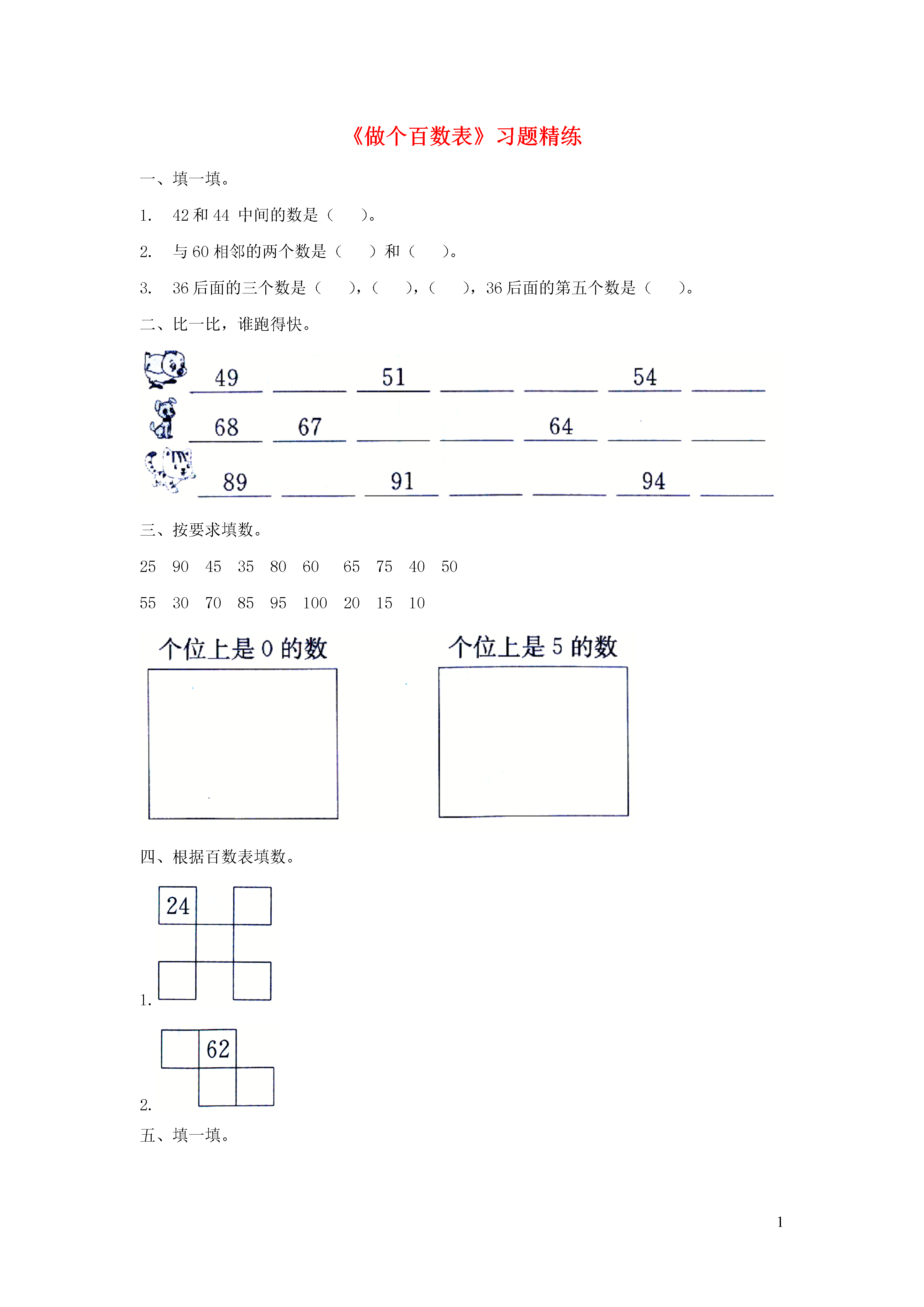 1《做个百数表》习题精练一、填一填。42和44中间的数是()。与60相邻的两个数是()和()。36后面的三个数是(),(),(),36后面的第五个数是()。二、比一比,谁跑得快。三、按要求填数。259045358060657540505530708595100201510四、根据百数表填数。1.2.五、填一填。1.2.六、找规律填数。