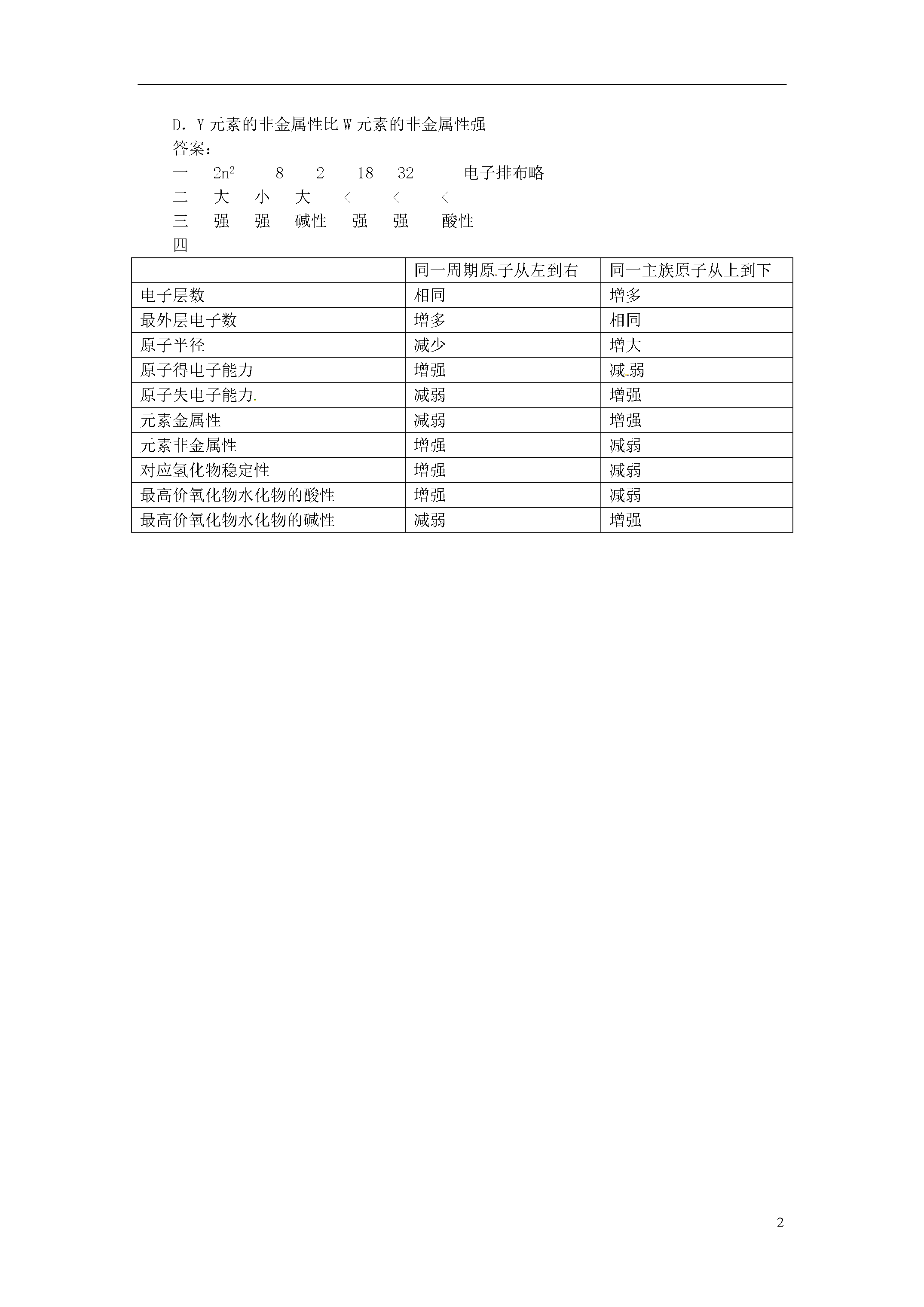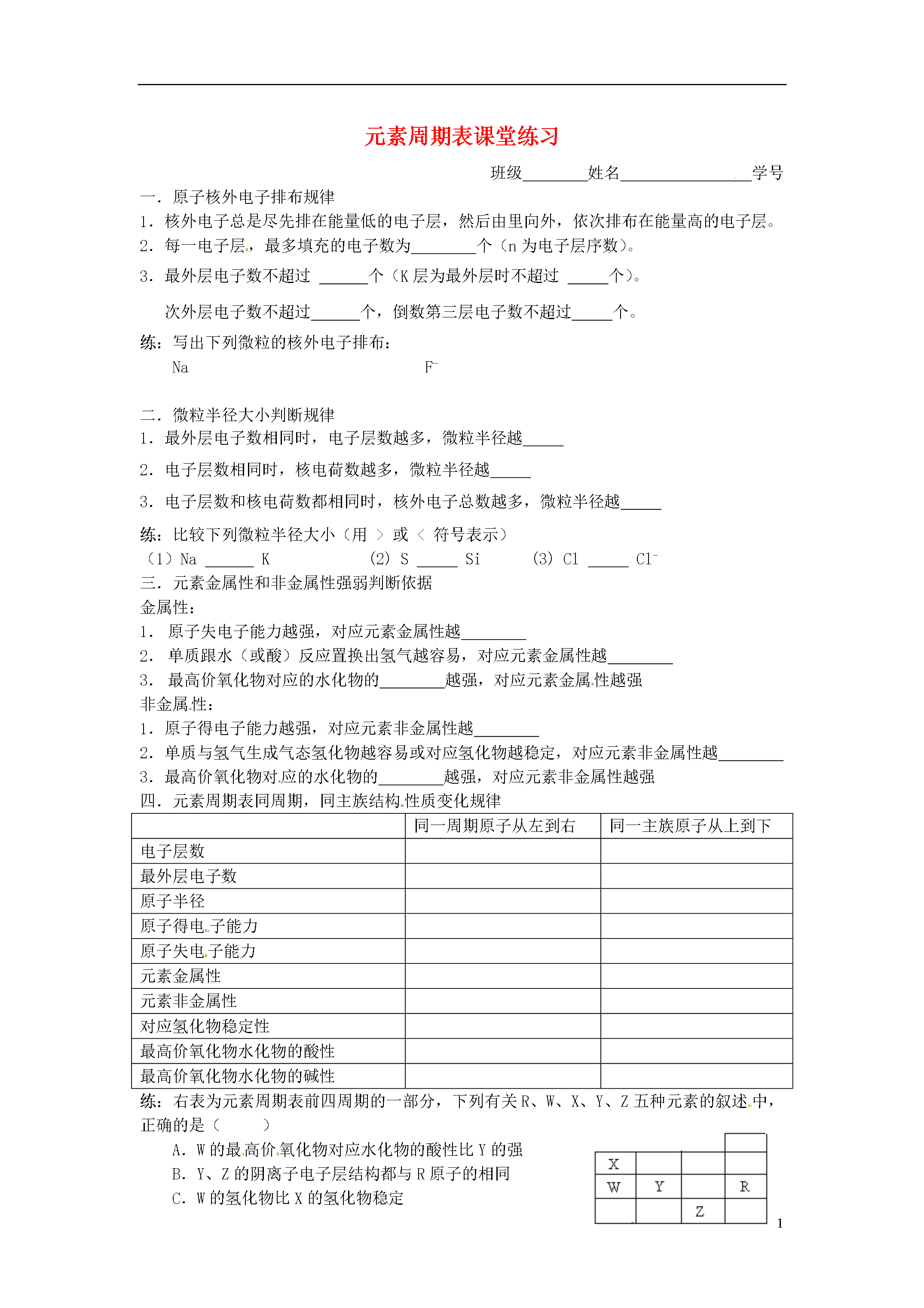 2元素周期表课堂练习班级姓名学号一.原子核外电子排布规律1.核外电子总是尽先排在能量低的电子层,然后由里向外,依次排布在能量高的电子层。2.每一电子层,最多填充的电子数为个(n为电子层序数)。3.最外层电子数不超过个(K层为最外层时不超过个)。次外层电子数不超过个,倒数第三层电子数不超过个。练:写出下列微粒的核外电子排布:NaF-二.微粒半径大小判断规律1.最外层电子数相同时,电子层数越多,微粒半径越2.电子层数相同时,核电荷数越多,微粒半径越3.电子层数和核电荷数都相同时,核外电子总数越多,微粒半径越练:比较下列微粒半径大小(用>或<符号表示)(1)NaK(2)SSi(3)ClCl-三.元素金属性和非金属性强弱判断依据金属性:原子失电子能力越强,对应元素金属性越单质跟水(或酸)反应置换出氢气越容易,对应元素金属性越最高价氧化物对应的水化物的越强,对应元素金属性越强非金属性:1.原子得电子能力越强,对应元素非金属性越2.单质与氢气生成气态氢化物越容易或对应氢化物越稳定,对应元素非金属性越3.最高价氧化物对应的水化物的越强,对应元素非金属性越强四.元素周期表同周期,同主族结构性质变化规律同一周期原子从左到右同一主族原子从上到下电子层数最外层电子数原子半径原子得电子能力原子失电子能力元素金属性元素非金属性对应氢化物稳定性最高价氧化物水化物的酸性最高价氧化物水化物的碱性练:右表为元素周期表前四周期的一部分,下列有关R、W、X、Y、Z五种元素的叙述中,正确的是()A.W的最高价氧化物对应水化物的酸性比Y的强B.Y、Z的阴离子电子层结构都与R原子的相同C.W的氢化物比X的氢化物稳定D.Y元素的非金属性比W元素的非金属性强答案:一2n2821832电子排布略二大小大<<<三强强碱性强强酸性四同一周期原子从左到右同一主族原子从上到下电子层数相同增多最外层电子数增多相同原子半径减少增大原子得电子能力增强减弱原子失电子能力减弱增强元素金属性减弱增强元素非金属性增强减弱对应氢化物稳定性增强减弱最高价氧化物水化物的酸性增强减弱最高价氧化物水化物的碱性减弱增强