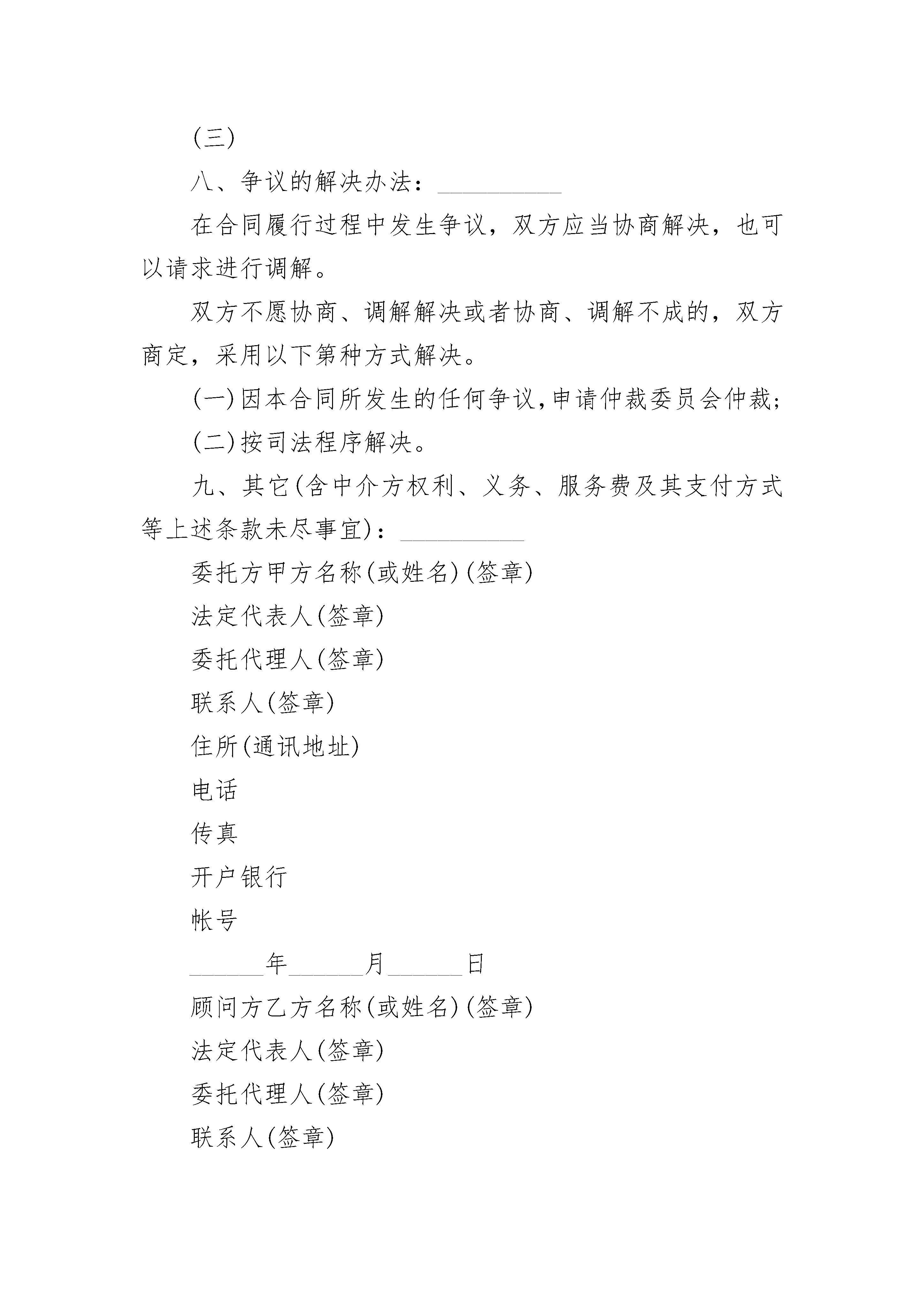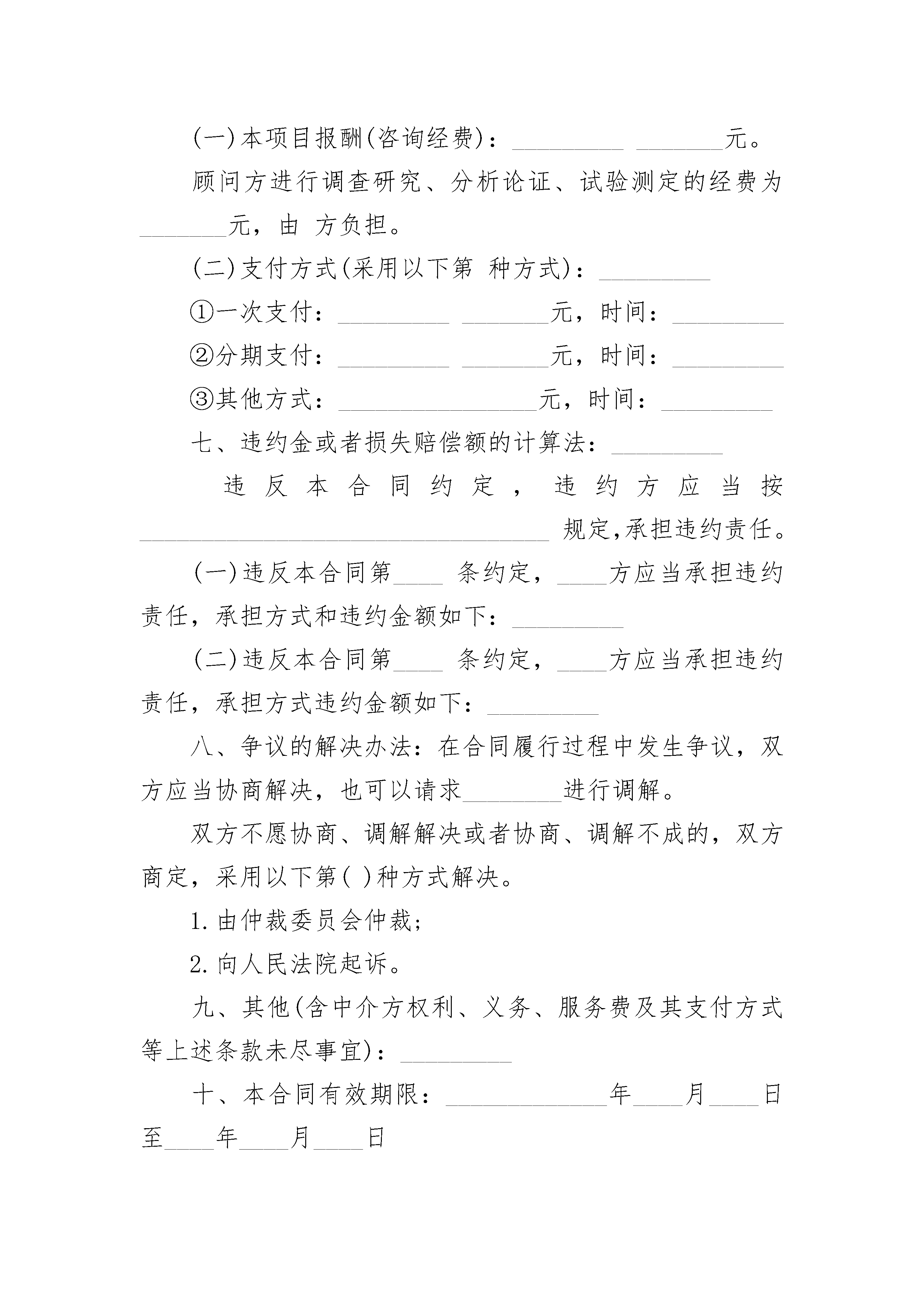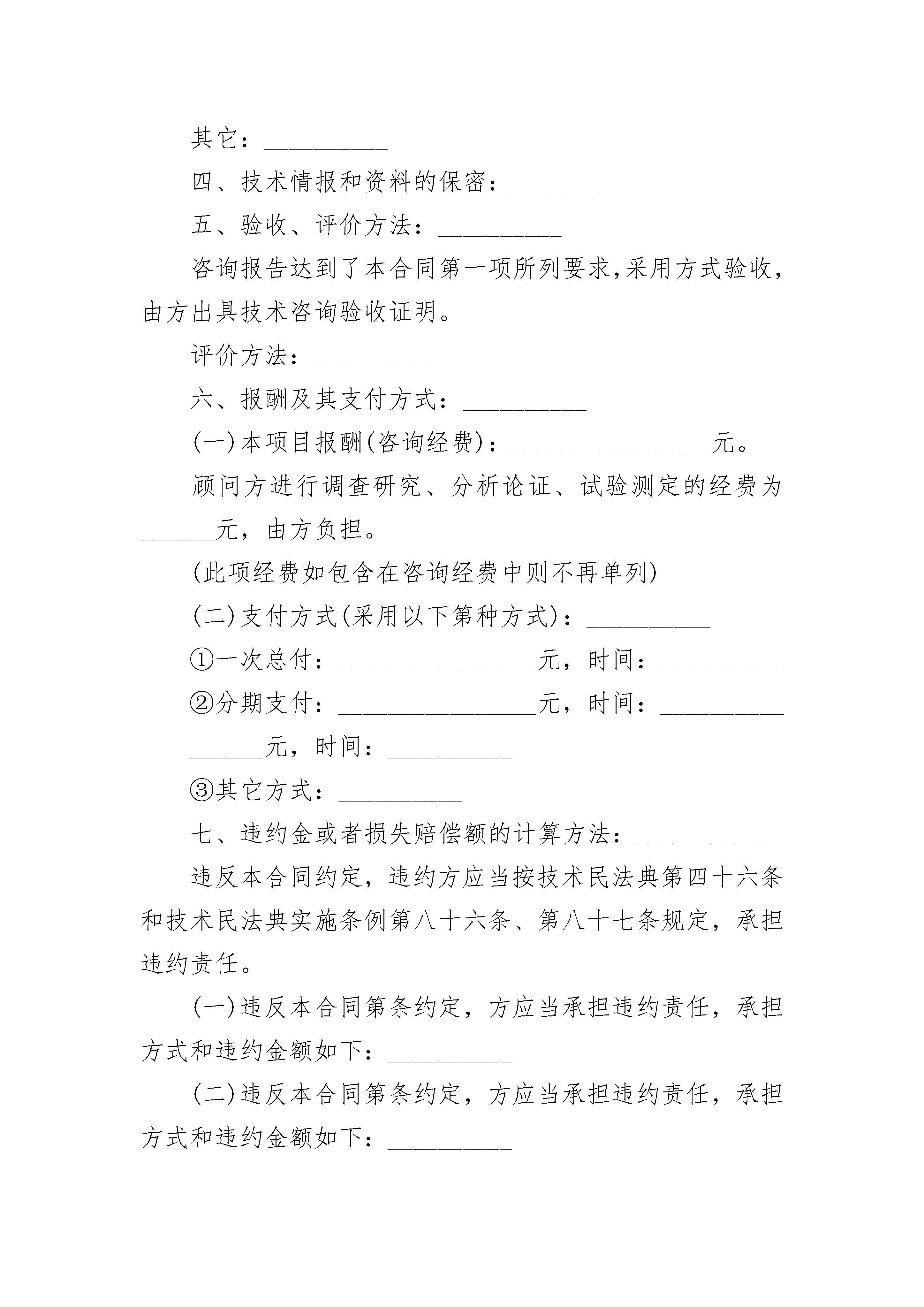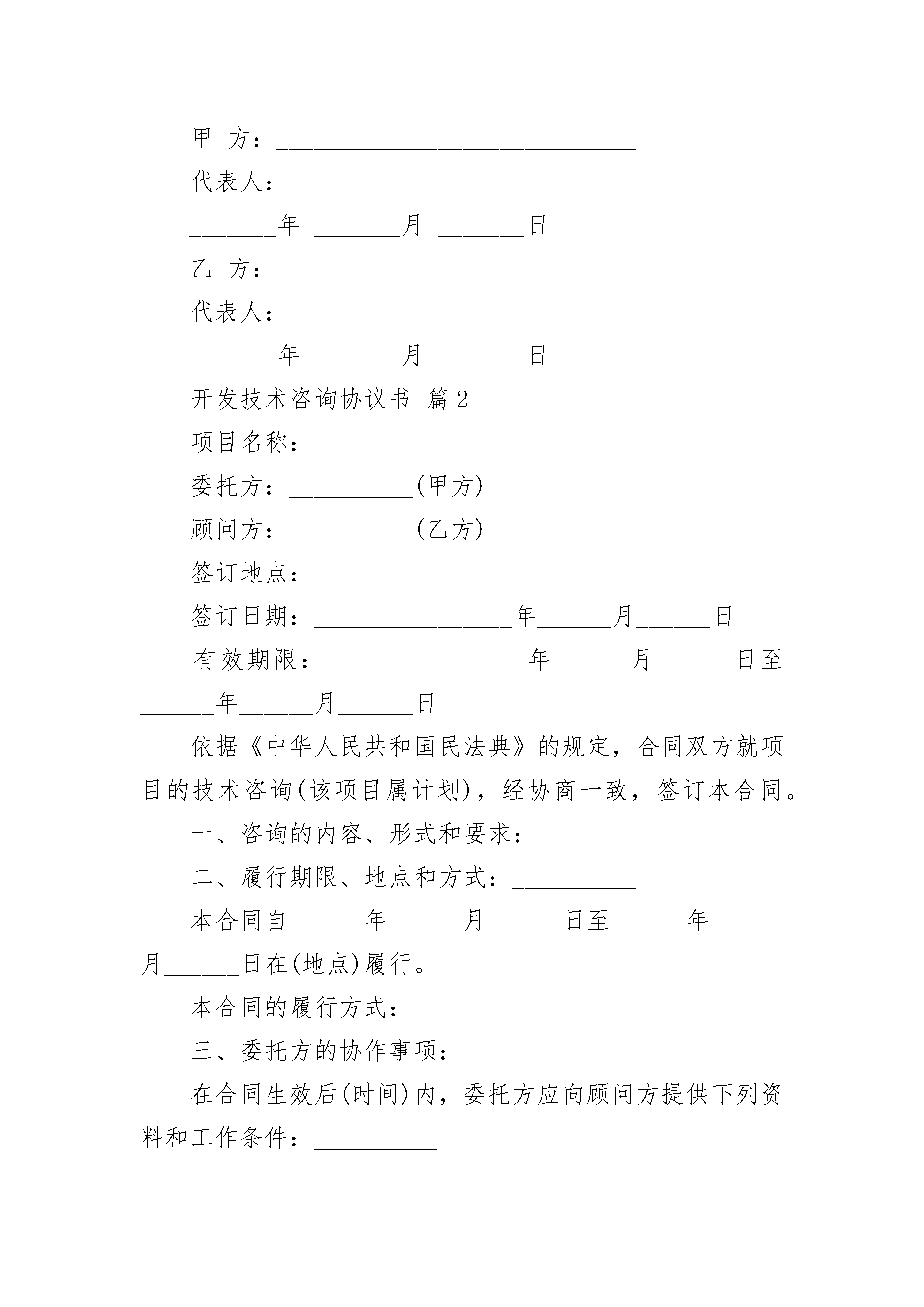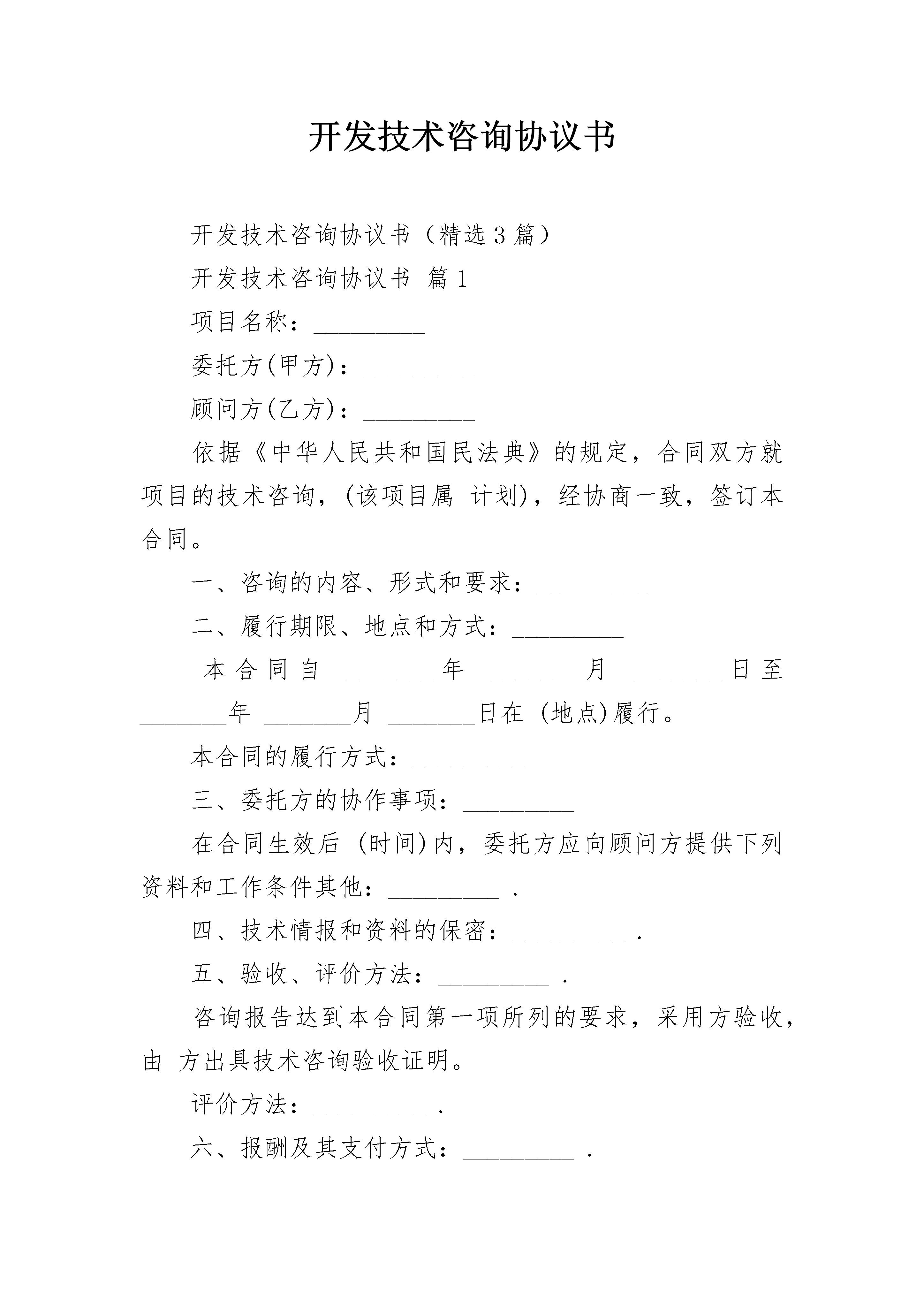 开发技术咨询协议书开发技术咨询协议书(精选3篇)开发技术咨询协议书篇1项目名称:_________委托方(甲方):_________顾问方(乙方):_________依据《中华人民共和国民法典》的规定,合同双方就项目的技术咨询,(该项目属计划),经协商一致,签订本合同。一、咨询的内容、形式和要求:_________二、履行期限、地点和方式:_________本合同自_______年_______月_______日至_______年_______月_______日在(地点)履行。本合同的履行方式:_________三、委托方的协作事项:_________在合同生效后(时间)内,委托方应向顾问方提供下列资料和工作条件其他:_________.四、技术情报和资料的保密:_________.五、验收、评价方法:_________.咨询报告达到本合同第一项所列的要求,采用方验收,由方出具技术咨询验收证明。评价方法:_________.六、报酬及其支付方式:_________.(一)本项目报酬(咨询经费):________________元。顾问方进行调查研究、分析论证、试验测定的经费为_______元,由方负担。(二)支付方式(采用以下第种方式):_________①一次支付:________________元,时间:_________②分期支付:________________元,时间:_________③其他方式:________________元,时间:_________七、违约金或者损失赔偿额的计算法:_________违反本合同约定,违约方应当按_________________________________规定,承担违约责任。(一)违反本合同第____条约定,____方应当承担违约责任,承担方式和违约金额如下:_________(二)违反本合同第____条约定,____方应当承担违约责任,承担方式违约金额如下:_________八、争议的解决办法:在合同履行过程中发生争议,双方应当协商解决,也可以请求________进行调解。双方不愿协商、调解解决或者协商、调解不成的,双方商定,采用以下第()种方式解决。1.由仲裁委员会仲裁;2.向人民法院起诉。九、其他(含中介方权利、义务、服务费及其支付方式等上述条款未尽事宜):_________十、本合同有效期限:_____________年____月____日至____年____月____日甲方:_____________________________代表人:________________________________年_______月_______日乙方:_____________________________代表人:________________________________年_______月_______日开发技术咨询协议书篇2项目名称:__________委托方:__________(甲方)顾问方:__________(乙方)签订地点:__________签订日期:________________年______月______日有效期限:________________年______月______日至______年______月______日依据《中华人民共和国民法典》的规定,合同双方就项目的技术咨询(该项目属计划),经协商一致,签订本合同。一、咨询的内容、形式和要求:__________二、履行期限、地点和方式:__________本合同自______年______月______日至______年______月______日在(地点)履行。本合同的履行方式:__________三、委托方的协作事项:__________在合同生效后(时间)内,委托方应向顾问方提供下列资料和工作条件:__________其它:__________四、技术情报和资料的保密:__________五、验收、评价方法:__________咨询报告达到了本合同第一项所列要求,采用方式验收,由方出具技术咨询验收证明。评价方法:__________六、报酬及其支付方式:__________(一)本项目报酬(咨询经费):________________元。顾问方进行调查研究、分析论证、试验测定的经费为______元,由方负担。(此项经费如包含在咨询经费中则不再单列)(二)支付方式(采用以下第种方式):__________①一次总付:________________元,时间:__________②分期支付:________________元,时间:________________元,时间:__________③其它方式:__________七、违约金或者损失赔偿额的计算方法:________