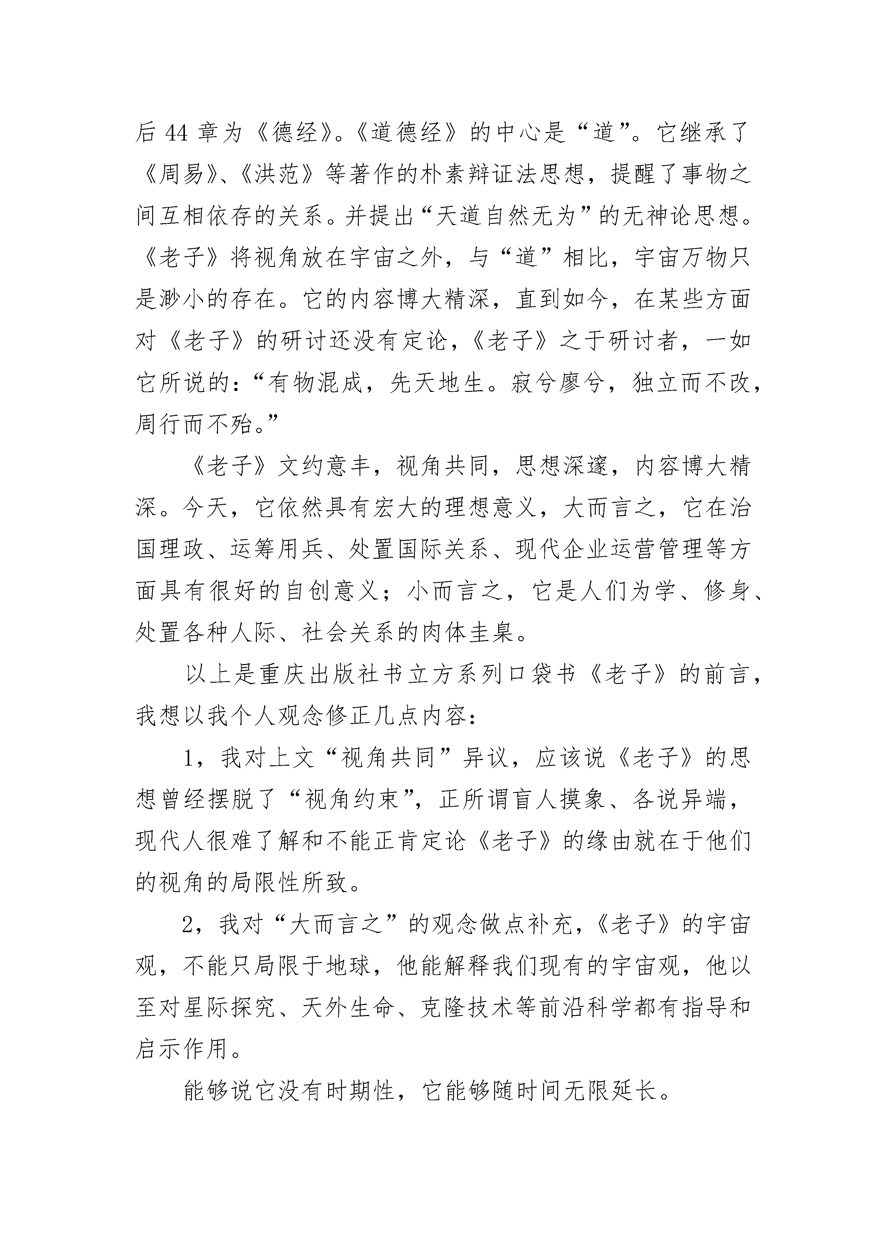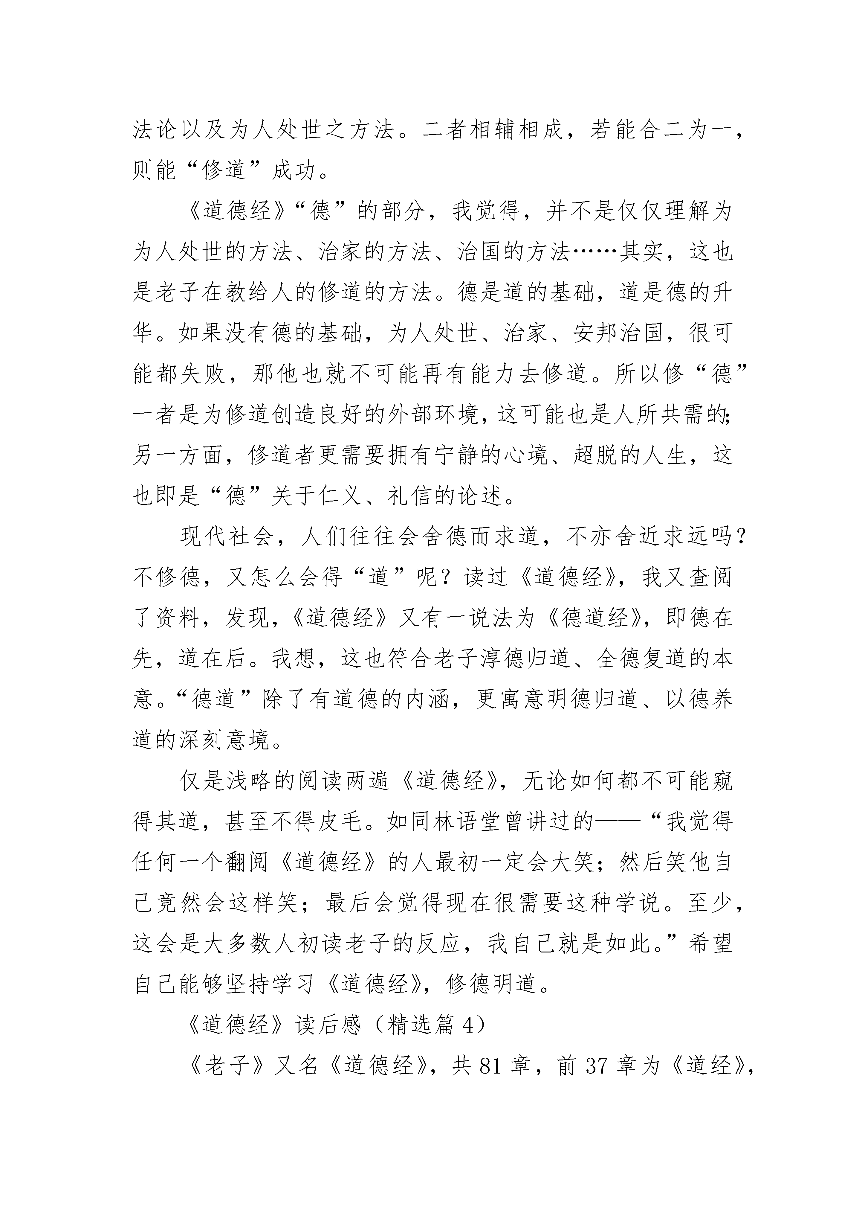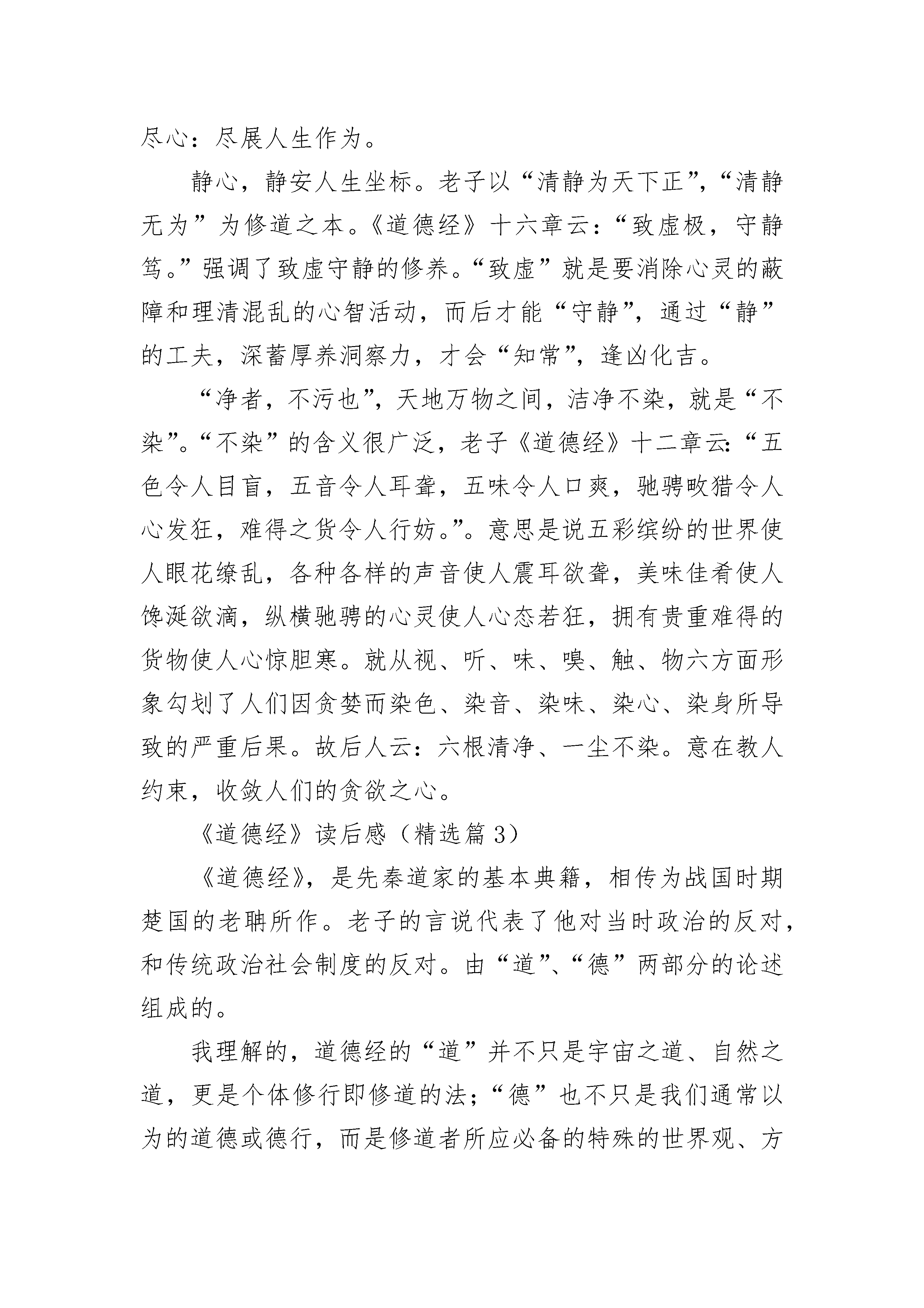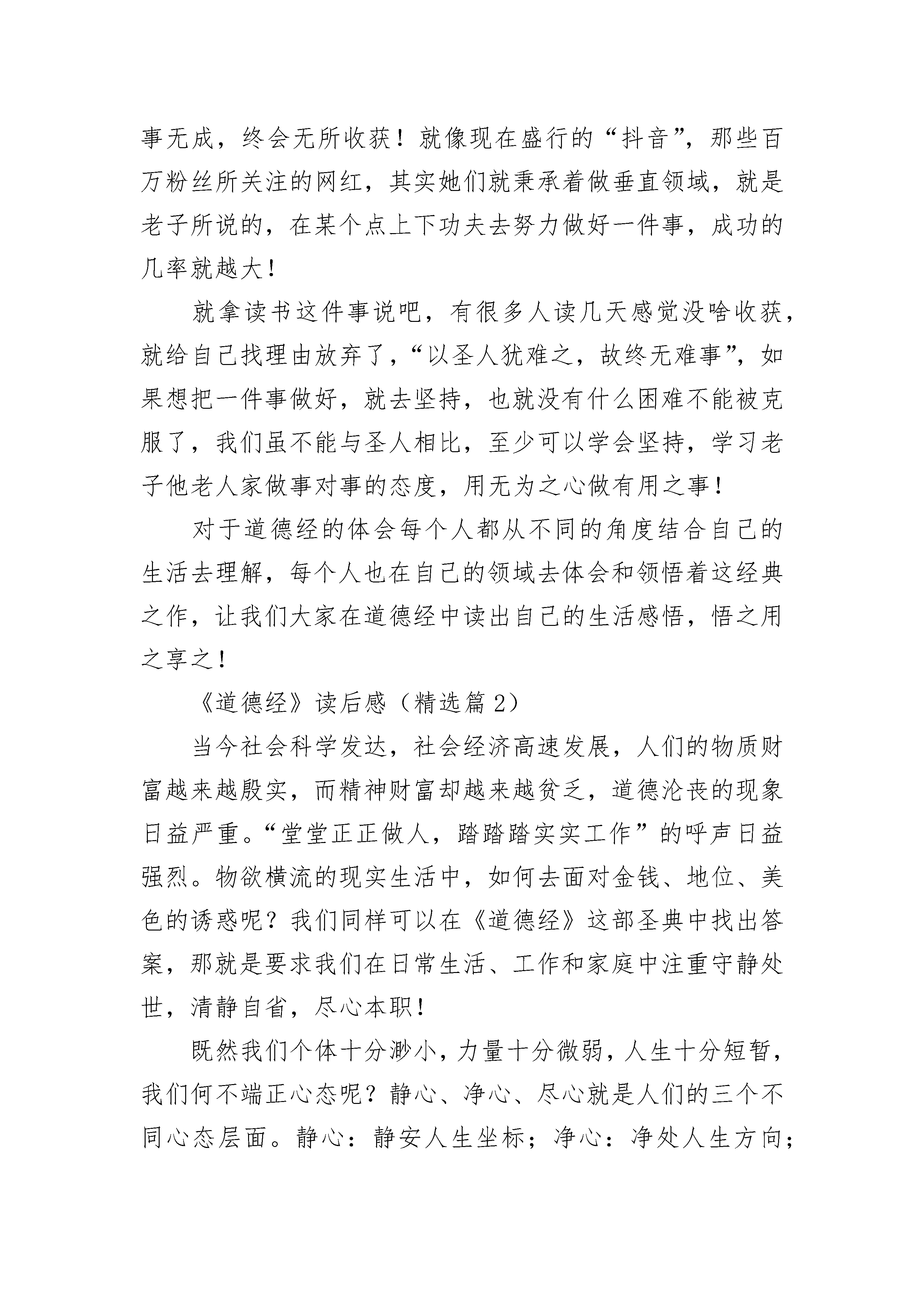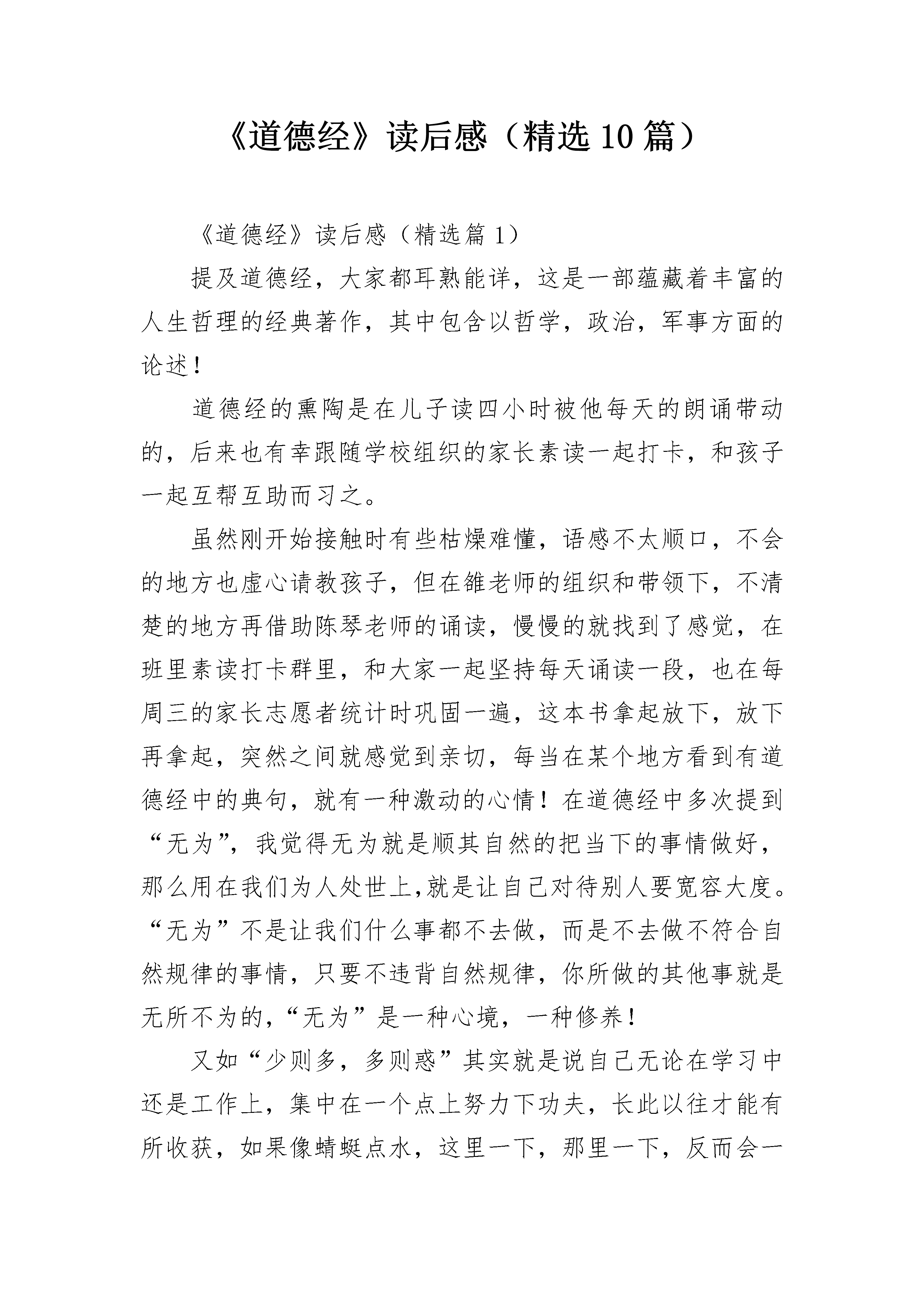《道德经》读后感(精选10篇)《道德经》读后感(精选篇1)提及道德经,大家都耳熟能详,这是一部蕴藏着丰富的人生哲理的经典著作,其中包含以哲学,政治,军事方面的论述!道德经的熏陶是在儿子读四小时被他每天的朗诵带动的,后来也有幸跟随学校组织的家长素读一起打卡,和孩子一起互帮互助而习之。虽然刚开始接触时有些枯燥难懂,语感不太顺口,不会的地方也虚心请教孩子,但在雒老师的组织和带领下,不清楚的地方再借助陈琴老师的诵读,慢慢的就找到了感觉,在班里素读打卡群里,和大家一起坚持每天诵读一段,也在每周三的家长志愿者统计时巩固一遍,这本书拿起放下,放下再拿起,突然之间就感觉到亲切,每当在某个地方看到有道德经中的典句,就有一种激动的心情!在道德经中多次提到“无为”,我觉得无为就是顺其自然的把当下的事情做好,那么用在我们为人处世上,就是让自己对待别人要宽容大度。“无为”不是让我们什么事都不去做,而是不去做不符合自然规律的事情,只要不违背自然规律,你所做的其他事就是无所不为的,“无为”是一种心境,一种修养!又如“少则多,多则惑”其实就是说自己无论在学习中还是工作上,集中在一个点上努力下功夫,长此以往才能有所收获,如果像蜻蜓点水,这里一下,那里一下,反而会一事无成,终会无所收获!就像现在盛行的“抖音”,那些百万粉丝所关注的网红,其实她们就秉承着做垂直领域,就是老子所说的,在某个点上下功夫去努力做好一件事,成功的几率就越大!就拿读书这件事说吧,有很多人读几天感觉没啥收获,就给自己找理由放弃了,“以圣人犹难之,故终无难事”,如果想把一件事做好,就去坚持,也就没有什么困难不能被克服了,我们虽不能与圣人相比,至少可以学会坚持,学习老子他老人家做事对事的态度,用无为之心做有用之事!对于道德经的体会每个人都从不同的角度结合自己的生活去理解,每个人也在自己的领域去体会和领悟着这经典之作,让我们大家在道德经中读出自己的生活感悟,悟之用之享之!《道德经》读后感(精选篇2)当今社会科学发达,社会经济高速发展,人们的物质财富越来越殷实,而精神财富却越来越贫乏,道德沦丧的现象日益严重。“堂堂正正做人,踏踏踏实实工作”的呼声日益强烈。物欲横流的现实生活中,如何去面对金钱、地位、美色的诱惑呢?我们同样可以在《道德经》这部圣典中找出答案,那就是要求我们在日常生活、工作和家庭中注重守静处世,清静自省,尽心本职!既然我们个体十分渺小,力量十分微弱,人生十分短暂,我们何不端正心态呢?静心、净心、尽心就是人们的三个不同心态层面。静心:静安人生坐标;净心:净处人生方向;尽心:尽展人生作为。静心,静安人生坐标。老子以“清静为天下正”,“清静无为”为修道之本。《道德经》十六章云:“致虚极,守静笃。”强调了致虚守静的修养。“致虚”就是要消除心灵的蔽障和理清混乱的心智活动,而后才能“守静”,通过“静”的工夫,深蓄厚养洞察力,才会“知常”,逢凶化吉。“净者,不污也”,天地万物之间,洁净不染,就是“不染”。“不染”的含义很广泛,老子《道德经》十二章云:“五色令人目盲,五音令人耳聋,五味令人口爽,驰骋畋猎令人心发狂,难得之货令人行妨。”。意思是说五彩缤纷的世界使人眼花缭乱,各种各样的声音使人震耳欲聋,美味佳肴使人馋涎欲滴,纵横驰骋的心灵使人心态若狂,拥有贵重难得的货物使人心惊胆寒。就从视、听、味、嗅、触、物六方面形象勾划了人们因贪婪而染色、染音、染味、染心、染身所导致的严重后果。故后人云:六根清净、一尘不染。意在教人约束,收敛人们的贪欲之心。《道德经》读后感(精选篇3)《道德经》,是先秦道家的基本典籍,相传为战国时期楚国的老聃所作。老子的言说代表了他对当时政治的反对,和传统政治社会制度的反对。由“道”、“德”两部分的论述组成的。我理解的,道德经的“道”并不只是宇宙之道、自然之道,更是个体修行即修道的法;“德”也不只是我们通常以为的道德或德行,而是修道者所应必备的特殊的世界观、方法论以及为人处世之方法。二者相辅相成,若能合二为一,则能“修道”成功。《道德经》“德”的部分,我觉得,并不是仅仅理解为为人处世的方法、治家的方法、治国的方法……其实,这也是老子在教给人的修道的方法。德是道的基础,道是德的升华。如果没有德的基础,为人处世、治家、安邦治国,很可能都失败,那他也就不可能再有能力去修道。所以修“德”一者是为修道创造良好的外部环境,这可能也是人所共需的;另一方面,修道者更需要拥有宁静的心境、超脱的人生,这也即是“德”关于仁义、礼信的论述。现代社会,人们往往会舍德而求道,不亦舍近求远吗?不修德,又怎么会得“道”呢?读过《道德经》,我又查阅了资料,发现,《道德经》又有一说法为《德道经》,即德在先,道在后。我想,这也符合老子淳德归道、全德复道的本意。“德道”除了有道德的内涵,更寓意明德归道、以德养道的深刻意境。仅