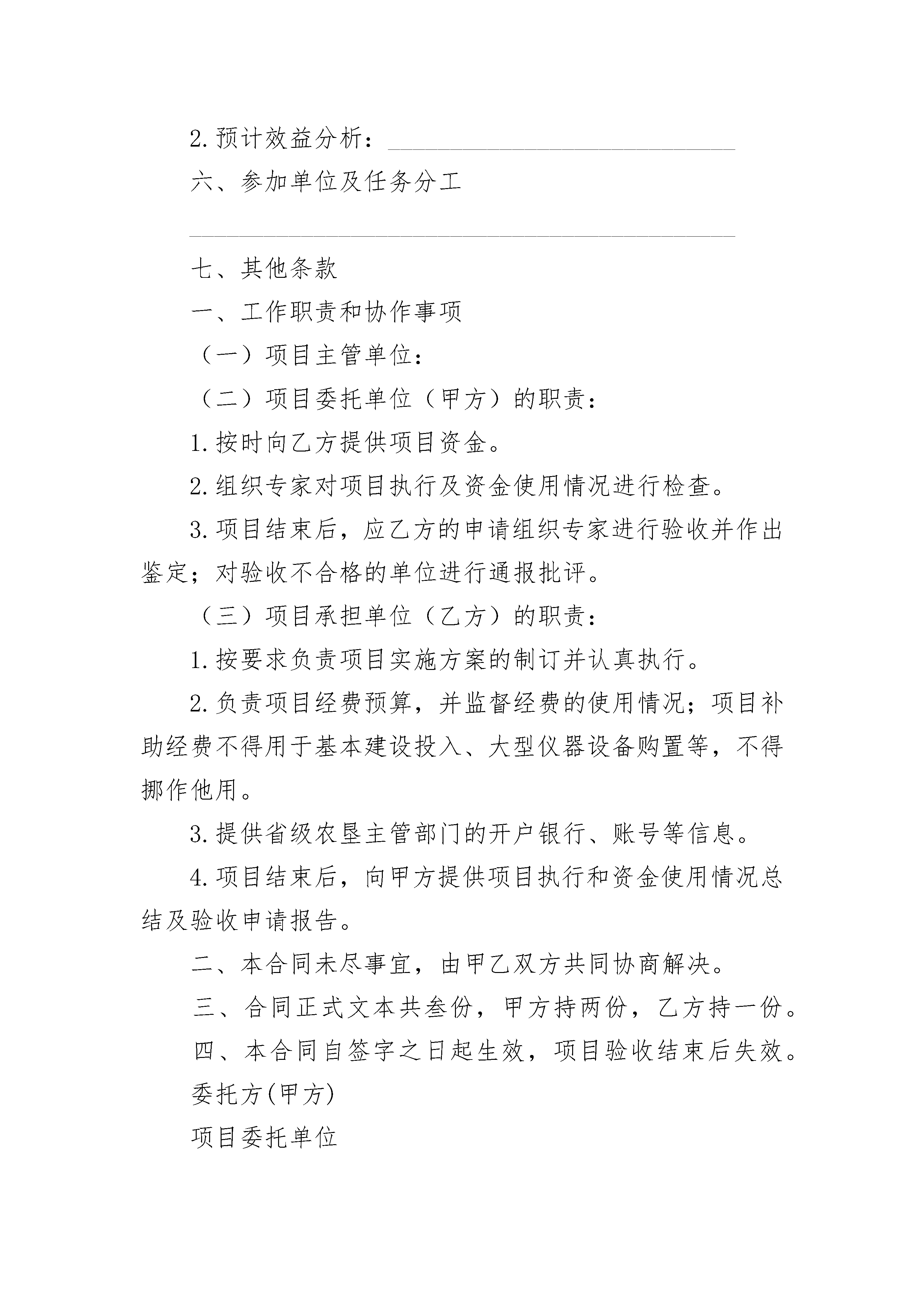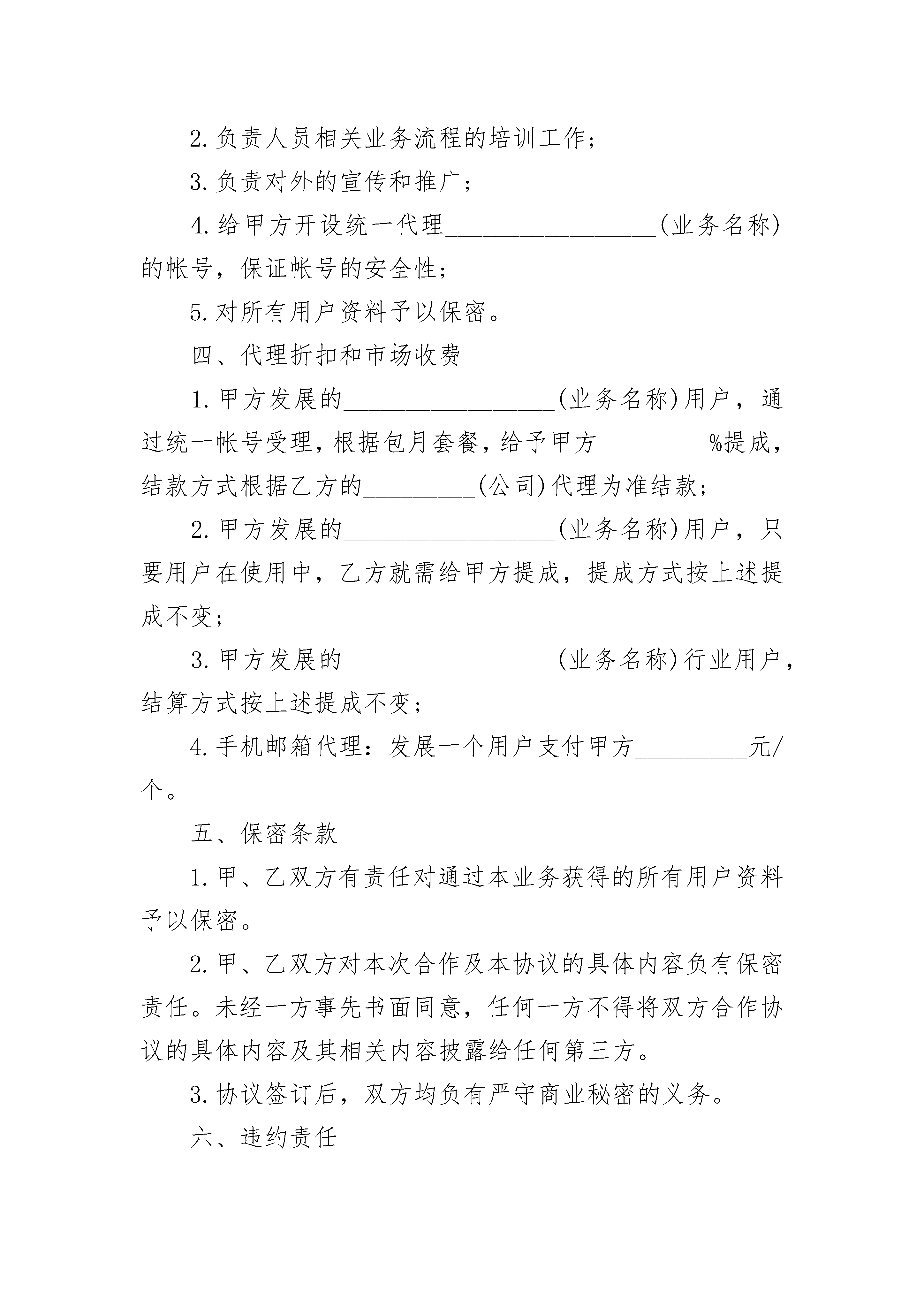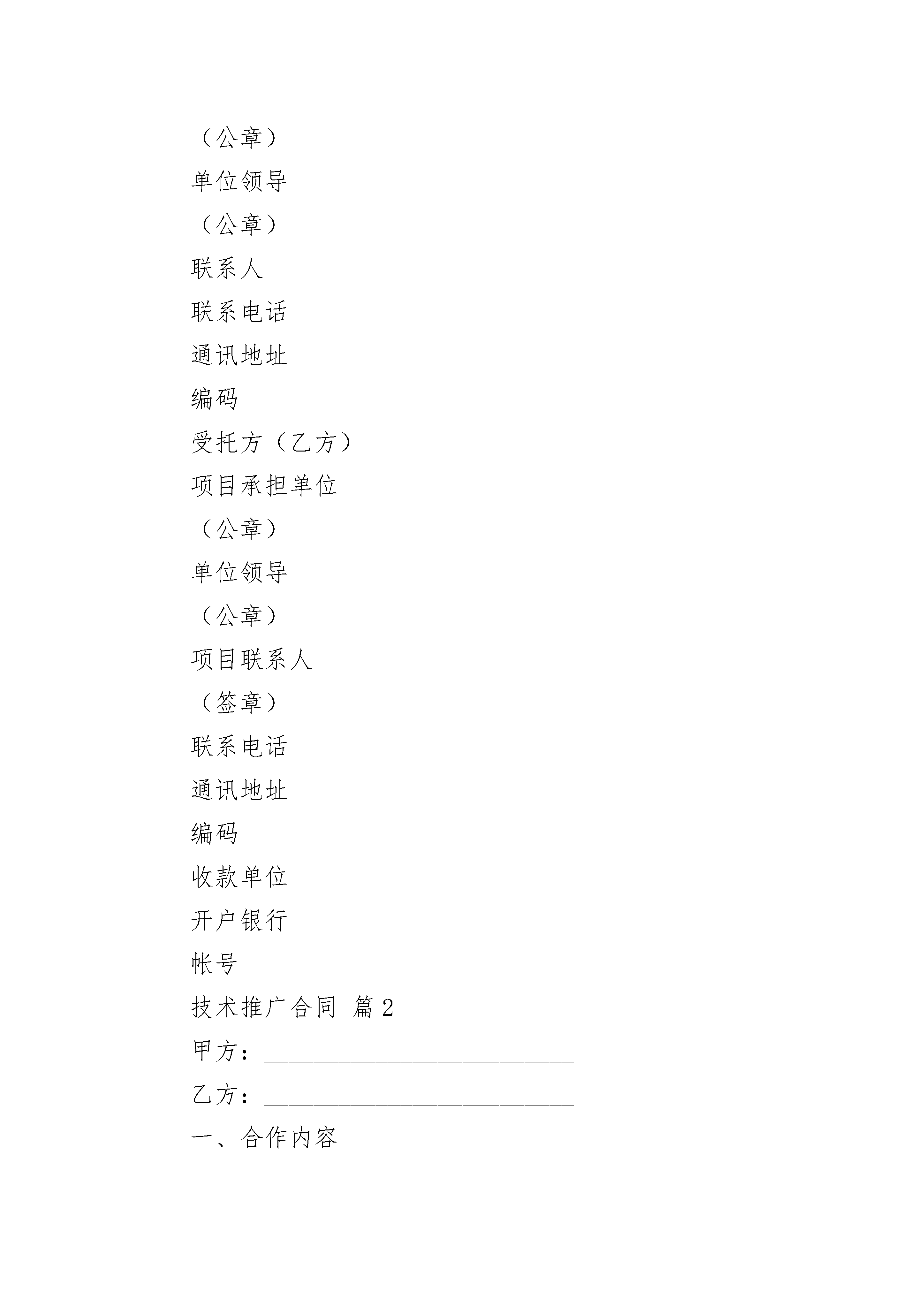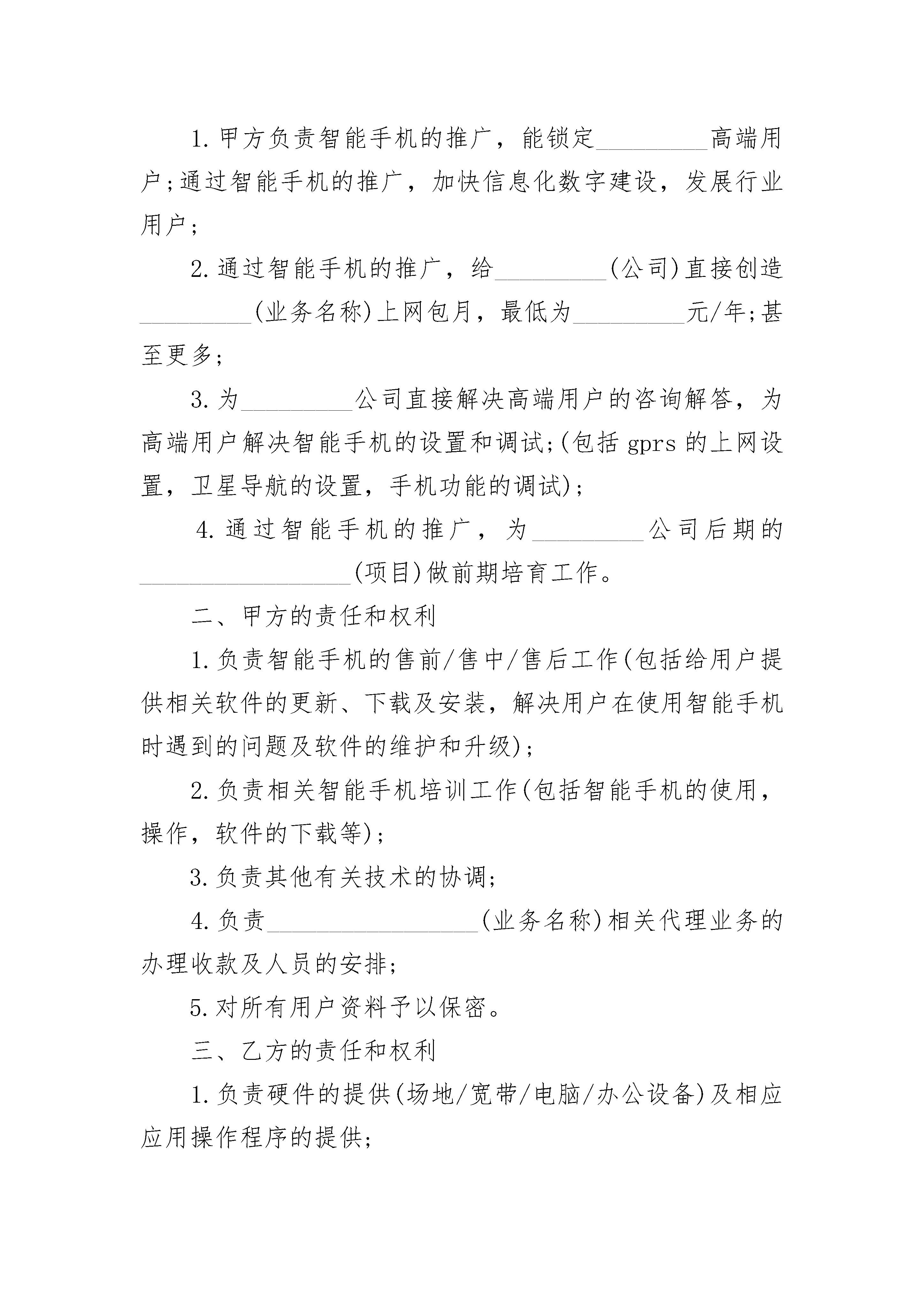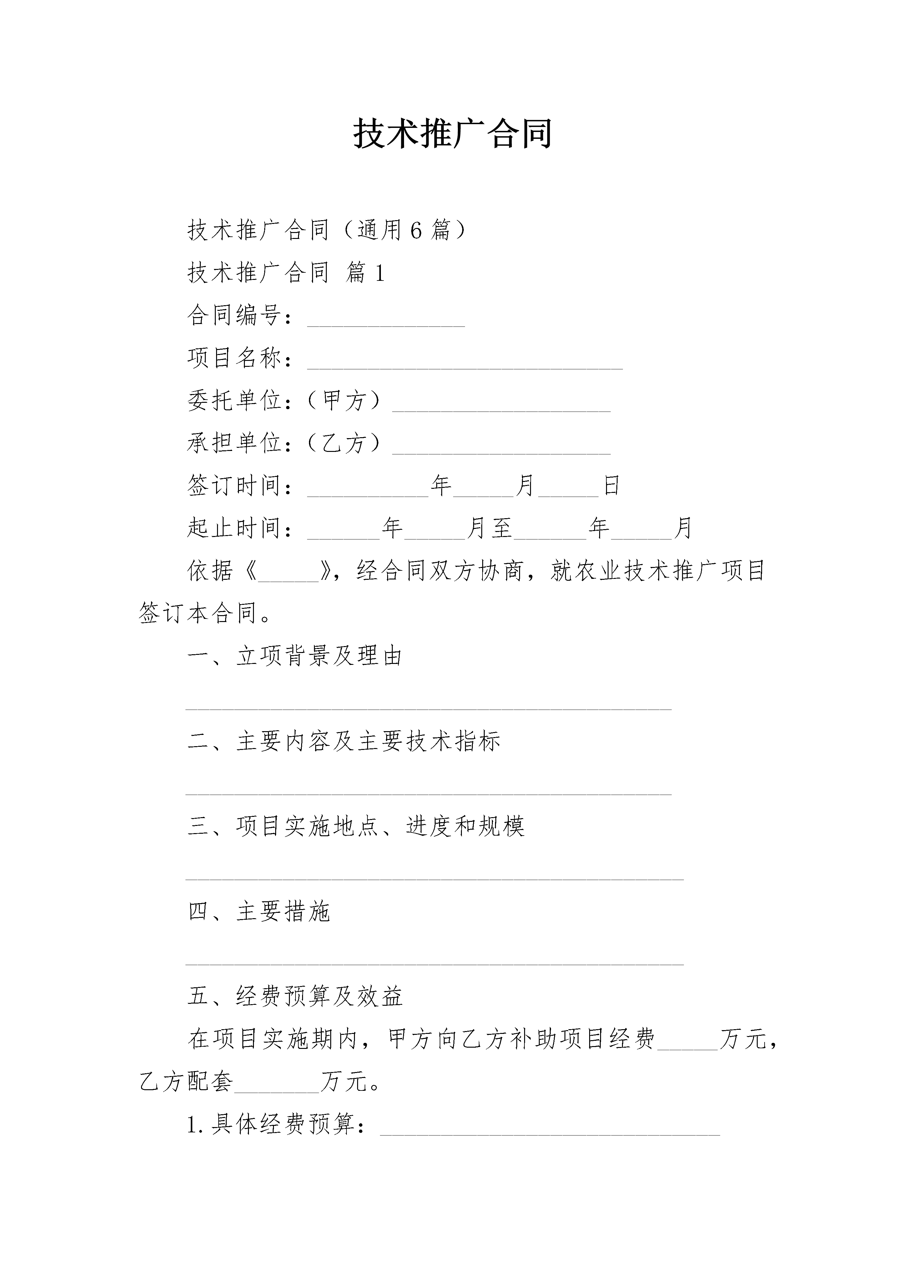 技术推广合同技术推广合同(通用6篇)技术推广合同篇1合同编号:_____________项目名称:__________________________委托单位:(甲方)__________________承担单位:(乙方)__________________签订时间:__________年_____月_____日起止时间:______年_____月至______年_____月依据《_____》,经合同双方协商,就农业技术推广项目签订本合同。一、立项背景及理由________________________________________二、主要内容及主要技术指标________________________________________三、项目实施地点、进度和规模_________________________________________四、主要措施_________________________________________五、经费预算及效益在项目实施期内,甲方向乙方补助项目经费_____万元,乙方配套_______万元。1.具体经费预算:____________________________2.预计效益分析:____________________________六、参加单位及任务分工____________________________________________七、其他条款一、工作职责和协作事项(一)项目主管单位:(二)项目委托单位(甲方)的职责:1.按时向乙方提供项目资金。2.组织专家对项目执行及资金使用情况进行检查。3.项目结束后,应乙方的申请组织专家进行验收并作出鉴定;对验收不合格的单位进行通报批评。(三)项目承担单位(乙方)的职责:1.按要求负责项目实施方案的制订并认真执行。2.负责项目经费预算,并监督经费的使用情况;项目补助经费不得用于基本建设投入、大型仪器设备购置等,不得挪作他用。3.提供省级农垦主管部门的开户银行、账号等信息。4.项目结束后,向甲方提供项目执行和资金使用情况总结及验收申请报告。二、本合同未尽事宜,由甲乙双方共同协商解决。三、合同正式文本共叁份,甲方持两份,乙方持一份。四、本合同自签字之日起生效,项目验收结束后失效。委托方(甲方)项目委托单位(公章)单位领导(公章)联系人联系电话通讯地址编码受托方(乙方)项目承担单位(公章)单位领导(公章)项目联系人(签章)联系电话通讯地址编码收款单位开户银行帐号技术推广合同篇2甲方:_________________________乙方:_________________________一、合作内容1.甲方负责智能手机的推广,能锁定_________高端用户;通过智能手机的推广,加快信息化数字建设,发展行业用户;2.通过智能手机的推广,给_________(公司)直接创造_________(业务名称)上网包月,最低为_________元/年;甚至更多;3.为_________公司直接解决高端用户的咨询解答,为高端用户解决智能手机的设置和调试;(包括gprs的上网设置,卫星导航的设置,手机功能的调试);4.通过智能手机的推广,为_________公司后期的_________________(项目)做前期培育工作。二、甲方的责任和权利1.负责智能手机的售前/售中/售后工作(包括给用户提供相关软件的更新、下载及安装,解决用户在使用智能手机时遇到的问题及软件的维护和升级);2.负责相关智能手机培训工作(包括智能手机的使用,操作,软件的下载等);3.负责其他有关技术的协调;4.负责_________________(业务名称)相关代理业务的办理收款及人员的安排;5.对所有用户资料予以保密。三、乙方的责任和权利1.负责硬件的提供(场地/宽带/电脑/办公设备)及相应应用操作程序的提供;2.负责人员相关业务流程的培训工作;3.负责对外的宣传和推广;4.给甲方开设统一代理_________________(业务名称)的帐号,保证帐号的安全性;5.对所有用户资料予以保密。四、代理折扣和市场收费1.甲方发展的_________________(业务名称)用户,通过统一帐号受理,根据包月套餐,给予甲方_________%提成,结款方式根据乙方的_________(公司)代理为准结款;2.甲方发展的_________________(业务名称)用户,只要用户在使用中,乙方就需给甲方提成,提成方式按上述提成不变;3.甲方发展的_________________(业务名称)行业用户,结算方式按上述提成不变;4.手机邮箱代理:发展一个用户支付甲方_________元/个。五、保密条款1.甲、乙双方有责任对通过本业务获得的所有用户资料予以保密。2.甲、乙双方对本次