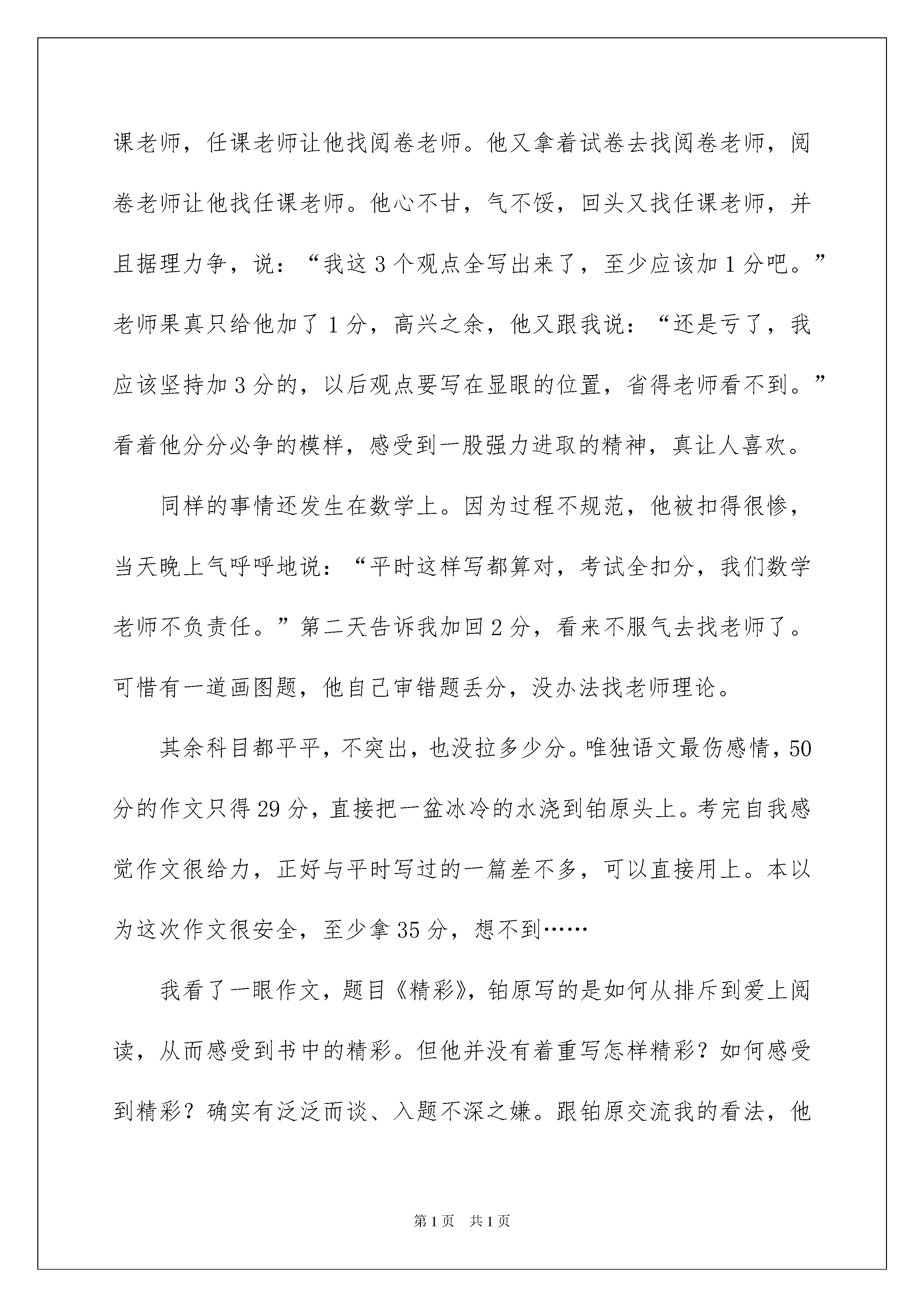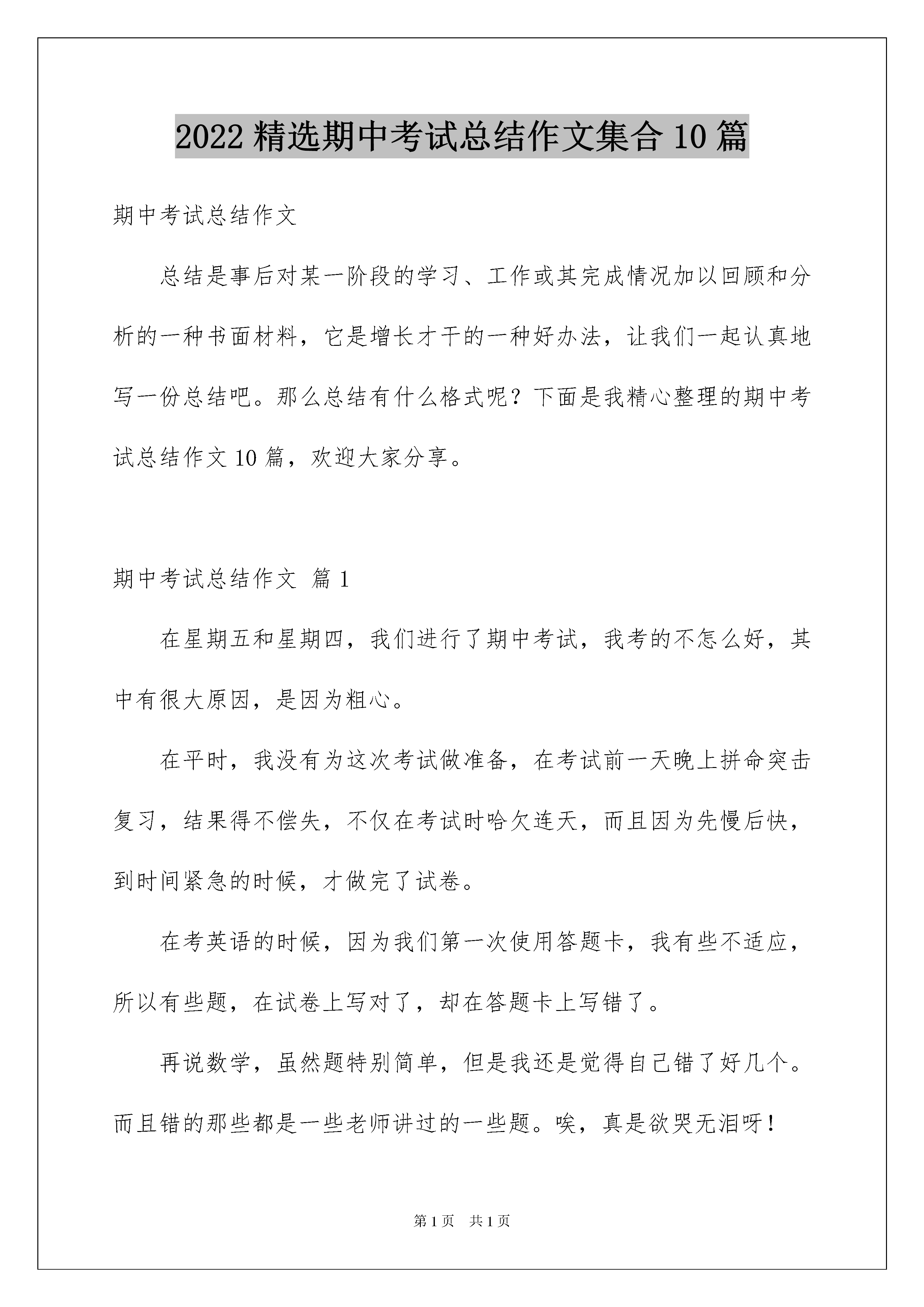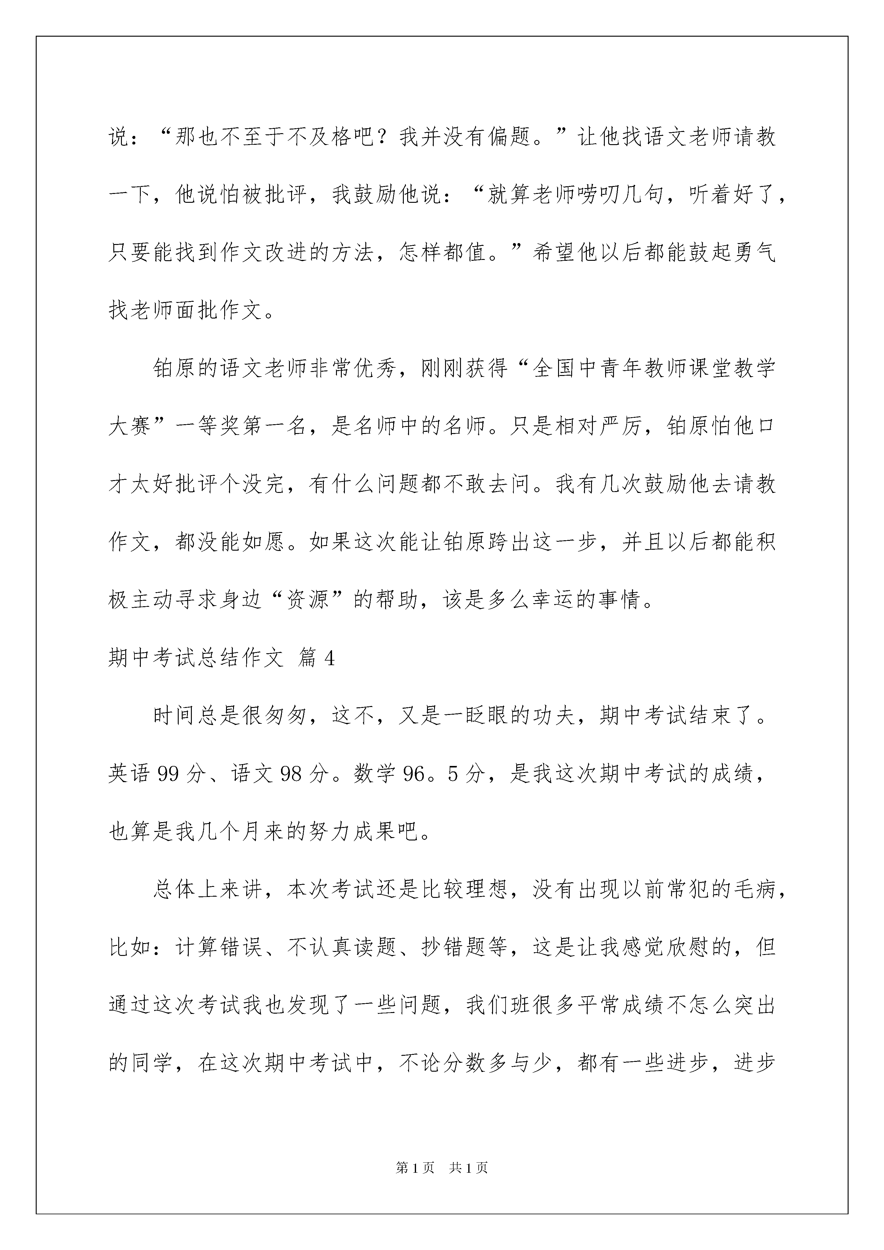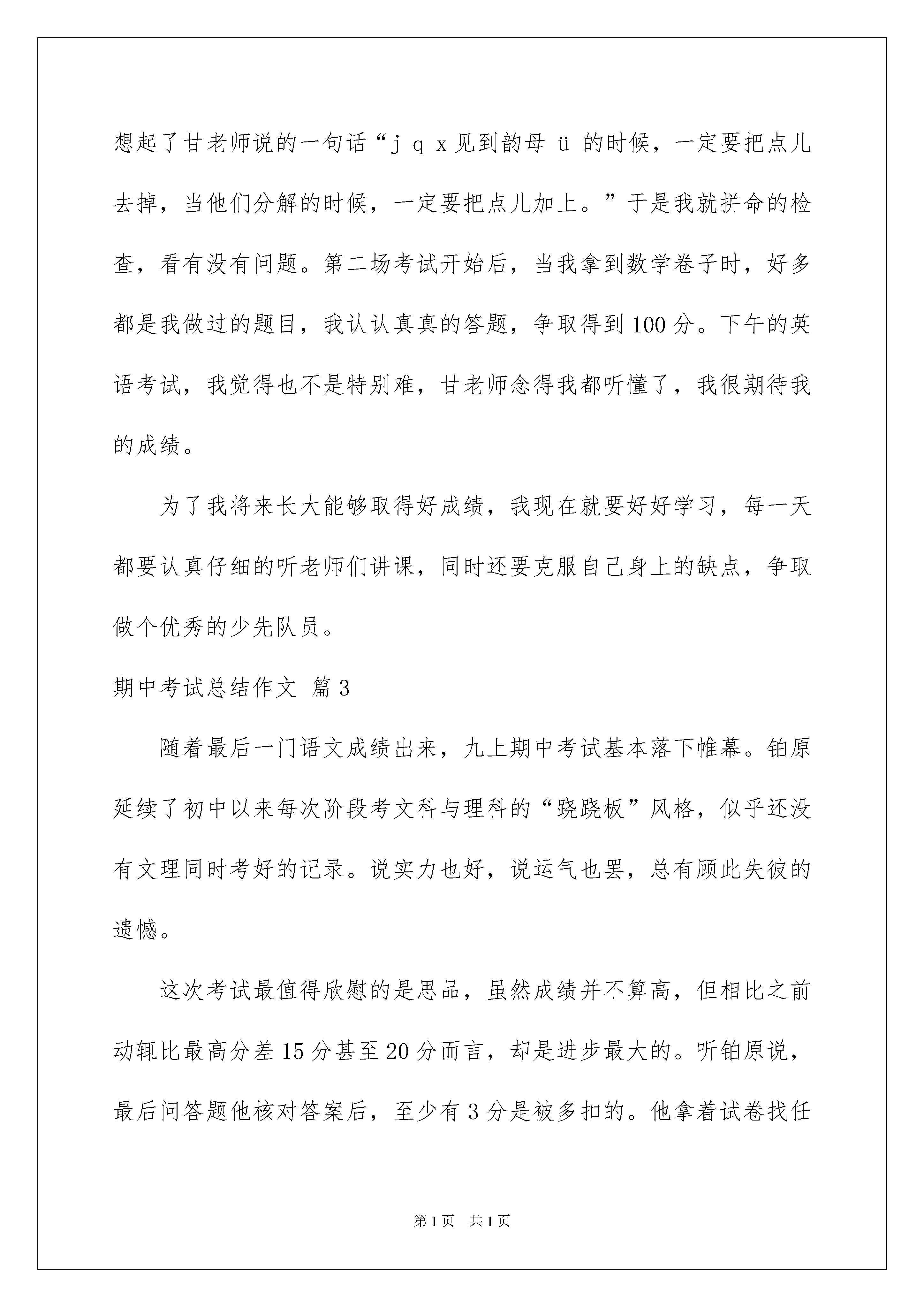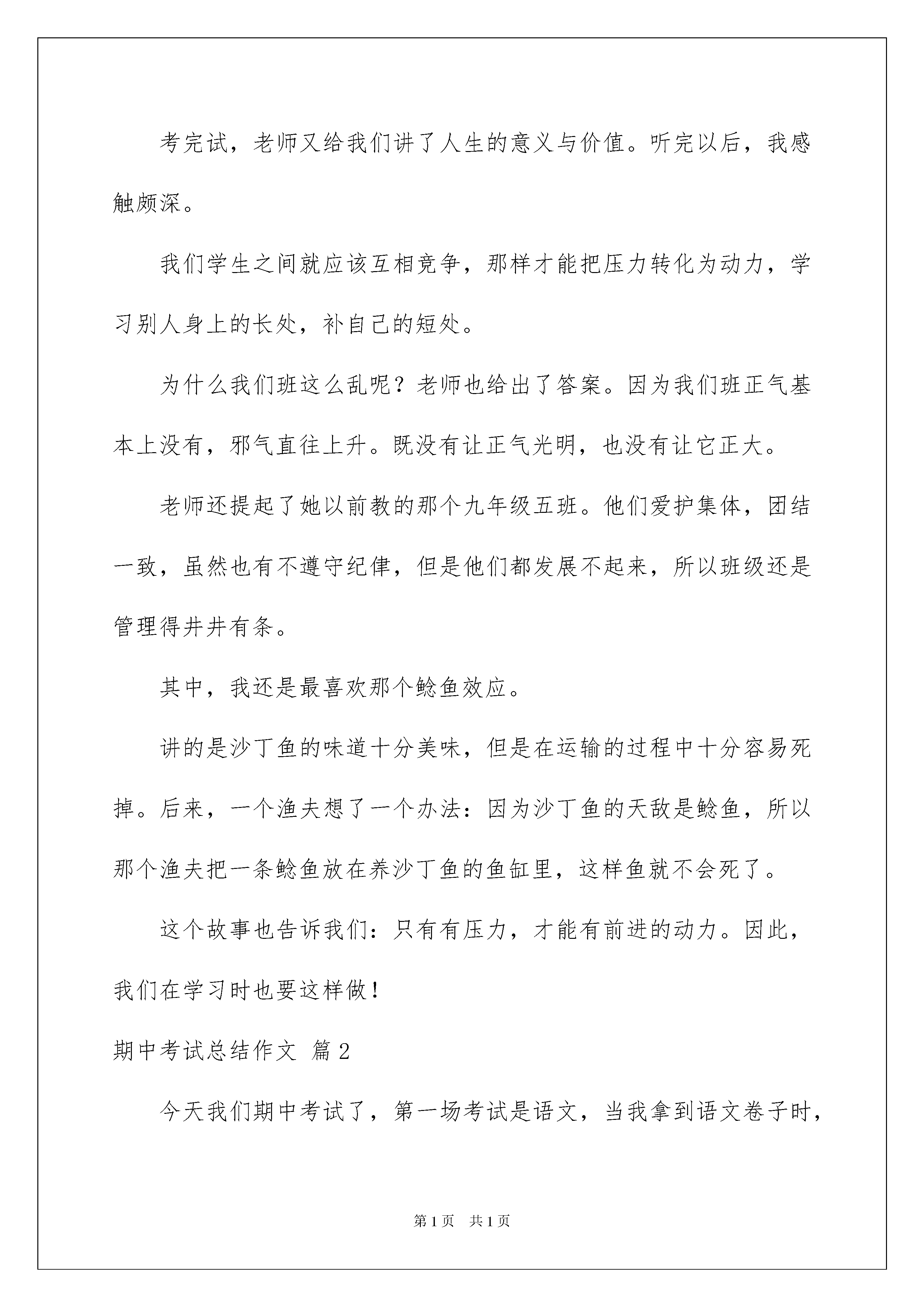 2022精选期中考试总结作文集合10篇期中考试总结作文总结是事后对某一阶段的学习、工作或其完成情况加以回顾和分析的一种书面材料,它是增长才干的一种好办法,让我们一起认真地写一份总结吧。那么总结有什么格式呢?下面是我精心整理的期中考试总结作文10篇,欢迎大家分享。期中考试总结作文篇1在星期五和星期四,我们进行了期中考试,我考的不怎么好,其中有很大原因,是因为粗心。在平时,我没有为这次考试做准备,在考试前一天晚上拼命突击复习,结果得不偿失,不仅在考试时哈欠连天,而且因为先慢后快,到时间紧急的时候,才做完了试卷。在考英语的时候,因为我们第一次使用答题卡,我有些不适应,所以有些题,在试卷上写对了,却在答题卡上写错了。再说数学,虽然题特别简单,但是我还是觉得自己错了好几个。而且错的那些都是一些老师讲过的一些题。唉,真是欲哭无泪呀!考完试,老师又给我们讲了人生的意义与价值。听完以后,我感触颇深。我们学生之间就应该互相竞争,那样才能把压力转化为动力,学习别人身上的长处,补自己的短处。为什么我们班这么乱呢?老师也给出了答案。因为我们班正气基本上没有,邪气直往上升。既没有让正气光明,也没有让它正大。老师还提起了她以前教的那个九年级五班。他们爱护集体,团结一致,虽然也有不遵守纪侓,但是他们都发展不起来,所以班级还是管理得井井有条。其中,我还是最喜欢那个鲶鱼效应。讲的是沙丁鱼的味道十分美味,但是在运输的过程中十分容易死掉。后来,一个渔夫想了一个办法:因为沙丁鱼的天敌是鲶鱼,所以那个渔夫把一条鲶鱼放在养沙丁鱼的鱼缸里,这样鱼就不会死了。这个故事也告诉我们:只有有压力,才能有前进的动力。因此,我们在学习时也要这样做!期中考试总结作文篇2今天我们期中考试了,第一场考试是语文,当我拿到语文卷子时,想起了甘老师说的一句话“jqx见到韵母ü的时候,一定要把点儿去掉,当他们分解的时候,一定要把点儿加上。”于是我就拼命的检查,看有没有问题。第二场考试开始后,当我拿到数学卷子时,好多都是我做过的题目,我认认真真的答题,争取得到100分。下午的英语考试,我觉得也不是特别难,甘老师念得我都听懂了,我很期待我的成绩。为了我将来长大能够取得好成绩,我现在就要好好学习,每一天都要认真仔细的听老师们讲课,同时还要克服自己身上的缺点,争取做个优秀的少先队员。期中考试总结作文篇3随着最后一门语文成绩出来,九上期中考试基本落下帷幕。铂原延续了初中以来每次阶段考文科与理科的“跷跷板”风格,似乎还没有文理同时考好的记录。说实力也好,说运气也罢,总有顾此失彼的遗憾。这次考试最值得欣慰的是思品,虽然成绩并不算高,但相比之前动辄比最高分差15分甚至20分而言,却是进步最大的。听铂原说,最后问答题他核对答案后,至少有3分是被多扣的。他拿着试卷找任课老师,任课老师让他找阅卷老师。他又拿着试卷去找阅卷老师,阅卷老师让他找任课老师。他心不甘,气不馁,回头又找任课老师,并且据理力争,说:“我这3个观点全写出来了,至少应该加1分吧。”老师果真只给他加了1分,高兴之余,他又跟我说:“还是亏了,我应该坚持加3分的,以后观点要写在显眼的位置,省得老师看不到。”看着他分分必争的模样,感受到一股强力进取的精神,真让人喜欢。同样的事情还发生在数学上。因为过程不规范,他被扣得很惨,当天晚上气呼呼地说:“平时这样写都算对,考试全扣分,我们数学老师不负责任。”第二天告诉我加回2分,看来不服气去找老师了。可惜有一道画图题,他自己审错题丢分,没办法找老师理论。其余科目都平平,不突出,也没拉多少分。唯独语文最伤感情,50分的作文只得29分,直接把一盆冰冷的水浇到铂原头上。考完自我感觉作文很给力,正好与平时写过的一篇差不多,可以直接用上。本以为这次作文很安全,至少拿35分,想不到……我看了一眼作文,题目《精彩》,铂原写的是如何从排斥到爱上阅读,从而感受到书中的精彩。但他并没有着重写怎样精彩?如何感受到精彩?确实有泛泛而谈、入题不深之嫌。跟铂原交流我的看法,他说:“那也不至于不及格吧?我并没有偏题。”让他找语文老师请教一下,他说怕被批评,我鼓励他说:“就算老师唠叨几句,听着好了,只要能找到作文改进的方法,怎样都值。”希望他以后都能鼓起勇气找老师面批作文。铂原的语文老师非常优秀,刚刚获得“全国中青年教师课堂教学大赛”一等奖第一名,是名师中的名师。只是相对严厉,铂原怕他口才太好批评个没完,有什么问题都不敢去问。我有几次鼓励他去请教作文,都没能如愿。如果这次能让铂原跨出这一步,并且以后都能积极主动寻求身边“资源”的帮助,该是多么幸运的事情。期中考试总结作文篇4时间总是很匆匆,这不,又